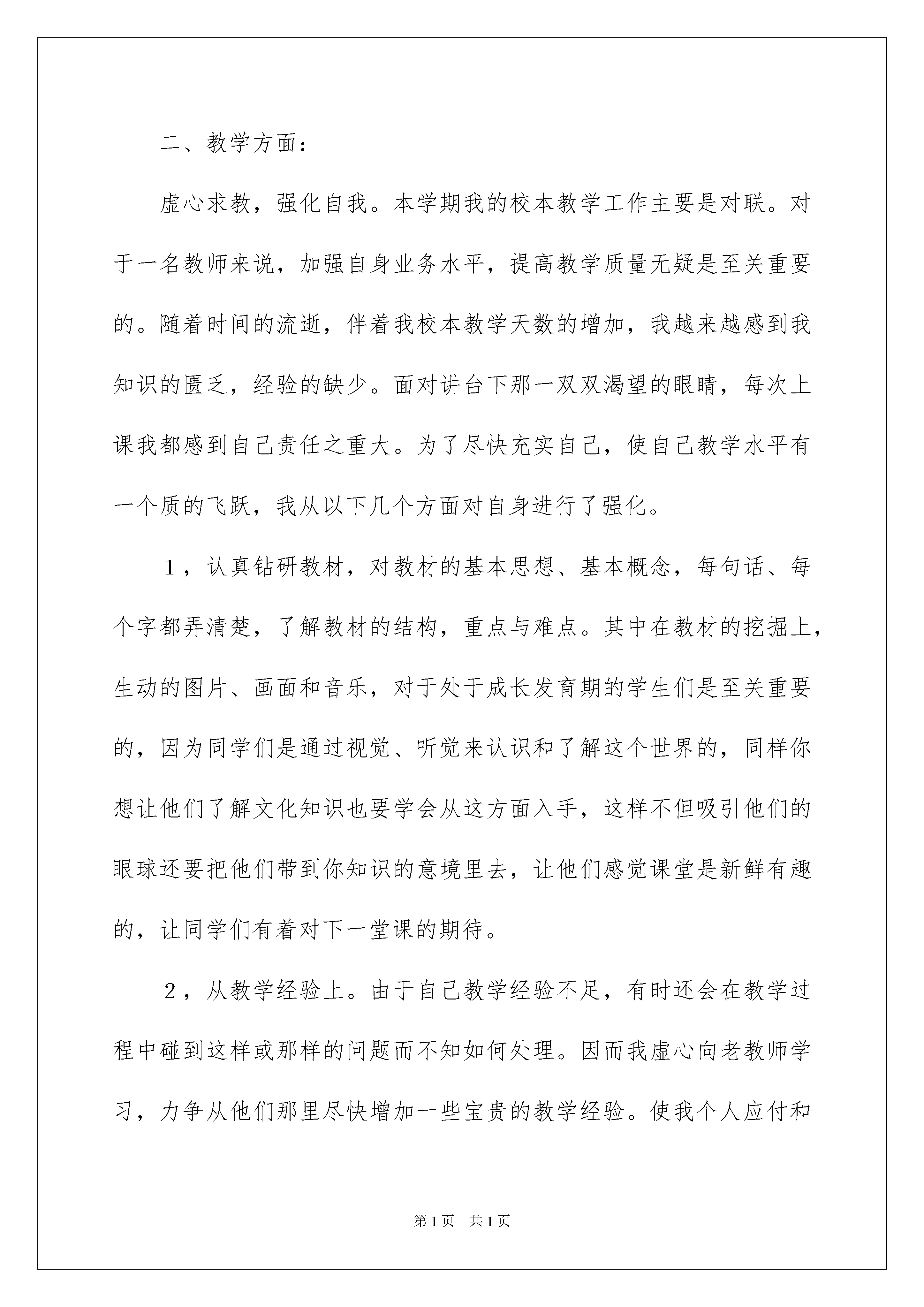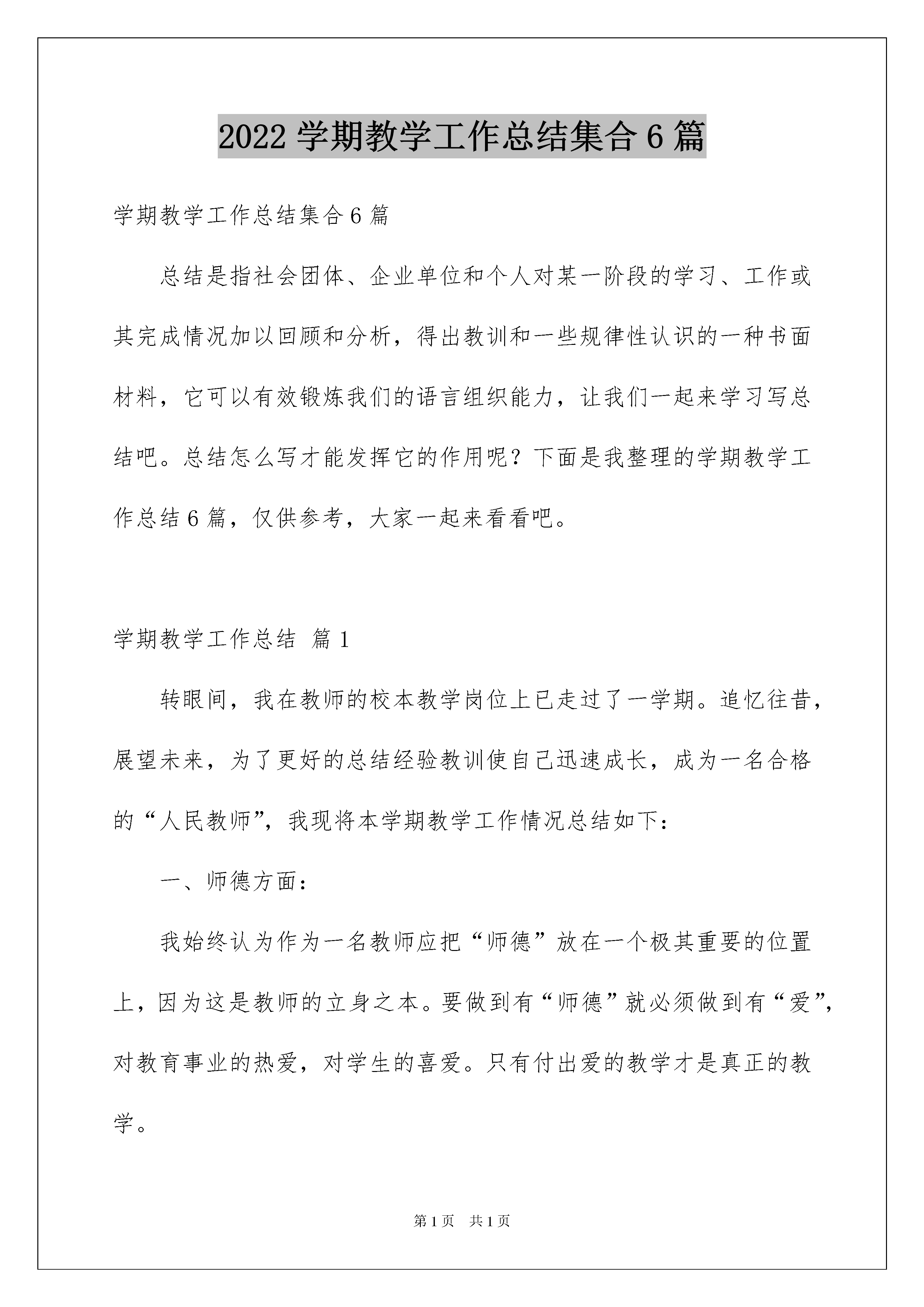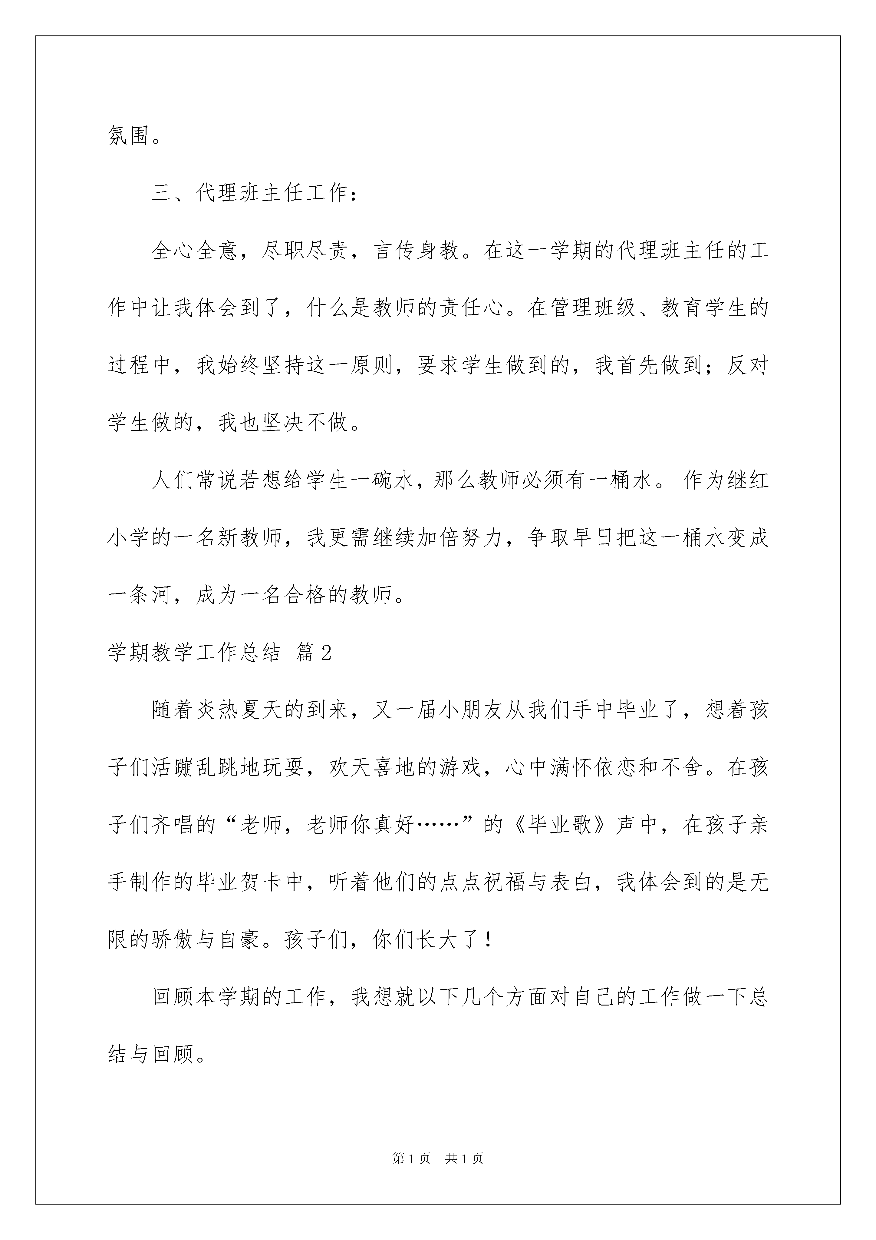 2022学期教学工作总结集合6篇学期教学工作总结集合6篇总结是指社会团体、企业单位和个人对某一阶段的学习、工作或其完成情况加以回顾和分析,得出教训和一些规律性认识的一种书面材料,它可以有效锻炼我们的语言组织能力,让我们一起来学习写总结吧。总结怎么写才能发挥它的作用呢?下面是我整理的学期教学工作总结6篇,仅供参考,大家一起来看看吧。学期教学工作总结篇1转眼间,我在教师的校本教学岗位上已走过了一学期。追忆往昔,展望未来,为了更好的总结经验教训使自己迅速成长,成为一名合格的“人民教师”,我现将本学期教学工作情况总结如下:一、师德方面:我始终认为作为一名教师应把“师德”放在一个极其重要的位置上,因为这是教师的立身之本。要做到有“师德”就必须做到有“爱”,对教育事业的热爱,对学生的喜爱。只有付出爱的教学才是真正的教学。二、教学方面:虚心求教,强化自我。本学期我的校本教学工作主要是对联。对于一名教师来说,加强自身业务水平,提高教学质量无疑是至关重要的。随着时间的流逝,伴着我校本教学天数的增加,我越来越感到我知识的匮乏,经验的缺少。面对讲台下那一双双渴望的眼睛,每次上课我都感到自己责任之重大。为了尽快充实自己,使自己教学水平有一个质的飞跃,我从以下几个方面对自身进行了强化。1,认真钻研教材,对教材的基本思想、基本概念,每句话、每个字都弄清楚,了解教材的结构,重点与难点。其中在教材的挖掘上,生动的图片、画面和音乐,对于处于成长发育期的学生们是至关重要的,因为同学们是通过视觉、听觉来认识和了解这个世界的,同样你想让他们了解文化知识也要学会从这方面入手,这样不但吸引他们的眼球还要把他们带到你知识的意境里去,让他们感觉课堂是新鲜有趣的,让同学们有着对下一堂课的期待。2,从教学经验上。由于自己教学经验不足,有时还会在教学过程中碰到这样或那样的问题而不知如何处理。因而我虚心向老教师学习,力争从他们那里尽快增加一些宝贵的教学经验。使我个人应付和处理课堂各式各样问题的能力有所增强。3,不耻下问,教学互长。从另一个角度来说,学生也是老师的“教师”。由于学生接受新知识快,接受信息多,因此我从和他们的交流中亦能丰富我的教学知识。4,讲课要达到生动、形象、深刻,不但要要求教师有丰富而广泛的知识,而且在课堂上教师的肢体语言是很重要的,你的举手投足之间都在吸引着同学们的注意力,他们的注意力集中了,课堂应有的效果自然就达到了,所以在课堂上老师不应该死板的站在一个位置,应该在恰当的时候做一些肢体语言的变动,以达到吸引同学们的注意力;我们的发声是要抑扬顿挫有升有降的,就像人们的情绪一样,作为老师我要带动的是学生的情绪,让他们的情绪和我的情绪产生共鸣,从而才能达到知识的共鸣。5,教师课堂评价语言应该克服表扬泛滥性、简单性、笼统性、频繁性;注意评价语言的急切性、随意性、冷漠性、浮夸性、武断性及评价方式呆板化。教师应尊重学生的理解和独特感受,以准确性的评价语言,让学生听得明白;以激励性的评价语言,激发学生的学习激情;以情感性的评价语言,营造宽松、和谐、富于人文气息的课堂氛围。三、代理班主任工作:全心全意,尽职尽责,言传身教。在这一学期的代理班主任的工作中让我体会到了,什么是教师的责任心。在管理班级、教育学生的过程中,我始终坚持这一原则,要求学生做到的,我首先做到;反对学生做的,我也坚决不做。人们常说若想给学生一碗水,那么教师必须有一桶水。作为继红小学的一名新教师,我更需继续加倍努力,争取早日把这一桶水变成一条河,成为一名合格的教师。学期教学工作总结篇2随着炎热夏天的到来,又一届小朋友从我们手中毕业了,想着孩子们活蹦乱跳地玩耍,欢天喜地的游戏,心中满怀依恋和不舍。在孩子们齐唱的“老师,老师你真好……”的《毕业歌》声中,在孩子亲手制作的毕业贺卡中,听着他们的点点祝福与表白,我体会到的是无限的骄傲与自豪。孩子们,你们长大了!回顾本学期的工作,我想就以下几个方面对自己的工作做一下总结与回顾。1、思想表现。从大的方面讲,我能爱国爱党,爱社会主义的教育事业,更爱自己的本质工作——幼儿教育。平时我能遵守园内的一切规章制度,不迟到早退,无病假事假现象发生。主动积极参加政治业务学习,认真做好学习摘记。对园内布置的工作任务不推委,尽自己的最大的努力保只质保量的完成。2、工作能力与实绩。首先,在工作中我能热爱关心每位孩子,根据孩子的年龄及个性特点,因材施教,因人而异地处理孩子在活动中的偶发事件。做到尊重孩子,用发展的眼光看待孩子,相信每个孩子都是优秀的。其次,我能主动配合主班施老师做好各项班级保教工作,积极开展主题教学,如:“神秘的海底世界”、“