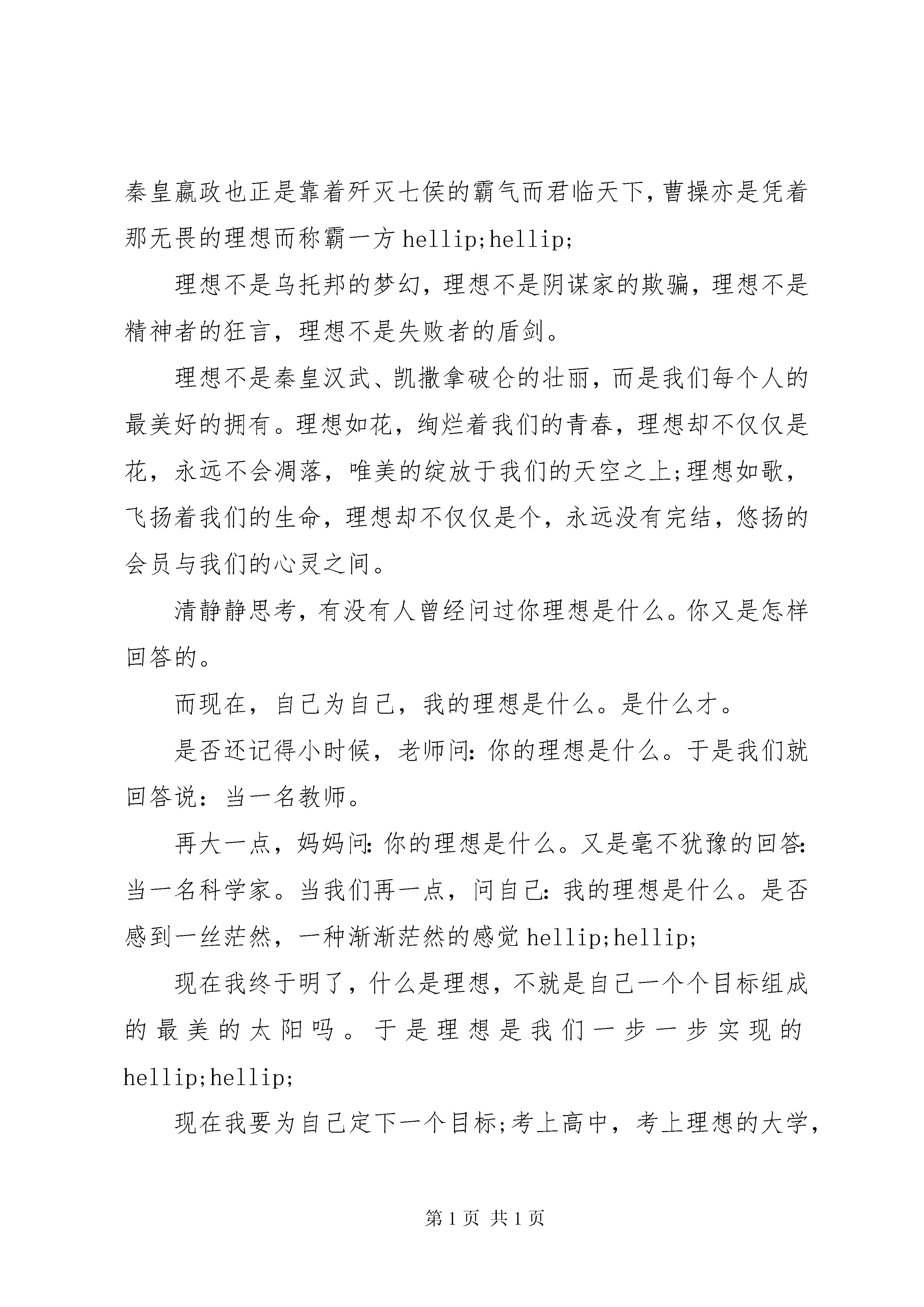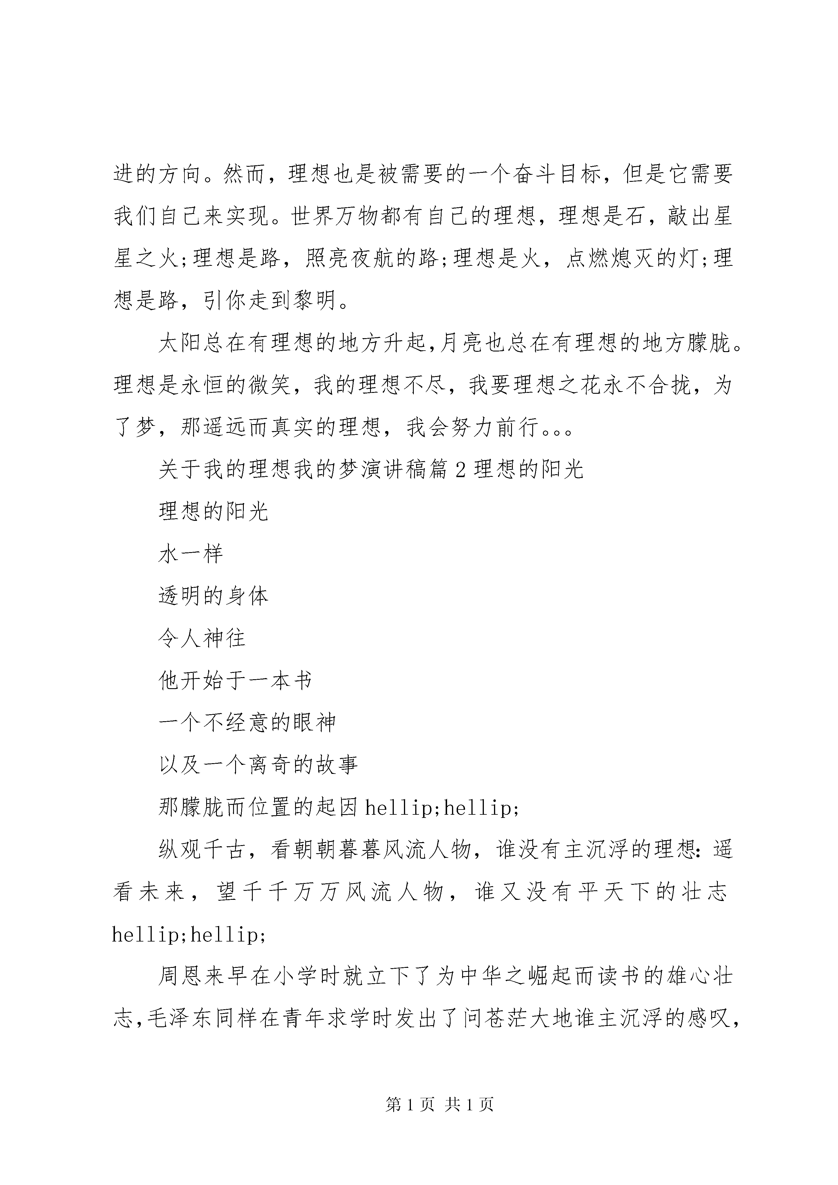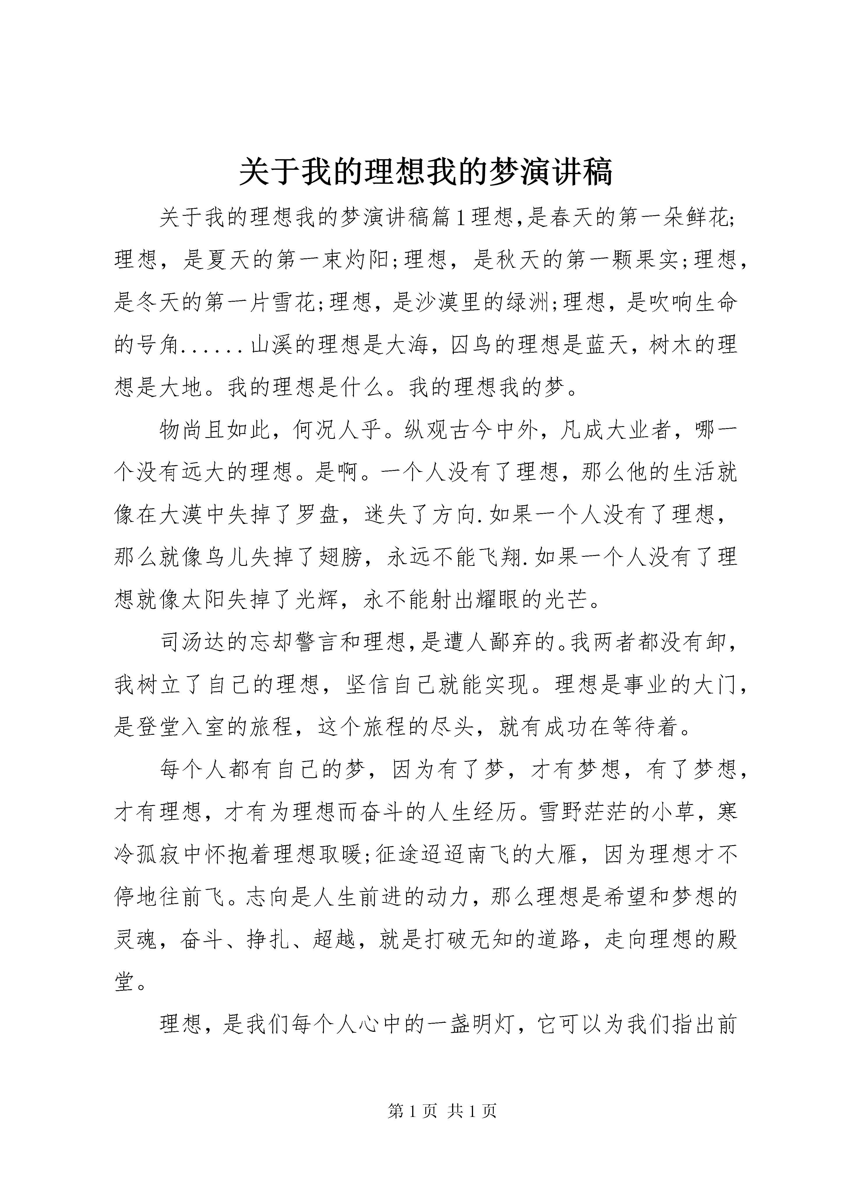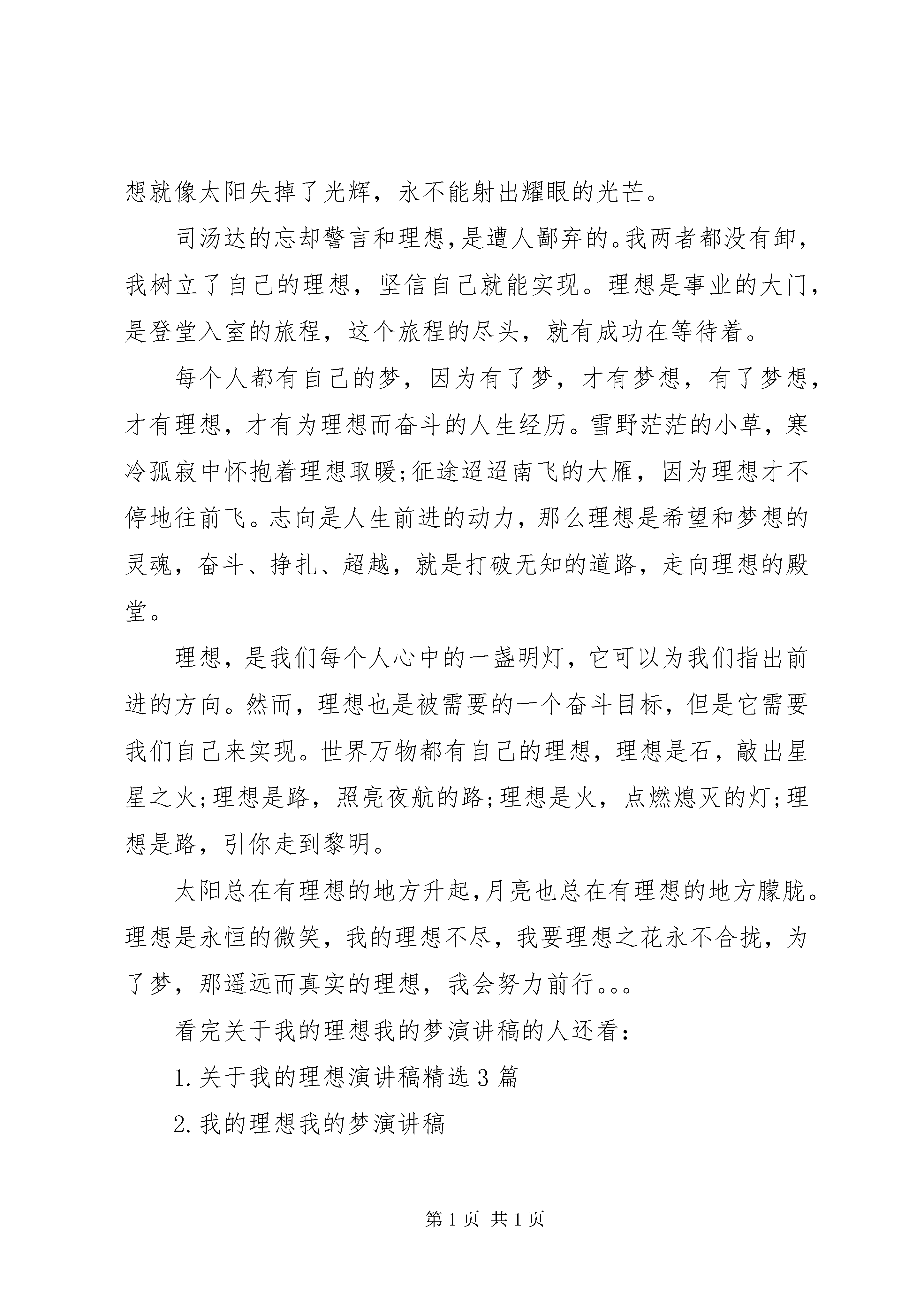 关于我的理想我的梦演讲稿关于我的理想我的梦演讲稿篇1理想,是春天的第一朵鲜花;理想,是夏天的第一束灼阳;理想,是秋天的第一颗果实;理想,是冬天的第一片雪花;理想,是沙漠里的绿洲;理想,是吹响生命的号角......山溪的理想是大海,囚鸟的理想是蓝天,树木的理想是大地。我的理想是什么。我的理想我的梦。物尚且如此,何况人乎。纵观古今中外,凡成大业者,哪一个没有远大的理想。是啊。一个人没有了理想,那么他的生活就像在大漠中失掉了罗盘,迷失了方向.如果一个人没有了理想,那么就像鸟儿失掉了翅膀,永远不能飞翔.如果一个人没有了理想就像太阳失掉了光辉,永不能射出耀眼的光芒。司汤达的忘却警言和理想,是遭人鄙弃的。我两者都没有卸,我树立了自己的理想,坚信自己就能实现。理想是事业的大门,是登堂入室的旅程,这个旅程的尽头,就有成功在等待着。每个人都有自己的梦,因为有了梦,才有梦想,有了梦想,才有理想,才有为理想而奋斗的人生经历。雪野茫茫的小草,寒冷孤寂中怀抱着理想取暖;征途迢迢南飞的大雁,因为理想才不停地往前飞。志向是人生前进的动力,那么理想是希望和梦想的灵魂,奋斗、挣扎、超越,就是打破无知的道路,走向理想的殿堂。理想,是我们每个人心中的一盏明灯,它可以为我们指出前进的方向。然而,理想也是被需要的一个奋斗目标,但是它需要我们自己来实现。世界万物都有自己的理想,理想是石,敲出星星之火;理想是路,照亮夜航的路;理想是火,点燃熄灭的灯;理想是路,引你走到黎明。太阳总在有理想的地方升起,月亮也总在有理想的地方朦胧。理想是永恒的微笑,我的理想不尽,我要理想之花永不合拢,为了梦,那遥远而真实的理想,我会努力前行。。。关于我的理想我的梦演讲稿篇2理想的阳光理想的阳光水一样透明的身体令人神往他开始于一本书一个不经意的眼神以及一个离奇的故事那朦胧而位置的起因hellip;hellip;纵观千古,看朝朝暮暮风流人物,谁没有主沉浮的理想:遥看未来,望千千万万风流人物,谁又没有平天下的壮志hellip;hellip;周恩来早在小学时就立下了为中华之崛起而读书的雄心壮志,毛泽东同样在青年求学时发出了问苍茫大地谁主沉浮的感叹,秦皇嬴政也正是靠着歼灭七侯的霸气而君临天下,曹操亦是凭着那无畏的理想而称霸一方hellip;hellip;理想不是乌托邦的梦幻,理想不是阴谋家的欺骗,理想不是精神者的狂言,理想不是失败者的盾剑。理想不是秦皇汉武、凯撒拿破仑的壮丽,而是我们每个人的最美好的拥有。理想如花,绚烂着我们的青春,理想却不仅仅是花,永远不会凋落,唯美的绽放于我们的天空之上;理想如歌,飞扬着我们的生命,理想却不仅仅是个,永远没有完结,悠扬的会员与我们的心灵之间。清静静思考,有没有人曾经问过你理想是什么。你又是怎样回答的。而现在,自己为自己,我的理想是什么。是什么才。是否还记得小时候,老师问:你的理想是什么。于是我们就回答说:当一名教师。再大一点,妈妈问:你的理想是什么。又是毫不犹豫的回答:当一名科学家。当我们再一点,问自己:我的理想是什么。是否感到一丝茫然,一种渐渐茫然的感觉hellip;hellip;现在我终于明了,什么是理想,不就是自己一个个目标组成的最美的太阳吗。于是理想是我们一步一步实现的hellip;hellip;现在我要为自己定下一个目标;考上高中,考上理想的大学,为此,我必须拼搏,尽全力拼搏,我要用现在的几年,换我未来的几十年,我相信,我可以,我同样相信,你们也可以,咱们都可以hellip;hellip;加油吧,为心中那最美的太阳,设立一个个目标,不断去实现,不断去突破,总有一天,你会发现你离那太阳是那么的近,触手可及似的近。相信,在将来的某一天,你会站在群山之巅俯视hellip;hellip;理想是灯,照亮前行的路,理想是路,引你走向黎明。加油为理想去拼搏hellip;hellip;关于我的理想我的梦演讲稿篇3理想,是春天的第一朵鲜花;理想,是夏天的第一束灼阳;理想,是秋天的第一颗果实;理想,是冬天的第一片雪花;理想,是沙漠里的绿洲;理想,是吹响生命的号角......山溪的理想是大海,囚鸟的理想是蓝天,树木的理想是大地。我的理想是什么。我的理想我的梦。物尚且如此,何况人乎。纵观古今中外,凡成大业者,哪一个没有远大的理想。是啊。一个人没有了理想,那么他的生活就像在大漠中失掉了罗盘,迷失了方向.如果一个人没有了理想,那么就像鸟儿失掉了翅膀,永远不能飞翔.如果一个人没有了理想就像太阳失掉了光辉,永不能射出耀眼的光芒。司汤达的忘却警言和理想,是遭人鄙弃的。我两者都没有卸,我树立了自己的理想,坚信自己就能实现。理想是事业的大门,是登堂入室的旅程,这个旅程的尽头,就有成功在等待着。每个人都有自己的梦,因为有了梦,才有梦想,有了梦想,才有理想,才有为理想而奋斗
