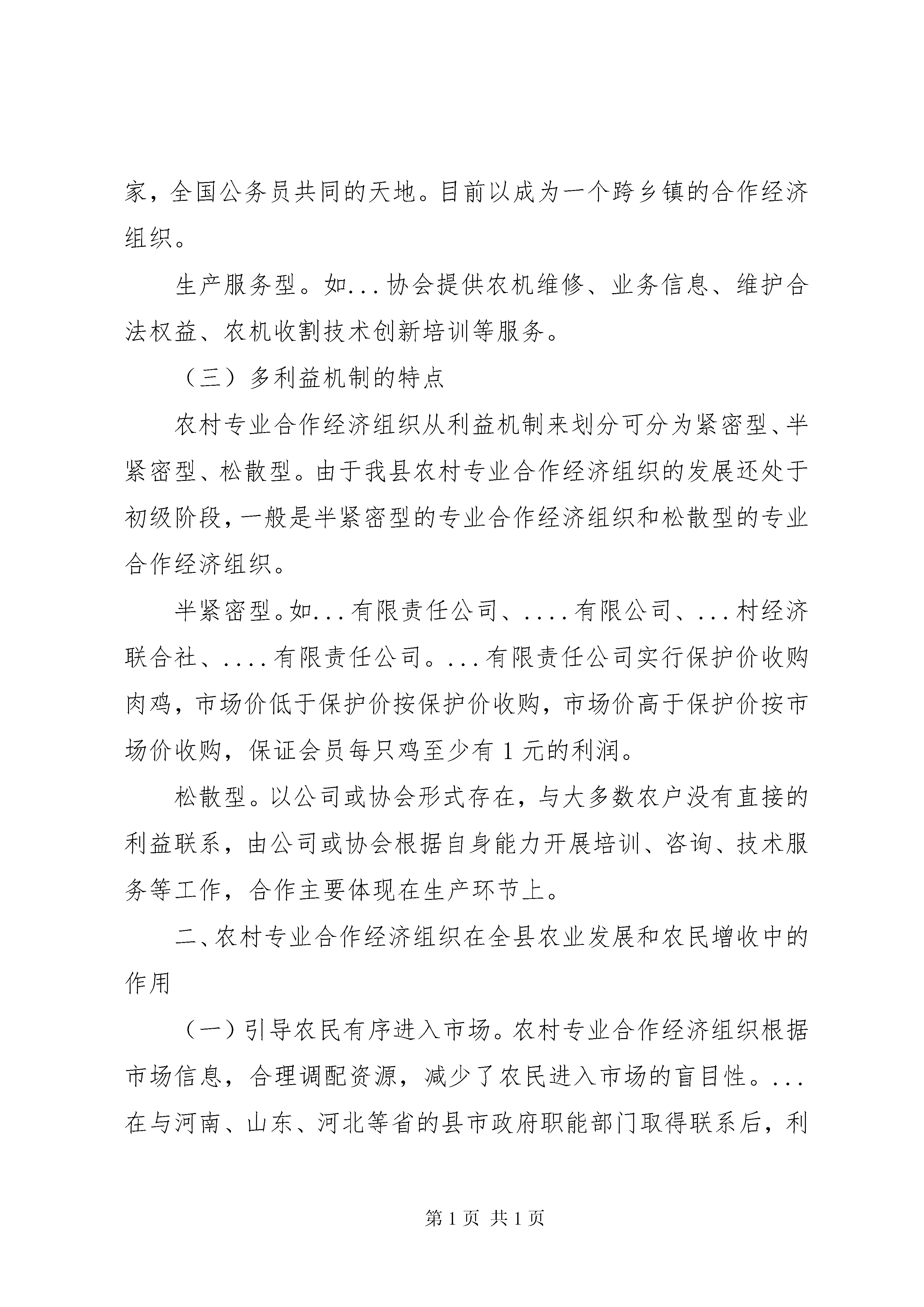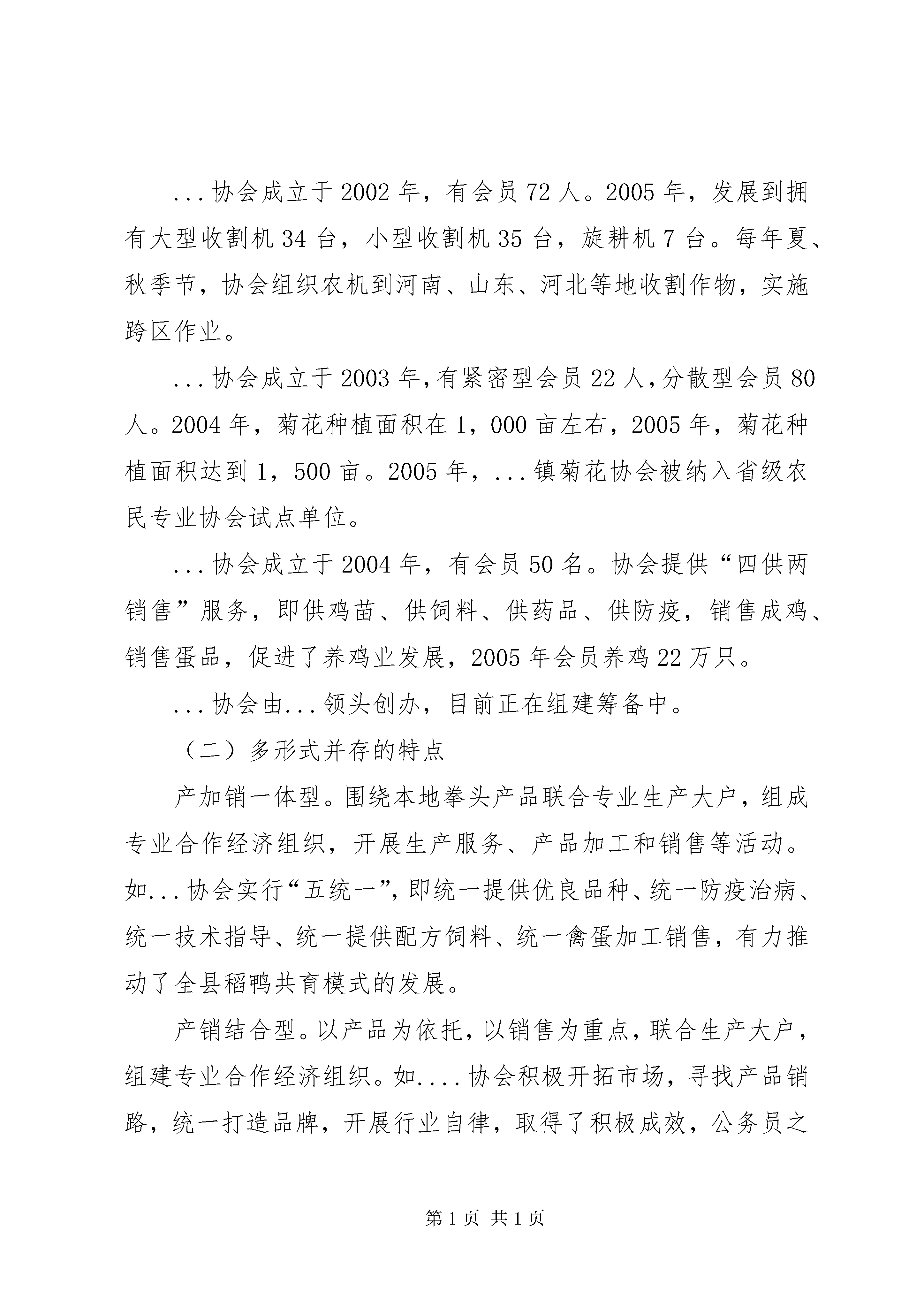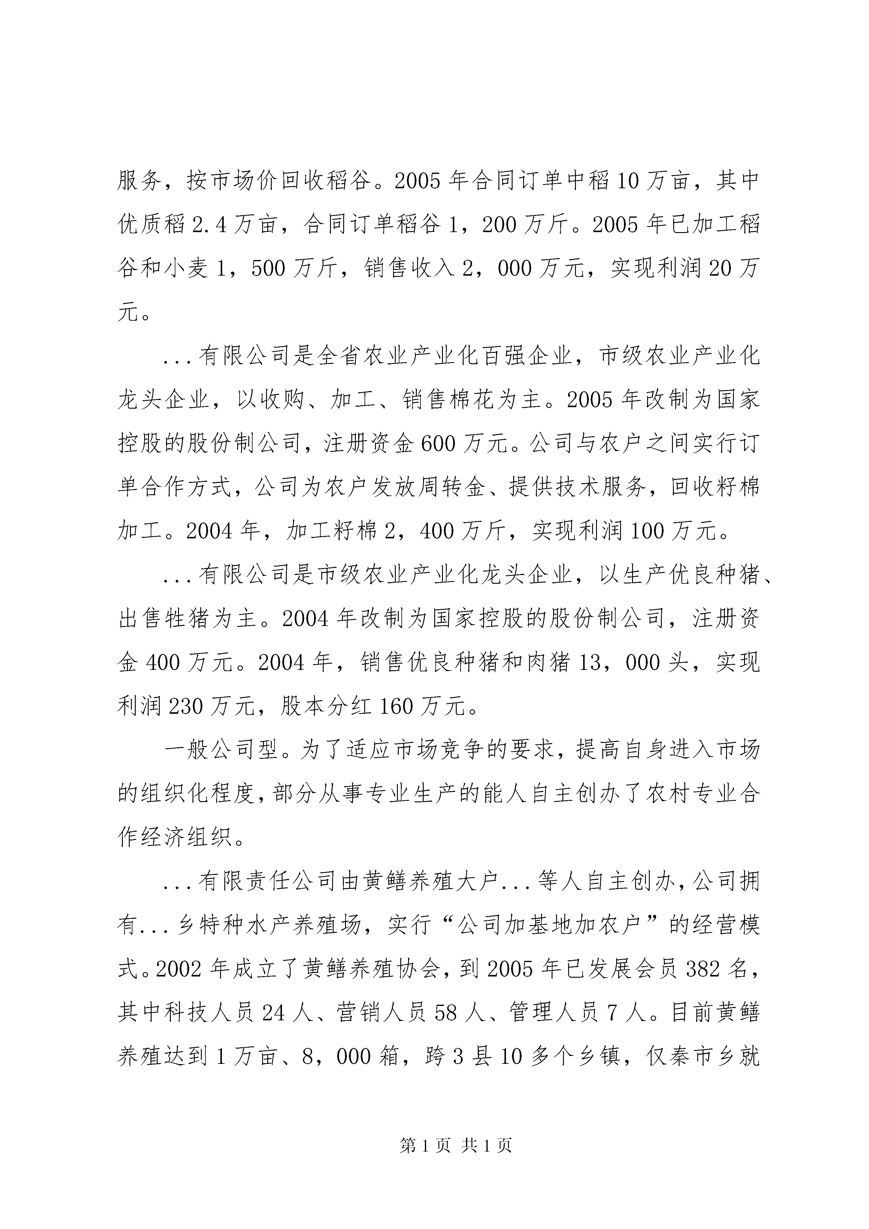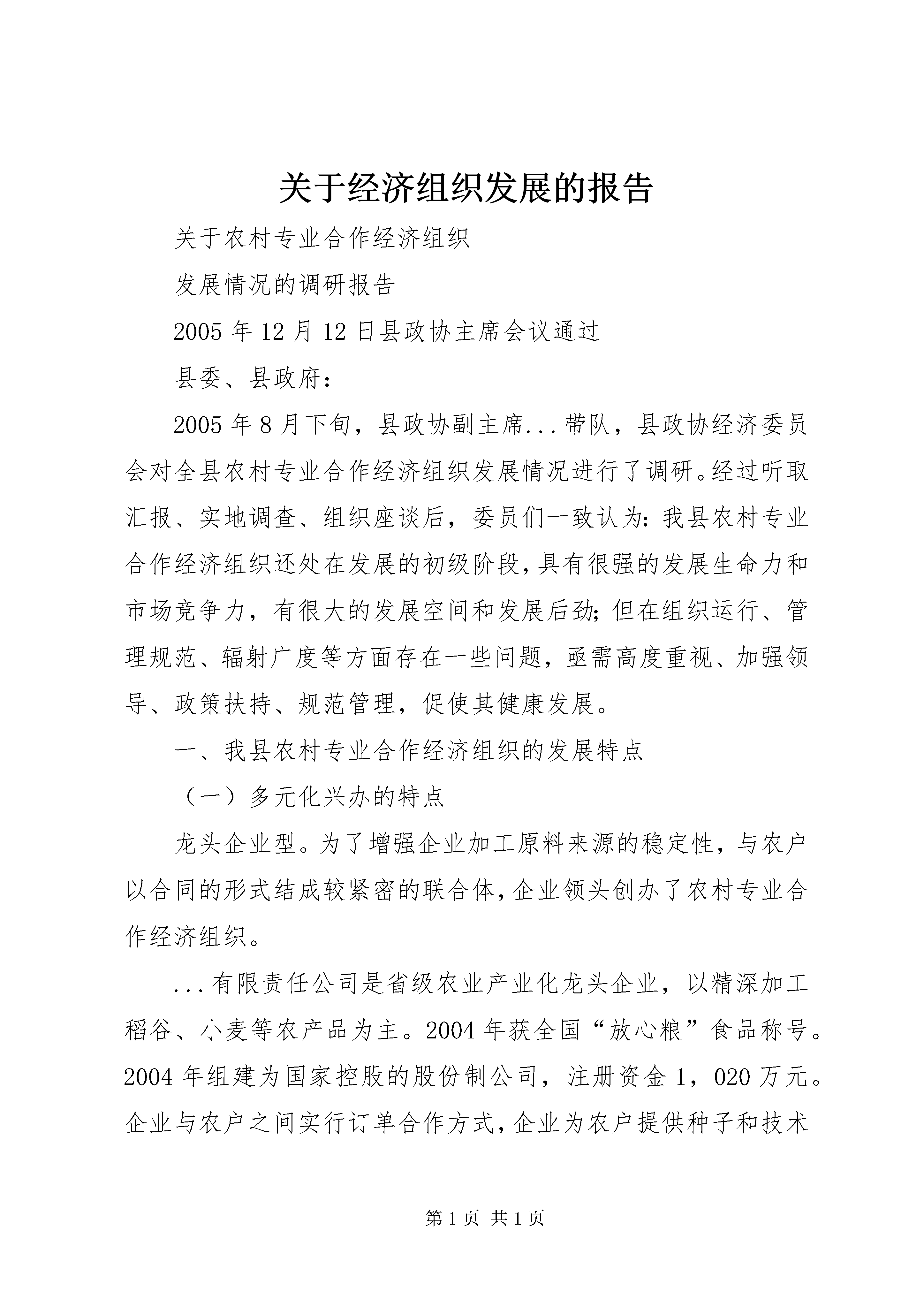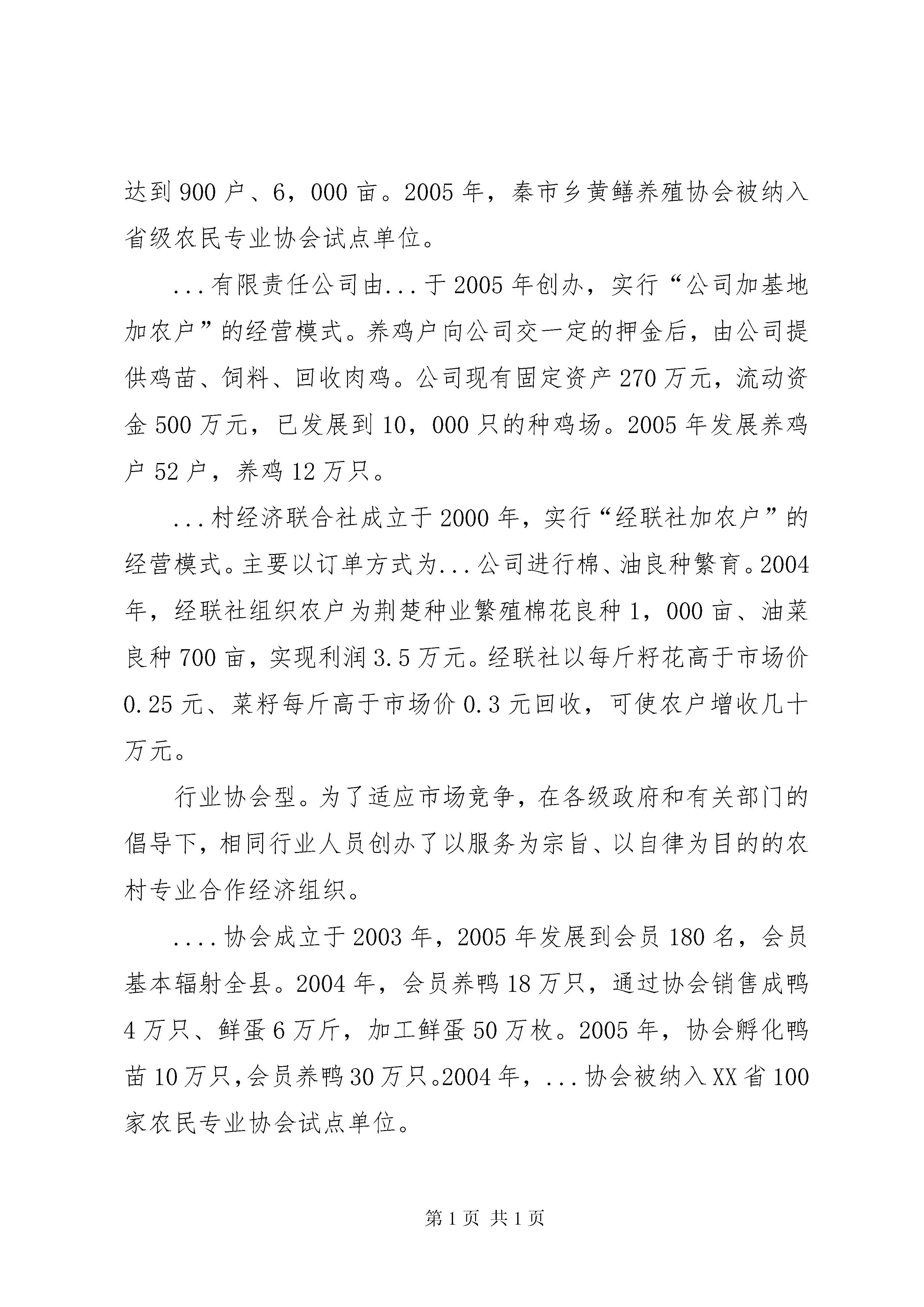 关于经济组织发展的报告关于农村专业合作经济组织发展情况的调研报告2005年12月12日县政协主席会议通过县委、县政府:2005年8月下旬,县政协副主席...带队,县政协经济委员会对全县农村专业合作经济组织发展情况进行了调研。经过听取汇报、实地调查、组织座谈后,委员们一致认为:我县农村专业合作经济组织还处在发展的初级阶段,具有很强的发展生命力和市场竞争力,有很大的发展空间和发展后劲;但在组织运行、管理规范、辐射广度等方面存在一些问题,亟需高度重视、加强领导、政策扶持、规范管理,促使其健康发展。一、我县农村专业合作经济组织的发展特点(一)多元化兴办的特点龙头企业型。为了增强企业加工原料来源的稳定性,与农户以合同的形式结成较紧密的联合体,企业领头创办了农村专业合作经济组织。...有限责任公司是省级农业产业化龙头企业,以精深加工稻谷、小麦等农产品为主。2004年获全国“放心粮”食品称号。2004年组建为国家控股的股份制公司,注册资金1,020万元。企业与农户之间实行订单合作方式,企业为农户提供种子和技术服务,按市场价回收稻谷。2005年合同订单中稻10万亩,其中优质稻2.4万亩,合同订单稻谷1,200万斤。2005年已加工稻谷和小麦1,500万斤,销售收入2,000万元,实现利润20万元。...有限公司是全省农业产业化百强企业,市级农业产业化龙头企业,以收购、加工、销售棉花为主。2005年改制为国家控股的股份制公司,注册资金600万元。公司与农户之间实行订单合作方式,公司为农户发放周转金、提供技术服务,回收籽棉加工。2004年,加工籽棉2,400万斤,实现利润100万元。...有限公司是市级农业产业化龙头企业,以生产优良种猪、出售牲猪为主。2004年改制为国家控股的股份制公司,注册资金400万元。2004年,销售优良种猪和肉猪13,000头,实现利润230万元,股本分红160万元。一般公司型。为了适应市场竞争的要求,提高自身进入市场的组织化程度,部分从事专业生产的能人自主创办了农村专业合作经济组织。...有限责任公司由黄鳝养殖大户...等人自主创办,公司拥有...乡特种水产养殖场,实行“公司加基地加农户”的经营模式。2002年成立了黄鳝养殖协会,到2005年已发展会员382名,其中科技人员24人、营销人员58人、管理人员7人。目前黄鳝养殖达到1万亩、8,000箱,跨3县10多个乡镇,仅秦市乡就达到900户、6,000亩。2005年,秦市乡黄鳝养殖协会被纳入省级农民专业协会试点单位。...有限责任公司由...于2005年创办,实行“公司加基地加农户”的经营模式。养鸡户向公司交一定的押金后,由公司提供鸡苗、饲料、回收肉鸡。公司现有固定资产270万元,流动资金500万元,已发展到10,000只的种鸡场。2005年发展养鸡户52户,养鸡12万只。...村经济联合社成立于2000年,实行“经联社加农户”的经营模式。主要以订单方式为...公司进行棉、油良种繁育。2004年,经联社组织农户为荆楚种业繁殖棉花良种1,000亩、油菜良种700亩,实现利润3.5万元。经联社以每斤籽花高于市场价0.25元、菜籽每斤高于市场价0.3元回收,可使农户增收几十万元。行业协会型。为了适应市场竞争,在各级政府和有关部门的倡导下,相同行业人员创办了以服务为宗旨、以自律为目的的农村专业合作经济组织。....协会成立于2003年,2005年发展到会员180名,会员基本辐射全县。2004年,会员养鸭18万只,通过协会销售成鸭4万只、鲜蛋6万斤,加工鲜蛋50万枚。2005年,协会孵化鸭苗10万只,会员养鸭30万只。2004年,...协会被纳入XX省100家农民专业协会试点单位。...协会成立于2002年,有会员72人。2005年,发展到拥有大型收割机34台,小型收割机35台,旋耕机7台。每年夏、秋季节,协会组织农机到河南、山东、河北等地收割作物,实施跨区作业。...协会成立于2003年,有紧密型会员22人,分散型会员80人。2004年,菊花种植面积在1,000亩左右,2005年,菊花种植面积达到1,500亩。2005年,...镇菊花协会被纳入省级农民专业协会试点单位。...协会成立于2004年,有会员50名。协会提供“四供两销售”服务,即供鸡苗、供饲料、供药品、供防疫,销售成鸡、销售蛋品,促进了养鸡业发展,2005年会员养鸡22万只。...协会由...领头创办,目前正在组建筹备中。(二)多形式并存的特点产加销一体型。围绕本地拳头产品联合专业生产大户,组成专业合作经济组织,开展生产服务、产品加工和销售等活动。如...协会实行“五统一”,即统一提供优良品种、统一防疫治病、统一技术指导、统一提供配方饲料、统一禽蛋加工销售,有力推动了全县稻鸭共育模式的发展。