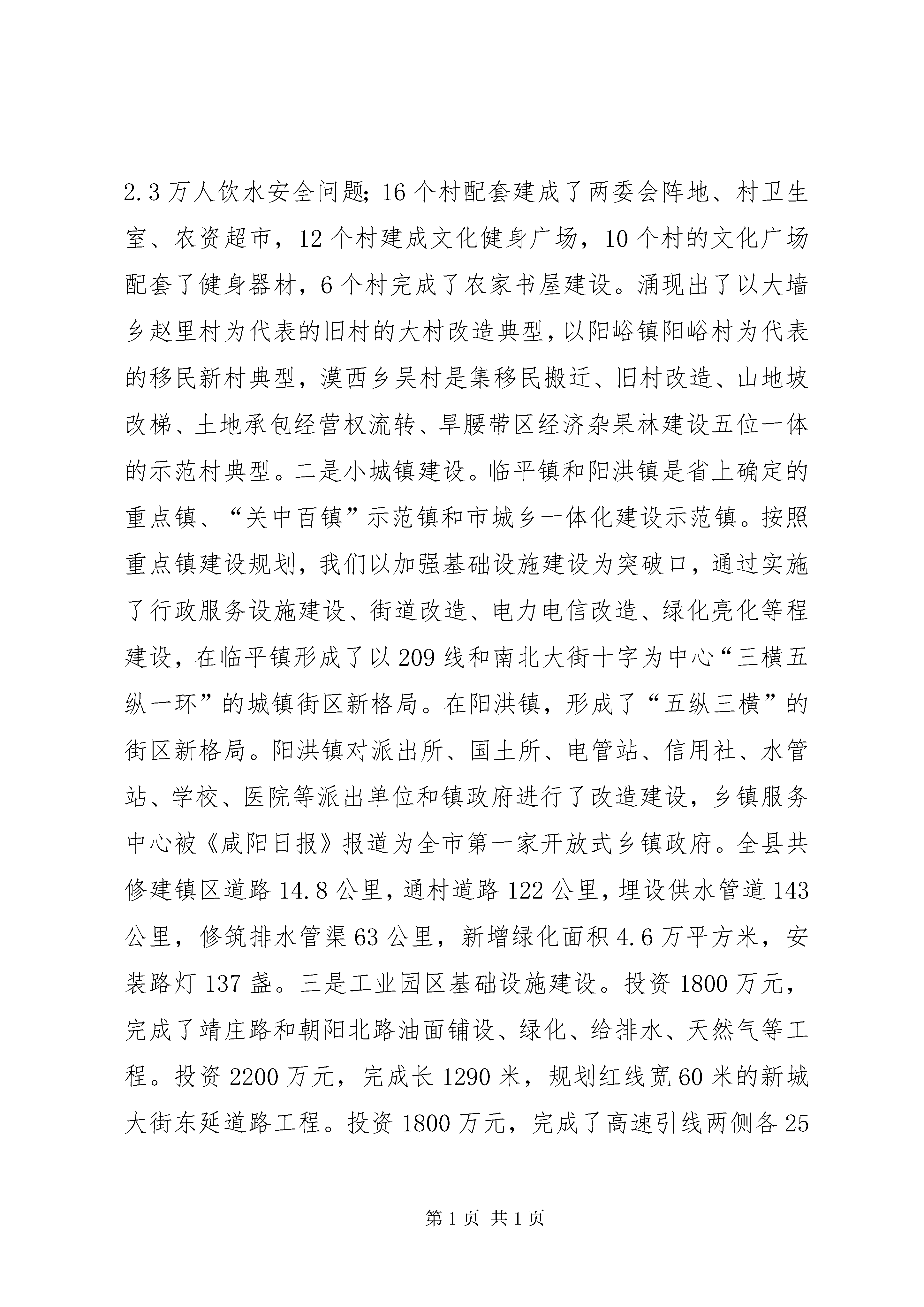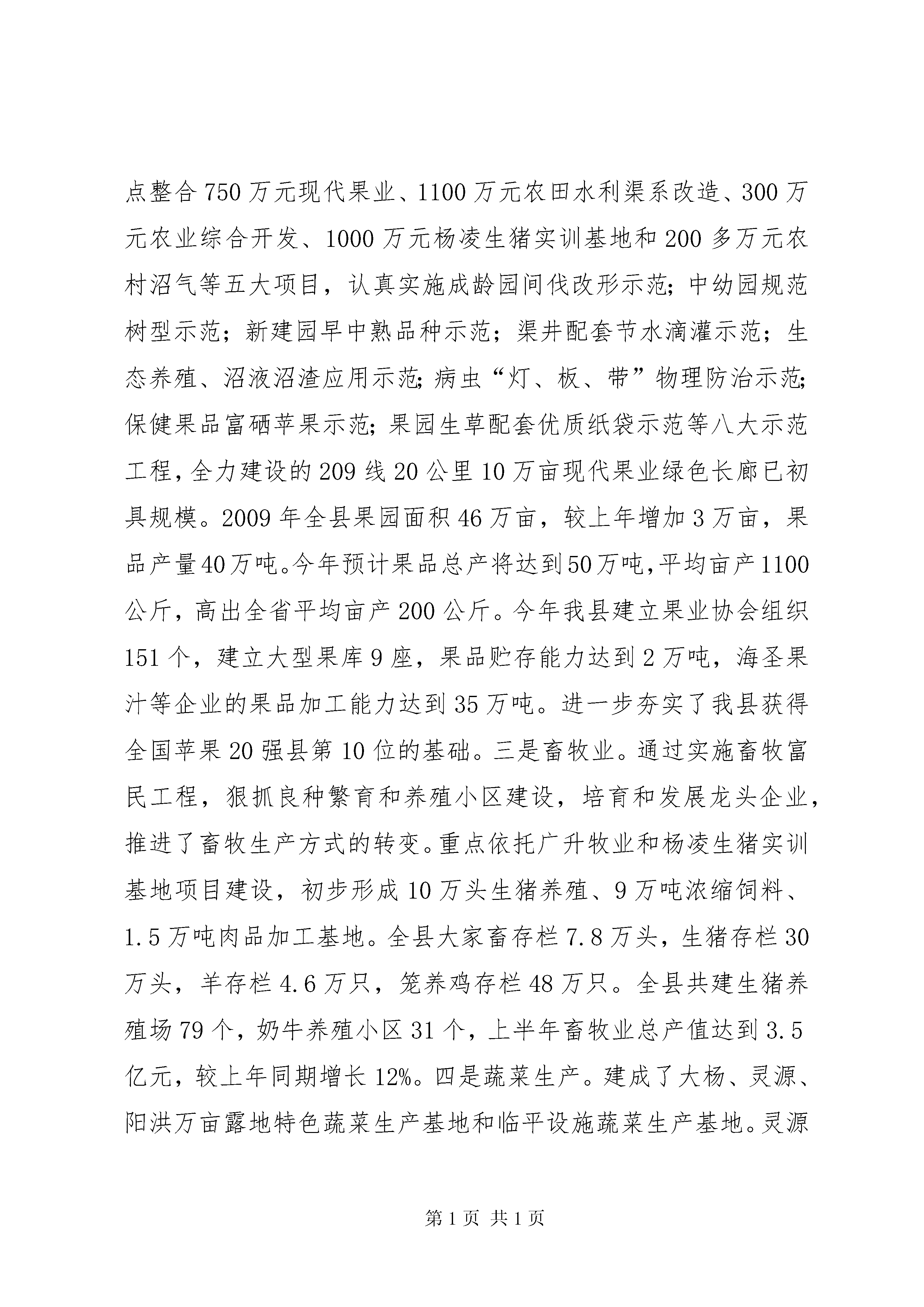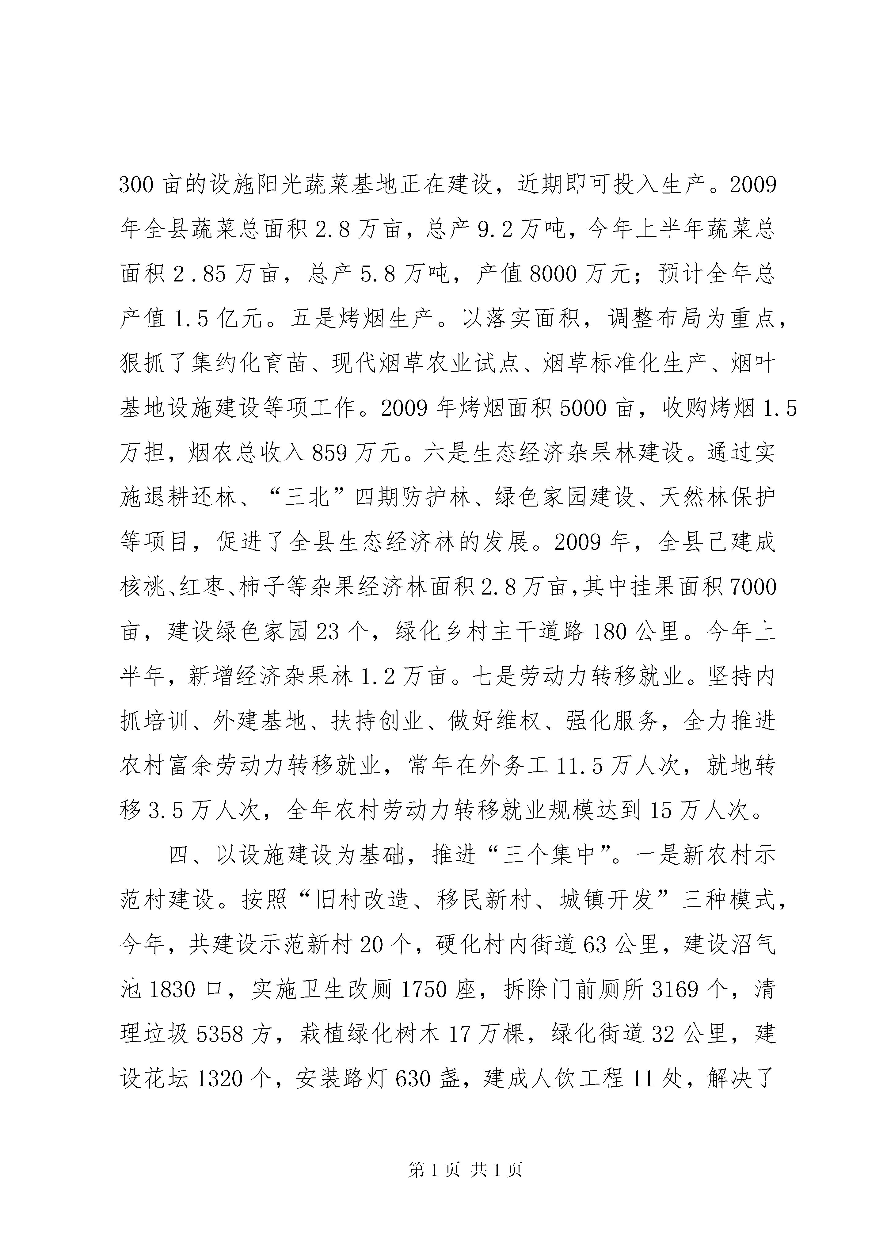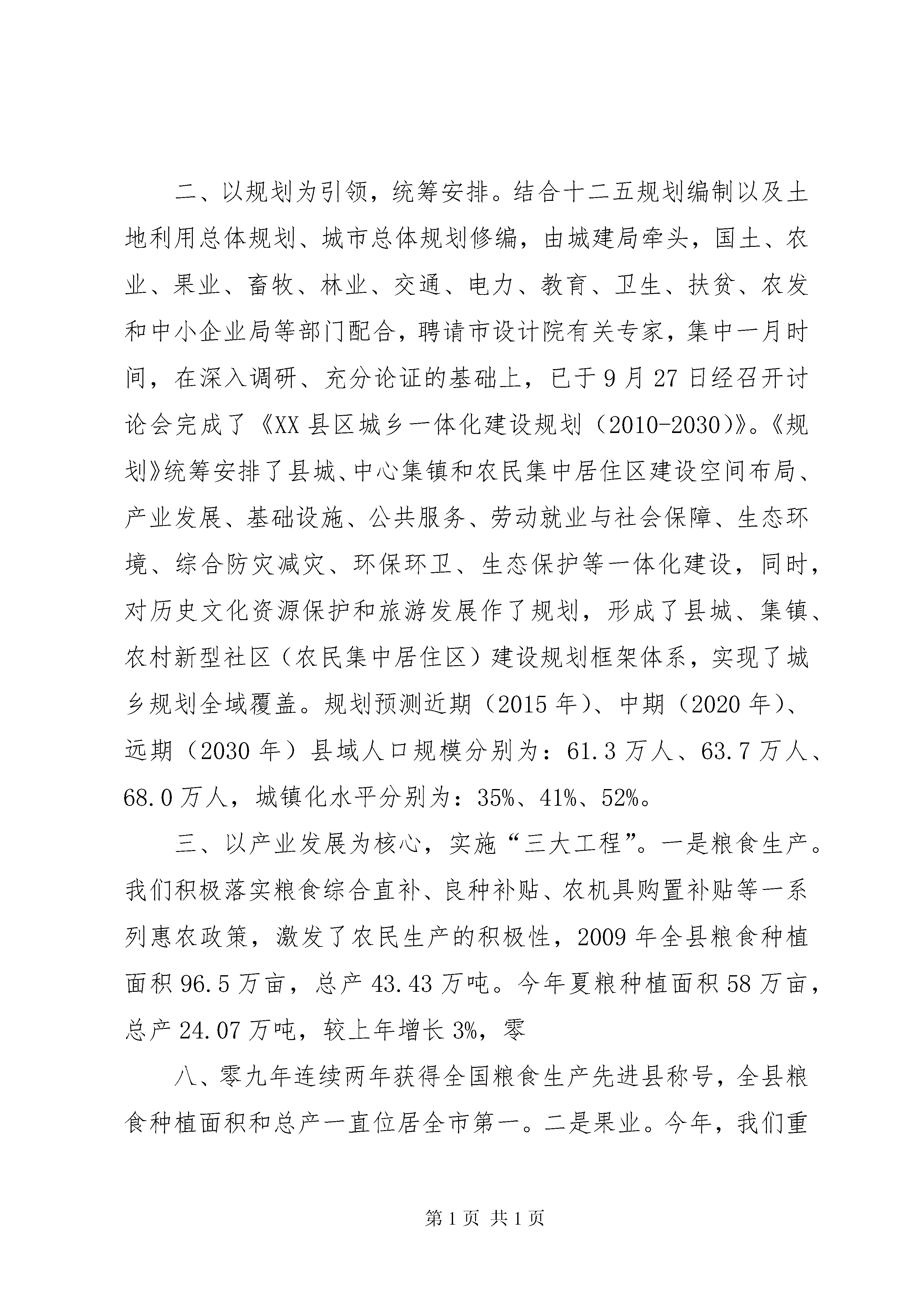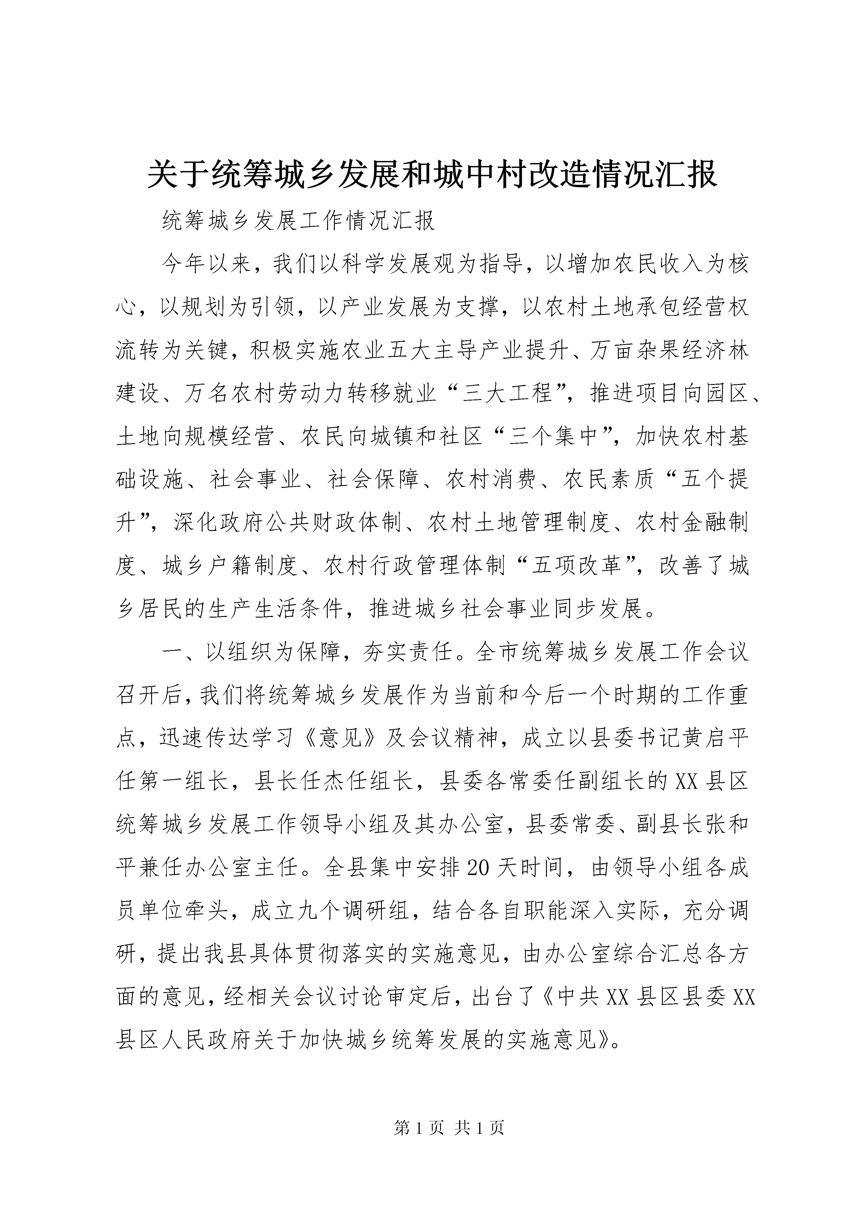 关于统筹城乡发展和城中村改造情况汇报统筹城乡发展工作情况汇报今年以来,我们以科学发展观为指导,以增加农民收入为核心,以规划为引领,以产业发展为支撑,以农村土地承包经营权流转为关键,积极实施农业五大主导产业提升、万亩杂果经济林建设、万名农村劳动力转移就业“三大工程”,推进项目向园区、土地向规模经营、农民向城镇和社区“三个集中”,加快农村基础设施、社会事业、社会保障、农村消费、农民素质“五个提升”,深化政府公共财政体制、农村土地管理制度、农村金融制度、城乡户籍制度、农村行政管理体制“五项改革”,改善了城乡居民的生产生活条件,推进城乡社会事业同步发展。一、以组织为保障,夯实责任。全市统筹城乡发展工作会议召开后,我们将统筹城乡发展作为当前和今后一个时期的工作重点,迅速传达学习《意见》及会议精神,成立以县委书记黄启平任第一组长,县长任杰任组长,县委各常委任副组长的XX县区统筹城乡发展工作领导小组及其办公室,县委常委、副县长张和平兼任办公室主任。全县集中安排20天时间,由领导小组各成员单位牵头,成立九个调研组,结合各自职能深入实际,充分调研,提出我县具体贯彻落实的实施意见,由办公室综合汇总各方面的意见,经相关会议讨论审定后,出台了《中共XX县区县委XX县区人民政府关于加快城乡统筹发展的实施意见》。二、以规划为引领,统筹安排。结合十二五规划编制以及土地利用总体规划、城市总体规划修编,由城建局牵头,国土、农业、果业、畜牧、林业、交通、电力、教育、卫生、扶贫、农发和中小企业局等部门配合,聘请市设计院有关专家,集中一月时间,在深入调研、充分论证的基础上,已于9月27日经召开讨论会完成了《XX县区城乡一体化建设规划(2010-2030)》。《规划》统筹安排了县城、中心集镇和农民集中居住区建设空间布局、产业发展、基础设施、公共服务、劳动就业与社会保障、生态环境、综合防灾减灾、环保环卫、生态保护等一体化建设,同时,对历史文化资源保护和旅游发展作了规划,形成了县城、集镇、农村新型社区(农民集中居住区)建设规划框架体系,实现了城乡规划全域覆盖。规划预测近期(2015年)、中期(2020年)、远期(2030年)县域人口规模分别为:61.3万人、63.7万人、68.0万人,城镇化水平分别为:35%、41%、52%。三、以产业发展为核心,实施“三大工程”。一是粮食生产。我们积极落实粮食综合直补、良种补贴、农机具购置补贴等一系列惠农政策,激发了农民生产的积极性,2009年全县粮食种植面积96.5万亩,总产43.43万吨。今年夏粮种植面积58万亩,总产24.07万吨,较上年增长3%,零八、零九年连续两年获得全国粮食生产先进县称号,全县粮食种植面积和总产一直位居全市第一。二是果业。今年,我们重点整合750万元现代果业、1100万元农田水利渠系改造、300万元农业综合开发、1000万元杨凌生猪实训基地和200多万元农村沼气等五大项目,认真实施成龄园间伐改形示范;中幼园规范树型示范;新建园早中熟品种示范;渠井配套节水滴灌示范;生态养殖、沼液沼渣应用示范;病虫“灯、板、带”物理防治示范;保健果品富硒苹果示范;果园生草配套优质纸袋示范等八大示范工程,全力建设的209线20公里10万亩现代果业绿色长廊已初具规模。2009年全县果园面积46万亩,较上年增加3万亩,果品产量40万吨。今年预计果品总产将达到50万吨,平均亩产1100公斤,高出全省平均亩产200公斤。今年我县建立果业协会组织151个,建立大型果库9座,果品贮存能力达到2万吨,海圣果汁等企业的果品加工能力达到35万吨。进一步夯实了我县获得全国苹果20强县第10位的基础。三是畜牧业。通过实施畜牧富民工程,狠抓良种繁育和养殖小区建设,培育和发展龙头企业,推进了畜牧生产方式的转变。重点依托广升牧业和杨凌生猪实训基地项目建设,初步形成10万头生猪养殖、9万吨浓缩饲料、1.5万吨肉品加工基地。全县大家畜存栏7.8万头,生猪存栏30万头,羊存栏4.6万只,笼养鸡存栏48万只。全县共建生猪养殖场79个,奶牛养殖小区31个,上半年畜牧业总产值达到3.5亿元,较上年同期增长12%。四是蔬菜生产。建成了大杨、灵源、阳洪万亩露地特色蔬菜生产基地和临平设施蔬菜生产基地。灵源300亩的设施阳光蔬菜基地正在建设,近期即可投入生产。2009年全县蔬菜总面积2.8万亩,总产9.2万吨,今年上半年蔬菜总面积2.85万亩,总产5.8万吨,产值8000万元;预计全年总产值1.5亿元。五是烤烟生产。以落实面积,调整布局为重点,狠抓了集约化育苗、现代烟草农业试点、烟草标准化生产、烟叶基地设施建设等项工作。2009年烤烟面积5000亩,收购烤烟1.5万担,烟农总收入859万元。六是生态经济杂果林建设。通过实施退耕还林、“三北”四期防护林、