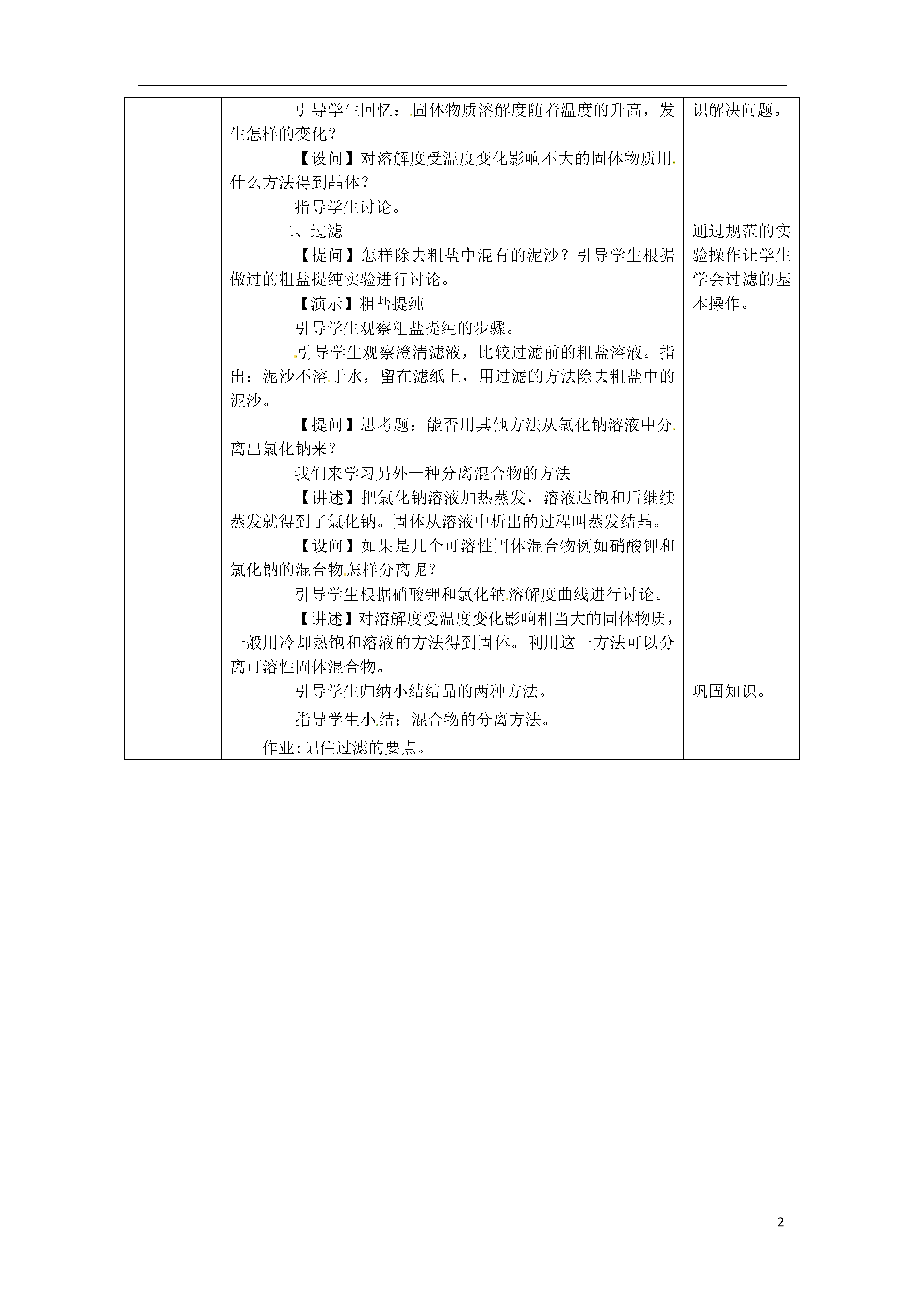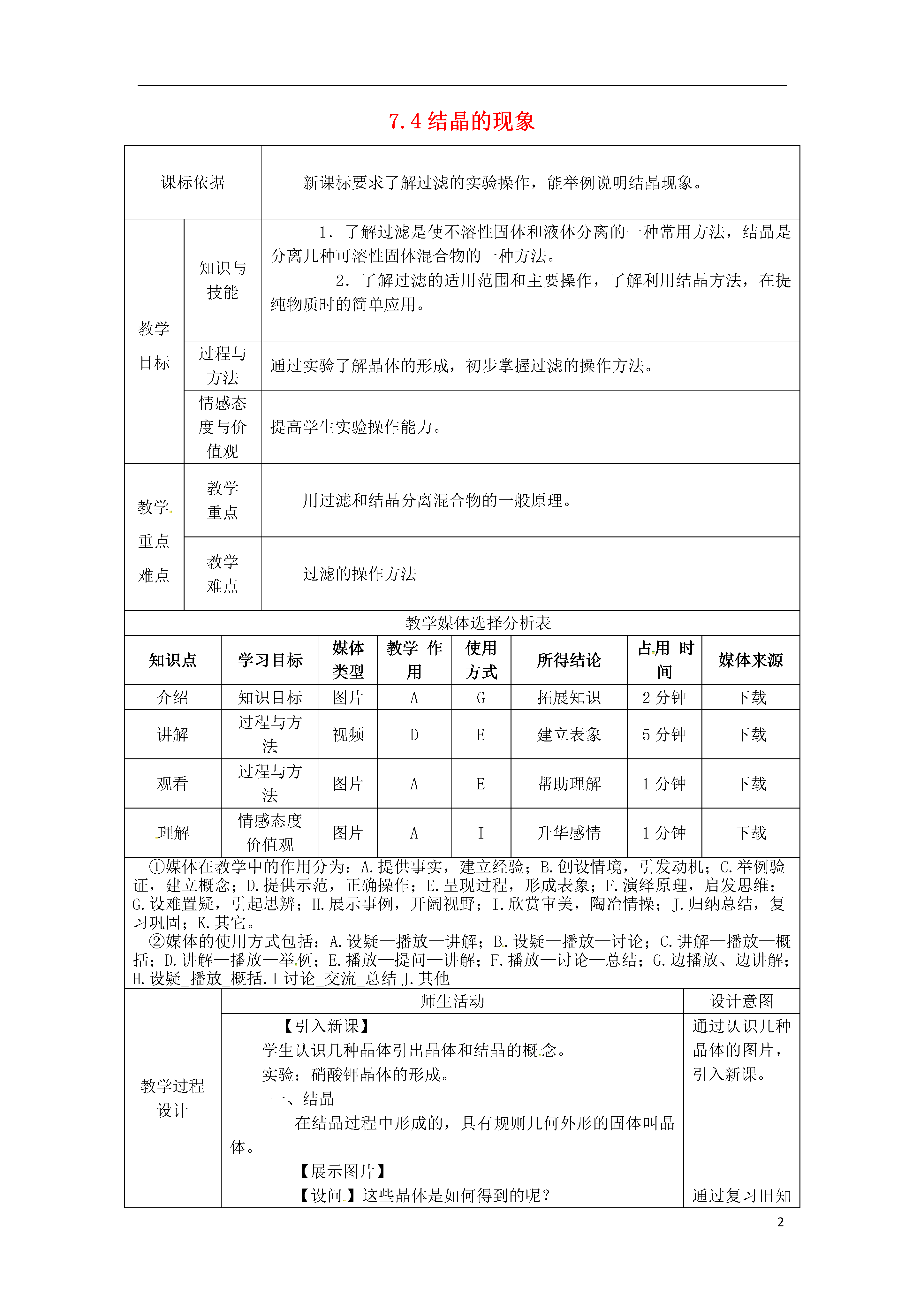 27.4结晶的现象课标依据新课标要求了解过滤的实验操作,能举例说明结晶现象。教学目标知识与技能1.了解过滤是使不溶性固体和液体分离的一种常用方法,结晶是分离几种可溶性固体混合物的一种方法。2.了解过滤的适用范围和主要操作,了解利用结晶方法,在提纯物质时的简单应用。过程与方法通过实验了解晶体的形成,初步掌握过滤的操作方法。情感态度与价值观提高学生实验操作能力。教学重点难点教学重点用过滤和结晶分离混合物的一般原理。教学难点过滤的操作方法教学媒体选择分析表知识点学习目标媒体类型教学作用使用方式所得结论占用时间媒体来源介绍知识目标图片AG拓展知识2分钟下载讲解过程与方法视频DE建立表象5分钟下载观看过程与方法图片AE帮助理解1分钟下载理解情感态度价值观图片AI升华感情1分钟下载①媒体在教学中的作用分为:A.提供事实,建立经验;B.创设情境,引发动机;C.举例验证,建立概念;D.提供示范,正确操作;E.呈现过程,形成表象;F.演绎原理,启发思维;G.设难置疑,引起思辨;H.展示事例,开阔视野;I.欣赏审美,陶冶情操;J.归纳总结,复习巩固;K.其它。②媒体的使用方式包括:A.设疑—播放—讲解;B.设疑—播放—讨论;C.讲解—播放—概括;D.讲解—播放—举例;E.播放—提问—讲解;F.播放—讨论—总结;G.边播放、边讲解;H.设疑_播放_概括.I讨论_交流_总结J.其他教学过程设计师生活动设计意图【引入新课】学生认识几种晶体引出晶体和结晶的概念。实验:硝酸钾晶体的形成。一、结晶在结晶过程中形成的,具有规则几何外形的固体叫晶体。【展示图片】【设问】这些晶体是如何得到的呢?引导学生回忆:固体物质溶解度随着温度的升高,发生怎样的变化?【设问】对溶解度受温度变化影响不大的固体物质用什么方法得到晶体?指导学生讨论。二、过滤【提问】怎样除去粗盐中混有的泥沙?引导学生根据做过的粗盐提纯实验进行讨论。【演示】粗盐提纯引导学生观察粗盐提纯的步骤。引导学生观察澄清滤液,比较过滤前的粗盐溶液。指出:泥沙不溶于水,留在滤纸上,用过滤的方法除去粗盐中的泥沙。【提问】思考题:能否用其他方法从氯化钠溶液中分离出氯化钠来?我们来学习另外一种分离混合物的方法【讲述】把氯化钠溶液加热蒸发,溶液达饱和后继续蒸发就得到了氯化钠。固体从溶液中析出的过程叫蒸发结晶。【设问】如果是几个可溶性固体混合物例如硝酸钾和氯化钠的混合物怎样分离呢?引导学生根据硝酸钾和氯化钠溶解度曲线进行讨论。【讲述】对溶解度受温度变化影响相当大的固体物质,一般用冷却热饱和溶液的方法得到固体。利用这一方法可以分离可溶性固体混合物。引导学生归纳小结结晶的两种方法。指导学生小结:混合物的分离方法。作业:记住过滤的要点。通过认识几种晶体的图片,引入新课。通过复习旧知识解决问题。通过规范的实验操作让学生学会过滤的基本操作。巩固知识。