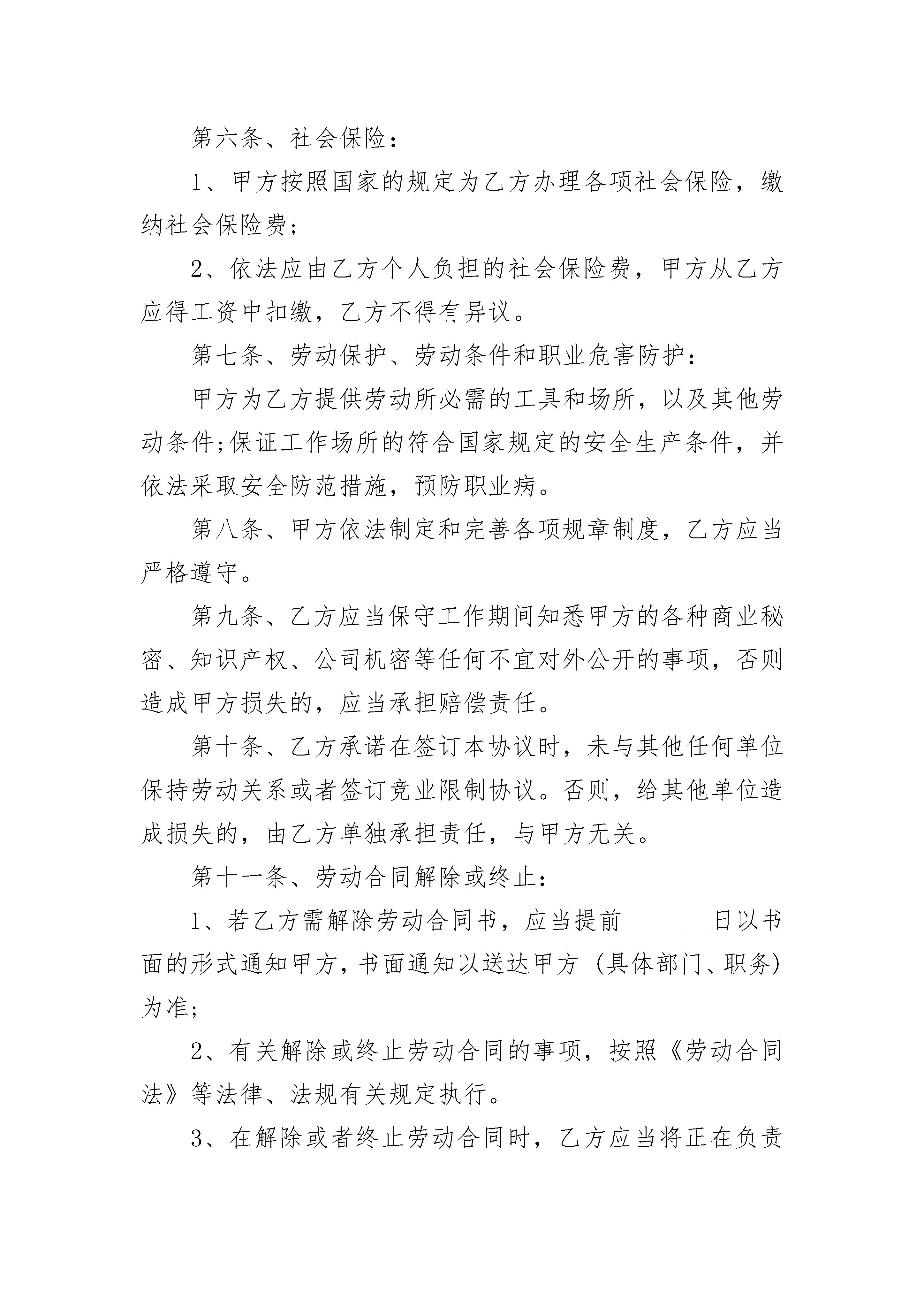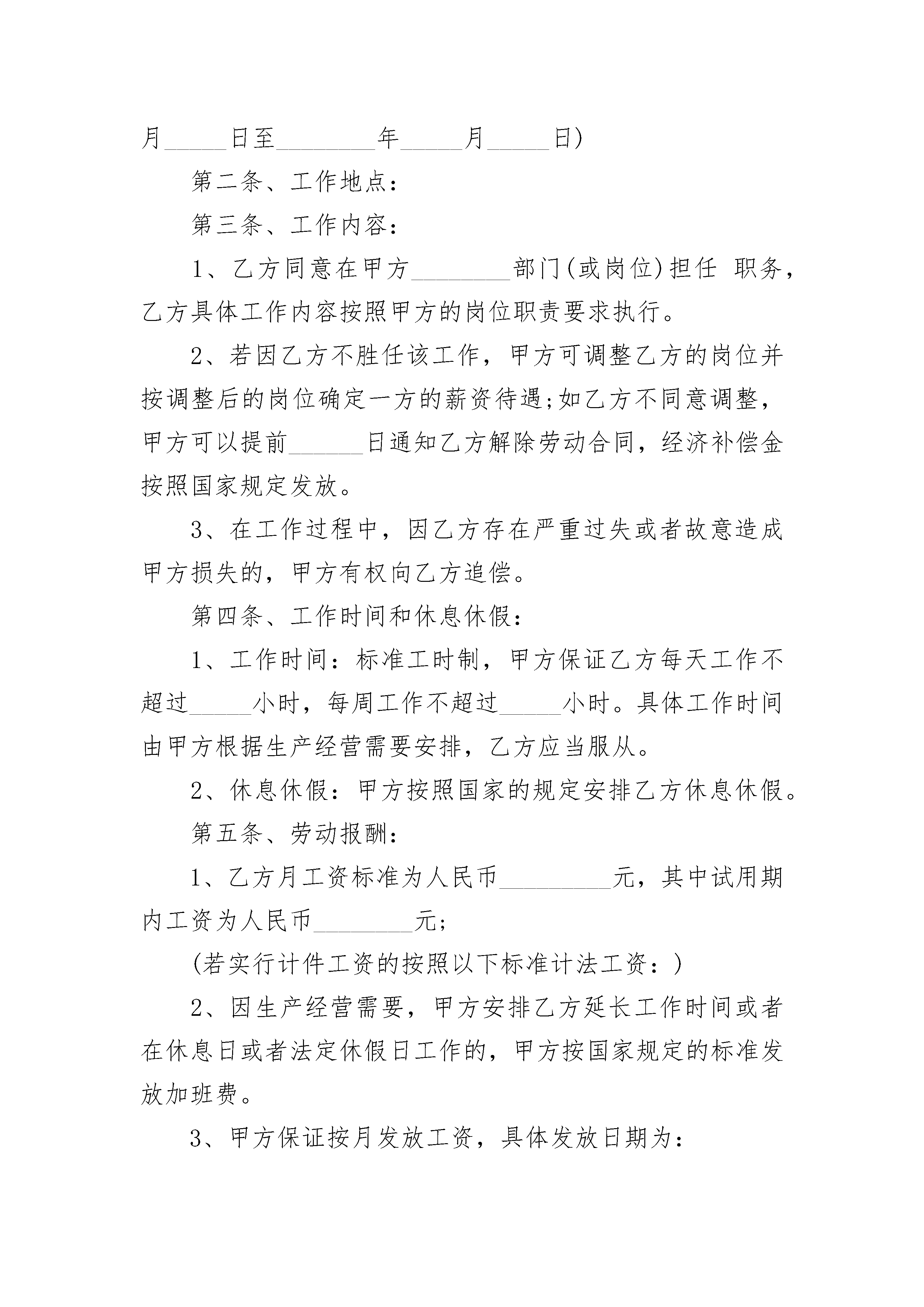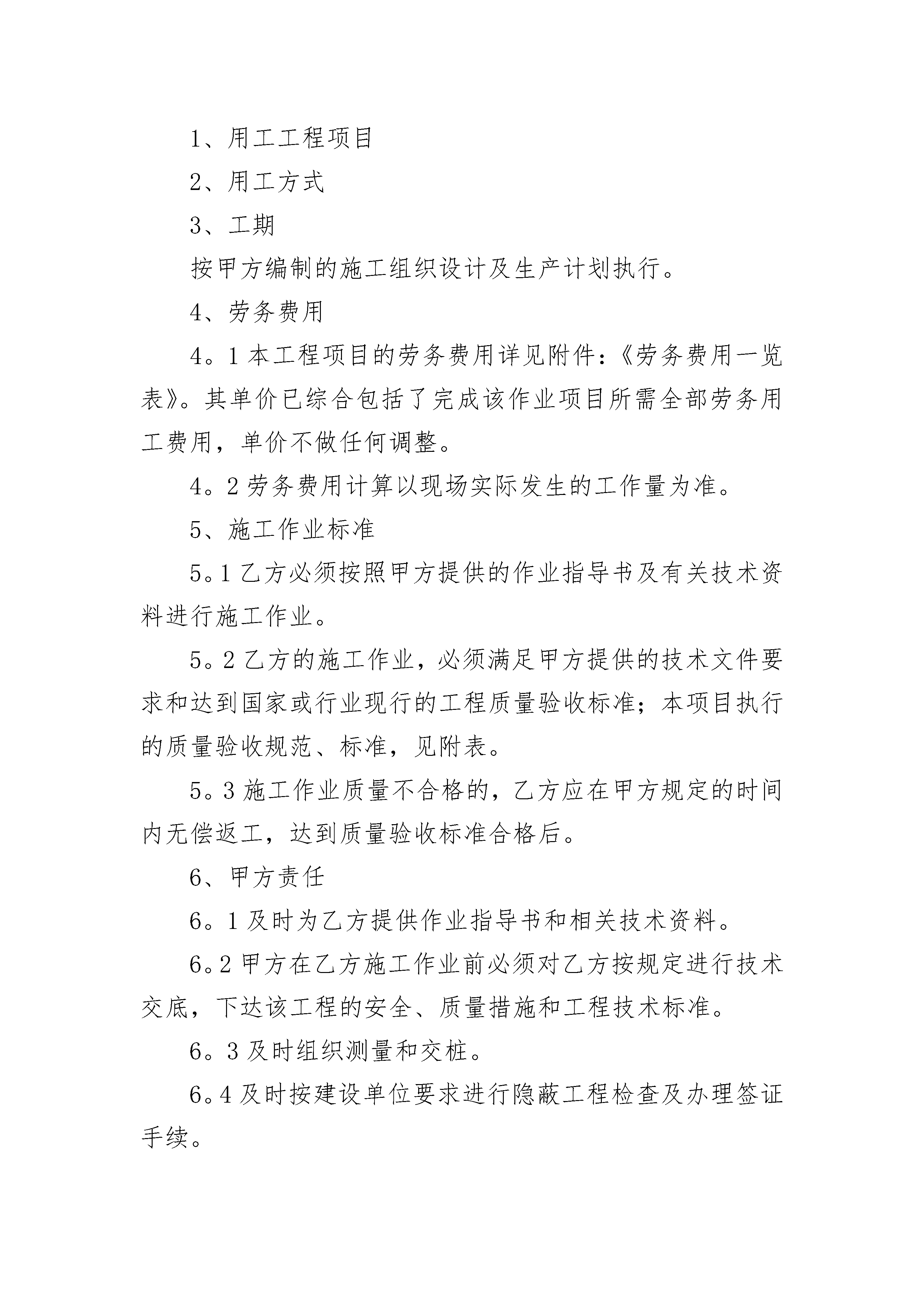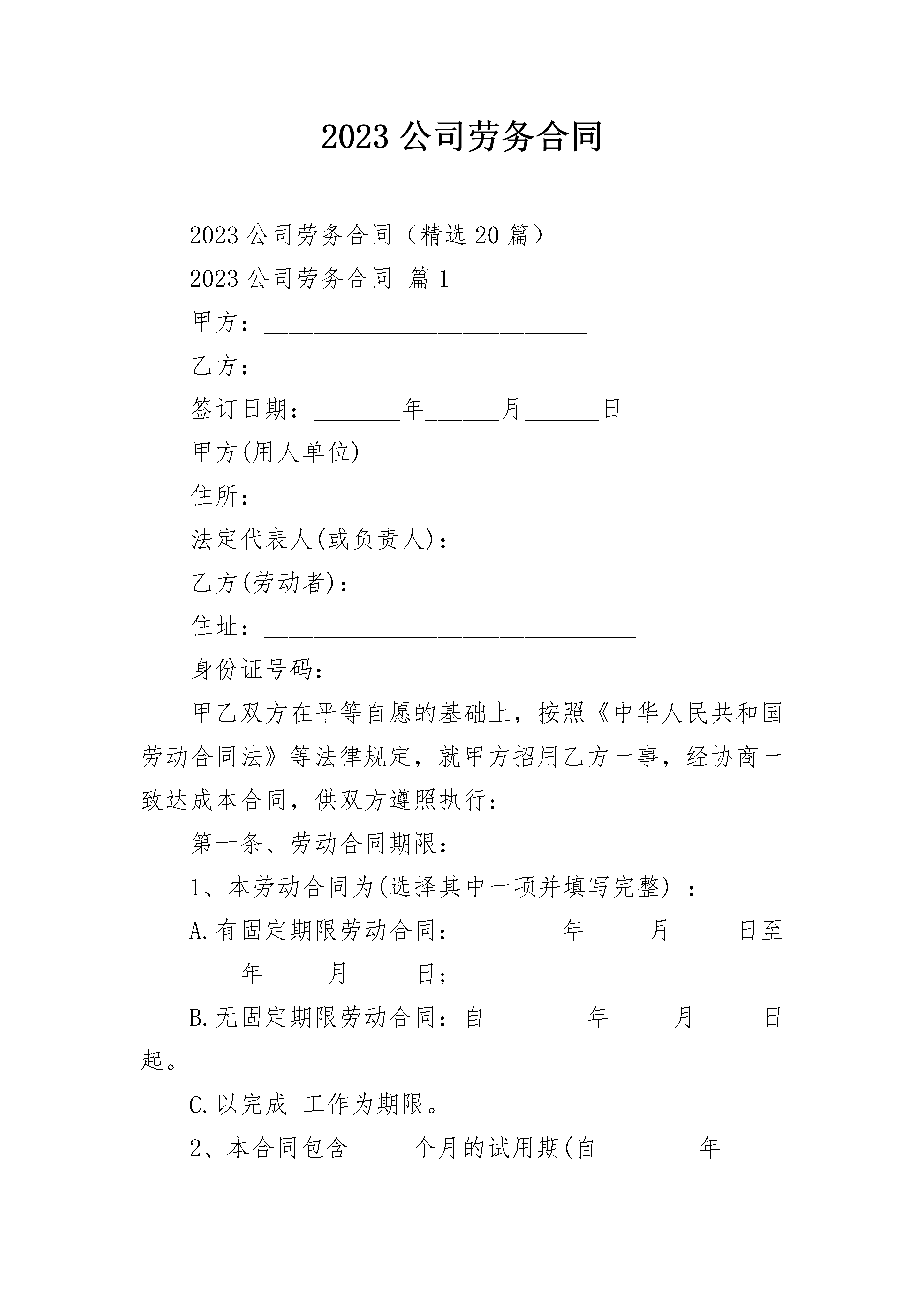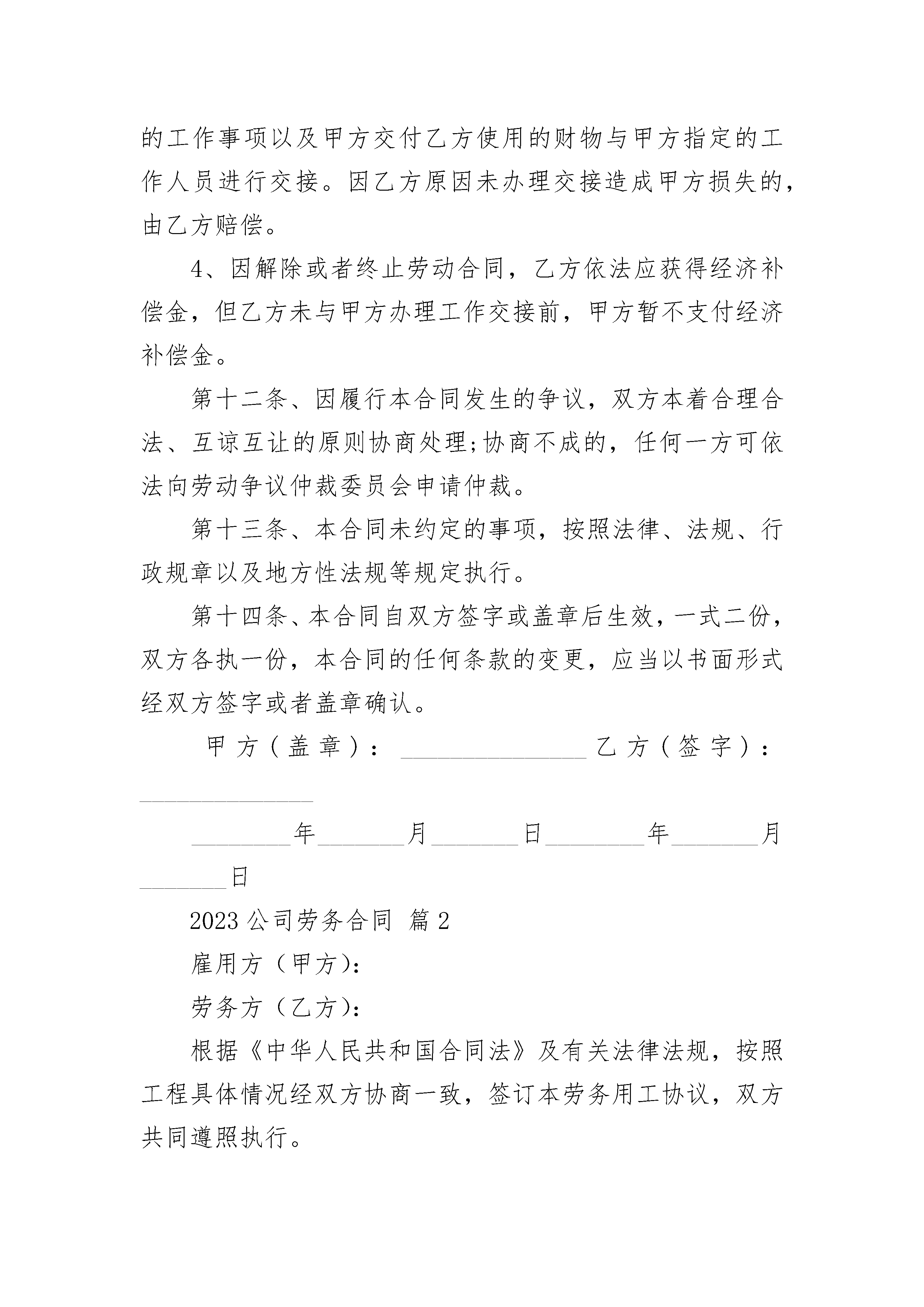 2023公司劳务合同2023公司劳务合同(精选20篇)2023公司劳务合同篇1甲方:__________________________乙方:__________________________签订日期:_______年______月______日甲方(用人单位)住所:__________________________法定代表人(或负责人):____________乙方(劳动者):_____________________住址:______________________________身份证号码:_____________________________甲乙双方在平等自愿的基础上,按照《中华人民共和国劳动合同法》等法律规定,就甲方招用乙方一事,经协商一致达成本合同,供双方遵照执行:第一条、劳动合同期限:1、本劳动合同为(选择其中一项并填写完整):A.有固定期限劳动合同:________年_____月_____日至________年_____月_____日;B.无固定期限劳动合同:自________年_____月_____日起。C.以完成工作为期限。2、本合同包含_____个月的试用期(自________年_____月_____日至________年_____月_____日)第二条、工作地点:第三条、工作内容:1、乙方同意在甲方________部门(或岗位)担任职务,乙方具体工作内容按照甲方的岗位职责要求执行。2、若因乙方不胜任该工作,甲方可调整乙方的岗位并按调整后的岗位确定一方的薪资待遇;如乙方不同意调整,甲方可以提前______日通知乙方解除劳动合同,经济补偿金按照国家规定发放。3、在工作过程中,因乙方存在严重过失或者故意造成甲方损失的,甲方有权向乙方追偿。第四条、工作时间和休息休假:1、工作时间:标准工时制,甲方保证乙方每天工作不超过_____小时,每周工作不超过_____小时。具体工作时间由甲方根据生产经营需要安排,乙方应当服从。2、休息休假:甲方按照国家的规定安排乙方休息休假。第五条、劳动报酬:1、乙方月工资标准为人民币_________元,其中试用期内工资为人民币________元;(若实行计件工资的按照以下标准计法工资:)2、因生产经营需要,甲方安排乙方延长工作时间或者在休息日或者法定休假日工作的,甲方按国家规定的标准发放加班费。3、甲方保证按月发放工资,具体发放日期为:第六条、社会保险:1、甲方按照国家的规定为乙方办理各项社会保险,缴纳社会保险费;2、依法应由乙方个人负担的社会保险费,甲方从乙方应得工资中扣缴,乙方不得有异议。第七条、劳动保护、劳动条件和职业危害防护:甲方为乙方提供劳动所必需的工具和场所,以及其他劳动条件;保证工作场所的符合国家规定的安全生产条件,并依法采取安全防范措施,预防职业病。第八条、甲方依法制定和完善各项规章制度,乙方应当严格遵守。第九条、乙方应当保守工作期间知悉甲方的各种商业秘密、知识产权、公司机密等任何不宜对外公开的事项,否则造成甲方损失的,应当承担赔偿责任。第十条、乙方承诺在签订本协议时,未与其他任何单位保持劳动关系或者签订竞业限制协议。否则,给其他单位造成损失的,由乙方单独承担责任,与甲方无关。第十一条、劳动合同解除或终止:1、若乙方需解除劳动合同书,应当提前_______日以书面的形式通知甲方,书面通知以送达甲方(具体部门、职务)为准;2、有关解除或终止劳动合同的事项,按照《劳动合同法》等法律、法规有关规定执行。3、在解除或者终止劳动合同时,乙方应当将正在负责的工作事项以及甲方交付乙方使用的财物与甲方指定的工作人员进行交接。因乙方原因未办理交接造成甲方损失的,由乙方赔偿。4、因解除或者终止劳动合同,乙方依法应获得经济补偿金,但乙方未与甲方办理工作交接前,甲方暂不支付经济补偿金。第十二条、因履行本合同发生的争议,双方本着合理合法、互谅互让的原则协商处理;协商不成的,任何一方可依法向劳动争议仲裁委员会申请仲裁。第十三条、本合同未约定的事项,按照法律、法规、行政规章以及地方性法规等规定执行。第十四条、本合同自双方签字或盖章后生效,一式二份,双方各执一份,本合同的任何条款的变更,应当以书面形式经双方签字或者盖章确认。甲方(盖章):_______________乙方(签字):______________________年_______月_______日________年_______月_______日2023公司劳务合同篇2雇用方(甲方):劳务方(乙方):根据《中华人民共和国合同法》及有关法律法规,按照工程具体情况经双方协商一致,签订本劳务用工协议,双方共同遵照执行。1、用工工程项目2、用工方式3、工期按甲方编制的施工组织设计及生产计划执行。4、劳务费用4。1本工程项目的劳务费用详