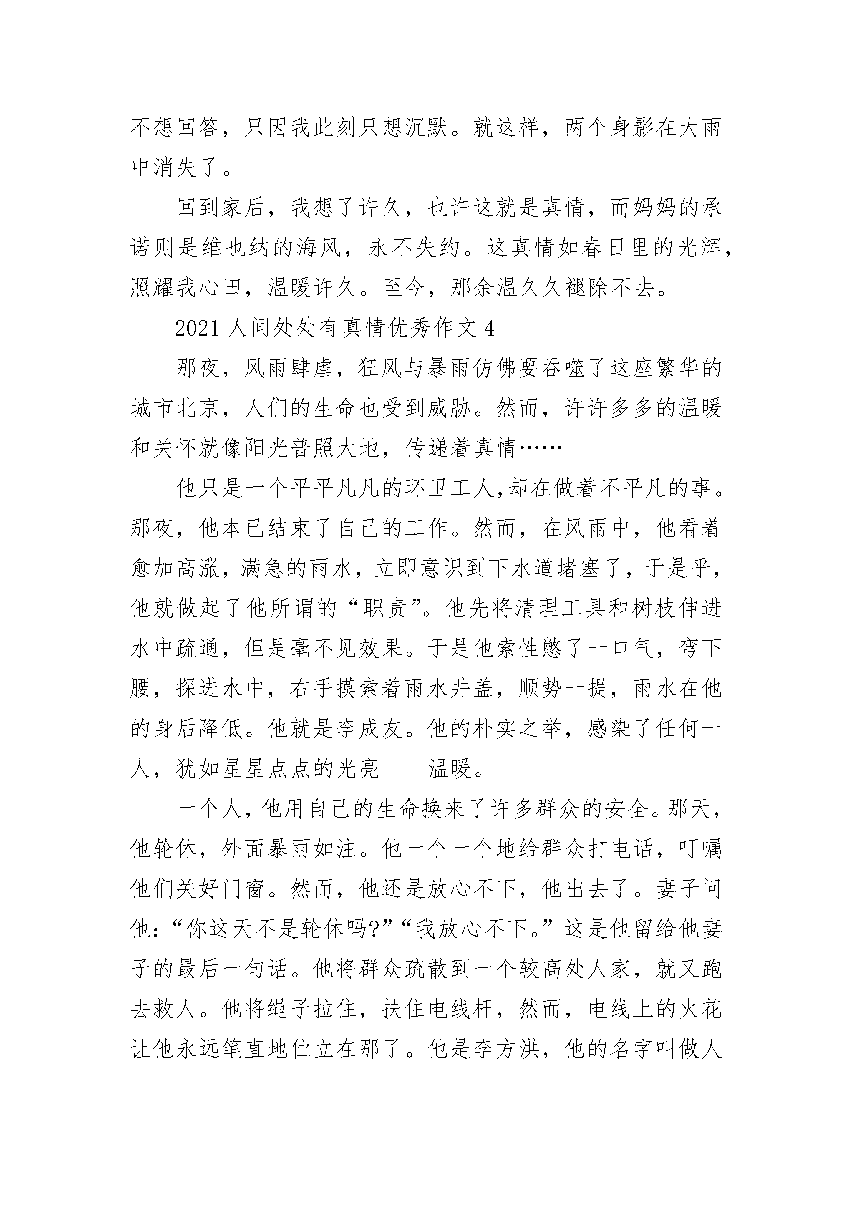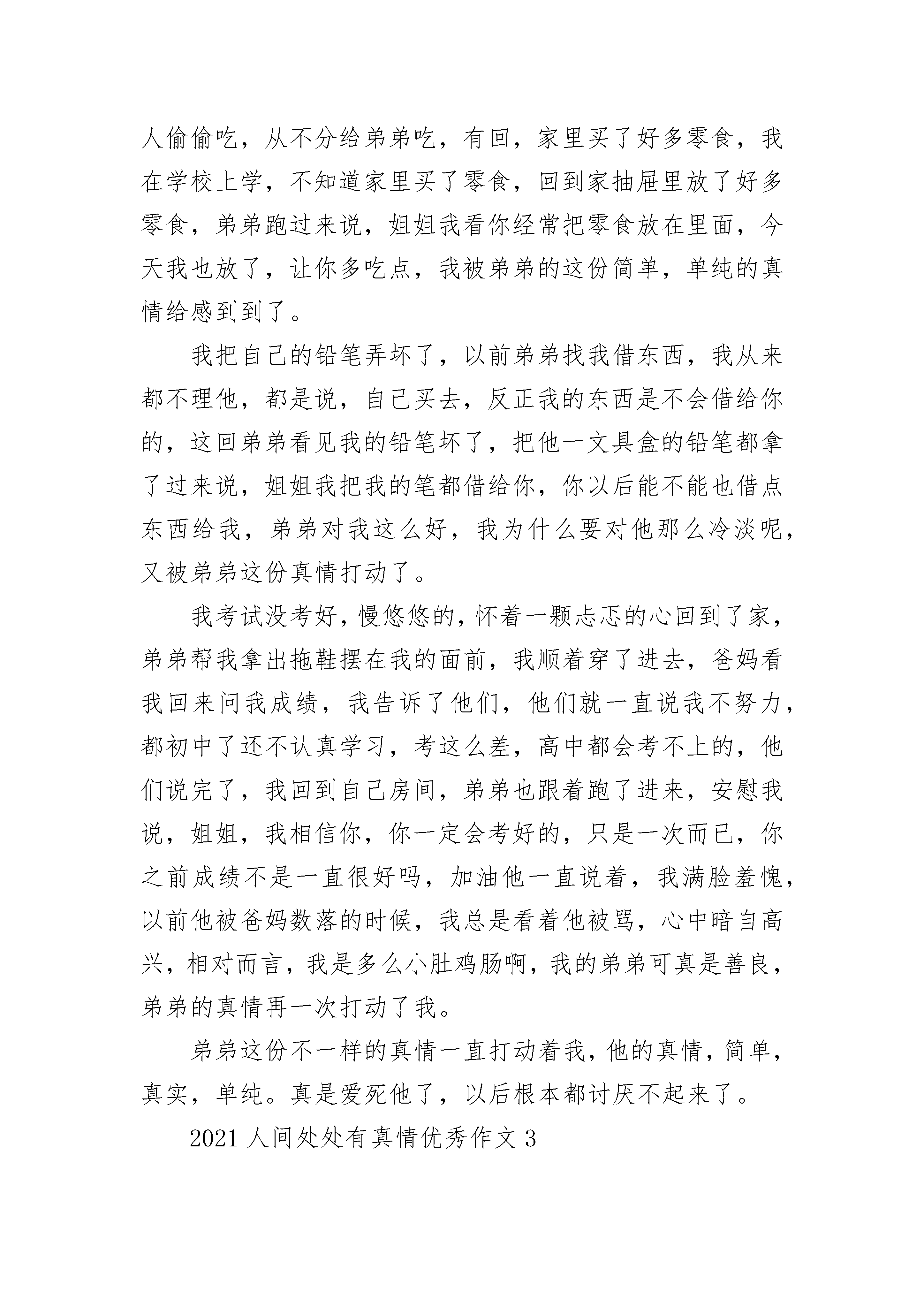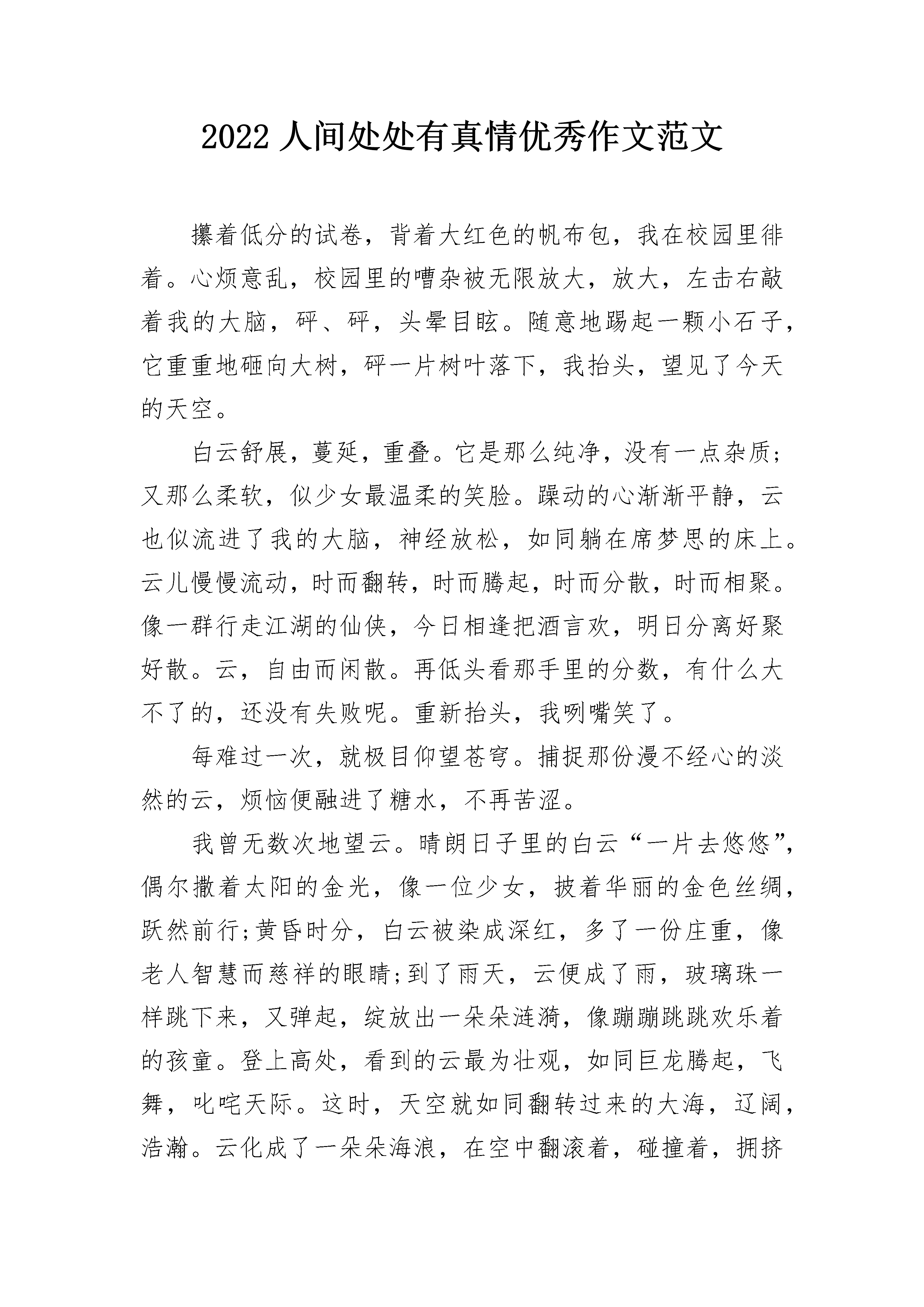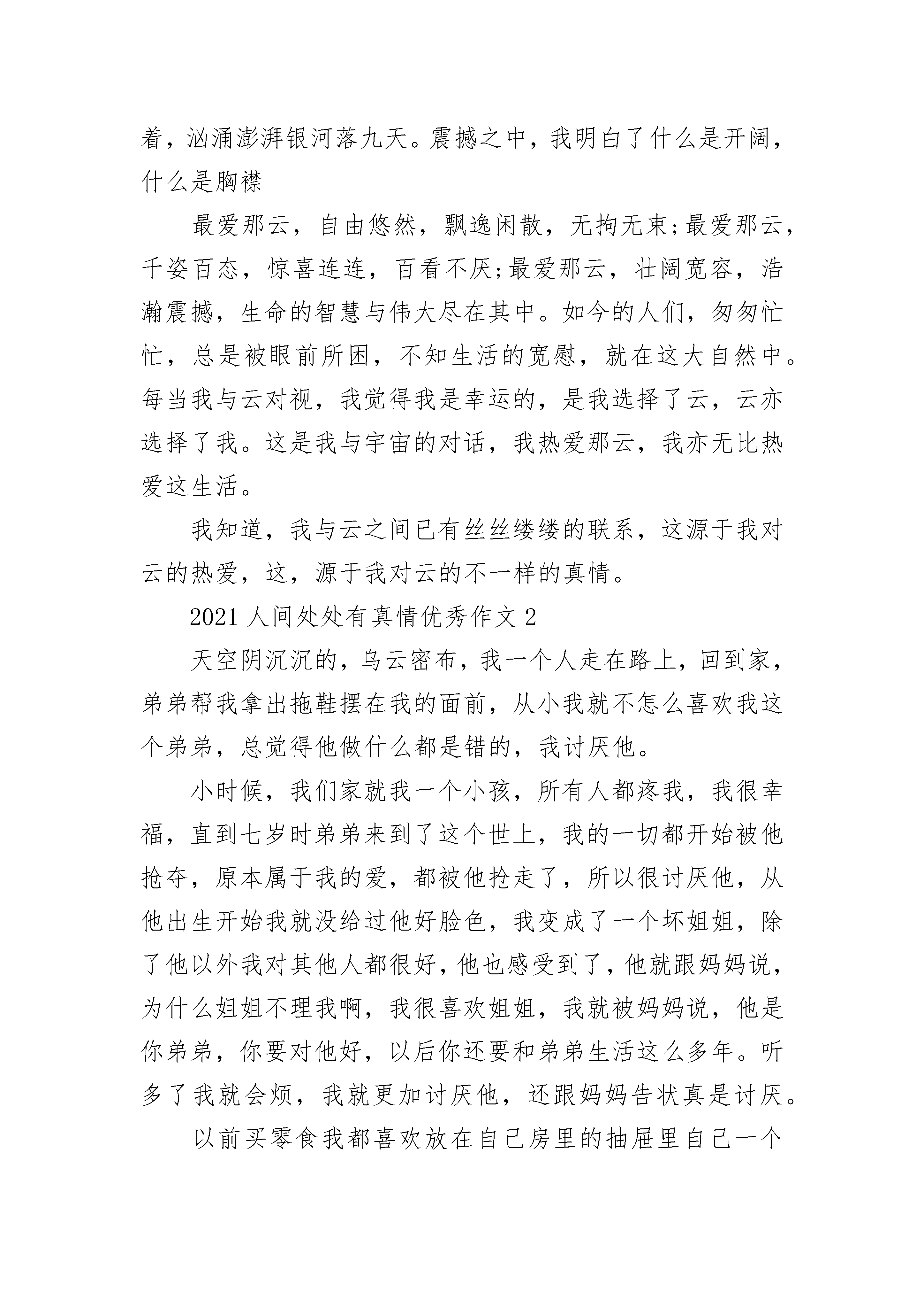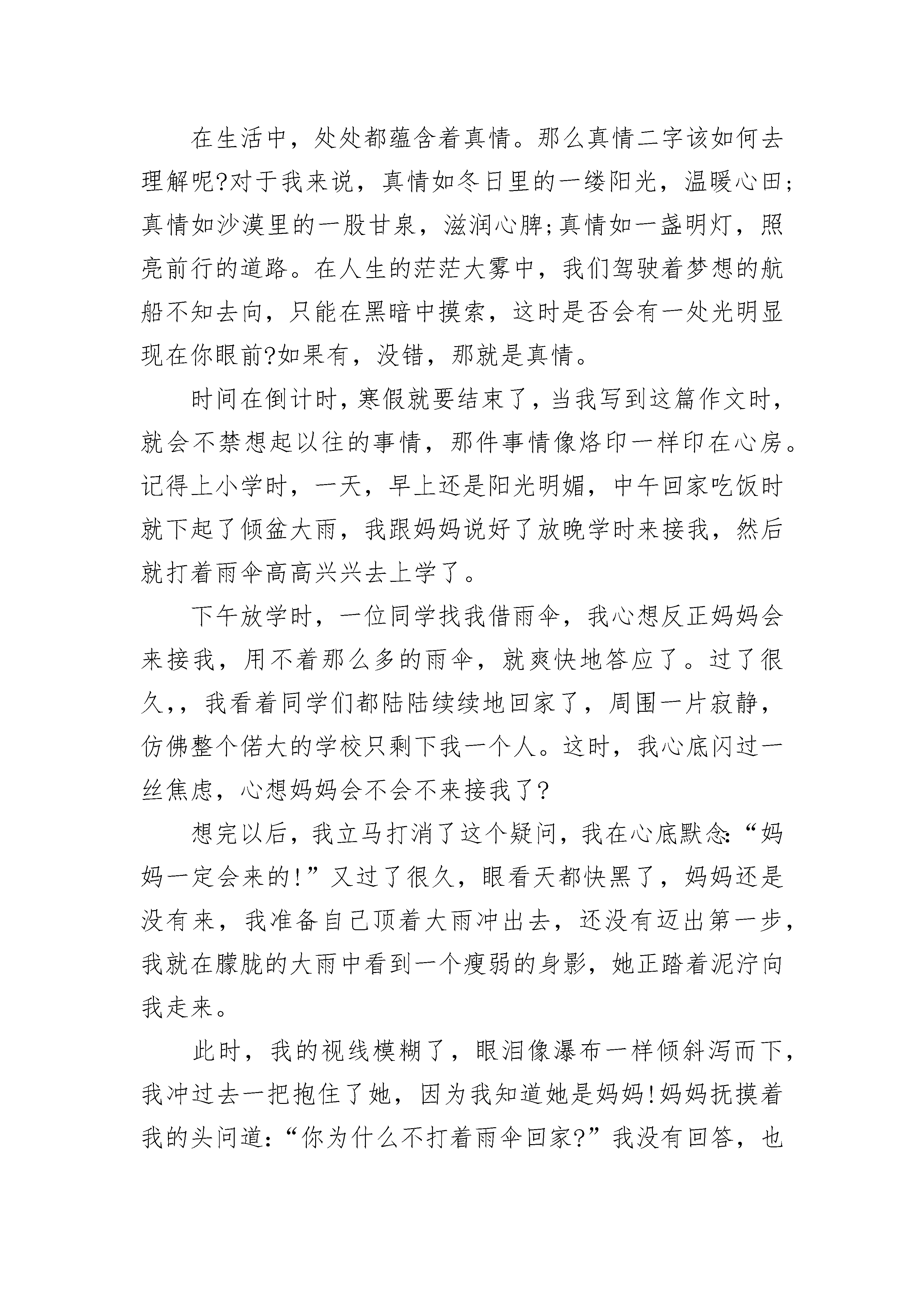 2022人间处处有真情优秀作文范文攥着低分的试卷,背着大红色的帆布包,我在校园里徘着。心烦意乱,校园里的嘈杂被无限放大,放大,左击右敲着我的大脑,砰、砰,头晕目眩。随意地踢起一颗小石子,它重重地砸向大树,砰一片树叶落下,我抬头,望见了今天的天空。白云舒展,蔓延,重叠。它是那么纯净,没有一点杂质;又那么柔软,似少女最温柔的笑脸。躁动的心渐渐平静,云也似流进了我的大脑,神经放松,如同躺在席梦思的床上。云儿慢慢流动,时而翻转,时而腾起,时而分散,时而相聚。像一群行走江湖的仙侠,今日相逢把酒言欢,明日分离好聚好散。云,自由而闲散。再低头看那手里的分数,有什么大不了的,还没有失败呢。重新抬头,我咧嘴笑了。每难过一次,就极目仰望苍穹。捕捉那份漫不经心的淡然的云,烦恼便融进了糖水,不再苦涩。我曾无数次地望云。晴朗日子里的白云“一片去悠悠”,偶尔撒着太阳的金光,像一位少女,披着华丽的金色丝绸,跃然前行;黄昏时分,白云被染成深红,多了一份庄重,像老人智慧而慈祥的眼睛;到了雨天,云便成了雨,玻璃珠一样跳下来,又弹起,绽放出一朵朵涟漪,像蹦蹦跳跳欢乐着的孩童。登上高处,看到的云最为壮观,如同巨龙腾起,飞舞,叱咤天际。这时,天空就如同翻转过来的大海,辽阔,浩瀚。云化成了一朵朵海浪,在空中翻滚着,碰撞着,拥挤着,汹涌澎湃银河落九天。震撼之中,我明白了什么是开阔,什么是胸襟最爱那云,自由悠然,飘逸闲散,无拘无束;最爱那云,千姿百态,惊喜连连,百看不厌;最爱那云,壮阔宽容,浩瀚震撼,生命的智慧与伟大尽在其中。如今的人们,匆匆忙忙,总是被眼前所困,不知生活的宽慰,就在这大自然中。每当我与云对视,我觉得我是幸运的,是我选择了云,云亦选择了我。这是我与宇宙的对话,我热爱那云,我亦无比热爱这生活。我知道,我与云之间已有丝丝缕缕的联系,这源于我对云的热爱,这,源于我对云的不一样的真情。2021人间处处有真情优秀作文2天空阴沉沉的,乌云密布,我一个人走在路上,回到家,弟弟帮我拿出拖鞋摆在我的面前,从小我就不怎么喜欢我这个弟弟,总觉得他做什么都是错的,我讨厌他。小时候,我们家就我一个小孩,所有人都疼我,我很幸福,直到七岁时弟弟来到了这个世上,我的一切都开始被他抢夺,原本属于我的爱,都被他抢走了,所以很讨厌他,从他出生开始我就没给过他好脸色,我变成了一个坏姐姐,除了他以外我对其他人都很好,他也感受到了,他就跟妈妈说,为什么姐姐不理我啊,我很喜欢姐姐,我就被妈妈说,他是你弟弟,你要对他好,以后你还要和弟弟生活这么多年。听多了我就会烦,我就更加讨厌他,还跟妈妈告状真是讨厌。以前买零食我都喜欢放在自己房里的抽屉里自己一个人偷偷吃,从不分给弟弟吃,有回,家里买了好多零食,我在学校上学,不知道家里买了零食,回到家抽屉里放了好多零食,弟弟跑过来说,姐姐我看你经常把零食放在里面,今天我也放了,让你多吃点,我被弟弟的这份简单,单纯的真情给感到到了。我把自己的铅笔弄坏了,以前弟弟找我借东西,我从来都不理他,都是说,自己买去,反正我的东西是不会借给你的,这回弟弟看见我的铅笔坏了,把他一文具盒的铅笔都拿了过来说,姐姐我把我的笔都借给你,你以后能不能也借点东西给我,弟弟对我这么好,我为什么要对他那么冷淡呢,又被弟弟这份真情打动了。我考试没考好,慢悠悠的,怀着一颗忐忑的心回到了家,弟弟帮我拿出拖鞋摆在我的面前,我顺着穿了进去,爸妈看我回来问我成绩,我告诉了他们,他们就一直说我不努力,都初中了还不认真学习,考这么差,高中都会考不上的,他们说完了,我回到自己房间,弟弟也跟着跑了进来,安慰我说,姐姐,我相信你,你一定会考好的,只是一次而已,你之前成绩不是一直很好吗,加油他一直说着,我满脸羞愧,以前他被爸妈数落的时候,我总是看着他被骂,心中暗自高兴,相对而言,我是多么小肚鸡肠啊,我的弟弟可真是善良,弟弟的真情再一次打动了我。弟弟这份不一样的真情一直打动着我,他的真情,简单,真实,单纯。真是爱死他了,以后根本都讨厌不起来了。2021人间处处有真情优秀作文3在生活中,处处都蕴含着真情。那么真情二字该如何去理解呢?对于我来说,真情如冬日里的一缕阳光,温暖心田;真情如沙漠里的一股甘泉,滋润心脾;真情如一盏明灯,照亮前行的道路。在人生的茫茫大雾中,我们驾驶着梦想的航船不知去向,只能在黑暗中摸索,这时是否会有一处光明显现在你眼前?如果有,没错,那就是真情。时间在倒计时,寒假就要结束了,当我写到这篇作文时,就会不禁想起以往的事情,那件事情像烙印一样印在心房。记得上小学时,一天,早上还是阳光明媚,中午回家吃饭时就下起了倾盆大雨,我跟妈妈说好了放晚学时来接我,然后就打着雨伞高高兴兴去上学了。下午放学时,一位同学找我借雨伞,我心想反正妈妈会来接我,用不着那么多的雨伞,就爽快地答应了。过了很久,,我看着同学们都陆陆续续地回