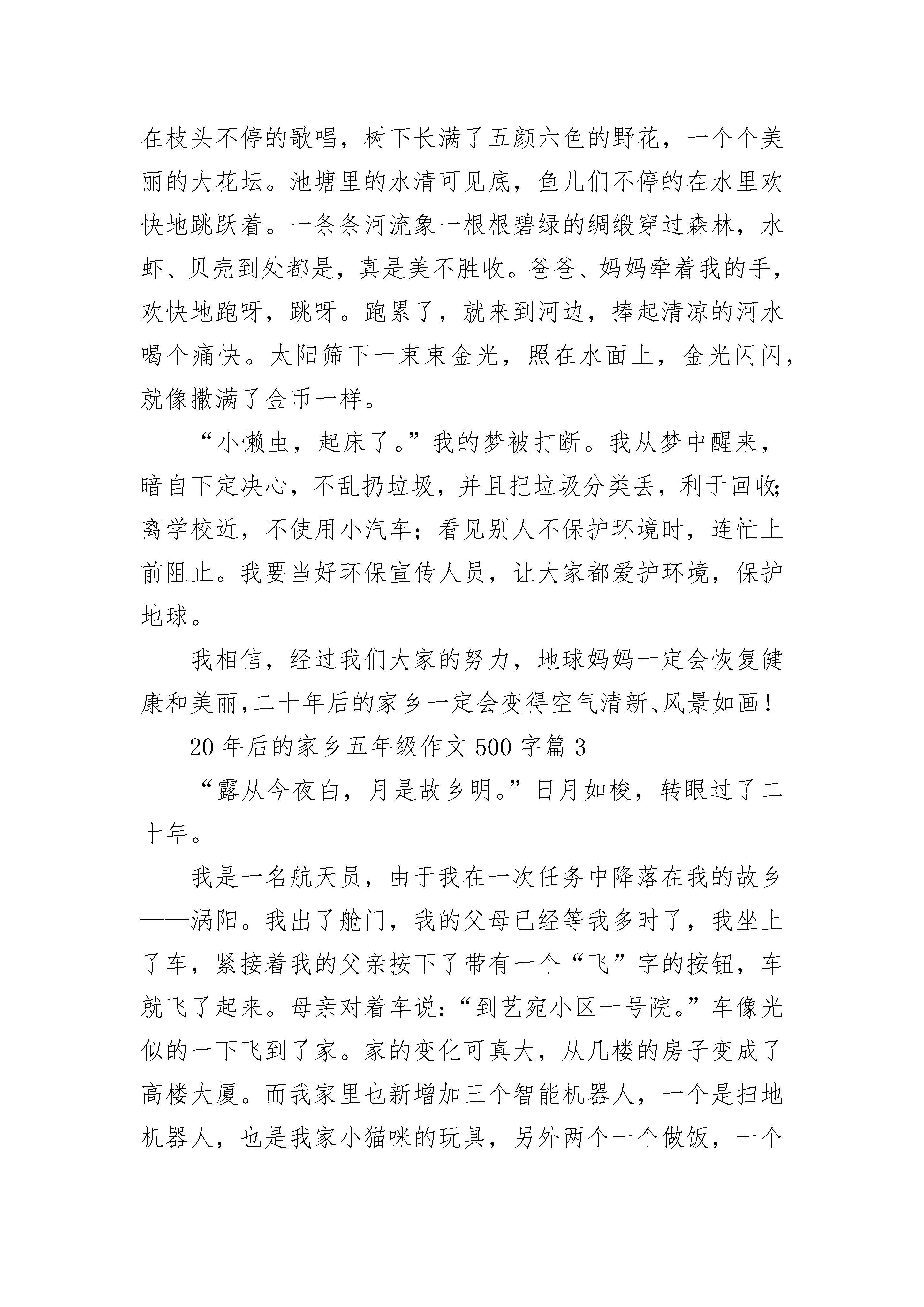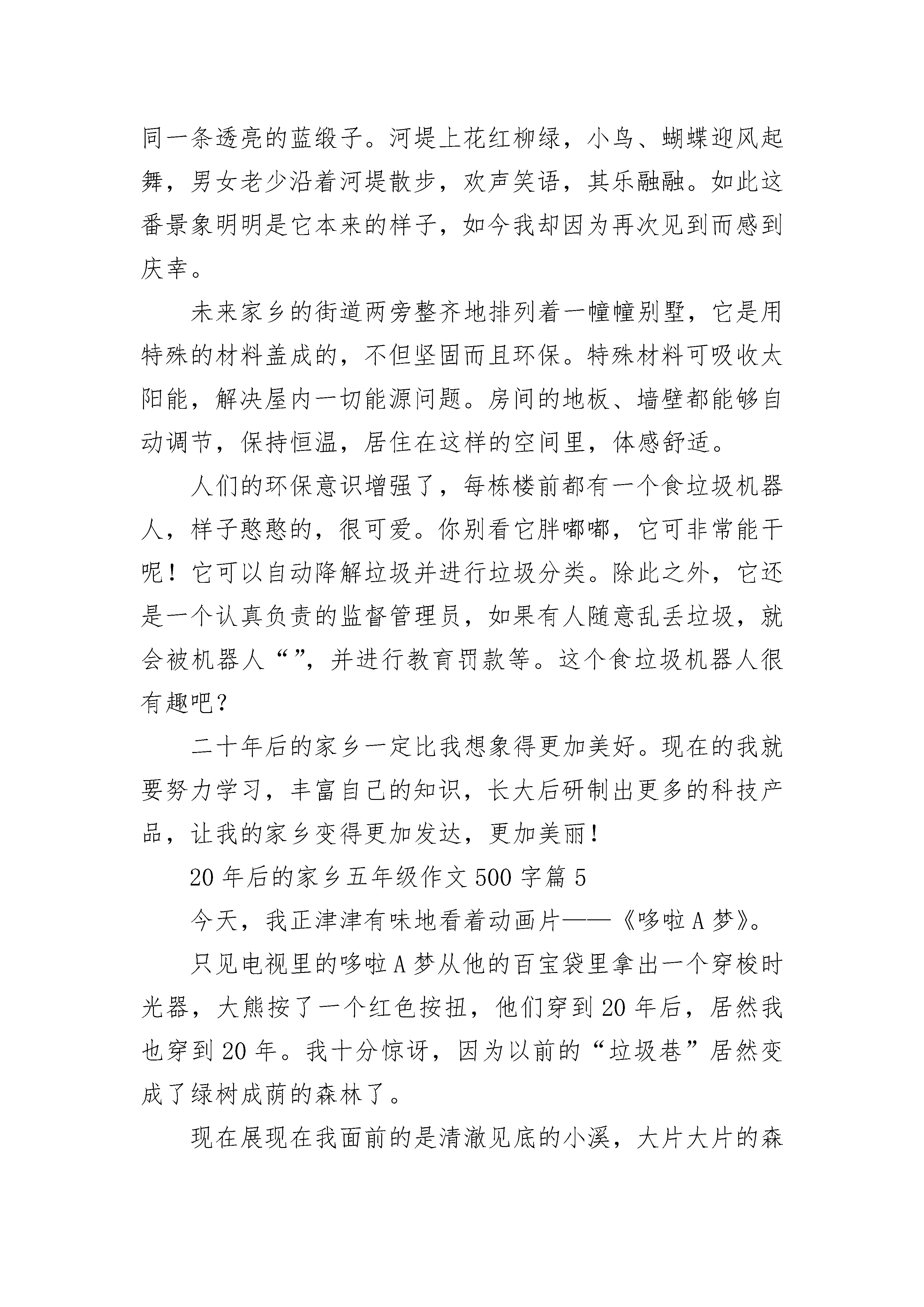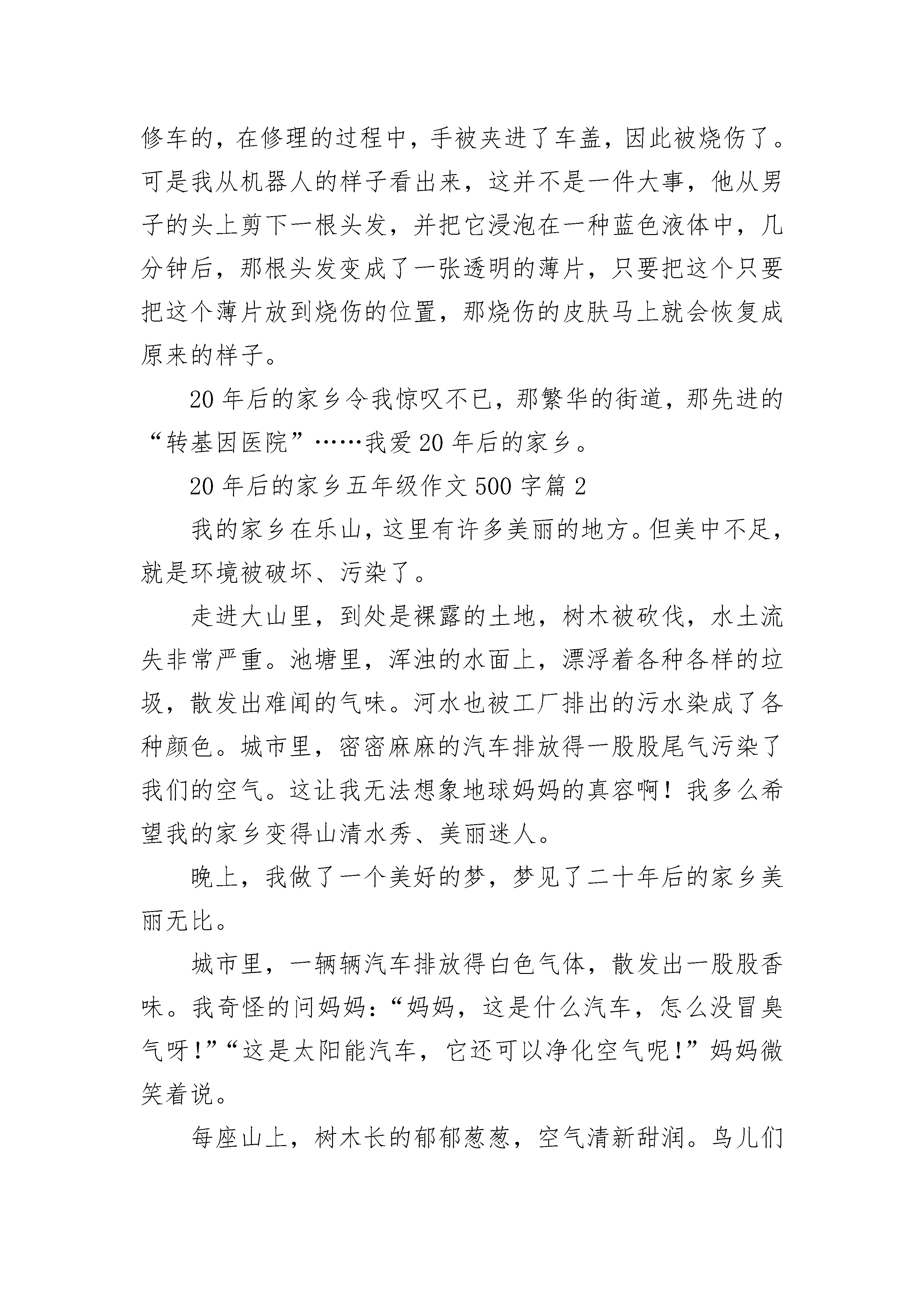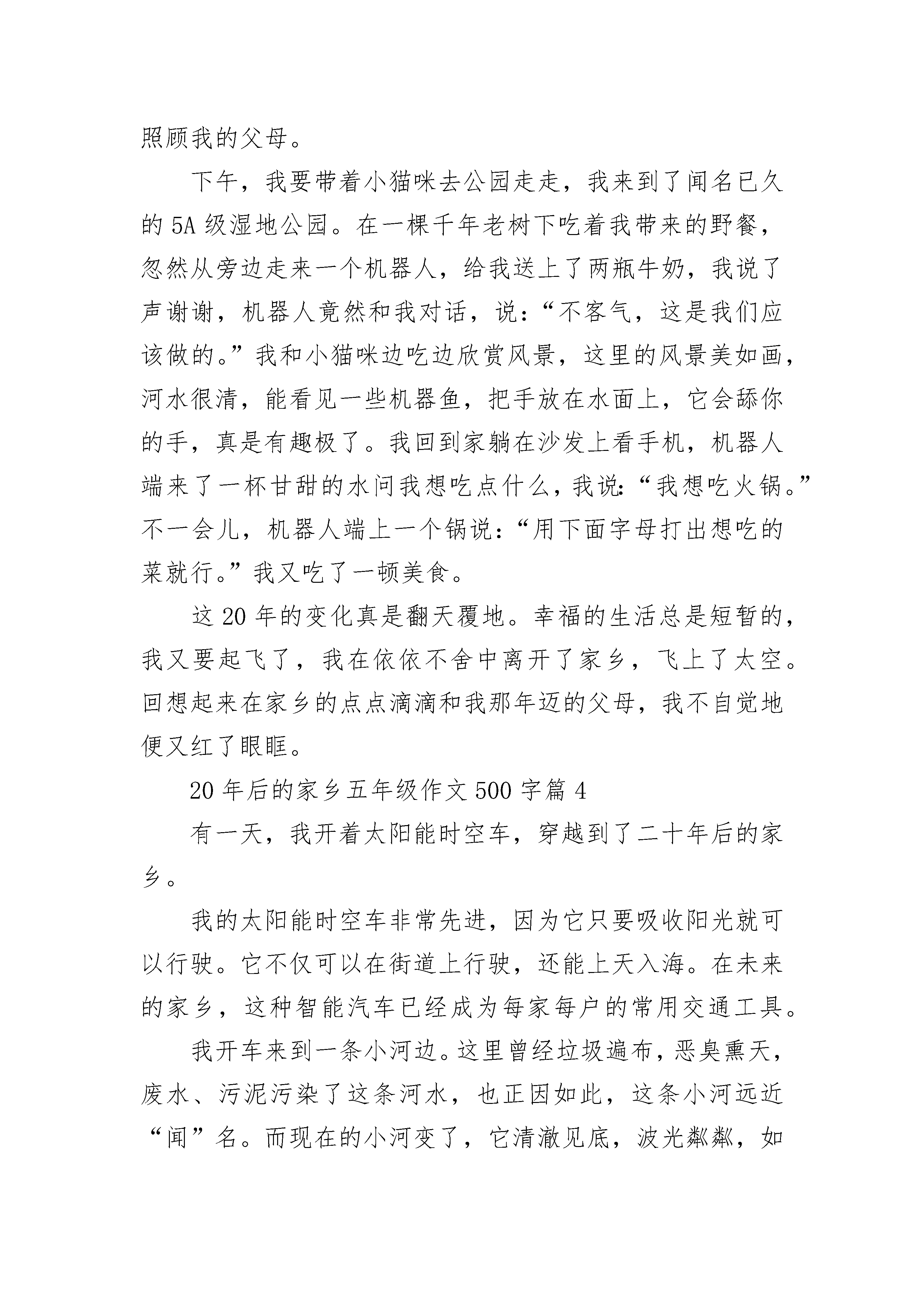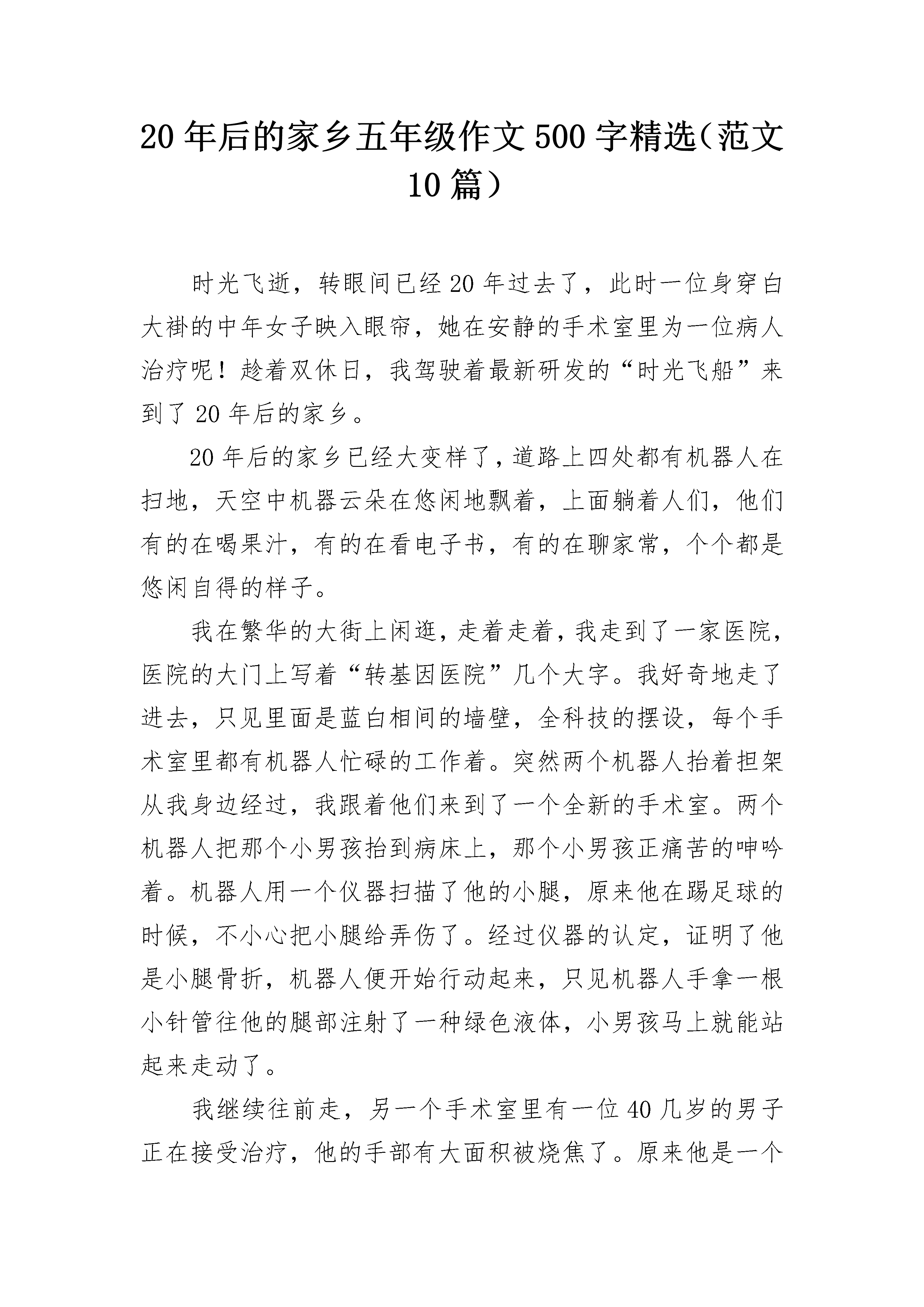 20年后的家乡五年级作文500字精选(范文10篇)时光飞逝,转眼间已经20年过去了,此时一位身穿白大褂的中年女子映入眼帘,她在安静的手术室里为一位病人治疗呢!趁着双休日,我驾驶着最新研发的“时光飞船”来到了20年后的家乡。20年后的家乡已经大变样了,道路上四处都有机器人在扫地,天空中机器云朵在悠闲地飘着,上面躺着人们,他们有的在喝果汁,有的在看电子书,有的在聊家常,个个都是悠闲自得的样子。我在繁华的大街上闲逛,走着走着,我走到了一家医院,医院的大门上写着“转基因医院”几个大字。我好奇地走了进去,只见里面是蓝白相间的墙壁,全科技的摆设,每个手术室里都有机器人忙碌的工作着。突然两个机器人抬着担架从我身边经过,我跟着他们来到了一个全新的手术室。两个机器人把那个小男孩抬到病床上,那个小男孩正痛苦的呻吟着。机器人用一个仪器扫描了他的小腿,原来他在踢足球的时候,不小心把小腿给弄伤了。经过仪器的认定,证明了他是小腿骨折,机器人便开始行动起来,只见机器人手拿一根小针管往他的腿部注射了一种绿色液体,小男孩马上就能站起来走动了。我继续往前走,另一个手术室里有一位40几岁的男子正在接受治疗,他的手部有大面积被烧焦了。原来他是一个修车的,在修理的过程中,手被夹进了车盖,因此被烧伤了。可是我从机器人的样子看出来,这并不是一件大事,他从男子的头上剪下一根头发,并把它浸泡在一种蓝色液体中,几分钟后,那根头发变成了一张透明的薄片,只要把这个只要把这个薄片放到烧伤的位置,那烧伤的皮肤马上就会恢复成原来的样子。20年后的家乡令我惊叹不已,那繁华的街道,那先进的“转基因医院”……我爱20年后的家乡。20年后的家乡五年级作文500字篇2我的家乡在乐山,这里有许多美丽的地方。但美中不足,就是环境被破坏、污染了。走进大山里,到处是裸露的土地,树木被砍伐,水土流失非常严重。池塘里,浑浊的水面上,漂浮着各种各样的垃圾,散发出难闻的气味。河水也被工厂排出的污水染成了各种颜色。城市里,密密麻麻的汽车排放得一股股尾气污染了我们的空气。这让我无法想象地球妈妈的真容啊!我多么希望我的家乡变得山清水秀、美丽迷人。晚上,我做了一个美好的梦,梦见了二十年后的家乡美丽无比。城市里,一辆辆汽车排放得白色气体,散发出一股股香味。我奇怪的问妈妈:“妈妈,这是什么汽车,怎么没冒臭气呀!”“这是太阳能汽车,它还可以净化空气呢!”妈妈微笑着说。每座山上,树木长的郁郁葱葱,空气清新甜润。鸟儿们在枝头不停的歌唱,树下长满了五颜六色的野花,一个个美丽的大花坛。池塘里的水清可见底,鱼儿们不停的在水里欢快地跳跃着。一条条河流象一根根碧绿的绸缎穿过森林,水虾、贝壳到处都是,真是美不胜收。爸爸、妈妈牵着我的手,欢快地跑呀,跳呀。跑累了,就来到河边,捧起清凉的河水喝个痛快。太阳筛下一束束金光,照在水面上,金光闪闪,就像撒满了金币一样。“小懒虫,起床了。”我的梦被打断。我从梦中醒来,暗自下定决心,不乱扔垃圾,并且把垃圾分类丢,利于回收;离学校近,不使用小汽车;看见别人不保护环境时,连忙上前阻止。我要当好环保宣传人员,让大家都爱护环境,保护地球。我相信,经过我们大家的努力,地球妈妈一定会恢复健康和美丽,二十年后的家乡一定会变得空气清新、风景如画!20年后的家乡五年级作文500字篇3“露从今夜白,月是故乡明。”日月如梭,转眼过了二十年。我是一名航天员,由于我在一次任务中降落在我的故乡——涡阳。我出了舱门,我的父母已经等我多时了,我坐上了车,紧接着我的父亲按下了带有一个“飞”字的按钮,车就飞了起来。母亲对着车说:“到艺宛小区一号院。”车像光似的一下飞到了家。家的变化可真大,从几楼的房子变成了高楼大厦。而我家里也新增加三个智能机器人,一个是扫地机器人,也是我家小猫咪的玩具,另外两个一个做饭,一个照顾我的父母。下午,我要带着小猫咪去公园走走,我来到了闻名已久的5A级湿地公园。在一棵千年老树下吃着我带来的野餐,忽然从旁边走来一个机器人,给我送上了两瓶牛奶,我说了声谢谢,机器人竟然和我对话,说:“不客气,这是我们应该做的。”我和小猫咪边吃边欣赏风景,这里的风景美如画,河水很清,能看见一些机器鱼,把手放在水面上,它会舔你的手,真是有趣极了。我回到家躺在沙发上看手机,机器人端来了一杯甘甜的水问我想吃点什么,我说:“我想吃火锅。”不一会儿,机器人端上一个锅说:“用下面字母打出想吃的菜就行。”我又吃了一顿美食。这20年的变化真是翻天覆地。幸福的生活总是短暂的,我又要起飞了,我在依依不舍中离开了家乡,飞上了太空。回想起来在家乡的点点滴滴和我那年迈的父母,我不自觉地便又红了眼眶。20年后的家乡五年级作文500字篇4有一天,我开着太阳能时空车,穿越到了二十年后的家乡。我的太阳能时空车非常先进,因为它只要吸收阳光就可以行驶。它不仅可以在街道上行驶