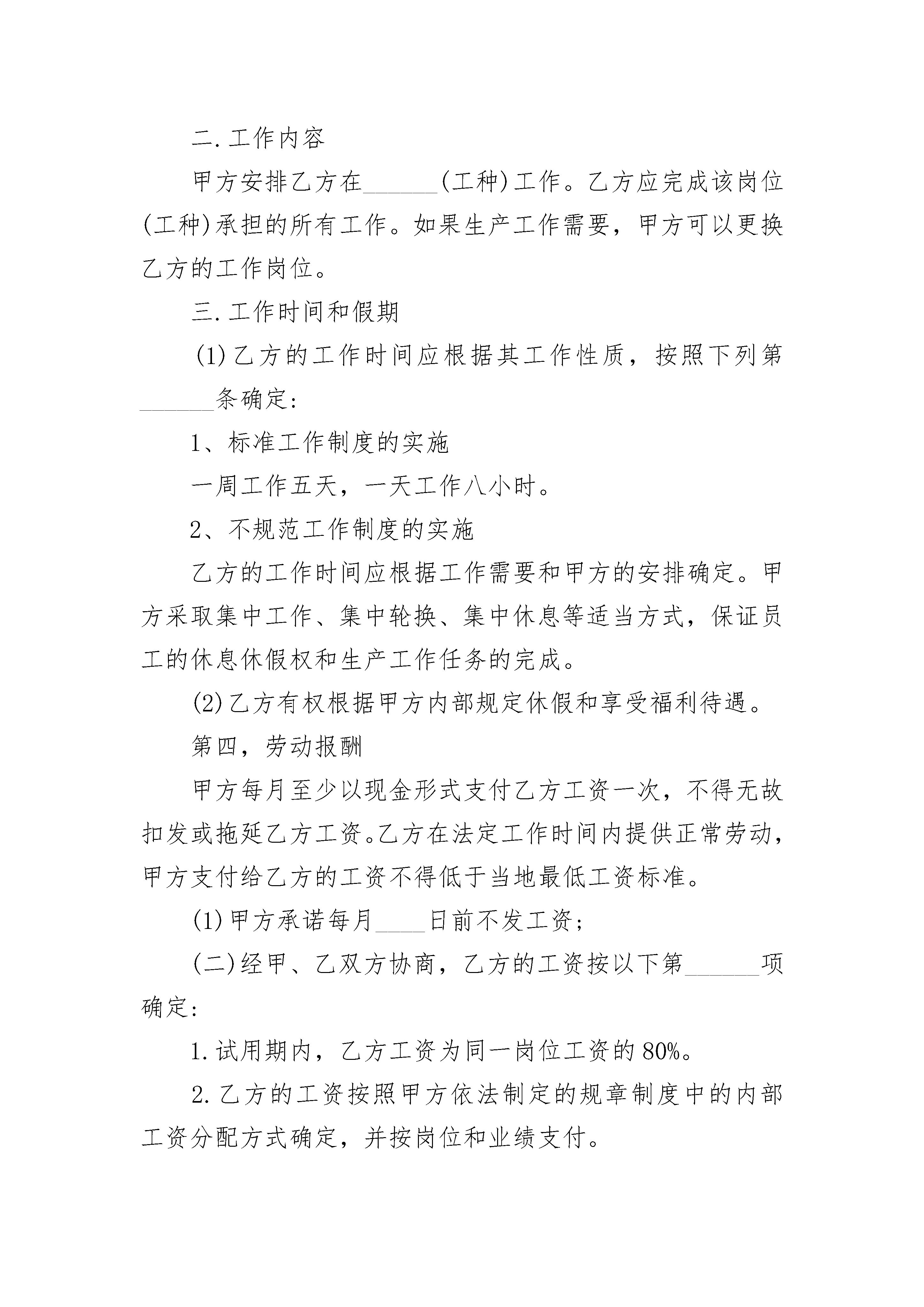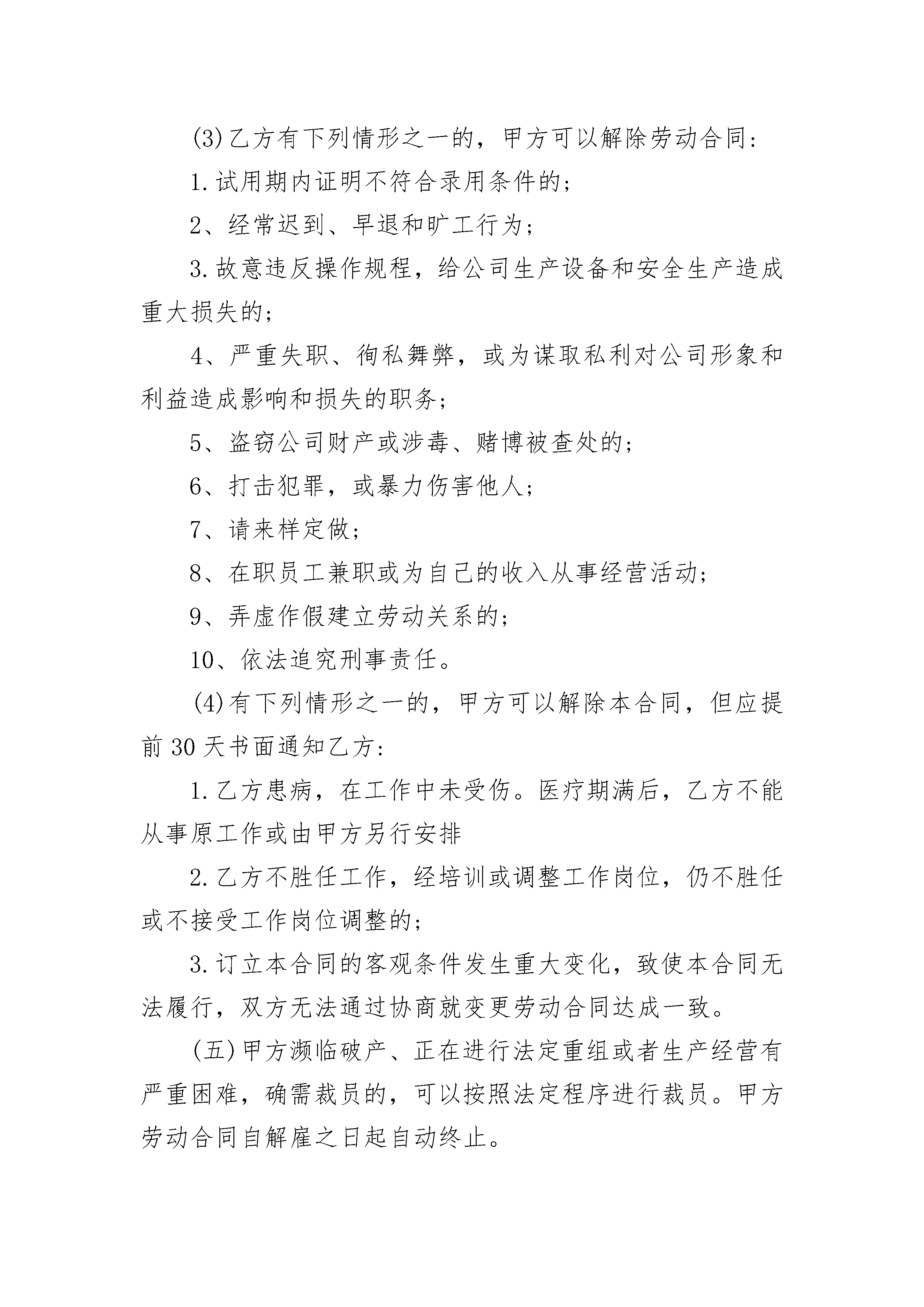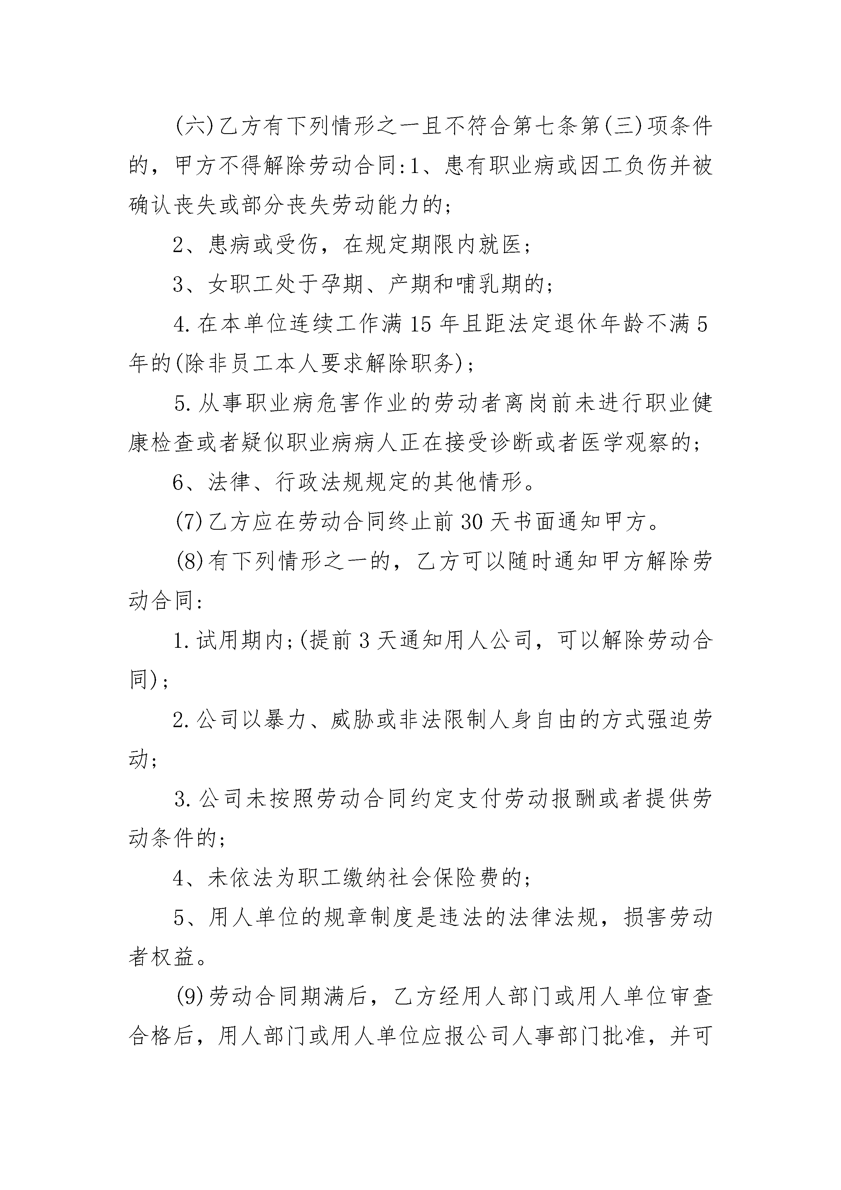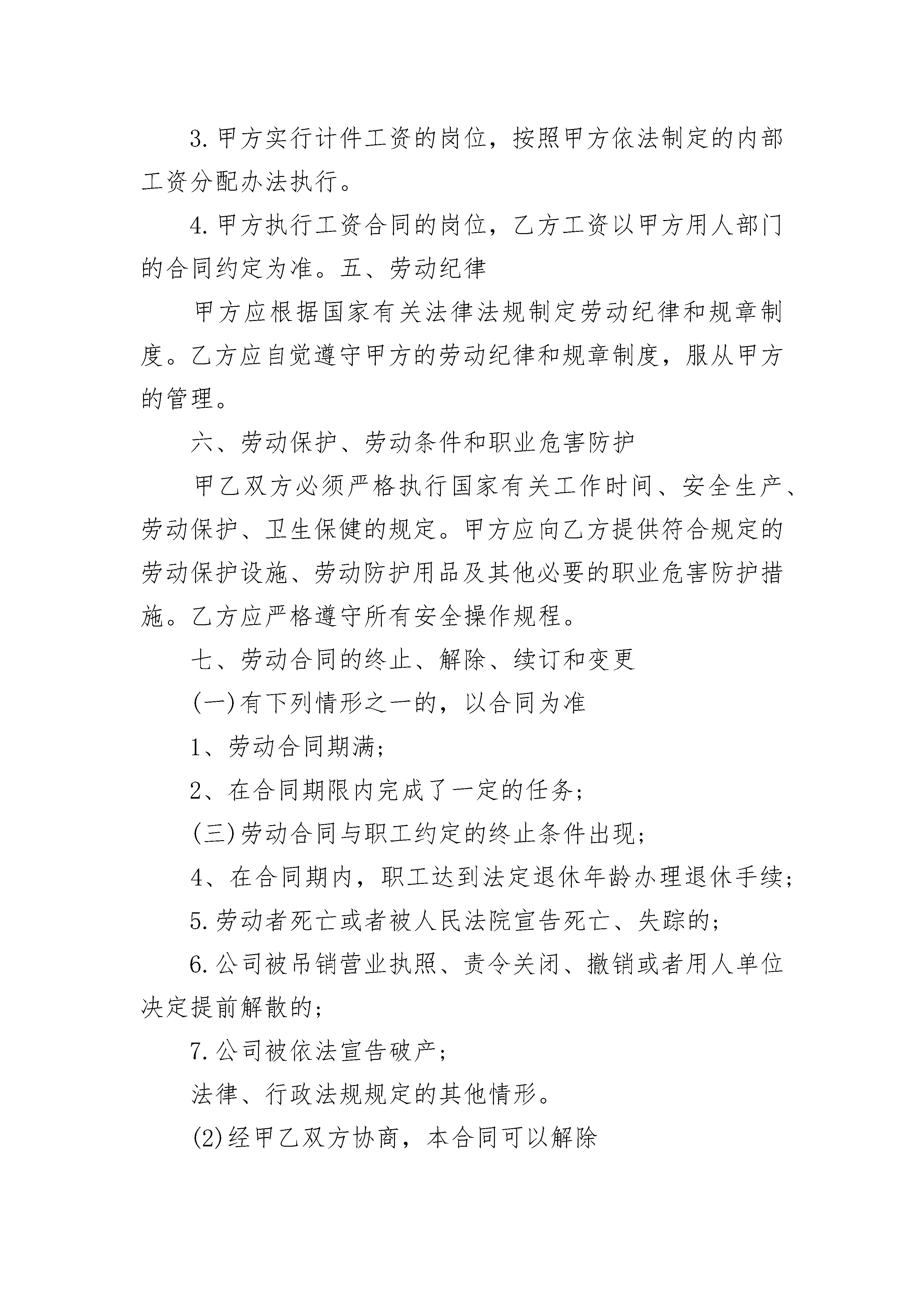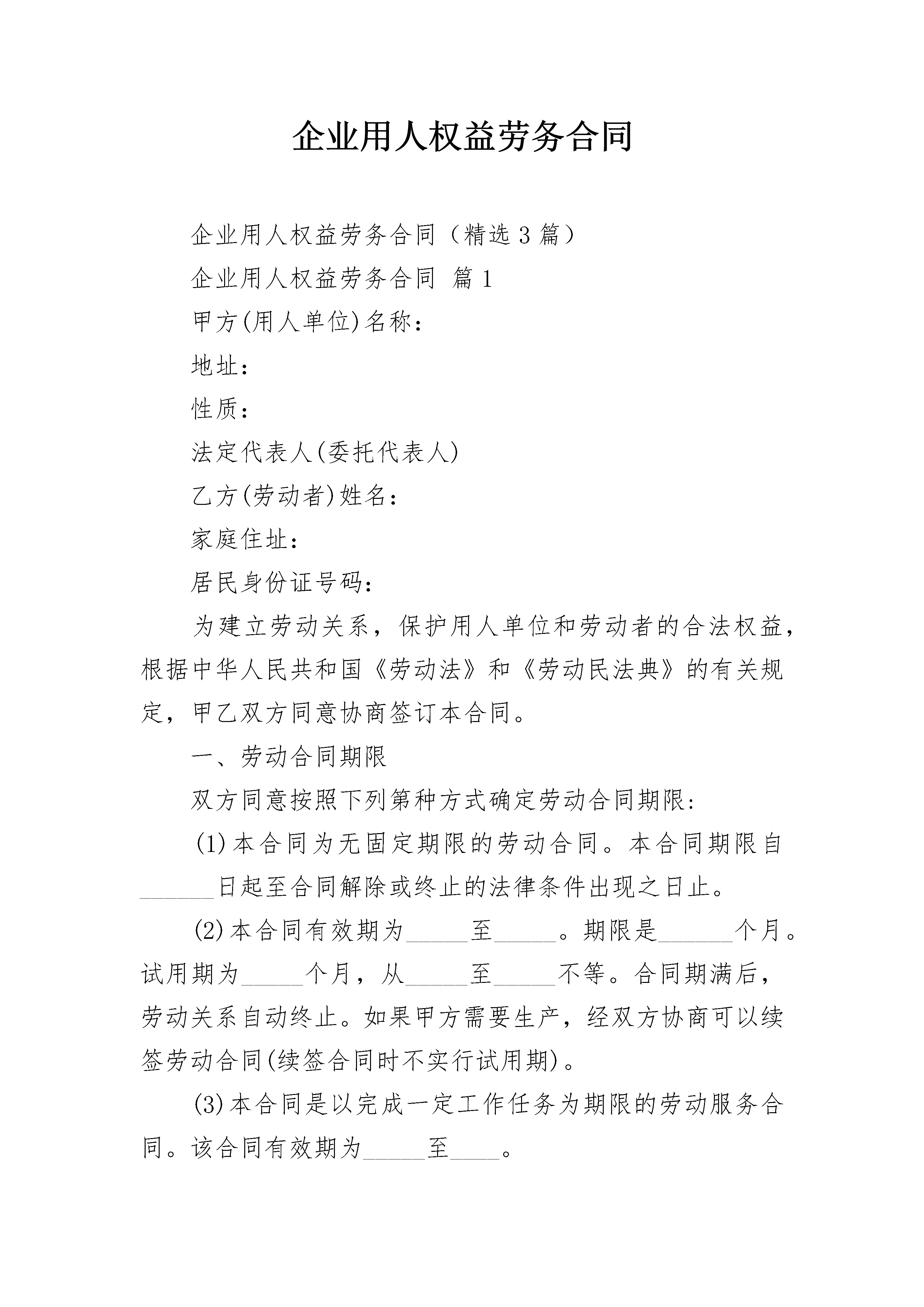 企业用人权益劳务合同企业用人权益劳务合同(精选3篇)企业用人权益劳务合同篇1甲方(用人单位)名称:地址:性质:法定代表人(委托代表人)乙方(劳动者)姓名:家庭住址:居民身份证号码:为建立劳动关系,保护用人单位和劳动者的合法权益,根据中华人民共和国《劳动法》和《劳动民法典》的有关规定,甲乙双方同意协商签订本合同。一、劳动合同期限双方同意按照下列第种方式确定劳动合同期限:(1)本合同为无固定期限的劳动合同。本合同期限自______日起至合同解除或终止的法律条件出现之日止。(2)本合同有效期为_____至_____。期限是______个月。试用期为_____个月,从_____至_____不等。合同期满后,劳动关系自动终止。如果甲方需要生产,经双方协商可以续签劳动合同(续签合同时不实行试用期)。(3)本合同是以完成一定工作任务为期限的劳动服务合同。该合同有效期为_____至____。二.工作内容甲方安排乙方在______(工种)工作。乙方应完成该岗位(工种)承担的所有工作。如果生产工作需要,甲方可以更换乙方的工作岗位。三.工作时间和假期(1)乙方的工作时间应根据其工作性质,按照下列第______条确定:1、标准工作制度的实施一周工作五天,一天工作八小时。2、不规范工作制度的实施乙方的工作时间应根据工作需要和甲方的安排确定。甲方采取集中工作、集中轮换、集中休息等适当方式,保证员工的休息休假权和生产工作任务的完成。(2)乙方有权根据甲方内部规定休假和享受福利待遇。第四,劳动报酬甲方每月至少以现金形式支付乙方工资一次,不得无故扣发或拖延乙方工资。乙方在法定工作时间内提供正常劳动,甲方支付给乙方的工资不得低于当地最低工资标准。(1)甲方承诺每月____日前不发工资;(二)经甲、乙双方协商,乙方的工资按以下第______项确定:1.试用期内,乙方工资为同一岗位工资的80%。2.乙方的工资按照甲方依法制定的规章制度中的内部工资分配方式确定,并按岗位和业绩支付。3.甲方实行计件工资的岗位,按照甲方依法制定的内部工资分配办法执行。4.甲方执行工资合同的岗位,乙方工资以甲方用人部门的合同约定为准。五、劳动纪律甲方应根据国家有关法律法规制定劳动纪律和规章制度。乙方应自觉遵守甲方的劳动纪律和规章制度,服从甲方的管理。六、劳动保护、劳动条件和职业危害防护甲乙双方必须严格执行国家有关工作时间、安全生产、劳动保护、卫生保健的规定。甲方应向乙方提供符合规定的劳动保护设施、劳动防护用品及其他必要的职业危害防护措施。乙方应严格遵守所有安全操作规程。七、劳动合同的终止、解除、续订和变更(一)有下列情形之一的,以合同为准1、劳动合同期满;2、在合同期限内完成了一定的任务;(三)劳动合同与职工约定的终止条件出现;4、在合同期内,职工达到法定退休年龄办理退休手续;5.劳动者死亡或者被人民法院宣告死亡、失踪的;6.公司被吊销营业执照、责令关闭、撤销或者用人单位决定提前解散的;7.公司被依法宣告破产;法律、行政法规规定的其他情形。(2)经甲乙双方协商,本合同可以解除(3)乙方有下列情形之一的,甲方可以解除劳动合同:1.试用期内证明不符合录用条件的;2、经常迟到、早退和旷工行为;3.故意违反操作规程,给公司生产设备和安全生产造成重大损失的;4、严重失职、徇私舞弊,或为谋取私利对公司形象和利益造成影响和损失的职务;5、盗窃公司财产或涉毒、赌博被查处的;6、打击犯罪,或暴力伤害他人;7、请来样定做;8、在职员工兼职或为自己的收入从事经营活动;9、弄虚作假建立劳动关系的;10、依法追究刑事责任。(4)有下列情形之一的,甲方可以解除本合同,但应提前30天书面通知乙方:1.乙方患病,在工作中未受伤。医疗期满后,乙方不能从事原工作或由甲方另行安排2.乙方不胜任工作,经培训或调整工作岗位,仍不胜任或不接受工作岗位调整的;3.订立本合同的客观条件发生重大变化,致使本合同无法履行,双方无法通过协商就变更劳动合同达成一致。(五)甲方濒临破产、正在进行法定重组或者生产经营有严重困难,确需裁员的,可以按照法定程序进行裁员。甲方劳动合同自解雇之日起自动终止。(六)乙方有下列情形之一且不符合第七条第(三)项条件的,甲方不得解除劳动合同:1、患有职业病或因工负伤并被确认丧失或部分丧失劳动能力的;2、患病或受伤,在规定期限内就医;3、女职工处于孕期、产期和哺乳期的;4.在本单位连续工作满15年且距法定退休年龄不满5年的(除非员工本人要求解除职务);5.从事职业病危害作业的劳动者离岗前未进行职业健康检查或者疑似职业病病人正在接受诊断或者医学观察的;6、法律、行政法规规定的其他情形。(7)乙方应在劳动合同终止前30天书面通知甲方。(8)有下列情形之一的,乙方可以随时通知甲方解除劳动合同:1.试用期内;(提前3天通