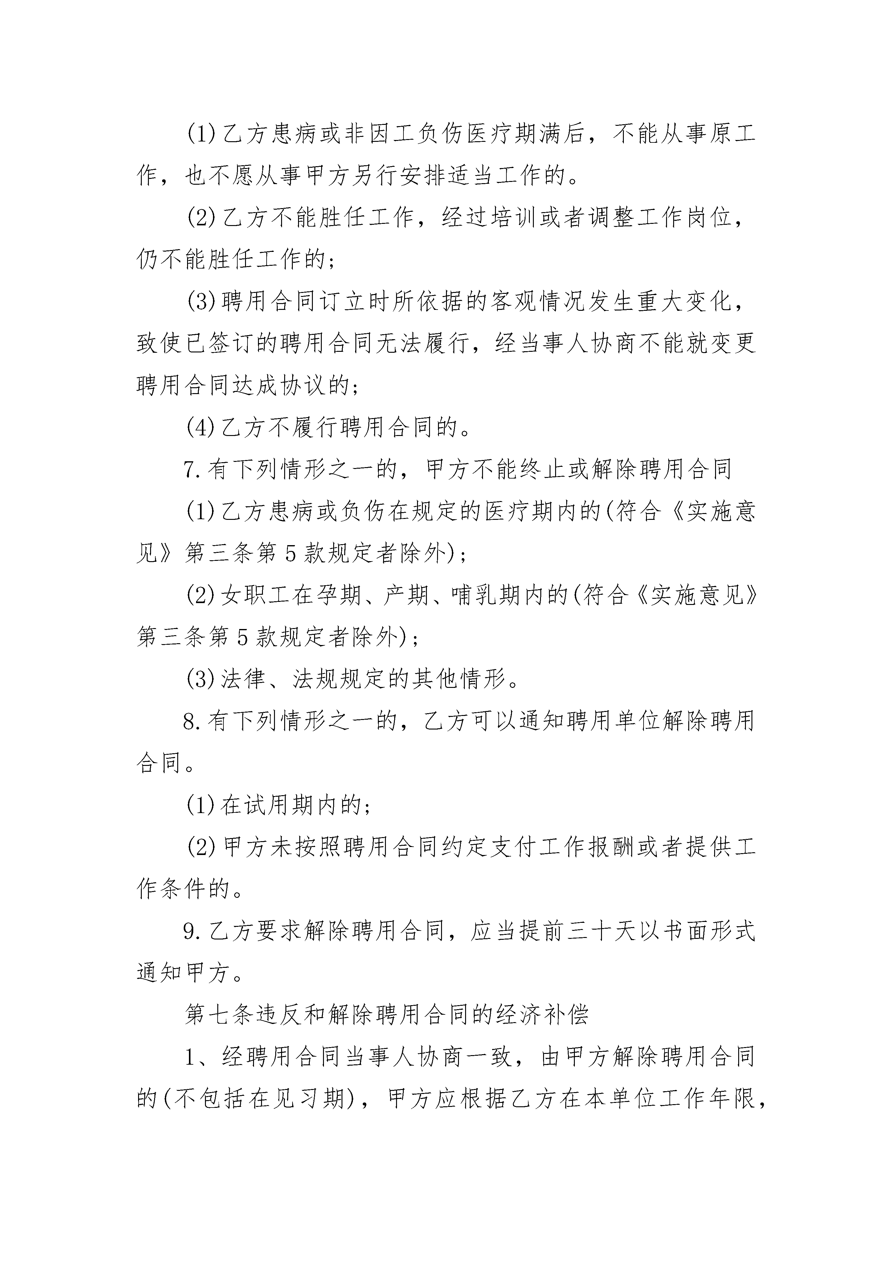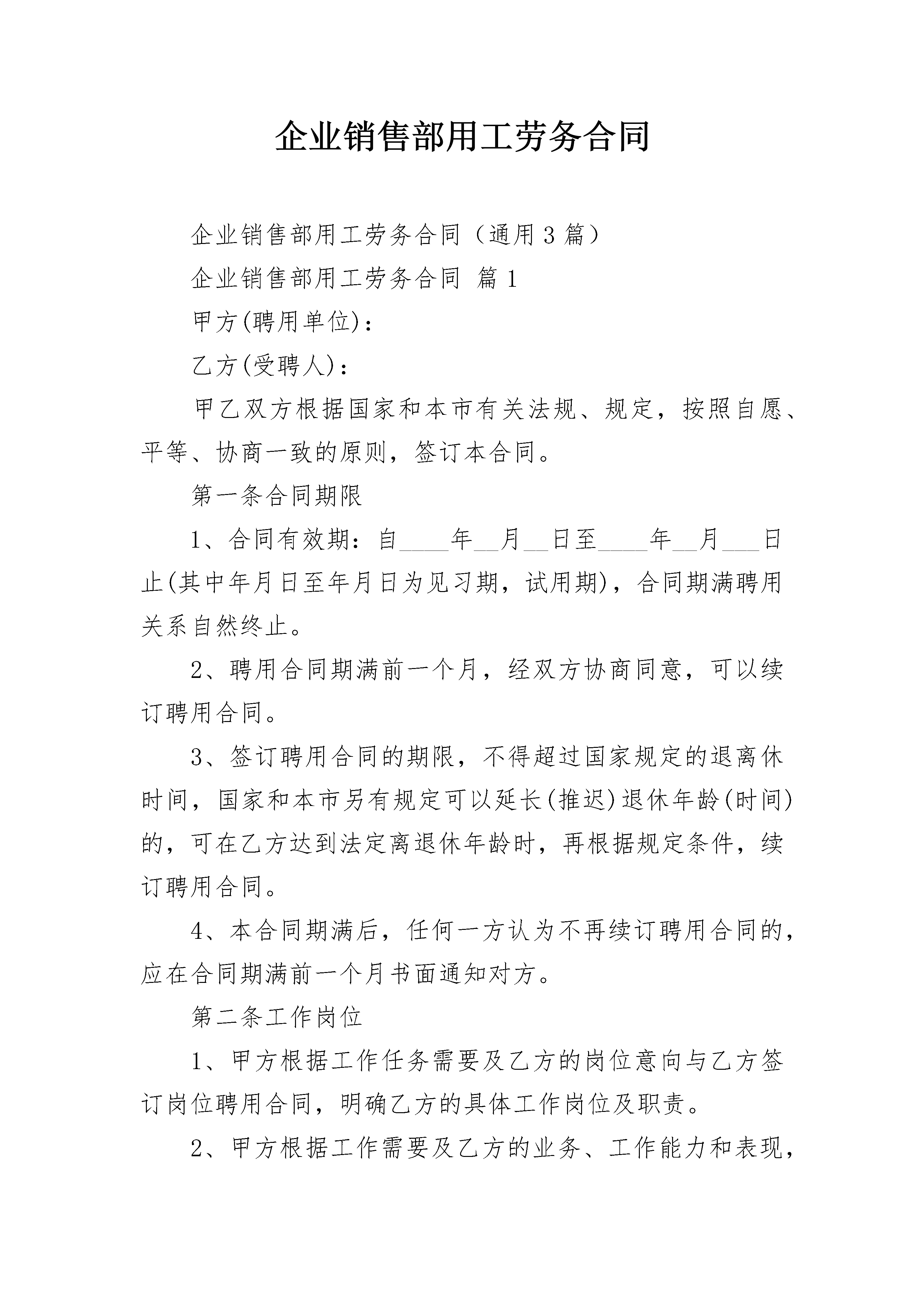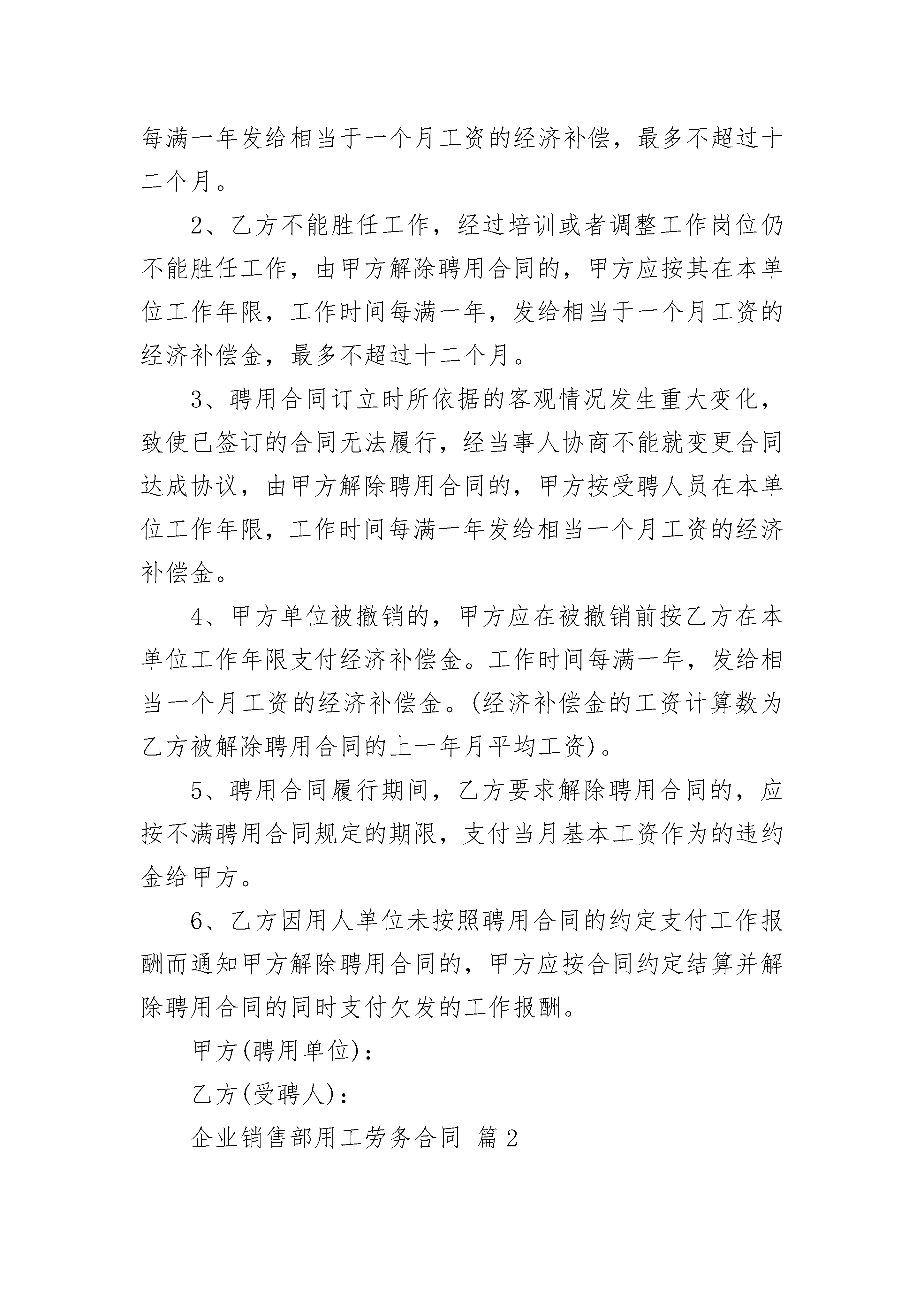 企业销售部用工劳务合同企业销售部用工劳务合同(通用3篇)企业销售部用工劳务合同篇1甲方(聘用单位):乙方(受聘人):甲乙双方根据国家和本市有关法规、规定,按照自愿、平等、协商一致的原则,签订本合同。第一条合同期限1、合同有效期:自____年__月__日至____年__月___日止(其中年月日至年月日为见习期,试用期),合同期满聘用关系自然终止。2、聘用合同期满前一个月,经双方协商同意,可以续订聘用合同。3、签订聘用合同的期限,不得超过国家规定的退离休时间,国家和本市另有规定可以延长(推迟)退休年龄(时间)的,可在乙方达到法定离退休年龄时,再根据规定条件,续订聘用合同。4、本合同期满后,任何一方认为不再续订聘用合同的,应在合同期满前一个月书面通知对方。第二条工作岗位1、甲方根据工作任务需要及乙方的岗位意向与乙方签订岗位聘用合同,明确乙方的具体工作岗位及职责。2、甲方根据工作需要及乙方的业务、工作能力和表现,可以调整乙方的工作岗位,重新签订岗位聘任合同。第三条工作条件和劳动保护1、甲方实行每周工作40小时,每天工作8小时的工作制度。2、甲方为乙方提供符合国家规定的安全卫生的工作环境,保证乙方的人身安全及人体不受危害的环境条件下工作。3、甲方根据乙方工作岗位的实际情况,按国家有关规定向乙方提供必要的劳动保护用品。4、甲方可根据工作需要组织乙方参加必要的业务知识培训。第四条工作报酬1、根据国家、市府和单位的有关规定,乙方的工作岗位,甲方按月支付乙方工资为元人民币。2、甲方根据国家、市府和单位的有关规定,调整乙方的工资。3、乙方享受规定的福利待遇。4、乙方享受国家规定的法定节假日、寒暑假、探亲假、婚假、计划生育等假期。5、甲方按期为乙方缴付养老保险金、待业保险金和其它社会保险金。第五条工作纪律、奖励和惩处1、乙方应遵守国家的法律、法规。2、乙方应遵守甲方规定的各项规章制度和劳动纪律,自觉服从甲方的管理、教育。3、甲方按市府和单位有关规定,依照乙方的工作实绩、贡献大小给予奖励。4、乙方如违反甲方的规章制度、劳动纪律,甲方按市府和单位的有关规定经予处罚。第六条聘用合同的变更、终止和解除1、聘用合同依法签订后,合同双方必须全面履行合同规定的义务,任何一方不得擅自变更合同。确需变更时,双方应协商一致,并按原签订程序变更合同。双方未达成一致意见的,原合同继续有效。2、聘用合同期满或者双方约定的合同终止条件出现时,聘用合同即自行终止。在聘用合同期满一个月前,经双方协商同意,可以续订聘用合同。3、甲方单位被撤消,聘用合同自行终止。4、经聘用合同双方当事人协商一致,聘用合同可以解除。5、乙方有下列情形之一的,甲方可以解除聘用合同。(1)在试用期内被证明不符合聘用条件的;(2)严重违反工作纪律或聘用单位规章制度的;(3)故意不完成工作任务,给公司造成严重损失的;(4)严重失职,营私舞弊,对甲方单位利益造成重大损害的;(5)被依法追究刑事责任的。6.有下列情形之一的,甲方可以解除聘用合同,但应提前三十天以书面形式通知受聘人。(1)乙方患病或非因工负伤医疗期满后,不能从事原工作,也不愿从事甲方另行安排适当工作的。(2)乙方不能胜任工作,经过培训或者调整工作岗位,仍不能胜任工作的;(3)聘用合同订立时所依据的客观情况发生重大变化,致使已签订的聘用合同无法履行,经当事人协商不能就变更聘用合同达成协议的;(4)乙方不履行聘用合同的。7.有下列情形之一的,甲方不能终止或解除聘用合同(1)乙方患病或负伤在规定的医疗期内的(符合《实施意见》第三条第5款规定者除外);(2)女职工在孕期、产期、哺乳期内的(符合《实施意见》第三条第5款规定者除外);(3)法律、法规规定的其他情形。8.有下列情形之一的,乙方可以通知聘用单位解除聘用合同。(1)在试用期内的;(2)甲方未按照聘用合同约定支付工作报酬或者提供工作条件的。9.乙方要求解除聘用合同,应当提前三十天以书面形式通知甲方。第七条违反和解除聘用合同的经济补偿1、经聘用合同当事人协商一致,由甲方解除聘用合同的(不包括在见习期),甲方应根据乙方在本单位工作年限,每满一年发给相当于一个月工资的经济补偿,最多不超过十二个月。2、乙方不能胜任工作,经过培训或者调整工作岗位仍不能胜任工作,由甲方解除聘用合同的,甲方应按其在本单位工作年限,工作时间每满一年,发给相当于一个月工资的经济补偿金,最多不超过十二个月。3、聘用合同订立时所依据的客观情况发生重大变化,致使已签订的合同无法履行,经当事人协商不能就变更合同达成协议,由甲方解除聘用合同的,甲方按受聘人员在本单位工作年限,工作时间每满一年发给相当一个月工资的经济补偿金。4、甲方单位被撤销的,甲方应在被撤销前按乙方在本单位工作年限支付经济补偿金。工作时间每满一年,发给相当一个月工资的经济补
