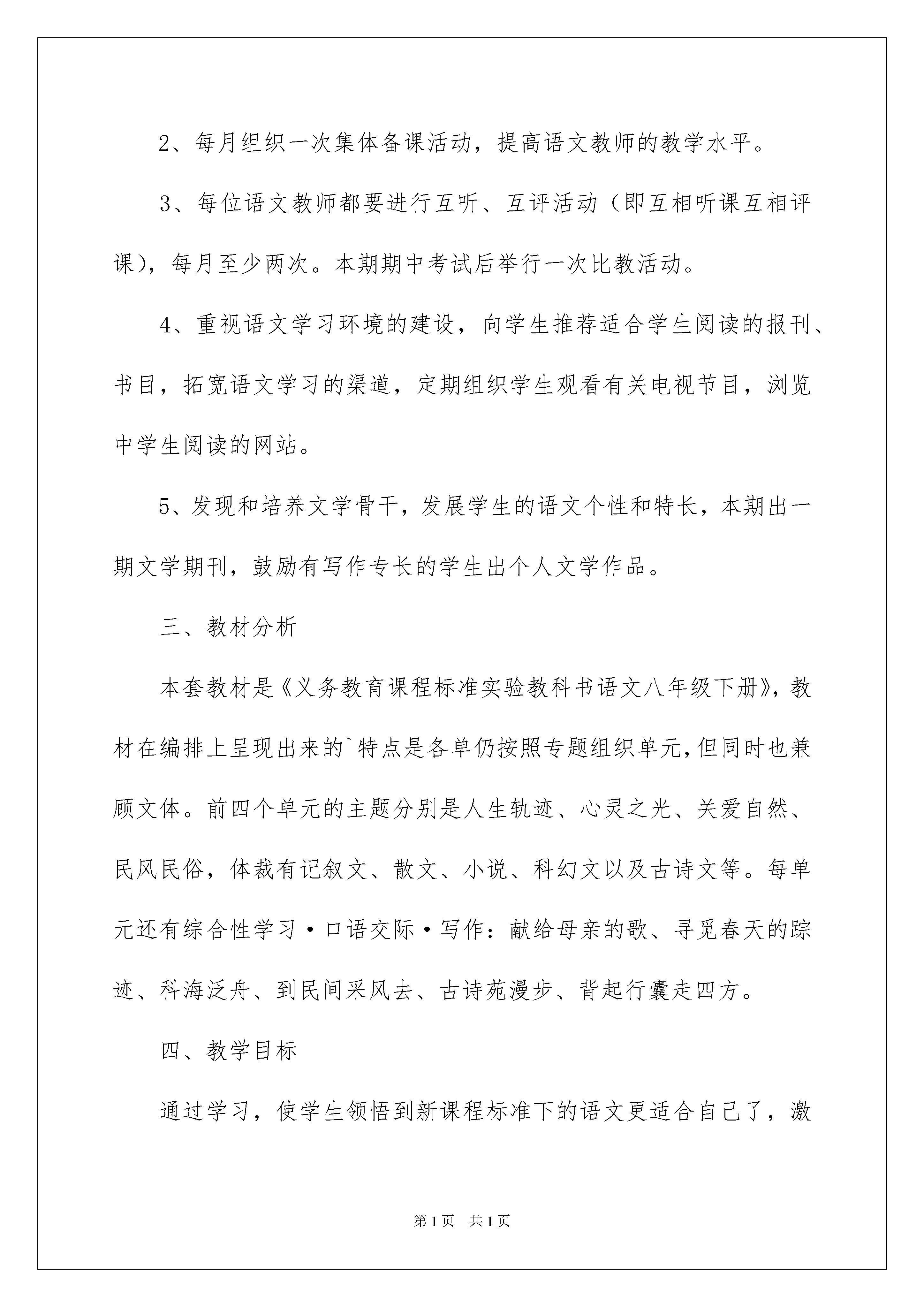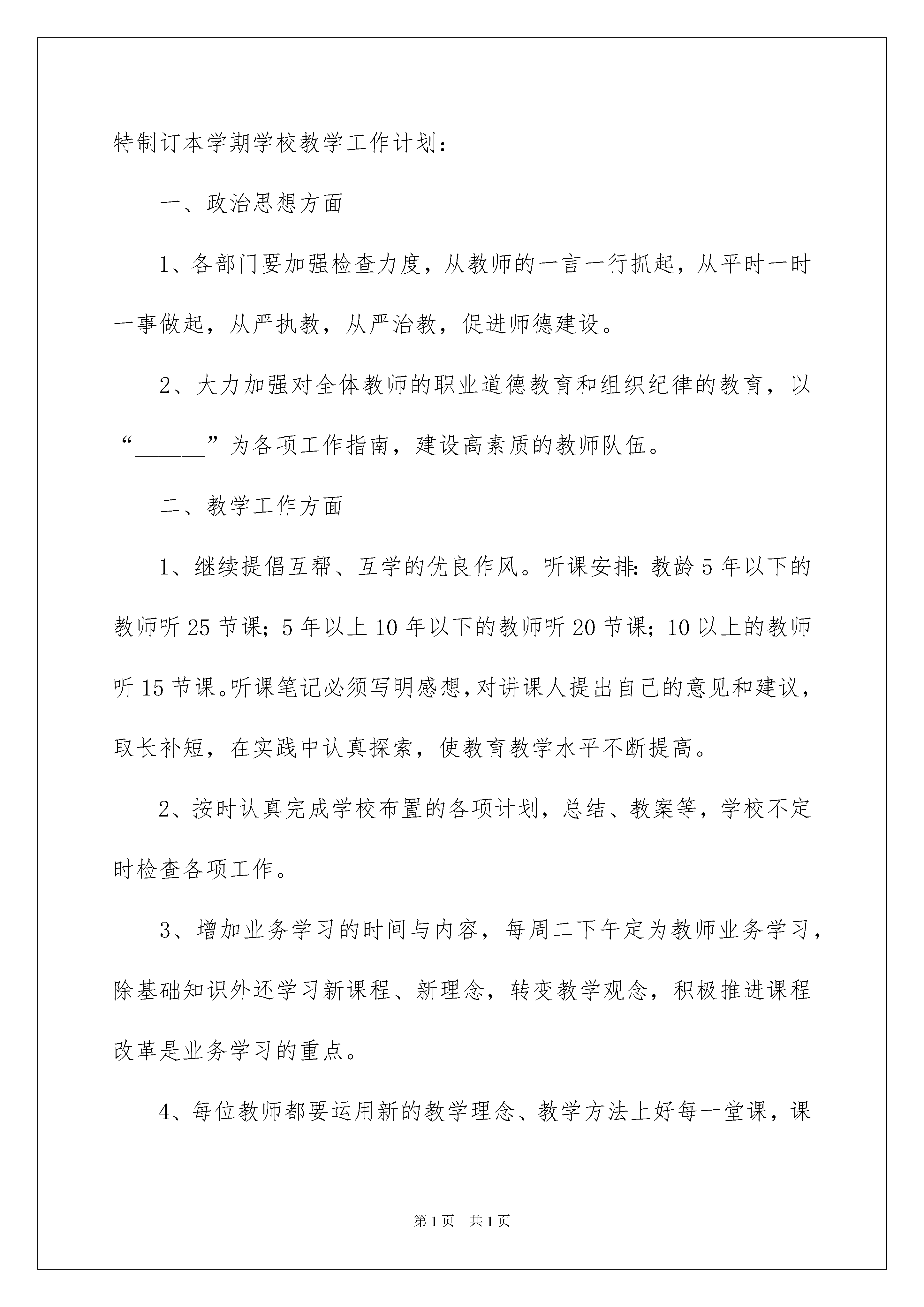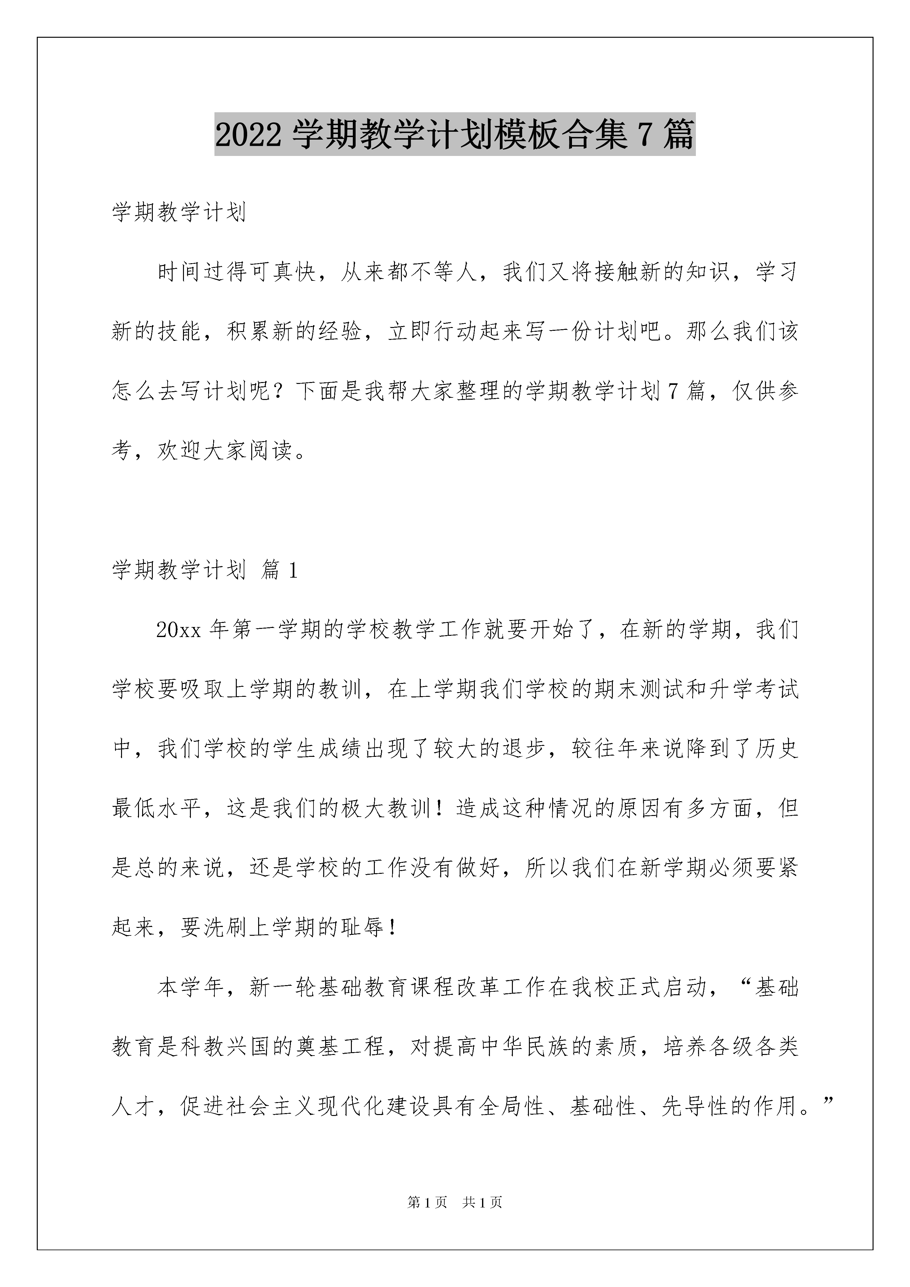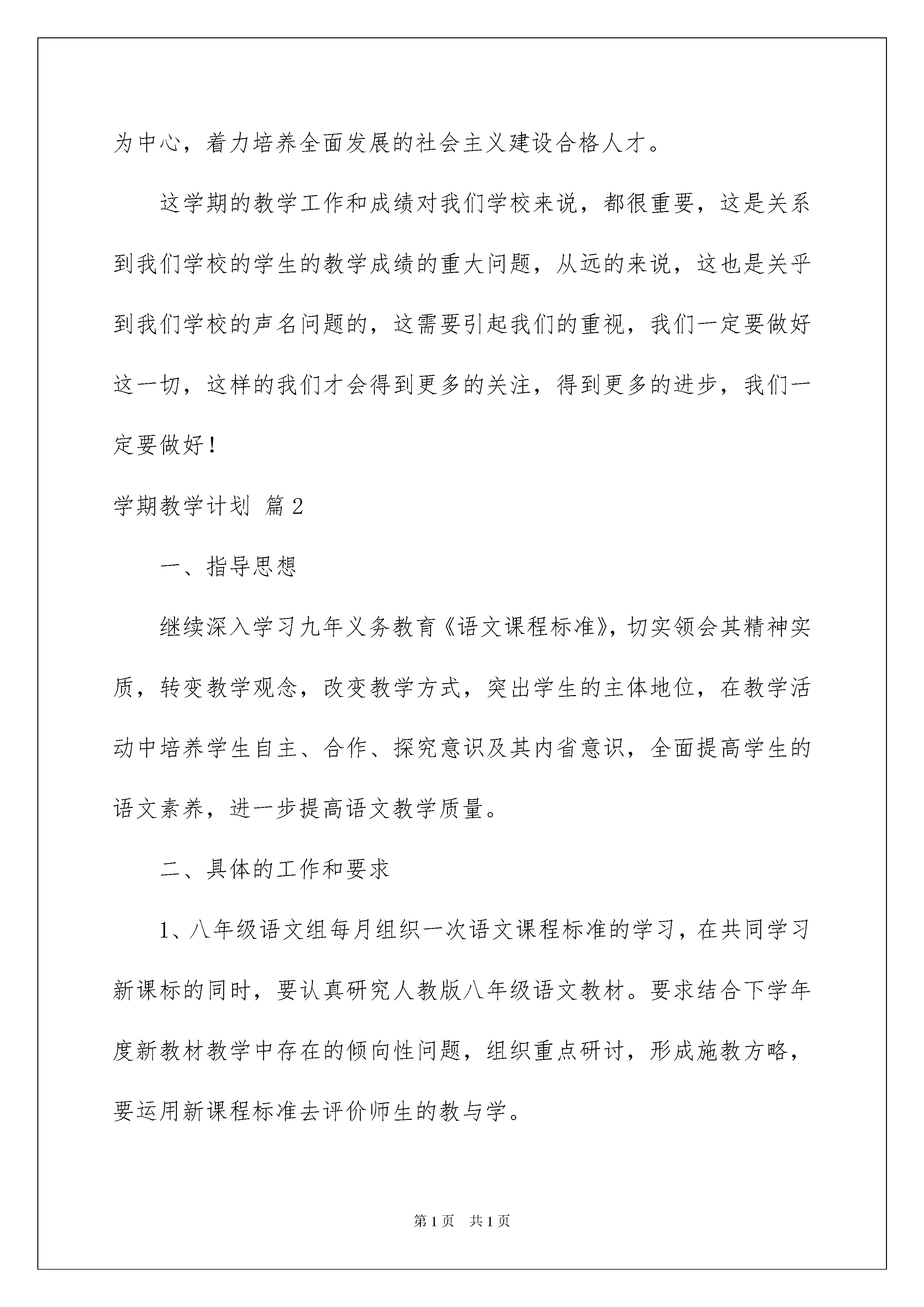 2022学期教学计划模板合集7篇学期教学计划时间过得可真快,从来都不等人,我们又将接触新的知识,学习新的技能,积累新的经验,立即行动起来写一份计划吧。那么我们该怎么去写计划呢?下面是我帮大家整理的学期教学计划7篇,仅供参考,欢迎大家阅读。学期教学计划篇120xx年第一学期的学校教学工作就要开始了,在新的学期,我们学校要吸取上学期的教训,在上学期我们学校的期末测试和升学考试中,我们学校的学生成绩出现了较大的退步,较往年来说降到了历史最低水平,这是我们的极大教训!造成这种情况的原因有多方面,但是总的来说,还是学校的工作没有做好,所以我们在新学期必须要紧起来,要洗刷上学期的耻辱!本学年,新一轮基础教育课程改革工作在我校正式启动,“基础教育是科教兴国的奠基工程,对提高中华民族的素质,培养各级各类人才,促进社会主义现代化建设具有全局性、基础性、先导性的作用。”特制订本学期学校教学工作计划:一、政治思想方面1、各部门要加强检查力度,从教师的一言一行抓起,从平时一时一事做起,从严执教,从严治教,促进师德建设。2、大力加强对全体教师的职业道德教育和组织纪律的教育,以“______”为各项工作指南,建设高素质的教师队伍。二、教学工作方面1、继续提倡互帮、互学的优良作风。听课安排:教龄5年以下的教师听25节课;5年以上10年以下的教师听20节课;10以上的教师听15节课。听课笔记必须写明感想,对讲课人提出自己的意见和建议,取长补短,在实践中认真探索,使教育教学水平不断提高。2、按时认真完成学校布置的各项计划,总结、教案等,学校不定时检查各项工作。3、增加业务学习的时间与内容,每周二下午定为教师业务学习,除基础知识外还学习新课程、新理念,转变教学观念,积极推进课程改革是业务学习的重点。4、每位教师都要运用新的教学理念、教学方法上好每一堂课,课前进行探讨,课后要进行反思,组里互相交流,不断进取。三、体育卫生加强校园管理,做好安全保卫工作,坚持每天打扫卫生,每周大扫除,每月大扫除的良好习惯;继续坚持课外兴趣小组活动,利用一切可以利用时间进行学生各种文体活动的组织训练;加强卫生健康教育,利用各种渠道培养学生良好的卫生习惯,做好“非典”预防工作。四、每周下午活动安排1、星期一政治学习;2、星期二业务学习,3、星期三教研组活动;4、星期四工会活动;5、星期五党、团活动。我们必须从科教兴国的战略高度,从提高民族素质增强综合国力的高度,来认识而推进基础教育课程改革,深刻领会具有中国特色符合素质教育要求的基础教育课程改革的重大意义,怀着强烈的使命感和紧迫感,积极地、高度负责地参与并作好基础教育改革的各项工作。全面贯彻党的教育方针,全面推进素质教育,以德育为先导,以教学为中心,着力培养全面发展的社会主义建设合格人才。这学期的教学工作和成绩对我们学校来说,都很重要,这是关系到我们学校的学生的教学成绩的重大问题,从远的来说,这也是关乎到我们学校的声名问题的,这需要引起我们的重视,我们一定要做好这一切,这样的我们才会得到更多的关注,得到更多的进步,我们一定要做好!学期教学计划篇2一、指导思想继续深入学习九年义务教育《语文课程标准》,切实领会其精神实质,转变教学观念,改变教学方式,突出学生的主体地位,在教学活动中培养学生自主、合作、探究意识及其内省意识,全面提高学生的语文素养,进一步提高语文教学质量。二、具体的工作和要求1、八年级语文组每月组织一次语文课程标准的学习,在共同学习新课标的同时,要认真研究人教版八年级语文教材。要求结合下学年度新教材教学中存在的倾向性问题,组织重点研讨,形成施教方略,要运用新课程标准去评价师生的教与学。2、每月组织一次集体备课活动,提高语文教师的教学水平。3、每位语文教师都要进行互听、互评活动(即互相听课互相评课),每月至少两次。本期期中考试后举行一次比教活动。4、重视语文学习环境的建设,向学生推荐适合学生阅读的报刊、书目,拓宽语文学习的渠道,定期组织学生观看有关电视节目,浏览中学生阅读的网站。5、发现和培养文学骨干,发展学生的语文个性和特长,本期出一期文学期刊,鼓励有写作专长的学生出个人文学作品。三、教材分析本套教材是《义务教育课程标准实验教科书语文八年级下册》,教材在编排上呈现出来的`特点是各单仍按照专题组织单元,但同时也兼顾文体。前四个单元的主题分别是人生轨迹、心灵之光、关爱自然、民风民俗,体裁有记叙文、散文、小说、科幻文以及古诗文等。每单元还有综合性学习·口语交际·写作:献给母亲的歌、寻觅春天的踪迹、科海泛舟、到民间采风去、古诗苑漫步、背起行囊走四方。四、教学目标通过学习,使学生领悟