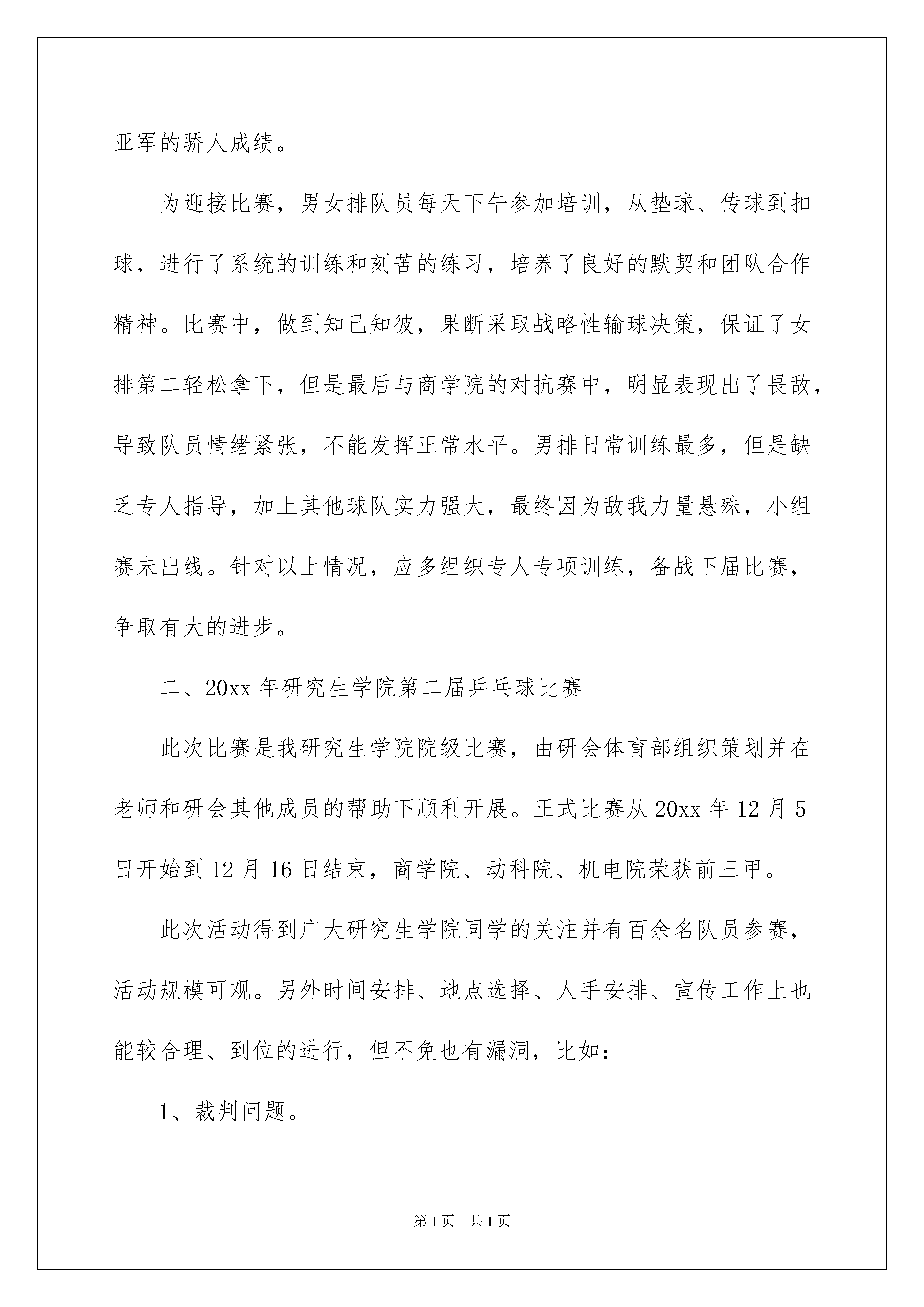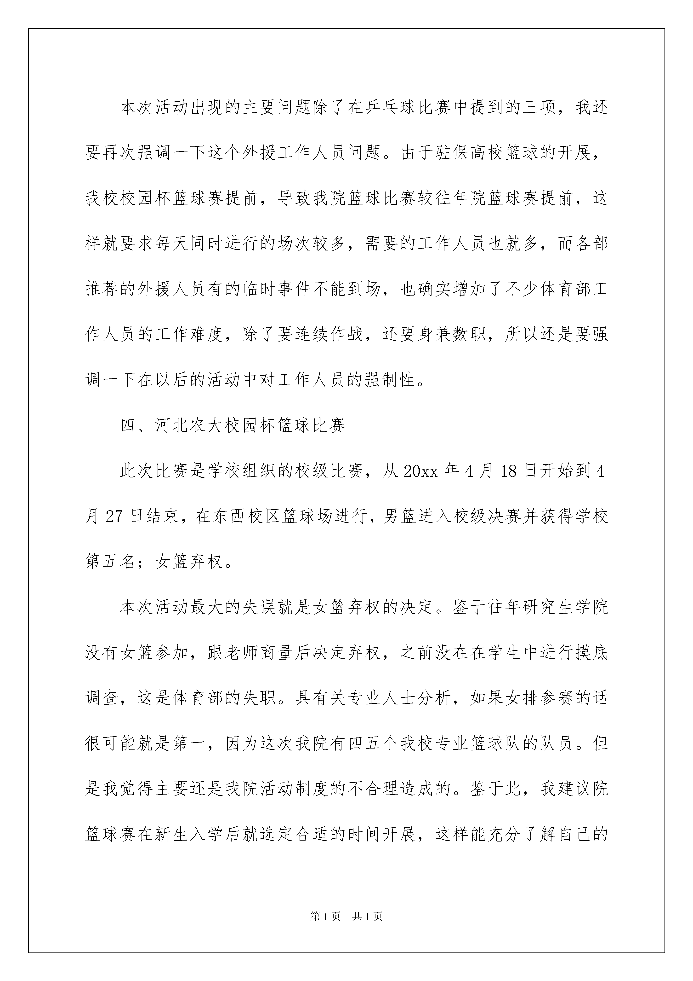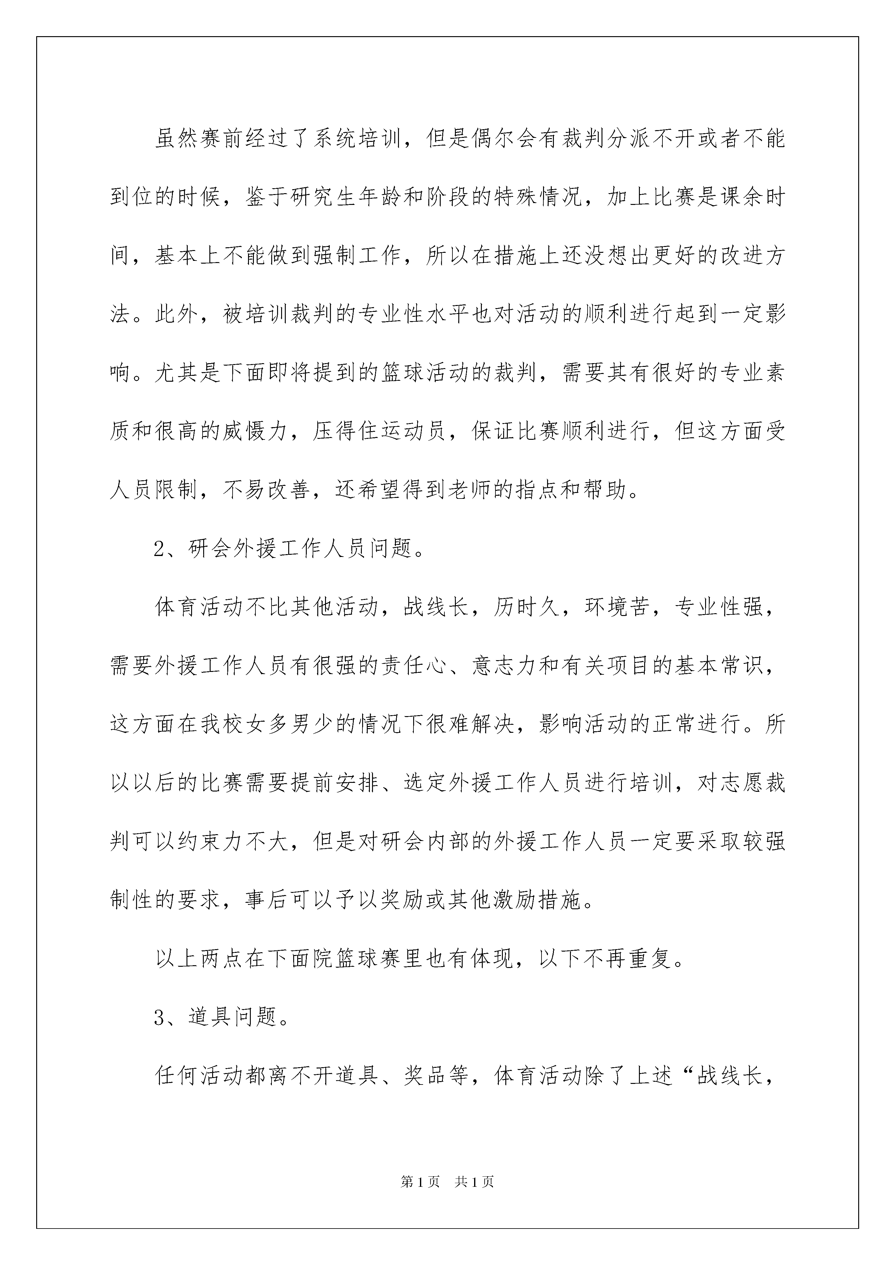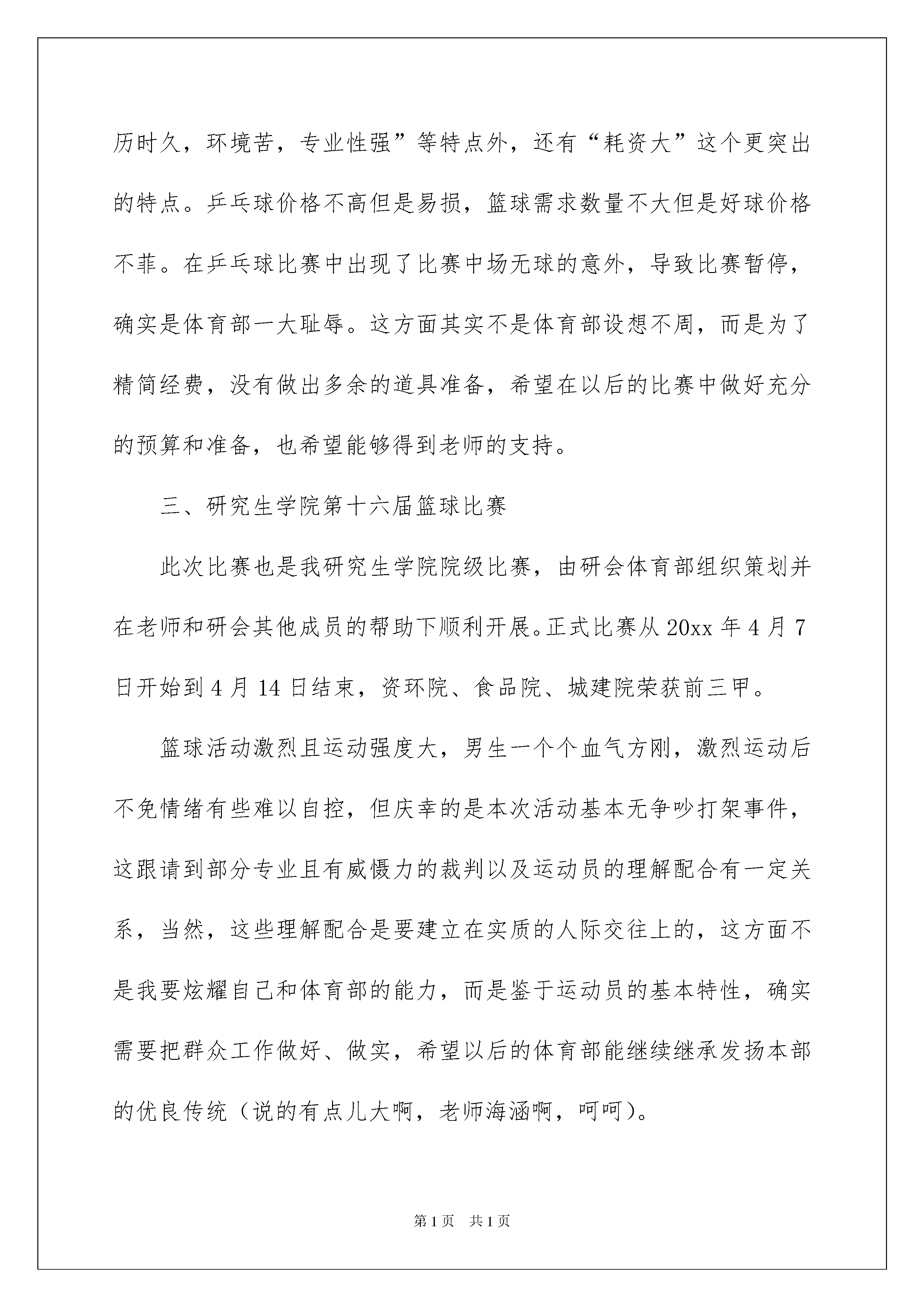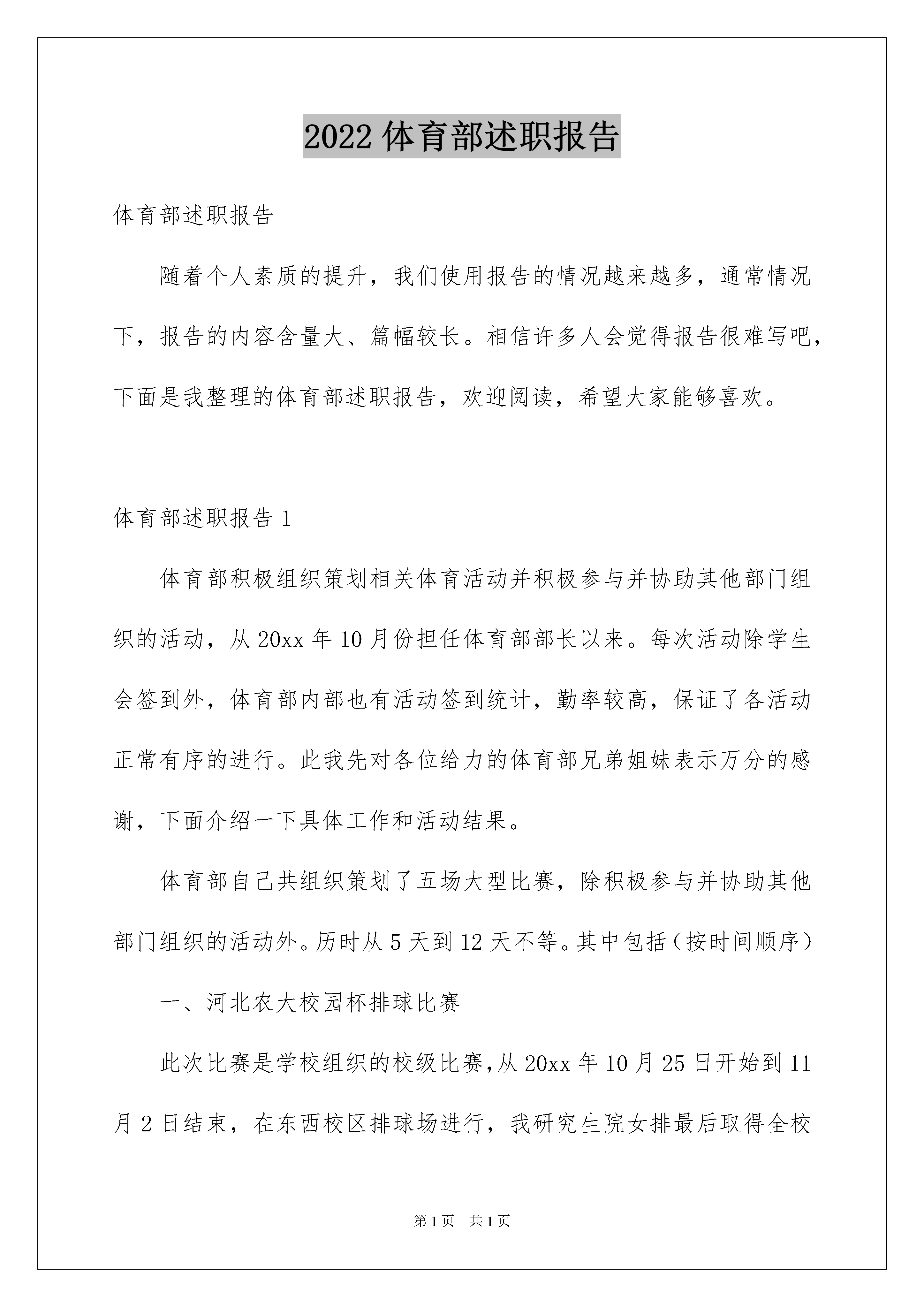 2022体育部述职报告体育部述职报告随着个人素质的提升,我们使用报告的情况越来越多,通常情况下,报告的内容含量大、篇幅较长。相信许多人会觉得报告很难写吧,下面是我整理的体育部述职报告,欢迎阅读,希望大家能够喜欢。体育部述职报告1体育部积极组织策划相关体育活动并积极参与并协助其他部门组织的活动,从20xx年10月份担任体育部部长以来。每次活动除学生会签到外,体育部内部也有活动签到统计,勤率较高,保证了各活动正常有序的进行。此我先对各位给力的体育部兄弟姐妹表示万分的感谢,下面介绍一下具体工作和活动结果。体育部自己共组织策划了五场大型比赛,除积极参与并协助其他部门组织的活动外。历时从5天到12天不等。其中包括(按时间顺序)一、河北农大校园杯排球比赛此次比赛是学校组织的校级比赛,从20xx年10月25日开始到11月2日结束,在东西校区排球场进行,我研究生院女排最后取得全校亚军的骄人成绩。为迎接比赛,男女排队员每天下午参加培训,从垫球、传球到扣球,进行了系统的训练和刻苦的练习,培养了良好的默契和团队合作精神。比赛中,做到知己知彼,果断采取战略性输球决策,保证了女排第二轻松拿下,但是最后与商学院的对抗赛中,明显表现出了畏敌,导致队员情绪紧张,不能发挥正常水平。男排日常训练最多,但是缺乏专人指导,加上其他球队实力强大,最终因为敌我力量悬殊,小组赛未出线。针对以上情况,应多组织专人专项训练,备战下届比赛,争取有大的进步。二、20xx年研究生学院第二届乒乓球比赛此次比赛是我研究生学院院级比赛,由研会体育部组织策划并在老师和研会其他成员的帮助下顺利开展。正式比赛从20xx年12月5日开始到12月16日结束,商学院、动科院、机电院荣获前三甲。此次活动得到广大研究生学院同学的关注并有百余名队员参赛,活动规模可观。另外时间安排、地点选择、人手安排、宣传工作上也能较合理、到位的进行,但不免也有漏洞,比如:1、裁判问题。虽然赛前经过了系统培训,但是偶尔会有裁判分派不开或者不能到位的时候,鉴于研究生年龄和阶段的特殊情况,加上比赛是课余时间,基本上不能做到强制工作,所以在措施上还没想出更好的改进方法。此外,被培训裁判的专业性水平也对活动的顺利进行起到一定影响。尤其是下面即将提到的篮球活动的裁判,需要其有很好的专业素质和很高的威慑力,压得住运动员,保证比赛顺利进行,但这方面受人员限制,不易改善,还希望得到老师的指点和帮助。2、研会外援工作人员问题。体育活动不比其他活动,战线长,历时久,环境苦,专业性强,需要外援工作人员有很强的责任心、意志力和有关项目的基本常识,这方面在我校女多男少的情况下很难解决,影响活动的正常进行。所以以后的比赛需要提前安排、选定外援工作人员进行培训,对志愿裁判可以约束力不大,但是对研会内部的外援工作人员一定要采取较强制性的要求,事后可以予以奖励或其他激励措施。以上两点在下面院篮球赛里也有体现,以下不再重复。3、道具问题。任何活动都离不开道具、奖品等,体育活动除了上述“战线长,历时久,环境苦,专业性强”等特点外,还有“耗资大”这个更突出的特点。乒乓球价格不高但是易损,篮球需求数量不大但是好球价格不菲。在乒乓球比赛中出现了比赛中场无球的意外,导致比赛暂停,确实是体育部一大耻辱。这方面其实不是体育部设想不周,而是为了精简经费,没有做出多余的道具准备,希望在以后的比赛中做好充分的预算和准备,也希望能够得到老师的支持。三、研究生学院第十六届篮球比赛此次比赛也是我研究生学院院级比赛,由研会体育部组织策划并在老师和研会其他成员的帮助下顺利开展。正式比赛从20xx年4月7日开始到4月14日结束,资环院、食品院、城建院荣获前三甲。篮球活动激烈且运动强度大,男生一个个血气方刚,激烈运动后不免情绪有些难以自控,但庆幸的是本次活动基本无争吵打架事件,这跟请到部分专业且有威慑力的裁判以及运动员的理解配合有一定关系,当然,这些理解配合是要建立在实质的人际交往上的,这方面不是我要炫耀自己和体育部的能力,而是鉴于运动员的基本特性,确实需要把群众工作做好、做实,希望以后的体育部能继续继承发扬本部的优良传统(说的有点儿大啊,老师海涵啊,呵呵)。本次活动出现的主要问题除了在乒乓球比赛中提到的三项,我还要再次强调一下这个外援工作人员问题。由于驻保高校篮球的开展,我校校园杯篮球赛提前,导致我院篮球比赛较往年院篮球赛提前,这样就要求每天同时进行的场次较多,需要的工作人员也就多,而各部推荐的外援人员有的临时事件不能到场,也确实增加了不少体育部工作人员的工作难度,除了要连续作战,还要身兼数职,所以还是要强调一下在以后的活动中对工作人