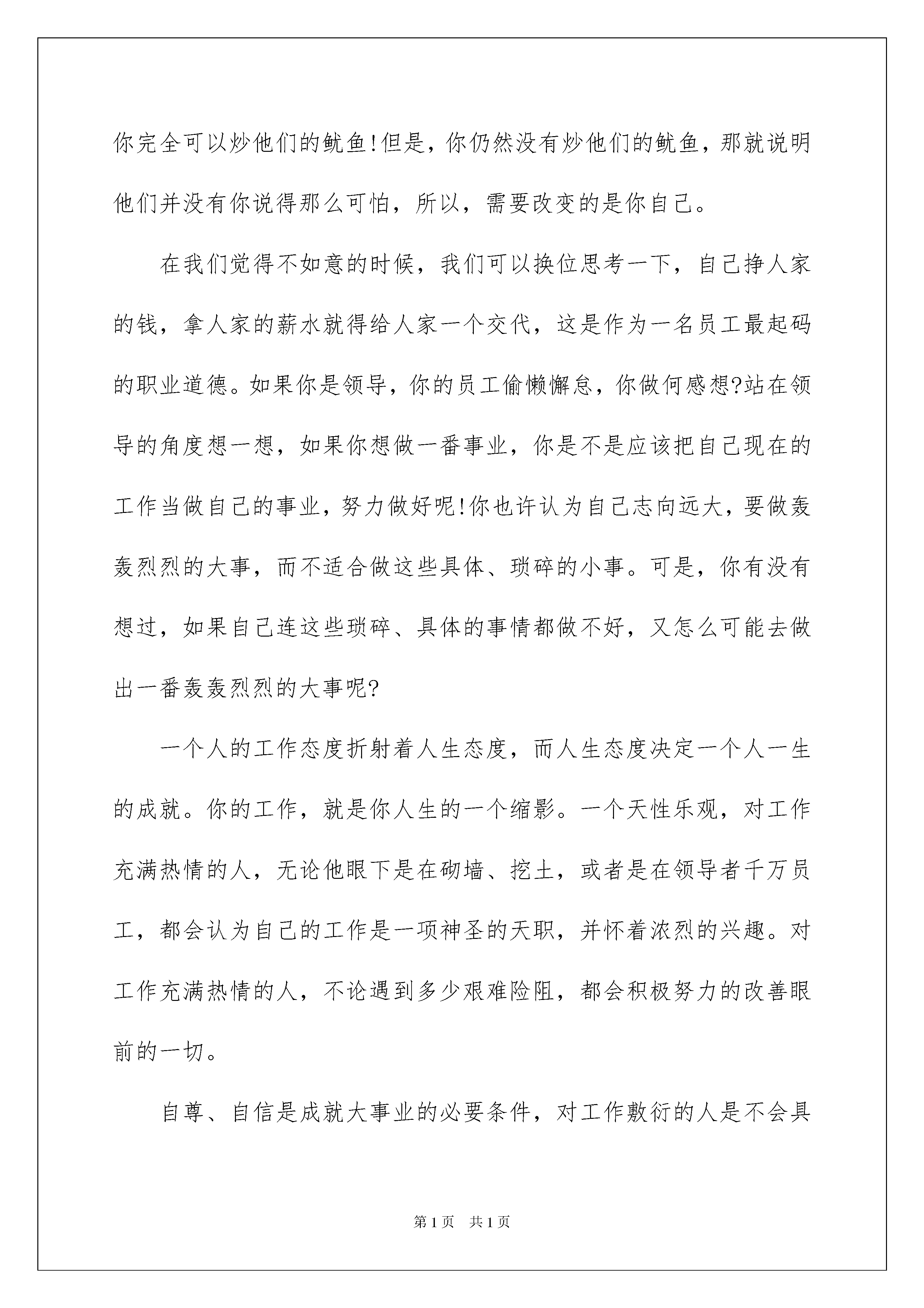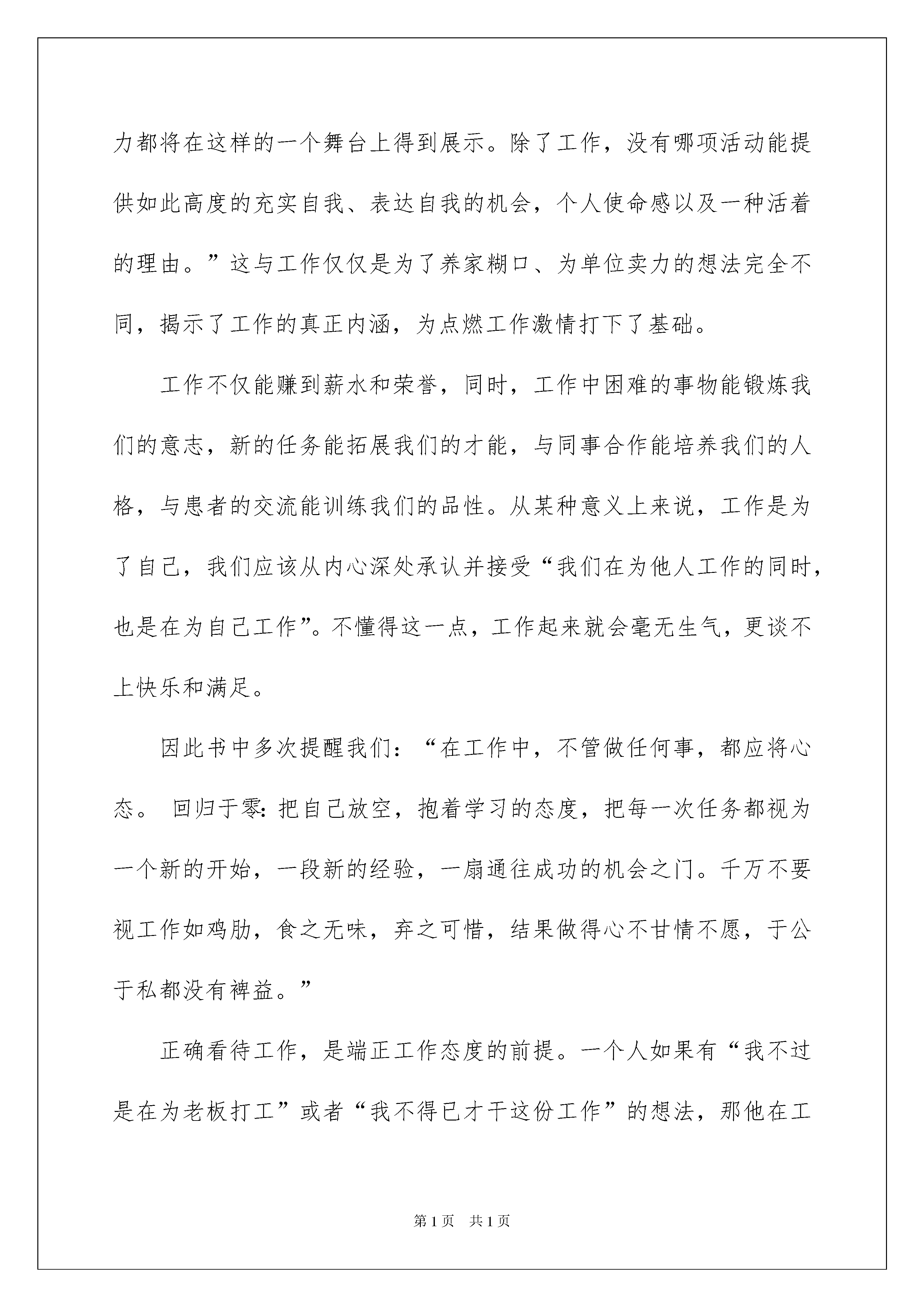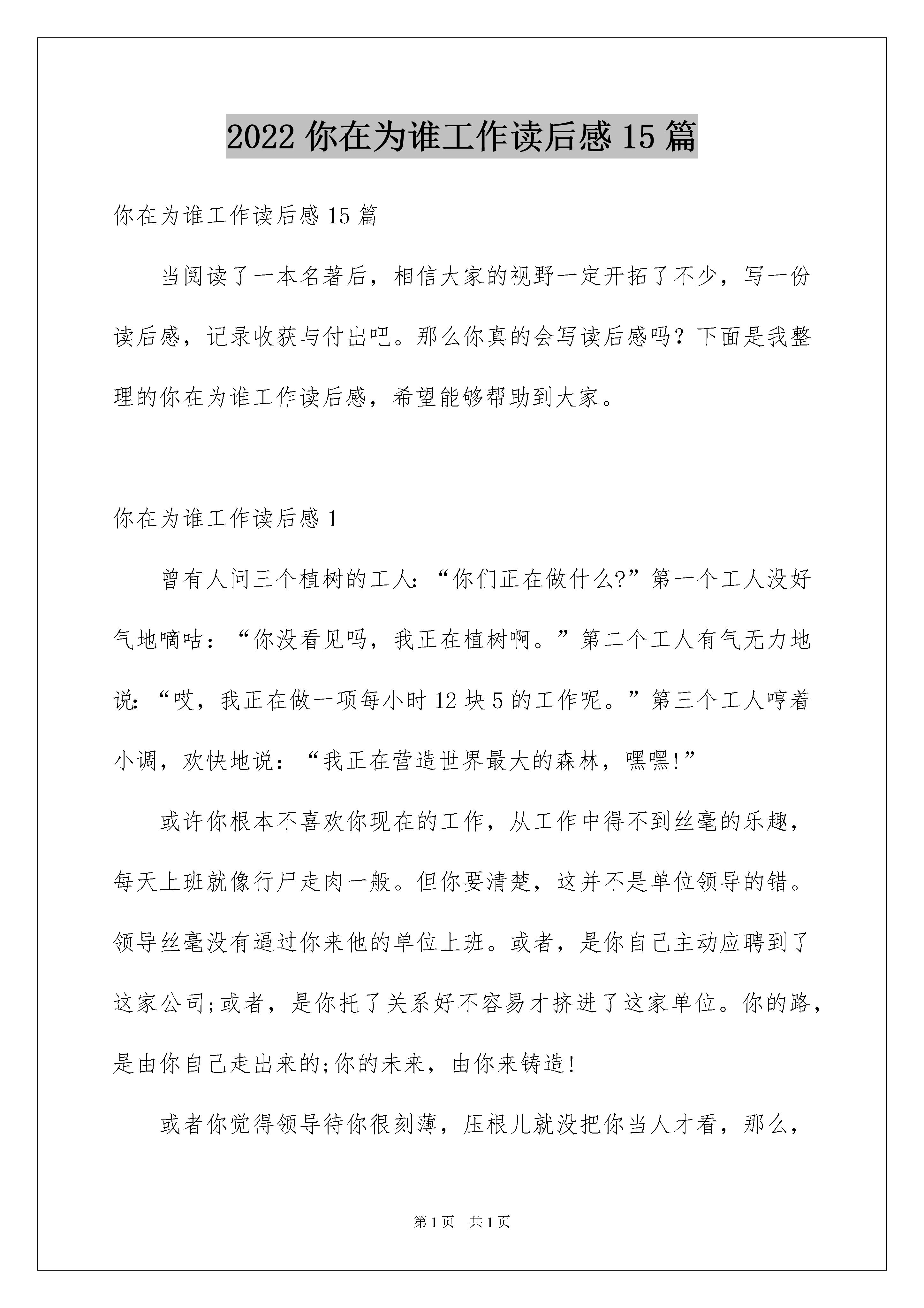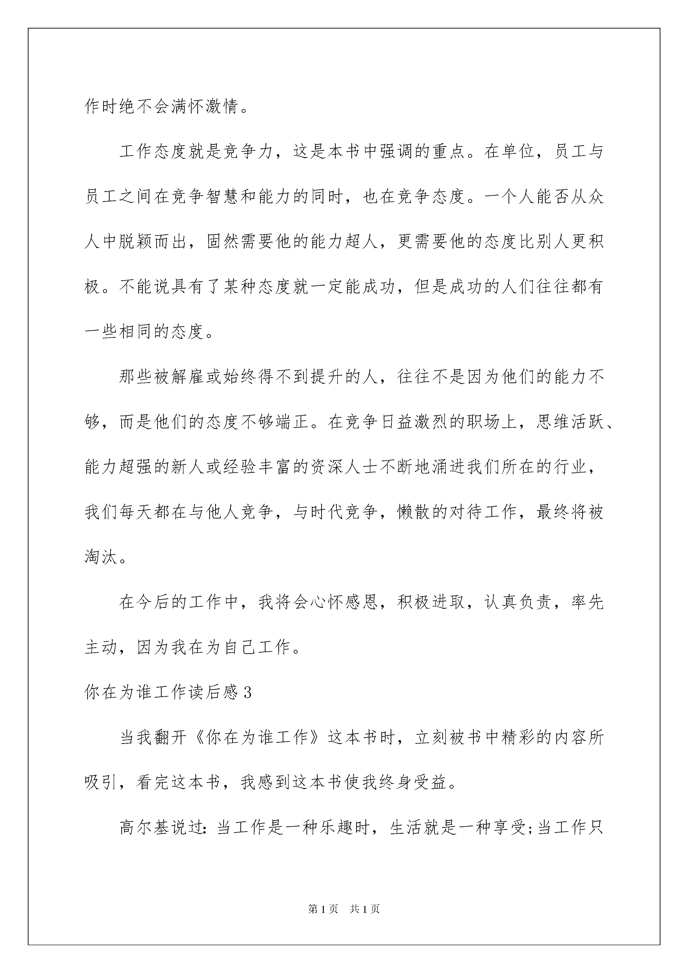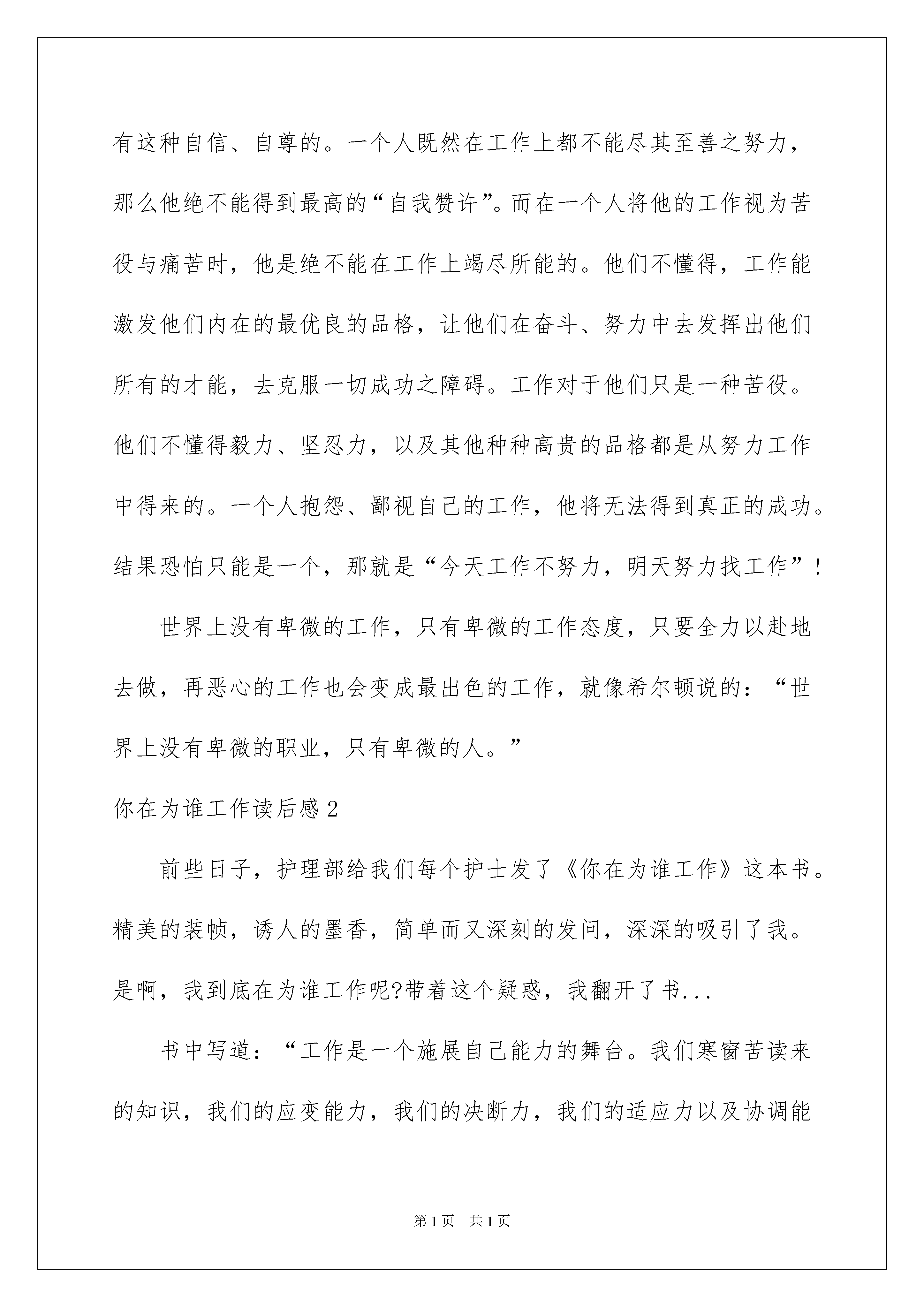 2022你在为谁工作读后感15篇你在为谁工作读后感15篇当阅读了一本名著后,相信大家的视野一定开拓了不少,写一份读后感,记录收获与付出吧。那么你真的会写读后感吗?下面是我整理的你在为谁工作读后感,希望能够帮助到大家。你在为谁工作读后感1曾有人问三个植树的工人:“你们正在做什么?”第一个工人没好气地嘀咕:“你没看见吗,我正在植树啊。”第二个工人有气无力地说:“哎,我正在做一项每小时12块5的工作呢。”第三个工人哼着小调,欢快地说:“我正在营造世界最大的森林,嘿嘿!”或许你根本不喜欢你现在的工作,从工作中得不到丝毫的乐趣,每天上班就像行尸走肉一般。但你要清楚,这并不是单位领导的错。领导丝毫没有逼过你来他的单位上班。或者,是你自己主动应聘到了这家公司;或者,是你托了关系好不容易才挤进了这家单位。你的路,是由你自己走出来的;你的未来,由你来铸造!或者你觉得领导待你很刻薄,压根儿就没把你当人才看,那么,你完全可以炒他们的鱿鱼!但是,你仍然没有炒他们的鱿鱼,那就说明他们并没有你说得那么可怕,所以,需要改变的是你自己。在我们觉得不如意的时候,我们可以换位思考一下,自己挣人家的钱,拿人家的薪水就得给人家一个交代,这是作为一名员工最起码的职业道德。如果你是领导,你的员工偷懒懈怠,你做何感想?站在领导的角度想一想,如果你想做一番事业,你是不是应该把自己现在的工作当做自己的事业,努力做好呢!你也许认为自己志向远大,要做轰轰烈烈的大事,而不适合做这些具体、琐碎的小事。可是,你有没有想过,如果自己连这些琐碎、具体的事情都做不好,又怎么可能去做出一番轰轰烈烈的大事呢?一个人的工作态度折射着人生态度,而人生态度决定一个人一生的成就。你的工作,就是你人生的一个缩影。一个天性乐观,对工作充满热情的人,无论他眼下是在砌墙、挖土,或者是在领导者千万员工,都会认为自己的工作是一项神圣的天职,并怀着浓烈的兴趣。对工作充满热情的人,不论遇到多少艰难险阻,都会积极努力的改善眼前的一切。自尊、自信是成就大事业的必要条件,对工作敷衍的人是不会具有这种自信、自尊的。一个人既然在工作上都不能尽其至善之努力,那么他绝不能得到最高的“自我赞许”。而在一个人将他的工作视为苦役与痛苦时,他是绝不能在工作上竭尽所能的。他们不懂得,工作能激发他们内在的最优良的品格,让他们在奋斗、努力中去发挥出他们所有的才能,去克服一切成功之障碍。工作对于他们只是一种苦役。他们不懂得毅力、坚忍力,以及其他种种高贵的品格都是从努力工作中得来的。一个人抱怨、鄙视自己的工作,他将无法得到真正的成功。结果恐怕只能是一个,那就是“今天工作不努力,明天努力找工作”!世界上没有卑微的工作,只有卑微的工作态度,只要全力以赴地去做,再恶心的工作也会变成最出色的工作,就像希尔顿说的:“世界上没有卑微的职业,只有卑微的人。”你在为谁工作读后感2前些日子,护理部给我们每个护士发了《你在为谁工作》这本书。精美的装帧,诱人的墨香,简单而又深刻的发问,深深的吸引了我。是啊,我到底在为谁工作呢?带着这个疑惑,我翻开了书...书中写道:“工作是一个施展自己能力的舞台。我们寒窗苦读来的知识,我们的应变能力,我们的决断力,我们的适应力以及协调能力都将在这样的一个舞台上得到展示。除了工作,没有哪项活动能提供如此高度的充实自我、表达自我的机会,个人使命感以及一种活着的理由。”这与工作仅仅是为了养家糊口、为单位卖力的想法完全不同,揭示了工作的真正内涵,为点燃工作激情打下了基础。工作不仅能赚到薪水和荣誉,同时,工作中困难的事物能锻炼我们的意志,新的任务能拓展我们的才能,与同事合作能培养我们的人格,与患者的交流能训练我们的品性。从某种意义上来说,工作是为了自己,我们应该从内心深处承认并接受“我们在为他人工作的同时,也是在为自己工作”。不懂得这一点,工作起来就会毫无生气,更谈不上快乐和满足。因此书中多次提醒我们:“在工作中,不管做任何事,都应将心态。回归于零:把自己放空,抱着学习的态度,把每一次任务都视为一个新的开始,一段新的经验,一扇通往成功的机会之门。千万不要视工作如鸡肋,食之无味,弃之可惜,结果做得心不甘情不愿,于公于私都没有裨益。”正确看待工作,是端正工作态度的前提。一个人如果有“我不过是在为老板打工”或者“我不得已才干这份工作”的想法,那他在工作时绝不会满怀激情。工作态度就是竞争力,这是本书中强调的重点。在单位,员工与员工之间在竞争智慧和能力的同时,也在竞争态度。一个人能否从众人中脱颖而出,固然需要他的能力超人,更需要他的态度比别人更积极。不能说具有了某种态度就一定能成功,但是成功的人们往往都