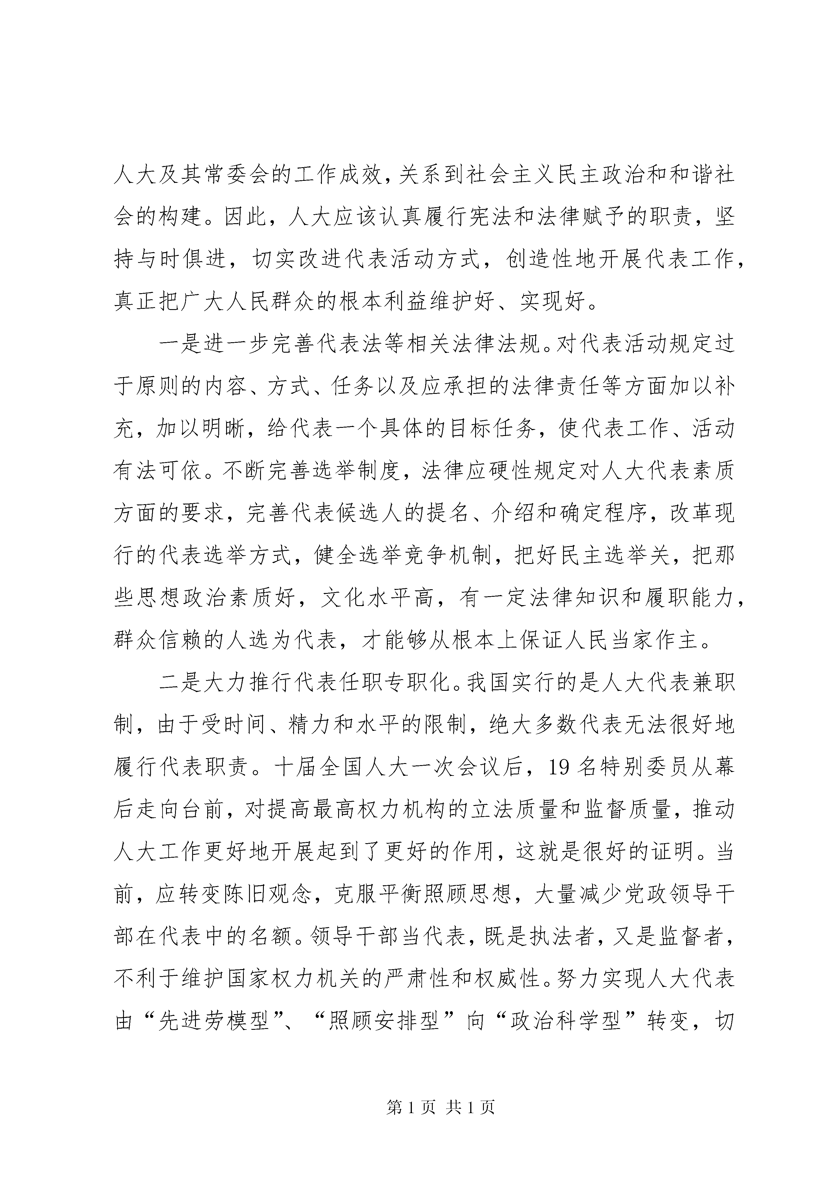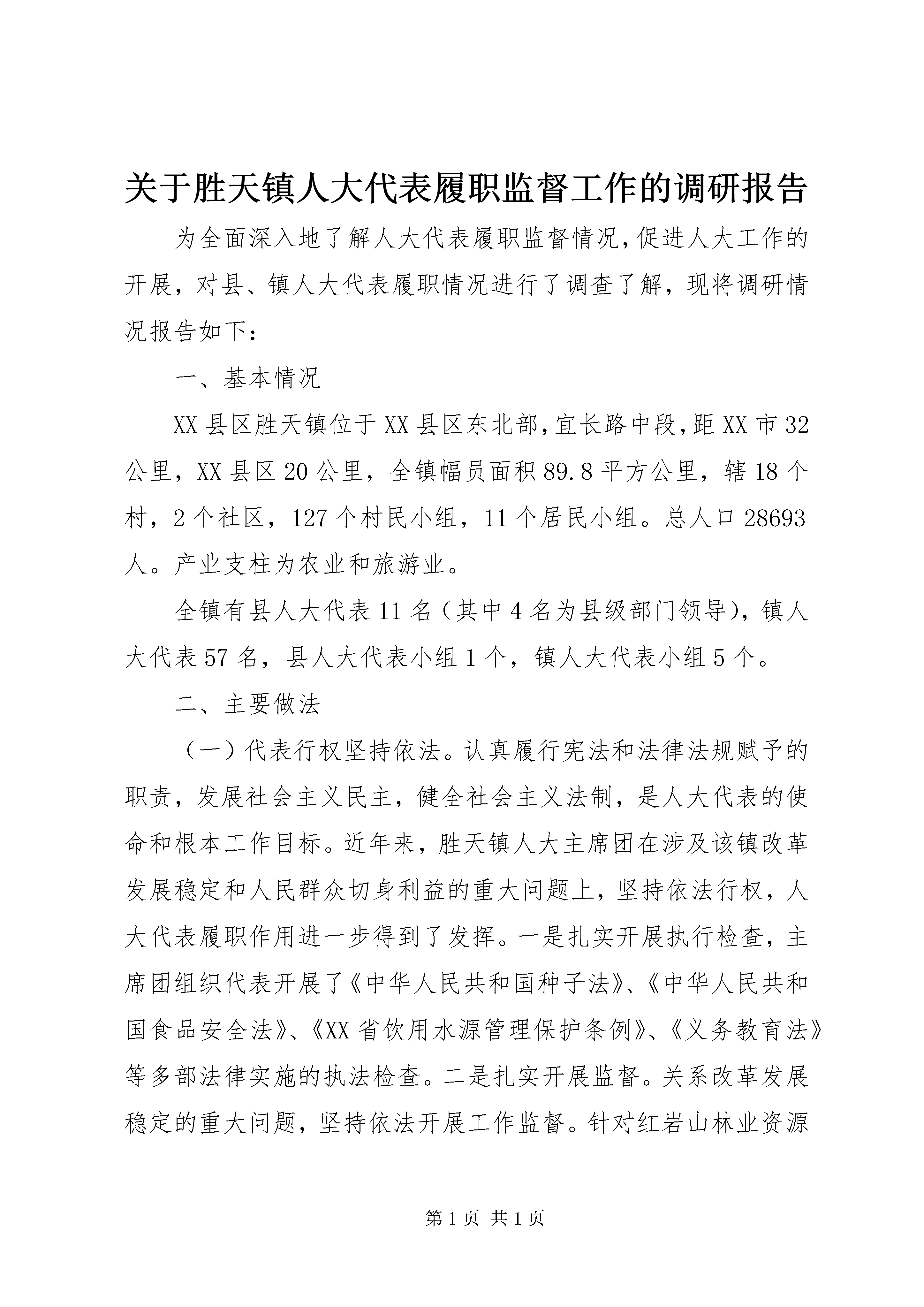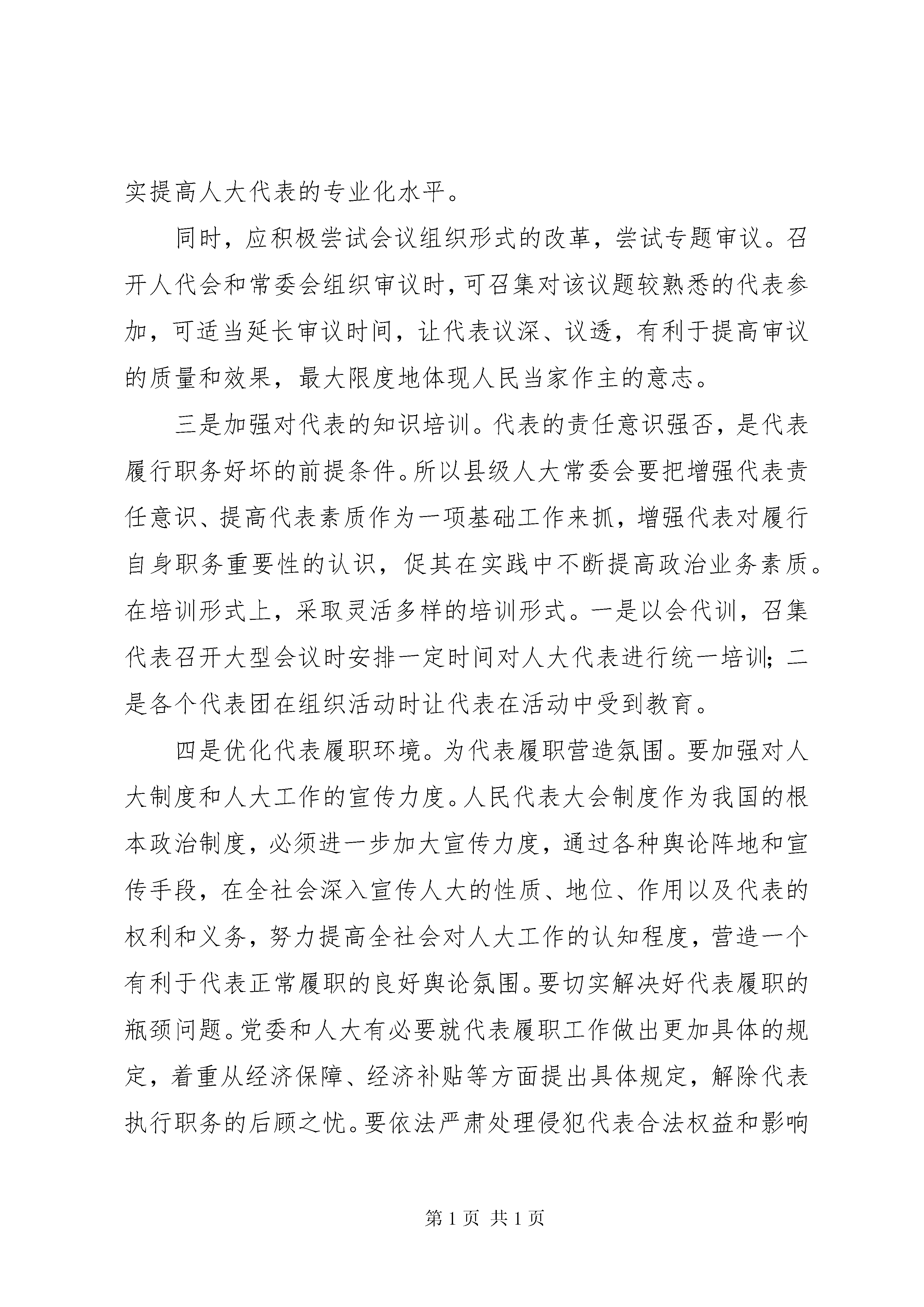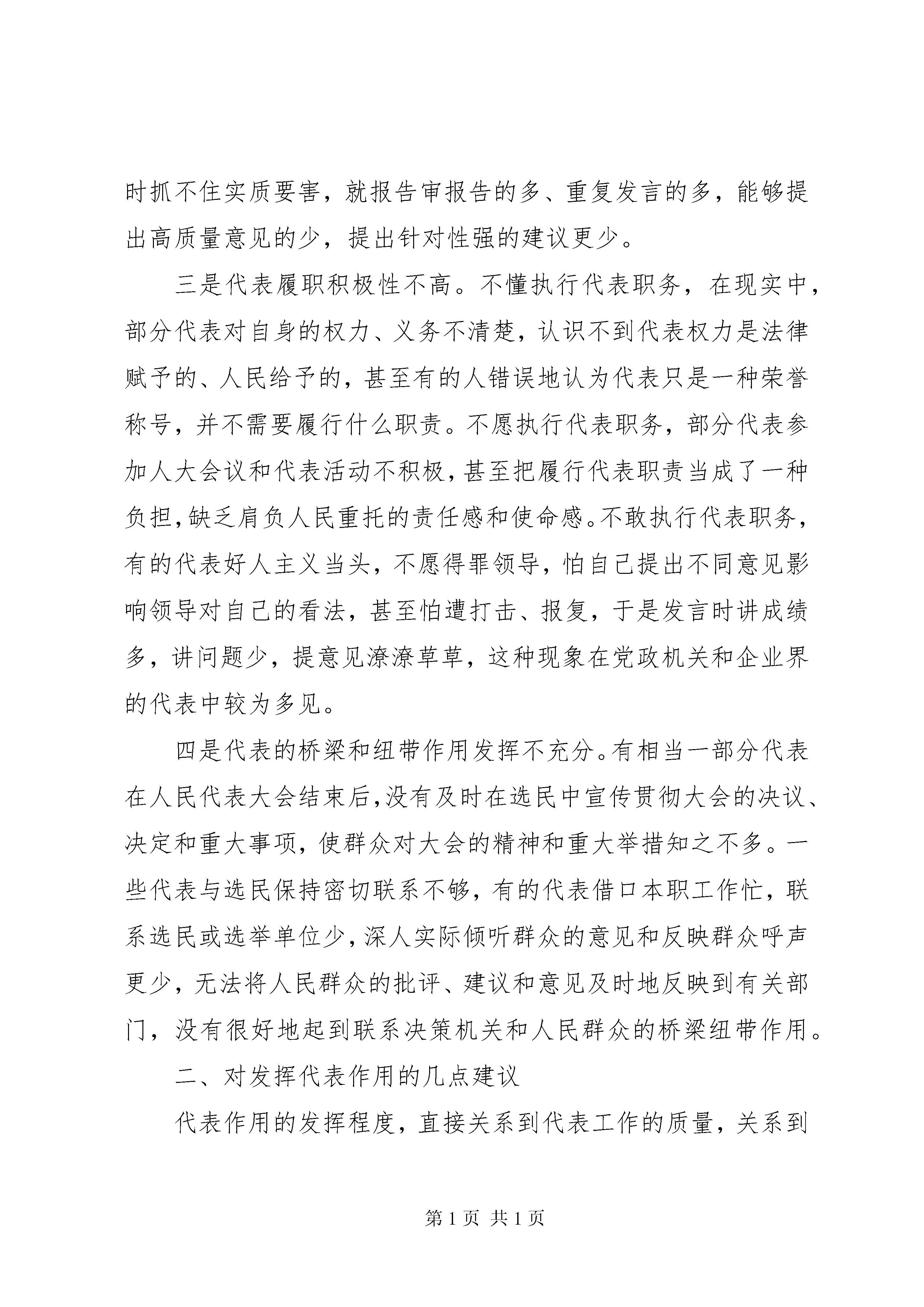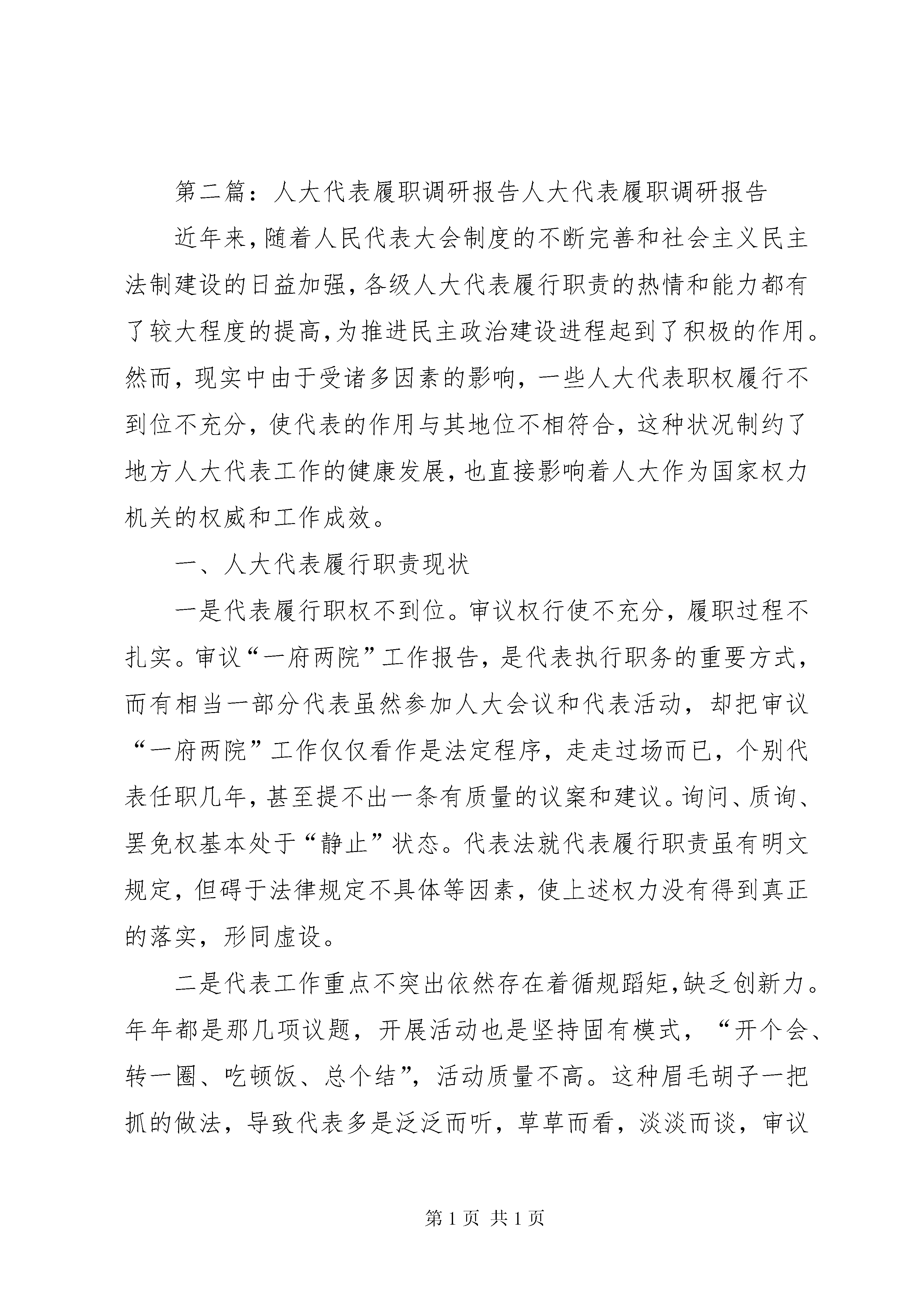 关于胜天镇人大代表履职监督工作的调研报告为全面深入地了解人大代表履职监督情况,促进人大工作的开展,对县、镇人大代表履职情况进行了调查了解,现将调研情况报告如下:一、基本情况XX县区胜天镇位于XX县区东北部,宜长路中段,距XX市32公里,XX县区20公里,全镇幅员面积89.8平方公里,辖18个村,2个社区,127个村民小组,11个居民小组。总人口28693人。产业支柱为农业和旅游业。全镇有县人大代表11名(其中4名为县级部门领导),镇人大代表57名,县人大代表小组1个,镇人大代表小组5个。二、主要做法(一)代表行权坚持依法。认真履行宪法和法律法规赋予的职责,发展社会主义民主,健全社会主义法制,是人大代表的使命和根本工作目标。近年来,胜天镇人大主席团在涉及该镇改革发展稳定和人民群众切身利益的重大问题上,坚持依法行权,人大代表履职作用进一步得到了发挥。一是扎实开展执行检查,主席团组织代表开展了《中华人民共和国种子法》、《中华人民共和国食品安全法》、《XX省饮用水源管理保护条例》、《义务教育法》等多部法律实施的执法检查。二是扎实开展监督。关系改革发展稳定的重大问题,坚持依法开展工作监督。针对红岩山林业资源第二篇:人大代表履职调研报告人大代表履职调研报告近年来,随着人民代表大会制度的不断完善和社会主义民主法制建设的日益加强,各级人大代表履行职责的热情和能力都有了较大程度的提高,为推进民主政治建设进程起到了积极的作用。然而,现实中由于受诸多因素的影响,一些人大代表职权履行不到位不充分,使代表的作用与其地位不相符合,这种状况制约了地方人大代表工作的健康发展,也直接影响着人大作为国家权力机关的权威和工作成效。一、人大代表履行职责现状一是代表履行职权不到位。审议权行使不充分,履职过程不扎实。审议“一府两院”工作报告,是代表执行职务的重要方式,而有相当一部分代表虽然参加人大会议和代表活动,却把审议“一府两院”工作仅仅看作是法定程序,走走过场而已,个别代表任职几年,甚至提不出一条有质量的议案和建议。询问、质询、罢免权基本处于“静止”状态。代表法就代表履行职责虽有明文规定,但碍于法律规定不具体等因素,使上述权力没有得到真正的落实,形同虚设。二是代表工作重点不突出依然存在着循规蹈矩,缺乏创新力。年年都是那几项议题,开展活动也是坚持固有模式,“开个会、转一圈、吃顿饭、总个结”,活动质量不高。这种眉毛胡子一把抓的做法,导致代表多是泛泛而听,草草而看,淡淡而谈,审议时抓不住实质要害,就报告审报告的多、重复发言的多,能够提出高质量意见的少,提出针对性强的建议更少。三是代表履职积极性不高。不懂执行代表职务,在现实中,部分代表对自身的权力、义务不清楚,认识不到代表权力是法律赋予的、人民给予的,甚至有的人错误地认为代表只是一种荣誉称号,并不需要履行什么职责。不愿执行代表职务,部分代表参加人大会议和代表活动不积极,甚至把履行代表职责当成了一种负担,缺乏肩负人民重托的责任感和使命感。不敢执行代表职务,有的代表好人主义当头,不愿得罪领导,怕自己提出不同意见影响领导对自己的看法,甚至怕遭打击、报复,于是发言时讲成绩多,讲问题少,提意见潦潦草草,这种现象在党政机关和企业界的代表中较为多见。四是代表的桥梁和纽带作用发挥不充分。有相当一部分代表在人民代表大会结束后,没有及时在选民中宣传贯彻大会的决议、决定和重大事项,使群众对大会的精神和重大举措知之不多。一些代表与选民保持密切联系不够,有的代表借口本职工作忙,联系选民或选举单位少,深人实际倾听群众的意见和反映群众呼声更少,无法将人民群众的批评、建议和意见及时地反映到有关部门,没有很好地起到联系决策机关和人民群众的桥梁纽带作用。二、对发挥代表作用的几点建议代表作用的发挥程度,直接关系到代表工作的质量,关系到人大及其常委会的工作成效,关系到社会主义民主政治和和谐社会的构建。因此,人大应该认真履行宪法和法律赋予的职责,坚持与时俱进,切实改进代表活动方式,创造性地开展代表工作,真正把广大人民群众的根本利益维护好、实现好。一是进一步完善代表法等相关法律法规。对代表活动规定过于原则的内容、方式、任务以及应承担的法律责任等方面加以补充,加以明晰,给代表一个具体的目标任务,使代表工作、活动有法可依。不断完善选举制度,法律应硬性规定对人大代表素质方面的要求,完善代表候选人的提名、介绍和确定程序,改革现行的代表选举方式,健全选举竞争机制,把好民主选举关,把那些思想政治素质好,文化水平高,有一定法律知识和履职能力,群众信赖的人选为代表,才能够从根本上保证人民当家作主。二是大力推行代表任职专职化。我国实行的是人大代表兼职制,由于受时间、精力和水平的限制,绝大多数代表无法很好地履行代表职责。十届全国人大一次会议后,19名特别委员从