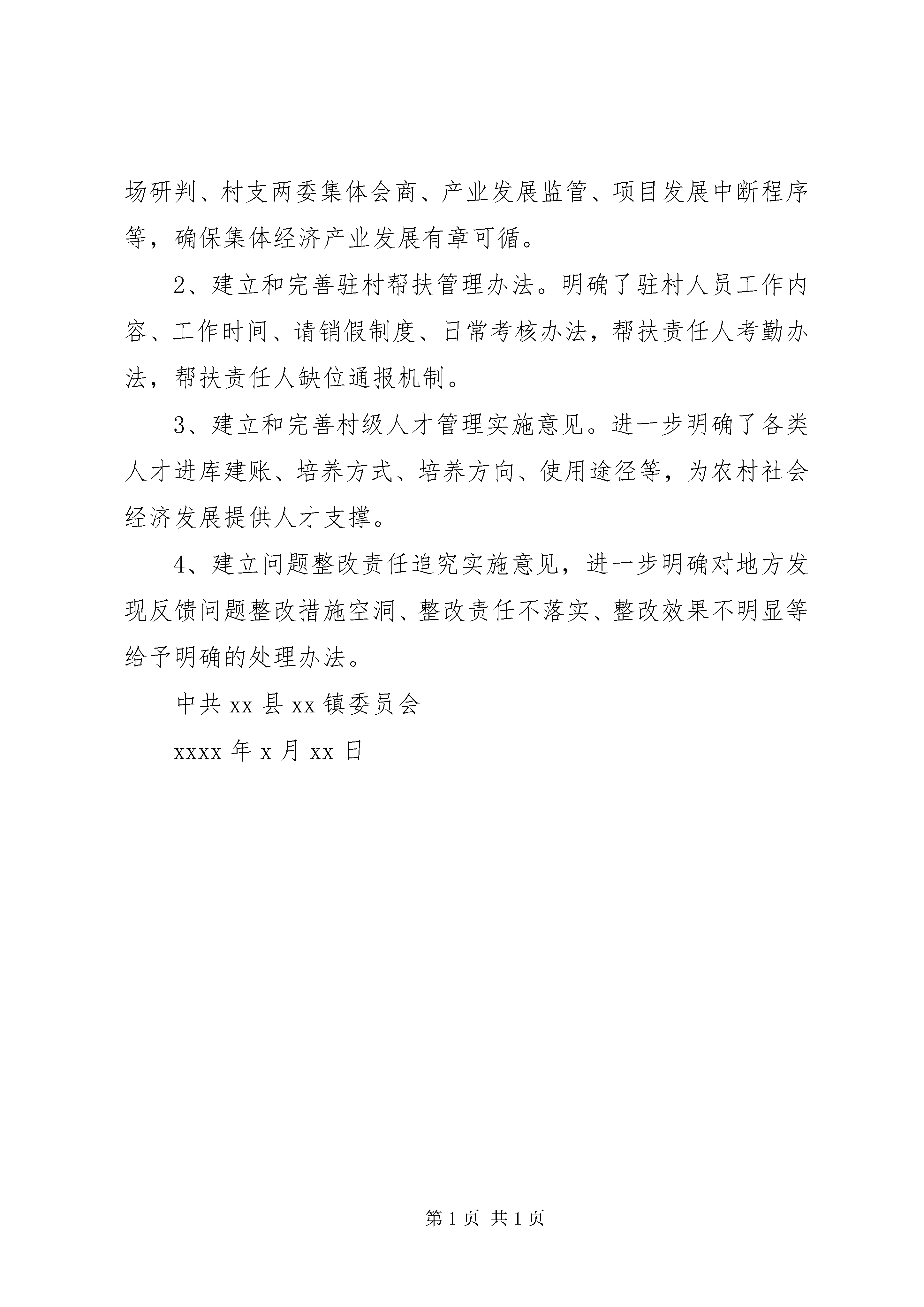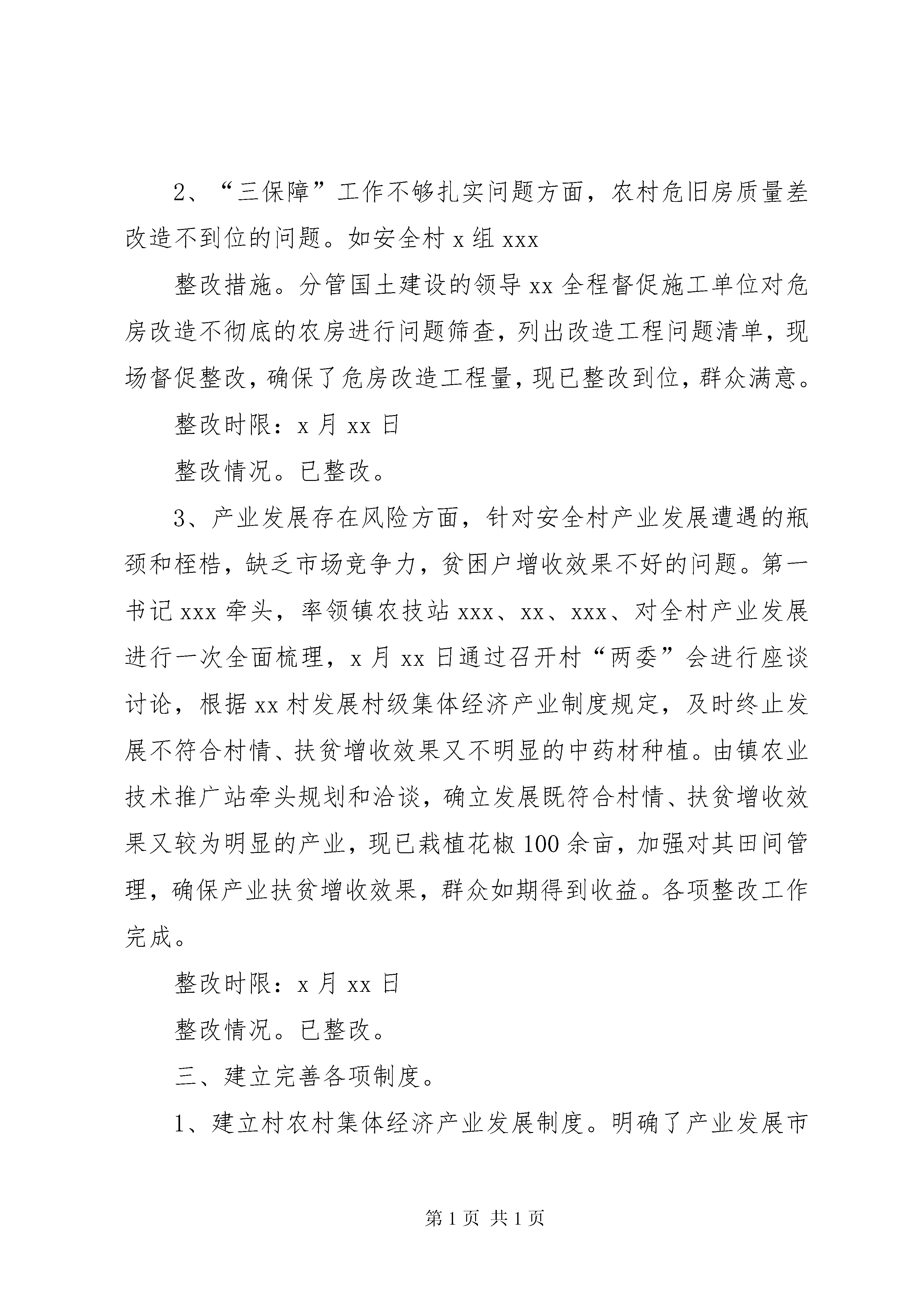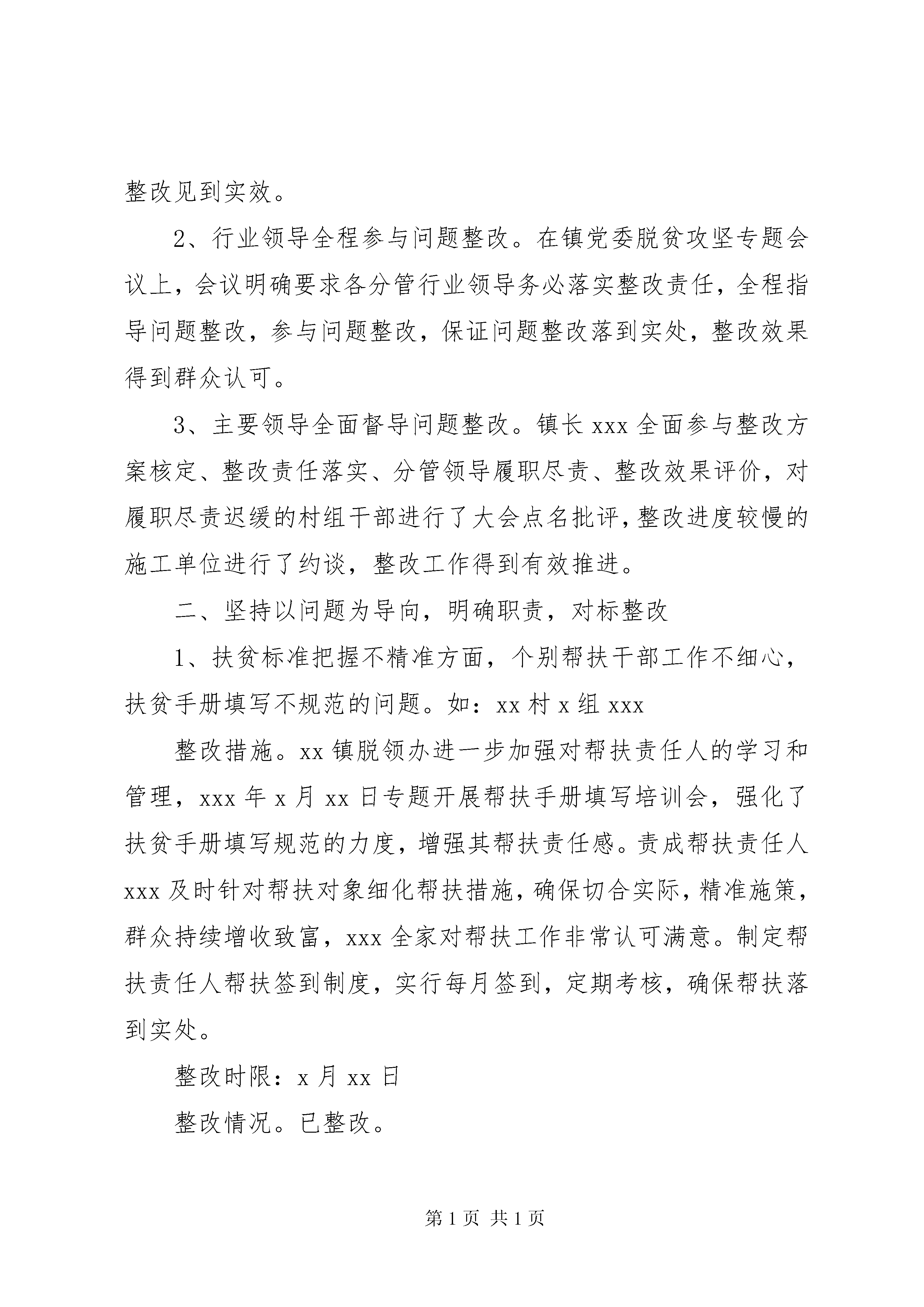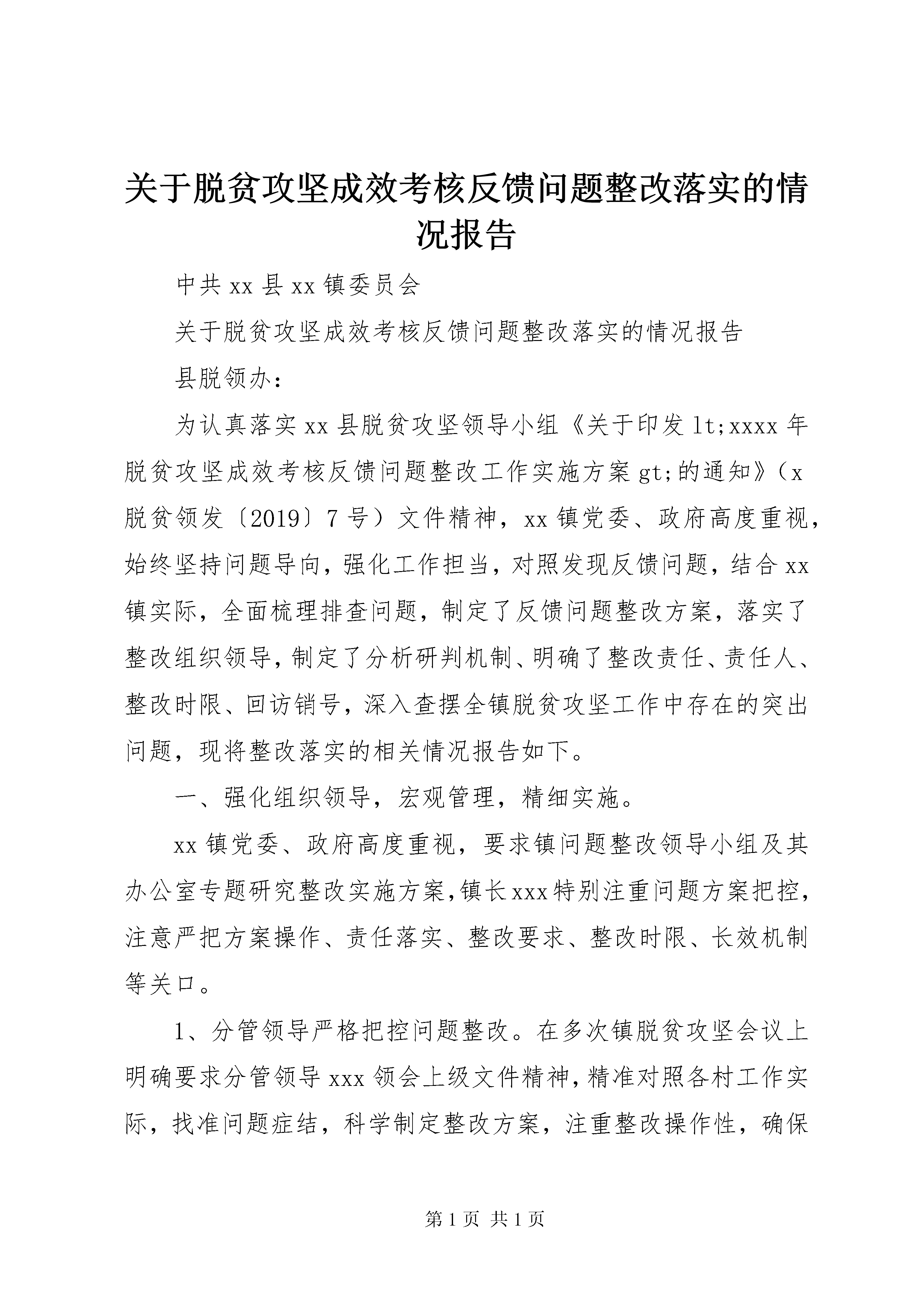关于脱贫攻坚成效考核反馈问题整改落实的情况报告中共xx县xx镇委员会关于脱贫攻坚成效考核反馈问题整改落实的情况报告县脱领办:为认真落实xx县脱贫攻坚领导小组《关于印发lt;xxxx年脱贫攻坚成效考核反馈问题整改工作实施方案gt;的通知》(x脱贫领发〔2019〕7号)文件精神,xx镇党委、政府高度重视,始终坚持问题导向,强化工作担当,对照发现反馈问题,结合xx镇实际,全面梳理排查问题,制定了反馈问题整改方案,落实了整改组织领导,制定了分析研判机制、明确了整改责任、责任人、整改时限、回访销号,深入查摆全镇脱贫攻坚工作中存在的突出问题,现将整改落实的相关情况报告如下。一、强化组织领导,宏观管理,精细实施。xx镇党委、政府高度重视,要求镇问题整改领导小组及其办公室专题研究整改实施方案,镇长xxx特别注重问题方案把控,注意严把方案操作、责任落实、整改要求、整改时限、长效机制等关口。1、分管领导严格把控问题整改。在多次镇脱贫攻坚会议上明确要求分管领导xxx领会上级文件精神,精准对照各村工作实际,找准问题症结,科学制定整改方案,注重整改操作性,确保整改见到实效。2、行业领导全程参与问题整改。在镇党委脱贫攻坚专题会议上,会议明确要求各分管行业领导务必落实整改责任,全程指导问题整改,参与问题整改,保证问题整改落到实处,整改效果得到群众认可。3、主要领导全面督导问题整改。镇长xxx全面参与整改方案核定、整改责任落实、分管领导履职尽责、整改效果评价,对履职尽责迟缓的村组干部进行了大会点名批评,整改进度较慢的施工单位进行了约谈,整改工作得到有效推进。二、坚持以问题为导向,明确职责,对标整改1、扶贫标准把握不精准方面,个别帮扶干部工作不细心,扶贫手册填写不规范的问题。如:xx村x组xxx整改措施。xx镇脱领办进一步加强对帮扶责任人的学习和管理,xxx年x月xx日专题开展帮扶手册填写培训会,强化了扶贫手册填写规范的力度,增强其帮扶责任感。责成帮扶责任人xxx及时针对帮扶对象细化帮扶措施,确保切合实际,精准施策,群众持续增收致富,xxx全家对帮扶工作非常认可满意。制定帮扶责任人帮扶签到制度,实行每月签到,定期考核,确保帮扶落到实处。整改时限:x月xx日整改情况。已整改。2、“三保障”工作不够扎实问题方面,农村危旧房质量差改造不到位的问题。如安全村x组xxx整改措施。分管国土建设的领导xx全程督促施工单位对危房改造不彻底的农房进行问题筛查,列出改造工程问题清单,现场督促整改,确保了危房改造工程量,现已整改到位,群众满意。整改时限:x月xx日整改情况。已整改。3、产业发展存在风险方面,针对安全村产业发展遭遇的瓶颈和桎梏,缺乏市场竞争力,贫困户增收效果不好的问题。第一书记xxx牵头,率领镇农技站xxx、xx、xxx、对全村产业发展进行一次全面梳理,x月xx日通过召开村“两委”会进行座谈讨论,根据xx村发展村级集体经济产业制度规定,及时终止发展不符合村情、扶贫增收效果又不明显的中药材种植。由镇农业技术推广站牵头规划和洽谈,确立发展既符合村情、扶贫增收效果又较为明显的产业,现已栽植花椒100余亩,加强对其田间管理,确保产业扶贫增收效果,群众如期得到收益。各项整改工作完成。整改时限:x月xx日整改情况。已整改。三、建立完善各项制度。1、建立村农村集体经济产业发展制度。明确了产业发展市场研判、村支两委集体会商、产业发展监管、项目发展中断程序等,确保集体经济产业发展有章可循。2、建立和完善驻村帮扶管理办法。明确了驻村人员工作内容、工作时间、请销假制度、日常考核办法,帮扶责任人考勤办法,帮扶责任人缺位通报机制。3、建立和完善村级人才管理实施意见。进一步明确了各类人才进库建账、培养方式、培养方向、使用途径等,为农村社会经济发展提供人才支撑。4、建立问题整改责任追究实施意见,进一步明确对地方发现反馈问题整改措施空洞、整改责任不落实、整改效果不明显等给予明确的处理办法。中共xx县xx镇委员会xxxx年x月xx日