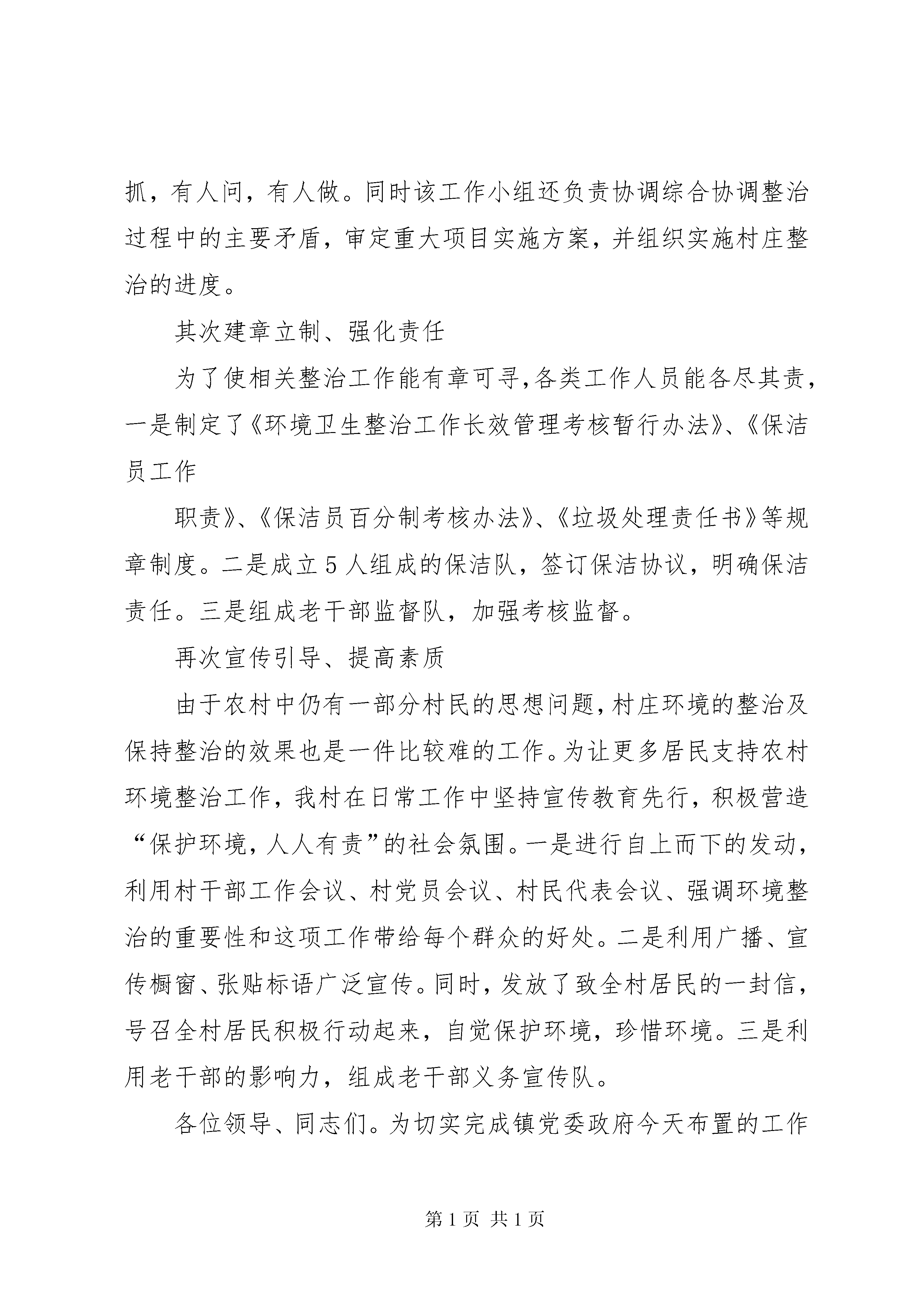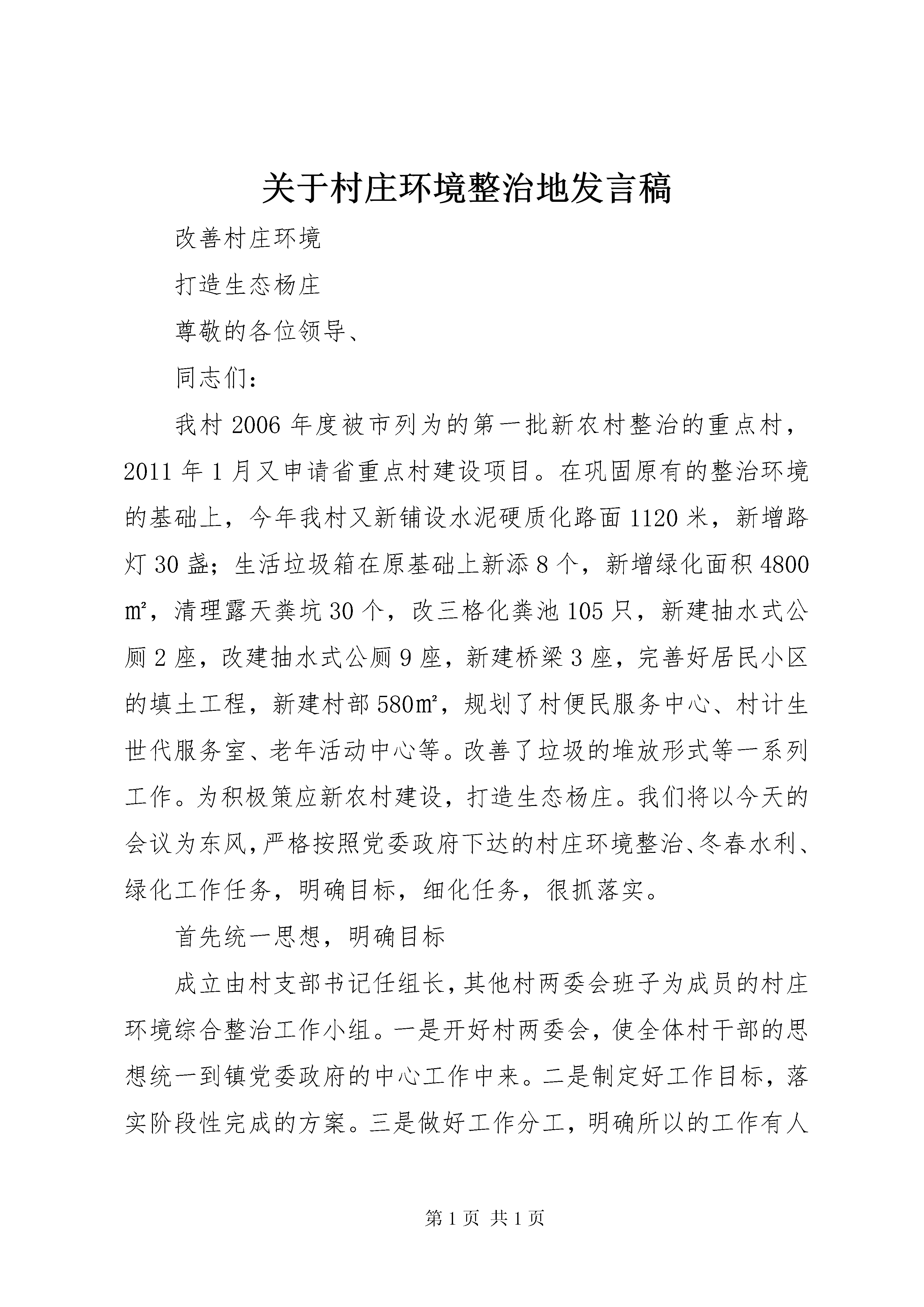 关于村庄环境整治地发言稿改善村庄环境打造生态杨庄尊敬的各位领导、同志们:我村2006年度被市列为的第一批新农村整治的重点村,2011年1月又申请省重点村建设项目。在巩固原有的整治环境的基础上,今年我村又新铺设水泥硬质化路面1120米,新增路灯30盏;生活垃圾箱在原基础上新添8个,新增绿化面积4800㎡,清理露天粪坑30个,改三格化粪池105只,新建抽水式公厕2座,改建抽水式公厕9座,新建桥梁3座,完善好居民小区的填土工程,新建村部580㎡,规划了村便民服务中心、村计生世代服务室、老年活动中心等。改善了垃圾的堆放形式等一系列工作。为积极策应新农村建设,打造生态杨庄。我们将以今天的会议为东风,严格按照党委政府下达的村庄环境整治、冬春水利、绿化工作任务,明确目标,细化任务,很抓落实。首先统一思想,明确目标成立由村支部书记任组长,其他村两委会班子为成员的村庄环境综合整治工作小组。一是开好村两委会,使全体村干部的思想统一到镇党委政府的中心工作中来。二是制定好工作目标,落实阶段性完成的方案。三是做好工作分工,明确所以的工作有人抓,有人问,有人做。同时该工作小组还负责协调综合协调整治过程中的主要矛盾,审定重大项目实施方案,并组织实施村庄整治的进度。其次建章立制、强化责任为了使相关整治工作能有章可寻,各类工作人员能各尽其责,一是制定了《环境卫生整治工作长效管理考核暂行办法》、《保洁员工作职责》、《保洁员百分制考核办法》、《垃圾处理责任书》等规章制度。二是成立5人组成的保洁队,签订保洁协议,明确保洁责任。三是组成老干部监督队,加强考核监督。再次宣传引导、提高素质由于农村中仍有一部分村民的思想问题,村庄环境的整治及保持整治的效果也是一件比较难的工作。为让更多居民支持农村环境整治工作,我村在日常工作中坚持宣传教育先行,积极营造“保护环境,人人有责”的社会氛围。一是进行自上而下的发动,利用村干部工作会议、村党员会议、村民代表会议、强调环境整治的重要性和这项工作带给每个群众的好处。二是利用广播、宣传橱窗、张贴标语广泛宣传。同时,发放了致全村居民的一封信,号召全村居民积极行动起来,自觉保护环境,珍惜环境。三是利用老干部的影响力,组成老干部义务宣传队。各位领导、同志们。为切实完成镇党委政府今天布置的工作任务,我们将以饱满的热情,对照我村的情况,制定详细的目标规划,积极落实会议提出的各项工作要求,着力加快各项工作的开展,为各项工作“早见效、快见效、大见效”作出贡献。谢谢各位杨庄村村民委员会2011年12月6日