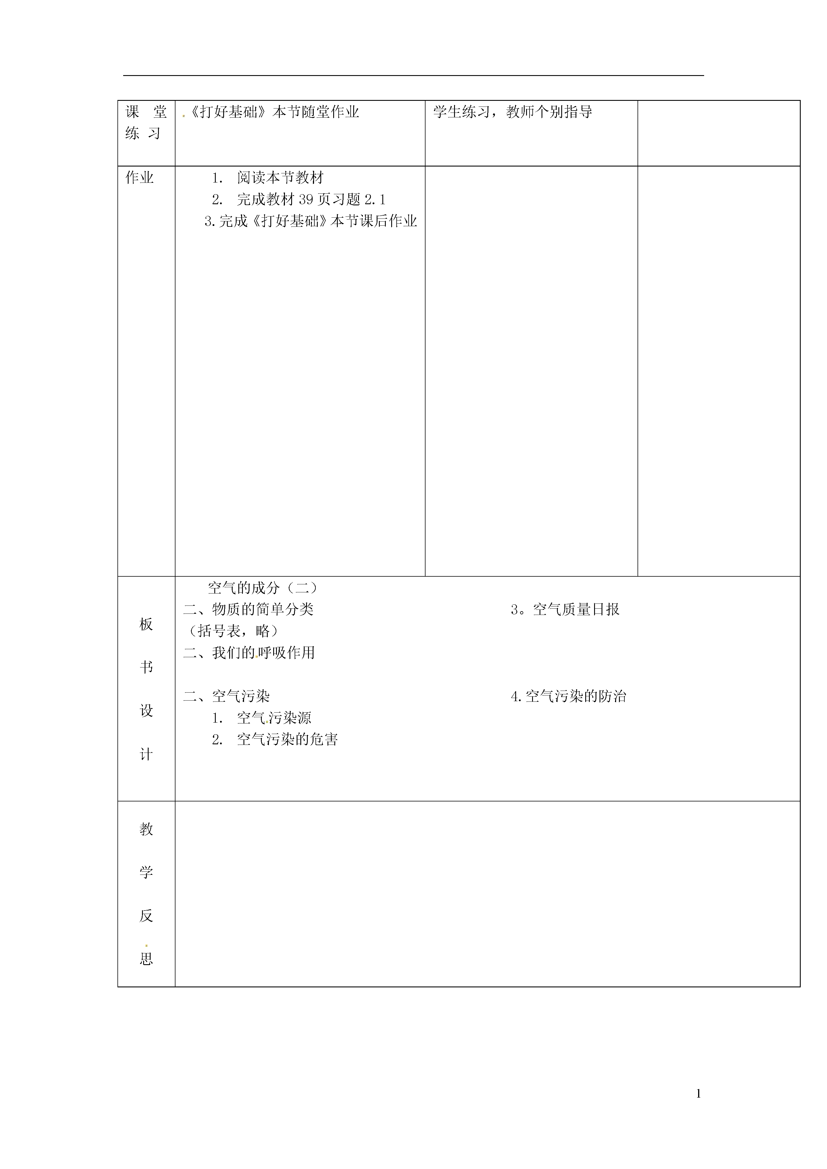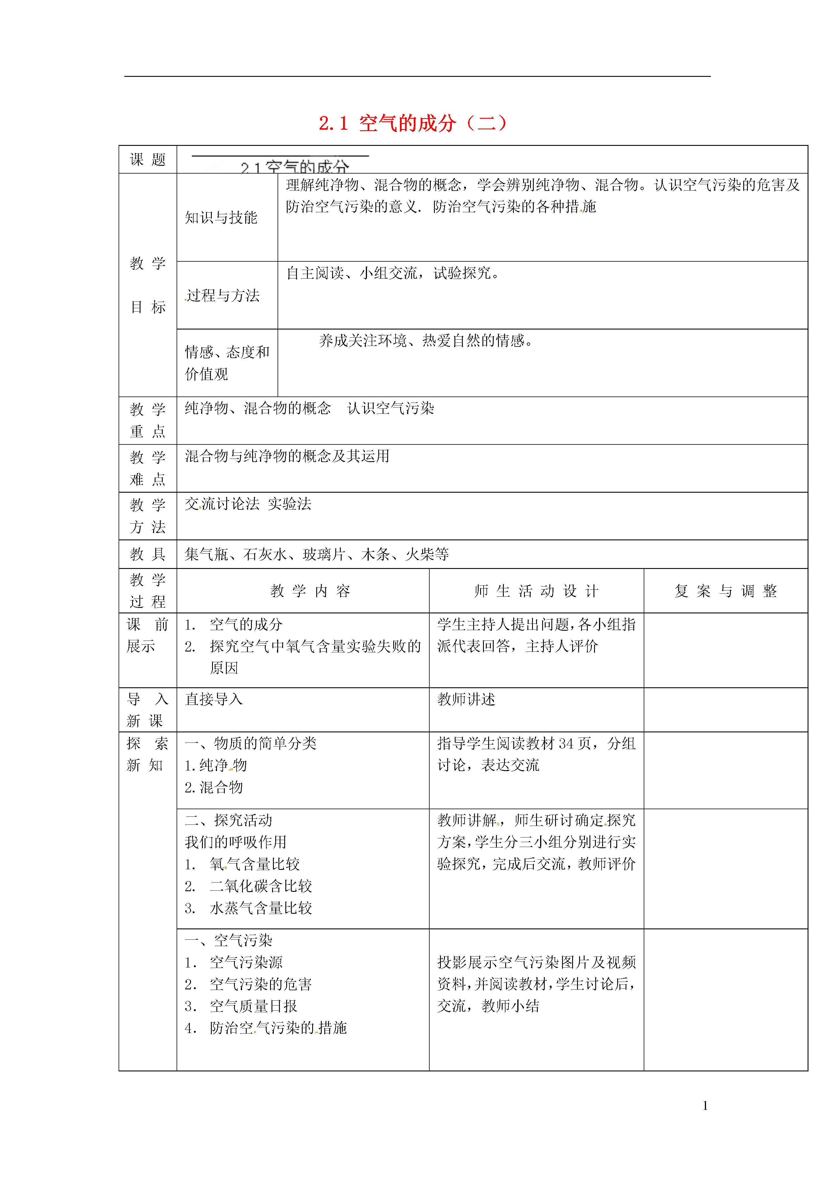 12.1空气的成分(二)课题教学目标知识与技能理解纯净物、混合物的概念,学会辨别纯净物、混合物。认识空气污染的危害及防治空气污染的意义.防治空气污染的各种措施过程与方法自主阅读、小组交流,试验探究。情感、态度和价值观养成关注环境、热爱自然的情感。教学重点纯净物、混合物的概念认识空气污染教学难点混合物与纯净物的概念及其运用教学方法交流讨论法实验法教具集气瓶、石灰水、玻璃片、木条、火柴等教学过程教学内容师生活动设计复案与调整课前展示空气的成分探究空气中氧气含量实验失败的原因学生主持人提出问题,各小组指派代表回答,主持人评价导入新课直接导入教师讲述探索新知一、物质的简单分类1.纯净物2.混合物指导学生阅读教材34页,分组讨论,表达交流探究活动我们的呼吸作用氧气含量比较二氧化碳含比较水蒸气含量比较教师讲解,师生研讨确定探究方案,学生分三小组分别进行实验探究,完成后交流,教师评价空气污染空气污染源空气污染的危害空气质量日报防治空气污染的措施投影展示空气污染图片及视频资料,并阅读教材,学生讨论后,交流,教师小结课堂练习《打好基础》本节随堂作业学生练习,教师个别指导作业阅读本节教材完成教材39页习题2.13.完成《打好基础》本节课后作业板书设计空气的成分(二)物质的简单分类3。空气质量日报(括号表,略)二、我们的呼吸作用空气污染4.空气污染的防治空气污染源空气污染的危害教学反思