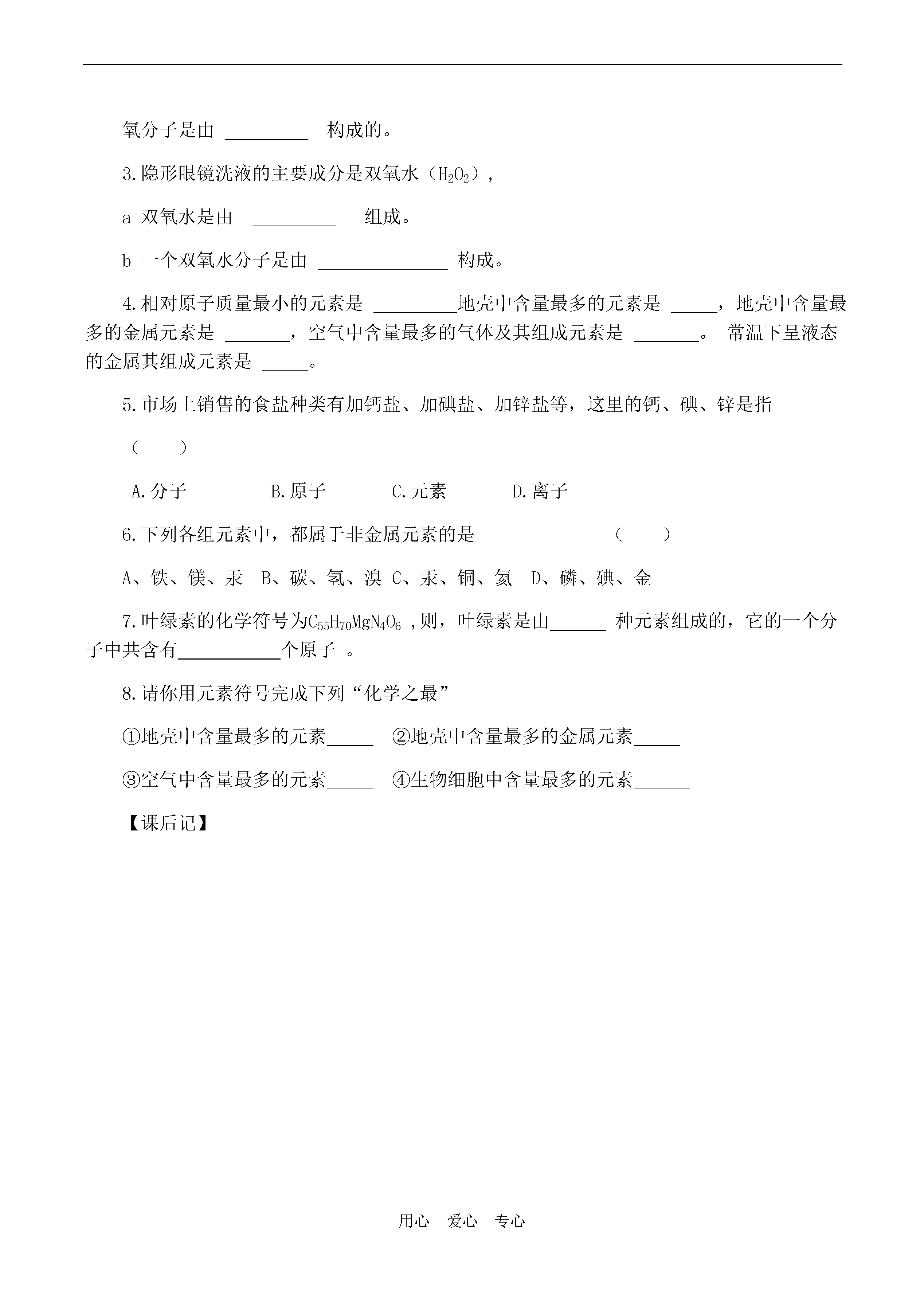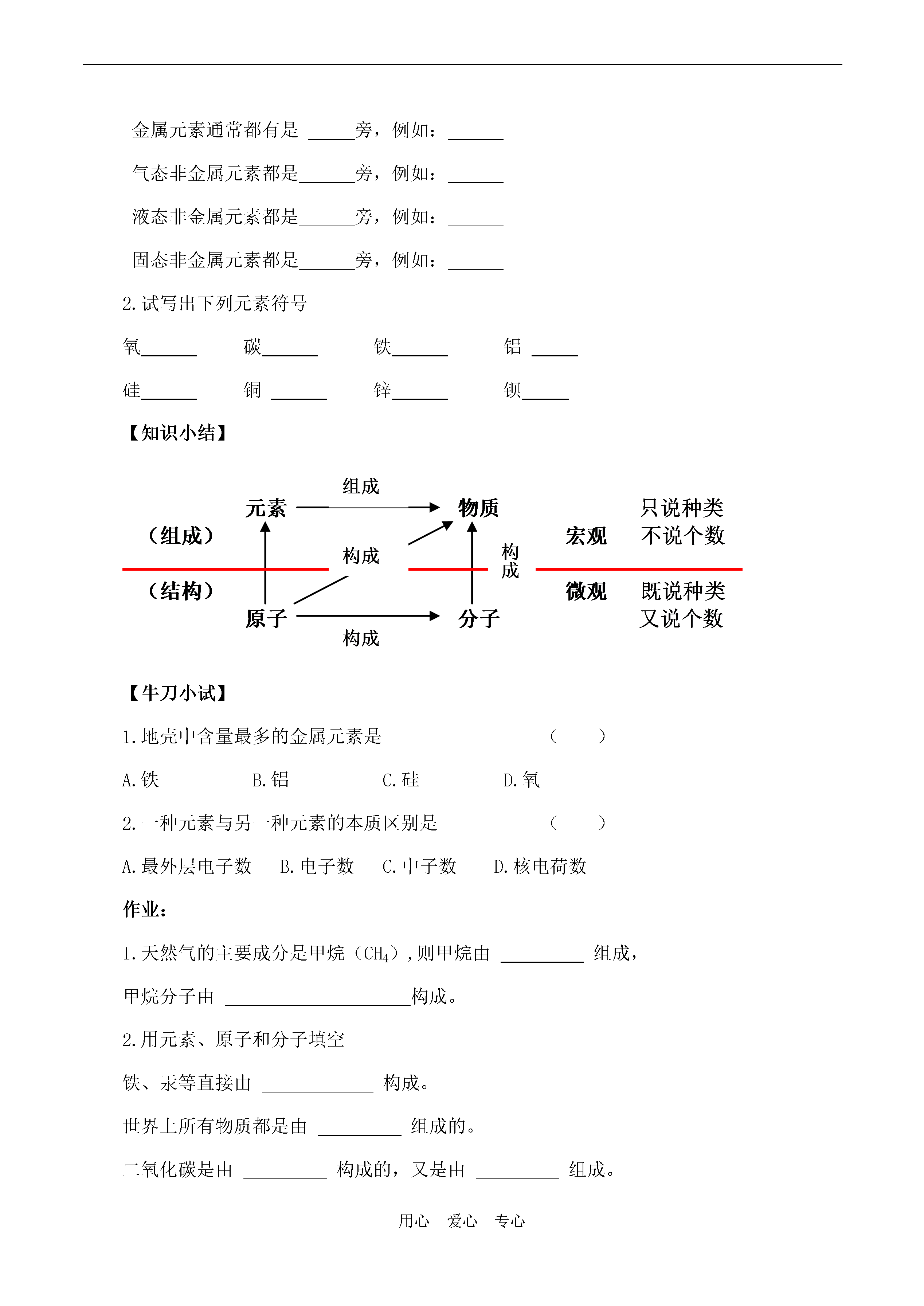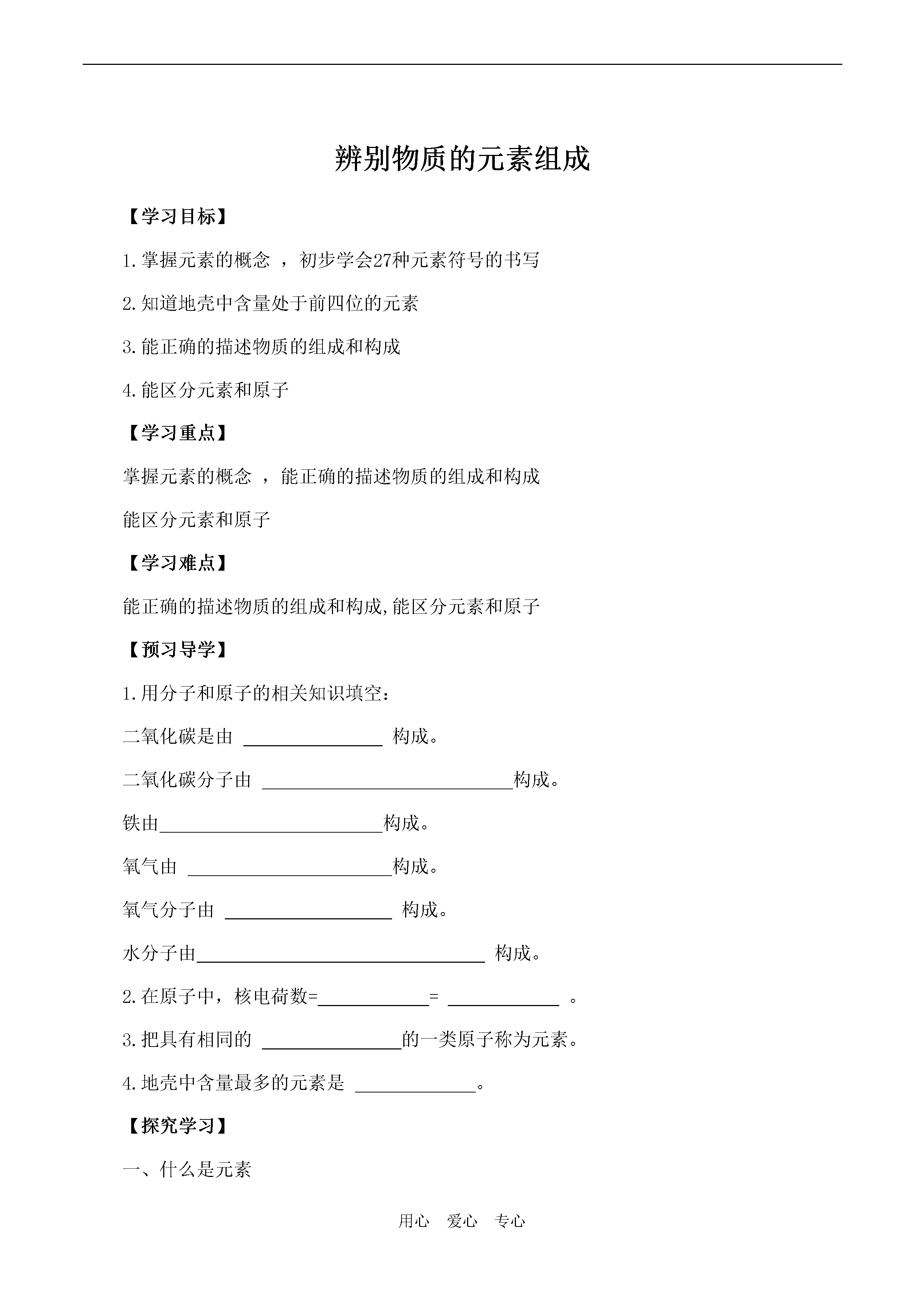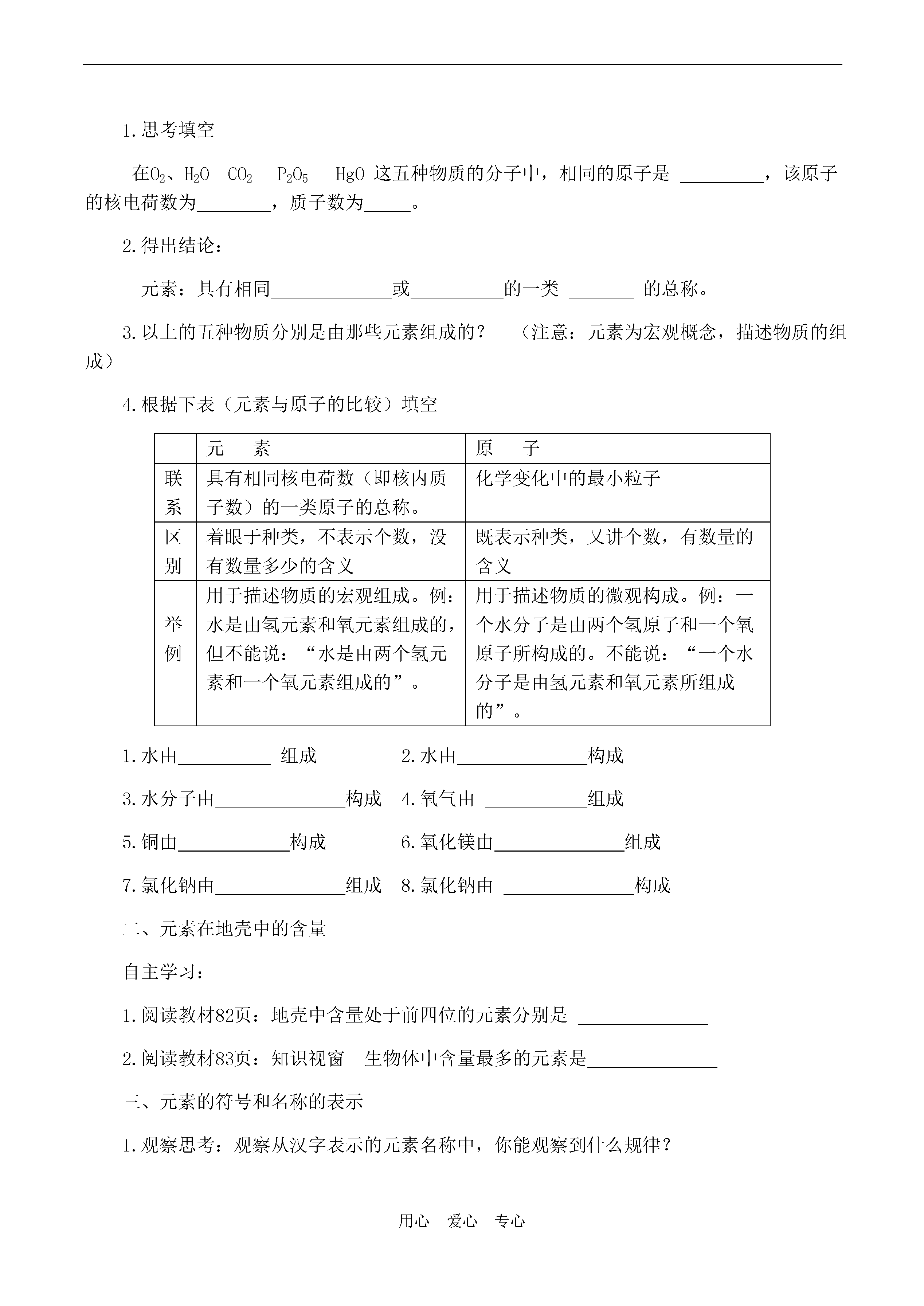 用心爱心专心辨别物质的元素组成【学习目标】1.掌握元素的概念,初步学会27种元素符号的书写2.知道地壳中含量处于前四位的元素3.能正确的描述物质的组成和构成4.能区分元素和原子【学习重点】掌握元素的概念,能正确的描述物质的组成和构成能区分元素和原子【学习难点】能正确的描述物质的组成和构成,能区分元素和原子【预习导学】1.用分子和原子的相关知识填空:二氧化碳是由构成。二氧化碳分子由构成。铁由构成。氧气由构成。氧气分子由构成。水分子由构成。2.在原子中,核电荷数==。3.把具有相同的的一类原子称为元素。4.地壳中含量最多的元素是。【探究学习】一、什么是元素1.思考填空在O2、H2OCO2P2O5HgO这五种物质的分子中,相同的原子是,该原子的核电荷数为,质子数为。2.得出结论:元素:具有相同或的一类的总称。3.以上的五种物质分别是由那些元素组成的?(注意:元素为宏观概念,描述物质的组成)4.根据下表(元素与原子的比较)填空元素原子联系具有相同核电荷数(即核内质子数)的一类原子的总称。化学变化中的最小粒子区别着眼于种类,不表示个数,没有数量多少的含义既表示种类,又讲个数,有数量的含义举例用于描述物质的宏观组成。例:水是由氢元素和氧元素组成的,但不能说:“水是由两个氢元素和一个氧元素组成的”。用于描述物质的微观构成。例:一个水分子是由两个氢原子和一个氧原子所构成的。不能说:“一个水分子是由氢元素和氧元素所组成的”。1.水由组成2.水由构成3.水分子由构成4.氧气由组成5.铜由构成6.氧化镁由组成7.氯化钠由组成8.氯化钠由构成二、元素在地壳中的含量自主学习:1.阅读教材82页:地壳中含量处于前四位的元素分别是2.阅读教材83页:知识视窗生物体中含量最多的元素是三、元素的符号和名称的表示1.观察思考:观察从汉字表示的元素名称中,你能观察到什么规律?金属元素通常都有是旁,例如:气态非金属元素都是旁,例如:液态非金属元素都是旁,例如:固态非金属元素都是旁,例如:2.试写出下列元素符号氧碳铁铝硅铜锌钡【知识小结】【牛刀小试】1.地壳中含量最多的金属元素是()A.铁B.铝C.硅D.氧2.一种元素与另一种元素的本质区别是()A.最外层电子数B.电子数C.中子数D.核电荷数作业:1.天然气的主要成分是甲烷(CH4),则甲烷由组成,甲烷分子由构成。2.用元素、原子和分子填空铁、汞等直接由构成。世界上所有物质都是由组成的。二氧化碳是由构成的,又是由组成。氧分子是由构成的。3.隐形眼镜洗液的主要成分是双氧水(H2O2),a双氧水是由组成。b一个双氧水分子是由构成。4.相对原子质量最小的元素是地壳中含量最多的元素是,地壳中含量最多的金属元素是,空气中含量最多的气体及其组成元素是。常温下呈液态的金属其组成元素是。5.市场上销售的食盐种类有加钙盐、加碘盐、加锌盐等,这里的钙、碘、锌是指()A.分子B.原子C.元素D.离子6.下列各组元素中,都属于非金属元素的是()A、铁、镁、汞B、碳、氢、溴C、汞、铜、氦D、磷、碘、金7.叶绿素的化学符号为C55H70MgN4O6,则,叶绿素是由种元素组成的,它的一个分子中共含有个原子。8.请你用元素符号完成下列“化学之最”①地壳中含量最多的元素②地壳中含量最多的金属元素③空气中含量最多的元素④生物细胞中含量最多的元素【课后记】