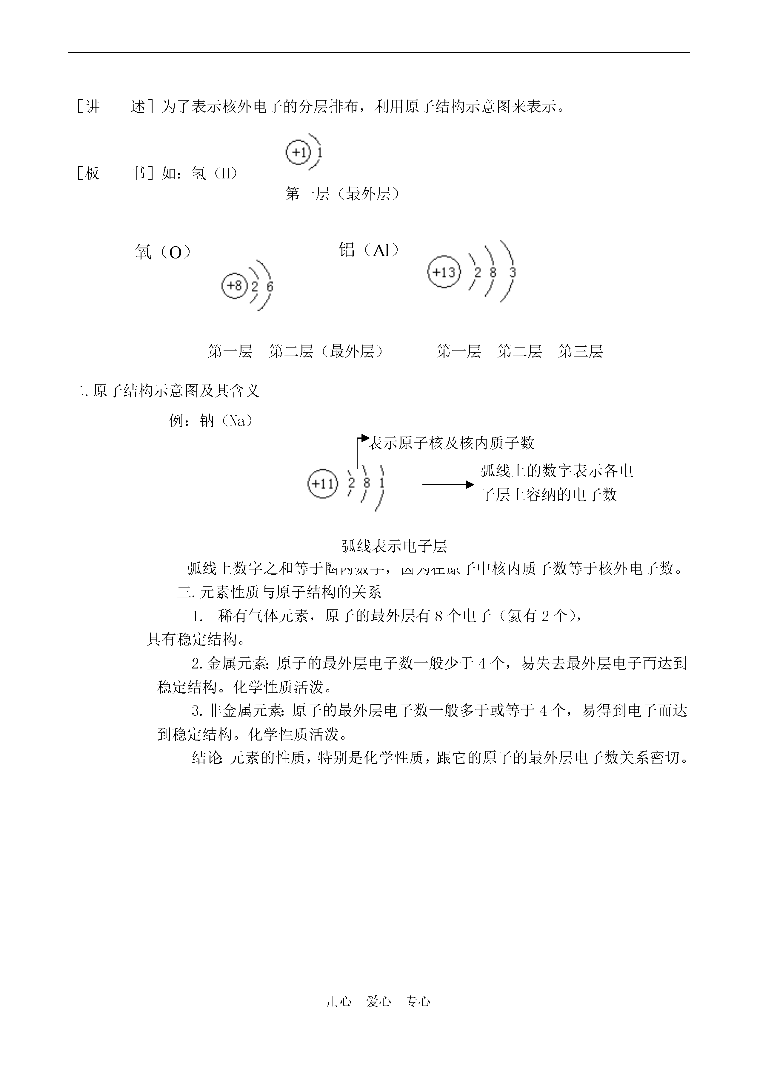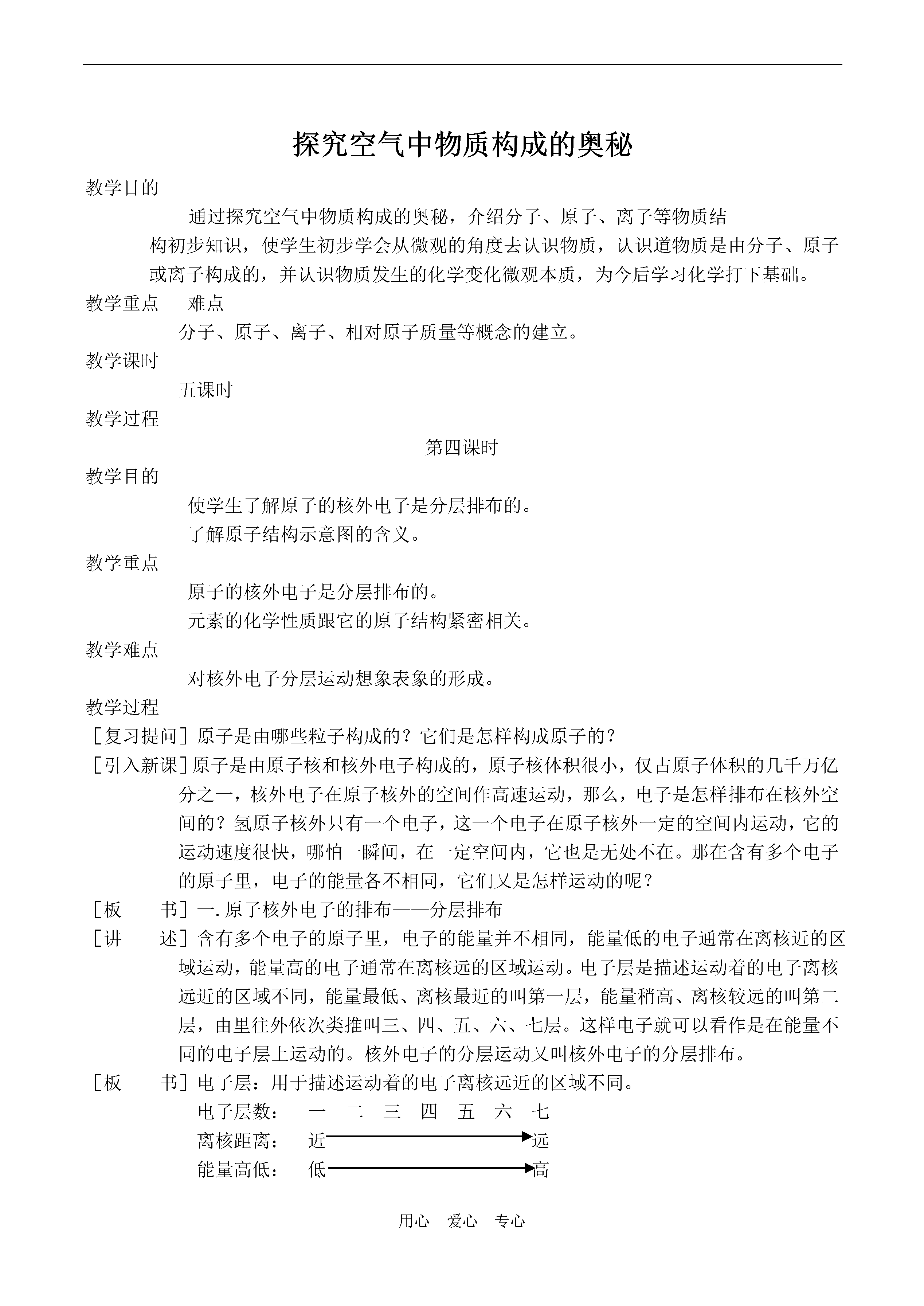 用心爱心专心探究空气中物质构成的奥秘教学目的通过探究空气中物质构成的奥秘,介绍分子、原子、离子等物质结构初步知识,使学生初步学会从微观的角度去认识物质,认识道物质是由分子、原子或离子构成的,并认识物质发生的化学变化微观本质,为今后学习化学打下基础。教学重点难点分子、原子、离子、相对原子质量等概念的建立。教学课时五课时教学过程第四课时教学目的使学生了解原子的核外电子是分层排布的。了解原子结构示意图的含义。教学重点原子的核外电子是分层排布的。元素的化学性质跟它的原子结构紧密相关。教学难点对核外电子分层运动想象表象的形成。教学过程[复习提问]原子是由哪些粒子构成的?它们是怎样构成原子的?[引入新课]原子是由原子核和核外电子构成的,原子核体积很小,仅占原子体积的几千万亿分之一,核外电子在原子核外的空间作高速运动,那么,电子是怎样排布在核外空间的?氢原子核外只有一个电子,这一个电子在原子核外一定的空间内运动,它的运动速度很快,哪怕一瞬间,在一定空间内,它也是无处不在。那在含有多个电子的原子里,电子的能量各不相同,它们又是怎样运动的呢?[板书]一.原子核外电子的排布——分层排布[讲述]含有多个电子的原子里,电子的能量并不相同,能量低的电子通常在离核近的区域运动,能量高的电子通常在离核远的区域运动。电子层是描述运动着的电子离核远近的区域不同,能量最低、离核最近的叫第一层,能量稍高、离核较远的叫第二层,由里往外依次类推叫三、四、五、六、七层。这样电子就可以看作是在能量不同的电子层上运动的。核外电子的分层运动又叫核外电子的分层排布。[板书]电子层:用于描述运动着的电子离核远近的区域不同。电子层数:一二三四五六七离核距离:近远能量高低:低高[讲述]为了表示核外电子的分层排布,利用原子结构示意图来表示。第一层(最外层)[板书]如:氢(H)铝(Al)氧(O)第一层第二层(最外层)第一层第二层第三层(次外层)(最外层)二.原子结构示意图及其含义表示原子核及核内质子数例:钠(Na)弧线表示电子层弧线上的数字表示各电子层上容纳的电子数弧线上数字之和等于圈内数字,因为在原子中核内质子数等于核外电子数。三.元素性质与原子结构的关系稀有气体元素,原子的最外层有8个电子(氦有2个),具有稳定结构。2.金属元素:原子的最外层电子数一般少于4个,易失去最外层电子而达到稳定结构。化学性质活泼。3.非金属元素:原子的最外层电子数一般多于或等于4个,易得到电子而达到稳定结构。化学性质活泼。结论:元素的性质,特别是化学性质,跟它的原子的最外层电子数关系密切。