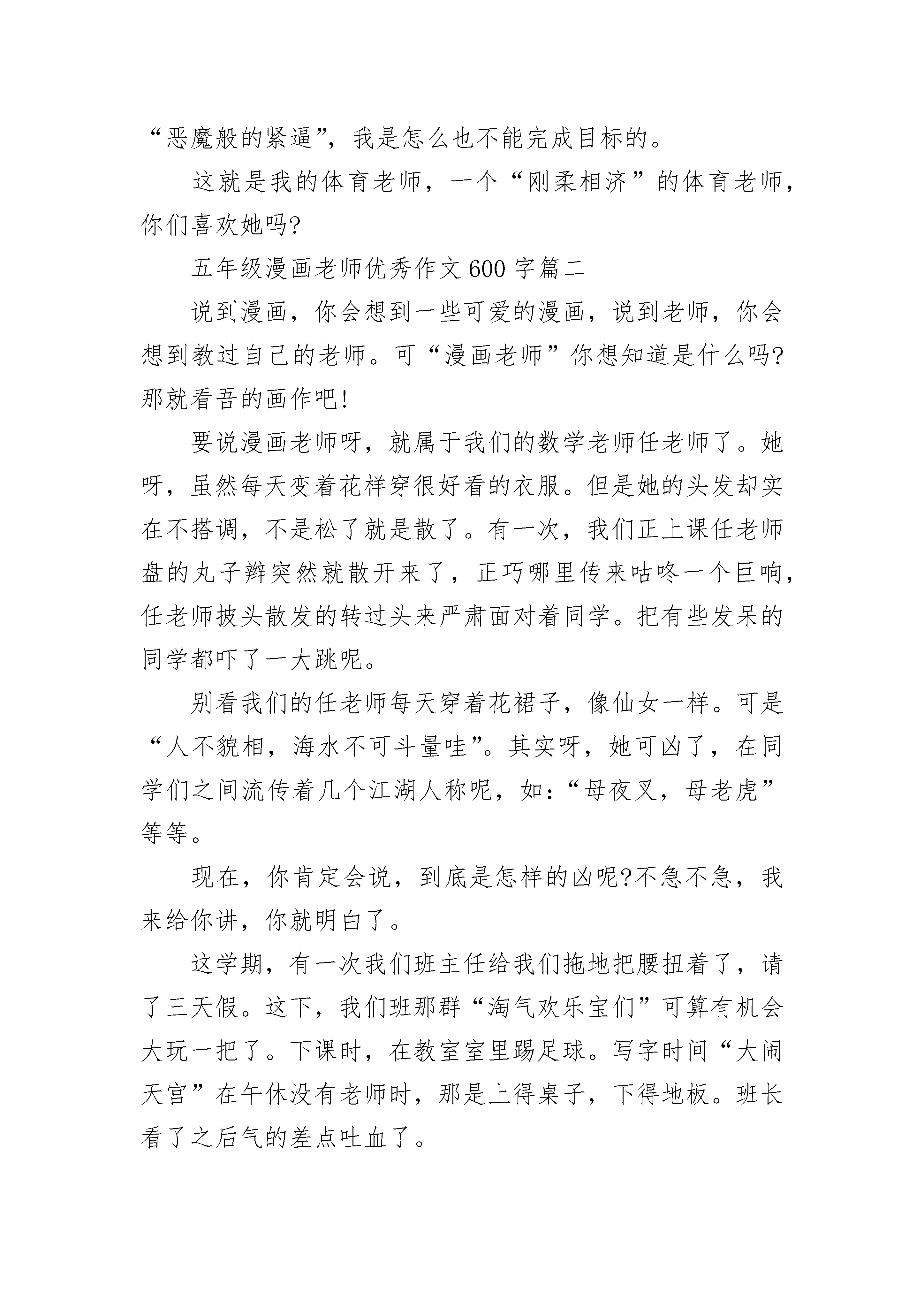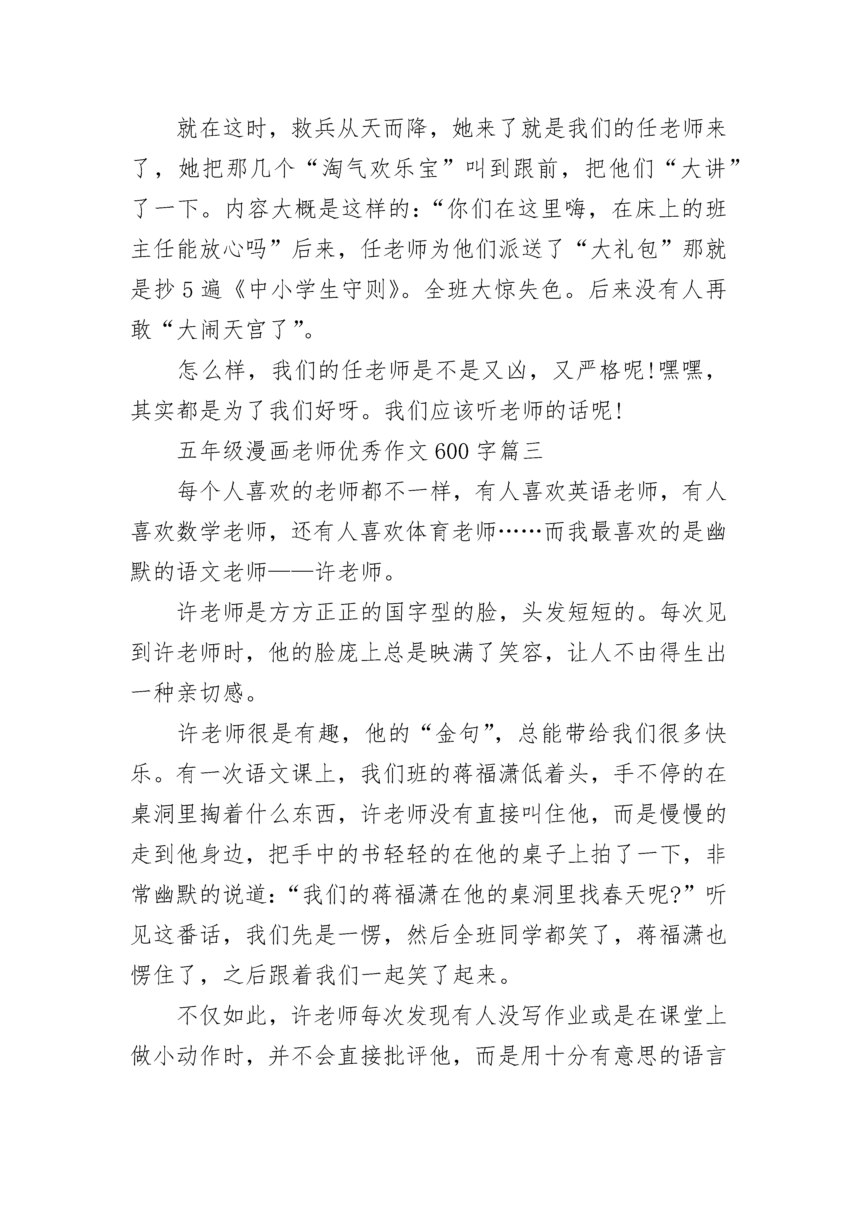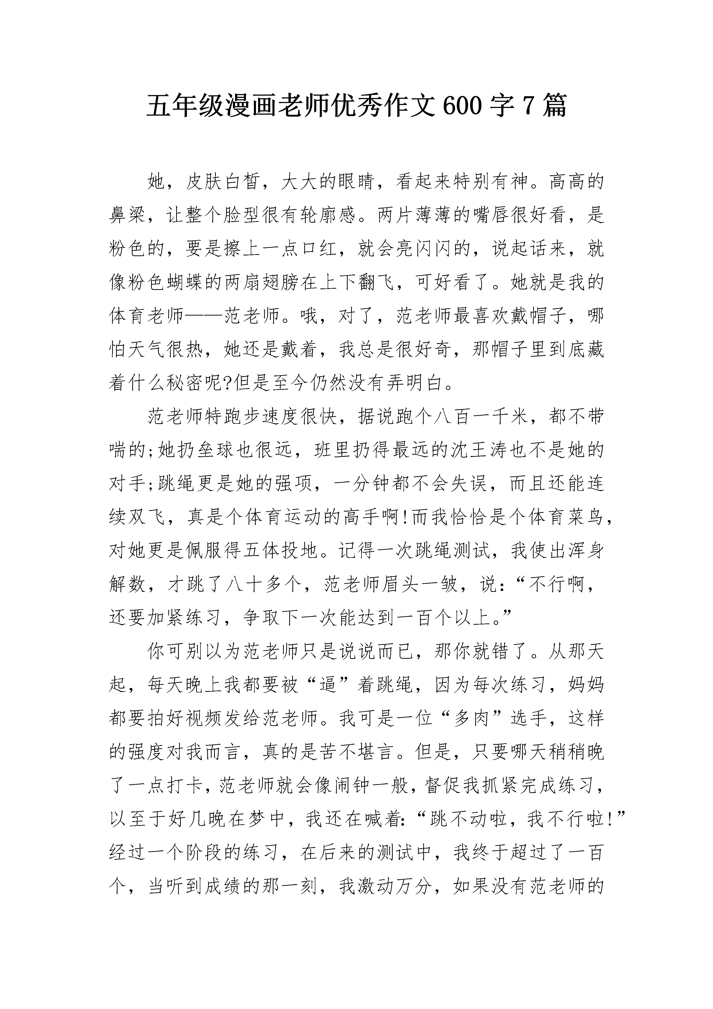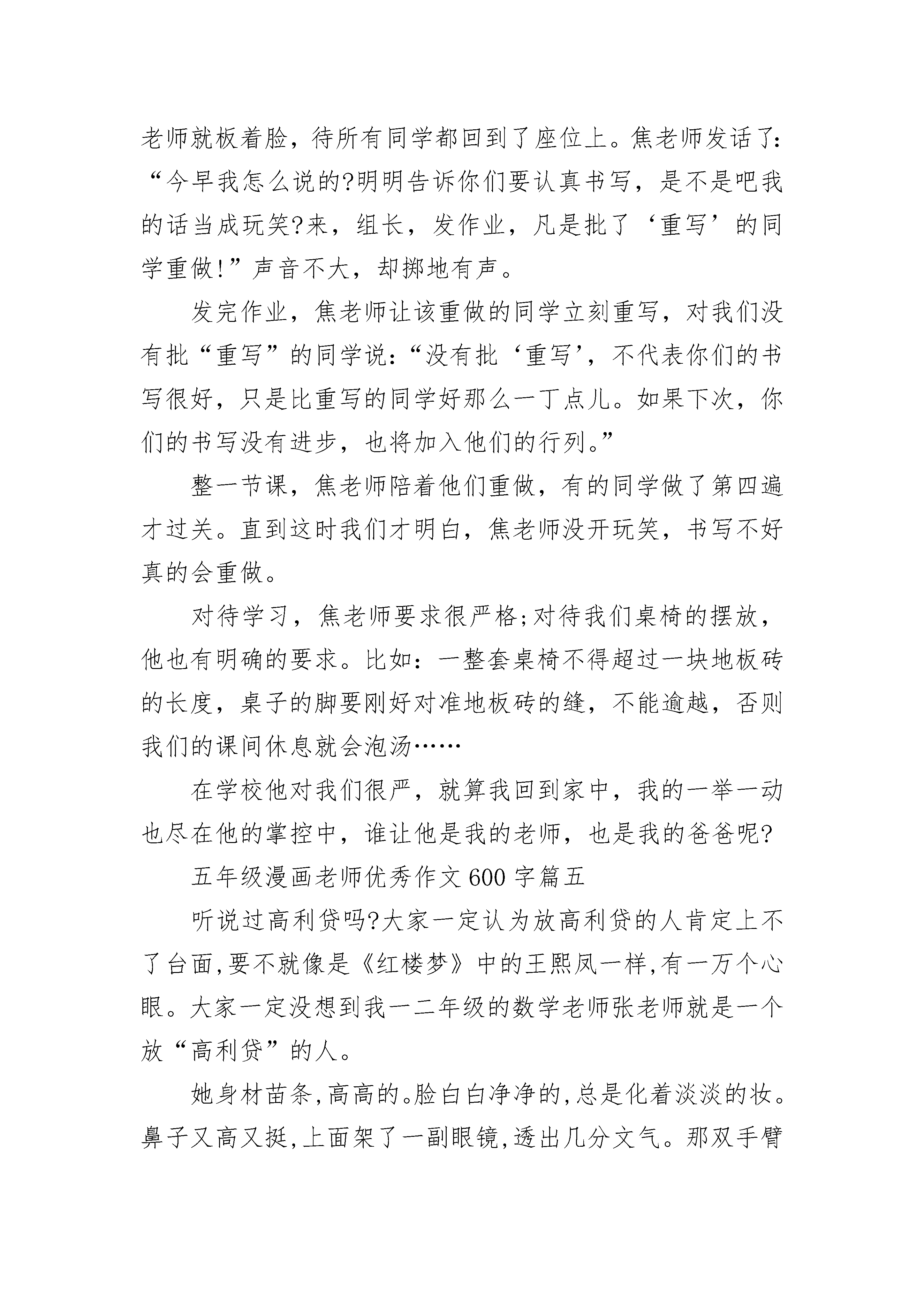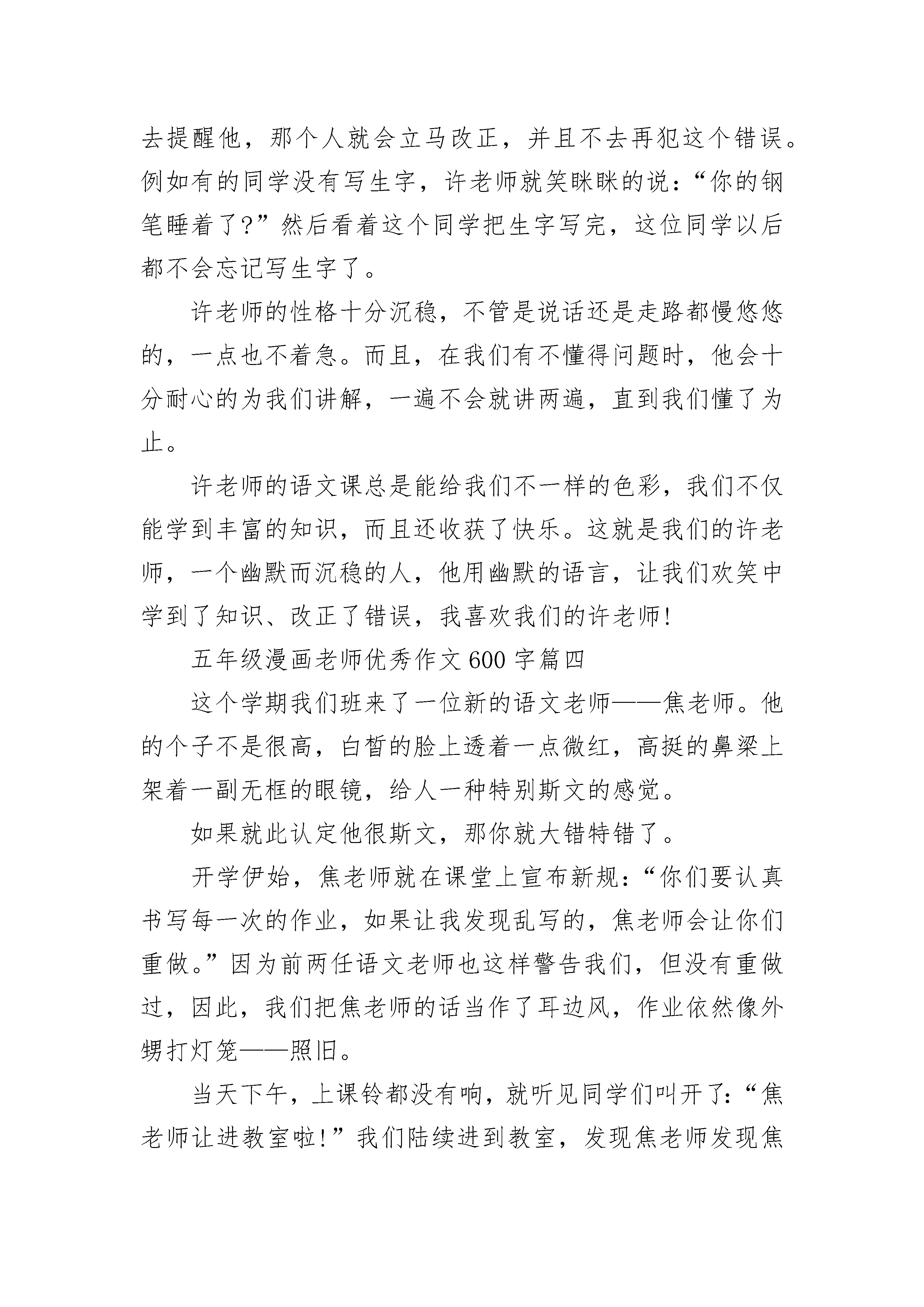 五年级漫画老师优秀作文600字7篇她,皮肤白皙,大大的眼睛,看起来特别有神。高高的鼻梁,让整个脸型很有轮廓感。两片薄薄的嘴唇很好看,是粉色的,要是擦上一点口红,就会亮闪闪的,说起话来,就像粉色蝴蝶的两扇翅膀在上下翻飞,可好看了。她就是我的体育老师——范老师。哦,对了,范老师最喜欢戴帽子,哪怕天气很热,她还是戴着,我总是很好奇,那帽子里到底藏着什么秘密呢?但是至今仍然没有弄明白。范老师特跑步速度很快,据说跑个八百一千米,都不带喘的;她扔垒球也很远,班里扔得最远的沈王涛也不是她的对手;跳绳更是她的强项,一分钟都不会失误,而且还能连续双飞,真是个体育运动的高手啊!而我恰恰是个体育菜鸟,对她更是佩服得五体投地。记得一次跳绳测试,我使出浑身解数,才跳了八十多个,范老师眉头一皱,说:“不行啊,还要加紧练习,争取下一次能达到一百个以上。”你可别以为范老师只是说说而已,那你就错了。从那天起,每天晚上我都要被“逼”着跳绳,因为每次练习,妈妈都要拍好视频发给范老师。我可是一位“多肉”选手,这样的强度对我而言,真的是苦不堪言。但是,只要哪天稍稍晚了一点打卡,范老师就会像闹钟一般,督促我抓紧完成练习,以至于好几晚在梦中,我还在喊着:“跳不动啦,我不行啦!”经过一个阶段的练习,在后来的测试中,我终于超过了一百个,当听到成绩的那一刻,我激动万分,如果没有范老师的“恶魔般的紧逼”,我是怎么也不能完成目标的。这就是我的体育老师,一个“刚柔相济”的体育老师,你们喜欢她吗?五年级漫画老师优秀作文600字篇二说到漫画,你会想到一些可爱的漫画,说到老师,你会想到教过自己的老师。可“漫画老师”你想知道是什么吗?那就看吾的画作吧!要说漫画老师呀,就属于我们的数学老师任老师了。她呀,虽然每天变着花样穿很好看的衣服。但是她的头发却实在不搭调,不是松了就是散了。有一次,我们正上课任老师盘的丸子辫突然就散开来了,正巧哪里传来咕咚一个巨响,任老师披头散发的转过头来严肃面对着同学。把有些发呆的同学都吓了一大跳呢。别看我们的任老师每天穿着花裙子,像仙女一样。可是“人不貌相,海水不可斗量哇”。其实呀,她可凶了,在同学们之间流传着几个江湖人称呢,如:“母夜叉,母老虎”等等。现在,你肯定会说,到底是怎样的凶呢?不急不急,我来给你讲,你就明白了。这学期,有一次我们班主任给我们拖地把腰扭着了,请了三天假。这下,我们班那群“淘气欢乐宝们”可算有机会大玩一把了。下课时,在教室室里踢足球。写字时间“大闹天宫”在午休没有老师时,那是上得桌子,下得地板。班长看了之后气的差点吐血了。就在这时,救兵从天而降,她来了就是我们的任老师来了,她把那几个“淘气欢乐宝”叫到跟前,把他们“大讲”了一下。内容大概是这样的:“你们在这里嗨,在床上的班主任能放心吗”后来,任老师为他们派送了“大礼包”那就是抄5遍《中小学生守则》。全班大惊失色。后来没有人再敢“大闹天宫了”。怎么样,我们的任老师是不是又凶,又严格呢!嘿嘿,其实都是为了我们好呀。我们应该听老师的话呢!五年级漫画老师优秀作文600字篇三每个人喜欢的老师都不一样,有人喜欢英语老师,有人喜欢数学老师,还有人喜欢体育老师……而我最喜欢的是幽默的语文老师——许老师。许老师是方方正正的国字型的脸,头发短短的。每次见到许老师时,他的脸庞上总是映满了笑容,让人不由得生出一种亲切感。许老师很是有趣,他的“金句”,总能带给我们很多快乐。有一次语文课上,我们班的蒋福潇低着头,手不停的在桌洞里掏着什么东西,许老师没有直接叫住他,而是慢慢的走到他身边,把手中的书轻轻的在他的桌子上拍了一下,非常幽默的说道:“我们的蒋福潇在他的桌洞里找春天呢?”听见这番话,我们先是一愣,然后全班同学都笑了,蒋福潇也愣住了,之后跟着我们一起笑了起来。不仅如此,许老师每次发现有人没写作业或是在课堂上做小动作时,并不会直接批评他,而是用十分有意思的语言去提醒他,那个人就会立马改正,并且不去再犯这个错误。例如有的同学没有写生字,许老师就笑眯眯的说:“你的钢笔睡着了?”然后看着这个同学把生字写完,这位同学以后都不会忘记写生字了。许老师的性格十分沉稳,不管是说话还是走路都慢悠悠的,一点也不着急。而且,在我们有不懂得问题时,他会十分耐心的为我们讲解,一遍不会就讲两遍,直到我们懂了为止。许老师的语文课总是能给我们不一样的色彩,我们不仅能学到丰富的知识,而且还收获了快乐。这就是我们的许老师,一个幽默而沉稳的人,他用幽默的语言,让我们欢笑中学到了知识、改正了错误,我喜欢我们的许老师!五年级漫画老师优秀作文600字篇四这个学期我们班来了一位新的语文老师——焦老师。他的个子不是很高,白皙的脸上透着一点微红,高挺的鼻梁上架着一副无框的眼镜,给人一种特别斯文的感觉。如果就此认定他很斯文,那你就大错特错了。开学伊始,焦老师就在课堂上宣