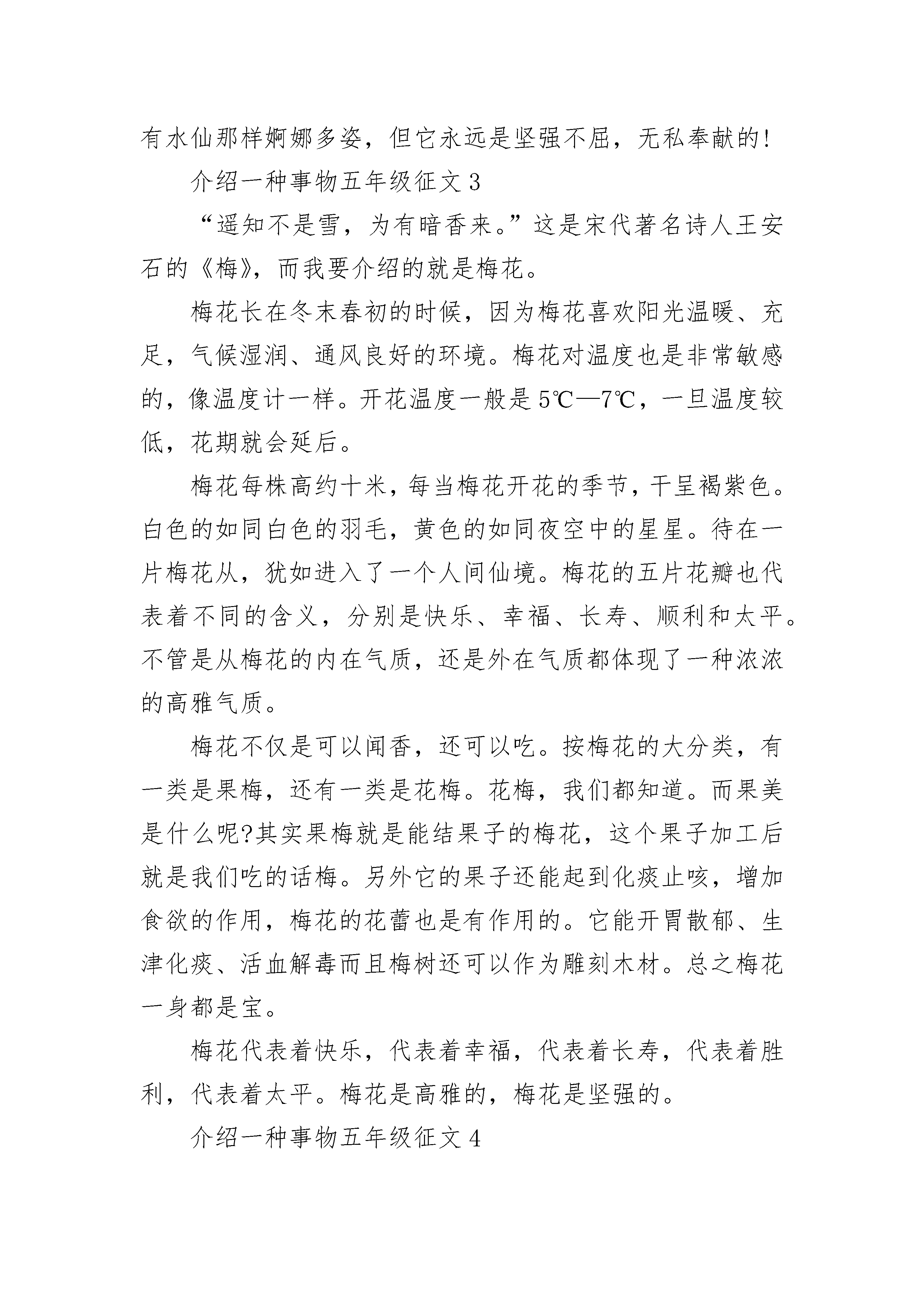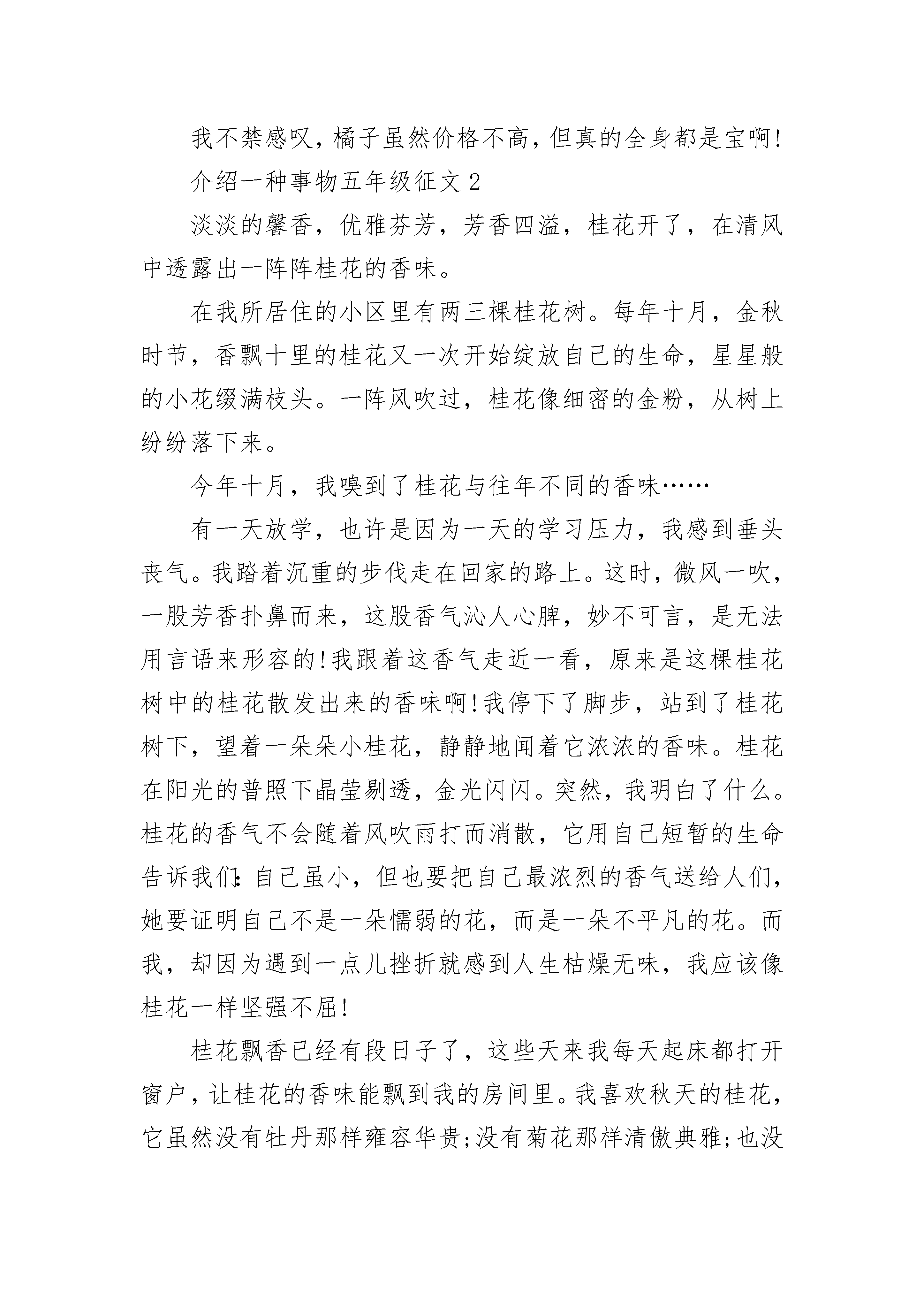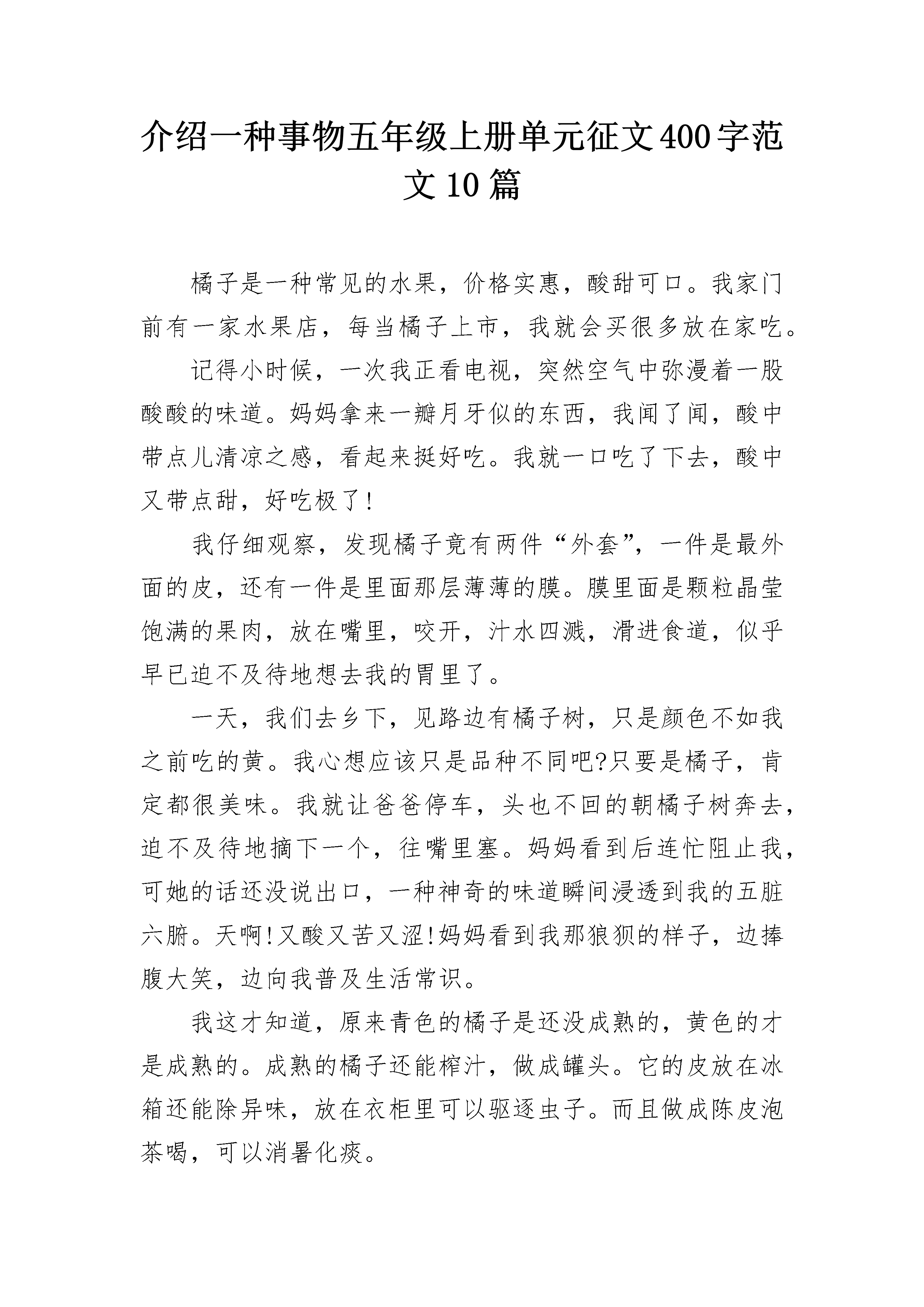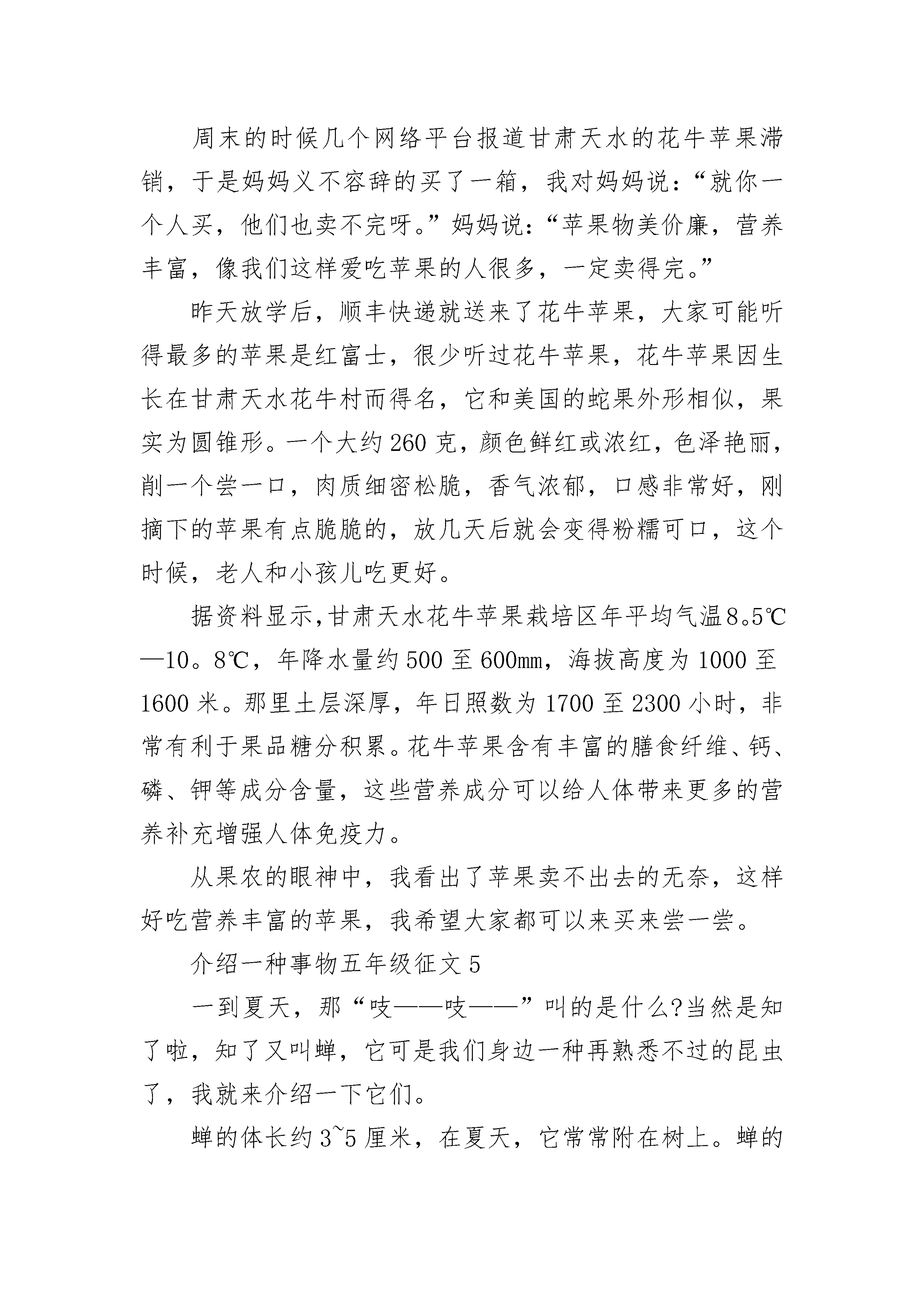 介绍一种事物五年级上册单元征文400字范文10篇橘子是一种常见的水果,价格实惠,酸甜可口。我家门前有一家水果店,每当橘子上市,我就会买很多放在家吃。记得小时候,一次我正看电视,突然空气中弥漫着一股酸酸的味道。妈妈拿来一瓣月牙似的东西,我闻了闻,酸中带点儿清凉之感,看起来挺好吃。我就一口吃了下去,酸中又带点甜,好吃极了!我仔细观察,发现橘子竟有两件“外套”,一件是最外面的皮,还有一件是里面那层薄薄的膜。膜里面是颗粒晶莹饱满的果肉,放在嘴里,咬开,汁水四溅,滑进食道,似乎早已迫不及待地想去我的胃里了。一天,我们去乡下,见路边有橘子树,只是颜色不如我之前吃的黄。我心想应该只是品种不同吧?只要是橘子,肯定都很美味。我就让爸爸停车,头也不回的朝橘子树奔去,迫不及待地摘下一个,往嘴里塞。妈妈看到后连忙阻止我,可她的话还没说出口,一种神奇的味道瞬间浸透到我的五脏六腑。天啊!又酸又苦又涩!妈妈看到我那狼狈的样子,边捧腹大笑,边向我普及生活常识。我这才知道,原来青色的橘子是还没成熟的,黄色的才是成熟的。成熟的橘子还能榨汁,做成罐头。它的皮放在冰箱还能除异味,放在衣柜里可以驱逐虫子。而且做成陈皮泡茶喝,可以消暑化痰。我不禁感叹,橘子虽然价格不高,但真的全身都是宝啊!介绍一种事物五年级征文2淡淡的馨香,优雅芬芳,芳香四溢,桂花开了,在清风中透露出一阵阵桂花的香味。在我所居住的小区里有两三棵桂花树。每年十月,金秋时节,香飘十里的桂花又一次开始绽放自己的生命,星星般的小花缀满枝头。一阵风吹过,桂花像细密的金粉,从树上纷纷落下来。今年十月,我嗅到了桂花与往年不同的香味……有一天放学,也许是因为一天的学习压力,我感到垂头丧气。我踏着沉重的步伐走在回家的路上。这时,微风一吹,一股芳香扑鼻而来,这股香气沁人心脾,妙不可言,是无法用言语来形容的!我跟着这香气走近一看,原来是这棵桂花树中的桂花散发出来的香味啊!我停下了脚步,站到了桂花树下,望着一朵朵小桂花,静静地闻着它浓浓的香味。桂花在阳光的普照下晶莹剔透,金光闪闪。突然,我明白了什么。桂花的香气不会随着风吹雨打而消散,它用自己短暂的生命告诉我们:自己虽小,但也要把自己最浓烈的香气送给人们,她要证明自己不是一朵懦弱的花,而是一朵不平凡的花。而我,却因为遇到一点儿挫折就感到人生枯燥无味,我应该像桂花一样坚强不屈!桂花飘香已经有段日子了,这些天来我每天起床都打开窗户,让桂花的香味能飘到我的房间里。我喜欢秋天的桂花,它虽然没有牡丹那样雍容华贵;没有菊花那样清傲典雅;也没有水仙那样婀娜多姿,但它永远是坚强不屈,无私奉献的!介绍一种事物五年级征文3“遥知不是雪,为有暗香来。”这是宋代著名诗人王安石的《梅》,而我要介绍的就是梅花。梅花长在冬末春初的时候,因为梅花喜欢阳光温暖、充足,气候湿润、通风良好的环境。梅花对温度也是非常敏感的,像温度计一样。开花温度一般是5℃—7℃,一旦温度较低,花期就会延后。梅花每株高约十米,每当梅花开花的季节,干呈褐紫色。白色的如同白色的羽毛,黄色的如同夜空中的星星。待在一片梅花从,犹如进入了一个人间仙境。梅花的五片花瓣也代表着不同的含义,分别是快乐、幸福、长寿、顺利和太平。不管是从梅花的内在气质,还是外在气质都体现了一种浓浓的高雅气质。梅花不仅是可以闻香,还可以吃。按梅花的大分类,有一类是果梅,还有一类是花梅。花梅,我们都知道。而果美是什么呢?其实果梅就是能结果子的梅花,这个果子加工后就是我们吃的话梅。另外它的果子还能起到化痰止咳,增加食欲的作用,梅花的花蕾也是有作用的。它能开胃散郁、生津化痰、活血解毒而且梅树还可以作为雕刻木材。总之梅花一身都是宝。梅花代表着快乐,代表着幸福,代表着长寿,代表着胜利,代表着太平。梅花是高雅的,梅花是坚强的。介绍一种事物五年级征文4周末的时候几个网络平台报道甘肃天水的花牛苹果滞销,于是妈妈义不容辞的买了一箱,我对妈妈说:“就你一个人买,他们也卖不完呀。”妈妈说:“苹果物美价廉,营养丰富,像我们这样爱吃苹果的人很多,一定卖得完。”昨天放学后,顺丰快递就送来了花牛苹果,大家可能听得最多的苹果是红富士,很少听过花牛苹果,花牛苹果因生长在甘肃天水花牛村而得名,它和美国的蛇果外形相似,果实为圆锥形。一个大约260克,颜色鲜红或浓红,色泽艳丽,削一个尝一口,肉质细密松脆,香气浓郁,口感非常好,刚摘下的苹果有点脆脆的,放几天后就会变得粉糯可口,这个时候,老人和小孩儿吃更好。据资料显示,甘肃天水花牛苹果栽培区年平均气温8。5℃—10。8℃,年降水量约500至600mm,海拔高度为1000至1600米。那里土层深厚,年日照数为1700至2300小时,非常有利于果品糖分积累。花牛苹果含有丰富的膳食纤维、钙、磷、钾等成分含量,这些营养成分可以给人体带来更多的营养补充增强人体免疫力。从