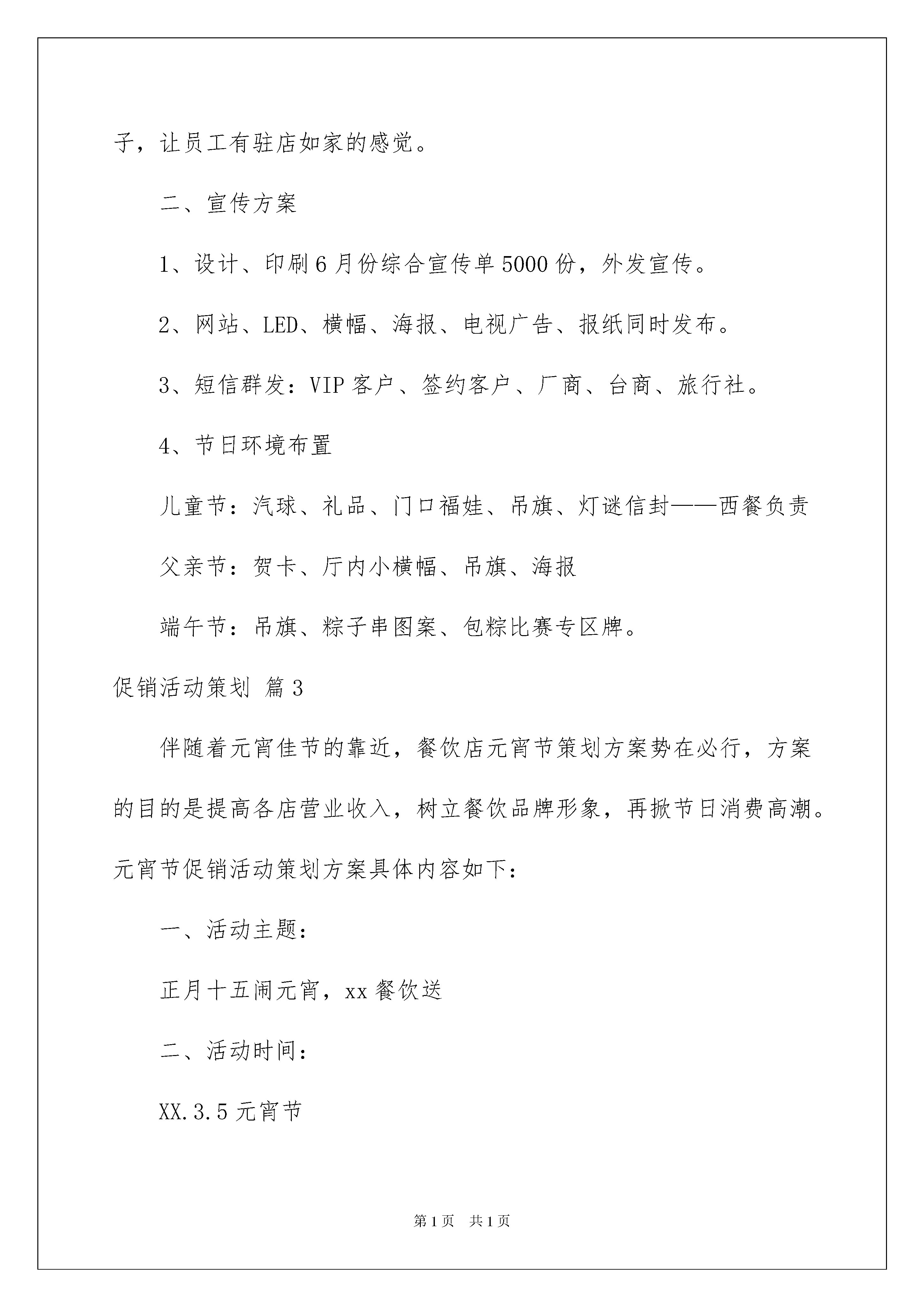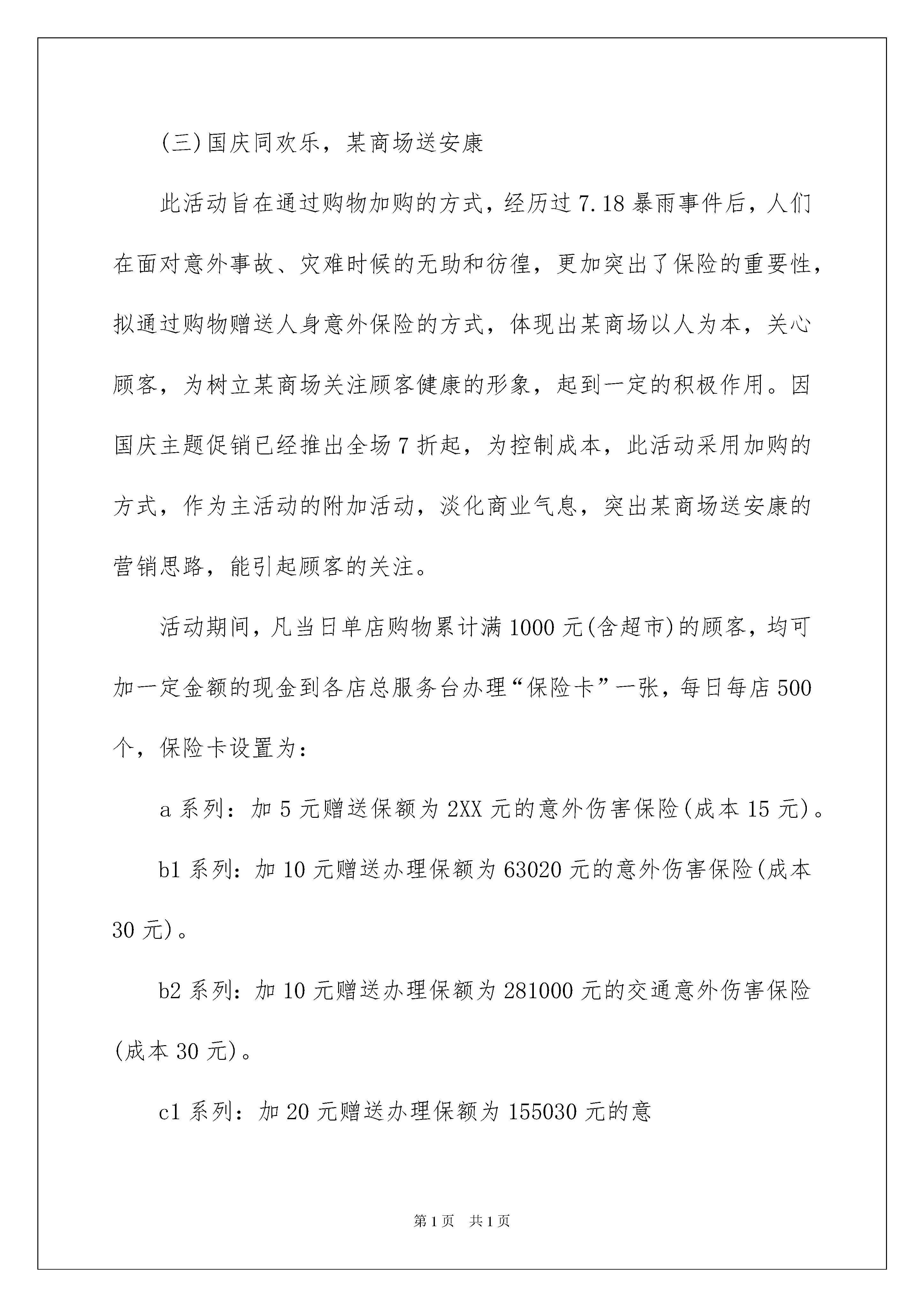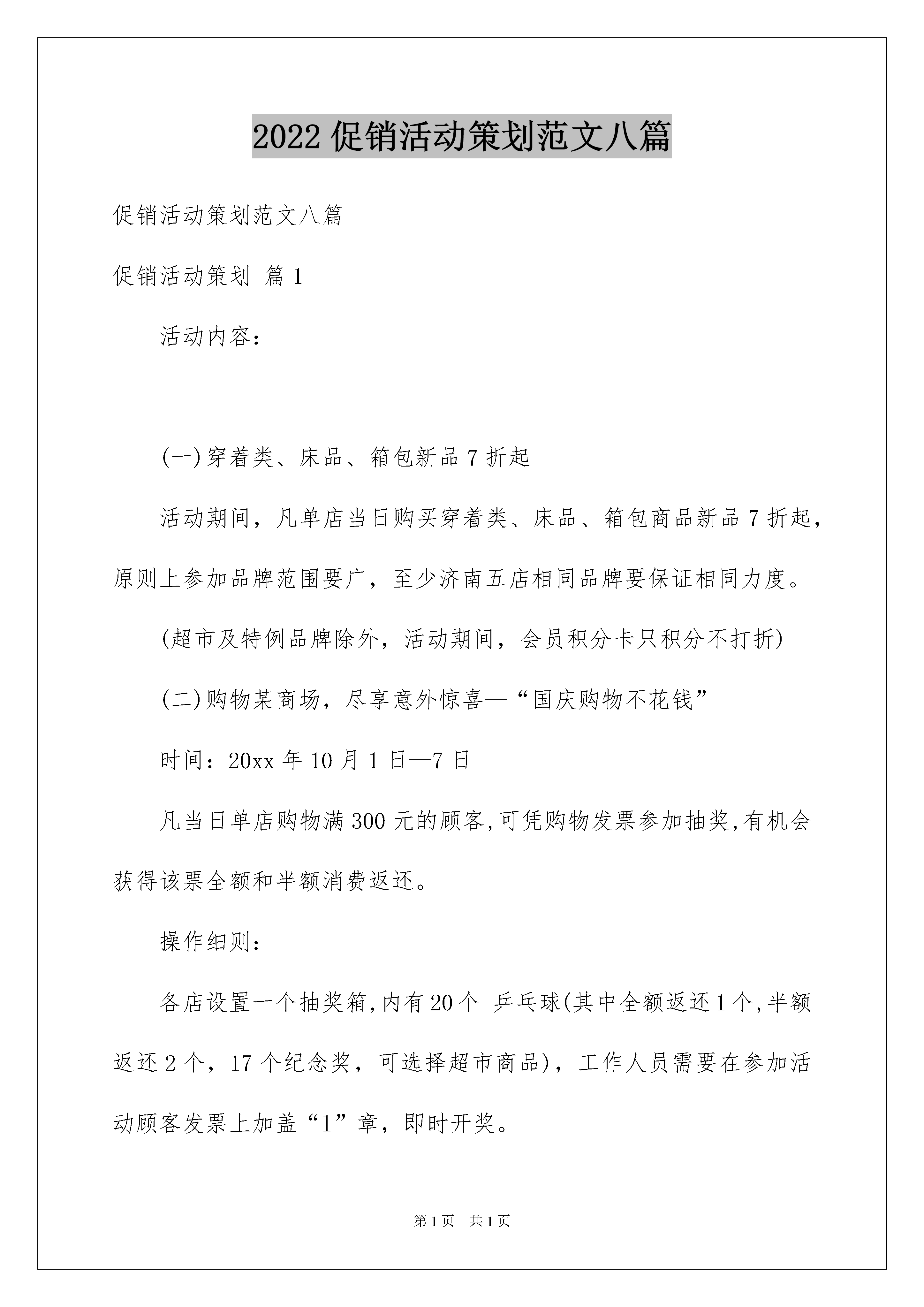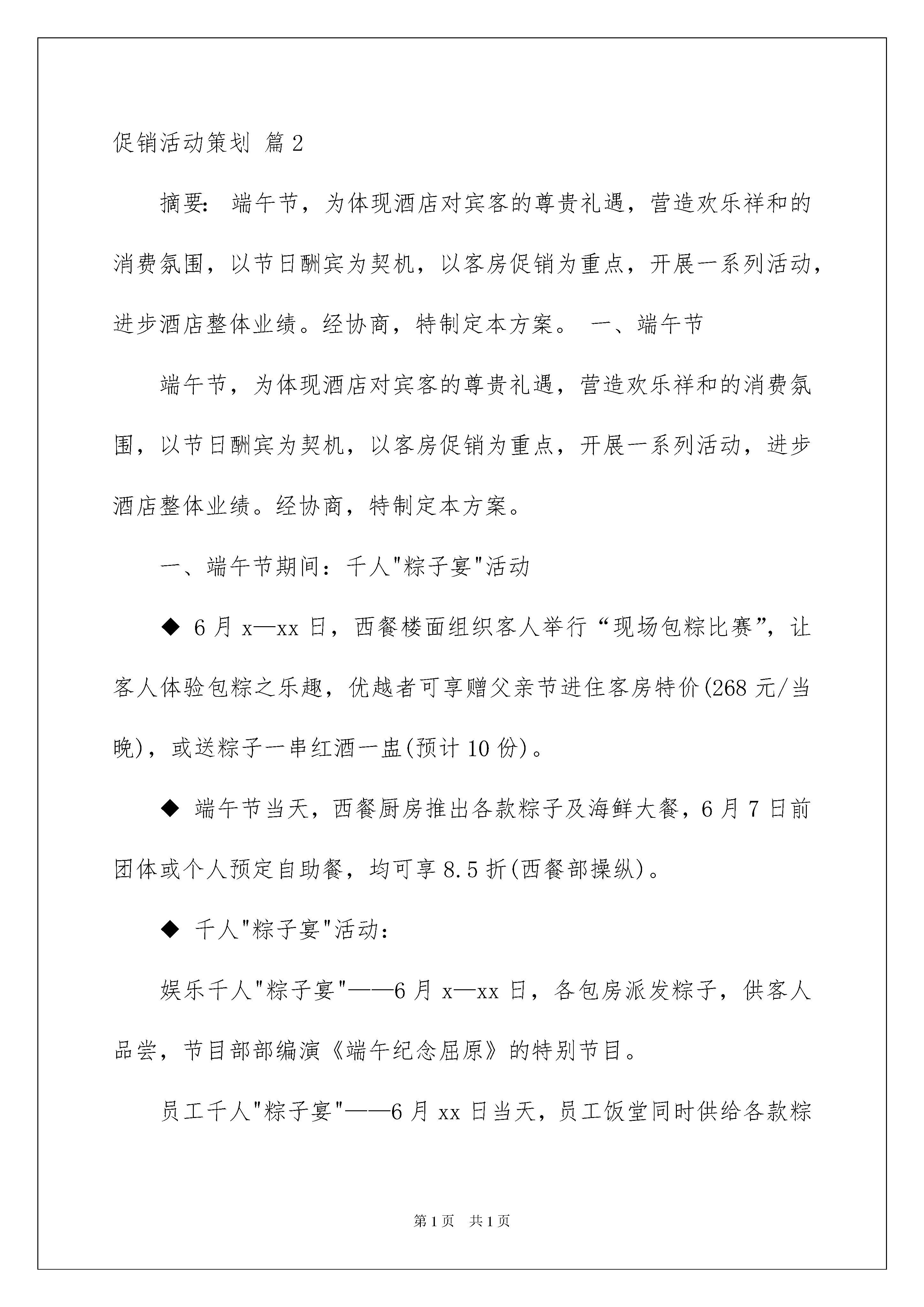 2022促销活动策划范文八篇促销活动策划范文八篇促销活动策划篇1活动内容:(一)穿着类、床品、箱包新品7折起活动期间,凡单店当日购买穿着类、床品、箱包商品新品7折起,原则上参加品牌范围要广,至少济南五店相同品牌要保证相同力度。(超市及特例品牌除外,活动期间,会员积分卡只积分不打折)(二)购物某商场,尽享意外惊喜—“国庆购物不花钱”时间:20xx年10月1日—7日凡当日单店购物满300元的顾客,可凭购物发票参加抽奖,有机会获得该票全额和半额消费返还。操作细则:各店设置一个抽奖箱,内有20个乒乓球(其中全额返还1个,半额返还2个,17个纪念奖,可选择超市商品),工作人员需要在参加活动顾客发票上加盖“l”章,即时开奖。(三)国庆同欢乐,某商场送安康此活动旨在通过购物加购的方式,经历过7.18暴雨事件后,人们在面对意外事故、灾难时候的无助和彷徨,更加突出了保险的重要性,拟通过购物赠送人身意外保险的方式,体现出某商场以人为本,关心顾客,为树立某商场关注顾客健康的形象,起到一定的积极作用。因国庆主题促销已经推出全场7折起,为控制成本,此活动采用加购的方式,作为主活动的附加活动,淡化商业气息,突出某商场送安康的营销思路,能引起顾客的关注。活动期间,凡当日单店购物累计满1000元(含超市)的顾客,均可加一定金额的现金到各店总服务台办理“保险卡”一张,每日每店500个,保险卡设置为:a系列:加5元赠送保额为2XX元的意外伤害保险(成本15元)。b1系列:加10元赠送办理保额为63020元的意外伤害保险(成本30元)。b2系列:加10元赠送办理保额为281000元的交通意外伤害保险(成本30元)。c1系列:加20元赠送办理保额为155030元的意促销活动策划篇2摘要:端午节,为体现酒店对宾客的尊贵礼遇,营造欢乐祥和的消费氛围,以节日酬宾为契机,以客房促销为重点,开展一系列活动,进步酒店整体业绩。经协商,特制定本方案。一、端午节端午节,为体现酒店对宾客的尊贵礼遇,营造欢乐祥和的消费氛围,以节日酬宾为契机,以客房促销为重点,开展一系列活动,进步酒店整体业绩。经协商,特制定本方案。一、端午节期间:千人"粽子宴"活动◆6月x—xx日,西餐楼面组织客人举行“现场包粽比赛”,让客人体验包粽之乐趣,优越者可享赠父亲节进住客房特价(268元/当晚),或送粽子一串红酒一盅(预计10份)。◆端午节当天,西餐厨房推出各款粽子及海鲜大餐,6月7日前团体或个人预定自助餐,均可享8.5折(西餐部操纵)。◆千人"粽子宴"活动:娱乐千人"粽子宴"——6月x—xx日,各包房派发粽子,供客人品尝,节目部部编演《端午纪念屈原》的特别节目。员工千人"粽子宴"——6月xx日当天,员工饭堂同时供给各款粽子,让员工有驻店如家的感觉。二、宣传方案1、设计、印刷6月份综合宣传单5000份,外发宣传。2、网站、LED、横幅、海报、电视广告、报纸同时发布。3、短信群发:VIP客户、签约客户、厂商、台商、旅行社。4、节日环境布置儿童节:汽球、礼品、门口福娃、吊旗、灯谜信封——西餐负责父亲节:贺卡、厅内小横幅、吊旗、海报端午节:吊旗、粽子串图案、包粽比赛专区牌。促销活动策划篇3伴随着元宵佳节的靠近,餐饮店元宵节策划方案势在必行,方案的目的是提高各店营业收入,树立餐饮品牌形象,再掀节日消费高潮。元宵节促销活动策划方案具体内容如下:一、活动主题:正月十五闹元宵,xx餐饮送二、活动时间:XX.3.5元宵节三、活动地点:美食城、美食海鲜城、美食海鲜广场、法尔春天餐厅四、活动内容:1、正月十五当天来店消费的客人可参加猜灯谜活动,猜中者可获得精美小礼品一份,每桌限猜一个灯谜。2、正月十五当天到店内消费的客人,每人赠送元宵两个,赠完为止,营业做好登记,财务备存。3、正月十五当天各店厨师推出几款团圆菜品,寓意元宵节团团圆圆。五、配合部门:1、企划部负责设计横幅,每店一条,内容:正月十五闹元宵,勇丽餐饮送祝福,利用短信平台发送元宵节祝福短信,内容:正月十五闹元宵,勇丽餐饮送祝福,勇丽餐饮祝您月圆灯圆事事圆,情圆梦圆人团圆!2、灯谜由各店自己打印准备。(字谜部分发给客人,谜底部分放在前台,按序号对谜底)3、猜灯谜的礼品各店根据现有剩余小礼品配发,财务做好登记。4、各店所需元宵数量提前安排本店采购人员进行购买。六、注意事项:1、各店对员工进行相关知识培训,当日客人用餐时主动提示,并送上节日祝福。2、活动当天赠券活动只赠不用、积分卡活动正常进行。促销活动策划篇4一、美容院国庆促销活动方案主题:“缤纷国庆,惊喜优惠抢先送”二、美容院国庆促销活动日期:9月30日——10月8日