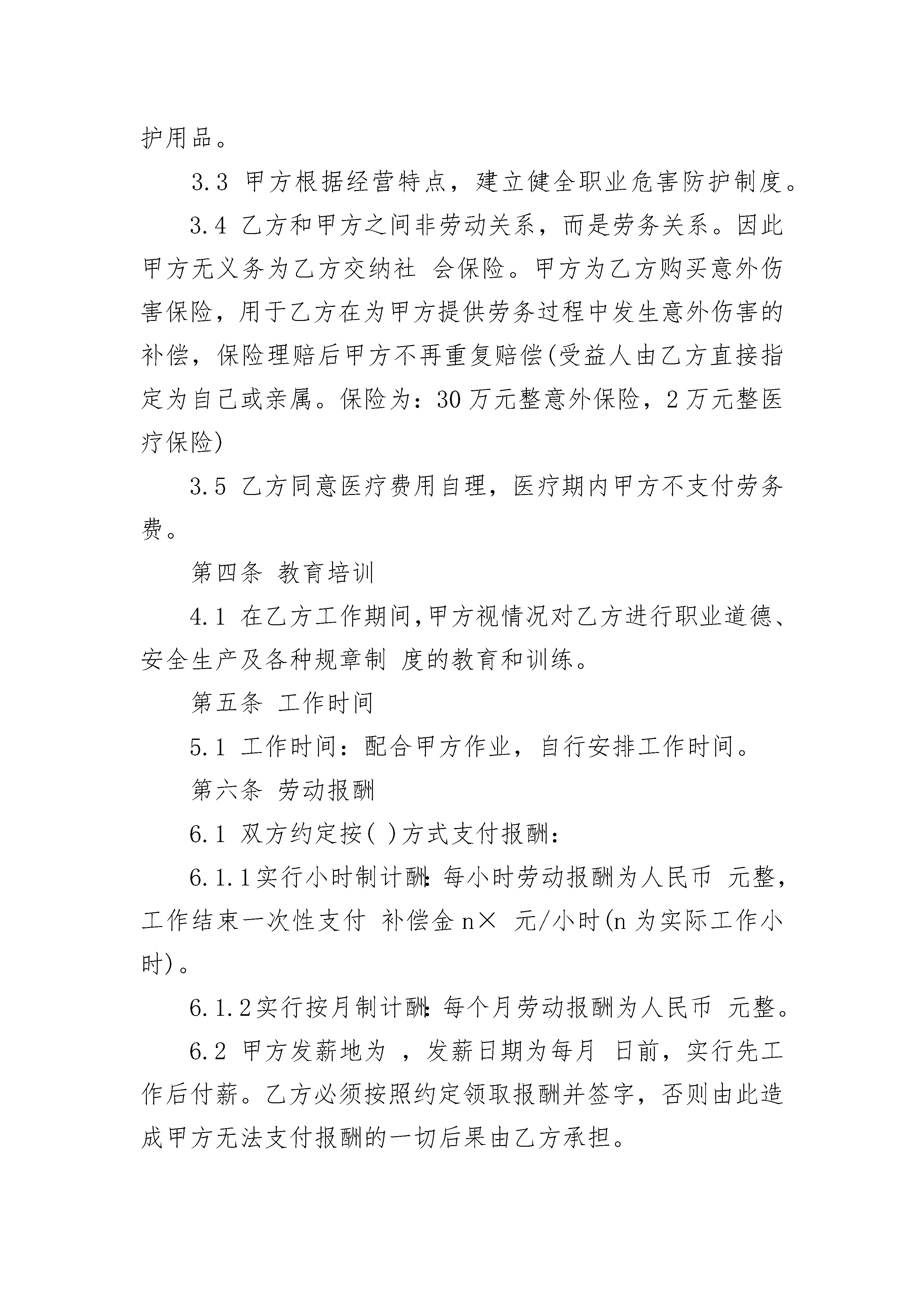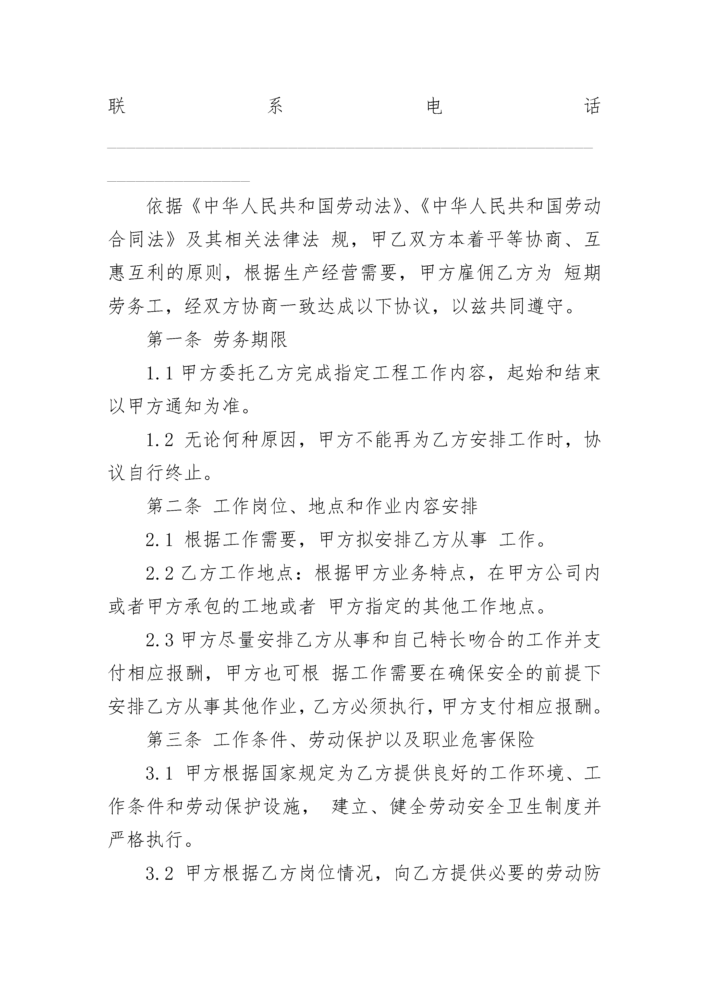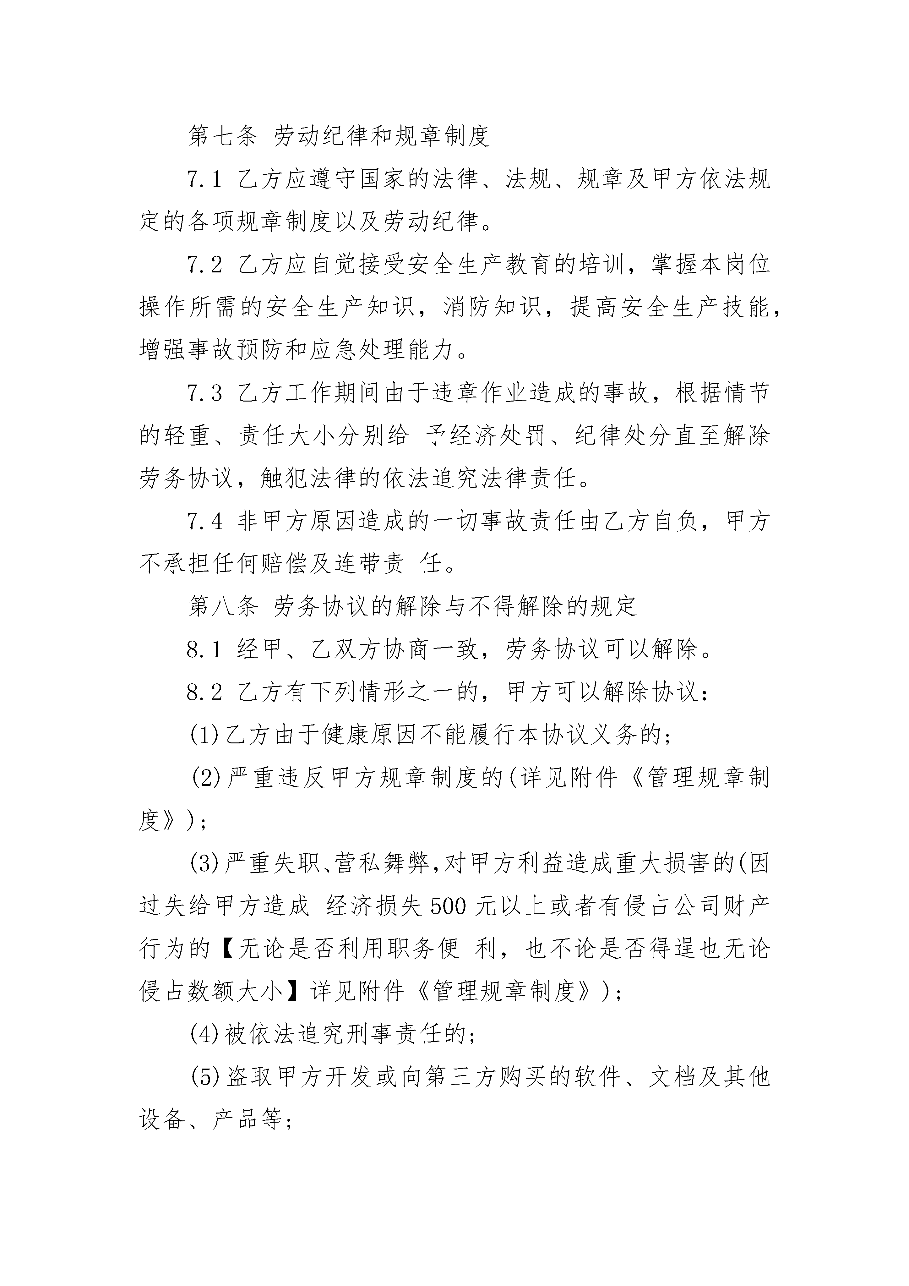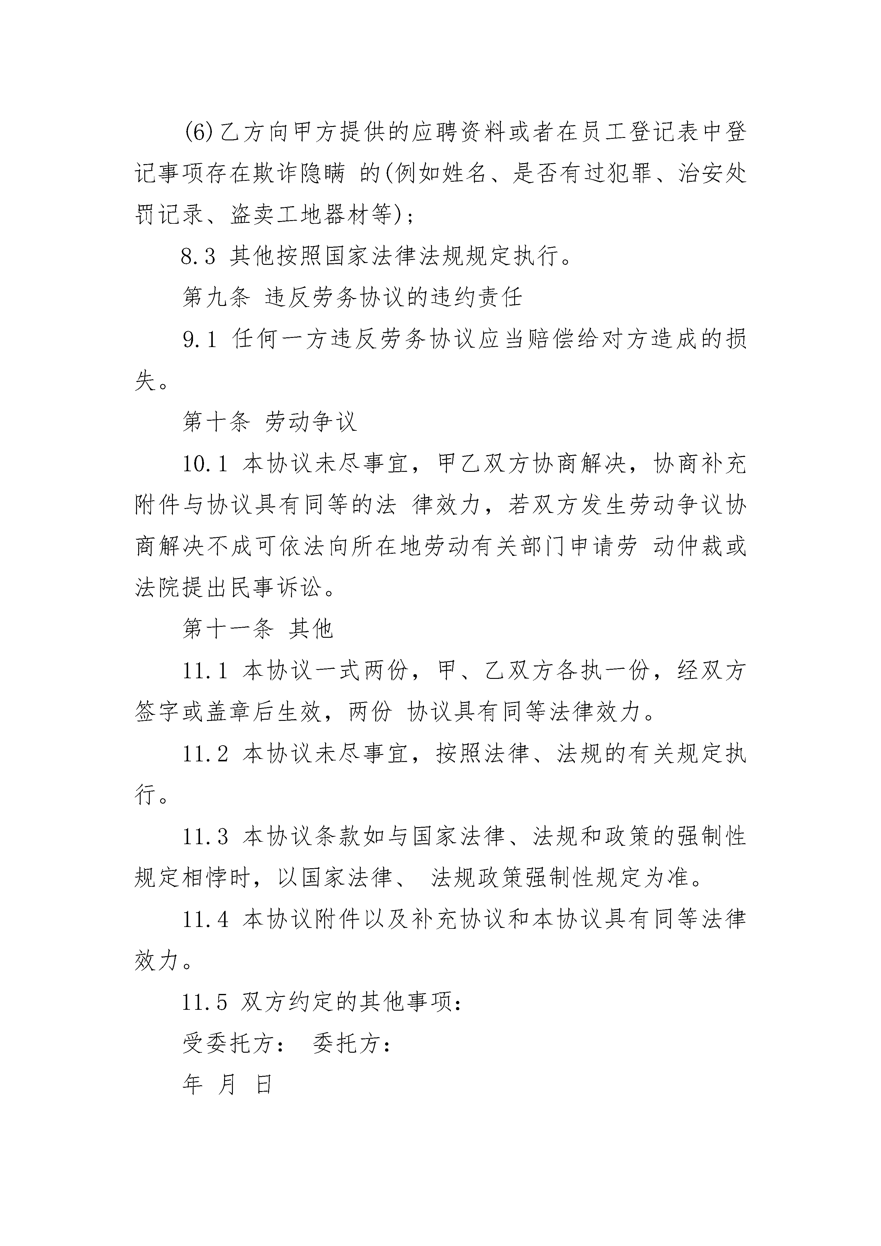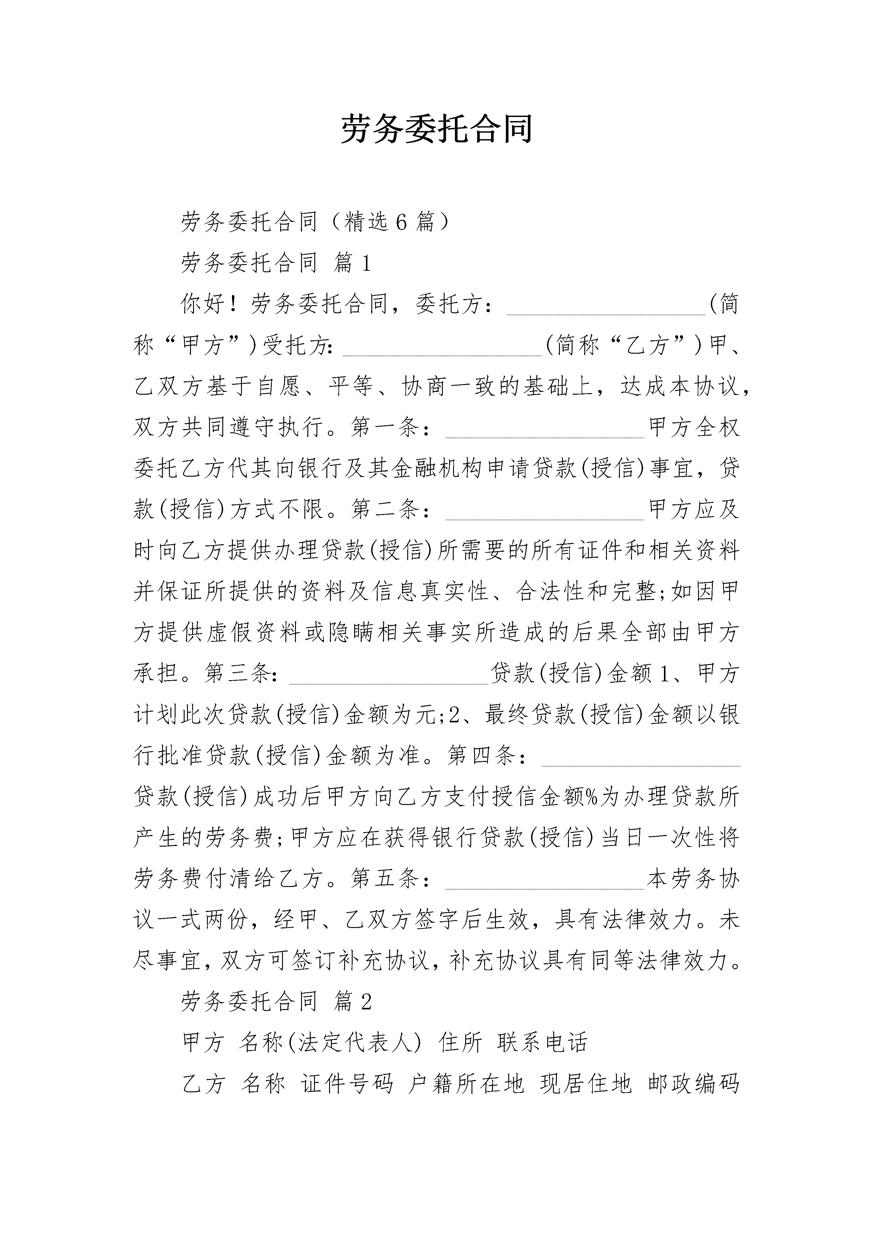 劳务委托合同劳务委托合同(精选6篇)劳务委托合同篇1你好!劳务委托合同,委托方:_________________(简称“甲方”)受托方:_________________(简称“乙方”)甲、乙双方基于自愿、平等、协商一致的基础上,达成本协议,双方共同遵守执行。第一条:_________________甲方全权委托乙方代其向银行及其金融机构申请贷款(授信)事宜,贷款(授信)方式不限。第二条:_________________甲方应及时向乙方提供办理贷款(授信)所需要的所有证件和相关资料并保证所提供的资料及信息真实性、合法性和完整;如因甲方提供虚假资料或隐瞒相关事实所造成的后果全部由甲方承担。第三条:_________________贷款(授信)金额1、甲方计划此次贷款(授信)金额为元;2、最终贷款(授信)金额以银行批准贷款(授信)金额为准。第四条:_________________贷款(授信)成功后甲方向乙方支付授信金额%为办理贷款所产生的劳务费;甲方应在获得银行贷款(授信)当日一次性将劳务费付清给乙方。第五条:_________________本劳务协议一式两份,经甲、乙双方签字后生效,具有法律效力。未尽事宜,双方可签订补充协议,补充协议具有同等法律效力。劳务委托合同篇2甲方名称(法定代表人)住所联系电话乙方名称证件号码户籍所在地现居住地邮政编码联系电话__________________________________________________________________依据《中华人民共和国劳动法》、《中华人民共和国劳动合同法》及其相关法律法规,甲乙双方本着平等协商、互惠互利的原则,根据生产经营需要,甲方雇佣乙方为短期劳务工,经双方协商一致达成以下协议,以兹共同遵守。第一条劳务期限1.1甲方委托乙方完成指定工程工作内容,起始和结束以甲方通知为准。1.2无论何种原因,甲方不能再为乙方安排工作时,协议自行终止。第二条工作岗位、地点和作业内容安排2.1根据工作需要,甲方拟安排乙方从事工作。2.2乙方工作地点:根据甲方业务特点,在甲方公司内或者甲方承包的工地或者甲方指定的其他工作地点。2.3甲方尽量安排乙方从事和自己特长吻合的工作并支付相应报酬,甲方也可根据工作需要在确保安全的前提下安排乙方从事其他作业,乙方必须执行,甲方支付相应报酬。第三条工作条件、劳动保护以及职业危害保险3.1甲方根据国家规定为乙方提供良好的工作环境、工作条件和劳动保护设施,建立、健全劳动安全卫生制度并严格执行。3.2甲方根据乙方岗位情况,向乙方提供必要的劳动防护用品。3.3甲方根据经营特点,建立健全职业危害防护制度。3.4乙方和甲方之间非劳动关系,而是劳务关系。因此甲方无义务为乙方交纳社会保险。甲方为乙方购买意外伤害保险,用于乙方在为甲方提供劳务过程中发生意外伤害的补偿,保险理赔后甲方不再重复赔偿(受益人由乙方直接指定为自己或亲属。保险为:30万元整意外保险,2万元整医疗保险)3.5乙方同意医疗费用自理,医疗期内甲方不支付劳务费。第四条教育培训4.1在乙方工作期间,甲方视情况对乙方进行职业道德、安全生产及各种规章制度的教育和训练。第五条工作时间5.1工作时间:配合甲方作业,自行安排工作时间。第六条劳动报酬6.1双方约定按()方式支付报酬:6.1.1实行小时制计酬:每小时劳动报酬为人民币元整,工作结束一次性支付补偿金n×元/小时(n为实际工作小时)。6.1.2实行按月制计酬:每个月劳动报酬为人民币元整。6.2甲方发薪地为,发薪日期为每月日前,实行先工作后付薪。乙方必须按照约定领取报酬并签字,否则由此造成甲方无法支付报酬的一切后果由乙方承担。第七条劳动纪律和规章制度7.1乙方应遵守国家的法律、法规、规章及甲方依法规定的各项规章制度以及劳动纪律。7.2乙方应自觉接受安全生产教育的培训,掌握本岗位操作所需的安全生产知识,消防知识,提高安全生产技能,增强事故预防和应急处理能力。7.3乙方工作期间由于违章作业造成的事故,根据情节的轻重、责任大小分别给予经济处罚、纪律处分直至解除劳务协议,触犯法律的依法追究法律责任。7.4非甲方原因造成的一切事故责任由乙方自负,甲方不承担任何赔偿及连带责任。第八条劳务协议的解除与不得解除的规定8.1经甲、乙双方协商一致,劳务协议可以解除。8.2乙方有下列情形之一的,甲方可以解除协议:(1)乙方由于健康原因不能履行本协议义务的;(2)严重违反甲方规章制度的(详见附件《管理规章制度》);(3)严重失职、营私舞弊,对甲方利益造成重大损害的(因过失给甲方造成经济损失500元以上或者有侵占公司财产行为的【无论是否利用职务便利,也不论是否得逞也无论侵占数额大小】详见附件《管理规章制度》);(4)被依法追究刑事责任的;(5)盗取甲方开发或