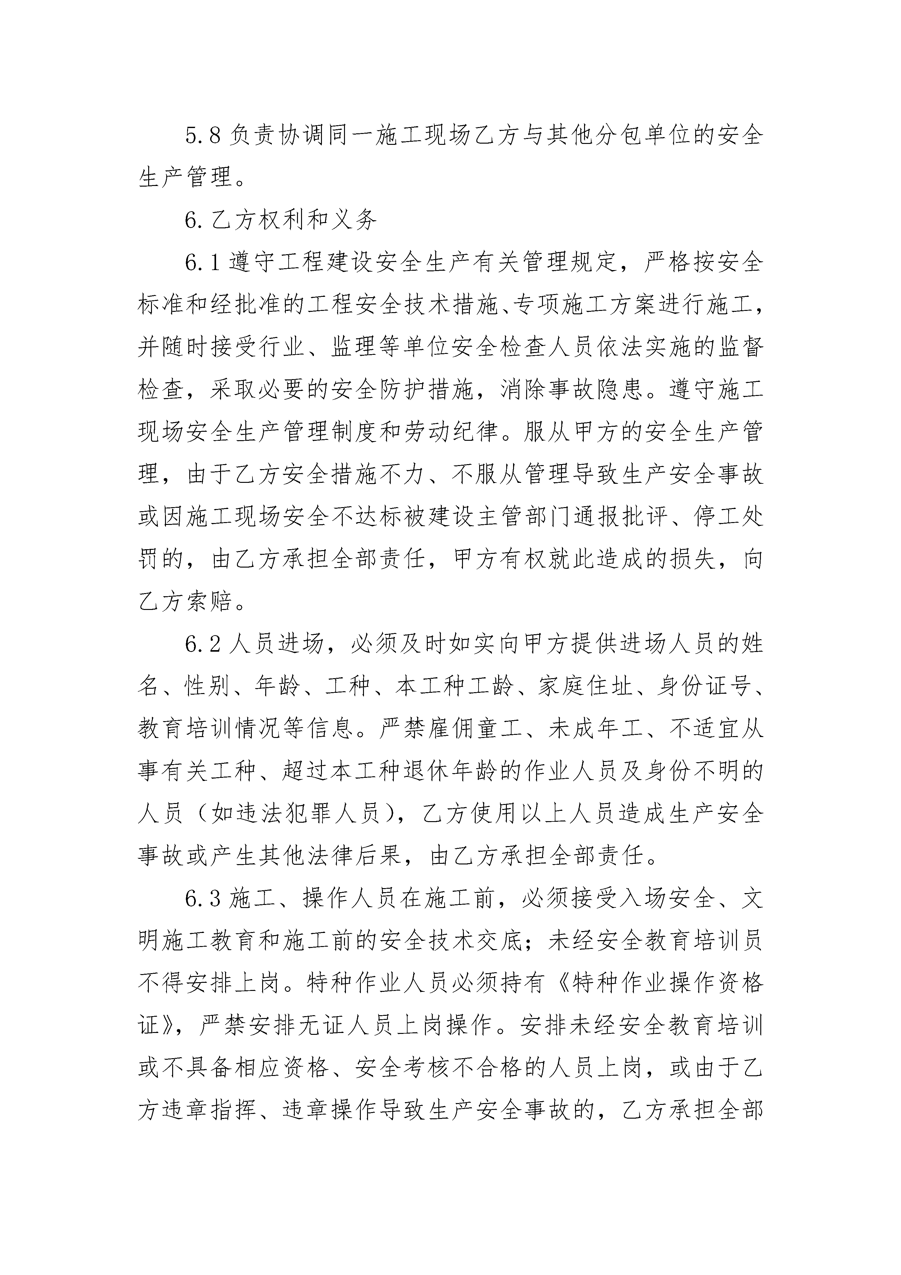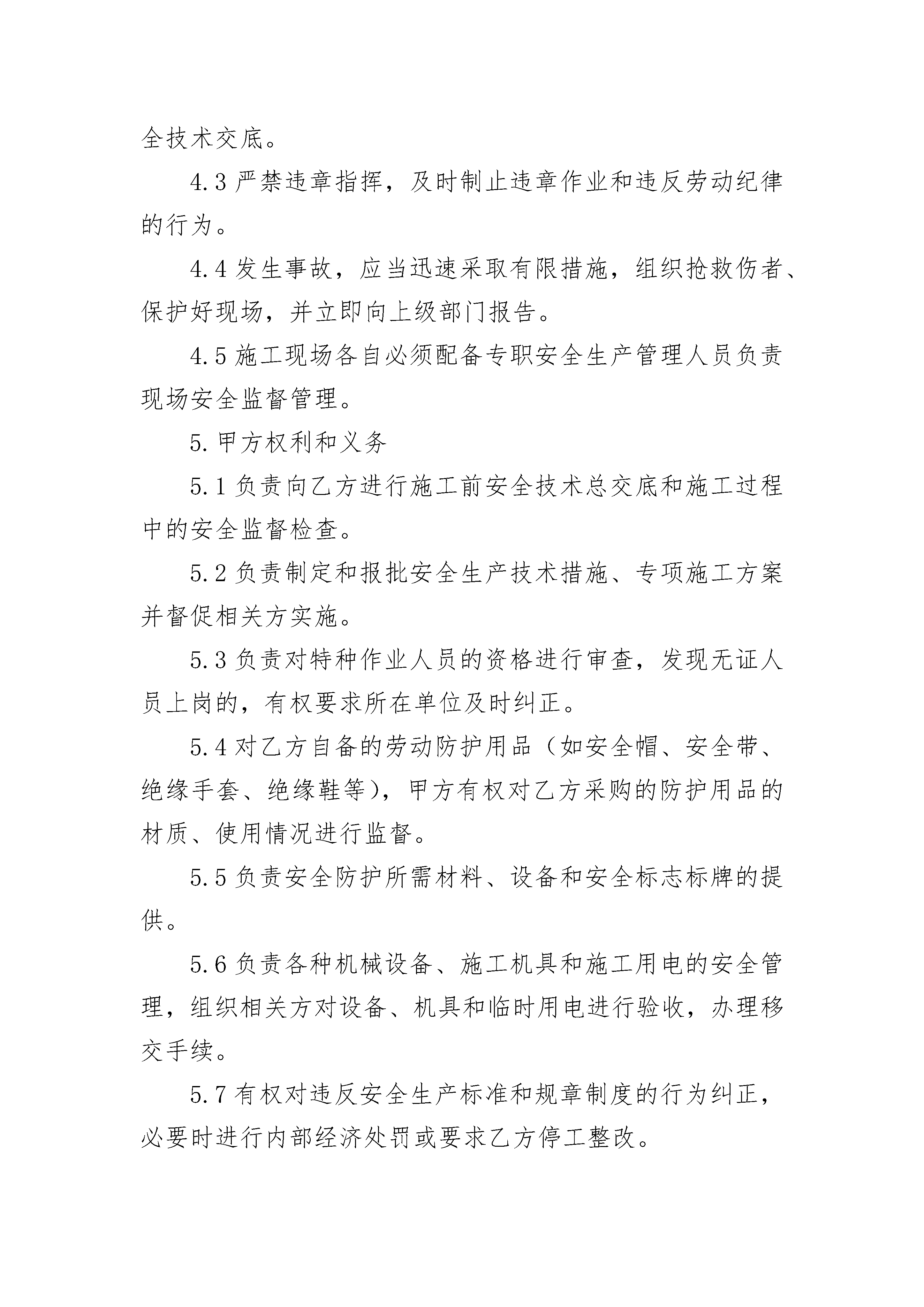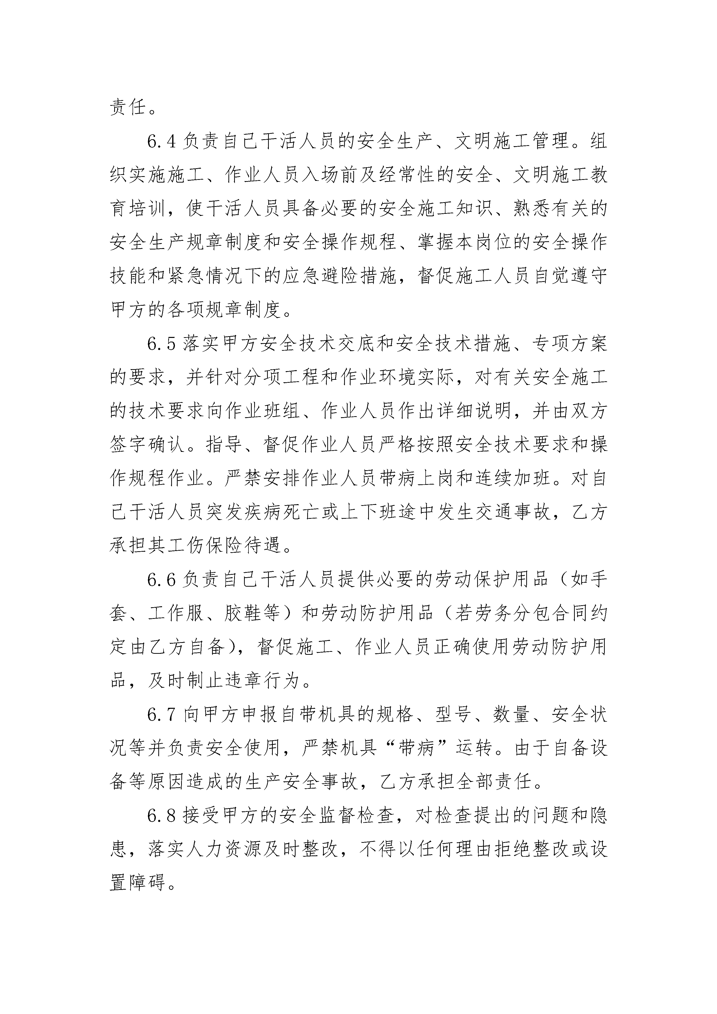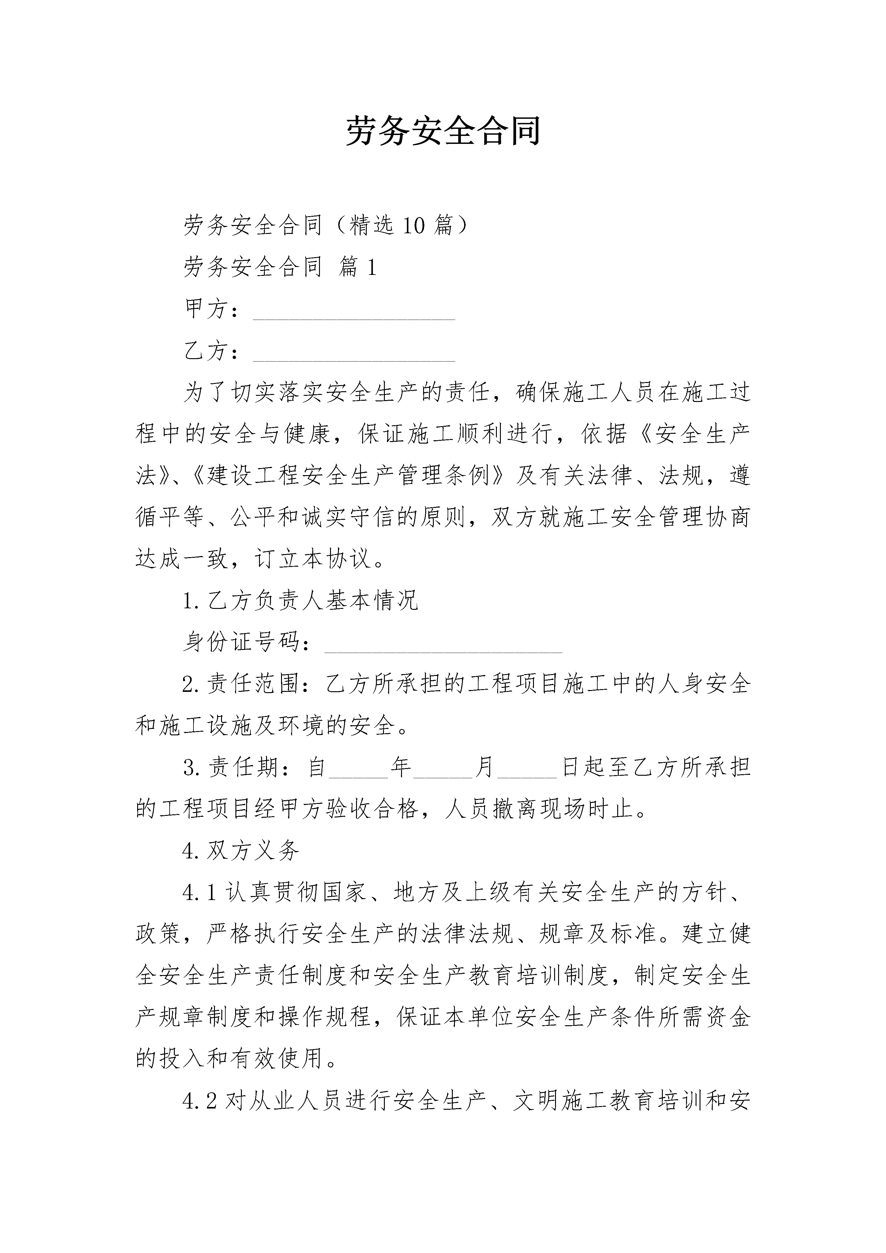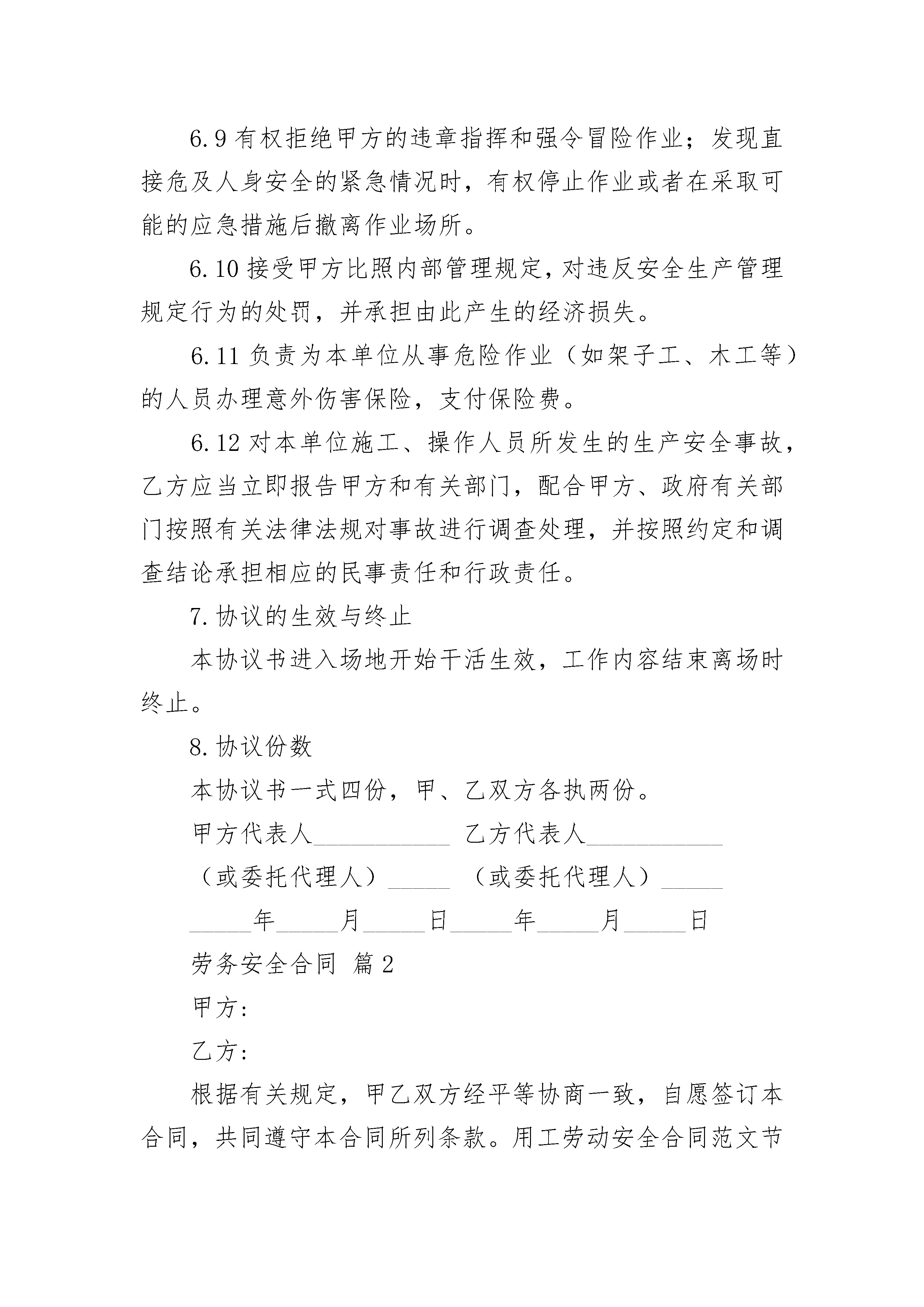 劳务安全合同劳务安全合同(精选10篇)劳务安全合同篇1甲方:_________________乙方:_________________为了切实落实安全生产的责任,确保施工人员在施工过程中的安全与健康,保证施工顺利进行,依据《安全生产法》、《建设工程安全生产管理条例》及有关法律、法规,遵循平等、公平和诚实守信的原则,双方就施工安全管理协商达成一致,订立本协议。1.乙方负责人基本情况身份证号码:____________________2.责任范围:乙方所承担的工程项目施工中的人身安全和施工设施及环境的安全。3.责任期:自_____年_____月_____日起至乙方所承担的工程项目经甲方验收合格,人员撤离现场时止。4.双方义务4.1认真贯彻国家、地方及上级有关安全生产的方针、政策,严格执行安全生产的法律法规、规章及标准。建立健全安全生产责任制度和安全生产教育培训制度,制定安全生产规章制度和操作规程,保证本单位安全生产条件所需资金的投入和有效使用。4.2对从业人员进行安全生产、文明施工教育培训和安全技术交底。4.3严禁违章指挥,及时制止违章作业和违反劳动纪律的行为。4.4发生事故,应当迅速采取有限措施,组织抢救伤者、保护好现场,并立即向上级部门报告。4.5施工现场各自必须配备专职安全生产管理人员负责现场安全监督管理。5.甲方权利和义务5.1负责向乙方进行施工前安全技术总交底和施工过程中的安全监督检查。5.2负责制定和报批安全生产技术措施、专项施工方案并督促相关方实施。5.3负责对特种作业人员的资格进行审查,发现无证人员上岗的,有权要求所在单位及时纠正。5.4对乙方自备的劳动防护用品(如安全帽、安全带、绝缘手套、绝缘鞋等),甲方有权对乙方采购的防护用品的材质、使用情况进行监督。5.5负责安全防护所需材料、设备和安全标志标牌的提供。5.6负责各种机械设备、施工机具和施工用电的安全管理,组织相关方对设备、机具和临时用电进行验收,办理移交手续。5.7有权对违反安全生产标准和规章制度的行为纠正,必要时进行内部经济处罚或要求乙方停工整改。5.8负责协调同一施工现场乙方与其他分包单位的安全生产管理。6.乙方权利和义务6.1遵守工程建设安全生产有关管理规定,严格按安全标准和经批准的工程安全技术措施、专项施工方案进行施工,并随时接受行业、监理等单位安全检查人员依法实施的监督检查,采取必要的安全防护措施,消除事故隐患。遵守施工现场安全生产管理制度和劳动纪律。服从甲方的安全生产管理,由于乙方安全措施不力、不服从管理导致生产安全事故或因施工现场安全不达标被建设主管部门通报批评、停工处罚的,由乙方承担全部责任,甲方有权就此造成的损失,向乙方索赔。6.2人员进场,必须及时如实向甲方提供进场人员的姓名、性别、年龄、工种、本工种工龄、家庭住址、身份证号、教育培训情况等信息。严禁雇佣童工、未成年工、不适宜从事有关工种、超过本工种退休年龄的作业人员及身份不明的人员(如违法犯罪人员),乙方使用以上人员造成生产安全事故或产生其他法律后果,由乙方承担全部责任。6.3施工、操作人员在施工前,必须接受入场安全、文明施工教育和施工前的安全技术交底;未经安全教育培训员不得安排上岗。特种作业人员必须持有《特种作业操作资格证》,严禁安排无证人员上岗操作。安排未经安全教育培训或不具备相应资格、安全考核不合格的人员上岗,或由于乙方违章指挥、违章操作导致生产安全事故的,乙方承担全部责任。6.4负责自己干活人员的安全生产、文明施工管理。组织实施施工、作业人员入场前及经常性的安全、文明施工教育培训,使干活人员具备必要的安全施工知识、熟悉有关的安全生产规章制度和安全操作规程、掌握本岗位的安全操作技能和紧急情况下的应急避险措施,督促施工人员自觉遵守甲方的各项规章制度。6.5落实甲方安全技术交底和安全技术措施、专项方案的要求,并针对分项工程和作业环境实际,对有关安全施工的技术要求向作业班组、作业人员作出详细说明,并由双方签字确认。指导、督促作业人员严格按照安全技术要求和操作规程作业。严禁安排作业人员带病上岗和连续加班。对自己干活人员突发疾病死亡或上下班途中发生交通事故,乙方承担其工伤保险待遇。6.6负责自己干活人员提供必要的劳动保护用品(如手套、工作服、胶鞋等)和劳动防护用品(若劳务分包合同约定由乙方自备),督促施工、作业人员正确使用劳动防护用品,及时制止违章行为。6.7向甲方申报自带机具的规格、型号、数量、安全状况等并负责安全使用,严禁机具“带病”运转。由于自备设备等原因造成的生产安全事故,乙方承担全部责任。6.8接受甲方的安全监督检查,对检查提出的问题和隐患,落实人力资源及时整改,不得以任何理由拒绝整改或设置障碍。6.9有权拒绝甲方的违章指挥和强令冒险作业;发现直接危及人身安全的紧急情况时,有权
