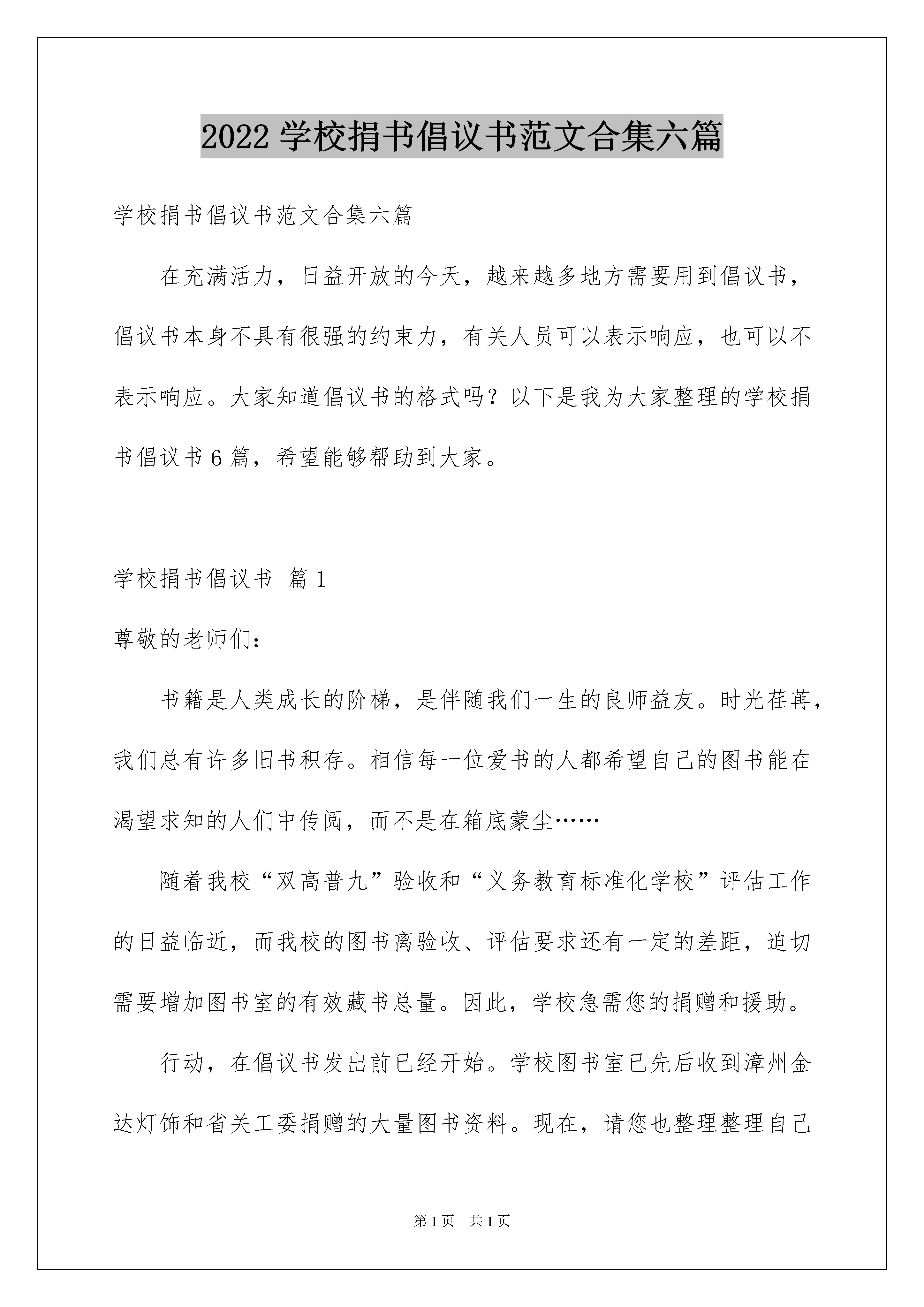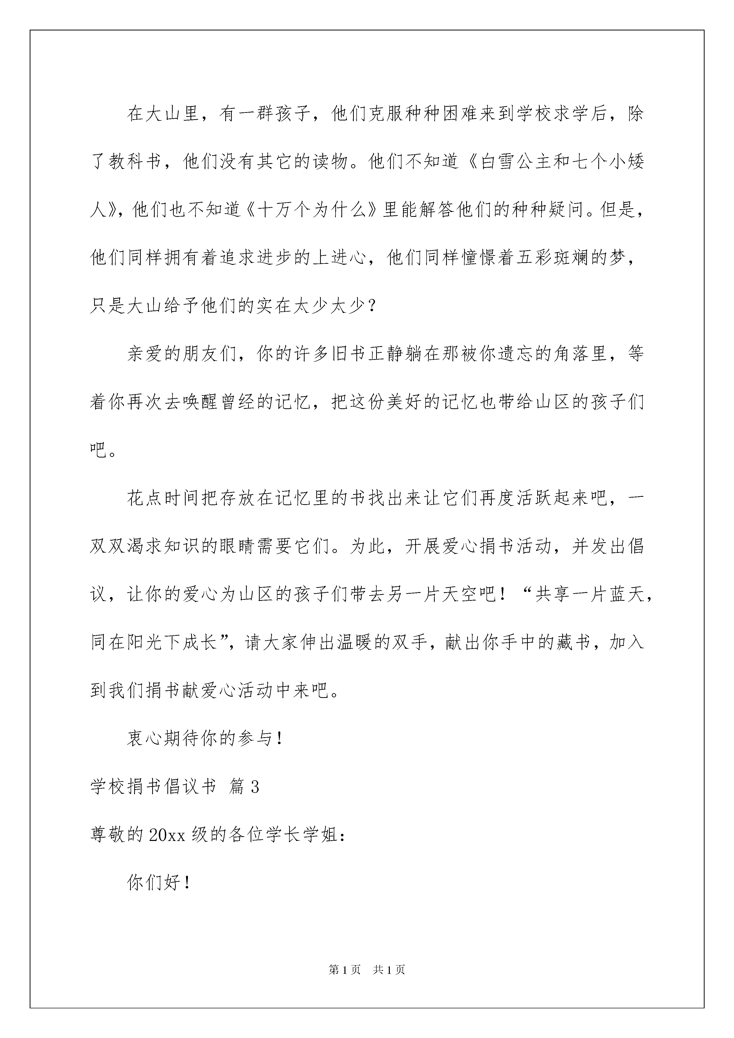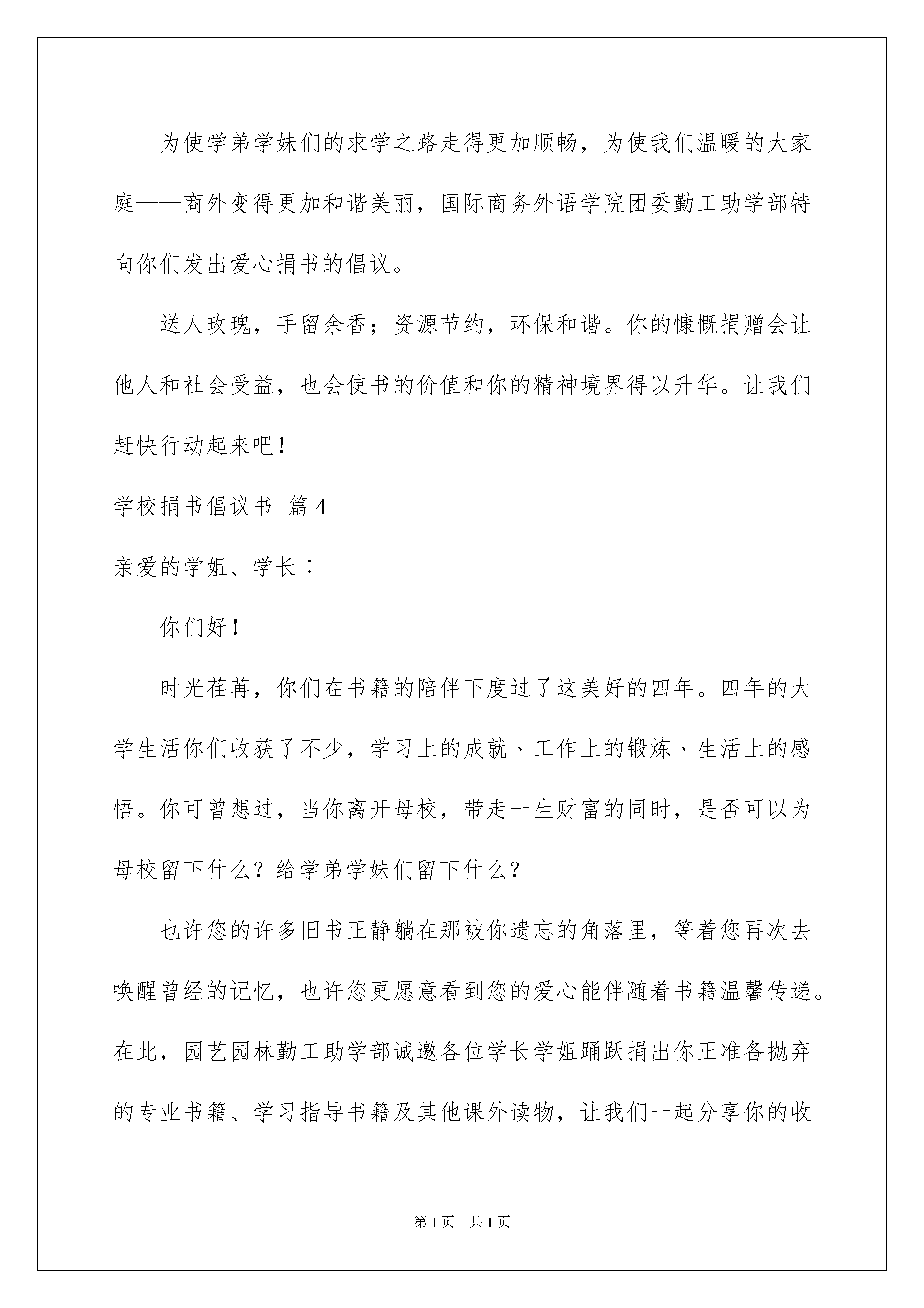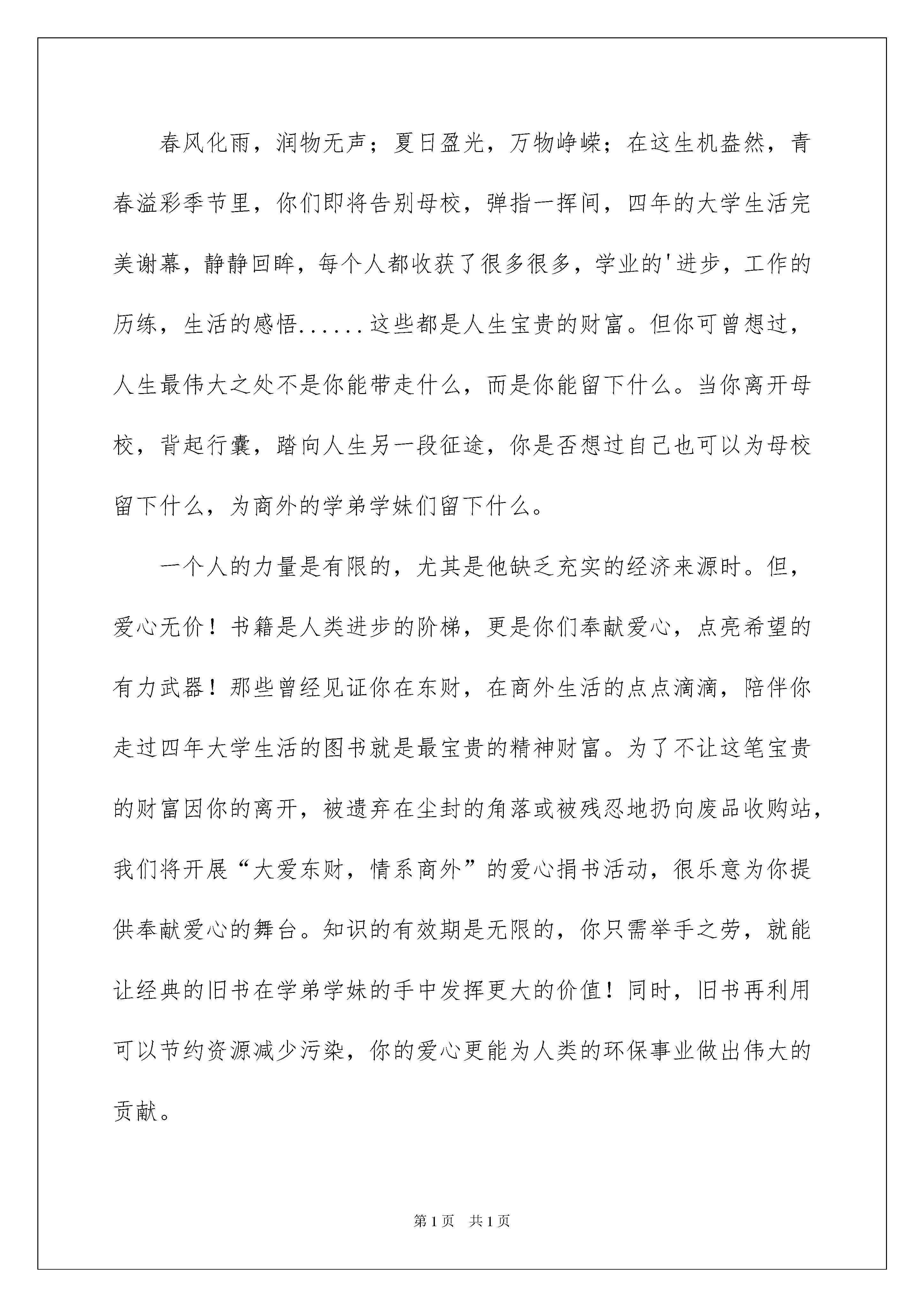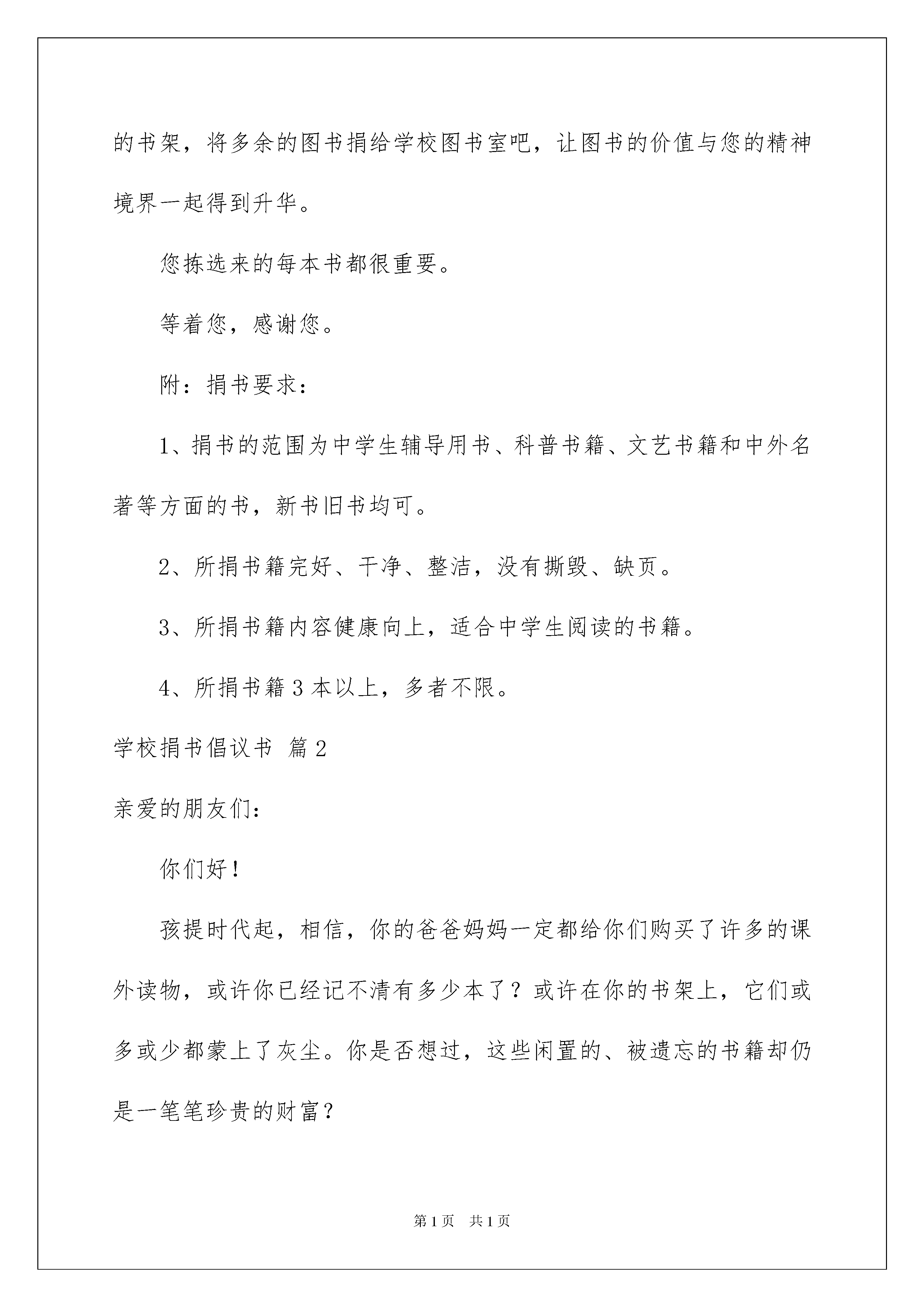 2022学校捐书倡议书范文合集六篇学校捐书倡议书范文合集六篇在充满活力,日益开放的今天,越来越多地方需要用到倡议书,倡议书本身不具有很强的约束力,有关人员可以表示响应,也可以不表示响应。大家知道倡议书的格式吗?以下是我为大家整理的学校捐书倡议书6篇,希望能够帮助到大家。学校捐书倡议书篇1尊敬的老师们:书籍是人类成长的阶梯,是伴随我们一生的良师益友。时光荏苒,我们总有许多旧书积存。相信每一位爱书的人都希望自己的图书能在渴望求知的人们中传阅,而不是在箱底蒙尘……随着我校“双高普九”验收和“义务教育标准化学校”评估工作的日益临近,而我校的图书离验收、评估要求还有一定的差距,迫切需要增加图书室的有效藏书总量。因此,学校急需您的捐赠和援助。行动,在倡议书发出前已经开始。学校图书室已先后收到漳州金达灯饰和省关工委捐赠的大量图书资料。现在,请您也整理整理自己的书架,将多余的图书捐给学校图书室吧,让图书的价值与您的精神境界一起得到升华。您拣选来的每本书都很重要。等着您,感谢您。附:捐书要求:1、捐书的范围为中学生辅导用书、科普书籍、文艺书籍和中外名著等方面的书,新书旧书均可。2、所捐书籍完好、干净、整洁,没有撕毁、缺页。3、所捐书籍内容健康向上,适合中学生阅读的书籍。4、所捐书籍3本以上,多者不限。学校捐书倡议书篇2亲爱的朋友们:你们好!孩提时代起,相信,你的爸爸妈妈一定都给你们购买了许多的课外读物,或许你已经记不清有多少本了?或许在你的书架上,它们或多或少都蒙上了灰尘。你是否想过,这些闲置的、被遗忘的书籍却仍是一笔笔珍贵的财富?在大山里,有一群孩子,他们克服种种困难来到学校求学后,除了教科书,他们没有其它的读物。他们不知道《白雪公主和七个小矮人》,他们也不知道《十万个为什么》里能解答他们的种种疑问。但是,他们同样拥有着追求进步的上进心,他们同样憧憬着五彩斑斓的梦,只是大山给予他们的实在太少太少?亲爱的朋友们,你的许多旧书正静躺在那被你遗忘的角落里,等着你再次去唤醒曾经的记忆,把这份美好的记忆也带给山区的孩子们吧。花点时间把存放在记忆里的书找出来让它们再度活跃起来吧,一双双渴求知识的眼睛需要它们。为此,开展爱心捐书活动,并发出倡议,让你的爱心为山区的孩子们带去另一片天空吧!“共享一片蓝天,同在阳光下成长”,请大家伸出温暖的双手,献出你手中的藏书,加入到我们捐书献爱心活动中来吧。衷心期待你的参与!学校捐书倡议书篇3尊敬的20xx级的各位学长学姐:你们好!春风化雨,润物无声;夏日盈光,万物峥嵘;在这生机盎然,青春溢彩季节里,你们即将告别母校,弹指一挥间,四年的大学生活完美谢幕,静静回眸,每个人都收获了很多很多,学业的'进步,工作的历练,生活的感悟......这些都是人生宝贵的财富。但你可曾想过,人生最伟大之处不是你能带走什么,而是你能留下什么。当你离开母校,背起行囊,踏向人生另一段征途,你是否想过自己也可以为母校留下什么,为商外的学弟学妹们留下什么。一个人的力量是有限的,尤其是他缺乏充实的经济来源时。但,爱心无价!书籍是人类进步的阶梯,更是你们奉献爱心,点亮希望的有力武器!那些曾经见证你在东财,在商外生活的点点滴滴,陪伴你走过四年大学生活的图书就是最宝贵的精神财富。为了不让这笔宝贵的财富因你的离开,被遗弃在尘封的角落或被残忍地扔向废品收购站,我们将开展“大爱东财,情系商外”的爱心捐书活动,很乐意为你提供奉献爱心的舞台。知识的有效期是无限的,你只需举手之劳,就能让经典的旧书在学弟学妹的手中发挥更大的价值!同时,旧书再利用可以节约资源减少污染,你的爱心更能为人类的环保事业做出伟大的贡献。为使学弟学妹们的求学之路走得更加顺畅,为使我们温暖的大家庭——商外变得更加和谐美丽,国际商务外语学院团委勤工助学部特向你们发出爱心捐书的倡议。送人玫瑰,手留余香;资源节约,环保和谐。你的慷慨捐赠会让他人和社会受益,也会使书的价值和你的精神境界得以升华。让我们赶快行动起来吧!学校捐书倡议书篇4亲爱的学姐、学长︰你们好!时光荏苒,你们在书籍的陪伴下度过了这美好的四年。四年的大学生活你们收获了不少,学习上的成就﹑工作上的锻炼﹑生活上的感悟。你可曾想过,当你离开母校,带走一生财富的同时,是否可以为母校留下什么?给学弟学妹们留下什么?也许您的许多旧书正静躺在那被你遗忘的角落里,等着您再次去唤醒曾经的记忆,也许您更愿意看到您的爱心能伴随着书籍温馨传递。在此,园艺园林勤工助学部诚邀各位学长学姐踊跃捐出你正准备抛弃的专业书籍、学习指导书籍及其他课外读物,让我们一起分享你的收藏果实,让书籍发挥它更大的潜在价值。亲们,加入我们的爱心