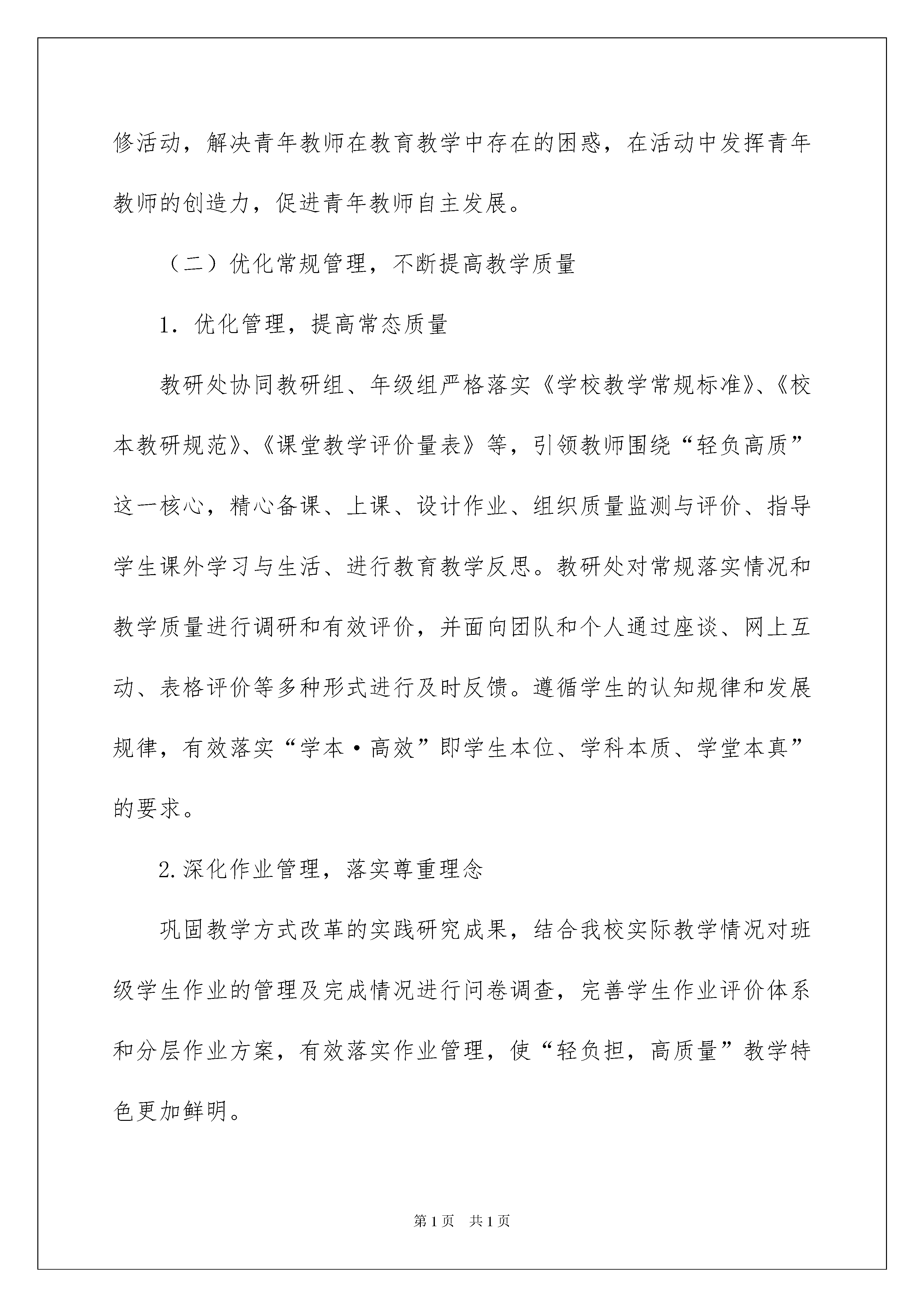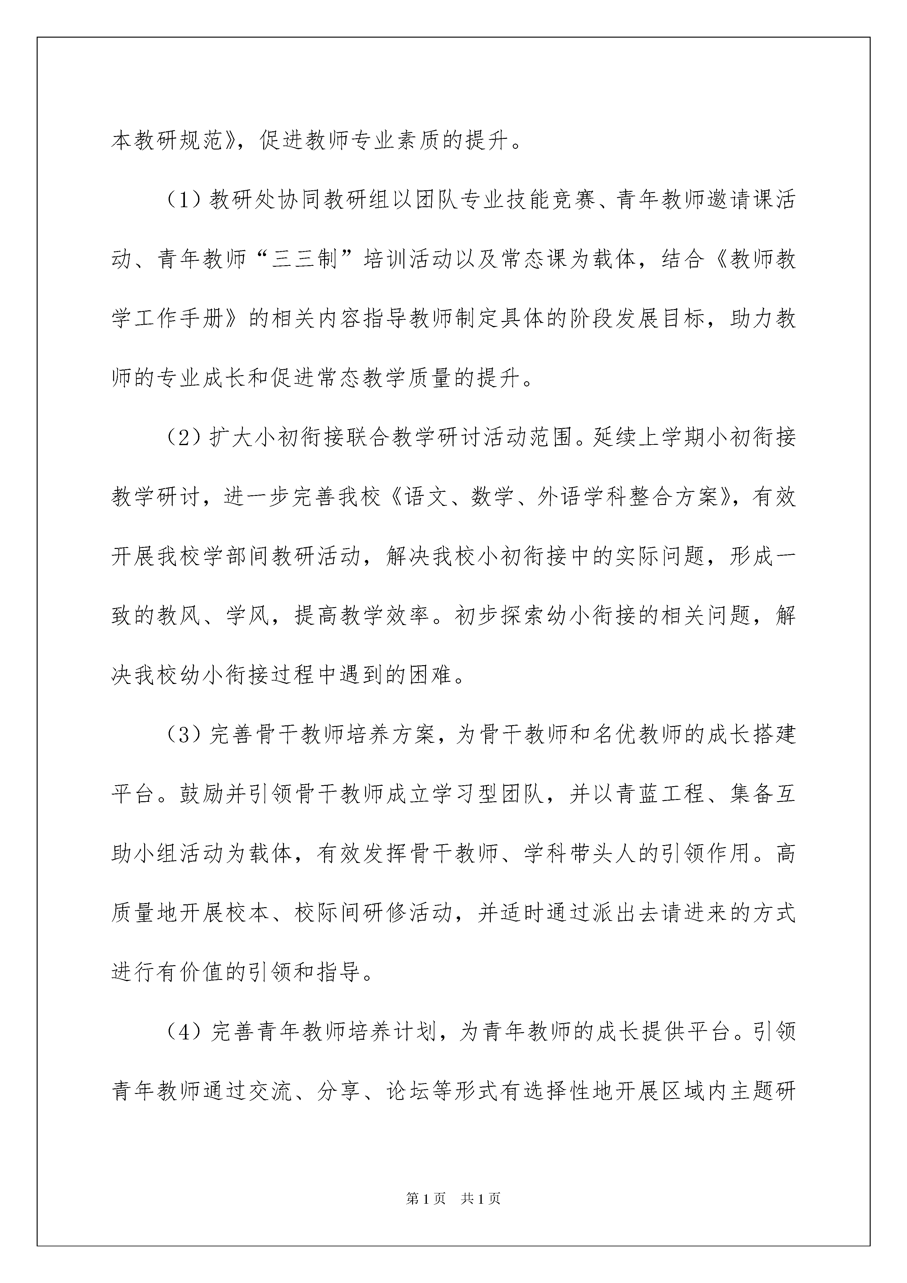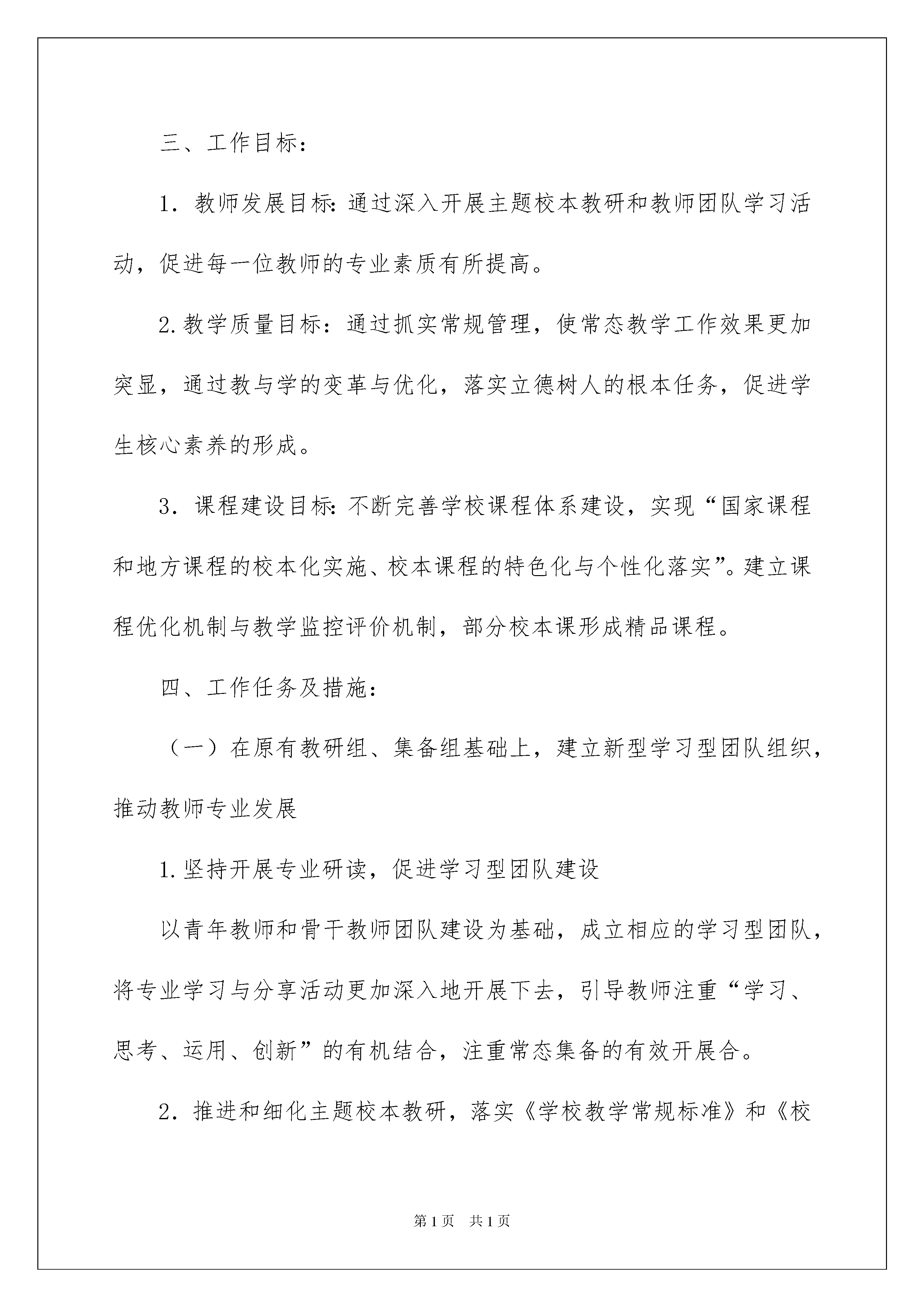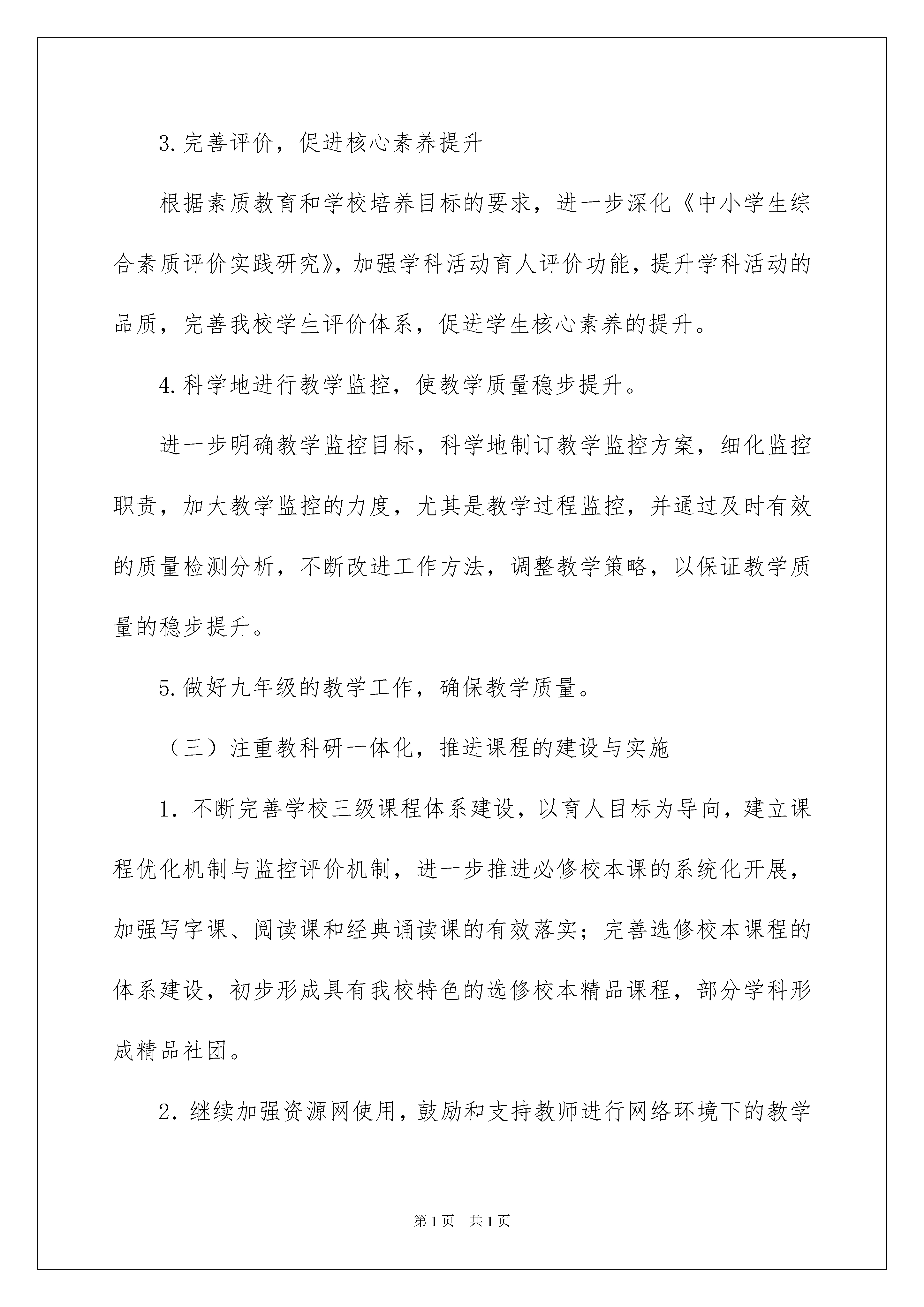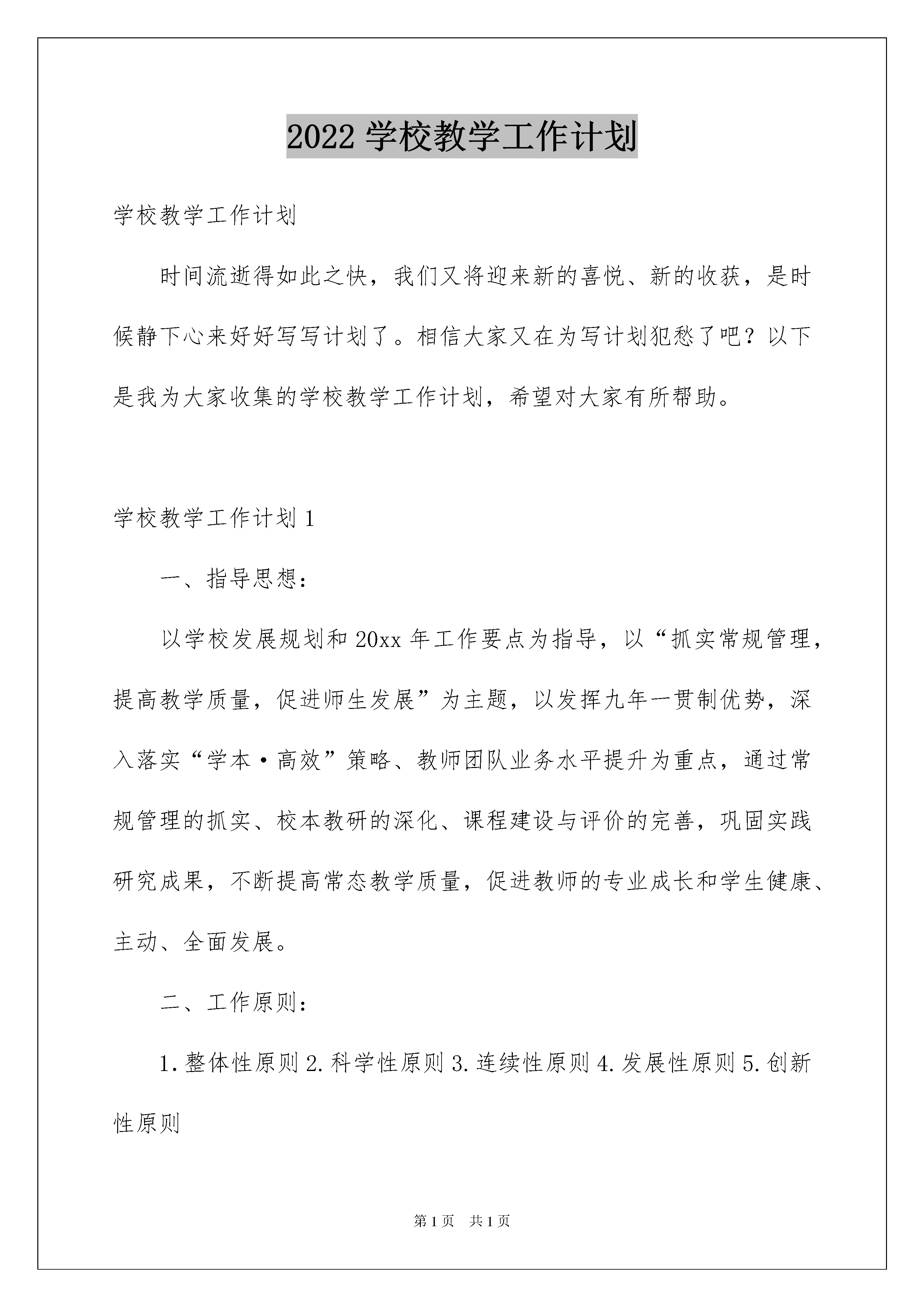 2022学校教学工作计划学校教学工作计划时间流逝得如此之快,我们又将迎来新的喜悦、新的收获,是时候静下心来好好写写计划了。相信大家又在为写计划犯愁了吧?以下是我为大家收集的学校教学工作计划,希望对大家有所帮助。学校教学工作计划1一、指导思想:以学校发展规划和20xx年工作要点为指导,以“抓实常规管理,提高教学质量,促进师生发展”为主题,以发挥九年一贯制优势,深入落实“学本·高效”策略、教师团队业务水平提升为重点,通过常规管理的抓实、校本教研的深化、课程建设与评价的完善,巩固实践研究成果,不断提高常态教学质量,促进教师的专业成长和学生健康、主动、全面发展。二、工作原则:1.整体性原则2.科学性原则3.连续性原则4.发展性原则5.创新性原则三、工作目标:1.教师发展目标:通过深入开展主题校本教研和教师团队学习活动,促进每一位教师的专业素质有所提高。2.教学质量目标:通过抓实常规管理,使常态教学工作效果更加突显,通过教与学的变革与优化,落实立德树人的根本任务,促进学生核心素养的形成。3.课程建设目标:不断完善学校课程体系建设,实现“国家课程和地方课程的校本化实施、校本课程的特色化与个性化落实”。建立课程优化机制与教学监控评价机制,部分校本课形成精品课程。四、工作任务及措施:(一)在原有教研组、集备组基础上,建立新型学习型团队组织,推动教师专业发展1.坚持开展专业研读,促进学习型团队建设以青年教师和骨干教师团队建设为基础,成立相应的学习型团队,将专业学习与分享活动更加深入地开展下去,引导教师注重“学习、思考、运用、创新”的有机结合,注重常态集备的有效开展合。2.推进和细化主题校本教研,落实《学校教学常规标准》和《校本教研规范》,促进教师专业素质的提升。(1)教研处协同教研组以团队专业技能竞赛、青年教师邀请课活动、青年教师“三三制”培训活动以及常态课为载体,结合《教师教学工作手册》的相关内容指导教师制定具体的阶段发展目标,助力教师的专业成长和促进常态教学质量的提升。(2)扩大小初衔接联合教学研讨活动范围。延续上学期小初衔接教学研讨,进一步完善我校《语文、数学、外语学科整合方案》,有效开展我校学部间教研活动,解决我校小初衔接中的实际问题,形成一致的教风、学风,提高教学效率。初步探索幼小衔接的相关问题,解决我校幼小衔接过程中遇到的困难。(3)完善骨干教师培养方案,为骨干教师和名优教师的成长搭建平台。鼓励并引领骨干教师成立学习型团队,并以青蓝工程、集备互助小组活动为载体,有效发挥骨干教师、学科带头人的引领作用。高质量地开展校本、校际间研修活动,并适时通过派出去请进来的方式进行有价值的引领和指导。(4)完善青年教师培养计划,为青年教师的成长提供平台。引领青年教师通过交流、分享、论坛等形式有选择性地开展区域内主题研修活动,解决青年教师在教育教学中存在的困惑,在活动中发挥青年教师的创造力,促进青年教师自主发展。(二)优化常规管理,不断提高教学质量1.优化管理,提高常态质量教研处协同教研组、年级组严格落实《学校教学常规标准》、《校本教研规范》、《课堂教学评价量表》等,引领教师围绕“轻负高质”这一核心,精心备课、上课、设计作业、组织质量监测与评价、指导学生课外学习与生活、进行教育教学反思。教研处对常规落实情况和教学质量进行调研和有效评价,并面向团队和个人通过座谈、网上互动、表格评价等多种形式进行及时反馈。遵循学生的认知规律和发展规律,有效落实“学本·高效”即学生本位、学科本质、学堂本真”的要求。2.深化作业管理,落实尊重理念巩固教学方式改革的实践研究成果,结合我校实际教学情况对班级学生作业的管理及完成情况进行问卷调查,完善学生作业评价体系和分层作业方案,有效落实作业管理,使“轻负担,高质量”教学特色更加鲜明。3.完善评价,促进核心素养提升根据素质教育和学校培养目标的要求,进一步深化《中小学生综合素质评价实践研究》,加强学科活动育人评价功能,提升学科活动的品质,完善我校学生评价体系,促进学生核心素养的提升。4.科学地进行教学监控,使教学质量稳步提升。进一步明确教学监控目标,科学地制订教学监控方案,细化监控职责,加大教学监控的力度,尤其是教学过程监控,并通过及时有效的质量检测分析,不断改进工作方法,调整教学策略,以保证教学质量的稳步提升。5.做好九年级的教学工作,确保教学质量。(三)注重教科研一体化,推进课程的建设与实施1.不断完善学校三级课程体系建设,以育人目标为导向,建立课程优化机制与监控评价机制,进一步推进必修校本课的系统化开展,加强写字课、阅读课和经典诵读课的有效落实;完善选修校本课程的体系建