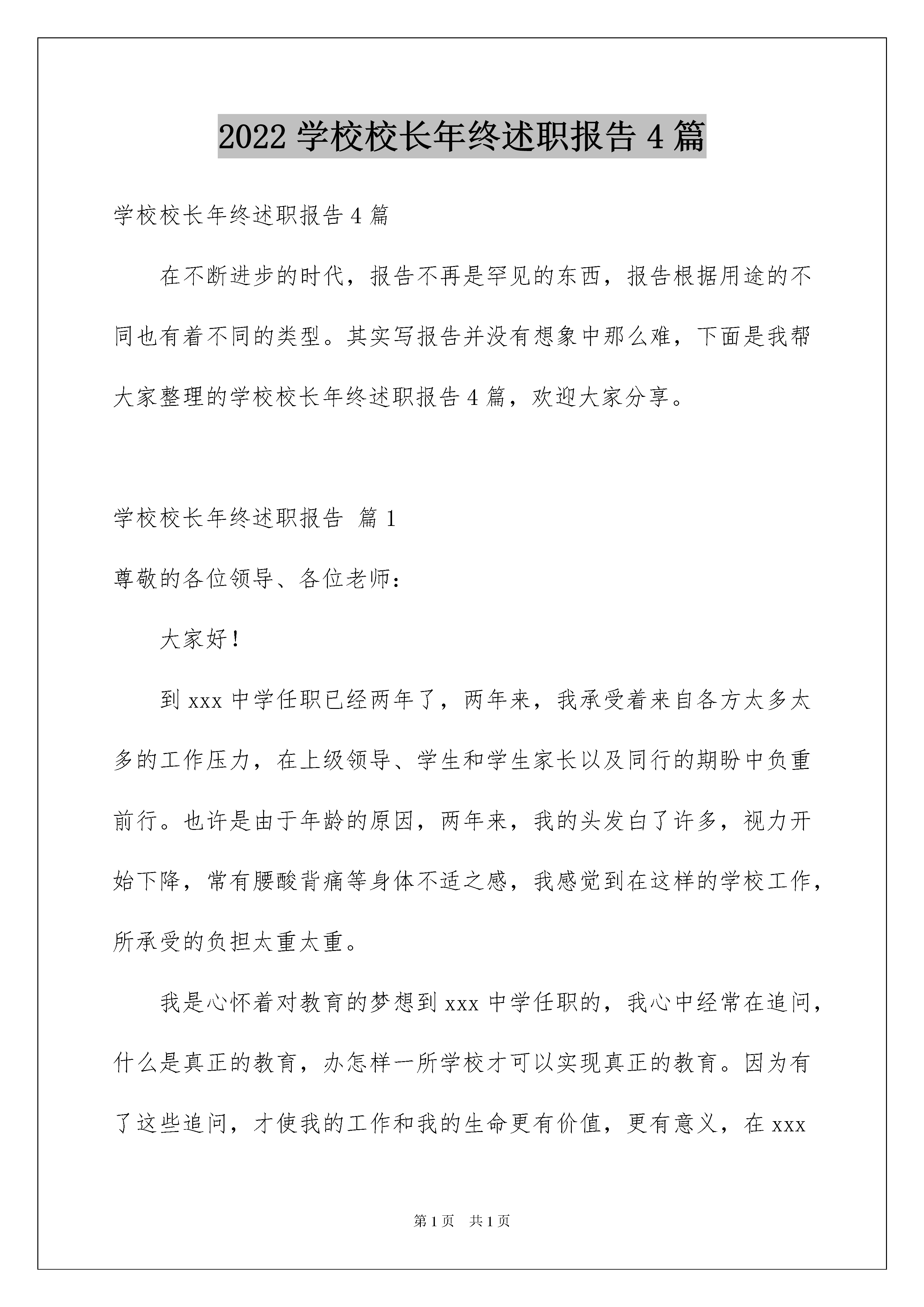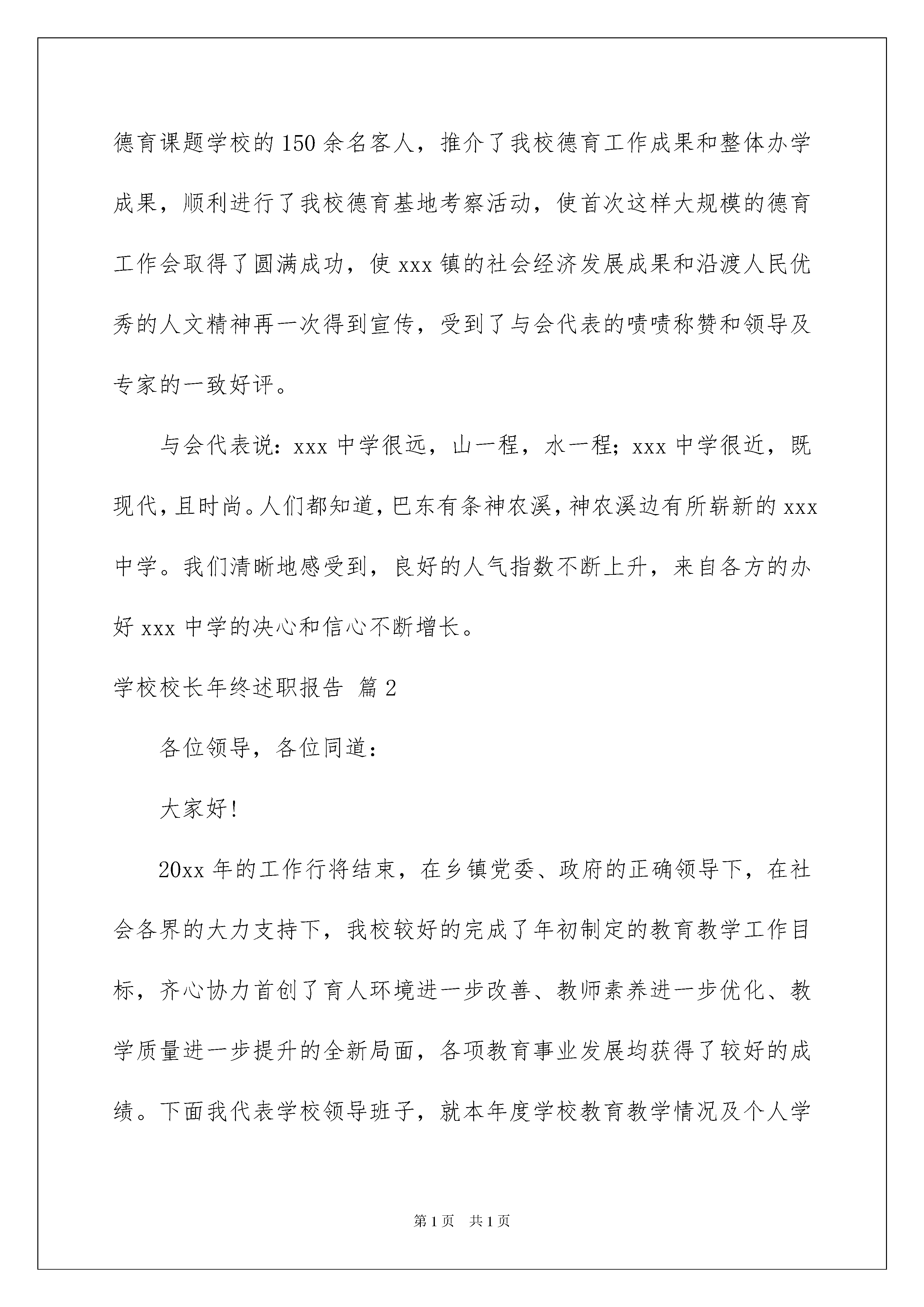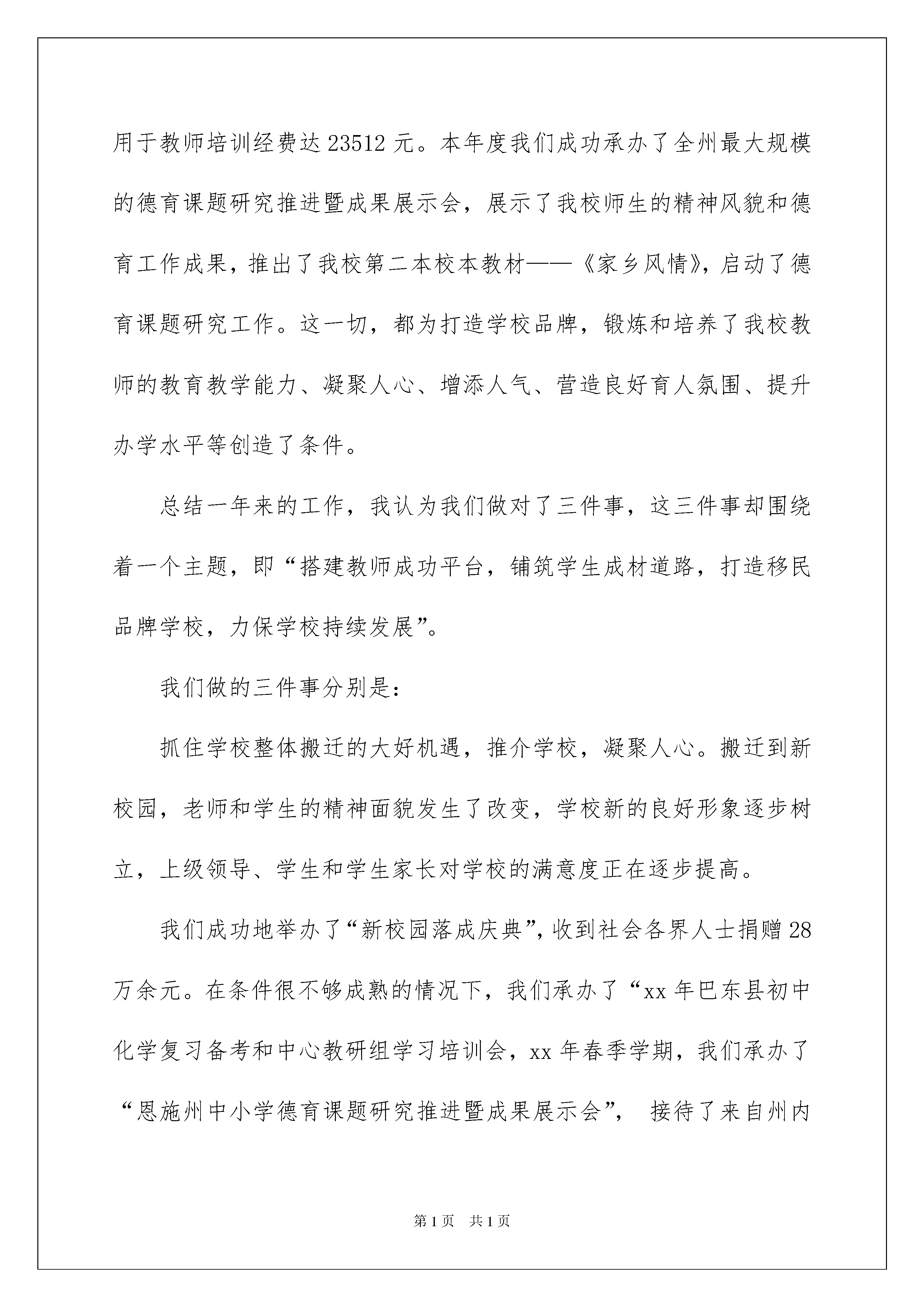2022学校校长年终述职报告4篇学校校长年终述职报告4篇在不断进步的时代,报告不再是罕见的东西,报告根据用途的不同也有着不同的类型。其实写报告并没有想象中那么难,下面是我帮大家整理的学校校长年终述职报告4篇,欢迎大家分享。学校校长年终述职报告篇1尊敬的各位领导、各位老师:大家好!到xxx中学任职已经两年了,两年来,我承受着来自各方太多太多的工作压力,在上级领导、学生和学生家长以及同行的期盼中负重前行。也许是由于年龄的原因,两年来,我的头发白了许多,视力开始下降,常有腰酸背痛等身体不适之感,我感觉到在这样的学校工作,所承受的负担太重太重。我是心怀着对教育的梦想到xxx中学任职的,我心中经常在追问,什么是真正的教育,办怎样一所学校才可以实现真正的教育。因为有了这些追问,才使我的工作和我的生命更有价值,更有意义,在xxx中学工作两年来我感觉非常幸福,有各级领导对xxx中学的支持与厚爱,有同志们(我把它叫做伙计们)理解与配合,有学生和学生家长的尊重与信任,我觉得这小小的校园里有做不完的工作,在这里,我可以用我的知识、智慧、情感和我一生中最旺盛的精力和体力,为这所学校留下一些或许对未来有用的东西,我的心中充满快乐。刚过去的一年对xxx中学来说非同寻常。这一年,我们有非常难得的机遇,学校整体移民搬迁成为社会关注的焦点,我认为,一旦我们不能把握机遇乘势而上,那么我们将不仅愧对前辈们的期待,而且,我们可能连学校未来的生存权都会葬送掉。所幸的是,我们全校教职员工齐心协力,依靠党委政府的坚强领导,依靠中心学校领导的指导,克服了许多困难,我们不仅没有被困难击垮,在一年的乐观情绪和充分的自信中,学校反而一越而成为令巴东教育界瞩目和震动的新学校,县委政府、县教育局、县移民局、镇党委政府、镇中心学校领导先后多次亲临我校指导工作,一年中我们接待来自州内数批兄弟学校代表团考察。学生和家长对学校的满意率不断上升。一年来,筹措并实施配套建设的资金达319021,15元,进一步改善了师生工作和学习条件。勤工俭学效益不断显现,一年来落实教师福利待遇达135255,34元,用于教师培训经费达23512元。本年度我们成功承办了全州最大规模的德育课题研究推进暨成果展示会,展示了我校师生的精神风貌和德育工作成果,推出了我校第二本校本教材——《家乡风情》,启动了德育课题研究工作。这一切,都为打造学校品牌,锻炼和培养了我校教师的教育教学能力、凝聚人心、增添人气、营造良好育人氛围、提升办学水平等创造了条件。总结一年来的工作,我认为我们做对了三件事,这三件事却围绕着一个主题,即“搭建教师成功平台,铺筑学生成材道路,打造移民品牌学校,力保学校持续发展”。我们做的三件事分别是:抓住学校整体搬迁的大好机遇,推介学校,凝聚人心。搬迁到新校园,老师和学生的精神面貌发生了改变,学校新的良好形象逐步树立,上级领导、学生和学生家长对学校的满意度正在逐步提高。我们成功地举办了“新校园落成庆典”,收到社会各界人士捐赠28万余元。在条件很不够成熟的情况下,我们承办了“xx年巴东县初中化学复习备考和中心教研组学习培训会,xx年春季学期,我们承办了“恩施州中小学德育课题研究推进暨成果展示会”,接待了来自州内德育课题学校的150余名客人,推介了我校德育工作成果和整体办学成果,顺利进行了我校德育基地考察活动,使首次这样大规模的德育工作会取得了圆满成功,使xxx镇的社会经济发展成果和沿渡人民优秀的人文精神再一次得到宣传,受到了与会代表的啧啧称赞和领导及专家的一致好评。与会代表说:xxx中学很远,山一程,水一程;xxx中学很近,既现代,且时尚。人们都知道,巴东有条神农溪,神农溪边有所崭新的xxx中学。我们清晰地感受到,良好的人气指数不断上升,来自各方的办好xxx中学的决心和信心不断增长。学校校长年终述职报告篇2各位领导,各位同道:大家好!20xx年的工作行将结束,在乡镇党委、政府的正确领导下,在社会各界的大力支持下,我校较好的完成了年初制定的教育教学工作目标,齐心协力首创了育人环境进一步改善、教师素养进一步优化、教学质量进一步提升的全新局面,各项教育事业发展均获得了较好的成绩。下面我代表学校领导班子,就本年度学校教育教学情况及个人学习工作情况述职报告以下:一、以新的教育理念引领学校发展。我们提出了“打造湘中教育高地,探索农村教育新路”的战略目标和“12345”发展战略,即:(1)构成一个共鸣:全面进步教育教学质量。(2)实现两个结合:课堂教学与常规教研相结合;教育科研与教师培训相结合。(3)落实三个带进:把微笑带进课堂;把鼓励带进课堂;把***带进课堂。(4)