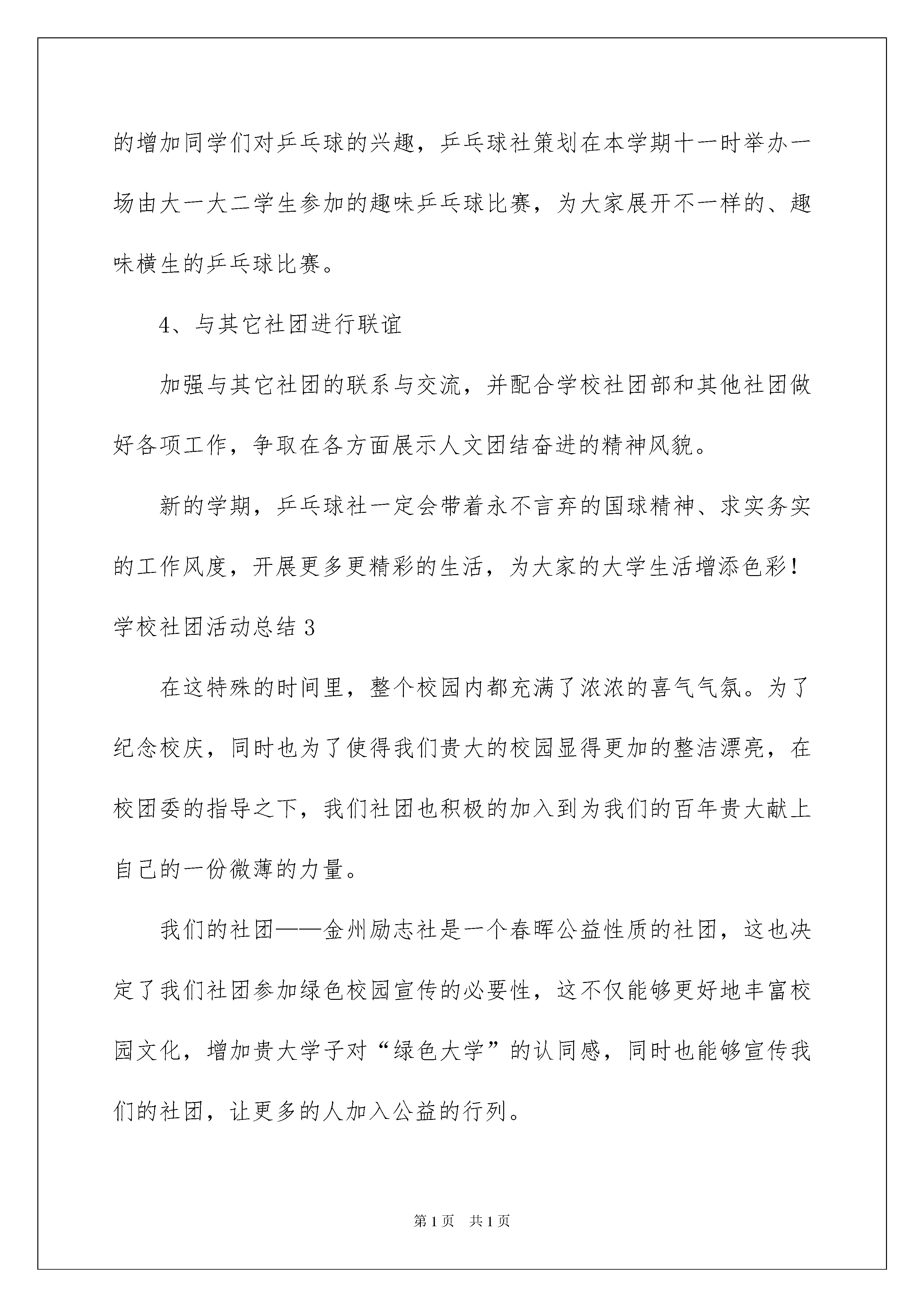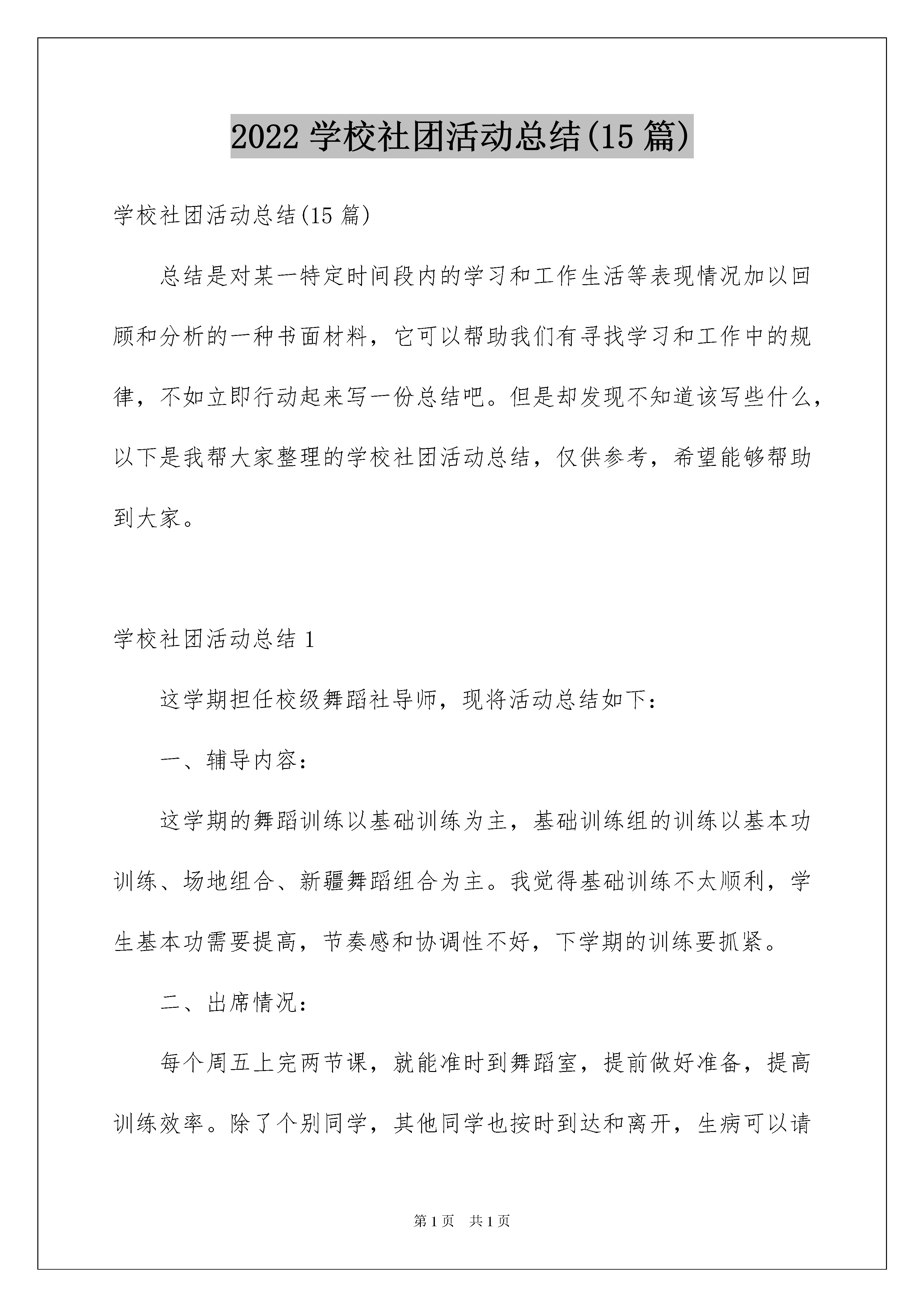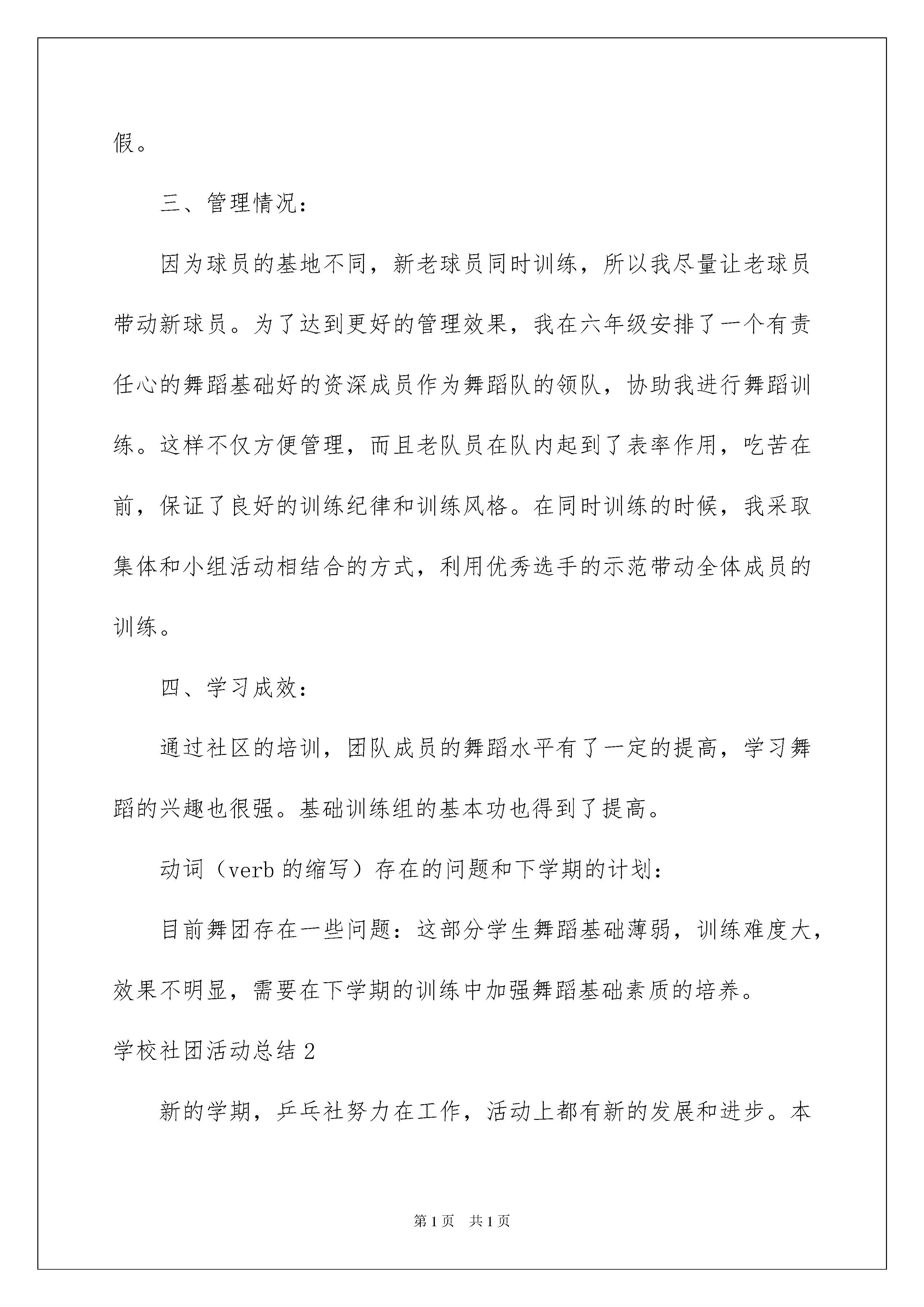 2022学校社团活动总结(15篇)学校社团活动总结(15篇)总结是对某一特定时间段内的学习和工作生活等表现情况加以回顾和分析的一种书面材料,它可以帮助我们有寻找学习和工作中的规律,不如立即行动起来写一份总结吧。但是却发现不知道该写些什么,以下是我帮大家整理的学校社团活动总结,仅供参考,希望能够帮助到大家。学校社团活动总结1这学期担任校级舞蹈社导师,现将活动总结如下:一、辅导内容:这学期的舞蹈训练以基础训练为主,基础训练组的训练以基本功训练、场地组合、新疆舞蹈组合为主。我觉得基础训练不太顺利,学生基本功需要提高,节奏感和协调性不好,下学期的训练要抓紧。二、出席情况:每个周五上完两节课,就能准时到舞蹈室,提前做好准备,提高训练效率。除了个别同学,其他同学也按时到达和离开,生病可以请假。三、管理情况:因为球员的基地不同,新老球员同时训练,所以我尽量让老球员带动新球员。为了达到更好的管理效果,我在六年级安排了一个有责任心的舞蹈基础好的资深成员作为舞蹈队的领队,协助我进行舞蹈训练。这样不仅方便管理,而且老队员在队内起到了表率作用,吃苦在前,保证了良好的训练纪律和训练风格。在同时训练的时候,我采取集体和小组活动相结合的方式,利用优秀选手的示范带动全体成员的训练。四、学习成效:通过社区的培训,团队成员的舞蹈水平有了一定的提高,学习舞蹈的兴趣也很强。基础训练组的基本功也得到了提高。动词(verb的缩写)存在的问题和下学期的计划:目前舞团存在一些问题:这部分学生舞蹈基础薄弱,训练难度大,效果不明显,需要在下学期的训练中加强舞蹈基础素质的培养。学校社团活动总结2新的学期,乒乓社努力在工作,活动上都有新的发展和进步。本学期乒乓社主要围绕着社员的社团活动,以社团纳新,趣味乒乓球比赛为重点,选出优秀的大一新社员,让全系同学对乒乓球这项运动以及系里乒乓社有更好的认识。1、乒乓球社纳新工作首先做好对大一新生的宣传工作,让乒乓球社的社团活动及注意要点有所了解。再从新声中挑选若干优秀的乒乓球爱好者成为社员,并及时召开乒乓球社的社团会议,具体告知本学期的社团活动,以及社员需遵守的章程及各项规章制度。2、社员社团活动平日社团活动上,我们设将继续续承多年来的传统,根据社员人数合理安排,贯彻好每周两次的社内活动。定时召开社团会议,与社团共同交流近段时间乒乓球社的情况以及一些需要改进的地方,详细告知社团将要与办的活动,让社员对社里活动完全了解,积极参与进社团举办的活动中来。制定奖惩制度,对整个学期表现优秀的社员进行奖励,激励所有社员更好的参加社团的活动。3、趣味乒乓球比赛为了丰富同学们课余生活,促进全院乒乓球爱好者的交流,更好的增加同学们对乒乓球的兴趣,乒乓球社策划在本学期十一时举办一场由大一大二学生参加的趣味乒乓球比赛,为大家展开不一样的、趣味横生的乒乓球比赛。4、与其它社团进行联谊加强与其它社团的联系与交流,并配合学校社团部和其他社团做好各项工作,争取在各方面展示人文团结奋进的精神风貌。新的学期,乒乓球社一定会带着永不言弃的国球精神、求实务实的工作风度,开展更多更精彩的生活,为大家的大学生活增添色彩!学校社团活动总结3在这特殊的时间里,整个校园内都充满了浓浓的喜气气氛。为了纪念校庆,同时也为了使得我们贵大的校园显得更加的整洁漂亮,在校团委的指导之下,我们社团也积极的加入到为我们的百年贵大献上自己的一份微薄的力量。我们的社团——金州励志社是一个春晖公益性质的社团,这也决定了我们社团参加绿色校园宣传的必要性,这不仅能够更好地丰富校园文化,增加贵大学子对“绿色大学”的认同感,同时也能够宣传我们的社团,让更多的人加入公益的行列。本次“环保校园宣传”活动举办时间为20xx年11月21日(星期三),这一天距离贵大校庆活动举办的时间已经很近了,在我们社团看来,此次活动质量的高低会影响到我们贵州大学的形象。在活动举办之前,在校团委的指导之下,我们社团做好了充分的准备。在宣传活动准备阶段,社团根据学校实际,展开以下准备工作:1、活动人员安排。社团就宣传活动召开社团会议,确定活动的负责人,活动材料的准备人员以及活动期间的宣传人员,人员的合理安排对于活动的有序开展及其重要。2、制作环保宣传喷绘。环保宣传喷绘的内容是此次活动宣传非常重要的一块,因为一张能够很是吸引的人们眼球的喷绘是宣传成功的一半;只有这样,师生们能够很快的从喷绘中看懂们想要表达的信息,所以在喷绘中宣传的图片和文字都是经过社团人员精挑细选出来的。3、环保工艺品的制作。宣传环保,更重要的是能够变废为宝,因为垃圾都是放错地方的资源,只是看我们是怎么利用的,我们社团觉得通过环