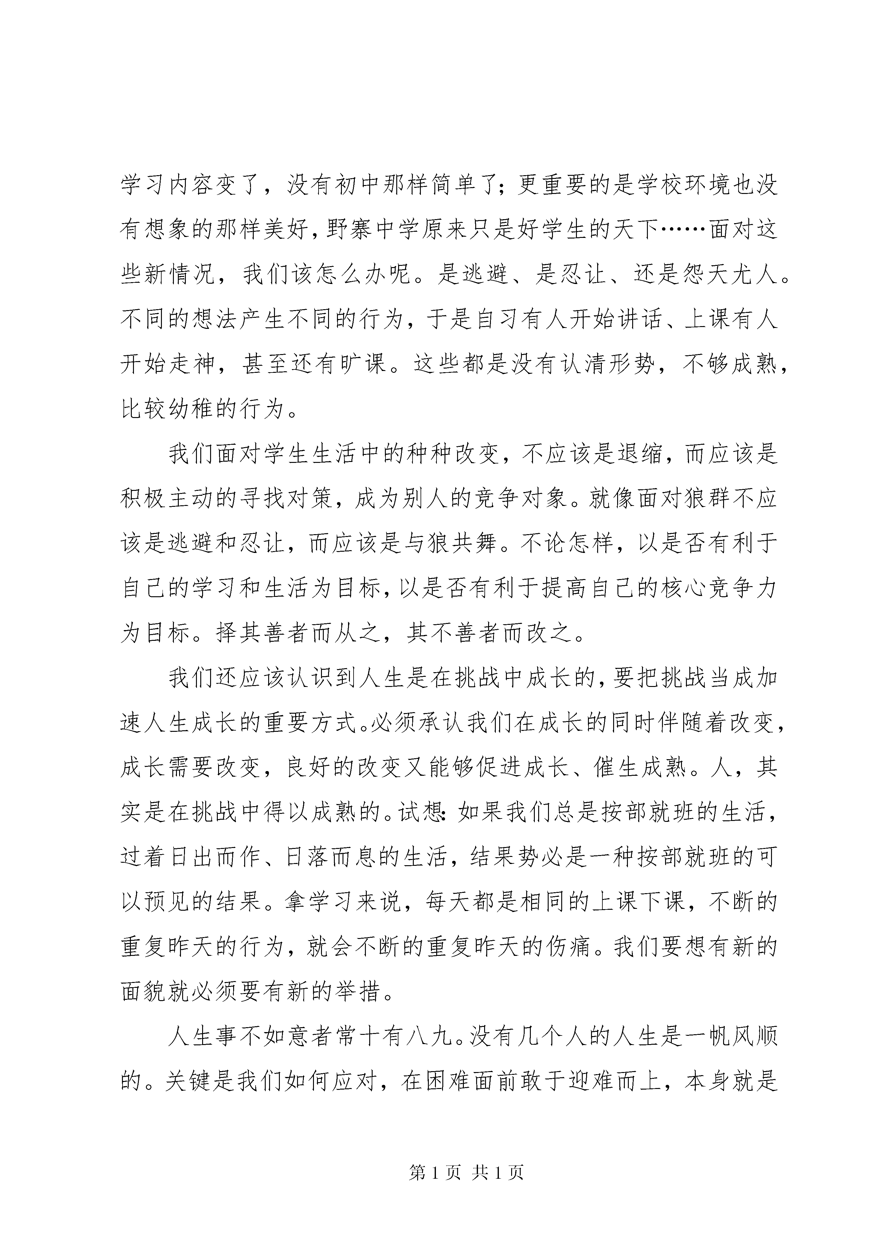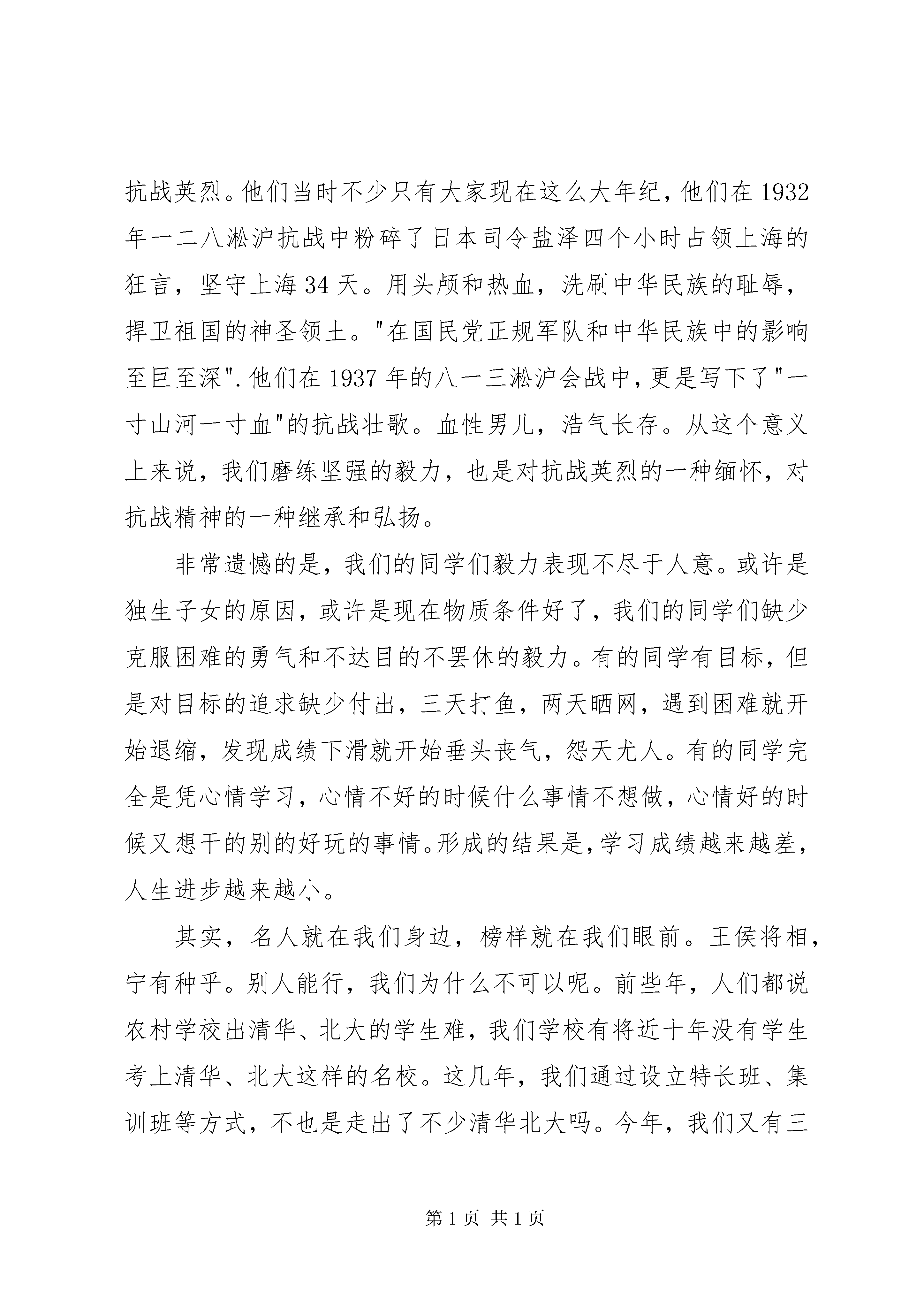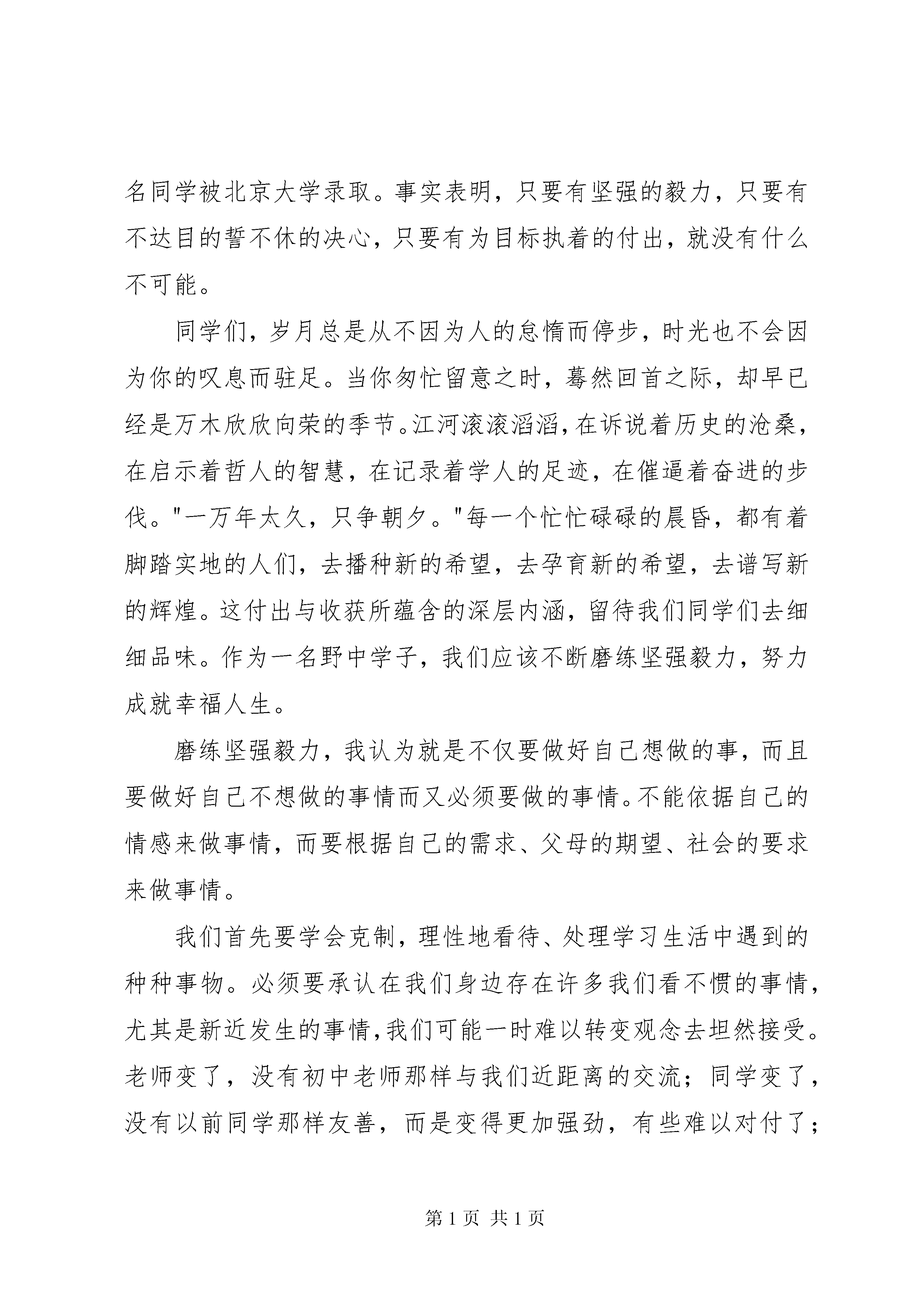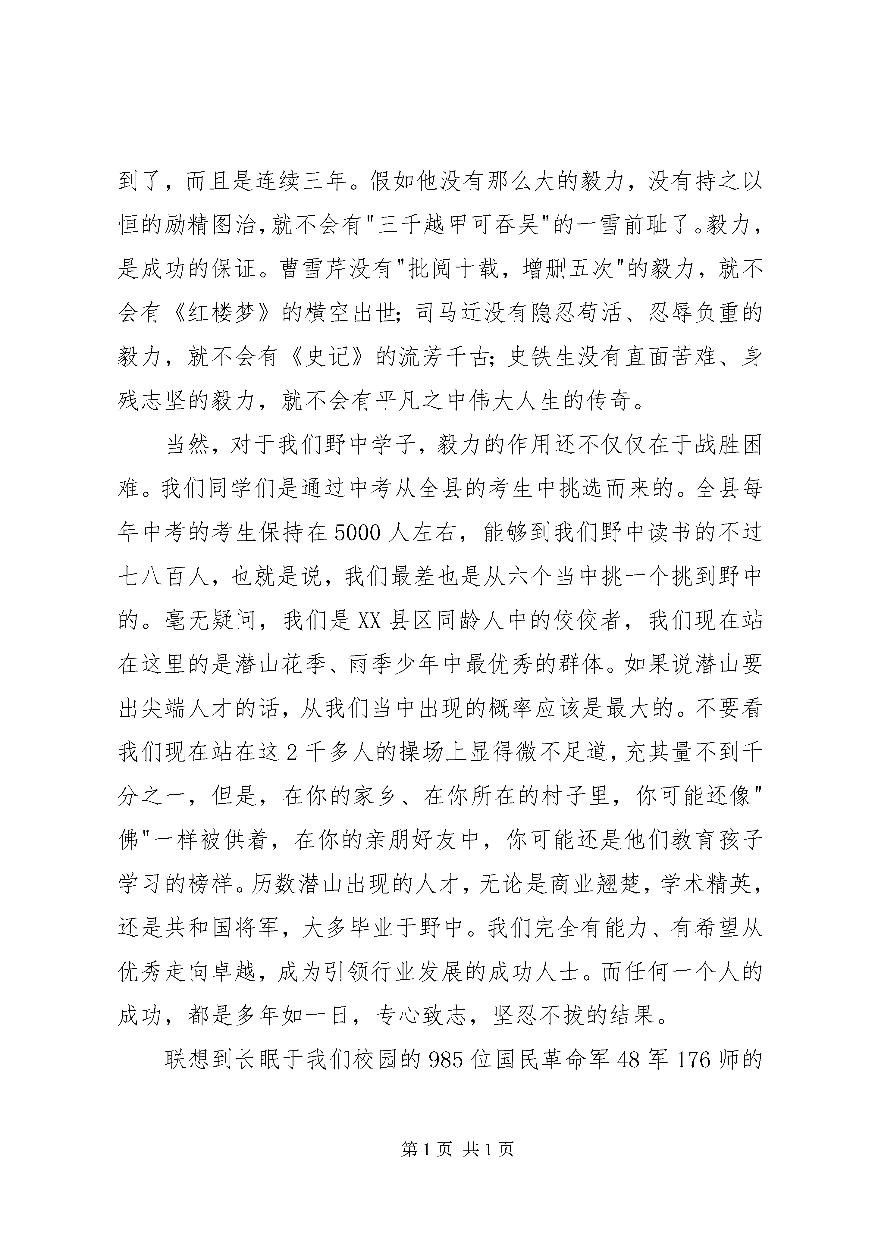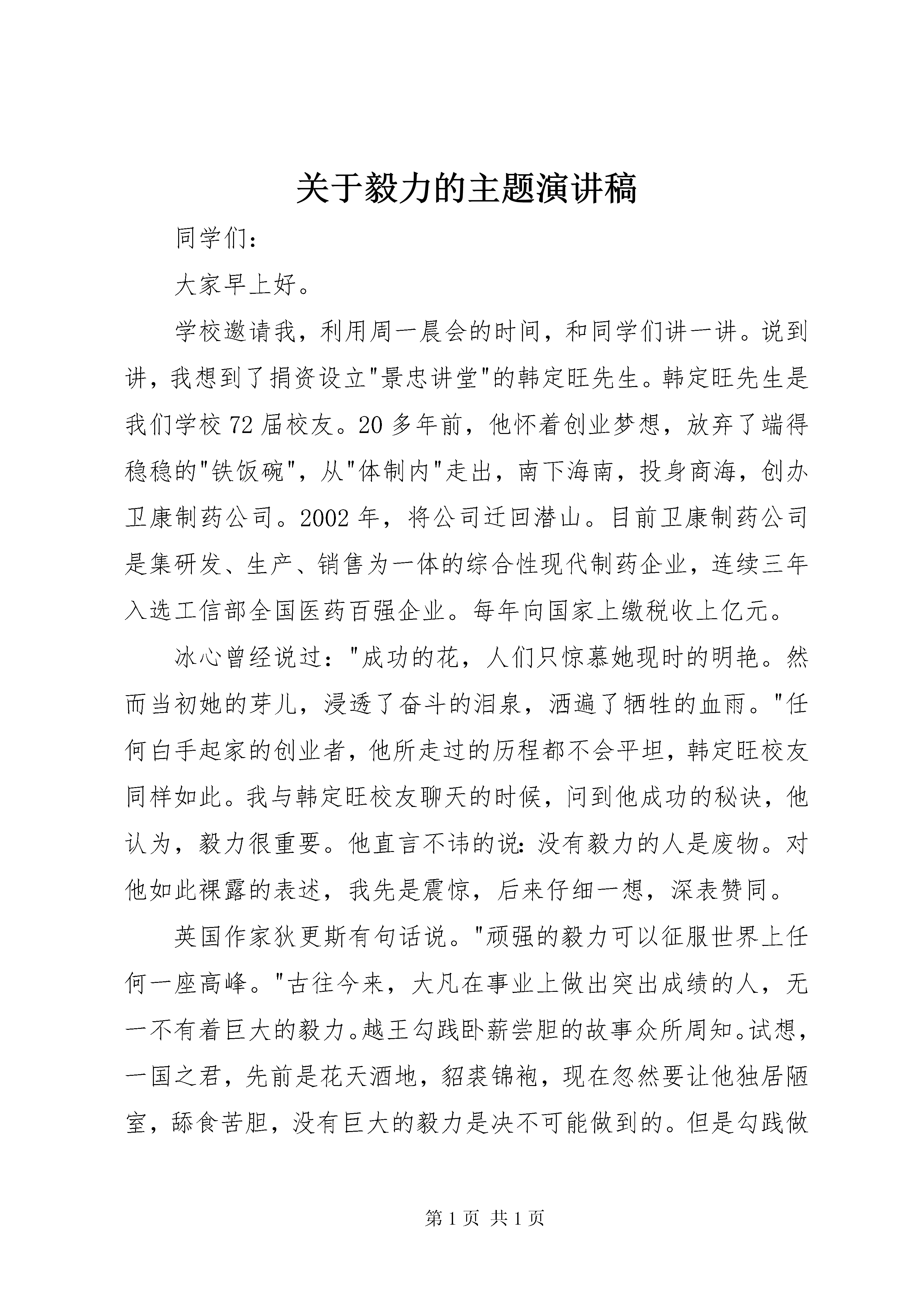 关于毅力的主题演讲稿同学们:大家早上好。学校邀请我,利用周一晨会的时间,和同学们讲一讲。说到讲,我想到了捐资设立"景忠讲堂"的韩定旺先生。韩定旺先生是我们学校72届校友。20多年前,他怀着创业梦想,放弃了端得稳稳的"铁饭碗",从"体制内"走出,南下海南,投身商海,创办卫康制药公司。2002年,将公司迁回潜山。目前卫康制药公司是集研发、生产、销售为一体的综合性现代制药企业,连续三年入选工信部全国医药百强企业。每年向国家上缴税收上亿元。冰心曾经说过:"成功的花,人们只惊慕她现时的明艳。然而当初她的芽儿,浸透了奋斗的泪泉,洒遍了牺牲的血雨。"任何白手起家的创业者,他所走过的历程都不会平坦,韩定旺校友同样如此。我与韩定旺校友聊天的时候,问到他成功的秘诀,他认为,毅力很重要。他直言不讳的说:没有毅力的人是废物。对他如此裸露的表述,我先是震惊,后来仔细一想,深表赞同。英国作家狄更斯有句话说。"顽强的毅力可以征服世界上任何一座高峰。"古往今来,大凡在事业上做出突出成绩的人,无一不有着巨大的毅力。越王勾践卧薪尝胆的故事众所周知。试想,一国之君,先前是花天酒地,貂裘锦袍,现在忽然要让他独居陋室,舔食苦胆,没有巨大的毅力是决不可能做到的。但是勾践做到了,而且是连续三年。假如他没有那么大的毅力,没有持之以恒的励精图治,就不会有"三千越甲可吞吴"的一雪前耻了。毅力,是成功的保证。曹雪芹没有"批阅十载,增删五次"的毅力,就不会有《红楼梦》的横空出世;司马迁没有隐忍苟活、忍辱负重的毅力,就不会有《史记》的流芳千古;史铁生没有直面苦难、身残志坚的毅力,就不会有平凡之中伟大人生的传奇。当然,对于我们野中学子,毅力的作用还不仅仅在于战胜困难。我们同学们是通过中考从全县的考生中挑选而来的。全县每年中考的考生保持在5000人左右,能够到我们野中读书的不过七八百人,也就是说,我们最差也是从六个当中挑一个挑到野中的。毫无疑问,我们是XX县区同龄人中的佼佼者,我们现在站在这里的是潜山花季、雨季少年中最优秀的群体。如果说潜山要出尖端人才的话,从我们当中出现的概率应该是最大的。不要看我们现在站在这2千多人的操场上显得微不足道,充其量不到千分之一,但是,在你的家乡、在你所在的村子里,你可能还像"佛"一样被供着,在你的亲朋好友中,你可能还是他们教育孩子学习的榜样。历数潜山出现的人才,无论是商业翘楚,学术精英,还是共和国将军,大多毕业于野中。我们完全有能力、有希望从优秀走向卓越,成为引领行业发展的成功人士。而任何一个人的成功,都是多年如一日,专心致志,坚忍不拔的结果。联想到长眠于我们校园的985位国民革命军48军176师的抗战英烈。他们当时不少只有大家现在这么大年纪,他们在1932年一二八淞沪抗战中粉碎了日本司令盐泽四个小时占领上海的狂言,坚守上海34天。用头颅和热血,洗刷中华民族的耻辱,捍卫祖国的神圣领土。"在国民党正规军队和中华民族中的影响至巨至深".他们在1937年的八一三淞沪会战中,更是写下了"一寸山河一寸血"的抗战壮歌。血性男儿,浩气长存。从这个意义上来说,我们磨练坚强的毅力,也是对抗战英烈的一种缅怀,对抗战精神的一种继承和弘扬。非常遗憾的是,我们的同学们毅力表现不尽于人意。或许是独生子女的原因,或许是现在物质条件好了,我们的同学们缺少克服困难的勇气和不达目的不罢休的毅力。有的同学有目标,但是对目标的追求缺少付出,三天打鱼,两天晒网,遇到困难就开始退缩,发现成绩下滑就开始垂头丧气,怨天尤人。有的同学完全是凭心情学习,心情不好的时候什么事情不想做,心情好的时候又想干的别的好玩的事情。形成的结果是,学习成绩越来越差,人生进步越来越小。其实,名人就在我们身边,榜样就在我们眼前。王侯将相,宁有种乎。别人能行,我们为什么不可以呢。前些年,人们都说农村学校出清华、北大的学生难,我们学校有将近十年没有学生考上清华、北大这样的名校。这几年,我们通过设立特长班、集训班等方式,不也是走出了不少清华北大吗。今年,我们又有三名同学被北京大学录取。事实表明,只要有坚强的毅力,只要有不达目的誓不休的决心,只要有为目标执着的付出,就没有什么不可能。同学们,岁月总是从不因为人的怠惰而停步,时光也不会因为你的叹息而驻足。当你匆忙留意之时,蓦然回首之际,却早已经是万木欣欣向荣的季节。江河滚滚滔滔,在诉说着历史的沧桑,在启示着哲人的智慧,在记录着学人的足迹,在催逼着奋进的步伐。"一万年太久,只争朝夕。"每一个忙忙碌碌的晨昏,都有着脚踏实地的人们,去播种新的希望,去孕育新的希望,去谱写新的辉煌。这付出与收获所蕴含的深层内涵,留待我们同学们去细细品味。作为一名野中学子,我们应该不断磨练坚强毅力,努力成就幸福人生。磨练坚强毅力,我认为就是不仅要做好自己想做的事,而且要做好自己不想做的事情