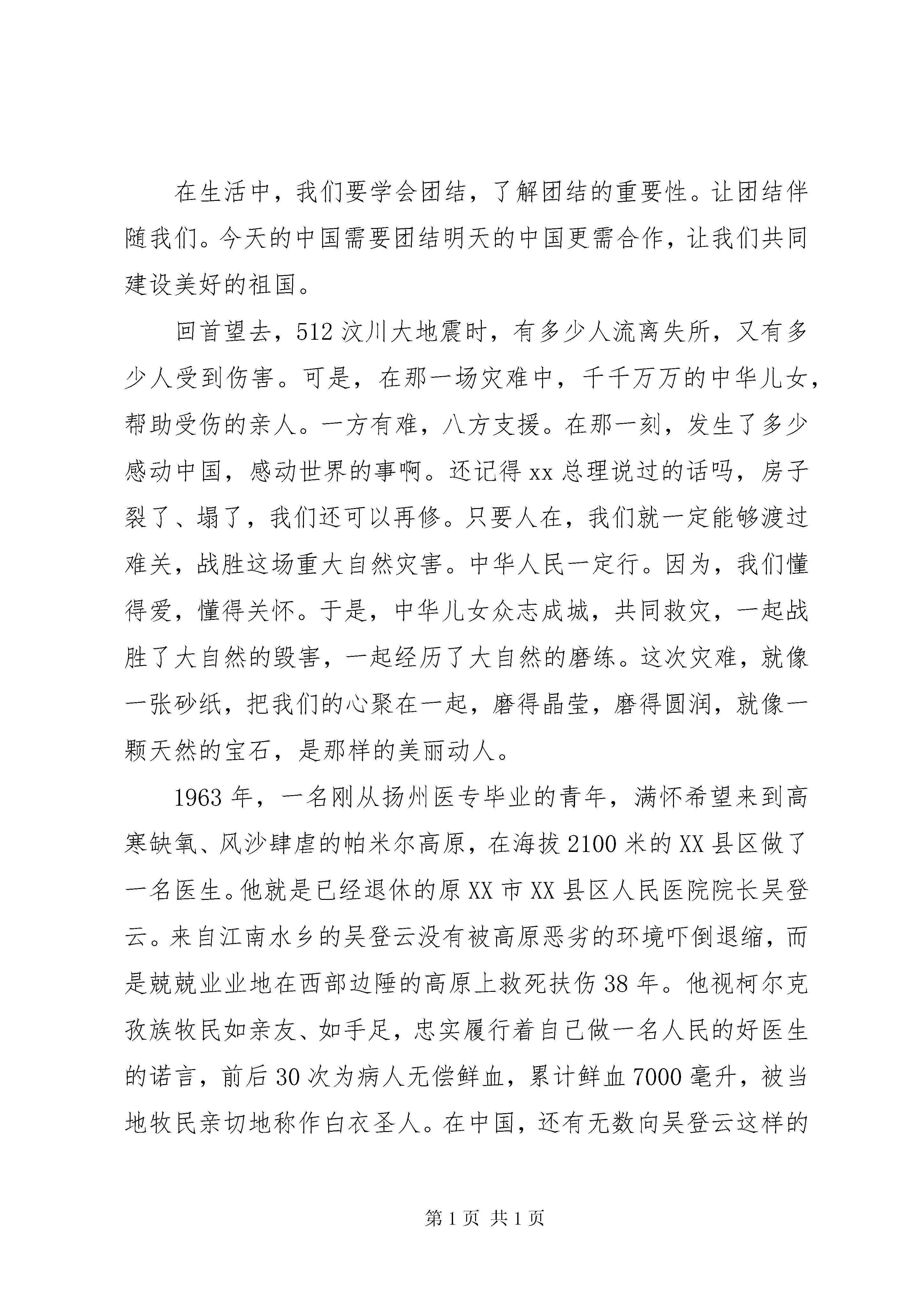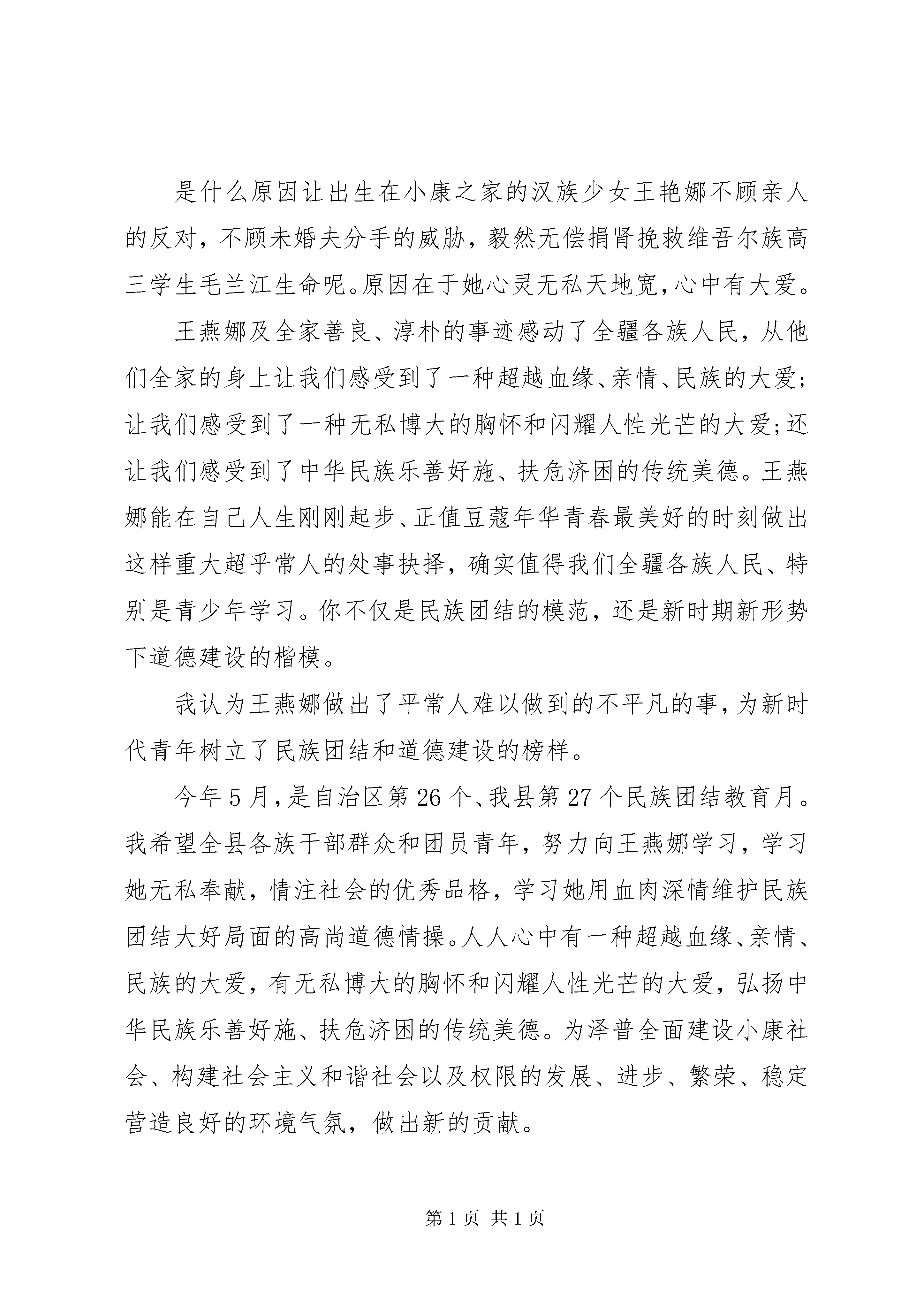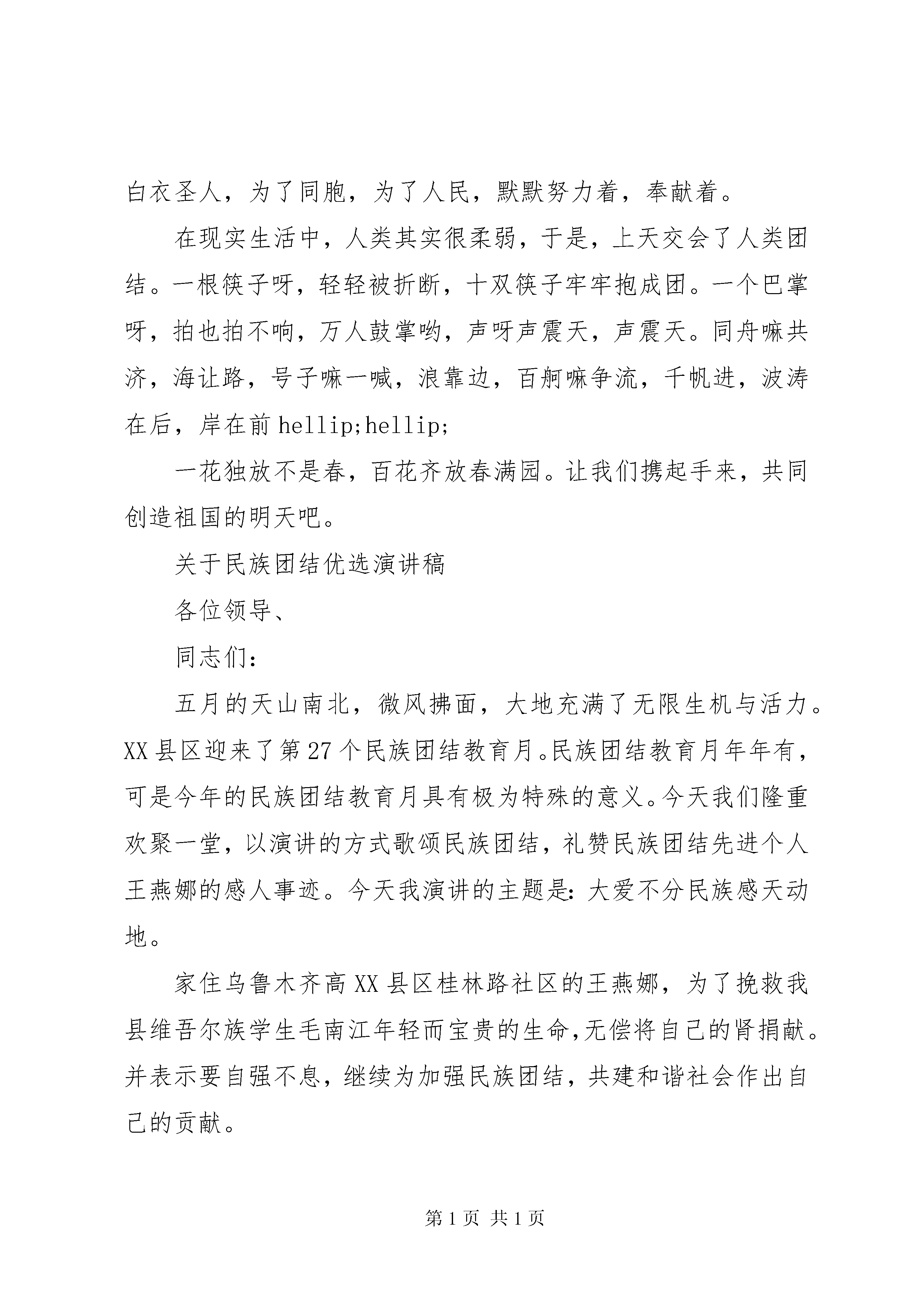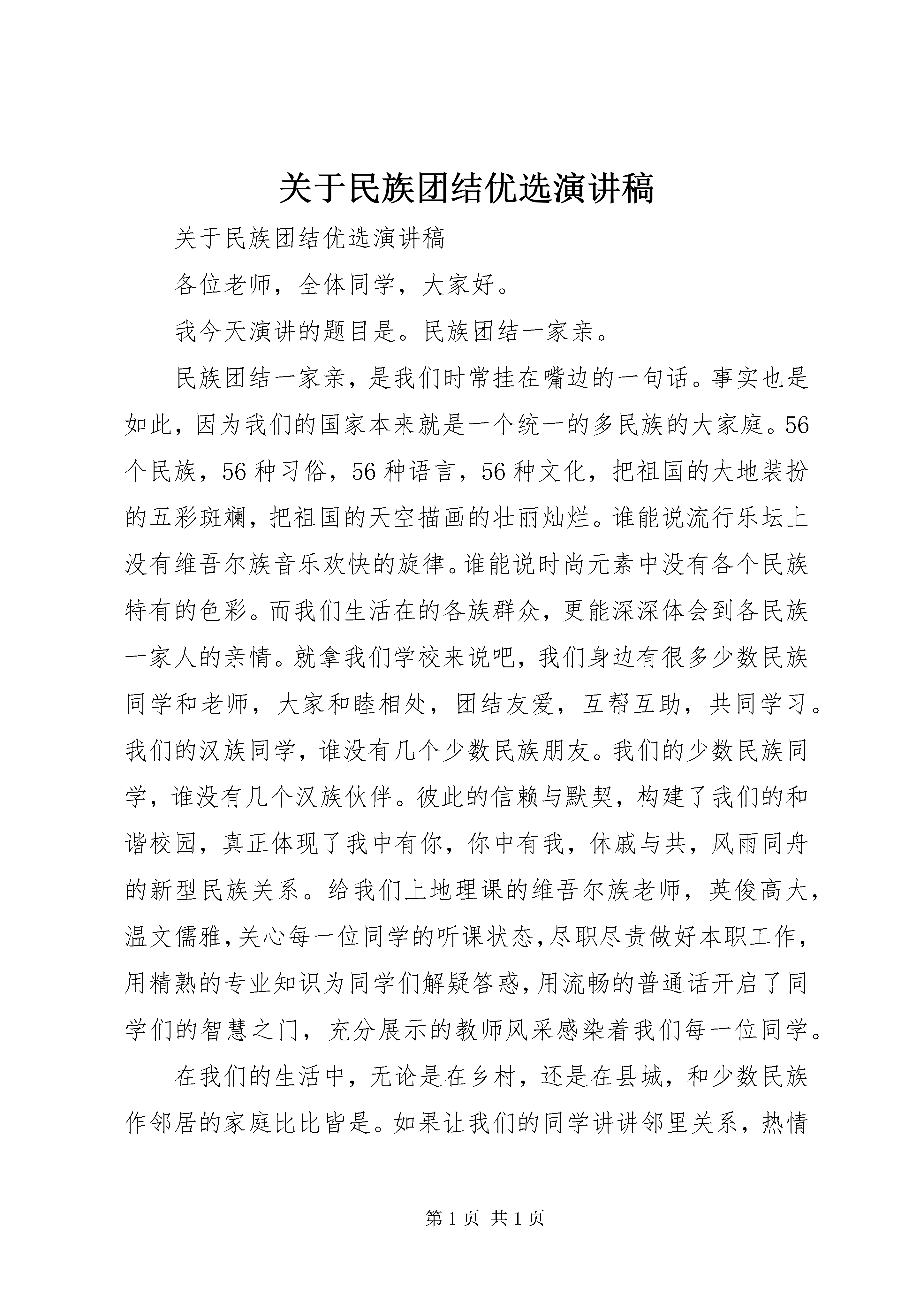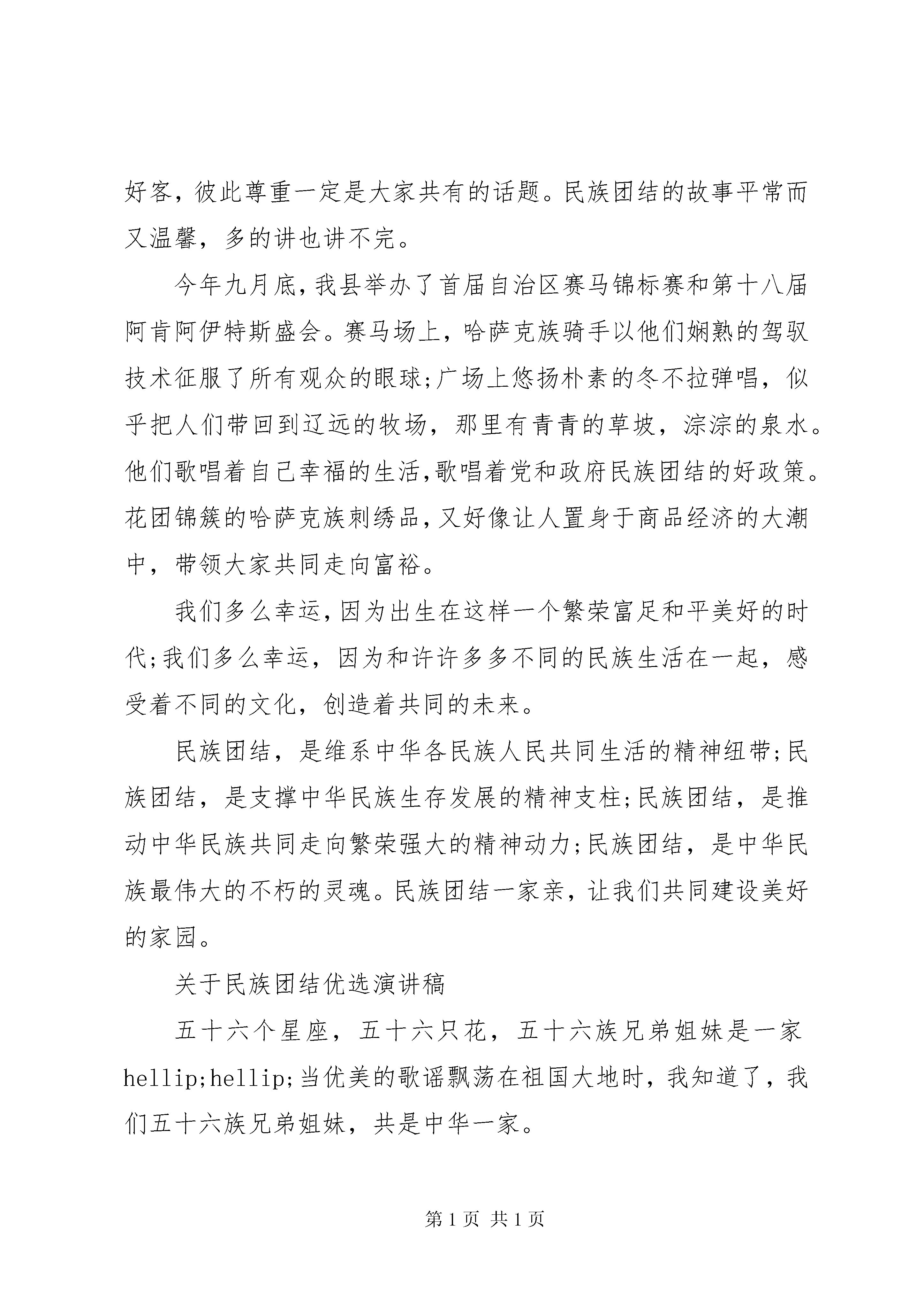 关于民族团结优选演讲稿关于民族团结优选演讲稿各位老师,全体同学,大家好。我今天演讲的题目是。民族团结一家亲。民族团结一家亲,是我们时常挂在嘴边的一句话。事实也是如此,因为我们的国家本来就是一个统一的多民族的大家庭。56个民族,56种习俗,56种语言,56种文化,把祖国的大地装扮的五彩斑斓,把祖国的天空描画的壮丽灿烂。谁能说流行乐坛上没有维吾尔族音乐欢快的旋律。谁能说时尚元素中没有各个民族特有的色彩。而我们生活在的各族群众,更能深深体会到各民族一家人的亲情。就拿我们学校来说吧,我们身边有很多少数民族同学和老师,大家和睦相处,团结友爱,互帮互助,共同学习。我们的汉族同学,谁没有几个少数民族朋友。我们的少数民族同学,谁没有几个汉族伙伴。彼此的信赖与默契,构建了我们的和谐校园,真正体现了我中有你,你中有我,休戚与共,风雨同舟的新型民族关系。给我们上地理课的维吾尔族老师,英俊高大,温文儒雅,关心每一位同学的听课状态,尽职尽责做好本职工作,用精熟的专业知识为同学们解疑答惑,用流畅的普通话开启了同学们的智慧之门,充分展示的教师风采感染着我们每一位同学。在我们的生活中,无论是在乡村,还是在县城,和少数民族作邻居的家庭比比皆是。如果让我们的同学讲讲邻里关系,热情好客,彼此尊重一定是大家共有的话题。民族团结的故事平常而又温馨,多的讲也讲不完。今年九月底,我县举办了首届自治区赛马锦标赛和第十八届阿肯阿伊特斯盛会。赛马场上,哈萨克族骑手以他们娴熟的驾驭技术征服了所有观众的眼球;广场上悠扬朴素的冬不拉弹唱,似乎把人们带回到辽远的牧场,那里有青青的草坡,淙淙的泉水。他们歌唱着自己幸福的生活,歌唱着党和政府民族团结的好政策。花团锦簇的哈萨克族刺绣品,又好像让人置身于商品经济的大潮中,带领大家共同走向富裕。我们多么幸运,因为出生在这样一个繁荣富足和平美好的时代;我们多么幸运,因为和许许多多不同的民族生活在一起,感受着不同的文化,创造着共同的未来。民族团结,是维系中华各民族人民共同生活的精神纽带;民族团结,是支撑中华民族生存发展的精神支柱;民族团结,是推动中华民族共同走向繁荣强大的精神动力;民族团结,是中华民族最伟大的不朽的灵魂。民族团结一家亲,让我们共同建设美好的家园。关于民族团结优选演讲稿五十六个星座,五十六只花,五十六族兄弟姐妹是一家hellip;hellip;当优美的歌谣飘荡在祖国大地时,我知道了,我们五十六族兄弟姐妹,共是中华一家。在生活中,我们要学会团结,了解团结的重要性。让团结伴随我们。今天的中国需要团结明天的中国更需合作,让我们共同建设美好的祖国。回首望去,512汶川大地震时,有多少人流离失所,又有多少人受到伤害。可是,在那一场灾难中,千千万万的中华儿女,帮助受伤的亲人。一方有难,八方支援。在那一刻,发生了多少感动中国,感动世界的事啊。还记得xx总理说过的话吗,房子裂了、塌了,我们还可以再修。只要人在,我们就一定能够渡过难关,战胜这场重大自然灾害。中华人民一定行。因为,我们懂得爱,懂得关怀。于是,中华儿女众志成城,共同救灾,一起战胜了大自然的毁害,一起经历了大自然的磨练。这次灾难,就像一张砂纸,把我们的心聚在一起,磨得晶莹,磨得圆润,就像一颗天然的宝石,是那样的美丽动人。1963年,一名刚从扬州医专毕业的青年,满怀希望来到高寒缺氧、风沙肆虐的帕米尔高原,在海拔2100米的XX县区做了一名医生。他就是已经退休的原XX市XX县区人民医院院长吴登云。来自江南水乡的吴登云没有被高原恶劣的环境吓倒退缩,而是兢兢业业地在西部边陲的高原上救死扶伤38年。他视柯尔克孜族牧民如亲友、如手足,忠实履行着自己做一名人民的好医生的诺言,前后30次为病人无偿鲜血,累计鲜血7000毫升,被当地牧民亲切地称作白衣圣人。在中国,还有无数向吴登云这样的白衣圣人,为了同胞,为了人民,默默努力着,奉献着。在现实生活中,人类其实很柔弱,于是,上天交会了人类团结。一根筷子呀,轻轻被折断,十双筷子牢牢抱成团。一个巴掌呀,拍也拍不响,万人鼓掌哟,声呀声震天,声震天。同舟嘛共济,海让路,号子嘛一喊,浪靠边,百舸嘛争流,千帆进,波涛在后,岸在前hellip;hellip;一花独放不是春,百花齐放春满园。让我们携起手来,共同创造祖国的明天吧。关于民族团结优选演讲稿各位领导、同志们:五月的天山南北,微风拂面,大地充满了无限生机与活力。XX县区迎来了第27个民族团结教育月。民族团结教育月年年有,可是今年的民族团结教育月具有极为特殊的意义。今天我们隆重欢聚一堂,以演讲的方式歌颂民族团结,礼赞民族团结先进个人王燕娜的感人事迹。今天我演讲的主题是:大爱不分民族感天动地。家住乌鲁木齐高XX县区桂林路社区的王燕娜,为了挽救我县维吾尔族学生毛南江年轻而宝贵的生命,无偿将自己的肾捐献。并