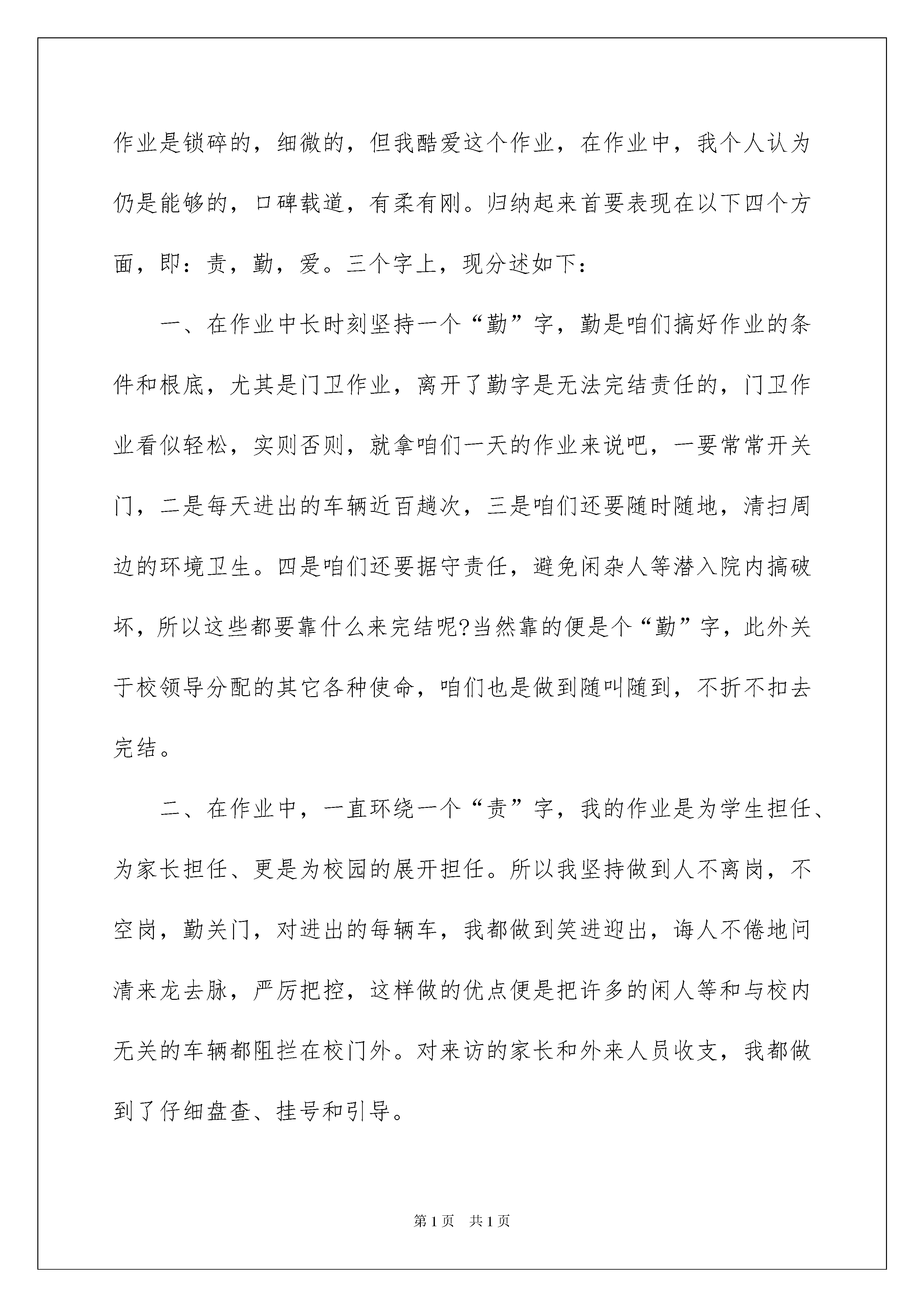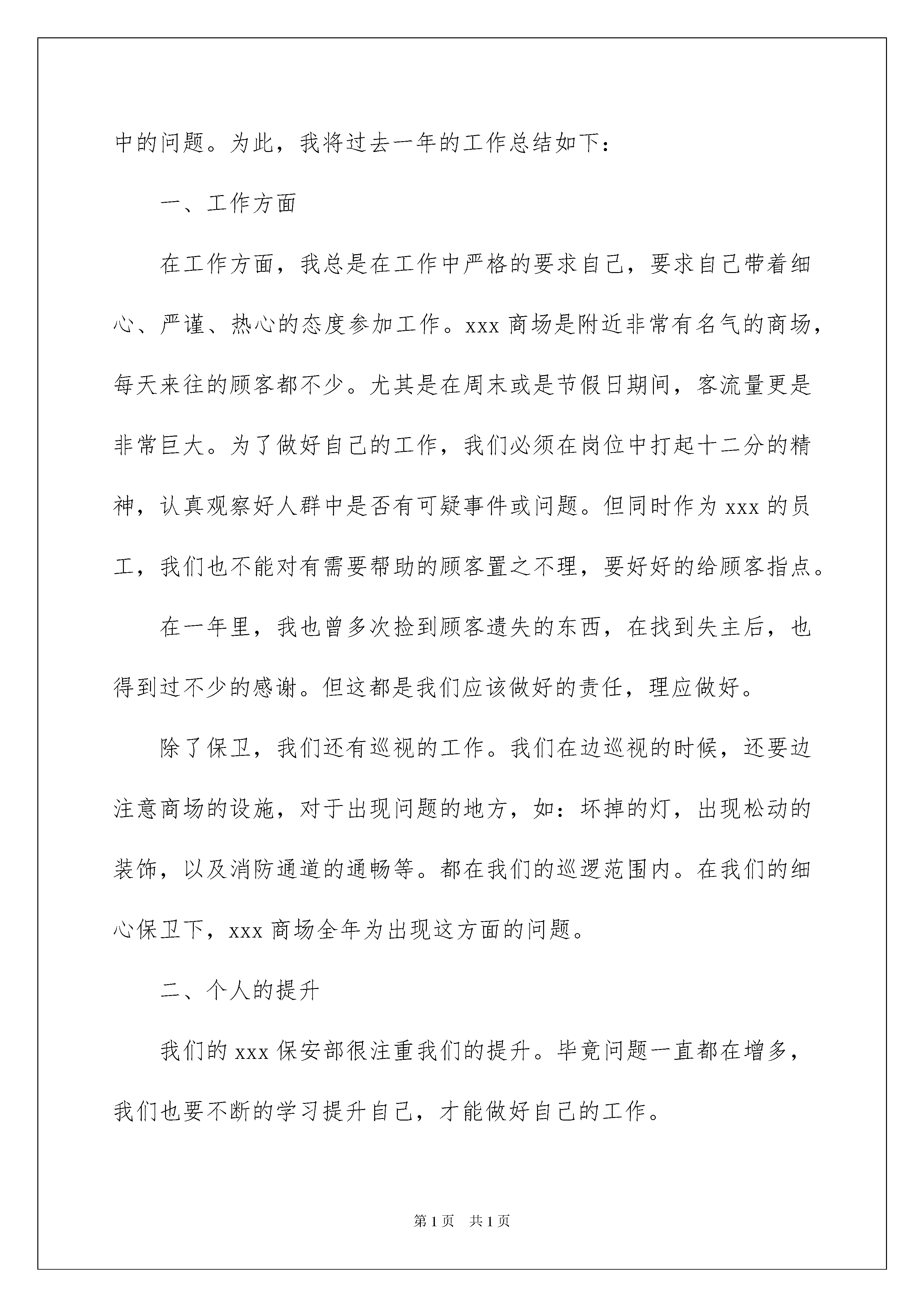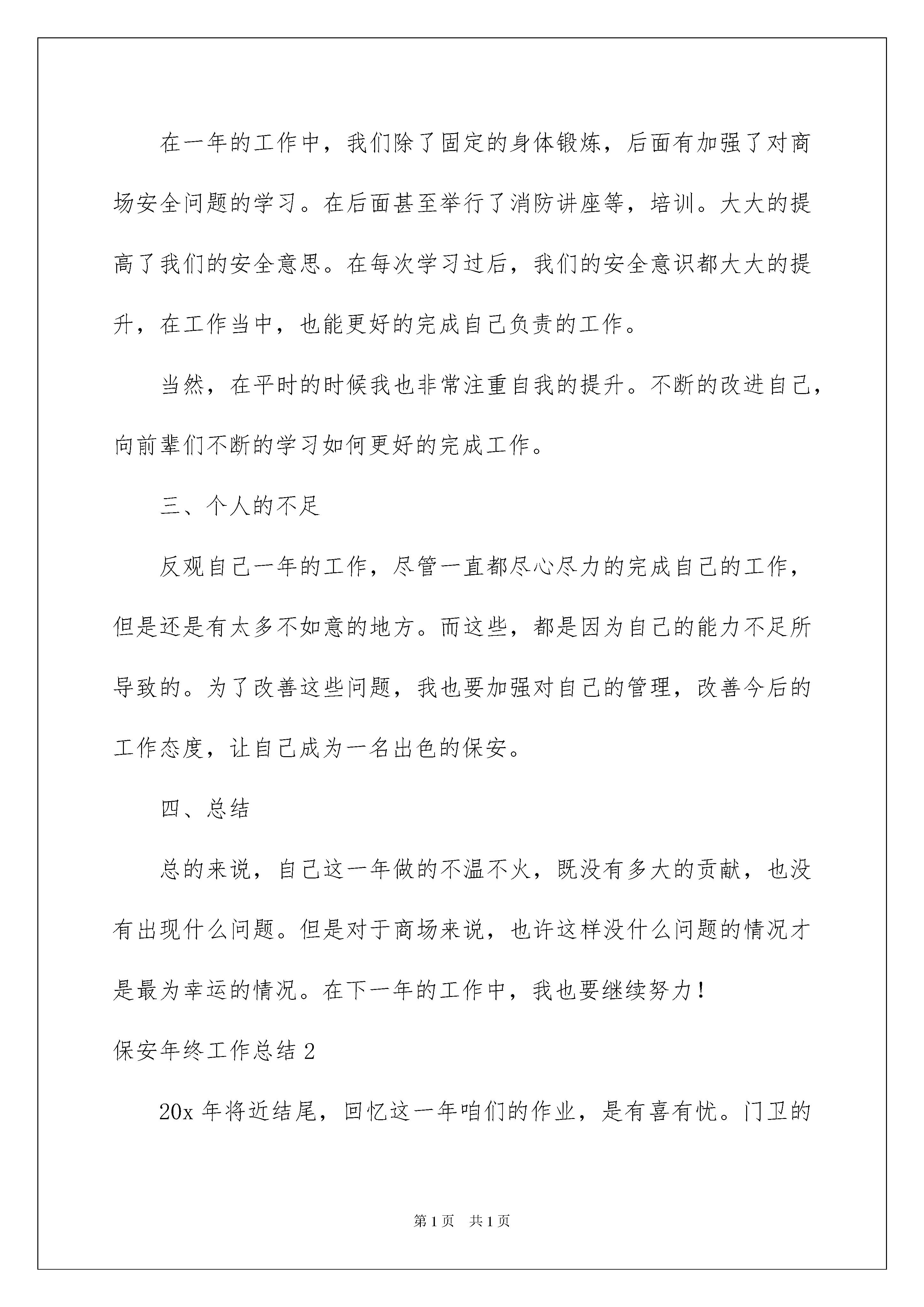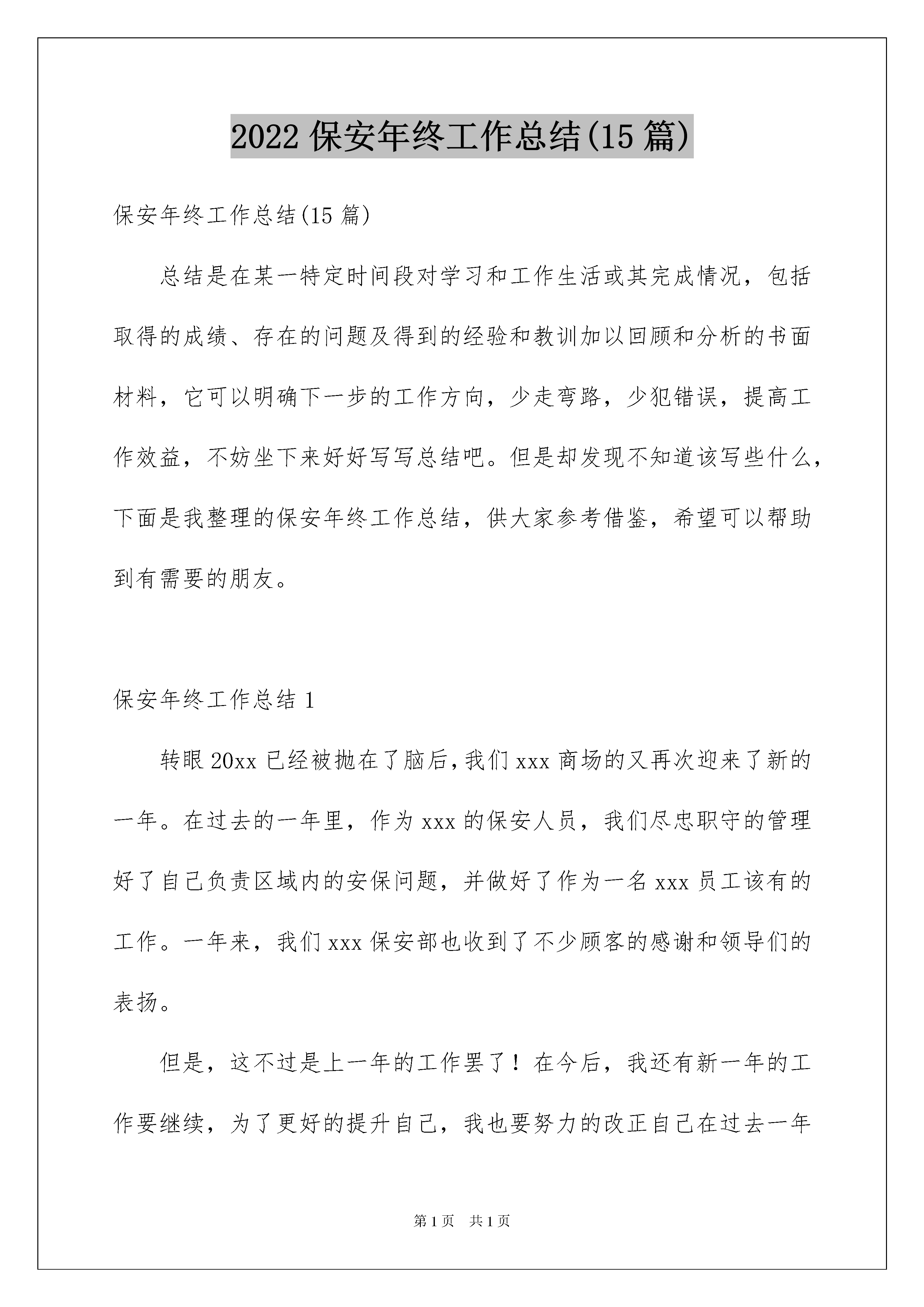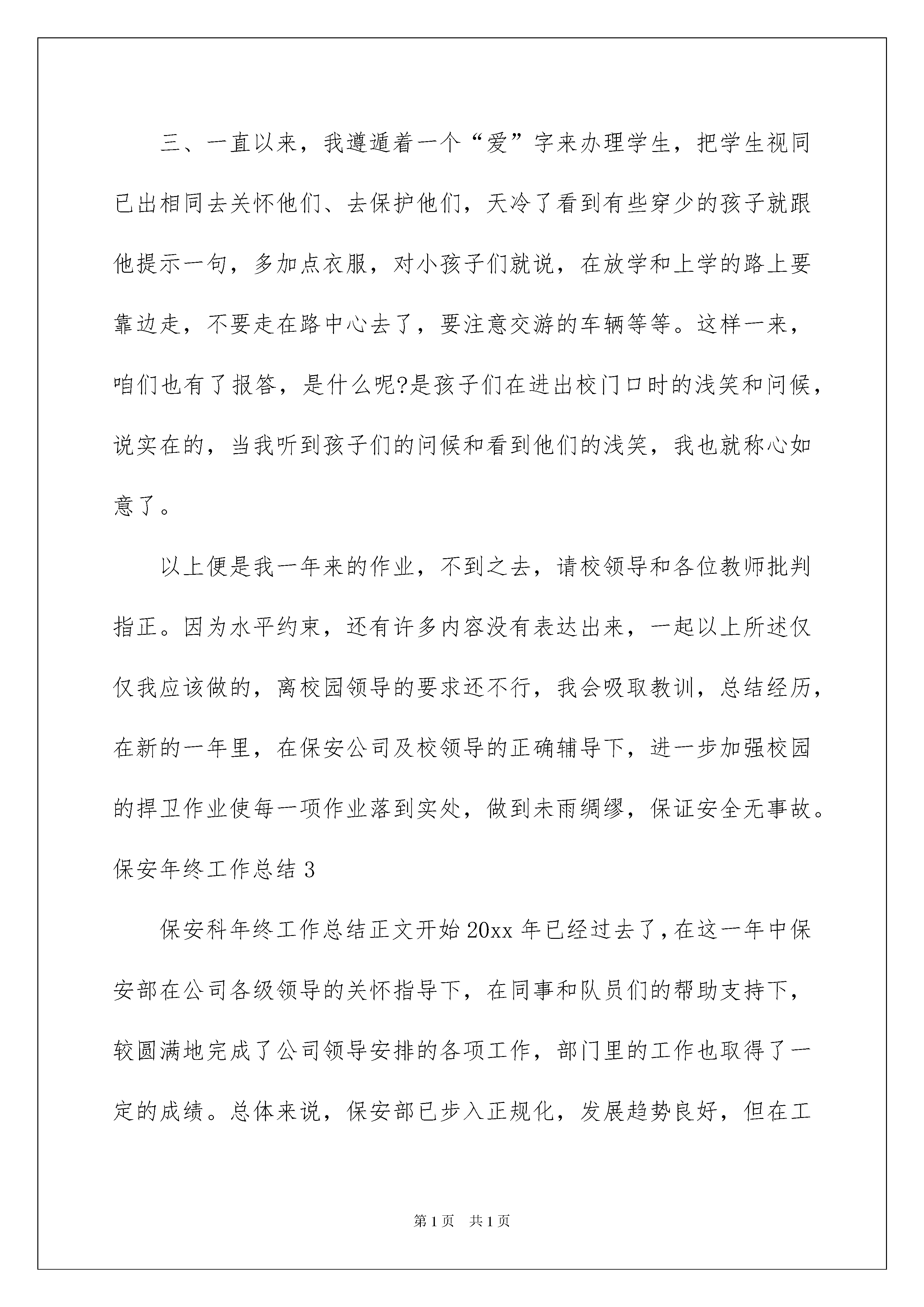 2022保安年终工作总结(15篇)保安年终工作总结(15篇)总结是在某一特定时间段对学习和工作生活或其完成情况,包括取得的成绩、存在的问题及得到的经验和教训加以回顾和分析的书面材料,它可以明确下一步的工作方向,少走弯路,少犯错误,提高工作效益,不妨坐下来好好写写总结吧。但是却发现不知道该写些什么,下面是我整理的保安年终工作总结,供大家参考借鉴,希望可以帮助到有需要的朋友。保安年终工作总结1转眼20xx已经被抛在了脑后,我们xxx商场的又再次迎来了新的一年。在过去的一年里,作为xxx的保安人员,我们尽忠职守的管理好了自己负责区域内的安保问题,并做好了作为一名xxx员工该有的工作。一年来,我们xxx保安部也收到了不少顾客的感谢和领导们的表扬。但是,这不过是上一年的工作罢了!在今后,我还有新一年的工作要继续,为了更好的提升自己,我也要努力的改正自己在过去一年中的问题。为此,我将过去一年的工作总结如下:一、工作方面在工作方面,我总是在工作中严格的要求自己,要求自己带着细心、严谨、热心的态度参加工作。xxx商场是附近非常有名气的商场,每天来往的顾客都不少。尤其是在周末或是节假日期间,客流量更是非常巨大。为了做好自己的工作,我们必须在岗位中打起十二分的精神,认真观察好人群中是否有可疑事件或问题。但同时作为xxx的员工,我们也不能对有需要帮助的顾客置之不理,要好好的给顾客指点。在一年里,我也曾多次捡到顾客遗失的东西,在找到失主后,也得到过不少的感谢。但这都是我们应该做好的责任,理应做好。除了保卫,我们还有巡视的工作。我们在边巡视的时候,还要边注意商场的设施,对于出现问题的地方,如:坏掉的灯,出现松动的装饰,以及消防通道的通畅等。都在我们的巡逻范围内。在我们的细心保卫下,xxx商场全年为出现这方面的问题。二、个人的提升我们的xxx保安部很注重我们的提升。毕竟问题一直都在增多,我们也要不断的学习提升自己,才能做好自己的工作。在一年的工作中,我们除了固定的身体锻炼,后面有加强了对商场安全问题的学习。在后面甚至举行了消防讲座等,培训。大大的提高了我们的安全意思。在每次学习过后,我们的安全意识都大大的提升,在工作当中,也能更好的完成自己负责的工作。当然,在平时的时候我也非常注重自我的提升。不断的改进自己,向前辈们不断的学习如何更好的完成工作。三、个人的不足反观自己一年的工作,尽管一直都尽心尽力的完成自己的工作,但是还是有太多不如意的地方。而这些,都是因为自己的能力不足所导致的。为了改善这些问题,我也要加强对自己的管理,改善今后的工作态度,让自己成为一名出色的保安。四、总结总的来说,自己这一年做的不温不火,既没有多大的贡献,也没有出现什么问题。但是对于商场来说,也许这样没什么问题的情况才是最为幸运的情况。在下一年的工作中,我也要继续努力!保安年终工作总结220x年将近结尾,回忆这一年咱们的作业,是有喜有忧。门卫的作业是锁碎的,细微的,但我酷爱这个作业,在作业中,我个人认为仍是能够的,口碑载道,有柔有刚。归纳起来首要表现在以下四个方面,即:责,勤,爱。三个字上,现分述如下:一、在作业中长时刻坚持一个“勤”字,勤是咱们搞好作业的条件和根底,尤其是门卫作业,离开了勤字是无法完结责任的,门卫作业看似轻松,实则否则,就拿咱们一天的作业来说吧,一要常常开关门,二是每天进出的车辆近百趟次,三是咱们还要随时随地,清扫周边的环境卫生。四是咱们还要据守责任,避免闲杂人等潜入院内搞破坏,所以这些都要靠什么来完结呢?当然靠的便是个“勤”字,此外关于校领导分配的其它各种使命,咱们也是做到随叫随到,不折不扣去完结。二、在作业中,一直环绕一个“责”字,我的作业是为学生担任、为家长担任、更是为校园的展开担任。所以我坚持做到人不离岗,不空岗,勤关门,对进出的每辆车,我都做到笑进迎出,诲人不倦地问清来龙去脉,严厉把控,这样做的优点便是把许多的闲人等和与校内无关的车辆都阻拦在校门外。对来访的家长和外来人员收支,我都做到了仔细盘查、挂号和引导。三、一直以来,我遵遁着一个“爱”字来办理学生,把学生视同已出相同去关怀他们、去保护他们,天冷了看到有些穿少的孩子就跟他提示一句,多加点衣服,对小孩子们就说,在放学和上学的路上要靠边走,不要走在路中心去了,要注意交游的车辆等等。这样一来,咱们也有了报答,是什么呢?是孩子们在进出校门口时的浅笑和问候,说实在的,当我听到孩子们的问候和看到他们的浅笑,我也就称心如意了。以上便是我一年来的作业,不到之去,请校领导和各位教师批判指正。因为水平约束,还有许多内容没有表达出来,一起以上所述仅仅我应该做的,离校园领