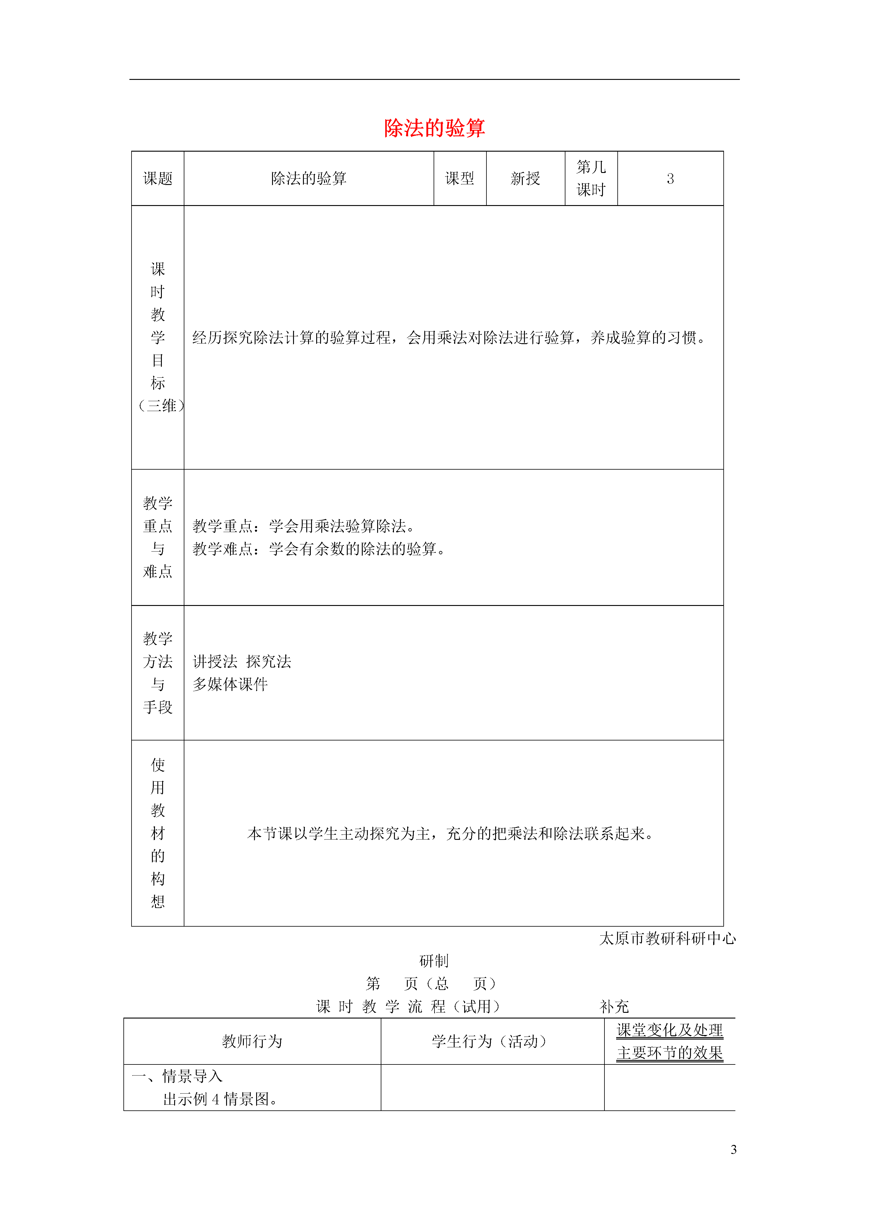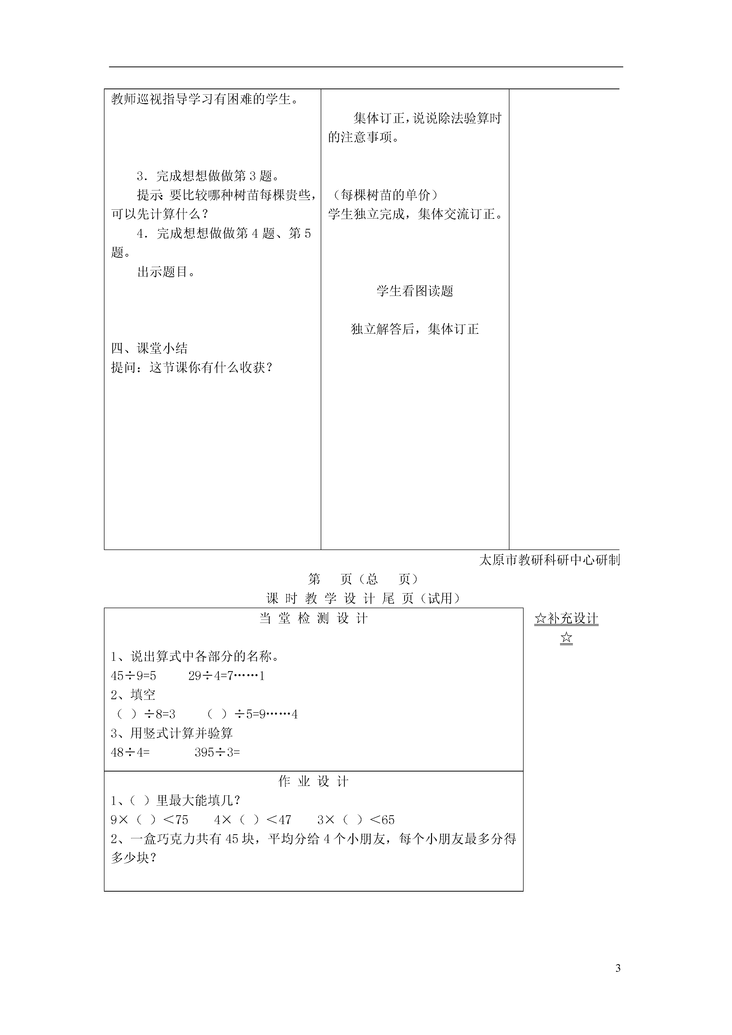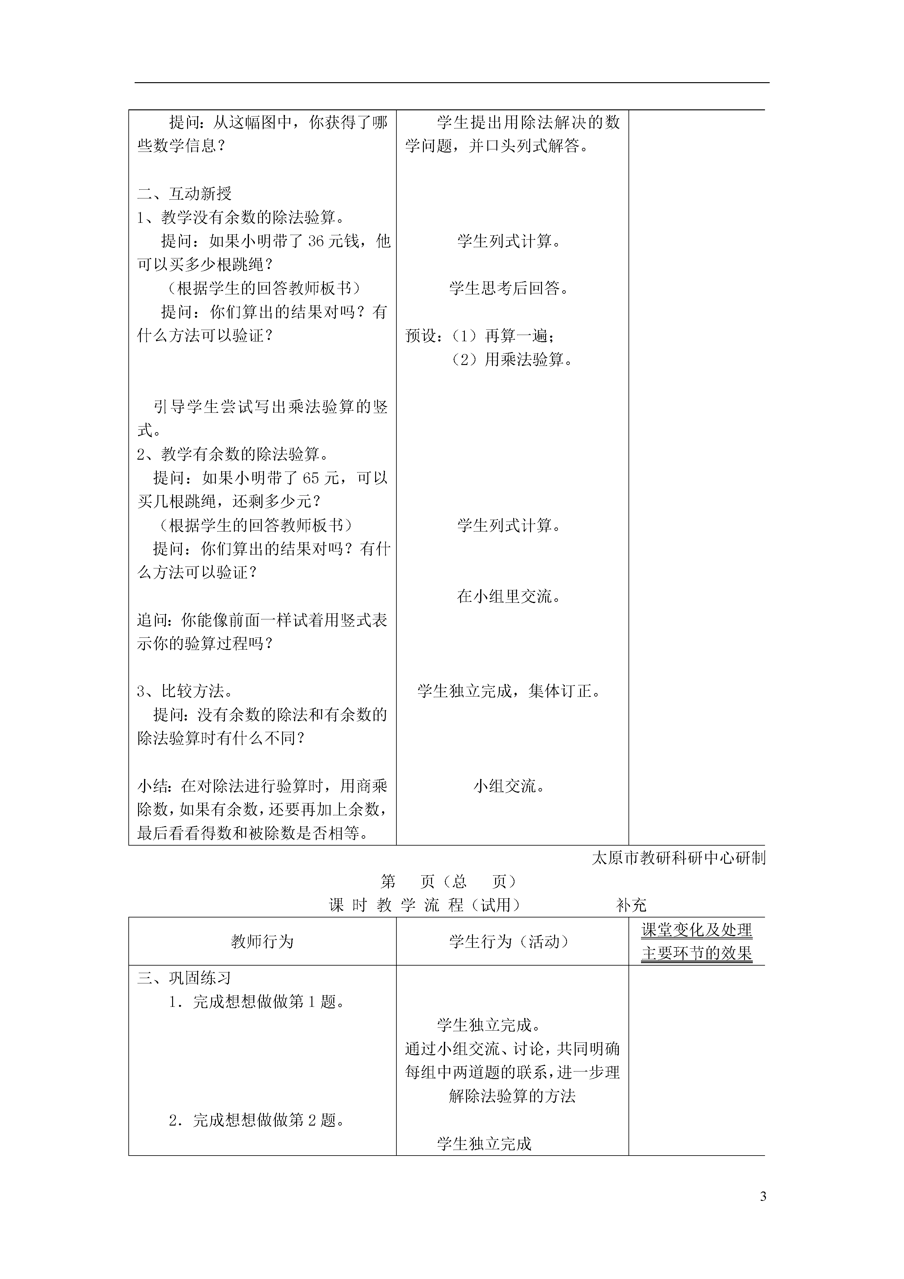 3除法的验算课题除法的验算课型新授第几课时3课时教学目标(三维)经历探究除法计算的验算过程,会用乘法对除法进行验算,养成验算的习惯。教学重点与难点教学重点:学会用乘法验算除法。教学难点:学会有余数的除法的验算。教学方法与手段讲授法探究法多媒体课件使用教材的构想本节课以学生主动探究为主,充分的把乘法和除法联系起来。太原市教研科研中心研制第页(总页)课时教学流程(试用)补充教师行为学生行为(活动)课堂变化及处理主要环节的效果一、情景导入出示例4情景图。提问:从这幅图中,你获得了哪些数学信息?二、互动新授1、教学没有余数的除法验算。提问:如果小明带了36元钱,他可以买多少根跳绳?(根据学生的回答教师板书)提问:你们算出的结果对吗?有什么方法可以验证?引导学生尝试写出乘法验算的竖式。2、教学有余数的除法验算。提问:如果小明带了65元,可以买几根跳绳,还剩多少元?(根据学生的回答教师板书)提问:你们算出的结果对吗?有什么方法可以验证?追问:你能像前面一样试着用竖式表示你的验算过程吗?3、比较方法。提问:没有余数的除法和有余数的除法验算时有什么不同?小结:在对除法进行验算时,用商乘除数,如果有余数,还要再加上余数,最后看看得数和被除数是否相等。学生提出用除法解决的数学问题,并口头列式解答。学生列式计算。学生思考后回答。预设:(1)再算一遍;(2)用乘法验算。学生列式计算。在小组里交流。学生独立完成,集体订正。小组交流。太原市教研科研中心研制第页(总页)课时教学流程(试用)补充教师行为学生行为(活动)课堂变化及处理主要环节的效果三、巩固练习1.完成想想做做第1题。2.完成想想做做第2题。教师巡视指导学习有困难的学生。3.完成想想做做第3题。提示:要比较哪种树苗每棵贵些,可以先计算什么?4.完成想想做做第4题、第5题。出示题目。四、课堂小结提问:这节课你有什么收获?学生独立完成。通过小组交流、讨论,共同明确每组中两道题的联系,进一步理解除法验算的方法学生独立完成集体订正,说说除法验算时的注意事项。(每棵树苗的单价)学生独立完成,集体交流订正。学生看图读题独立解答后,集体订正太原市教研科研中心研制第页(总页)课时教学设计尾页(试用)当堂检测设计1、说出算式中各部分的名称。45÷9=529÷4=7……12、填空()÷8=3()÷5=9……43、用竖式计算并验算48÷4=395÷3=☆补充设计☆作业设计1、()里最大能填几?9×()<754×()<473×()<652、一盒巧克力共有45块,平均分给4个小朋友,每个小朋友最多分得多少块?板书设计除法的验算36÷3=12(根)65÷3=21(根)……2(元)验算验算教学反思