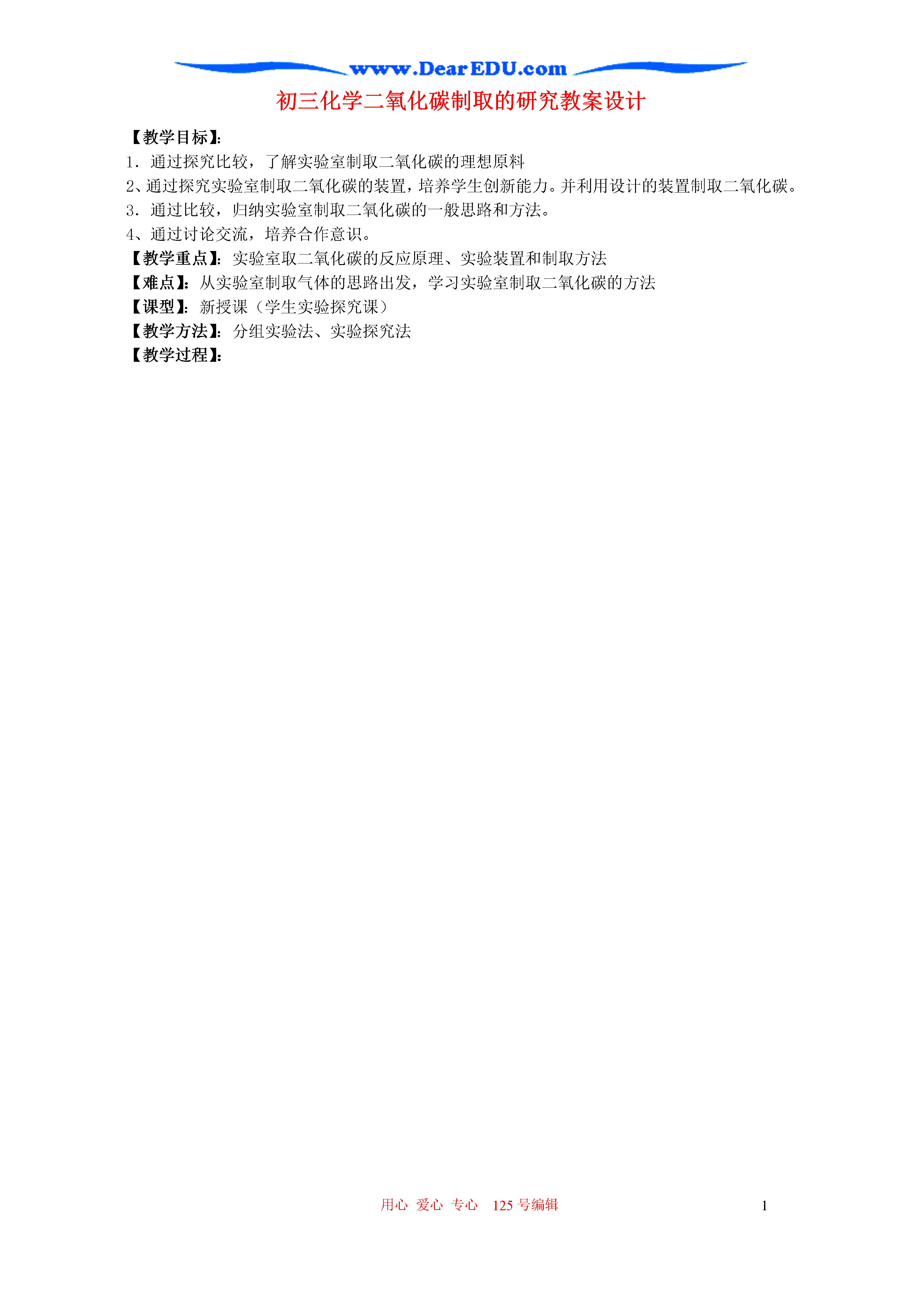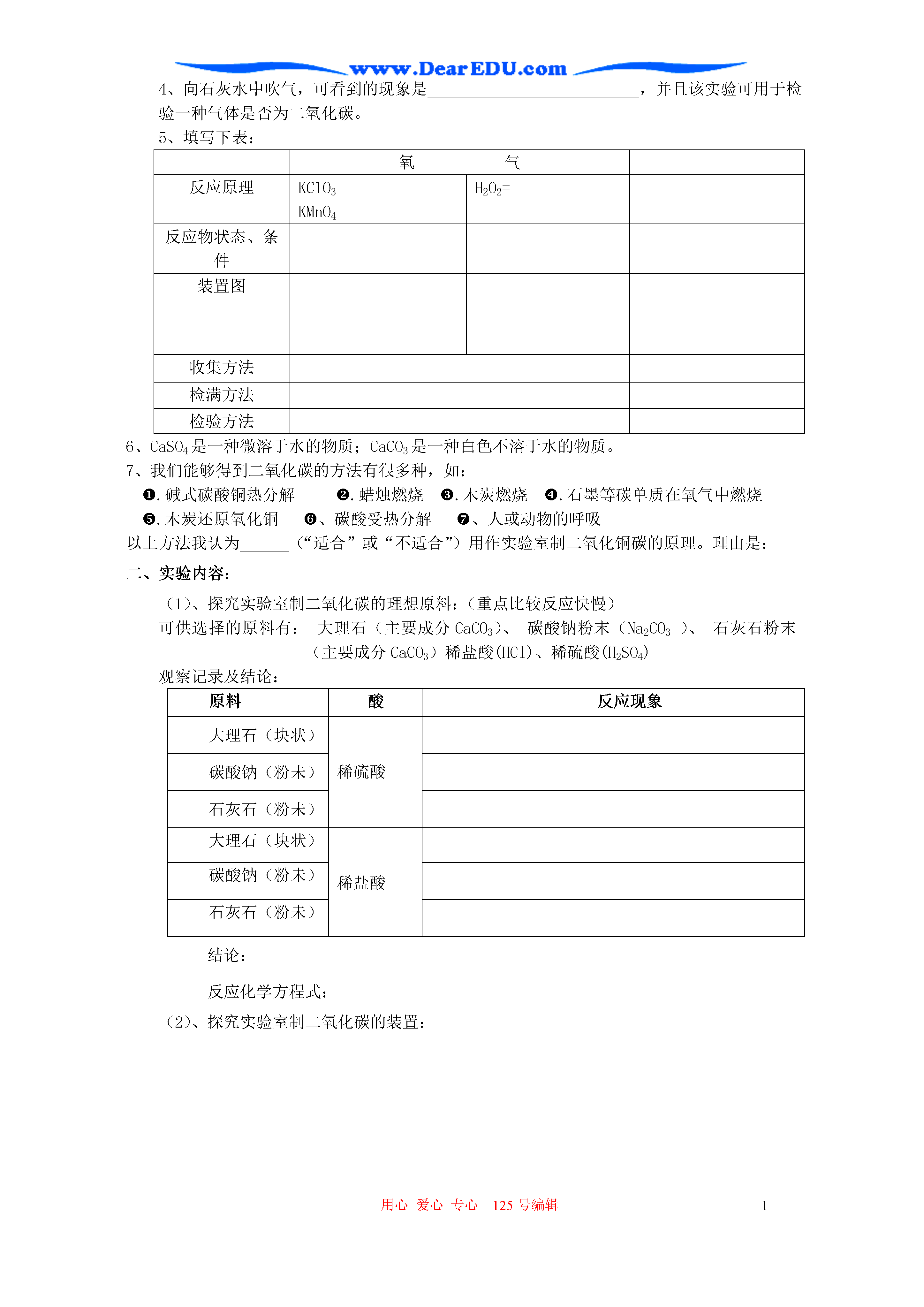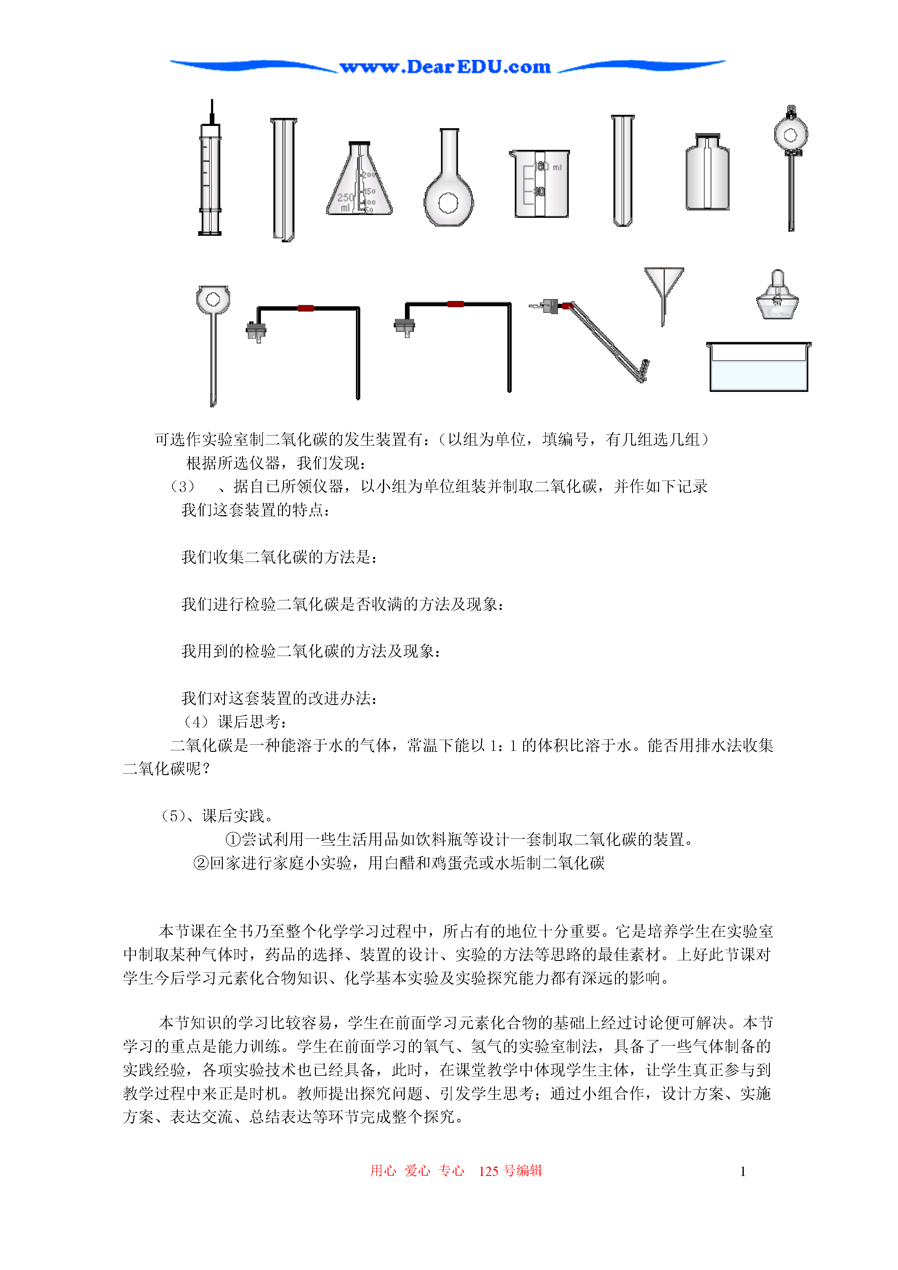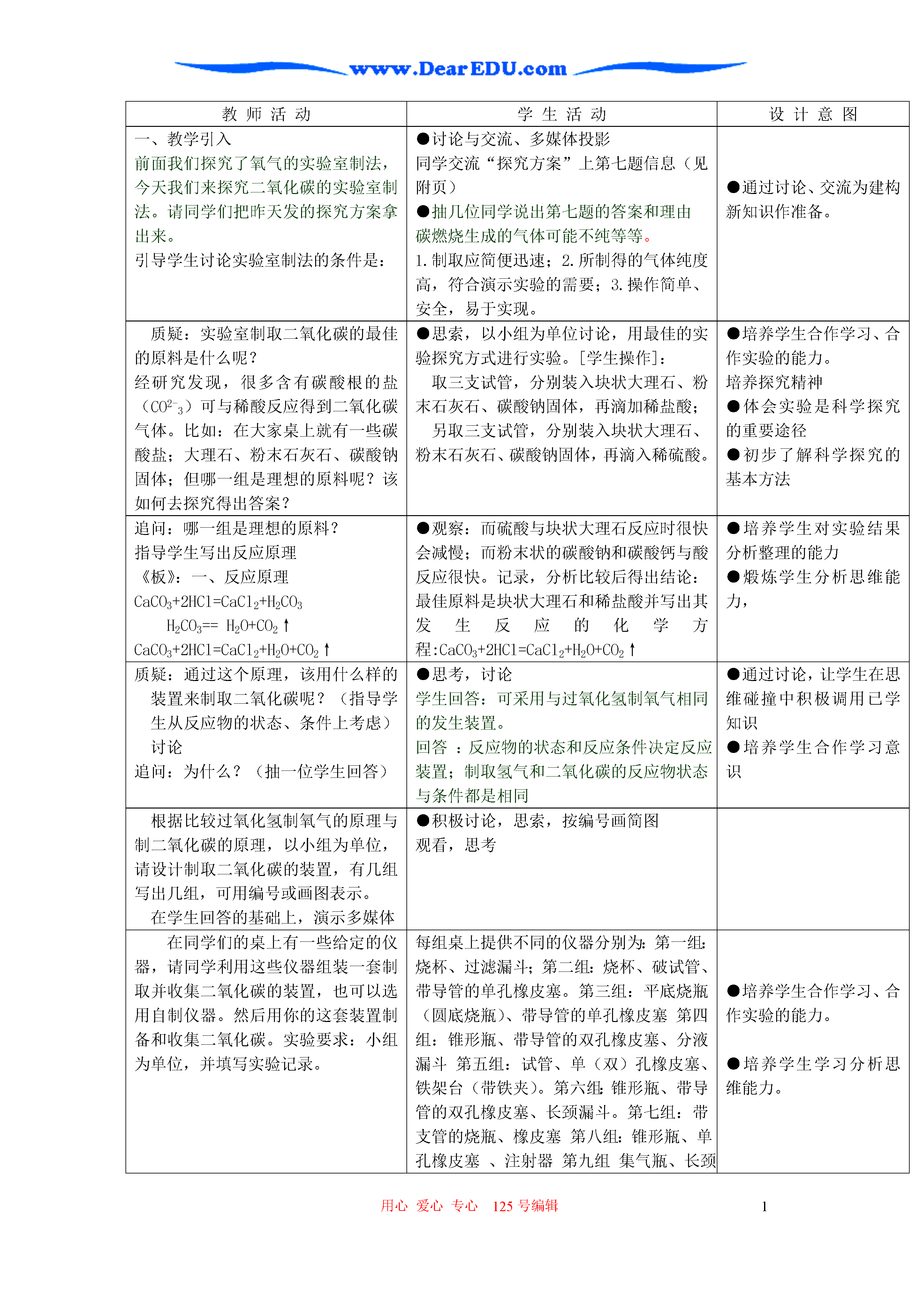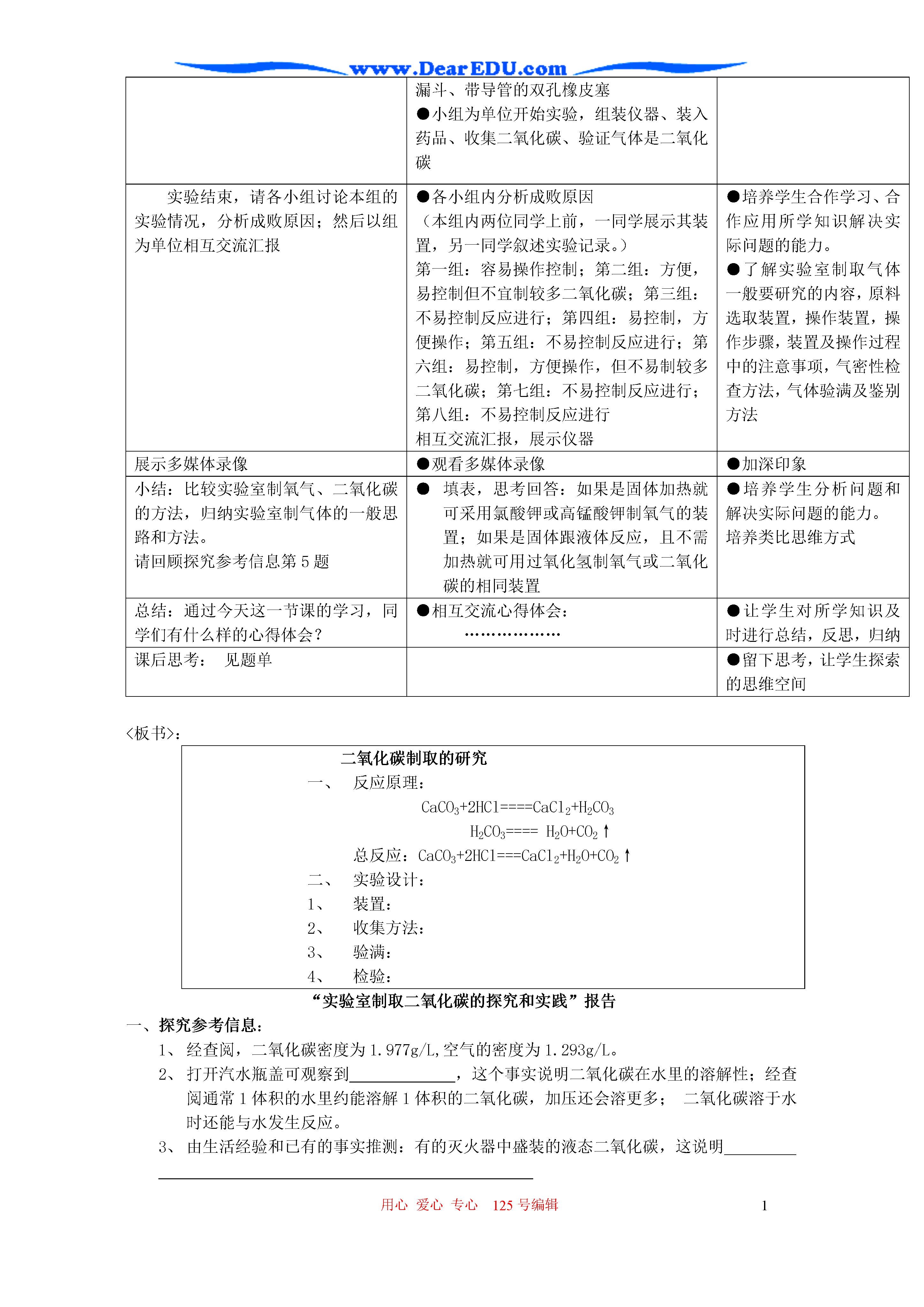 用心爱心专心125号编辑1初三化学二氧化碳制取的研究教案设计【教学目标】:1.通过探究比较,了解实验室制取二氧化碳的理想原料2、通过探究实验室制取二氧化碳的装置,培养学生创新能力。并利用设计的装置制取二氧化碳。3.通过比较,归纳实验室制取二氧化碳的一般思路和方法。4、通过讨论交流,培养合作意识。【教学重点】:实验室取二氧化碳的反应原理、实验装置和制取方法【难点】:从实验室制取气体的思路出发,学习实验室制取二氧化碳的方法【课型】:新授课(学生实验探究课)【教学方法】:分组实验法、实验探究法【教学过程】:教师活动学生活动设计意图教学引入前面我们探究了氧气的实验室制法,今天我们来探究二氧化碳的实验室制法。请同学们把昨天发的探究方案拿出来。引导学生讨论实验室制法的条件是:●讨论与交流、多媒体投影同学交流“探究方案”上第七题信息(见附页)●抽几位同学说出第七题的答案和理由碳燃烧生成的气体可能不纯等等。1.制取应简便迅速;2.所制得的气体纯度高,符合演示实验的需要;3.操作简单、安全,易于实现。●通过讨论、交流为建构新知识作准备。质疑:实验室制取二氧化碳的最佳的原料是什么呢?经研究发现,很多含有碳酸根的盐(CO2-3)可与稀酸反应得到二氧化碳气体。比如:在大家桌上就有一些碳酸盐;大理石、粉末石灰石、碳酸钠固体;但哪一组是理想的原料呢?该如何去探究得出答案?●思索,以小组为单位讨论,用最佳的实验探究方式进行实验。[学生操作]:取三支试管,分别装入块状大理石、粉末石灰石、碳酸钠固体,再滴加稀盐酸;另取三支试管,分别装入块状大理石、粉末石灰石、碳酸钠固体,再滴入稀硫酸。●培养学生合作学习、合作实验的能力。培养探究精神●体会实验是科学探究的重要途径●初步了解科学探究的基本方法追问:哪一组是理想的原料?指导学生写出反应原理《板》:一、反应原理CaCO3+2HCl=CaCl2+H2CO3H2CO3==H2O+CO2↑CaCO3+2HCl=CaCl2+H2O+CO2↑●观察:而硫酸与块状大理石反应时很快会减慢;而粉末状的碳酸钠和碳酸钙与酸反应很快。记录,分析比较后得出结论:最佳原料是块状大理石和稀盐酸并写出其发生反应的化学方程:CaCO3+2HCl=CaCl2+H2O+CO2↑●培养学生对实验结果分析整理的能力●煅炼学生分析思维能力,质疑:通过这个原理,该用什么样的装置来制取二氧化碳呢?(指导学生从反应物的状态、条件上考虑)讨论追问:为什么?(抽一位学生回答)●思考,讨论学生回答:可采用与过氧化氢制氧气相同的发生装置。回答:反应物的状态和反应条件决定反应装置;制取氢气和二氧化碳的反应物状态与条件都是相同●通过讨论,让学生在思维碰撞中积极调用已学知识●培养学生合作学习意识根据比较过氧化氢制氧气的原理与制二氧化碳的原理,以小组为单位,请设计制取二氧化碳的装置,有几组写出几组,可用编号或画图表示。在学生回答的基础上,演示多媒体●积极讨论,思索,按编号画简图观看,思考在同学们的桌上有一些给定的仪器,请同学利用这些仪器组装一套制取并收集二氧化碳的装置,也可以选用自制仪器。然后用你的这套装置制备和收集二氧化碳。实验要求:小组为单位,并填写实验记录。每组桌上提供不同的仪器分别为:第一组:烧杯、过滤漏斗;第二组:烧杯、破试管、带导管的单孔橡皮塞。第三组:平底烧瓶(圆底烧瓶)、带导管的单孔橡皮塞第四组:锥形瓶、带导管的双孔橡皮塞、分液漏斗第五组:试管、单(双)孔橡皮塞、铁架台(带铁夹)。第六组:锥形瓶、带导管的双孔橡皮塞、长颈漏斗。第七组:带支管的烧瓶、橡皮塞第八组:锥形瓶、单孔橡皮塞、注射器第九组集气瓶、长颈漏斗、带导管的双孔橡皮塞●小组为单位开始实验,组装仪器、装入药品、收集二氧化碳、验证气体是二氧化碳●培养学生合作学习、合作实验的能力。●培养学生学习分析思维能力。实验结束,请各小组讨论本组的实验情况,分析成败原因;然后以组为单位相互交流汇报●各小组内分析成败原因(本组内两位同学上前,一同学展示其装置,另一同学叙述实验记录。)第一组:容易操作控制;第二组:方便,易控制但不宜制较多二氧化碳;第三组:不易控制反应进行;第四组:易控制,方便操作;第五组:不易控制反应进行;第六组:易控制,方便操作,但不易制较多二氧化碳;第七组:不易控制反应进行;第八组:不易控制反应进行相互交流汇报,展示仪器●培养学生合作学习、合作应用所学知识解决实际问题的能力。●了解实验室制取气体一般要研究的内容,原料选取装置,操作装置,操作步骤,装置及操作过程中的注意事项,气密性检查方法,气体验满及鉴别方法展示多媒体录像●观看多媒体录像●加深印象小结:比较实验室制氧气、二氧化碳的方法,归纳实验室制