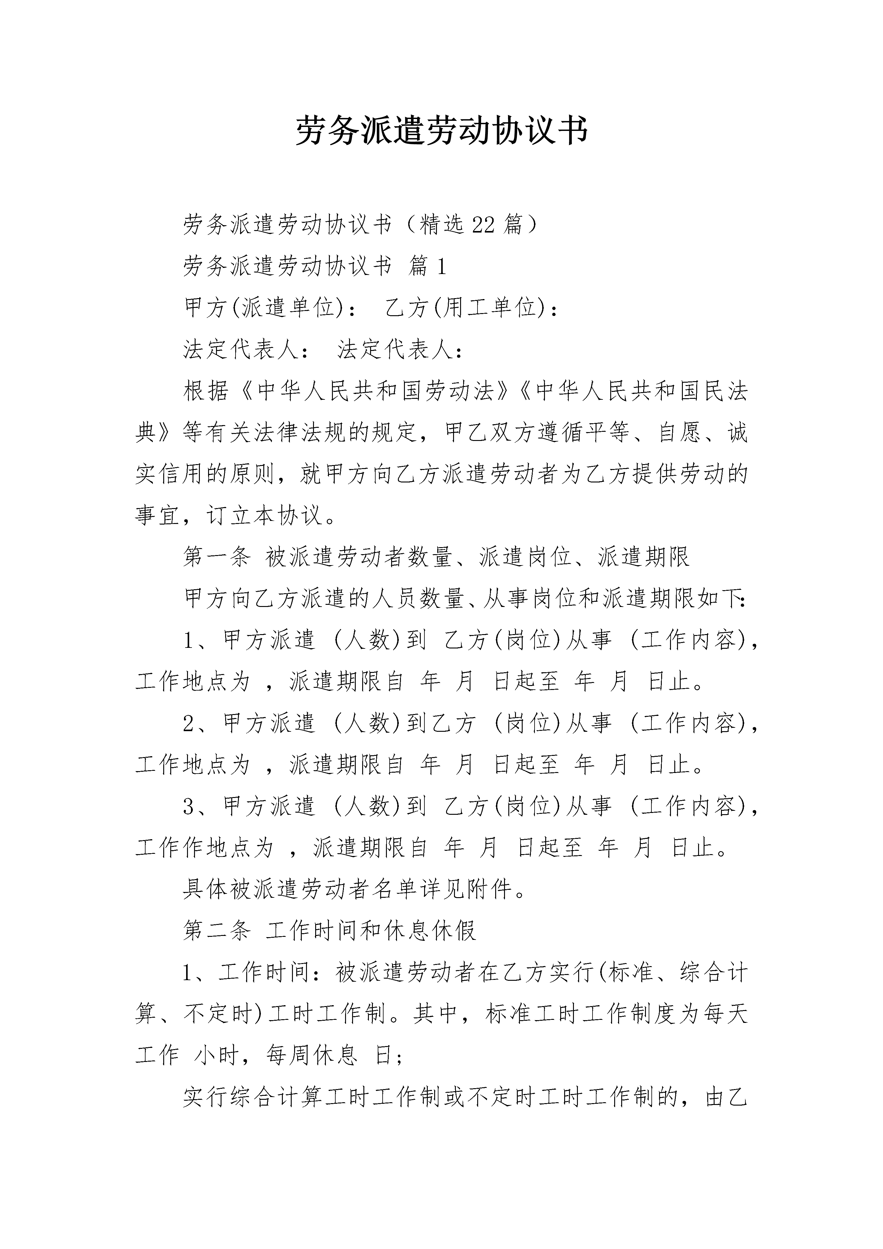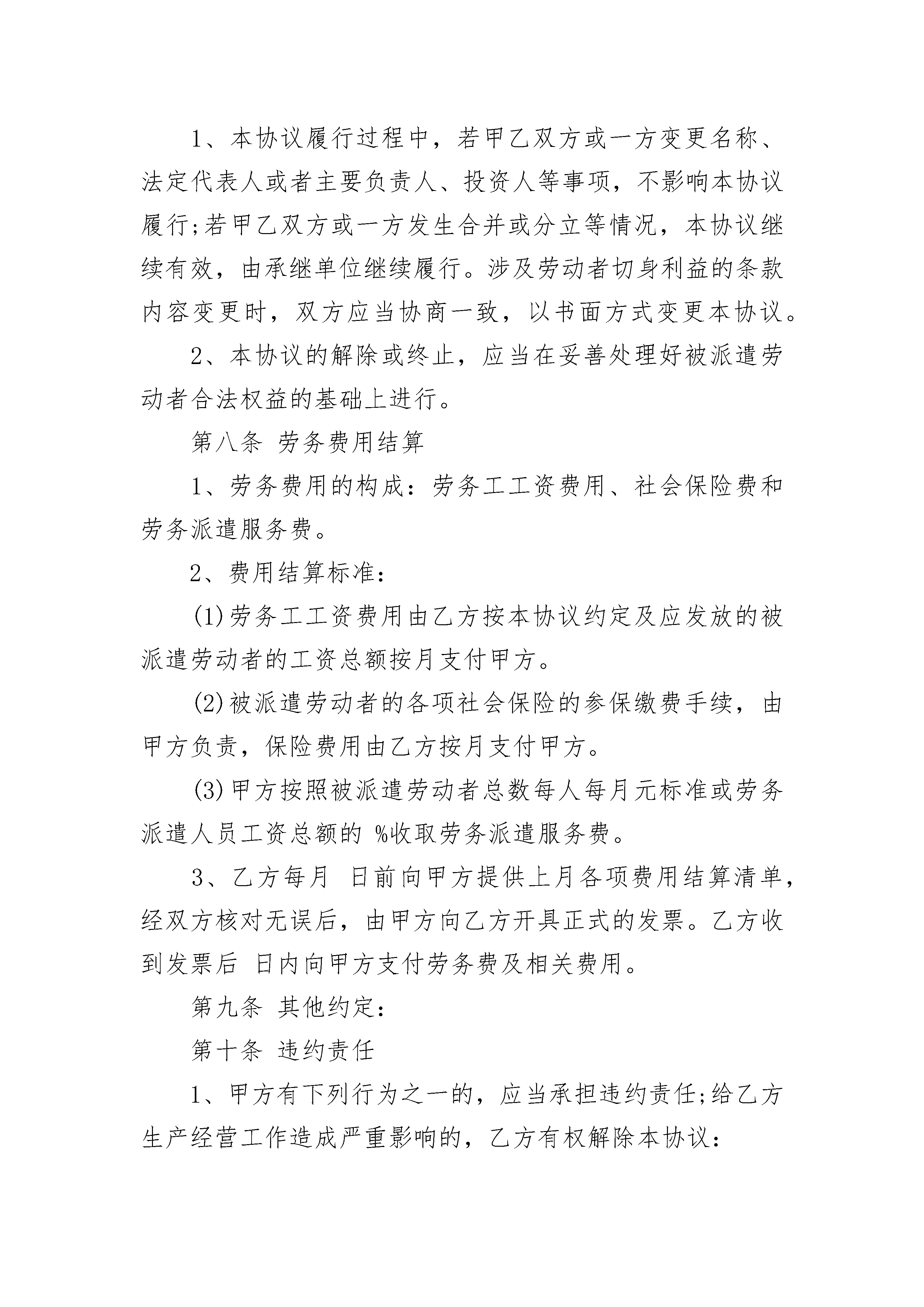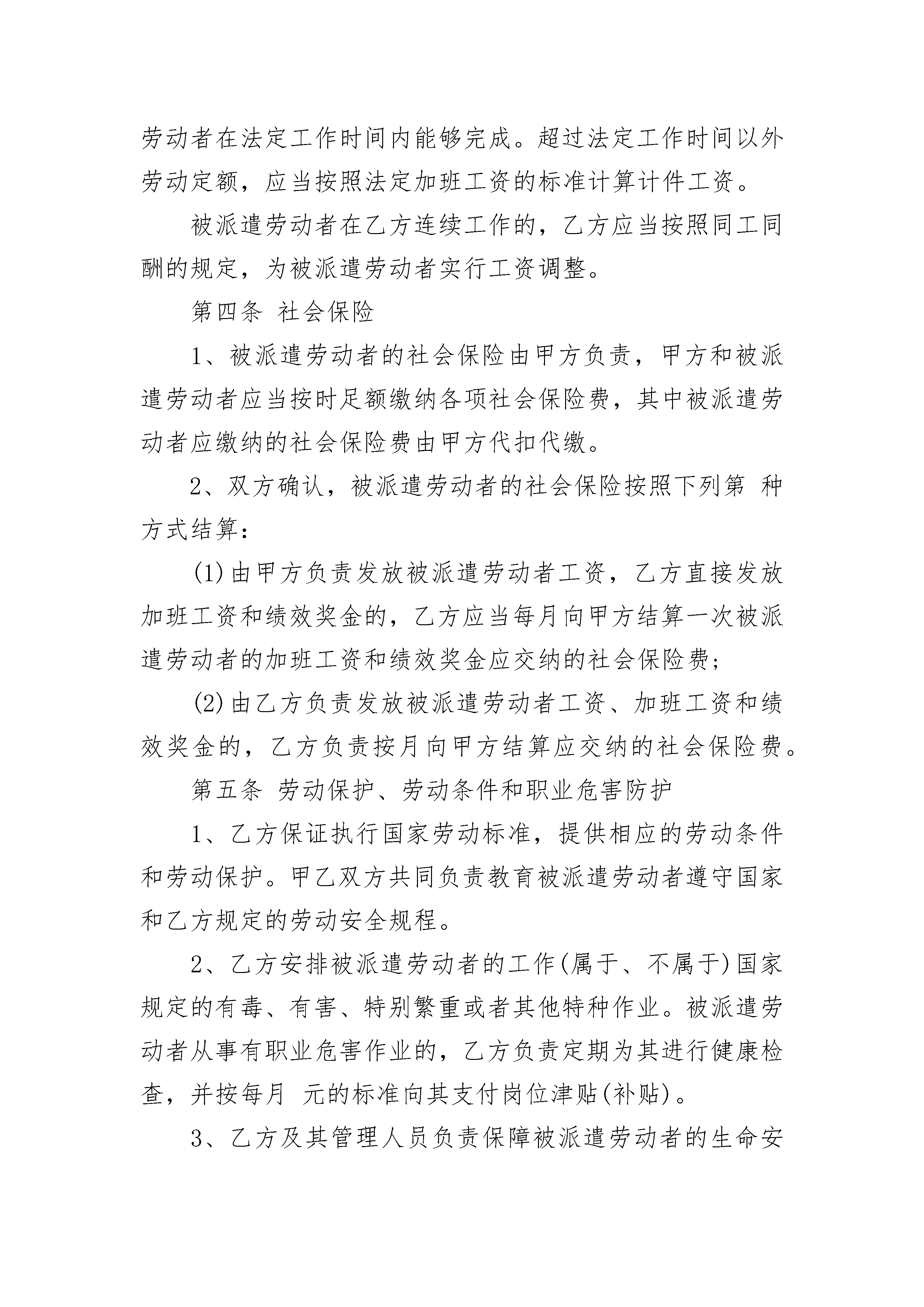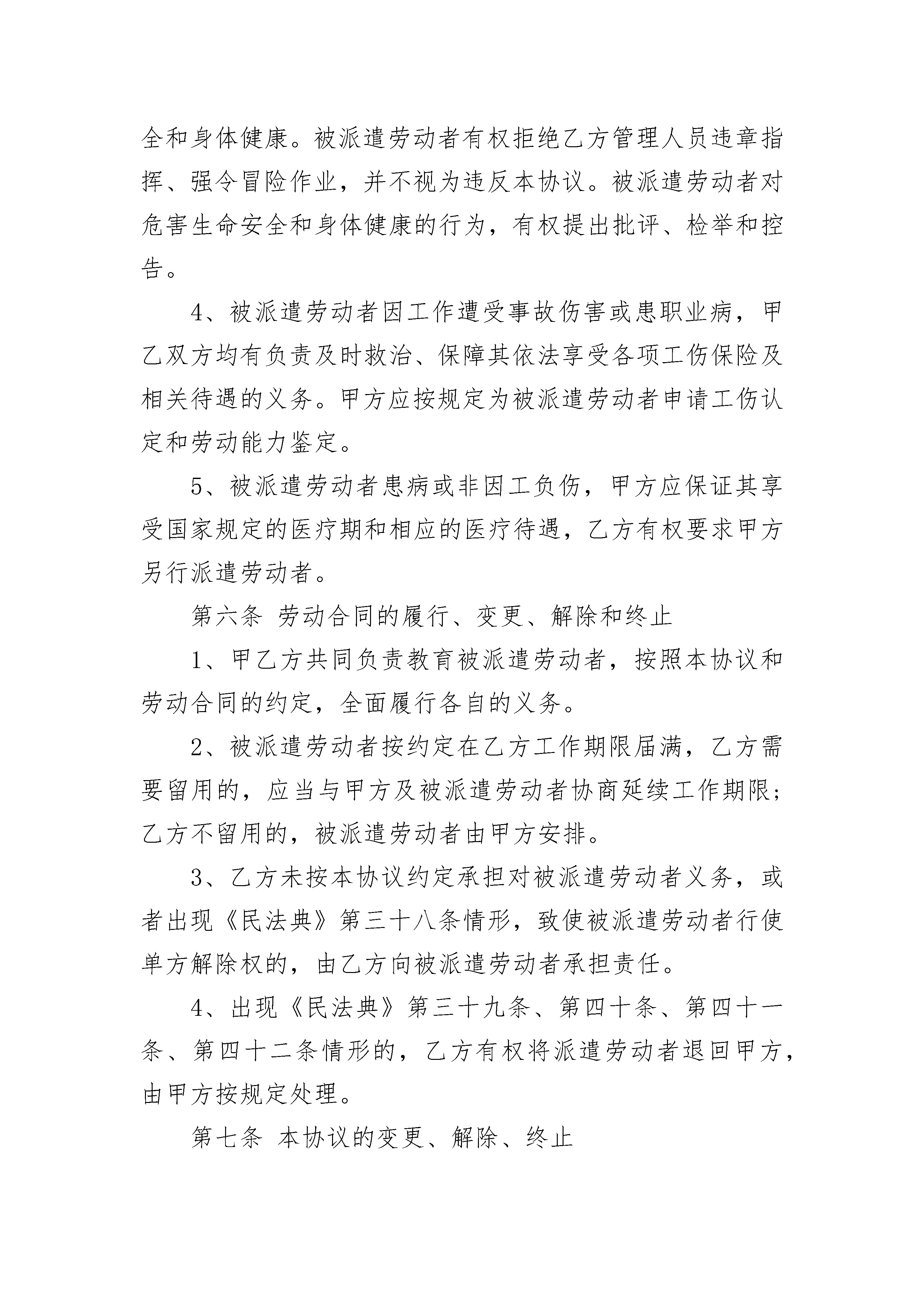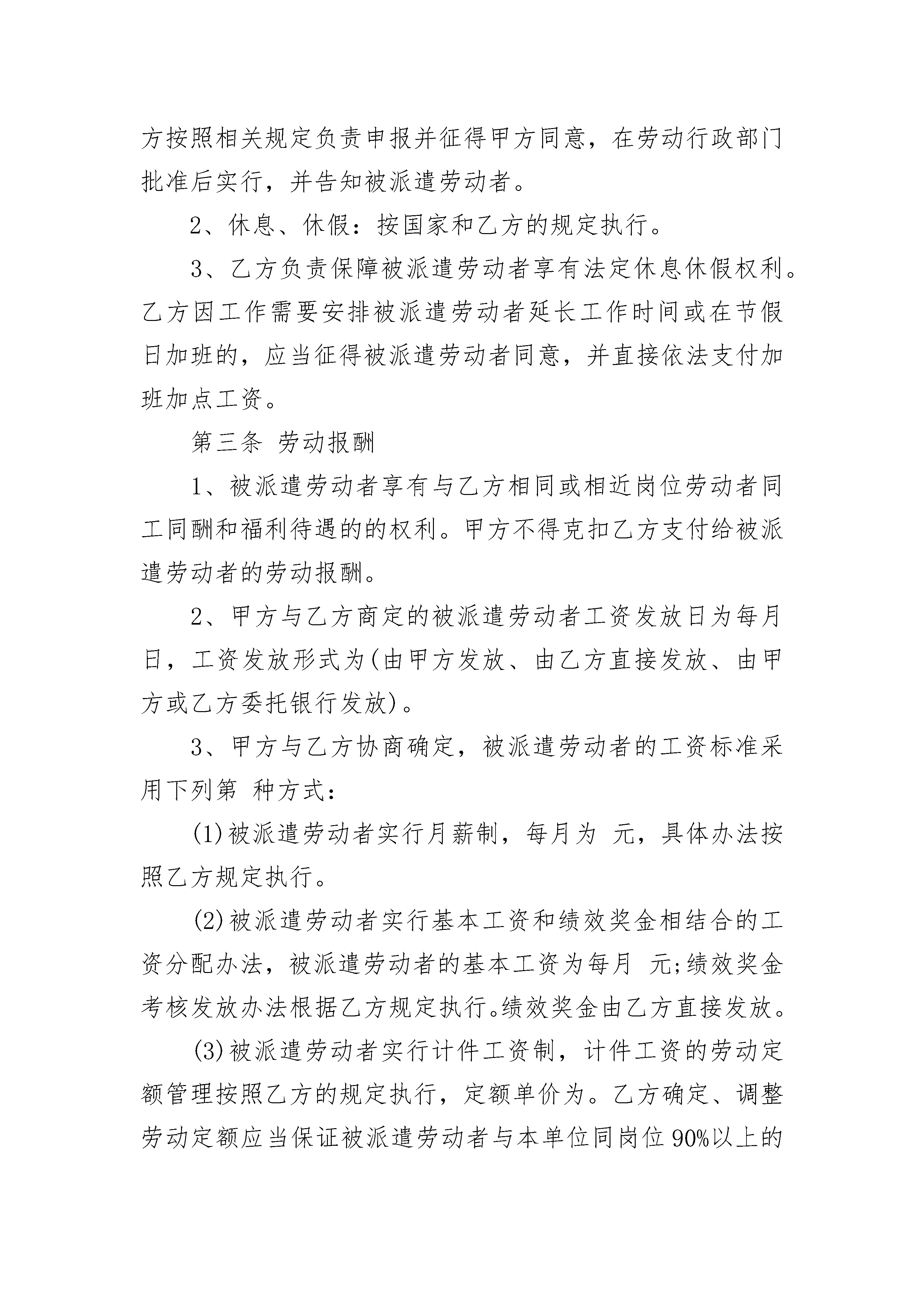 劳务派遣劳动协议书劳务派遣劳动协议书(精选22篇)劳务派遣劳动协议书篇1甲方(派遣单位):乙方(用工单位):法定代表人:法定代表人:根据《中华人民共和国劳动法》《中华人民共和国民法典》等有关法律法规的规定,甲乙双方遵循平等、自愿、诚实信用的原则,就甲方向乙方派遣劳动者为乙方提供劳动的事宜,订立本协议。第一条被派遣劳动者数量、派遣岗位、派遣期限甲方向乙方派遣的人员数量、从事岗位和派遣期限如下:1、甲方派遣(人数)到乙方(岗位)从事(工作内容),工作地点为,派遣期限自年月日起至年月日止。2、甲方派遣(人数)到乙方(岗位)从事(工作内容),工作地点为,派遣期限自年月日起至年月日止。3、甲方派遣(人数)到乙方(岗位)从事(工作内容),工作作地点为,派遣期限自年月日起至年月日止。具体被派遣劳动者名单详见附件。第二条工作时间和休息休假1、工作时间:被派遣劳动者在乙方实行(标准、综合计算、不定时)工时工作制。其中,标准工时工作制度为每天工作小时,每周休息日;实行综合计算工时工作制或不定时工时工作制的,由乙方按照相关规定负责申报并征得甲方同意,在劳动行政部门批准后实行,并告知被派遣劳动者。2、休息、休假:按国家和乙方的规定执行。3、乙方负责保障被派遣劳动者享有法定休息休假权利。乙方因工作需要安排被派遣劳动者延长工作时间或在节假日加班的,应当征得被派遣劳动者同意,并直接依法支付加班加点工资。第三条劳动报酬1、被派遣劳动者享有与乙方相同或相近岗位劳动者同工同酬和福利待遇的的权利。甲方不得克扣乙方支付给被派遣劳动者的劳动报酬。2、甲方与乙方商定的被派遣劳动者工资发放日为每月日,工资发放形式为(由甲方发放、由乙方直接发放、由甲方或乙方委托银行发放)。3、甲方与乙方协商确定,被派遣劳动者的工资标准采用下列第种方式:(1)被派遣劳动者实行月薪制,每月为元,具体办法按照乙方规定执行。(2)被派遣劳动者实行基本工资和绩效奖金相结合的工资分配办法,被派遣劳动者的基本工资为每月元;绩效奖金考核发放办法根据乙方规定执行。绩效奖金由乙方直接发放。(3)被派遣劳动者实行计件工资制,计件工资的劳动定额管理按照乙方的规定执行,定额单价为。乙方确定、调整劳动定额应当保证被派遣劳动者与本单位同岗位90%以上的劳动者在法定工作时间内能够完成。超过法定工作时间以外劳动定额,应当按照法定加班工资的标准计算计件工资。被派遣劳动者在乙方连续工作的,乙方应当按照同工同酬的规定,为被派遣劳动者实行工资调整。第四条社会保险1、被派遣劳动者的社会保险由甲方负责,甲方和被派遣劳动者应当按时足额缴纳各项社会保险费,其中被派遣劳动者应缴纳的社会保险费由甲方代扣代缴。2、双方确认,被派遣劳动者的社会保险按照下列第种方式结算:(1)由甲方负责发放被派遣劳动者工资,乙方直接发放加班工资和绩效奖金的,乙方应当每月向甲方结算一次被派遣劳动者的加班工资和绩效奖金应交纳的社会保险费;(2)由乙方负责发放被派遣劳动者工资、加班工资和绩效奖金的,乙方负责按月向甲方结算应交纳的社会保险费。第五条劳动保护、劳动条件和职业危害防护1、乙方保证执行国家劳动标准,提供相应的劳动条件和劳动保护。甲乙双方共同负责教育被派遣劳动者遵守国家和乙方规定的劳动安全规程。2、乙方安排被派遣劳动者的工作(属于、不属于)国家规定的有毒、有害、特别繁重或者其他特种作业。被派遣劳动者从事有职业危害作业的,乙方负责定期为其进行健康检查,并按每月元的标准向其支付岗位津贴(补贴)。3、乙方及其管理人员负责保障被派遣劳动者的生命安全和身体健康。被派遣劳动者有权拒绝乙方管理人员违章指挥、强令冒险作业,并不视为违反本协议。被派遣劳动者对危害生命安全和身体健康的行为,有权提出批评、检举和控告。4、被派遣劳动者因工作遭受事故伤害或患职业病,甲乙双方均有负责及时救治、保障其依法享受各项工伤保险及相关待遇的义务。甲方应按规定为被派遣劳动者申请工伤认定和劳动能力鉴定。5、被派遣劳动者患病或非因工负伤,甲方应保证其享受国家规定的医疗期和相应的医疗待遇,乙方有权要求甲方另行派遣劳动者。第六条劳动合同的履行、变更、解除和终止1、甲乙方共同负责教育被派遣劳动者,按照本协议和劳动合同的约定,全面履行各自的义务。2、被派遣劳动者按约定在乙方工作期限届满,乙方需要留用的,应当与甲方及被派遣劳动者协商延续工作期限;乙方不留用的,被派遣劳动者由甲方安排。3、乙方未按本协议约定承担对被派遣劳动者义务,或者出现《民法典》第三十八条情形,致使被派遣劳动者行使单方解除权的,由乙方向被派遣劳动者承担责任。4、出现《民法典》第三十九条、第四十条、第四十一条、第四十二条情形的,乙方有权将派遣劳动者退回甲方,由甲方按规定处理。第七条本协议的变更、解除、终止1、本协议履行过程中,若甲乙双方或一方变更名