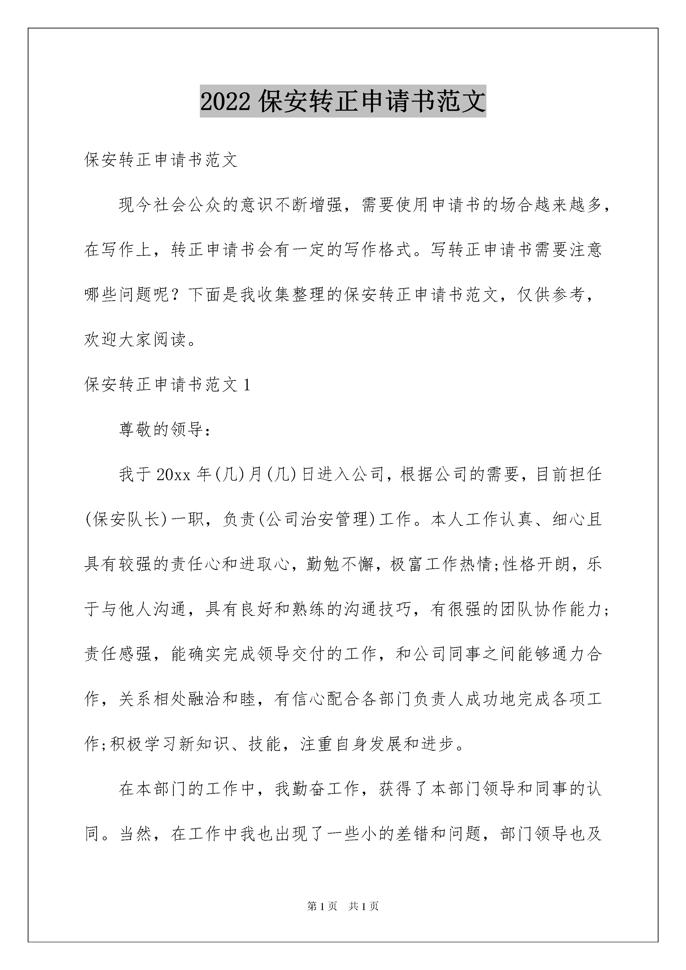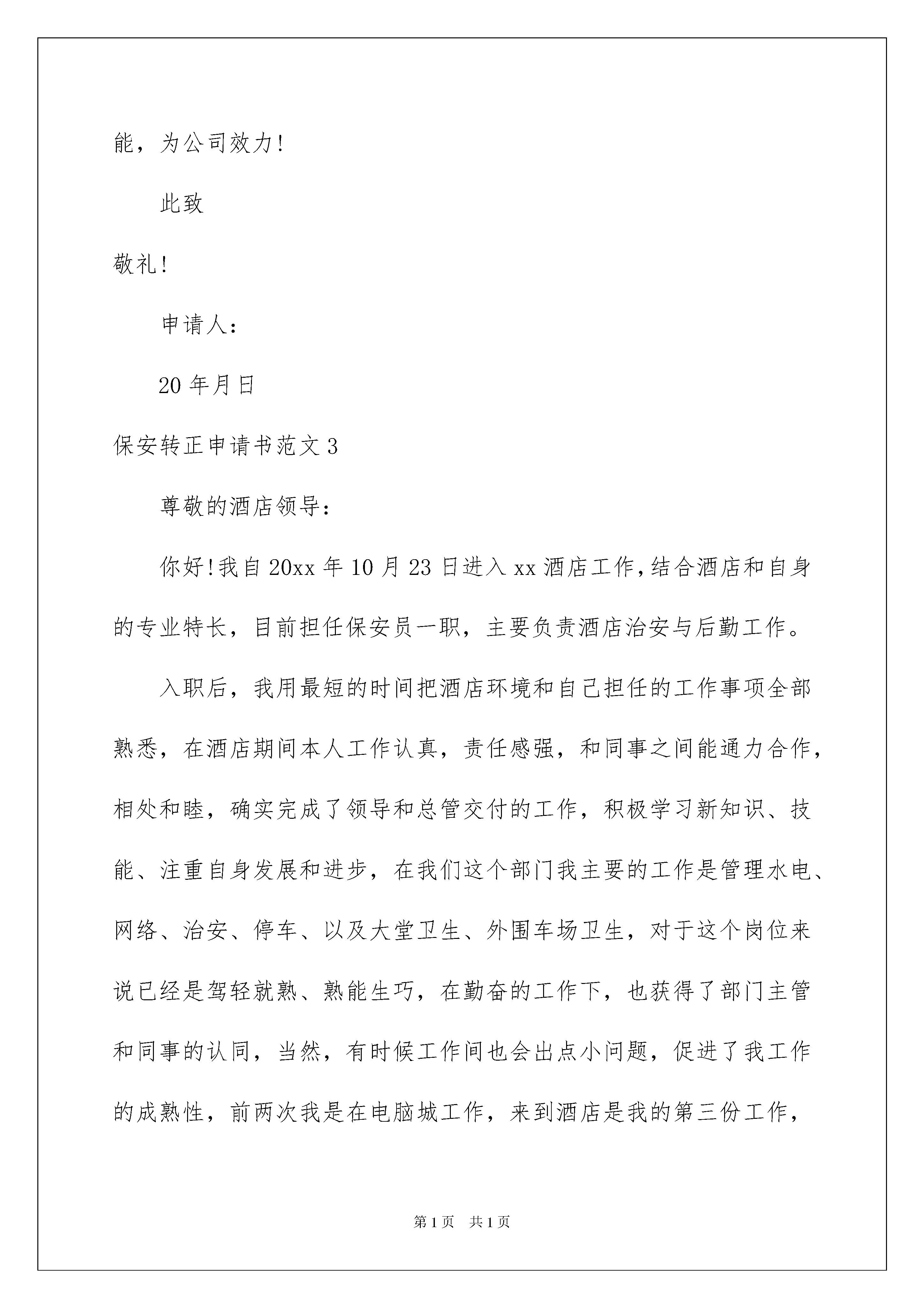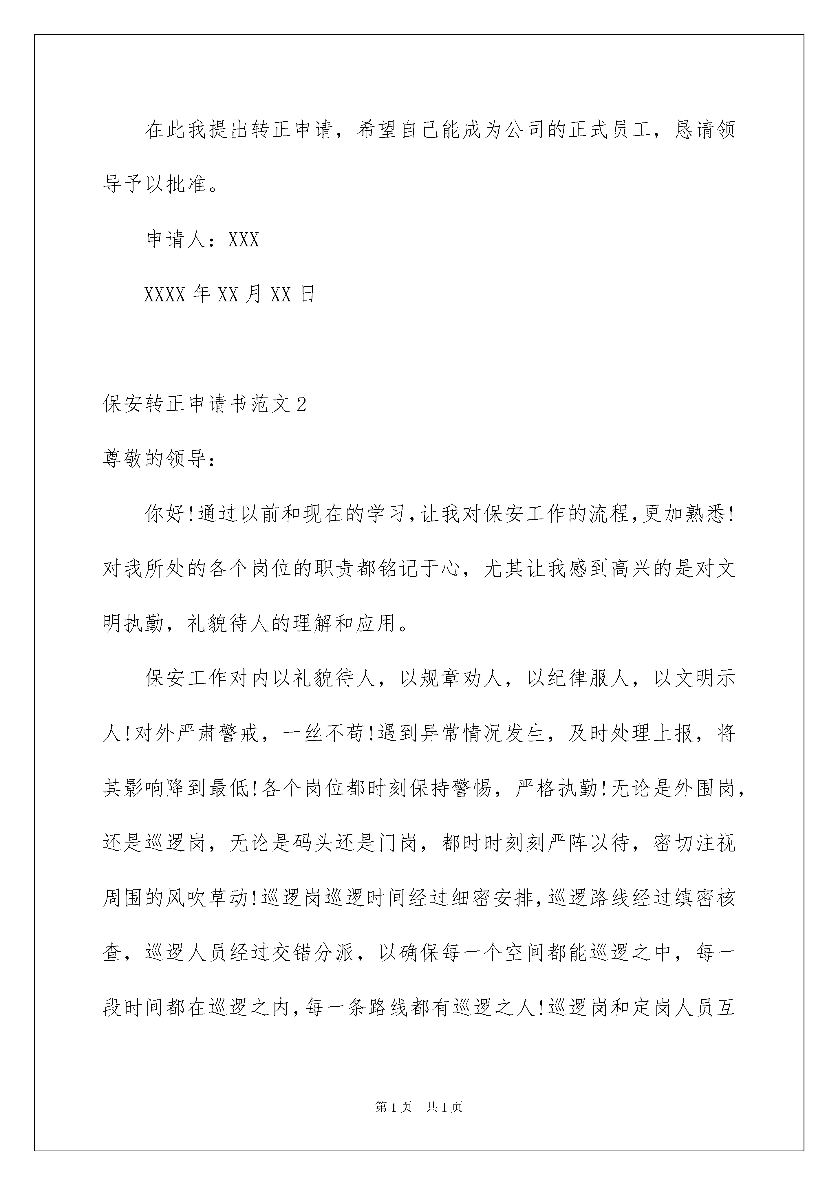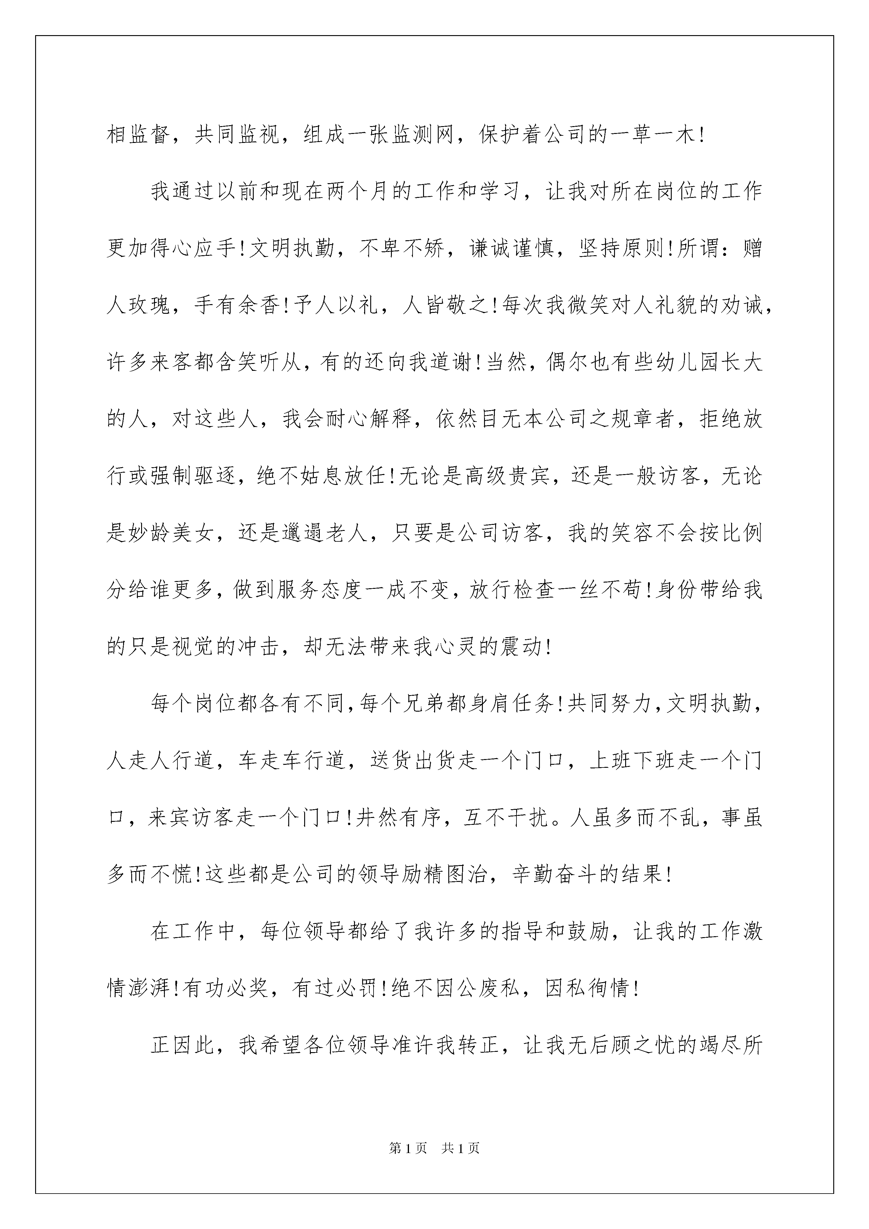 2022保安转正申请书范文保安转正申请书范文现今社会公众的意识不断增强,需要使用申请书的场合越来越多,在写作上,转正申请书会有一定的写作格式。写转正申请书需要注意哪些问题呢?下面是我收集整理的保安转正申请书范文,仅供参考,欢迎大家阅读。保安转正申请书范文1尊敬的领导:我于20xx年(几)月(几)日进入公司,根据公司的需要,目前担任(保安队长)一职,负责(公司治安管理)工作。本人工作认真、细心且具有较强的责任心和进取心,勤勉不懈,极富工作热情;性格开朗,乐于与他人沟通,具有良好和熟练的沟通技巧,有很强的团队协作能力;责任感强,能确实完成领导交付的工作,和公司同事之间能够通力合作,关系相处融洽和睦,有信心配合各部门负责人成功地完成各项工作;积极学习新知识、技能,注重自身发展和进步。在本部门的工作中,我勤奋工作,获得了本部门领导和同事的认同。当然,在工作中我也出现了一些小的差错和问题,部门领导也及时给我指正,促进了我工作的成熟。如果说刚来的那几天仅仅是从简介中了解公司,对公司的认识仅仅是皮毛的话,那么随着时间的推移,我对公司也有了更为深刻的了解。公司宽松融洽的工作氛围、团结向上的企业文化,让我很快进入到了工作角色中来。这就好比一辆正在进行磨合的新车一样,一个好的司机会让新车的磨合期缩短,并且会很好的保护好新车,让它发挥出最好的性能。咱们公司就是一名优秀的司机,新员工就像是需要渡过磨合期的新车,在公司的领导下,我会更加严格要求自己,在作好本职工作的同时,积极团结同事,搞好大家之间的关系。在工作中,要不断的学习与积累,不断的提出问题,解决问题,不断完善自我,使工作能够更快、更好的完成。我相信我一定会做好工作,成为优秀的(公司名称)中的一份子,不辜负领导对我的期望。总之,在这(两)个月的工作中,我深深体会到有一个和谐、共进的团队是非常重要的,有一个积极向上、大气磅礴的公司和领导是员工前进的动力。(公司名称)公司给了我这样一个发挥的舞台,我就要珍惜这次机会,为公司的发展竭尽全力。在此我提出转正申请,希望自己能成为公司的正式员工,恳请领导予以批准。申请人:XXXXXXX年XX月XX日保安转正申请书范文2尊敬的领导:你好!通过以前和现在的学习,让我对保安工作的流程,更加熟悉!对我所处的各个岗位的职责都铭记于心,尤其让我感到高兴的是对文明执勤,礼貌待人的理解和应用。保安工作对内以礼貌待人,以规章劝人,以纪律服人,以文明示人!对外严肃警戒,一丝不苟!遇到异常情况发生,及时处理上报,将其影响降到最低!各个岗位都时刻保持警惕,严格执勤!无论是外围岗,还是巡逻岗,无论是码头还是门岗,都时时刻刻严阵以待,密切注视周围的风吹草动!巡逻岗巡逻时间经过细密安排,巡逻路线经过缜密核查,巡逻人员经过交错分派,以确保每一个空间都能巡逻之中,每一段时间都在巡逻之内,每一条路线都有巡逻之人!巡逻岗和定岗人员互相监督,共同监视,组成一张监测网,保护着公司的一草一木!我通过以前和现在两个月的工作和学习,让我对所在岗位的工作更加得心应手!文明执勤,不卑不矫,谦诚谨慎,坚持原则!所谓:赠人玫瑰,手有余香!予人以礼,人皆敬之!每次我微笑对人礼貌的劝诫,许多来客都含笑听从,有的还向我道谢!当然,偶尔也有些幼儿园长大的人,对这些人,我会耐心解释,依然目无本公司之规章者,拒绝放行或强制驱逐,绝不姑息放任!无论是高级贵宾,还是一般访客,无论是妙龄美女,还是邋遢老人,只要是公司访客,我的笑容不会按比例分给谁更多,做到服务态度一成不变,放行检查一丝不苟!身份带给我的只是视觉的冲击,却无法带来我心灵的震动!每个岗位都各有不同,每个兄弟都身肩任务!共同努力,文明执勤,人走人行道,车走车行道,送货出货走一个门口,上班下班走一个门口,来宾访客走一个门口!井然有序,互不干扰。人虽多而不乱,事虽多而不慌!这些都是公司的领导励精图治,辛勤奋斗的结果!在工作中,每位领导都给了我许多的指导和鼓励,让我的工作激情澎湃!有功必奖,有过必罚!绝不因公废私,因私徇情!正因此,我希望各位领导准许我转正,让我无后顾之忧的竭尽所能,为公司效力!此致敬礼!申请人:20年月日保安转正申请书范文3尊敬的酒店领导:你好!我自20xx年10月23日进入xx酒店工作,结合酒店和自身的专业特长,目前担任保安员一职,主要负责酒店治安与后勤工作。入职后,我用最短的时间把酒店环境和自己担任的工作事项全部熟悉,在酒店期间本人工作认真,责任感强,和同事之间能通力合作,相处和睦,确实完成了领导和总管交付的工作,积极学习新知识、技能、注重自身发展和进步,在我们这个部门我主要的工作是管理水电、网络、