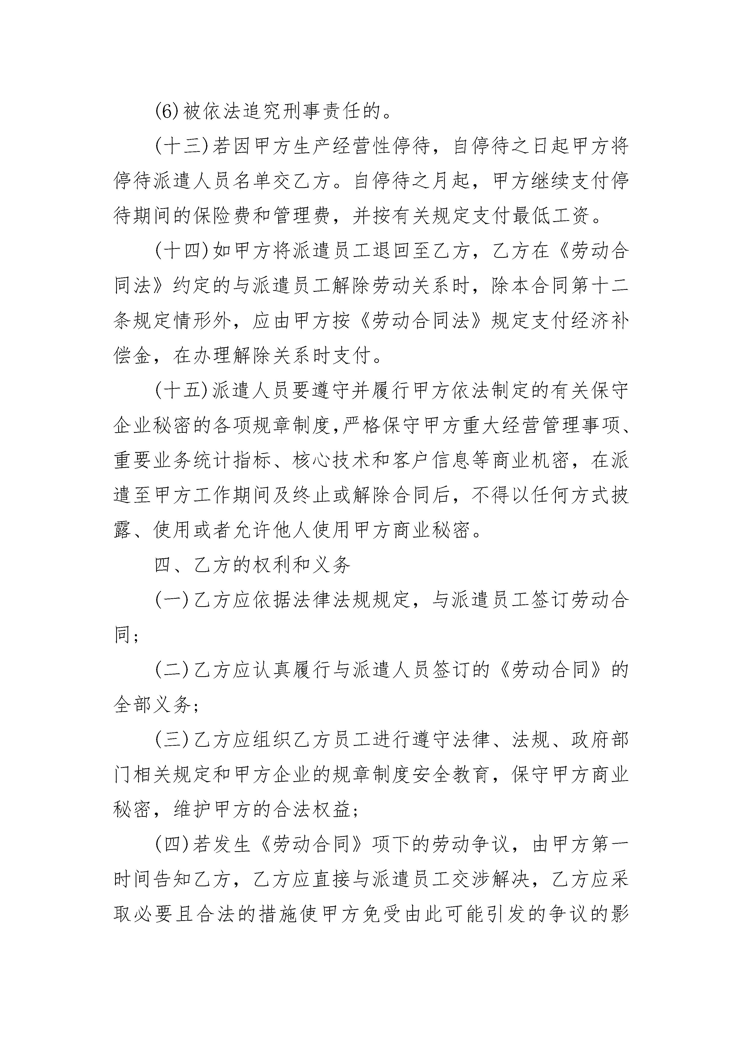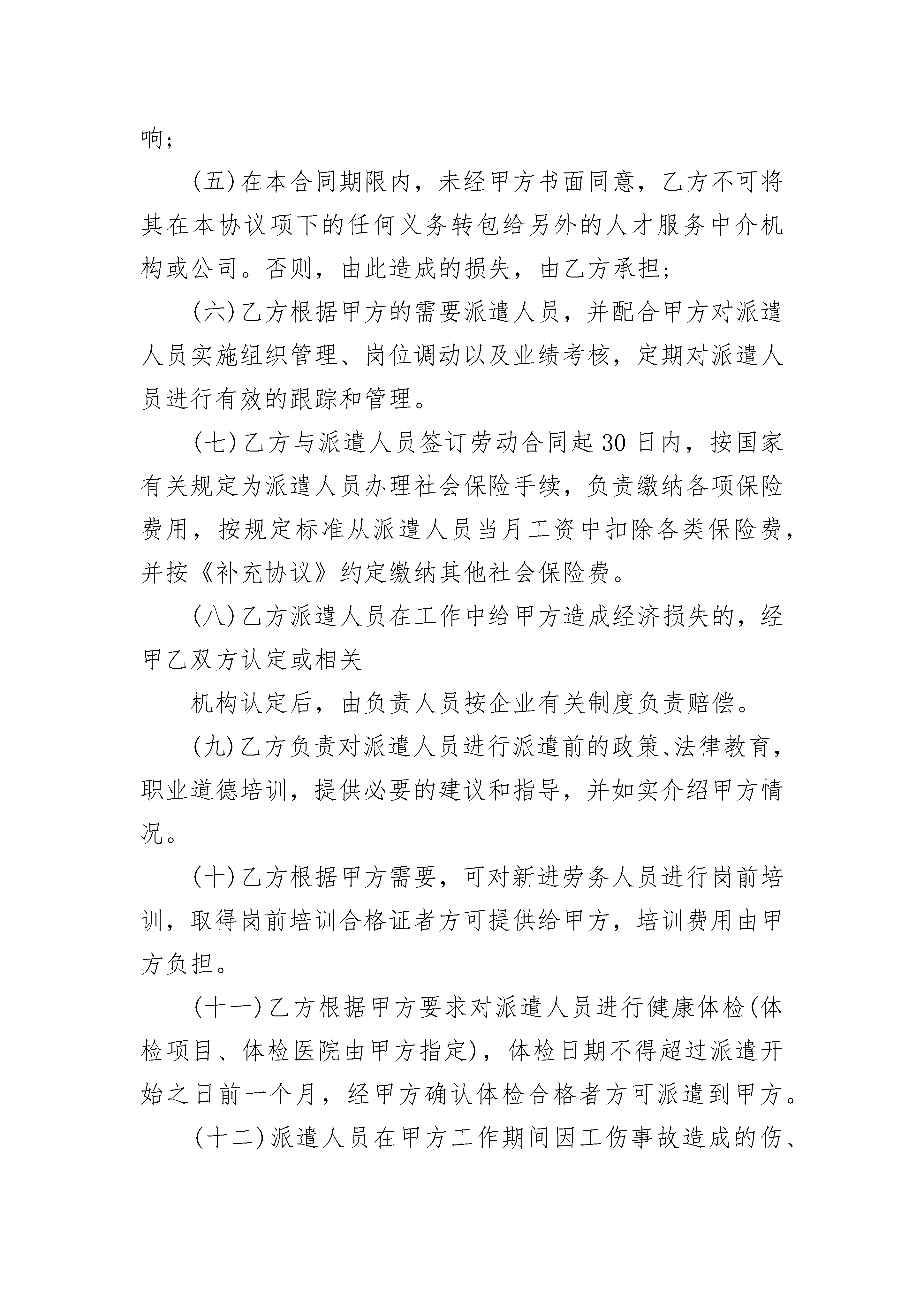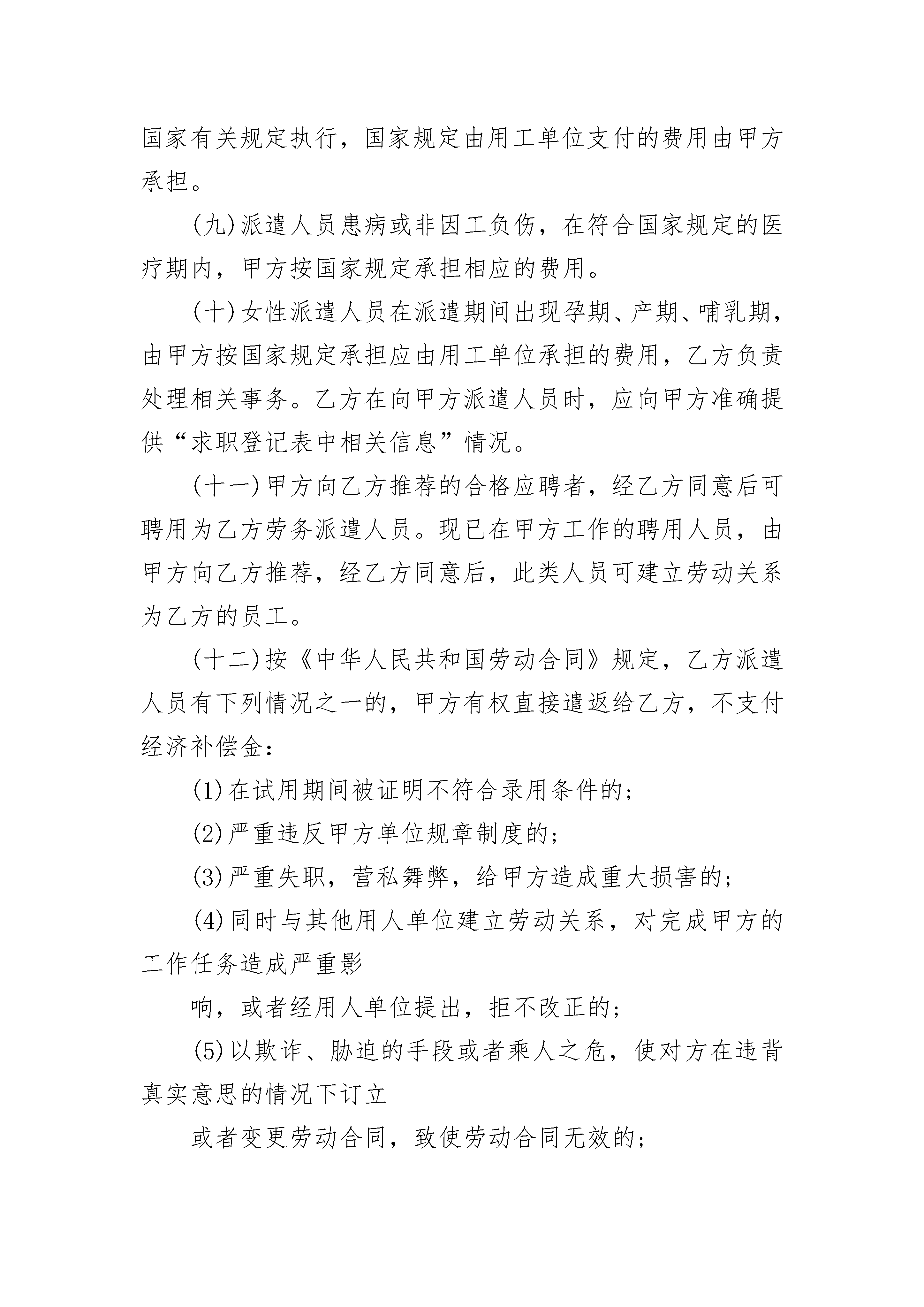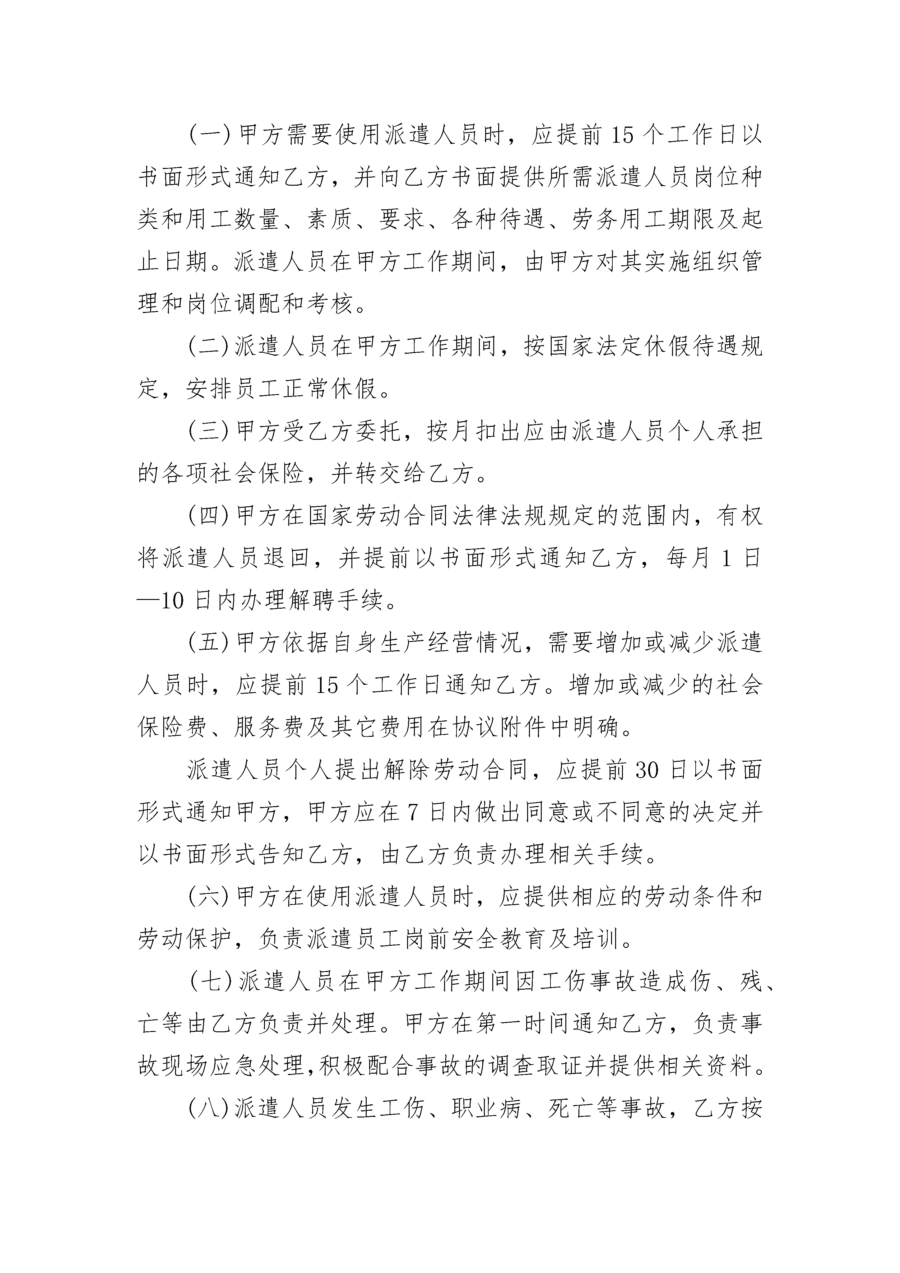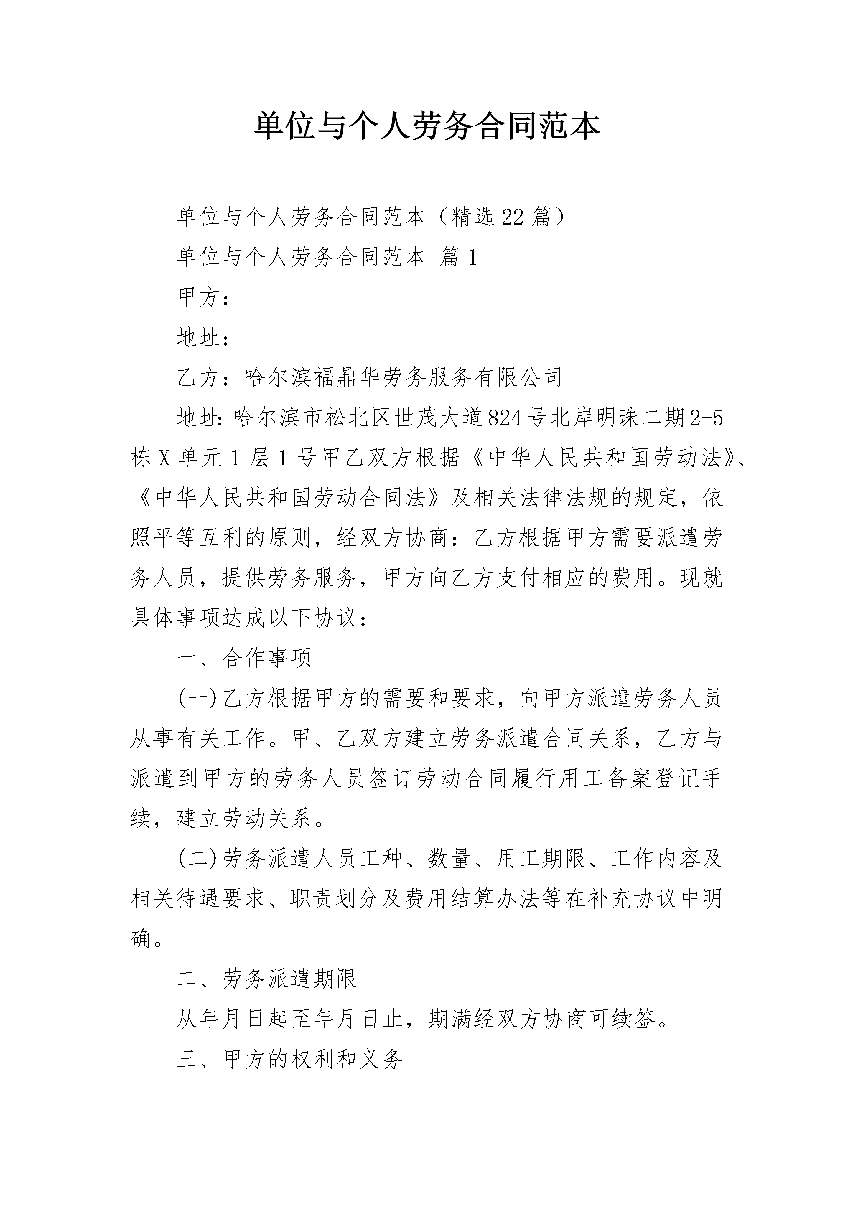 单位与个人劳务合同范本单位与个人劳务合同范本(精选22篇)单位与个人劳务合同范本篇1甲方:地址:乙方:哈尔滨福鼎华劳务服务有限公司地址:哈尔滨市松北区世茂大道824号北岸明珠二期2-5栋X单元1层1号甲乙双方根据《中华人民共和国劳动法》、《中华人民共和国劳动合同法》及相关法律法规的规定,依照平等互利的原则,经双方协商:乙方根据甲方需要派遣劳务人员,提供劳务服务,甲方向乙方支付相应的费用。现就具体事项达成以下协议:一、合作事项(一)乙方根据甲方的需要和要求,向甲方派遣劳务人员从事有关工作。甲、乙双方建立劳务派遣合同关系,乙方与派遣到甲方的劳务人员签订劳动合同履行用工备案登记手续,建立劳动关系。(二)劳务派遣人员工种、数量、用工期限、工作内容及相关待遇要求、职责划分及费用结算办法等在补充协议中明确。二、劳务派遣期限从年月日起至年月日止,期满经双方协商可续签。三、甲方的权利和义务(一)甲方需要使用派遣人员时,应提前15个工作日以书面形式通知乙方,并向乙方书面提供所需派遣人员岗位种类和用工数量、素质、要求、各种待遇、劳务用工期限及起止日期。派遣人员在甲方工作期间,由甲方对其实施组织管理和岗位调配和考核。(二)派遣人员在甲方工作期间,按国家法定休假待遇规定,安排员工正常休假。(三)甲方受乙方委托,按月扣出应由派遣人员个人承担的各项社会保险,并转交给乙方。(四)甲方在国家劳动合同法律法规规定的范围内,有权将派遣人员退回,并提前以书面形式通知乙方,每月1日—10日内办理解聘手续。(五)甲方依据自身生产经营情况,需要增加或减少派遣人员时,应提前15个工作日通知乙方。增加或减少的社会保险费、服务费及其它费用在协议附件中明确。派遣人员个人提出解除劳动合同,应提前30日以书面形式通知甲方,甲方应在7日内做出同意或不同意的决定并以书面形式告知乙方,由乙方负责办理相关手续。(六)甲方在使用派遣人员时,应提供相应的劳动条件和劳动保护,负责派遣员工岗前安全教育及培训。(七)派遣人员在甲方工作期间因工伤事故造成伤、残、亡等由乙方负责并处理。甲方在第一时间通知乙方,负责事故现场应急处理,积极配合事故的调查取证并提供相关资料。(八)派遣人员发生工伤、职业病、死亡等事故,乙方按国家有关规定执行,国家规定由用工单位支付的费用由甲方承担。(九)派遣人员患病或非因工负伤,在符合国家规定的医疗期内,甲方按国家规定承担相应的费用。(十)女性派遣人员在派遣期间出现孕期、产期、哺乳期,由甲方按国家规定承担应由用工单位承担的费用,乙方负责处理相关事务。乙方在向甲方派遣人员时,应向甲方准确提供“求职登记表中相关信息”情况。(十一)甲方向乙方推荐的合格应聘者,经乙方同意后可聘用为乙方劳务派遣人员。现已在甲方工作的聘用人员,由甲方向乙方推荐,经乙方同意后,此类人员可建立劳动关系为乙方的员工。(十二)按《中华人民共和国劳动合同》规定,乙方派遣人员有下列情况之一的,甲方有权直接遣返给乙方,不支付经济补偿金:(1)在试用期间被证明不符合录用条件的;(2)严重违反甲方单位规章制度的;(3)严重失职,营私舞弊,给甲方造成重大损害的;(4)同时与其他用人单位建立劳动关系,对完成甲方的工作任务造成严重影响,或者经用人单位提出,拒不改正的;(5)以欺诈、胁迫的手段或者乘人之危,使对方在违背真实意思的情况下订立或者变更劳动合同,致使劳动合同无效的;(6)被依法追究刑事责任的。(十三)若因甲方生产经营性停待,自停待之日起甲方将停待派遣人员名单交乙方。自停待之月起,甲方继续支付停待期间的保险费和管理费,并按有关规定支付最低工资。(十四)如甲方将派遣员工退回至乙方,乙方在《劳动合同法》约定的与派遣员工解除劳动关系时,除本合同第十二条规定情形外,应由甲方按《劳动合同法》规定支付经济补偿金,在办理解除关系时支付。(十五)派遣人员要遵守并履行甲方依法制定的有关保守企业秘密的各项规章制度,严格保守甲方重大经营管理事项、重要业务统计指标、核心技术和客户信息等商业机密,在派遣至甲方工作期间及终止或解除合同后,不得以任何方式披露、使用或者允许他人使用甲方商业秘密。四、乙方的权利和义务(一)乙方应依据法律法规规定,与派遣员工签订劳动合同;(二)乙方应认真履行与派遣人员签订的《劳动合同》的全部义务;(三)乙方应组织乙方员工进行遵守法律、法规、政府部门相关规定和甲方企业的规章制度安全教育,保守甲方商业秘密,维护甲方的合法权益;(四)若发生《劳动合同》项下的劳动争议,由甲方第一时间告知乙方,乙方应直接与派遣员工交涉解决,乙方应采取必要且合法的措施使甲方免受由此可能引发的争议的影响;(五)在本合同期限内,未经甲方书面同意,乙方不可将其在本协议项下的任何义务转包给另外的人才服务中介机构或公司。否则,由此造成的损失,由乙方承担;(六