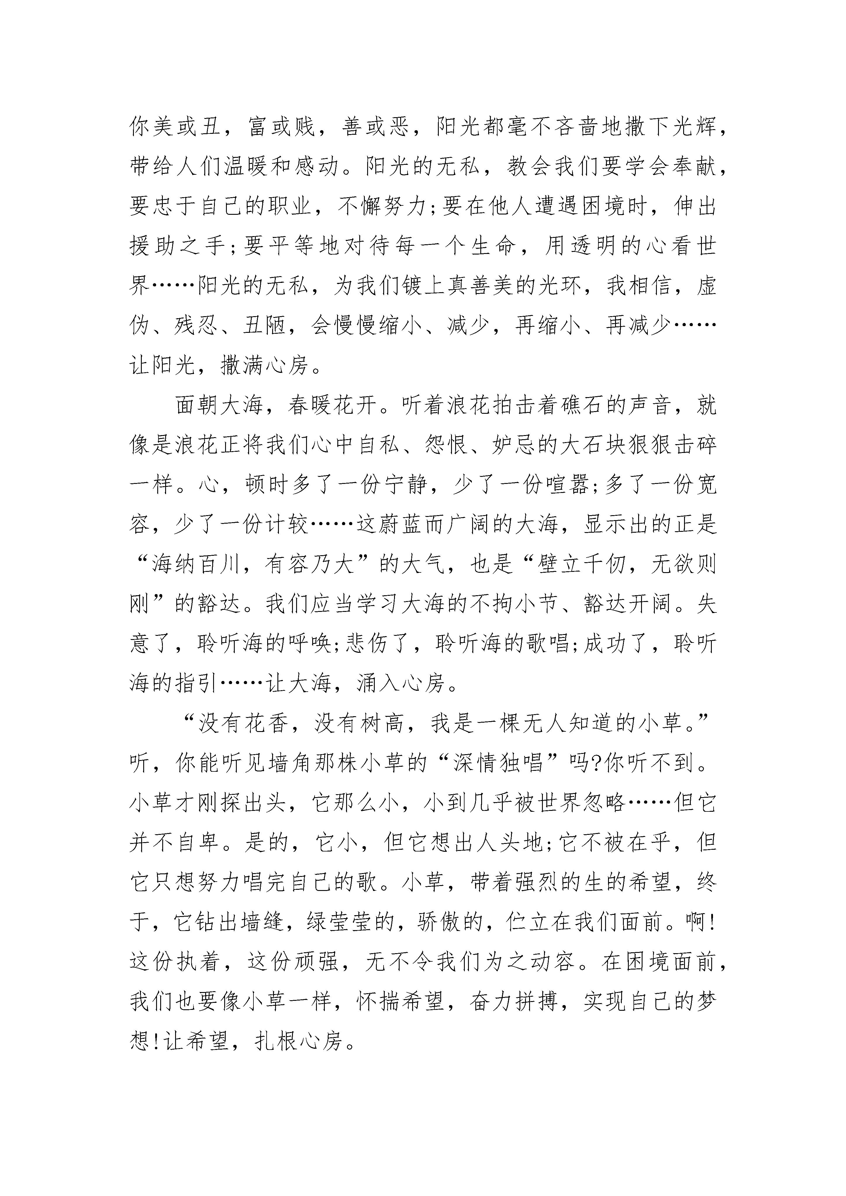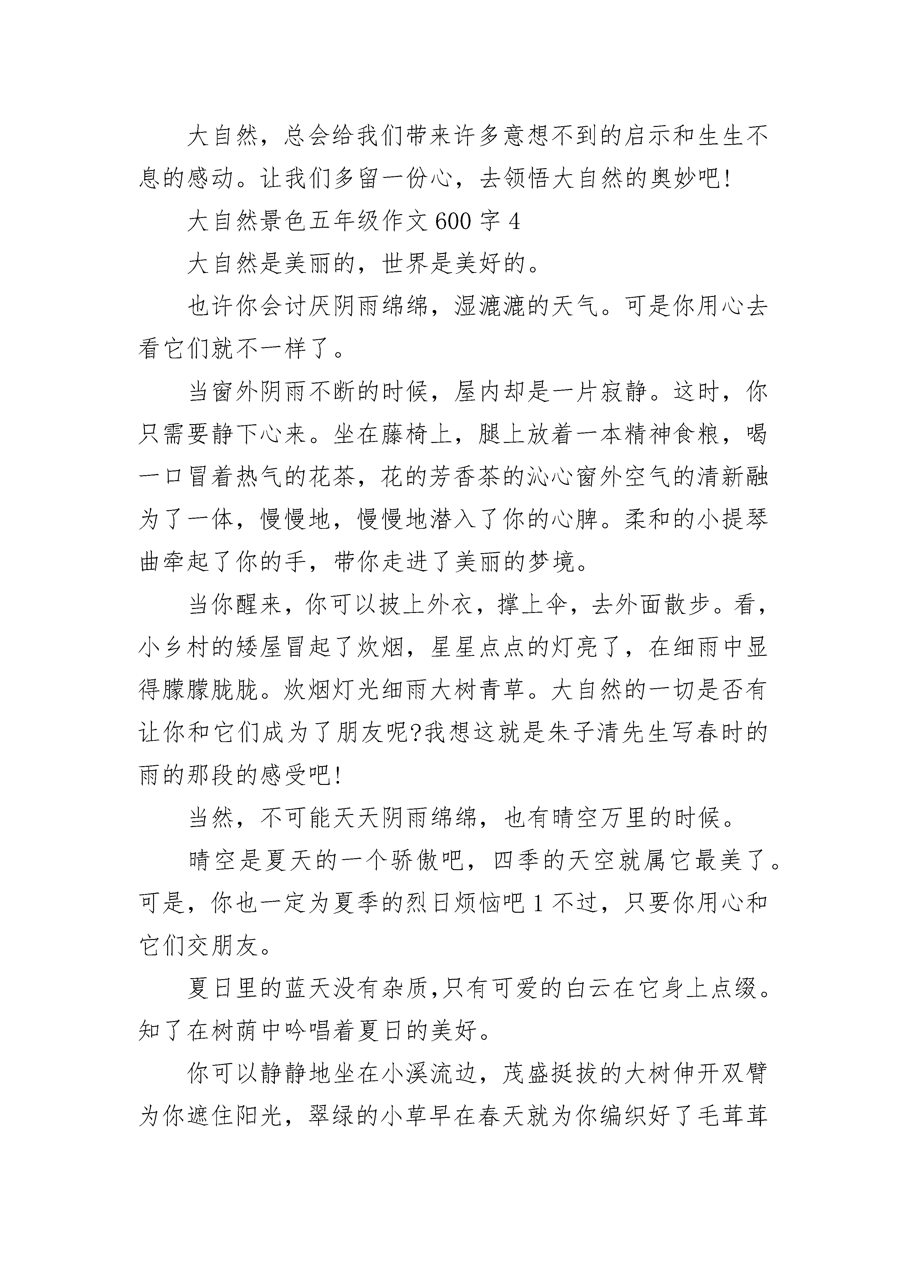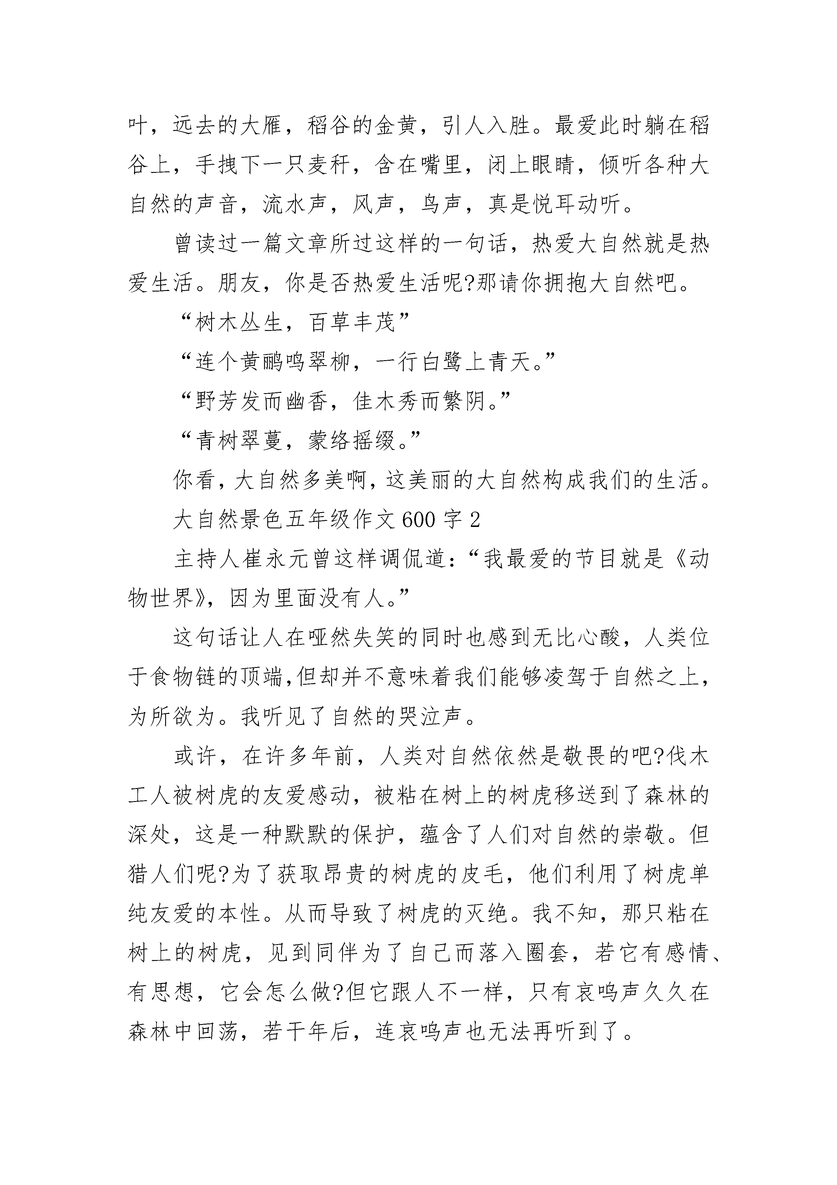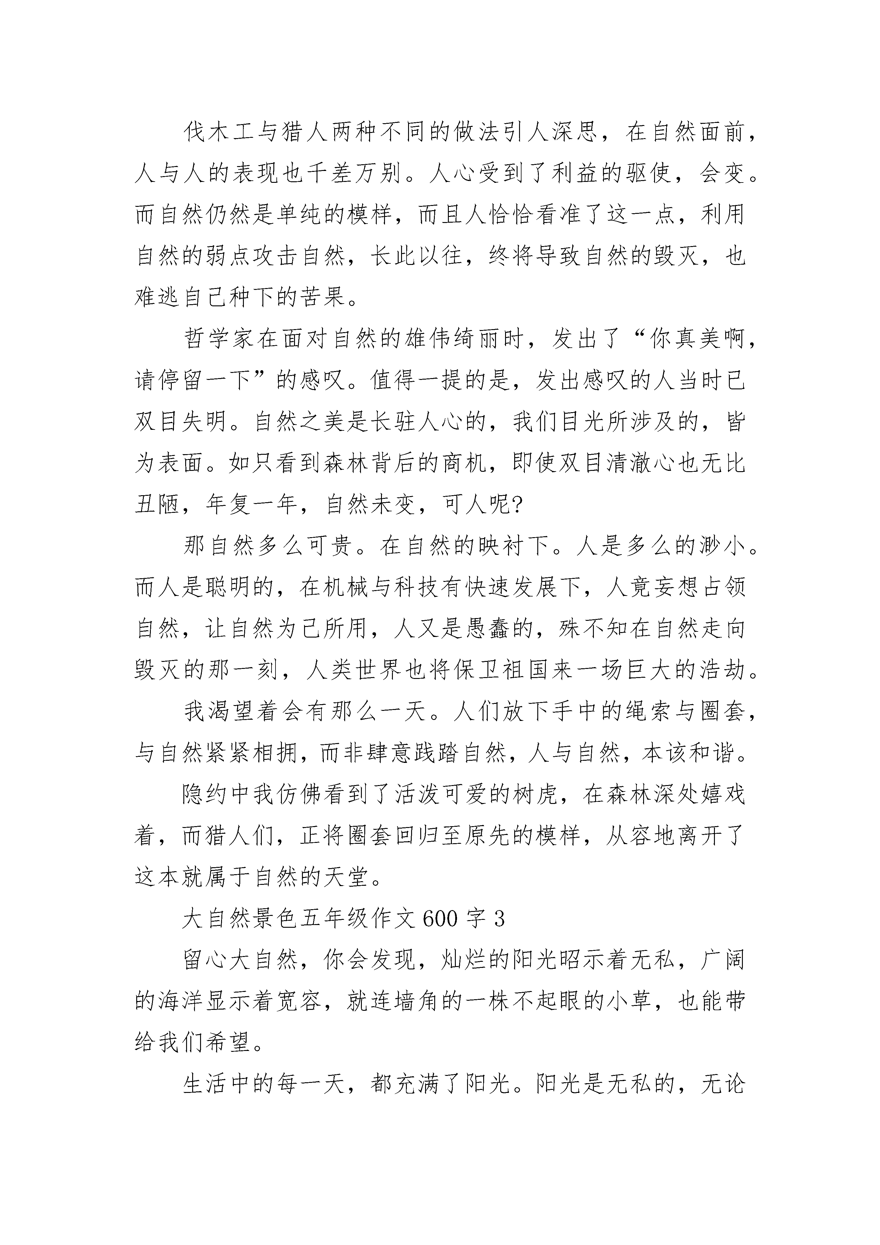大自然景色五年级作文600字范文我热爱生活,热爱看书,在字里行间找到我的心灵的归处!它能让我安静下来,但最爱的还是大自然,最想拥抱大自然。大自然千奇百态,有令人叹为观止的名胜古迹,有春夏秋冬的四季幻化,有风雨雷电的自然天气,有形态各异的花草树木,还有霞光等奇妙的景观。我这一辈子,目前仍是没有机会造访大自然的名胜古迹,只得在网上浏览那一张张令人心驰神往的景象,或是一段段视频,不知怎地看着那景象,就如同自己到了另外一个世界,远离了凡间的金戈铁马,追名逐利。在那里,我全身放松,拥抱大自然。六月的天就像下孩子的脸,说变就变,刚才还是晴空万里,一会就阴云密布,暴雨倾盆,我爱雨,特别是淅淅沥沥的小雨,我总是走出房屋,在雨中漫步,观察小草渐渐破土而出,小树渐渐抽出新芽。那淅淅沥沥的小雨像是一首演奏的乐曲,或悠扬,亦或是悲伤,婉转,倾听着他们,感受大自然的脉搏,与她同喜同悲,怡然自得。雨后,站在树下,侧耳倾听,那是鸟儿的欢唱,他们为大自然而欢畅,好一首“好雨知时节,当春乃发生,随风潜入夜,润物细无声”真可谓写得生动形象,淋漓尽致。我爱秋天,不仅仅因为它是一个收获的季节,还有一个更为重要的原因,就是它是四季最美丽的画卷。那满树的枫叶,远去的大雁,稻谷的金黄,引人入胜。最爱此时躺在稻谷上,手拽下一只麦秆,含在嘴里,闭上眼睛,倾听各种大自然的声音,流水声,风声,鸟声,真是悦耳动听。曾读过一篇文章所过这样的一句话,热爱大自然就是热爱生活。朋友,你是否热爱生活呢?那请你拥抱大自然吧。“树木丛生,百草丰茂”“连个黄鹂鸣翠柳,一行白鹭上青天。”“野芳发而幽香,佳木秀而繁阴。”“青树翠蔓,蒙络摇缀。”你看,大自然多美啊,这美丽的大自然构成我们的生活。大自然景色五年级作文600字2主持人崔永元曾这样调侃道:“我最爱的节目就是《动物世界》,因为里面没有人。”这句话让人在哑然失笑的同时也感到无比心酸,人类位于食物链的顶端,但却并不意味着我们能够凌驾于自然之上,为所欲为。我听见了自然的哭泣声。或许,在许多年前,人类对自然依然是敬畏的吧?伐木工人被树虎的友爱感动,被粘在树上的树虎移送到了森林的深处,这是一种默默的保护,蕴含了人们对自然的崇敬。但猎人们呢?为了获取昂贵的树虎的皮毛,他们利用了树虎单纯友爱的本性。从而导致了树虎的灭绝。我不知,那只粘在树上的树虎,见到同伴为了自己而落入圈套,若它有感情、有思想,它会怎么做?但它跟人不一样,只有哀呜声久久在森林中回荡,若干年后,连哀呜声也无法再听到了。伐木工与猎人两种不同的做法引人深思,在自然面前,人与人的表现也千差万别。人心受到了利益的驱使,会变。而自然仍然是单纯的模样,而且人恰恰看准了这一点,利用自然的弱点攻击自然,长此以往,终将导致自然的毁灭,也难逃自己种下的苦果。哲学家在面对自然的雄伟绮丽时,发出了“你真美啊,请停留一下”的感叹。值得一提的是,发出感叹的人当时已双目失明。自然之美是长驻人心的,我们目光所涉及的,皆为表面。如只看到森林背后的商机,即使双目清澈心也无比丑陋,年复一年,自然未变,可人呢?那自然多么可贵。在自然的映衬下。人是多么的渺小。而人是聪明的,在机械与科技有快速发展下,人竟妄想占领自然,让自然为己所用,人又是愚蠢的,殊不知在自然走向毁灭的那一刻,人类世界也将保卫祖国来一场巨大的浩劫。我渴望着会有那么一天。人们放下手中的绳索与圈套,与自然紧紧相拥,而非肆意践踏自然,人与自然,本该和谐。隐约中我仿佛看到了活泼可爱的树虎,在森林深处嬉戏着,而猎人们,正将圈套回归至原先的模样,从容地离开了这本就属于自然的天堂。大自然景色五年级作文600字3留心大自然,你会发现,灿烂的阳光昭示着无私,广阔的海洋显示着宽容,就连墙角的一株不起眼的小草,也能带给我们希望。生活中的每一天,都充满了阳光。阳光是无私的,无论你美或丑,富或贱,善或恶,阳光都毫不吝啬地撒下光辉,带给人们温暖和感动。阳光的无私,教会我们要学会奉献,要忠于自己的职业,不懈努力;要在他人遭遇困境时,伸出援助之手;要平等地对待每一个生命,用透明的心看世界……阳光的无私,为我们镀上真善美的光环,我相信,虚伪、残忍、丑陋,会慢慢缩小、减少,再缩小、再减少……让阳光,撒满心房。面朝大海,春暖花开。听着浪花拍击着礁石的声音,就像是浪花正将我们心中自私、怨恨、妒忌的大石块狠狠击碎一样。心,顿时多了一份宁静,少了一份喧嚣;多了一份宽容,少了一份计较……这蔚蓝而广阔的大海,显示出的正是“海纳百川,有容乃大”的大气,也是“壁立千仞,无欲则刚”的豁达。我们应当学习大海的不拘小节、豁达开阔。失意了,聆听海的呼唤;悲伤了,聆听海的歌唱;成功了,聆听海的指引……让大海,涌入心房。“没有花香,没有树高,我是一棵无人知道的小草。”听,你能听见墙角那株小草的“深情独唱”吗?你听不到。小草才刚探