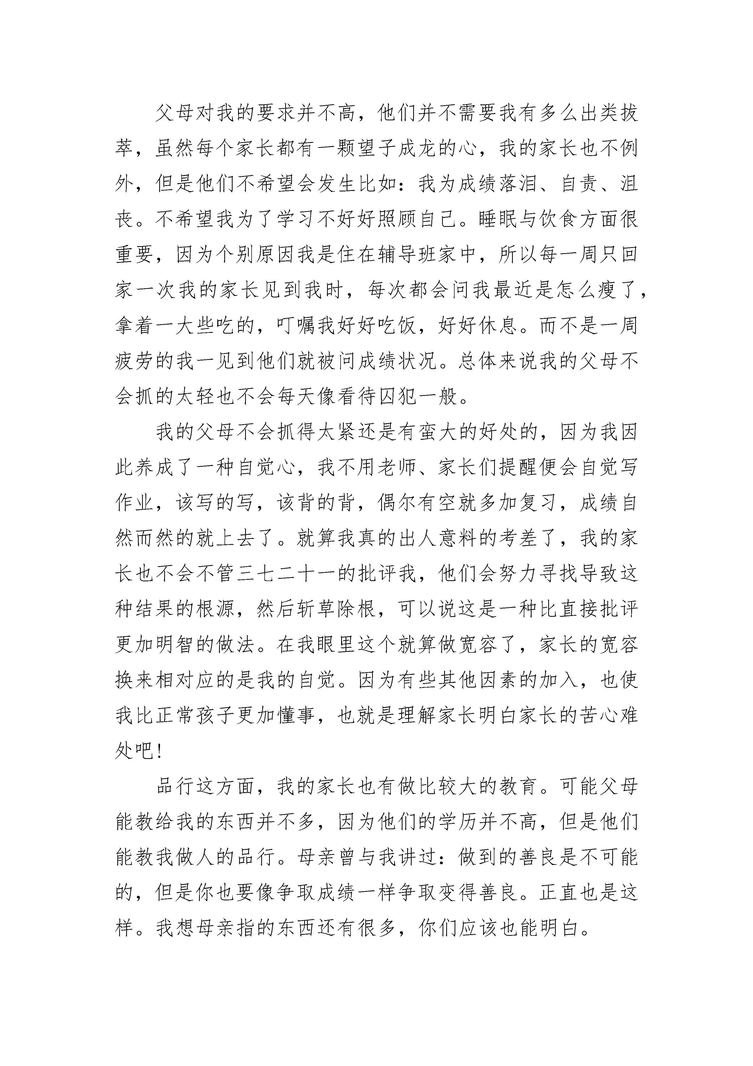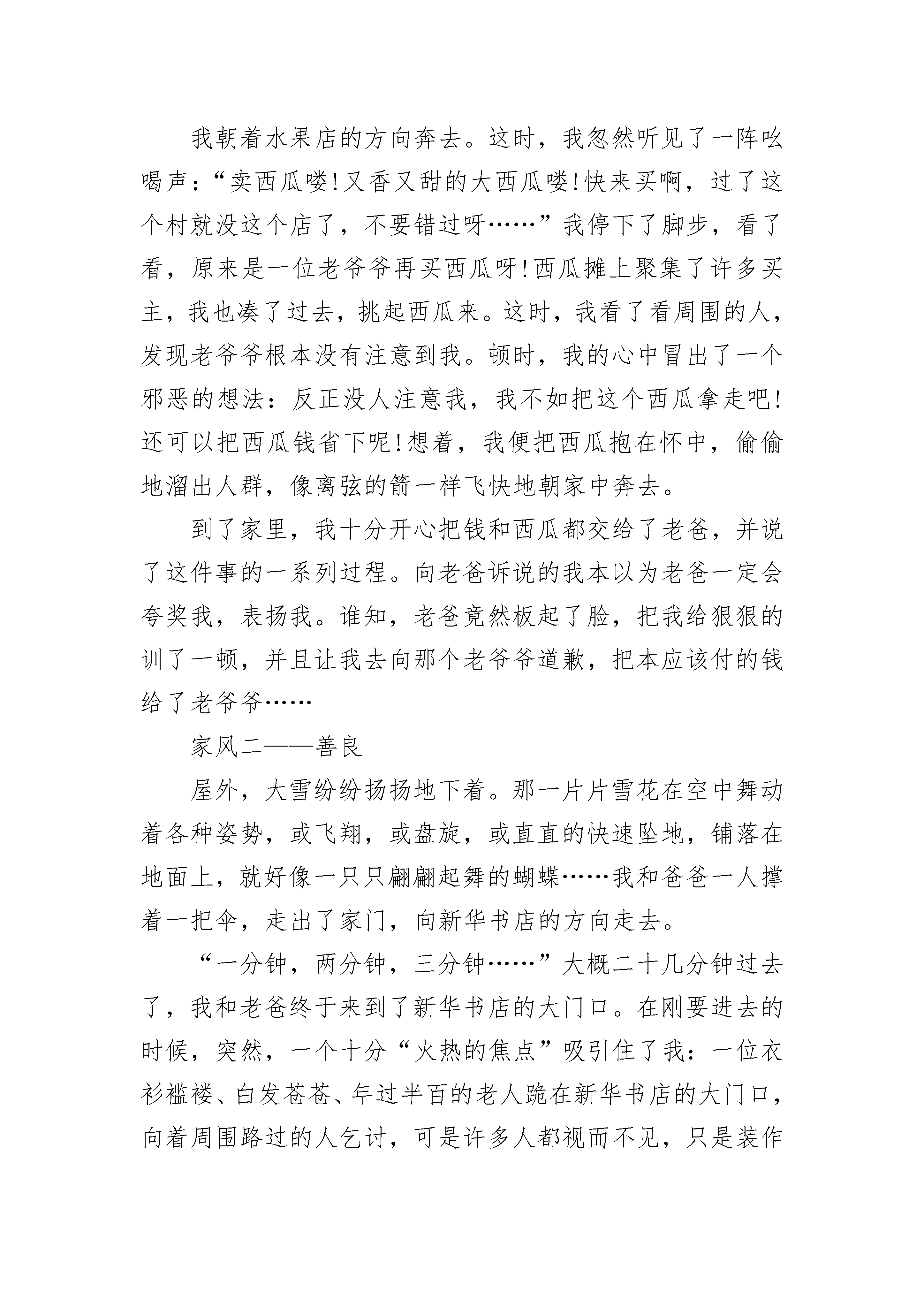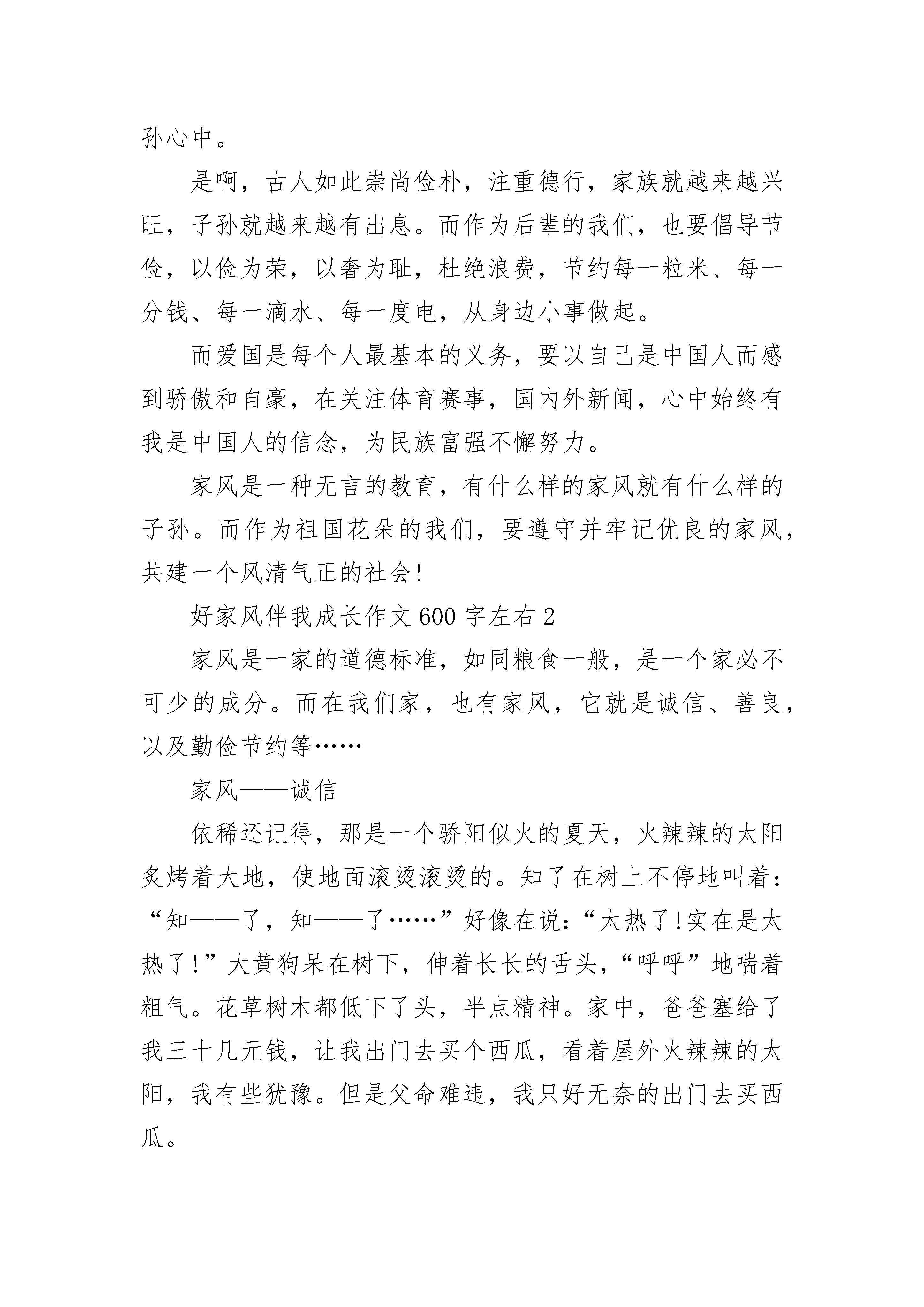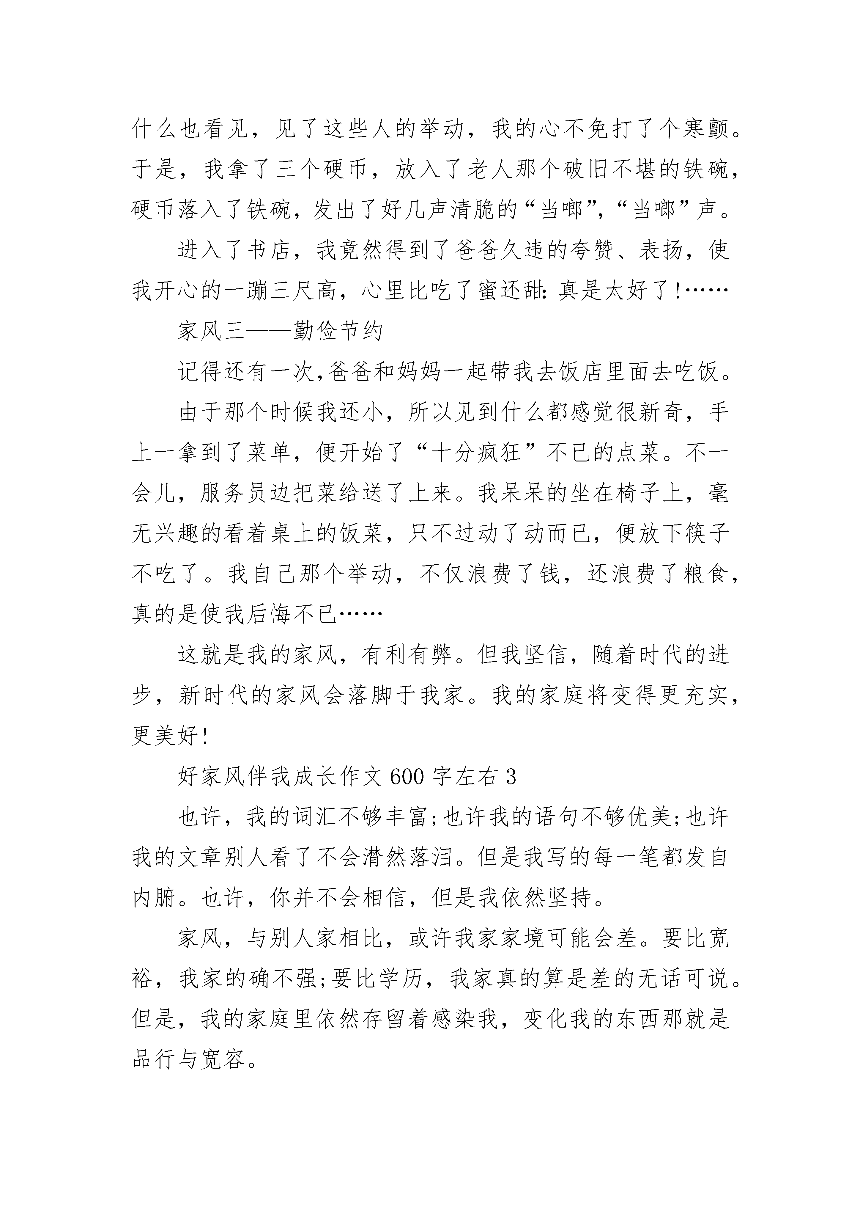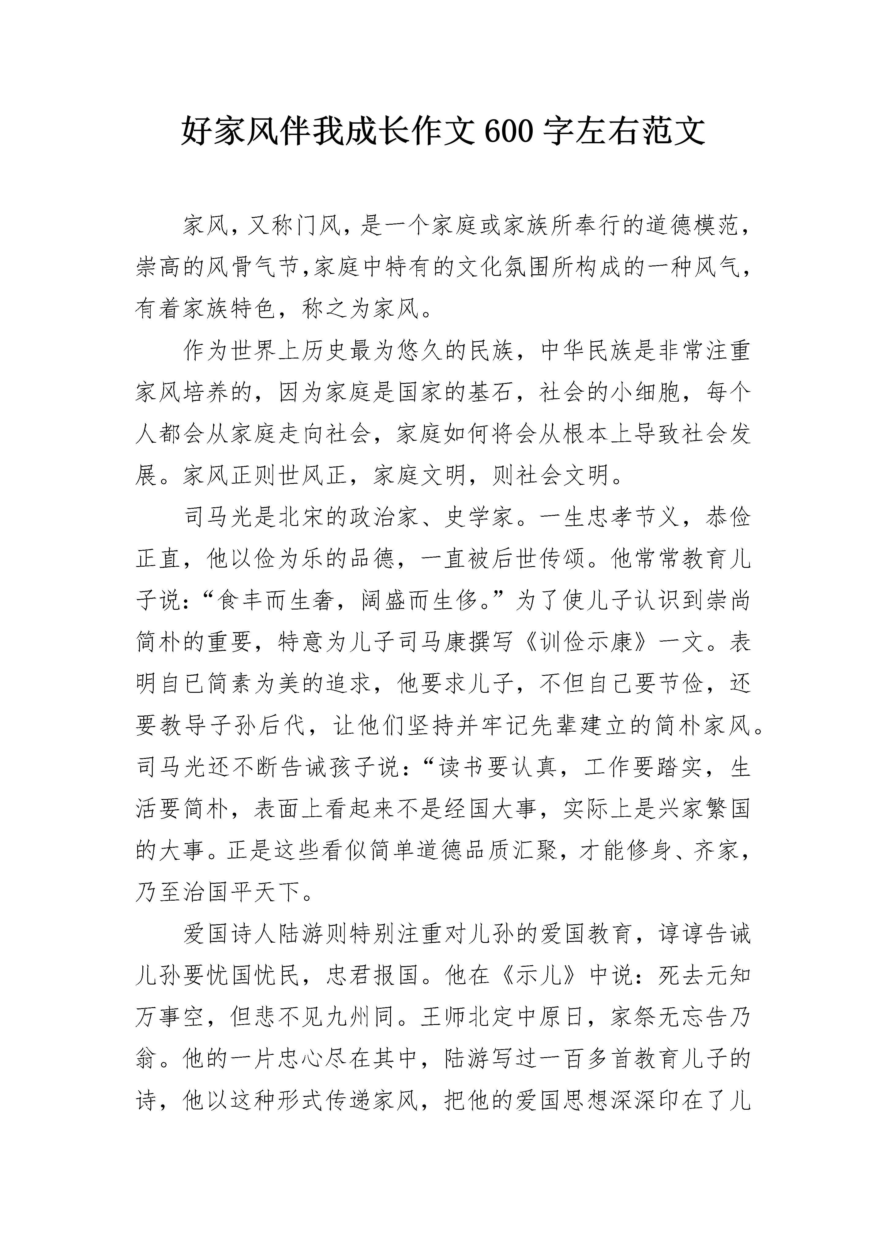 好家风伴我成长作文600字左右范文家风,又称门风,是一个家庭或家族所奉行的道德模范,崇高的风骨气节,家庭中特有的文化氛围所构成的一种风气,有着家族特色,称之为家风。作为世界上历史最为悠久的民族,中华民族是非常注重家风培养的,因为家庭是国家的基石,社会的小细胞,每个人都会从家庭走向社会,家庭如何将会从根本上导致社会发展。家风正则世风正,家庭文明,则社会文明。司马光是北宋的政治家、史学家。一生忠孝节义,恭俭正直,他以俭为乐的品德,一直被后世传颂。他常常教育儿子说:“食丰而生奢,阔盛而生侈。”为了使儿子认识到崇尚简朴的重要,特意为儿子司马康撰写《训俭示康》一文。表明自已简素为美的追求,他要求儿子,不但自己要节俭,还要教导子孙后代,让他们坚持并牢记先辈建立的简朴家风。司马光还不断告诫孩子说:“读书要认真,工作要踏实,生活要简朴,表面上看起来不是经国大事,实际上是兴家繁国的大事。正是这些看似简单道德品质汇聚,才能修身、齐家,乃至治国平天下。爱国诗人陆游则特别注重对儿孙的爱国教育,谆谆告诫儿孙要忧国忧民,忠君报国。他在《示儿》中说:死去元知万事空,但悲不见九州同。王师北定中原日,家祭无忘告乃翁。他的一片忠心尽在其中,陆游写过一百多首教育儿子的诗,他以这种形式传递家风,把他的爱国思想深深印在了儿孙心中。是啊,古人如此崇尚俭朴,注重德行,家族就越来越兴旺,子孙就越来越有出息。而作为后辈的我们,也要倡导节俭,以俭为荣,以奢为耻,杜绝浪费,节约每一粒米、每一分钱、每一滴水、每一度电,从身边小事做起。而爱国是每个人最基本的义务,要以自己是中国人而感到骄傲和自豪,在关注体育赛事,国内外新闻,心中始终有我是中国人的信念,为民族富强不懈努力。家风是一种无言的教育,有什么样的家风就有什么样的子孙。而作为祖国花朵的我们,要遵守并牢记优良的家风,共建一个风清气正的社会!好家风伴我成长作文600字左右2家风是一家的道德标准,如同粮食一般,是一个家必不可少的成分。而在我们家,也有家风,它就是诚信、善良,以及勤俭节约等……家风——诚信依稀还记得,那是一个骄阳似火的夏天,火辣辣的太阳炙烤着大地,使地面滚烫滚烫的。知了在树上不停地叫着:“知——了,知——了……”好像在说:“太热了!实在是太热了!”大黄狗呆在树下,伸着长长的舌头,“呼呼”地喘着粗气。花草树木都低下了头,半点精神。家中,爸爸塞给了我三十几元钱,让我出门去买个西瓜,看着屋外火辣辣的太阳,我有些犹豫。但是父命难违,我只好无奈的出门去买西瓜。我朝着水果店的方向奔去。这时,我忽然听见了一阵吆喝声:“卖西瓜喽!又香又甜的大西瓜喽!快来买啊,过了这个村就没这个店了,不要错过呀……”我停下了脚步,看了看,原来是一位老爷爷再买西瓜呀!西瓜摊上聚集了许多买主,我也凑了过去,挑起西瓜来。这时,我看了看周围的人,发现老爷爷根本没有注意到我。顿时,我的心中冒出了一个邪恶的想法:反正没人注意我,我不如把这个西瓜拿走吧!还可以把西瓜钱省下呢!想着,我便把西瓜抱在怀中,偷偷地溜出人群,像离弦的箭一样飞快地朝家中奔去。到了家里,我十分开心把钱和西瓜都交给了老爸,并说了这件事的一系列过程。向老爸诉说的我本以为老爸一定会夸奖我,表扬我。谁知,老爸竟然板起了脸,把我给狠狠的训了一顿,并且让我去向那个老爷爷道歉,把本应该付的钱给了老爷爷……家风二——善良屋外,大雪纷纷扬扬地下着。那一片片雪花在空中舞动着各种姿势,或飞翔,或盘旋,或直直的快速坠地,铺落在地面上,就好像一只只翩翩起舞的蝴蝶……我和爸爸一人撑着一把伞,走出了家门,向新华书店的方向走去。“一分钟,两分钟,三分钟……”大概二十几分钟过去了,我和老爸终于来到了新华书店的大门口。在刚要进去的时候,突然,一个十分“火热的焦点”吸引住了我:一位衣衫褴褛、白发苍苍、年过半百的老人跪在新华书店的大门口,向着周围路过的人乞讨,可是许多人都视而不见,只是装作什么也看见,见了这些人的举动,我的心不免打了个寒颤。于是,我拿了三个硬币,放入了老人那个破旧不堪的铁碗,硬币落入了铁碗,发出了好几声清脆的“当啷”,“当啷”声。进入了书店,我竟然得到了爸爸久违的夸赞、表扬,使我开心的一蹦三尺高,心里比吃了蜜还甜:真是太好了!……家风三——勤俭节约记得还有一次,爸爸和妈妈一起带我去饭店里面去吃饭。由于那个时候我还小,所以见到什么都感觉很新奇,手上一拿到了菜单,便开始了“十分疯狂”不已的点菜。不一会儿,服务员边把菜给送了上来。我呆呆的坐在椅子上,毫无兴趣的看着桌上的饭菜,只不过动了动而已,便放下筷子不吃了。我自己那个举动,不仅浪费了钱,还浪费了粮食,真的是使我后悔不已……这就是我的家风,有利有弊。但我坚信,随着时代的进步,新时代的家风会落脚于我家。我的家庭将变得更充实,更美好!好家风伴我成长作文600字左右3也许,我的