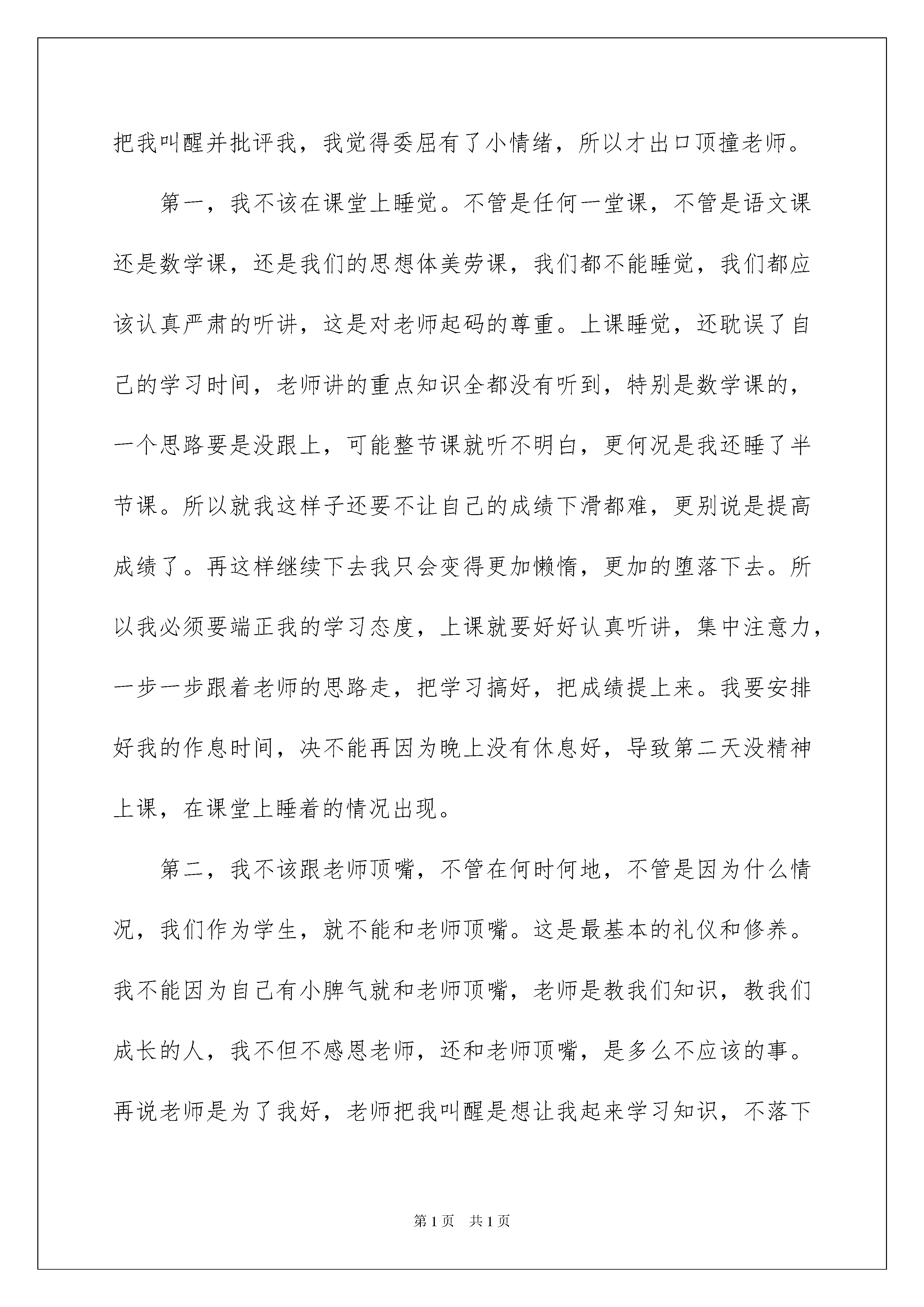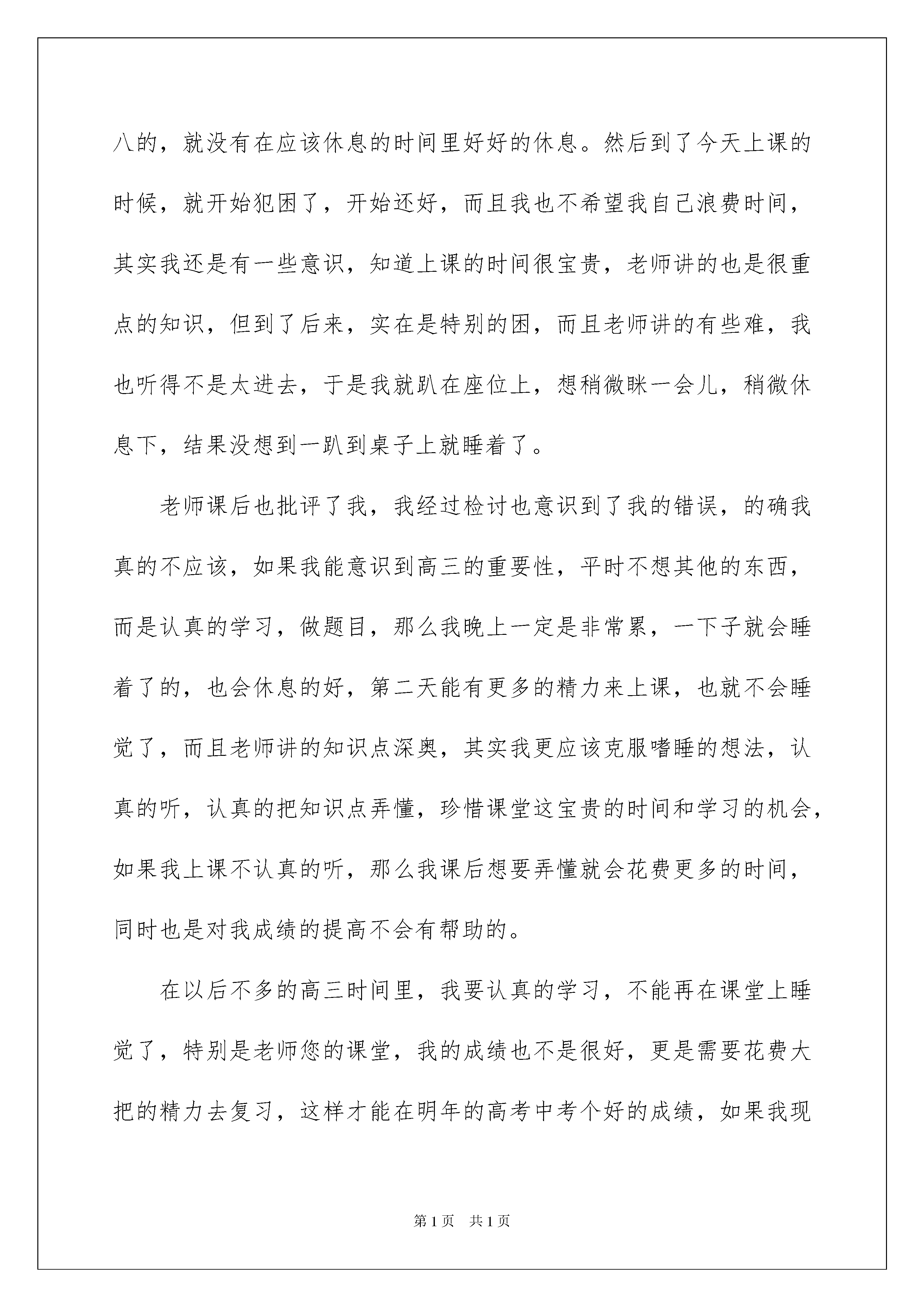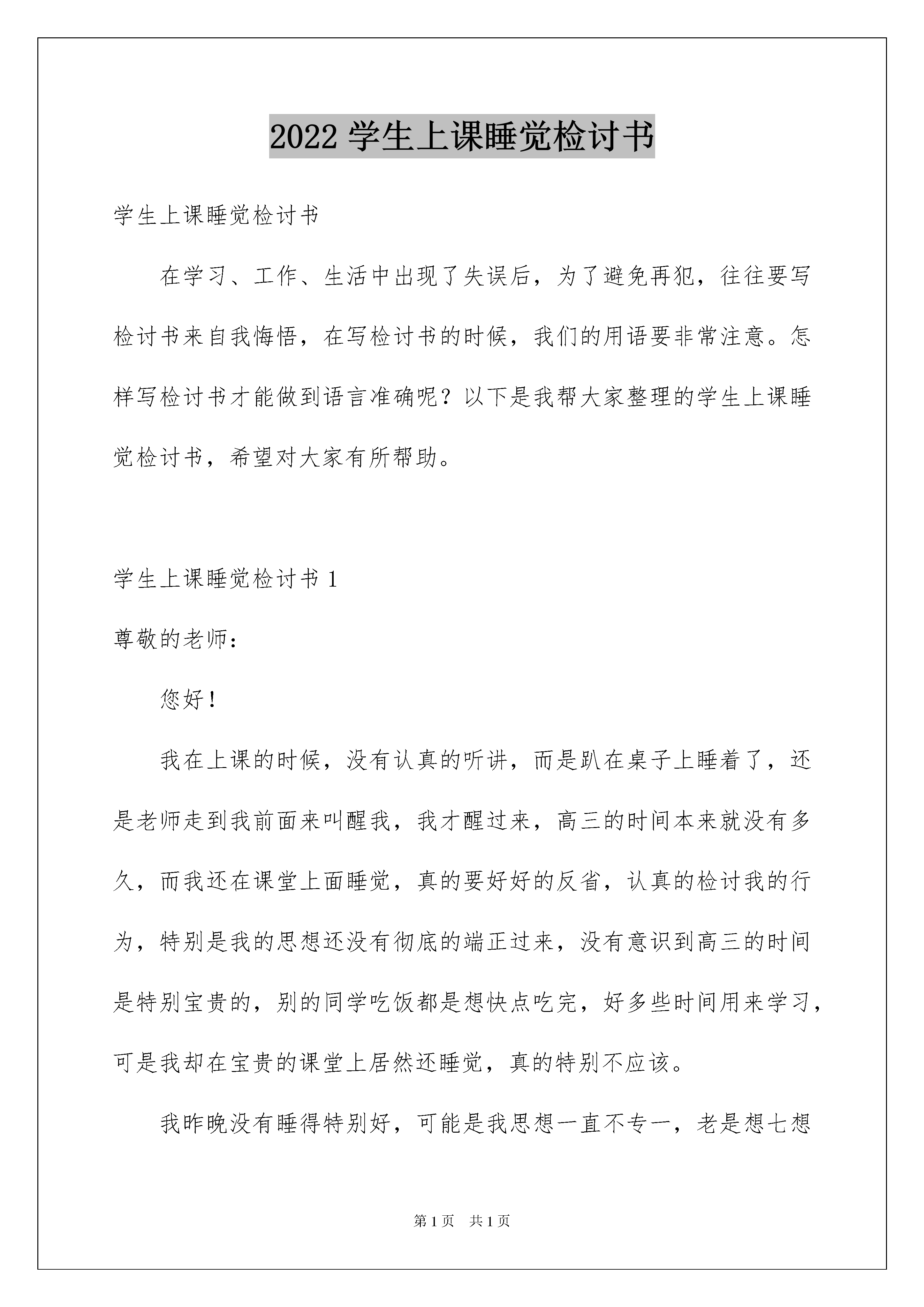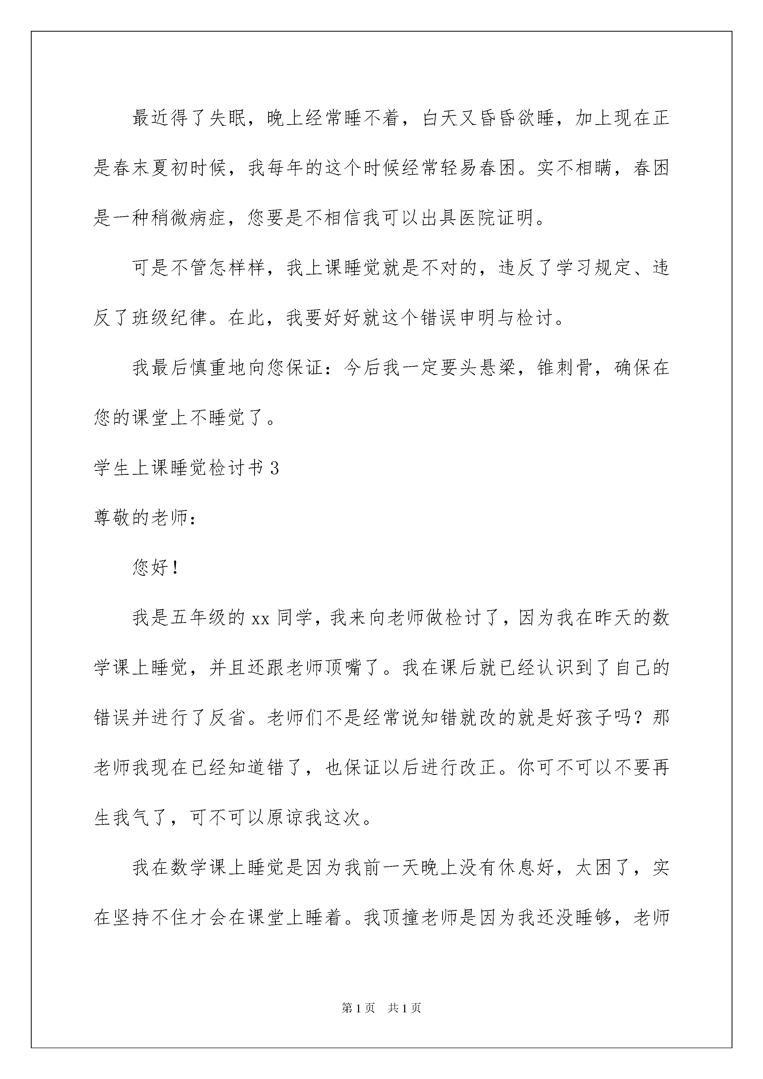 2022学生上课睡觉检讨书学生上课睡觉检讨书在学习、工作、生活中出现了失误后,为了避免再犯,往往要写检讨书来自我悔悟,在写检讨书的时候,我们的用语要非常注意。怎样写检讨书才能做到语言准确呢?以下是我帮大家整理的学生上课睡觉检讨书,希望对大家有所帮助。学生上课睡觉检讨书1尊敬的老师:您好!我在上课的时候,没有认真的听讲,而是趴在桌子上睡着了,还是老师走到我前面来叫醒我,我才醒过来,高三的时间本来就没有多久,而我还在课堂上面睡觉,真的要好好的反省,认真的检讨我的行为,特别是我的思想还没有彻底的端正过来,没有意识到高三的时间是特别宝贵的,别的同学吃饭都是想快点吃完,好多些时间用来学习,可是我却在宝贵的课堂上居然还睡觉,真的特别不应该。我昨晚没有睡得特别好,可能是我思想一直不专一,老是想七想八的,就没有在应该休息的时间里好好的休息。然后到了今天上课的时候,就开始犯困了,开始还好,而且我也不希望我自己浪费时间,其实我还是有一些意识,知道上课的时间很宝贵,老师讲的也是很重点的知识,但到了后来,实在是特别的困,而且老师讲的有些难,我也听得不是太进去,于是我就趴在座位上,想稍微眯一会儿,稍微休息下,结果没想到一趴到桌子上就睡着了。老师课后也批评了我,我经过检讨也意识到了我的错误,的确我真的不应该,如果我能意识到高三的重要性,平时不想其他的东西,而是认真的学习,做题目,那么我晚上一定是非常累,一下子就会睡着了的,也会休息的好,第二天能有更多的精力来上课,也就不会睡觉了,而且老师讲的知识点深奥,其实我更应该克服嗜睡的想法,认真的听,认真的把知识点弄懂,珍惜课堂这宝贵的时间和学习的机会,如果我上课不认真的听,那么我课后想要弄懂就会花费更多的时间,同时也是对我成绩的提高不会有帮助的。在以后不多的高三时间里,我要认真的学习,不能再在课堂上睡觉了,特别是老师您的课堂,我的成绩也不是很好,更是需要花费大把的精力去复习,这样才能在明年的高考中考个好的成绩,如果我现在就不认真,不努力的话,那么也是对自己不住,我有这么多的时间,真的要好好的去珍惜,去把握住。老师,我会把成绩搞好,认真的做好复习的,也请老师相信我,我真的意识到了我的错误,不会再犯了,更是要对自己负责,不能把有限的时间浪费在那些没有任何意义的事情上面了。此致敬礼!检讨人:xxx20xx年x月x日学生上课睡觉检讨书2尊敬的化学老师:关于我在上课睡觉的事情,在此递交我的检讨,以深入我的错误行为。对我的行为给您酿成的影响,给班级同学建立的不良范例,在此向您们致以深深的歉意与非常的愧意。20xx年4月17日我在您的课堂上呼呼大睡也就罢了,期间我还发出了几声嗷嗷嗷的呼声,直接引得班级哄堂大笑,严重地影响了您的课堂教课最近得了失眠,晚上经常睡不着,白天又昏昏欲睡,加上现在正是春末夏初时候,我每年的这个时候经常轻易春困。实不相瞒,春困是一种稍微病症,您要是不相信我可以出具医院证明。可是不管怎样样,我上课睡觉就是不对的,违反了学习规定、违反了班级纪律。在此,我要好好就这个错误申明与检讨。我最后慎重地向您保证:今后我一定要头悬梁,锥刺骨,确保在您的课堂上不睡觉了。学生上课睡觉检讨书3尊敬的老师:您好!我是五年级的xx同学,我来向老师做检讨了,因为我在昨天的数学课上睡觉,并且还跟老师顶嘴了。我在课后就已经认识到了自己的错误并进行了反省。老师们不是经常说知错就改的就是好孩子吗?那老师我现在已经知道错了,也保证以后进行改正。你可不可以不要再生我气了,可不可以原谅我这次。我在数学课上睡觉是因为我前一天晚上没有休息好,太困了,实在坚持不住才会在课堂上睡着。我顶撞老师是因为我还没睡够,老师把我叫醒并批评我,我觉得委屈有了小情绪,所以才出口顶撞老师。第一,我不该在课堂上睡觉。不管是任何一堂课,不管是语文课还是数学课,还是我们的思想体美劳课,我们都不能睡觉,我们都应该认真严肃的听讲,这是对老师起码的尊重。上课睡觉,还耽误了自己的学习时间,老师讲的重点知识全都没有听到,特别是数学课的,一个思路要是没跟上,可能整节课就听不明白,更何况是我还睡了半节课。所以就我这样子还要不让自己的成绩下滑都难,更别说是提高成绩了。再这样继续下去我只会变得更加懒惰,更加的堕落下去。所以我必须要端正我的学习态度,上课就要好好认真听讲,集中注意力,一步一步跟着老师的思路走,把学习搞好,把成绩提上来。我要安排好我的作息时间,决不能再因为晚上没有休息好,导致第二天没精神上课,在课堂上睡着的情况出现。第二,我不该跟老师顶嘴,不管在何时何地,不管是因为什么情况,我们作为学生,就不能和老师顶嘴。这是最基本的礼仪和修