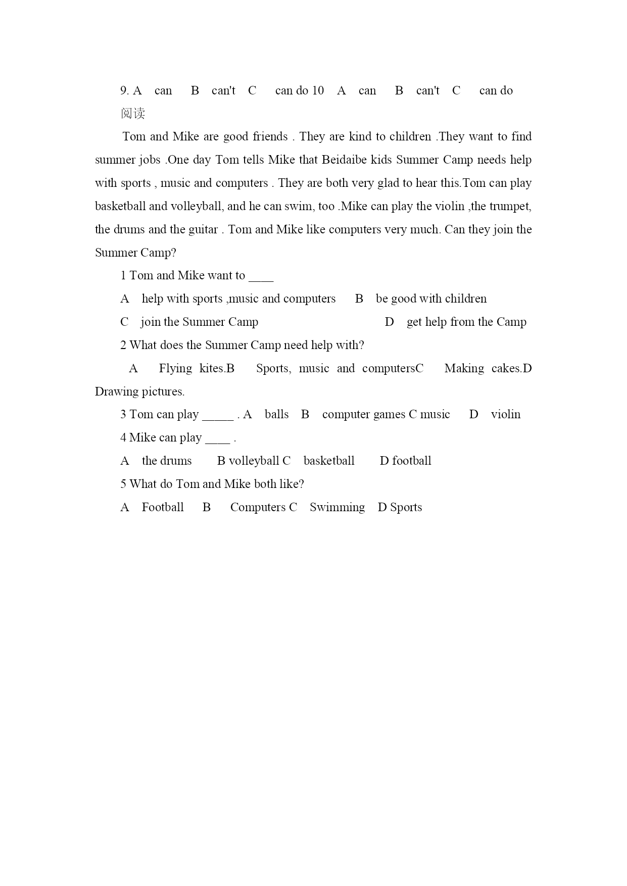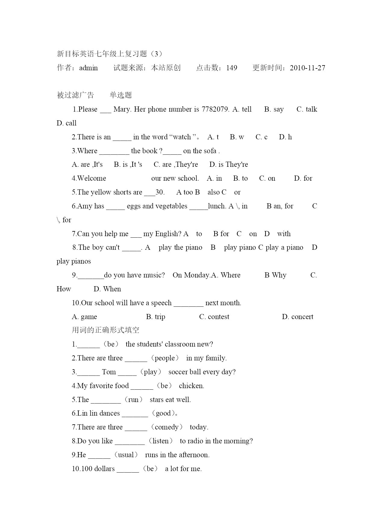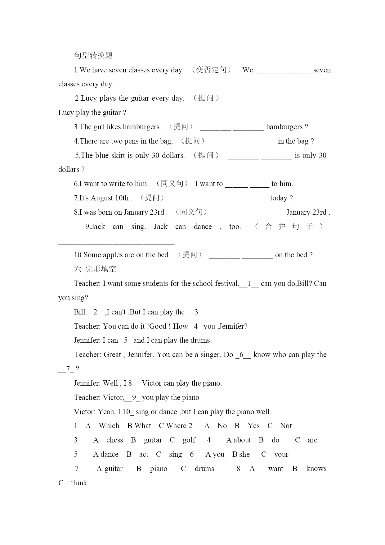新目标英语七年级上复习题(3)作者:admin试题来源:本站原创点击数:149更新时间:2010-11-27被过滤广告单选题1.Please___Mary.Herphonenumberis7782079.A.tellB.sayC.talkD.call2.Thereisan_____intheword“watch”。A.tB.wC.cD.h3.Where________thebook?_____onthesofa.A.are,It'sB.is,It'sC.are,They'reD.isThey're4.Welcomeournewschool.A.inB.toC.onD.for5.Theyellowshortsare___30.AtooBalsoCor6.Amyhas_____eggsandvegetables_____lunch.A\,inBan,forC\,for7.Canyouhelpme___myEnglish?AtoBforConDwith8.Theboycan't_____.AplaythepianoBplaypianoCplayapianoDplaypianos9._______doyouhavemusic?OnMonday.A.WhereBWhyC.HowD.When10.Ourschoolwillhaveaspeech________nextmonth.A.gameB.tripC.contestD.concert用词的正确形式填空1.______(be)thestudents'classroomnew?2.Therearethree______(people)inmyfamily.3.______Tom_____(play)soccerballeveryday?4.Myfavoritefood______(be)chicken.5.The________(run)starseatwell.6.Linlindances_______(good)。7.Therearethree______(comedy)today.8.Doyoulike________(listen)toradiointhemorning?9.He______(usual)runsintheafternoon.10.100dollars______(be)alotforme.句型转换题1.Wehavesevenclasseseveryday.(变否定句)We______________sevenclasseseveryday.2.Lucyplaystheguitareveryday.(提问)________________________Lucyplaytheguitar?3.Thegirllikeshamburgers.(提问)________________hamburgers?4.Therearetwopensinthebag.(提问)________________inthebag?5.Theblueskirtisonly30dollars.(提问)________________isonly30dollars?6.Iwanttowritetohim.(同义句)Iwantto___________tohim.7.It'sAugust10th.(提问)________________________today?8.IwasbornonJanuary23rd.(同义句)________________January23rd.9.Jackcansing.Jackcandance,too.(合并句子)______________________________10.Someapplesareonthebed.(提问)________________onthebed?六完形填空Teacher:Iwantsomestudentsfortheschoolfestival.__1__canyoudo,Bill?Canyousing?Bill:_2__,Ican't.ButIcanplaythe__3_Teacher:Youcandoit!Good!How_4_you,Jennifer?Jennifer:Ican_5_andIcanplaythedrums.Teacher:Great,Jennifer.Youcanbeasinger.Do_6__knowwhocanplaythe__7_?Jennifer:Well,I8__Victorcanplaythepiano.Teacher:Victor,__9_youplaythepianoVictor:Yeah,I10_singordance,butIcanplaythepianowell.1AWhichBWha