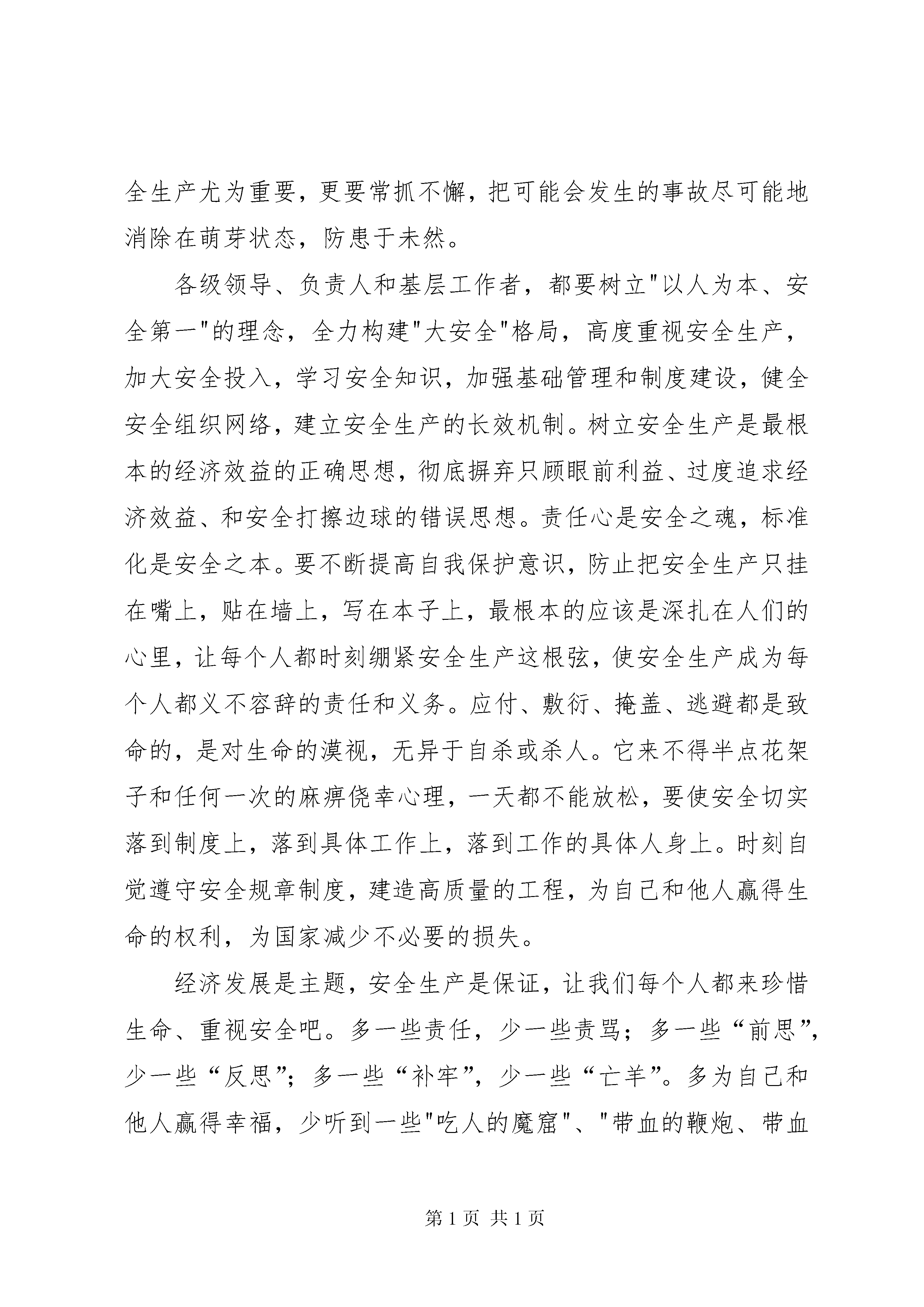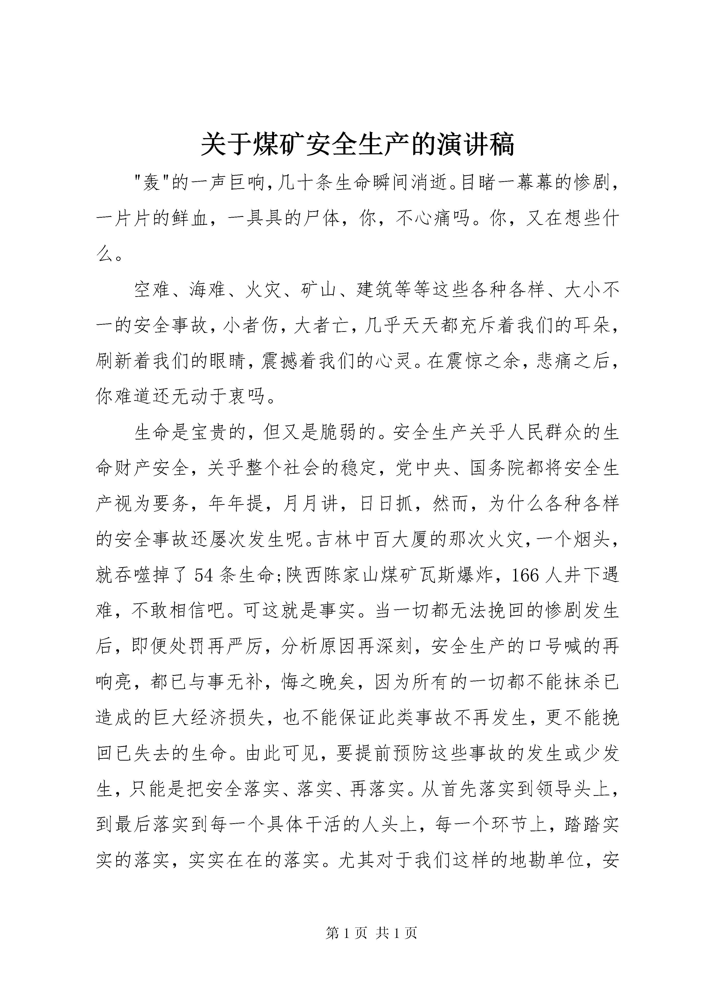 关于煤矿安全生产的演讲稿"轰"的一声巨响,几十条生命瞬间消逝。目睹一幕幕的惨剧,一片片的鲜血,一具具的尸体,你,不心痛吗。你,又在想些什么。空难、海难、火灾、矿山、建筑等等这些各种各样、大小不一的安全事故,小者伤,大者亡,几乎天天都充斥着我们的耳朵,刷新着我们的眼睛,震撼着我们的心灵。在震惊之余,悲痛之后,你难道还无动于衷吗。生命是宝贵的,但又是脆弱的。安全生产关乎人民群众的生命财产安全,关乎整个社会的稳定,党中央、国务院都将安全生产视为要务,年年提,月月讲,日日抓,然而,为什么各种各样的安全事故还屡次发生呢。吉林中百大厦的那次火灾,一个烟头,就吞噬掉了54条生命;陕西陈家山煤矿瓦斯爆炸,166人井下遇难,不敢相信吧。可这就是事实。当一切都无法挽回的惨剧发生后,即便处罚再严厉,分析原因再深刻,安全生产的口号喊的再响亮,都已与事无补,悔之晚矣,因为所有的一切都不能抹杀已造成的巨大经济损失,也不能保证此类事故不再发生,更不能挽回已失去的生命。由此可见,要提前预防这些事故的发生或少发生,只能是把安全落实、落实、再落实。从首先落实到领导头上,到最后落实到每一个具体干活的人头上,每一个环节上,踏踏实实的落实,实实在在的落实。尤其对于我们这样的地勘单位,安全生产尤为重要,更要常抓不懈,把可能会发生的事故尽可能地消除在萌芽状态,防患于未然。各级领导、负责人和基层工作者,都要树立"以人为本、安全第一"的理念,全力构建"大安全"格局,高度重视安全生产,加大安全投入,学习安全知识,加强基础管理和制度建设,健全安全组织网络,建立安全生产的长效机制。树立安全生产是最根本的经济效益的正确思想,彻底摒弃只顾眼前利益、过度追求经济效益、和安全打擦边球的错误思想。责任心是安全之魂,标准化是安全之本。要不断提高自我保护意识,防止把安全生产只挂在嘴上,贴在墙上,写在本子上,最根本的应该是深扎在人们的心里,让每个人都时刻绷紧安全生产这根弦,使安全生产成为每个人都义不容辞的责任和义务。应付、敷衍、掩盖、逃避都是致命的,是对生命的漠视,无异于自杀或杀人。它来不得半点花架子和任何一次的麻痹侥幸心理,一天都不能放松,要使安全切实落到制度上,落到具体工作上,落到工作的具体人身上。时刻自觉遵守安全规章制度,建造高质量的工程,为自己和他人赢得生命的权利,为国家减少不必要的损失。经济发展是主题,安全生产是保证,让我们每个人都来珍惜生命、重视安全吧。多一些责任,少一些责骂;多一些“前思”,少一些“反思”;多一些“补牢”,少一些“亡羊”。多为自己和他人赢得幸福,少听到一些"吃人的魔窟"、"带血的鞭炮、带血的煤"之类的消息和"舍得花钱买棺材、不舍得花钱买设备"、"不该发生的事却发生了"的评论。让鞭炮在该响的时候响,煤炭在该出的时候出,在大力发展经济的基础上,切实把安全工作做到前面,搞好预防,努力构建“大、法、网、制、度、化”的六字安全工作格局,用“严、细、分、防、实、恒、全、优”的高标准来严格要求自己,在每个人的心里都筑起一道安全的城墙,以期建立以人为本,珍惜生命,安全第一的人文安全文化体系,开创冶勘一局安全生产工作新局面。“生命无价,责任如山”,看着因为你的负责、因为你的遵章守规而活蹦乱跳的一个个人、而露出的一张张幸福笑脸,你,不欣慰吗。