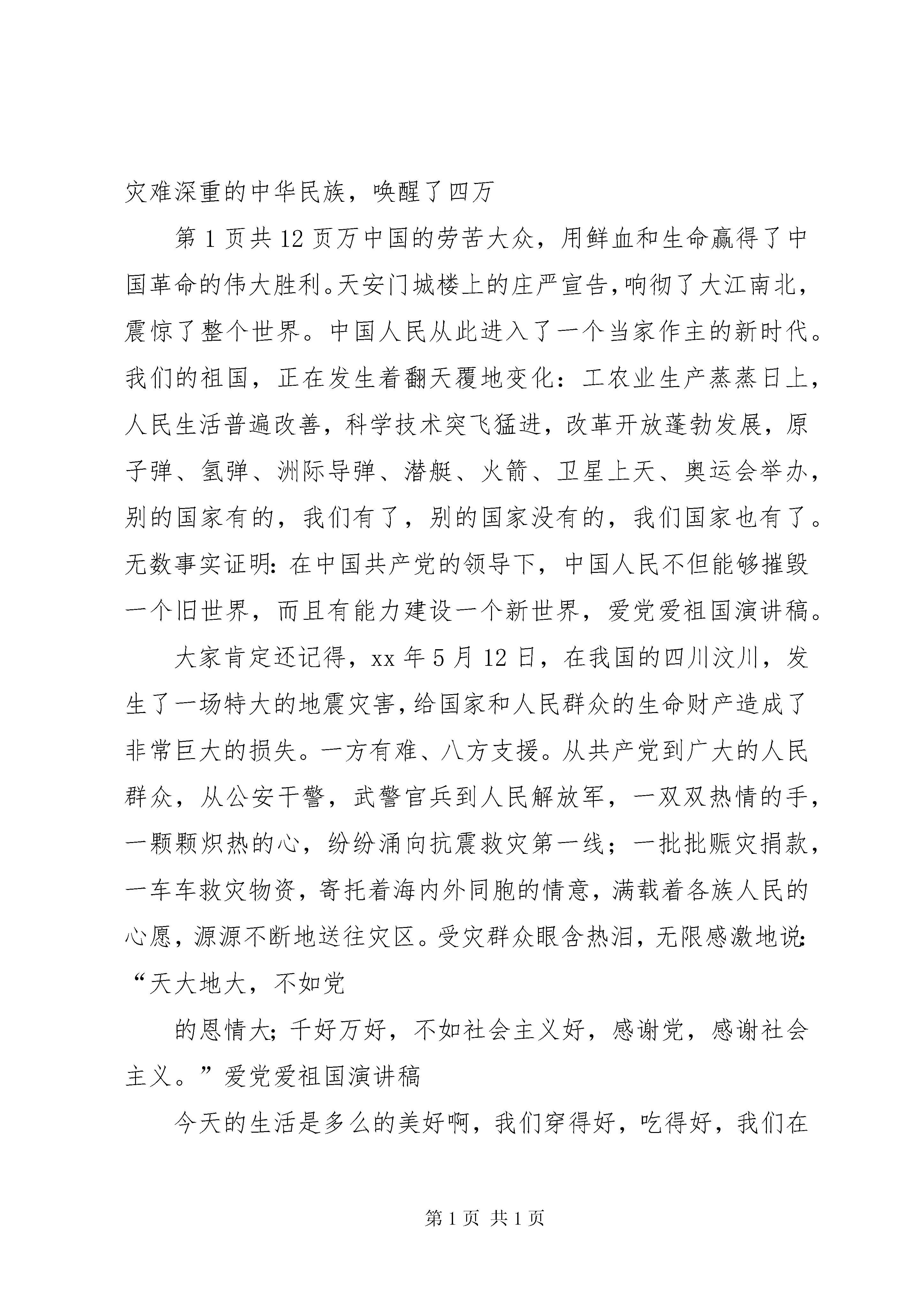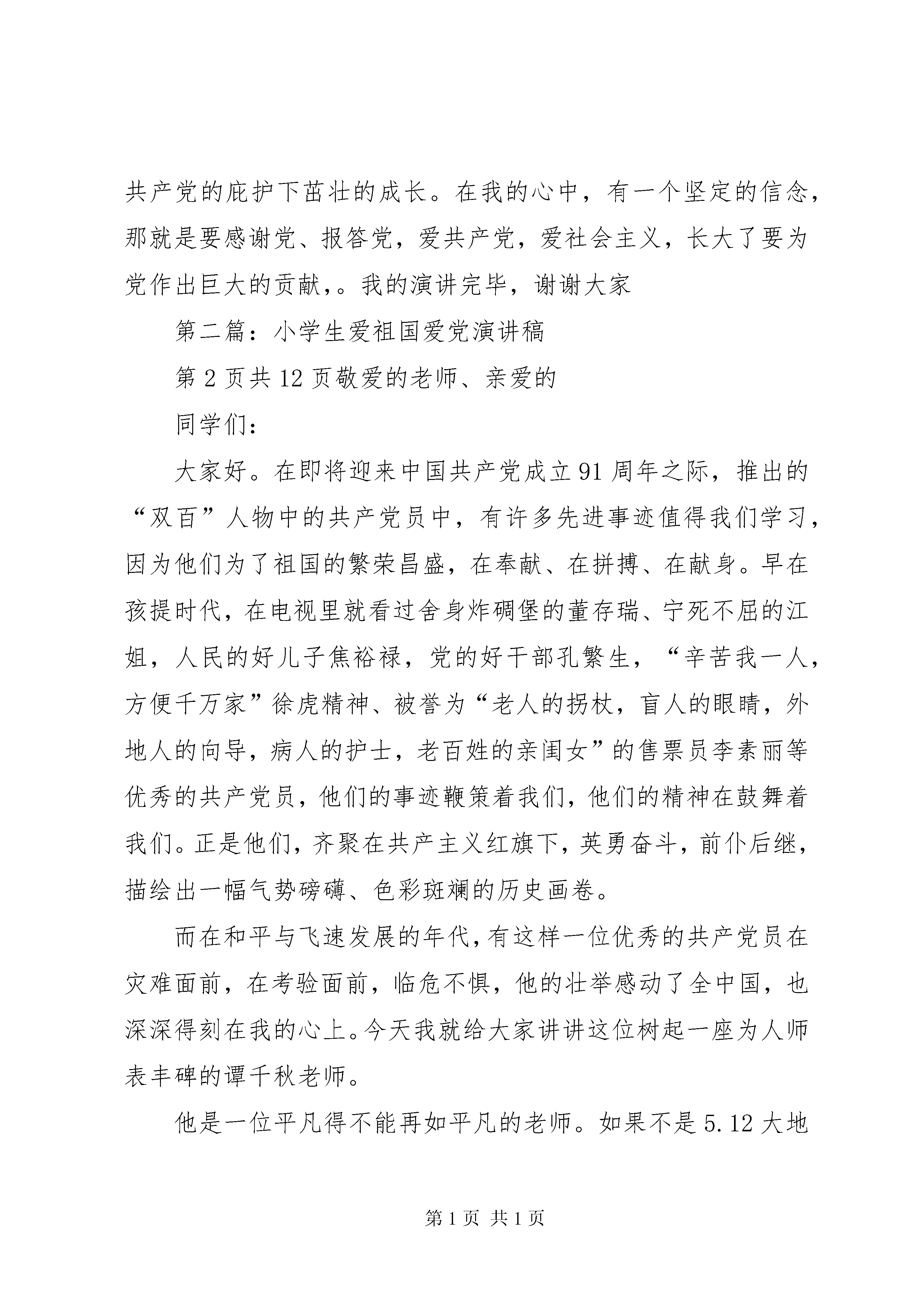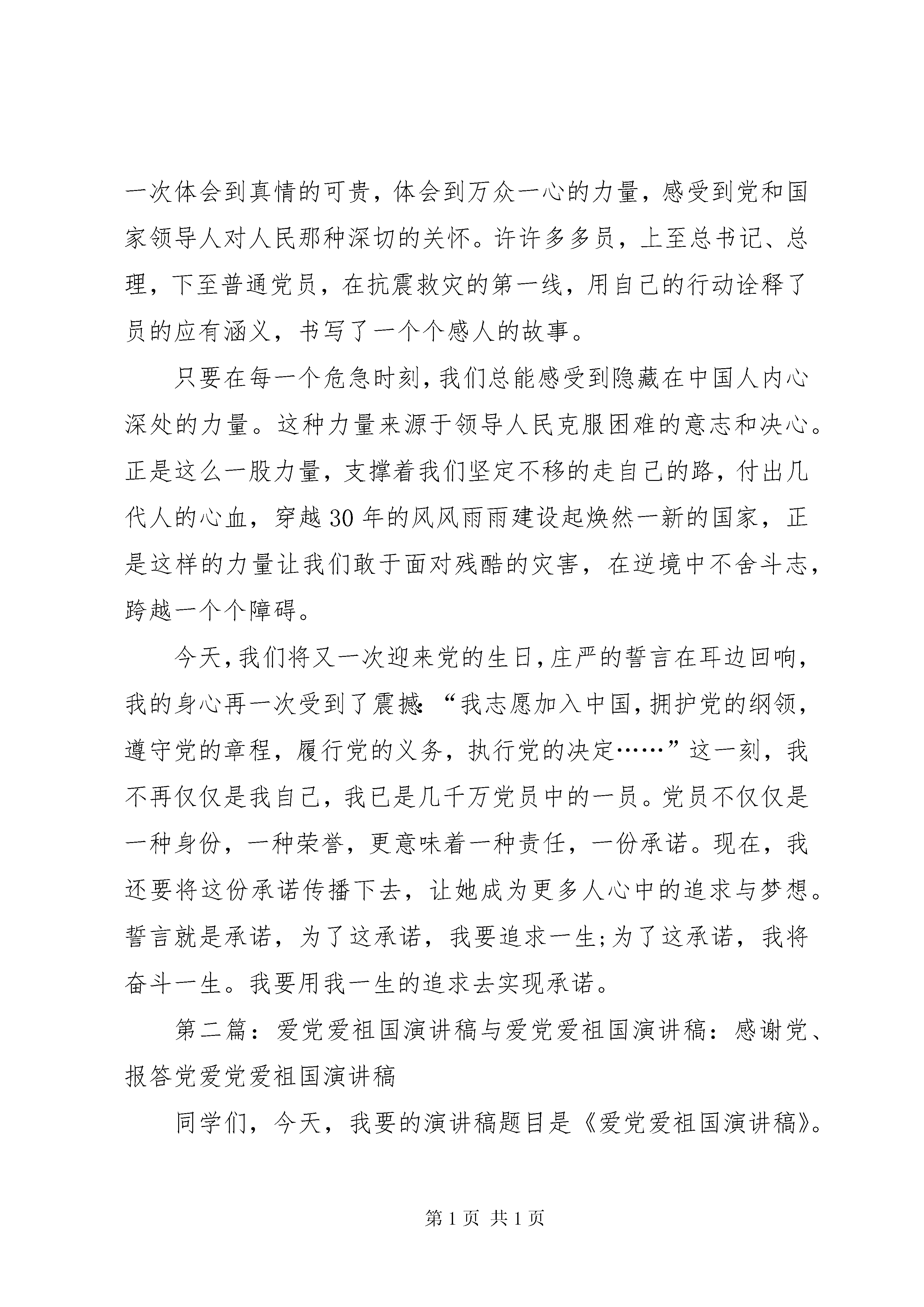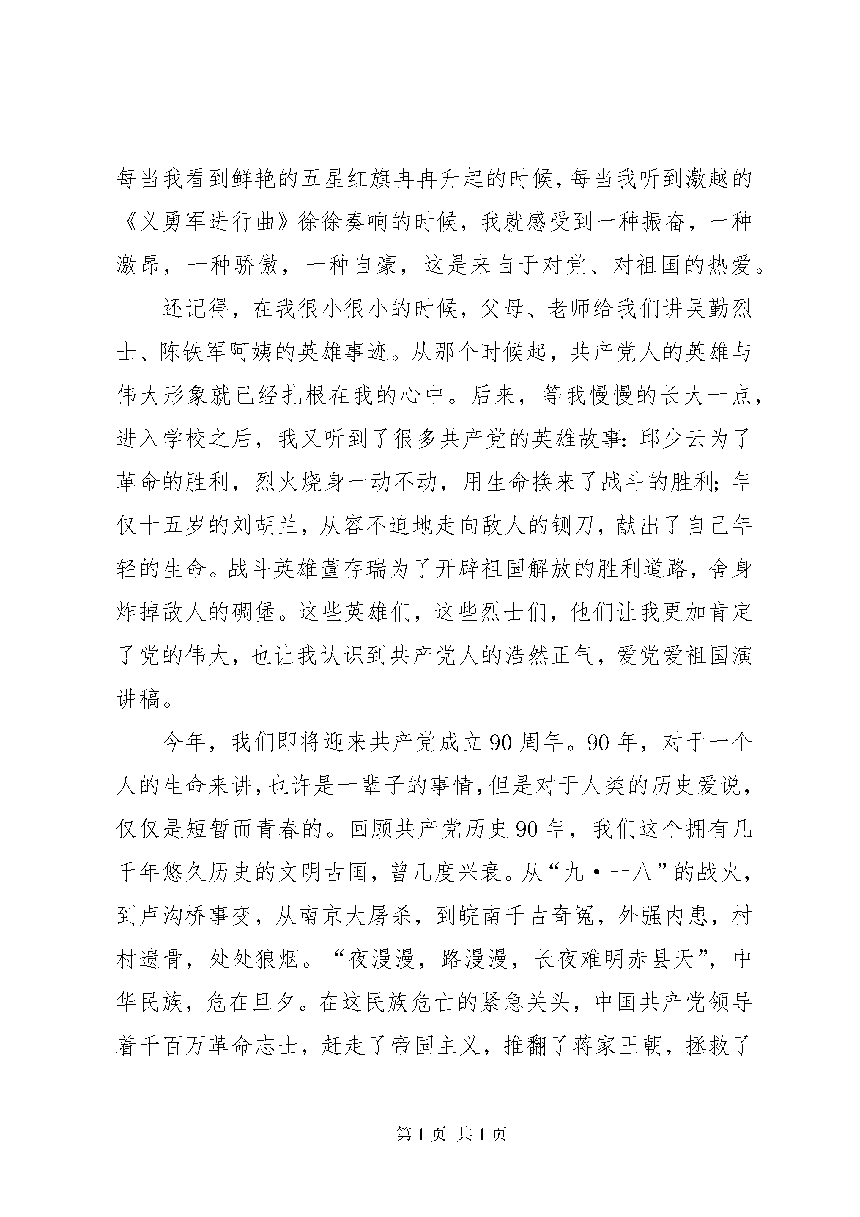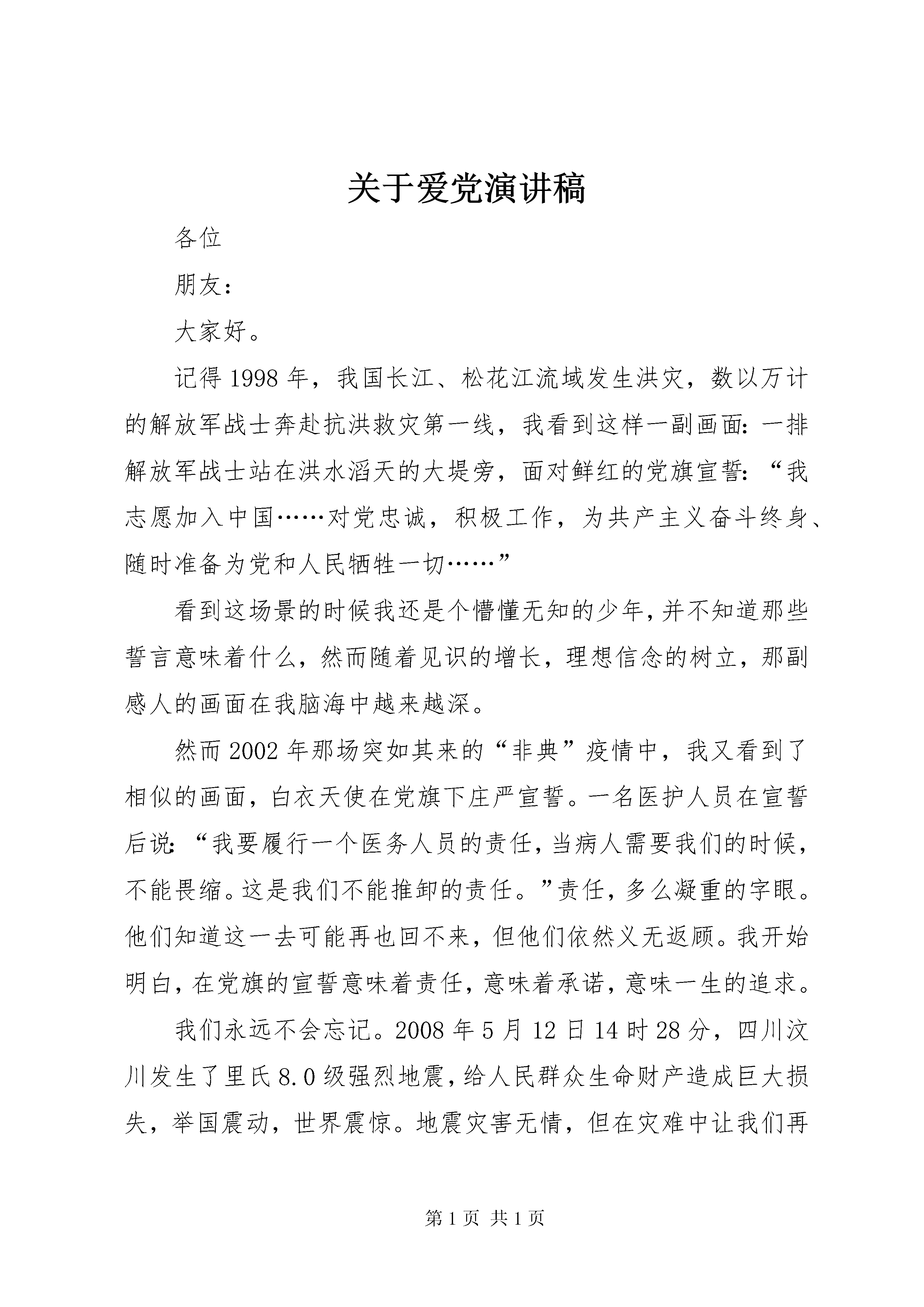 关于爱党演讲稿各位朋友:大家好。记得1998年,我国长江、松花江流域发生洪灾,数以万计的解放军战士奔赴抗洪救灾第一线,我看到这样一副画面:一排解放军战士站在洪水滔天的大堤旁,面对鲜红的党旗宣誓:“我志愿加入中国……对党忠诚,积极工作,为共产主义奋斗终身、随时准备为党和人民牺牲一切……”看到这场景的时候我还是个懵懂无知的少年,并不知道那些誓言意味着什么,然而随着见识的增长,理想信念的树立,那副感人的画面在我脑海中越来越深。然而2002年那场突如其来的“非典”疫情中,我又看到了相似的画面,白衣天使在党旗下庄严宣誓。一名医护人员在宣誓后说:“我要履行一个医务人员的责任,当病人需要我们的时候,不能畏缩。这是我们不能推卸的责任。”责任,多么凝重的字眼。他们知道这一去可能再也回不来,但他们依然义无返顾。我开始明白,在党旗的宣誓意味着责任,意味着承诺,意味一生的追求。我们永远不会忘记。2008年5月12日14时28分,四川汶川发生了里氏8.0级强烈地震,给人民群众生命财产造成巨大损失,举国震动,世界震惊。地震灾害无情,但在灾难中让我们再一次体会到真情的可贵,体会到万众一心的力量,感受到党和国家领导人对人民那种深切的关怀。许许多多员,上至总书记、总理,下至普通党员,在抗震救灾的第一线,用自己的行动诠释了员的应有涵义,书写了一个个感人的故事。只要在每一个危急时刻,我们总能感受到隐藏在中国人内心深处的力量。这种力量来源于领导人民克服困难的意志和决心。正是这么一股力量,支撑着我们坚定不移的走自己的路,付出几代人的心血,穿越30年的风风雨雨建设起焕然一新的国家,正是这样的力量让我们敢于面对残酷的灾害,在逆境中不舍斗志,跨越一个个障碍。今天,我们将又一次迎来党的生日,庄严的誓言在耳边回响,我的身心再一次受到了震撼:“我志愿加入中国,拥护党的纲领,遵守党的章程,履行党的义务,执行党的决定……”这一刻,我不再仅仅是我自己,我已是几千万党员中的一员。党员不仅仅是一种身份,一种荣誉,更意味着一种责任,一份承诺。现在,我还要将这份承诺传播下去,让她成为更多人心中的追求与梦想。誓言就是承诺,为了这承诺,我要追求一生;为了这承诺,我将奋斗一生。我要用我一生的追求去实现承诺。第二篇:爱党爱祖国演讲稿与爱党爱祖国演讲稿:感谢党、报答党爱党爱祖国演讲稿同学们,今天,我要的演讲稿题目是《爱党爱祖国演讲稿》。每当我看到鲜艳的五星红旗冉冉升起的时候,每当我听到激越的《义勇军进行曲》徐徐奏响的时候,我就感受到一种振奋,一种激昂,一种骄傲,一种自豪,这是来自于对党、对祖国的热爱。还记得,在我很小很小的时候,父母、老师给我们讲吴勤烈士、陈铁军阿姨的英雄事迹。从那个时候起,共产党人的英雄与伟大形象就已经扎根在我的心中。后来,等我慢慢的长大一点,进入学校之后,我又听到了很多共产党的英雄故事:邱少云为了革命的胜利,烈火烧身一动不动,用生命换来了战斗的胜利;年仅十五岁的刘胡兰,从容不迫地走向敌人的铡刀,献出了自己年轻的生命。战斗英雄董存瑞为了开辟祖国解放的胜利道路,舍身炸掉敌人的碉堡。这些英雄们,这些烈士们,他们让我更加肯定了党的伟大,也让我认识到共产党人的浩然正气,爱党爱祖国演讲稿。今年,我们即将迎来共产党成立90周年。90年,对于一个人的生命来讲,也许是一辈子的事情,但是对于人类的历史爱说,仅仅是短暂而青春的。回顾共产党历史90年,我们这个拥有几千年悠久历史的文明古国,曾几度兴衰。从“九·一八”的战火,到卢沟桥事变,从南京大屠杀,到皖南千古奇冤,外强内患,村村遗骨,处处狼烟。“夜漫漫,路漫漫,长夜难明赤县天”,中华民族,危在旦夕。在这民族危亡的紧急关头,中国共产党领导着千百万革命志士,赶走了帝国主义,推翻了蒋家王朝,拯救了灾难深重的中华民族,唤醒了四万万中国的劳苦大众,用鲜血和生命赢得了中国革命的伟大胜利。天安门城楼上的庄严宣告,响彻了大江南北,震惊了整个世界。中国人民从此进入了一个当家作主的新时代。我们的祖国,正在发生着翻天覆地变化:工农业生产蒸蒸日上,人民生活普遍改善,科学技术突飞猛进,改革开放蓬勃发展,原子弹、氢弹、洲际导弹、潜艇、火箭、卫星上天、奥运会举办,别的国家有的,我们有了,别的国家没有的,我们国家也有了。无数事实证明:在中国共产党的领导下,中国人民不但能够摧毁一个旧世界,而且有能力建设一个新世界,爱党爱祖国演讲稿。大家肯定还记得,xx年5月12日,在我国的四川汶川,发生了一场特大的地震灾害,给国家和人民群众的生命财产造成了非常巨大的损失。一方有难、八方支援。从共产党到广大的人民群众,从公安干警,武警官兵到人民解放军,一双双热情的手,一颗颗炽热的心,纷纷涌向抗震救灾第一线;一批批赈灾捐款,一车车救灾物资,寄托着海内外同胞的情意,满载着
