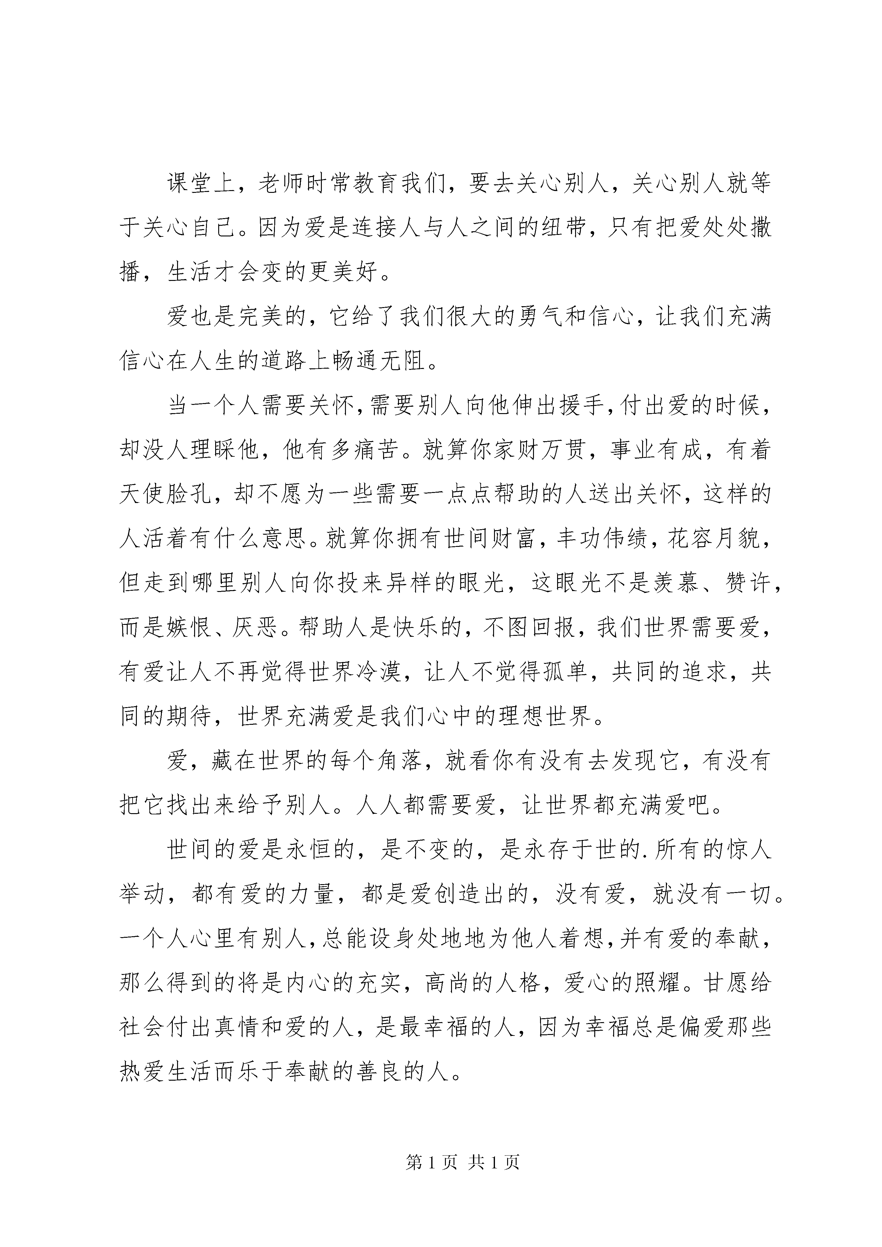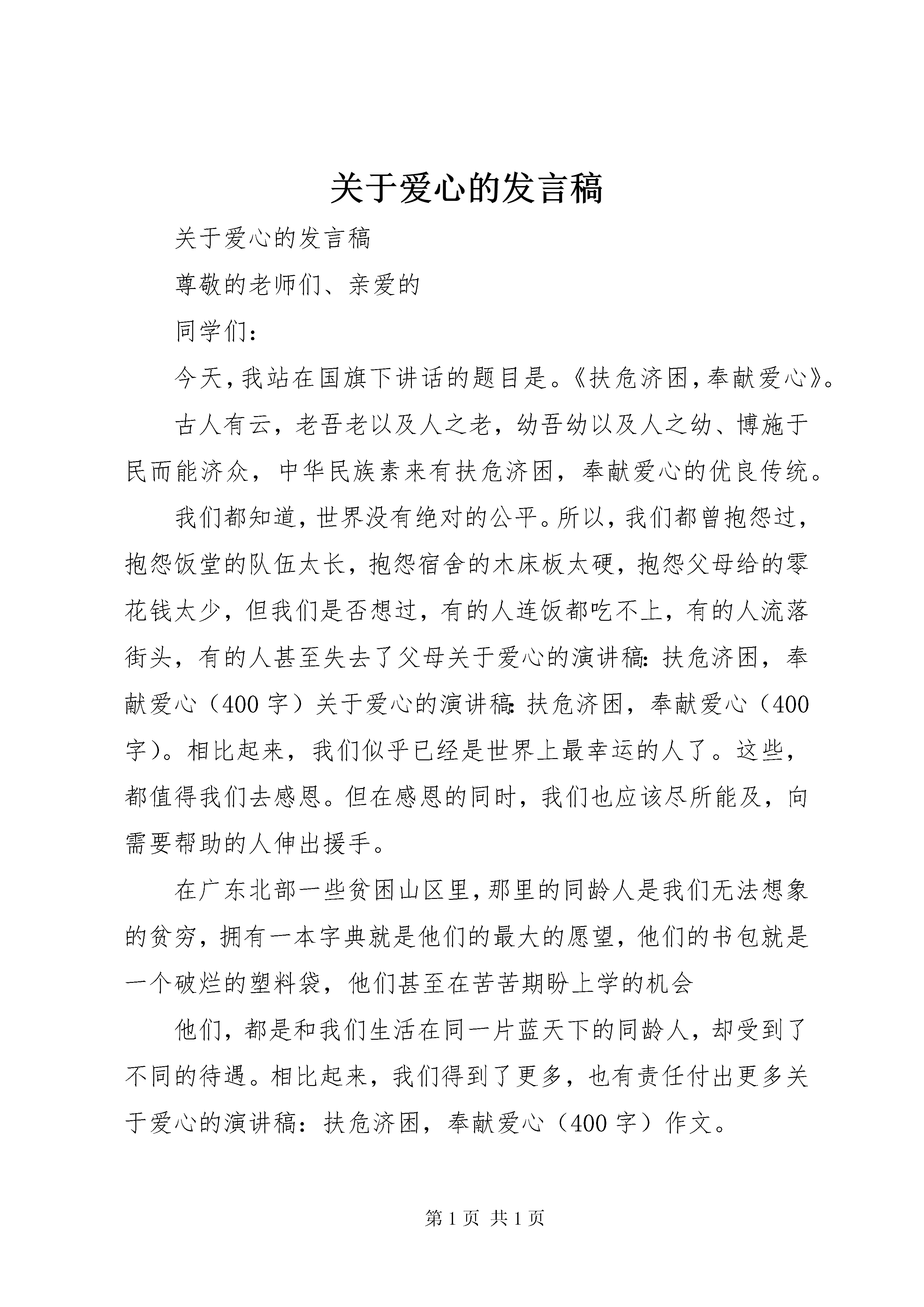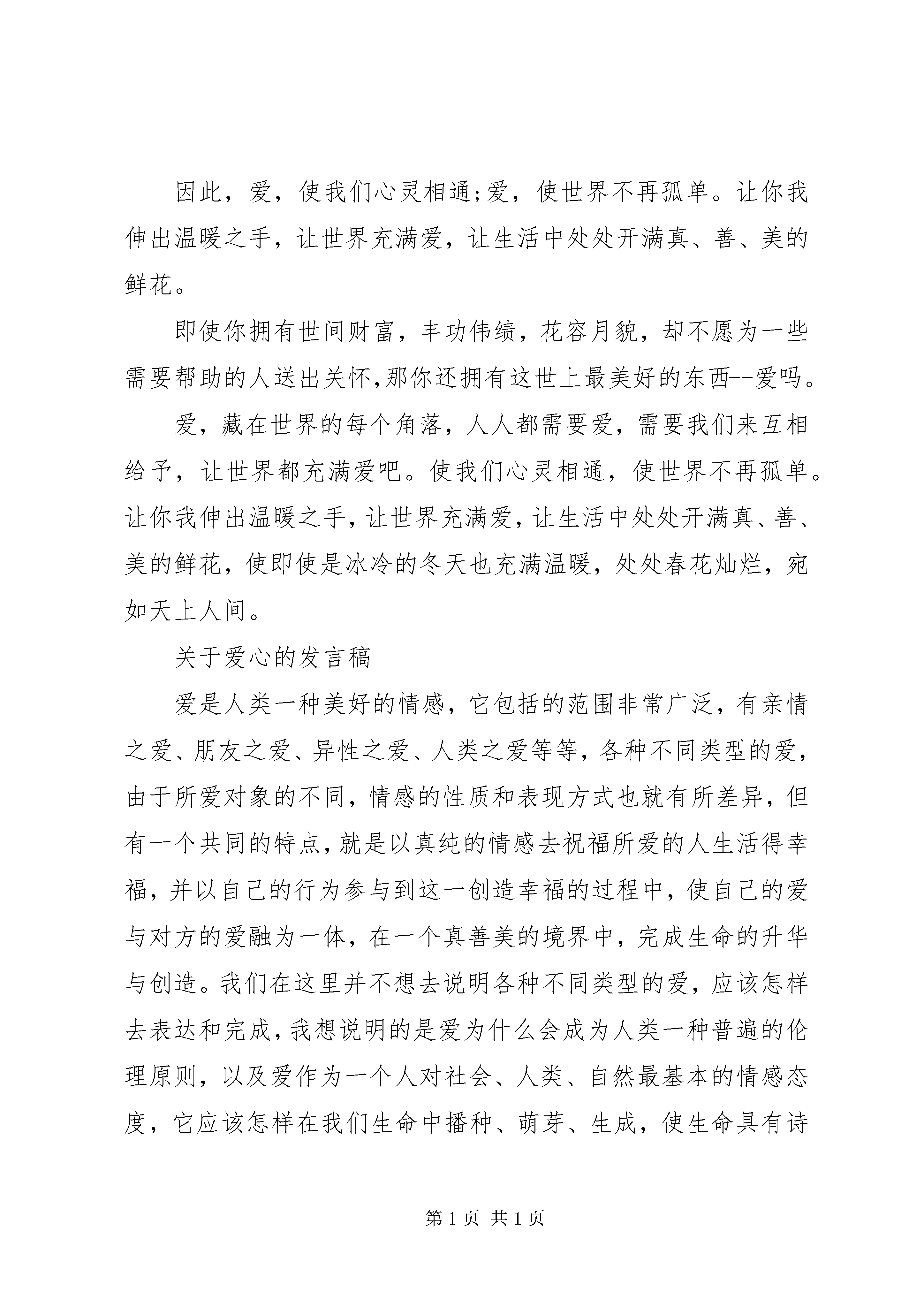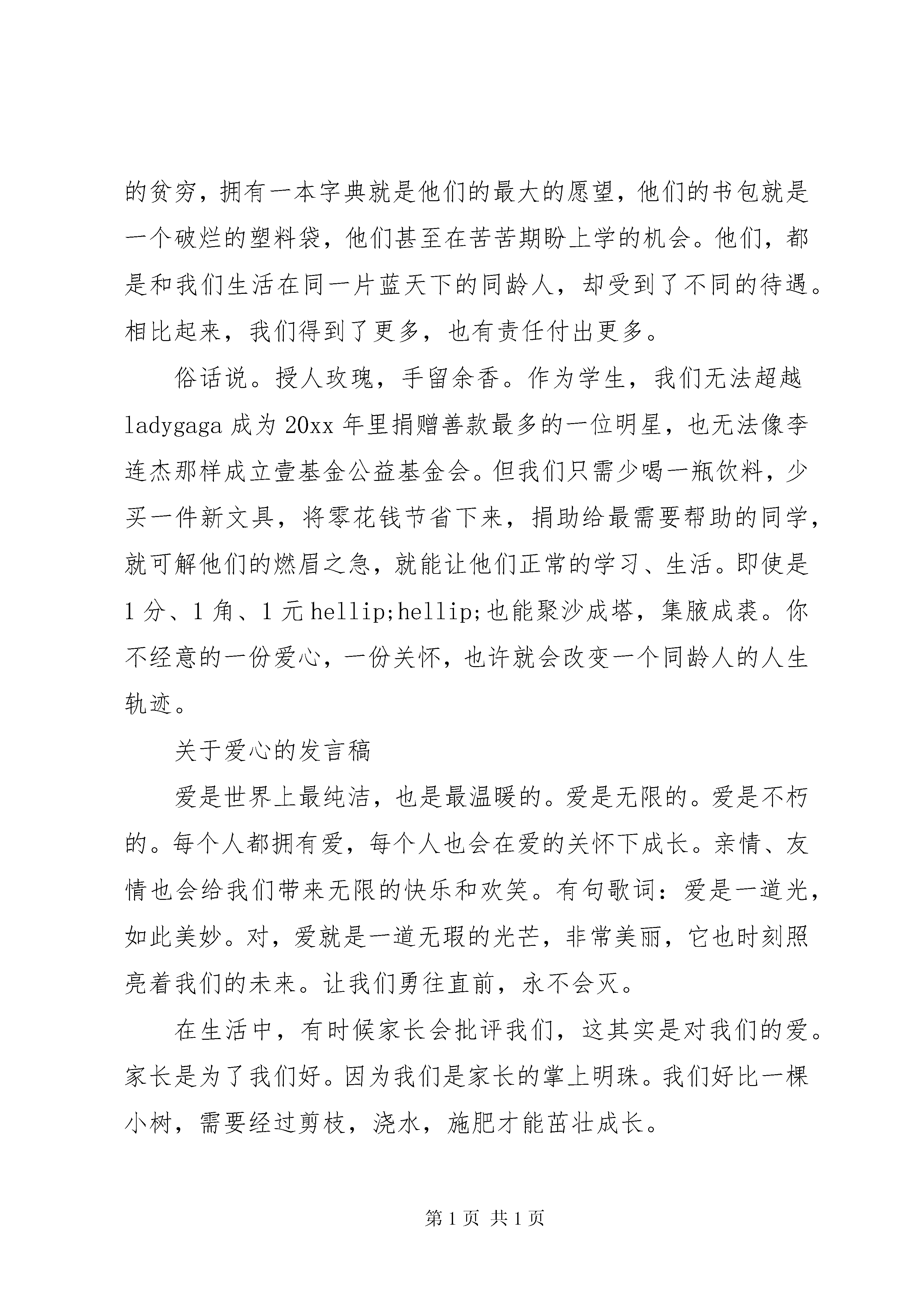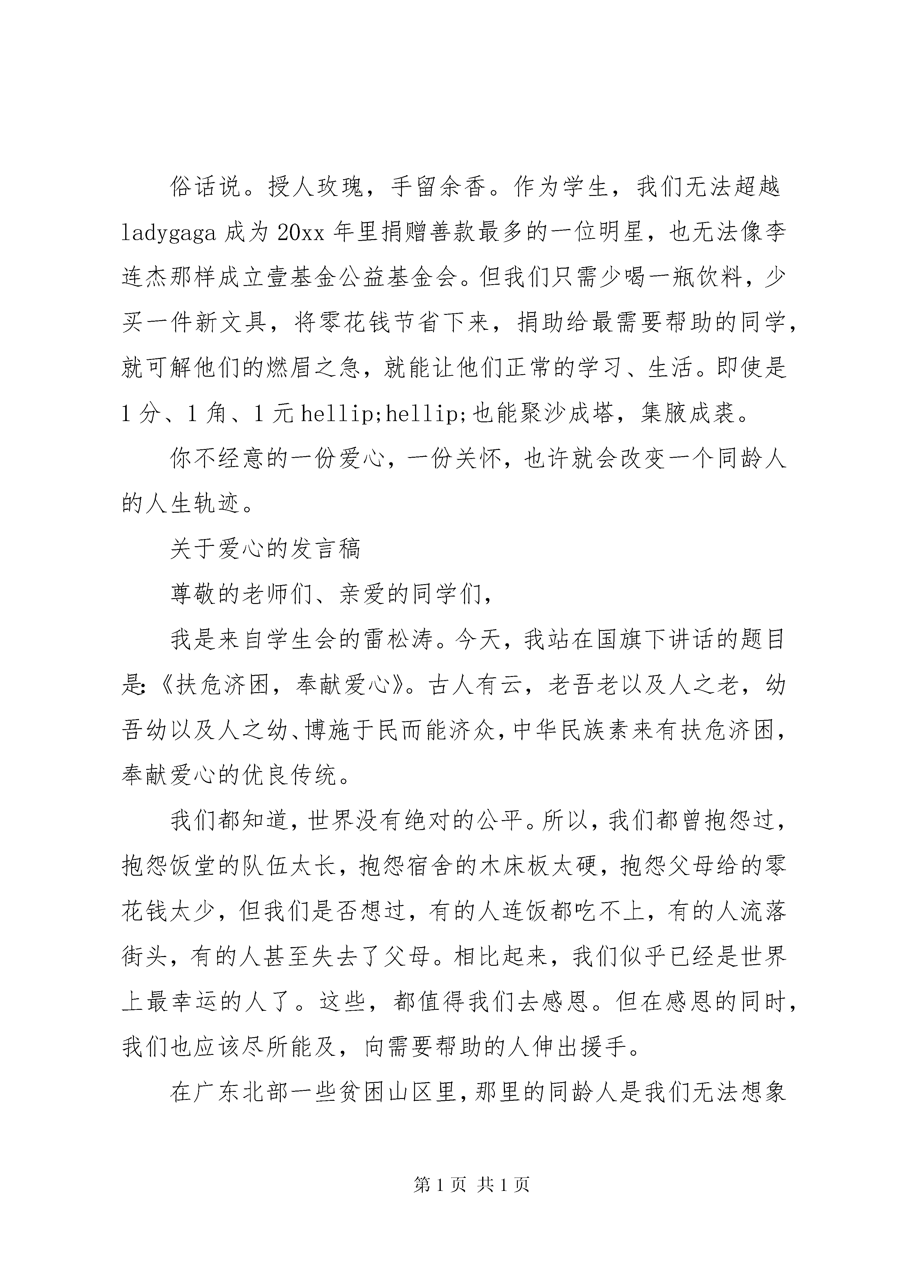 关于爱心的发言稿关于爱心的发言稿尊敬的老师们、亲爱的同学们:今天,我站在国旗下讲话的题目是。《扶危济困,奉献爱心》。古人有云,老吾老以及人之老,幼吾幼以及人之幼、博施于民而能济众,中华民族素来有扶危济困,奉献爱心的优良传统。我们都知道,世界没有绝对的公平。所以,我们都曾抱怨过,抱怨饭堂的队伍太长,抱怨宿舍的木床板太硬,抱怨父母给的零花钱太少,但我们是否想过,有的人连饭都吃不上,有的人流落街头,有的人甚至失去了父母关于爱心的演讲稿:扶危济困,奉献爱心(400字)关于爱心的演讲稿:扶危济困,奉献爱心(400字)。相比起来,我们似乎已经是世界上最幸运的人了。这些,都值得我们去感恩。但在感恩的同时,我们也应该尽所能及,向需要帮助的人伸出援手。在广东北部一些贫困山区里,那里的同龄人是我们无法想象的贫穷,拥有一本字典就是他们的最大的愿望,他们的书包就是一个破烂的塑料袋,他们甚至在苦苦期盼上学的机会他们,都是和我们生活在同一片蓝天下的同龄人,却受到了不同的待遇。相比起来,我们得到了更多,也有责任付出更多关于爱心的演讲稿:扶危济困,奉献爱心(400字)作文。俗话说。授人玫瑰,手留余香。作为学生,我们无法超越ladygaga成为20xx年里捐赠善款最多的一位明星,也无法像李连杰那样成立壹基金公益基金会。但我们只需少喝一瓶饮料,少买一件新文具,将零花钱节省下来,捐助给最需要帮助的同学,就可解他们的燃眉之急,就能让他们正常的学习、生活。即使是1分、1角、1元hellip;hellip;也能聚沙成塔,集腋成裘。你不经意的一份爱心,一份关怀,也许就会改变一个同龄人的人生轨迹。关于爱心的发言稿尊敬的老师们、亲爱的同学们,我是来自学生会的雷松涛。今天,我站在国旗下讲话的题目是:《扶危济困,奉献爱心》。古人有云,老吾老以及人之老,幼吾幼以及人之幼、博施于民而能济众,中华民族素来有扶危济困,奉献爱心的优良传统。我们都知道,世界没有绝对的公平。所以,我们都曾抱怨过,抱怨饭堂的队伍太长,抱怨宿舍的木床板太硬,抱怨父母给的零花钱太少,但我们是否想过,有的人连饭都吃不上,有的人流落街头,有的人甚至失去了父母。相比起来,我们似乎已经是世界上最幸运的人了。这些,都值得我们去感恩。但在感恩的同时,我们也应该尽所能及,向需要帮助的人伸出援手。在广东北部一些贫困山区里,那里的同龄人是我们无法想象的贫穷,拥有一本字典就是他们的最大的愿望,他们的书包就是一个破烂的塑料袋,他们甚至在苦苦期盼上学的机会。他们,都是和我们生活在同一片蓝天下的同龄人,却受到了不同的待遇。相比起来,我们得到了更多,也有责任付出更多。俗话说。授人玫瑰,手留余香。作为学生,我们无法超越ladygaga成为20xx年里捐赠善款最多的一位明星,也无法像李连杰那样成立壹基金公益基金会。但我们只需少喝一瓶饮料,少买一件新文具,将零花钱节省下来,捐助给最需要帮助的同学,就可解他们的燃眉之急,就能让他们正常的学习、生活。即使是1分、1角、1元hellip;hellip;也能聚沙成塔,集腋成裘。你不经意的一份爱心,一份关怀,也许就会改变一个同龄人的人生轨迹。关于爱心的发言稿爱是世界上最纯洁,也是最温暖的。爱是无限的。爱是不朽的。每个人都拥有爱,每个人也会在爱的关怀下成长。亲情、友情也会给我们带来无限的快乐和欢笑。有句歌词:爱是一道光,如此美妙。对,爱就是一道无瑕的光芒,非常美丽,它也时刻照亮着我们的未来。让我们勇往直前,永不会灭。在生活中,有时候家长会批评我们,这其实是对我们的爱。家长是为了我们好。因为我们是家长的掌上明珠。我们好比一棵小树,需要经过剪枝,浇水,施肥才能茁壮成长。课堂上,老师时常教育我们,要去关心别人,关心别人就等于关心自己。因为爱是连接人与人之间的纽带,只有把爱处处撒播,生活才会变的更美好。爱也是完美的,它给了我们很大的勇气和信心,让我们充满信心在人生的道路上畅通无阻。当一个人需要关怀,需要别人向他伸出援手,付出爱的时候,却没人理睬他,他有多痛苦。就算你家财万贯,事业有成,有着天使脸孔,却不愿为一些需要一点点帮助的人送出关怀,这样的人活着有什么意思。就算你拥有世间财富,丰功伟绩,花容月貌,但走到哪里别人向你投来异样的眼光,这眼光不是羡慕、赞许,而是嫉恨、厌恶。帮助人是快乐的,不图回报,我们世界需要爱,有爱让人不再觉得世界冷漠,让人不觉得孤单,共同的追求,共同的期待,世界充满爱是我们心中的理想世界。爱,藏在世界的每个角落,就看你有没有去发现它,有没有把它找出来给予别人。人人都需要爱,让世界都充满爱吧。世间的爱是永恒的,是不变的,是永存于世的.所有的惊人举动,都有爱的力量,都是爱创造出的,没有爱,就没有一切。一个人心里有别人,总能设身处地地为他人着想,并有爱的奉献,那么得到的将是内心的