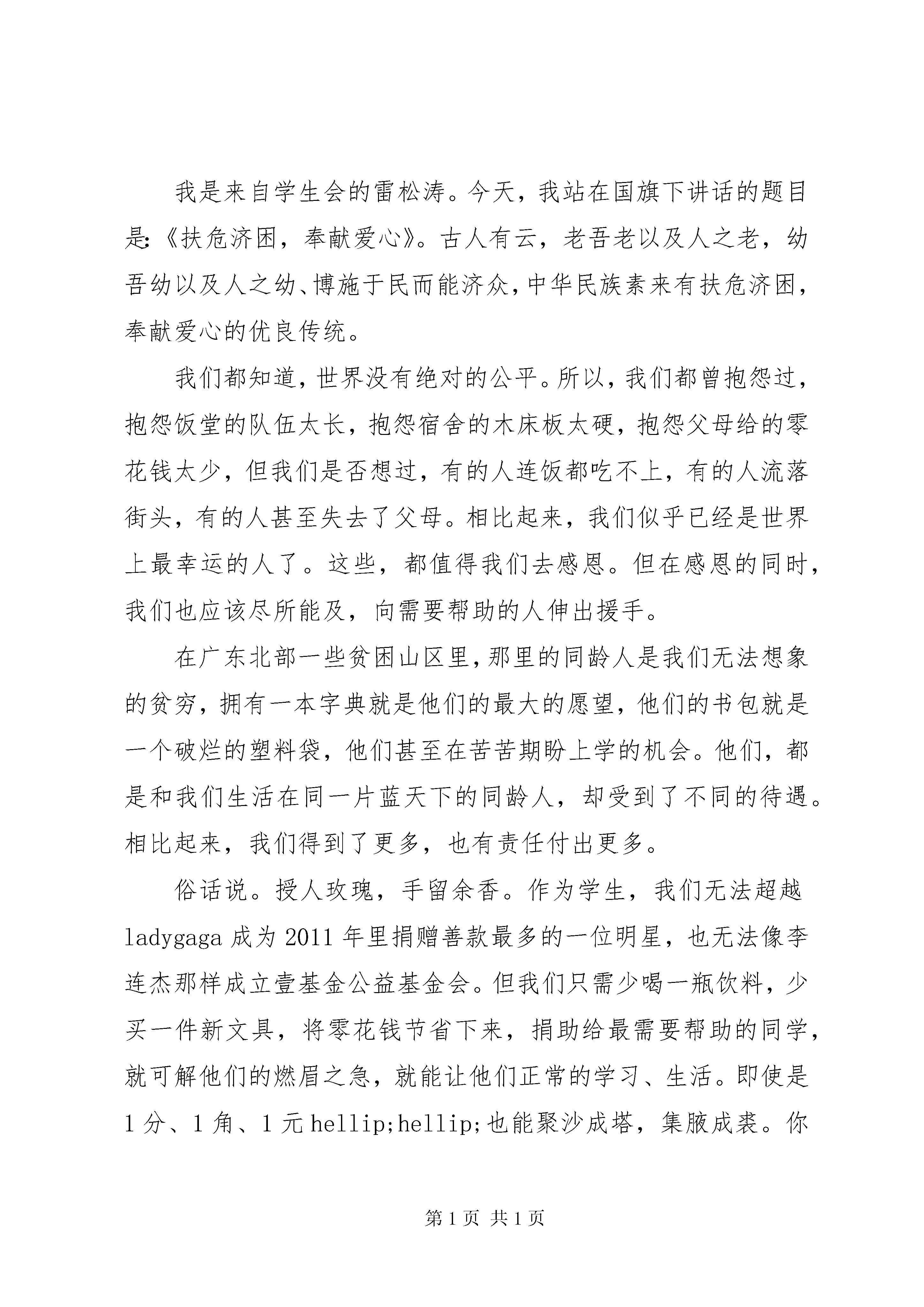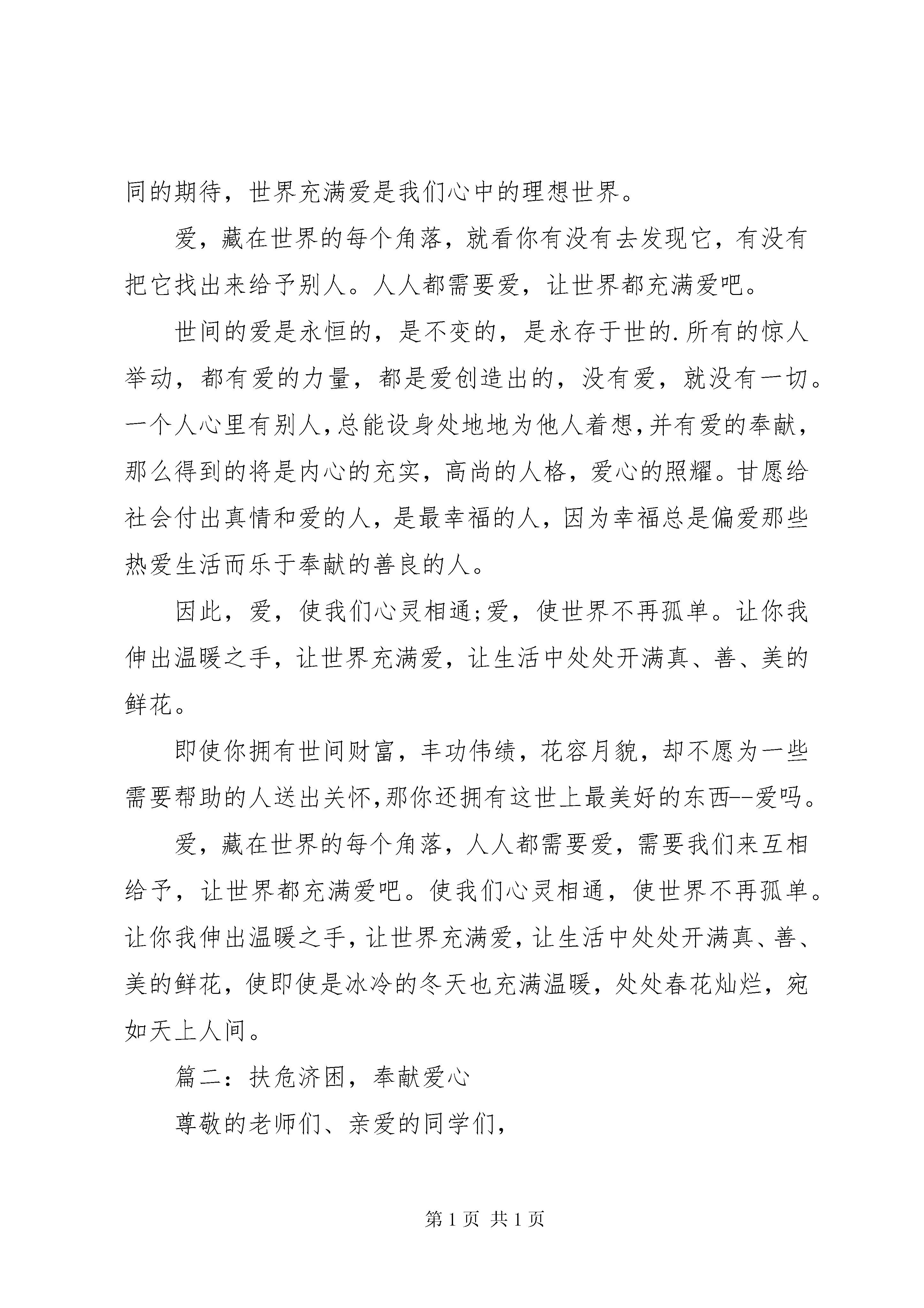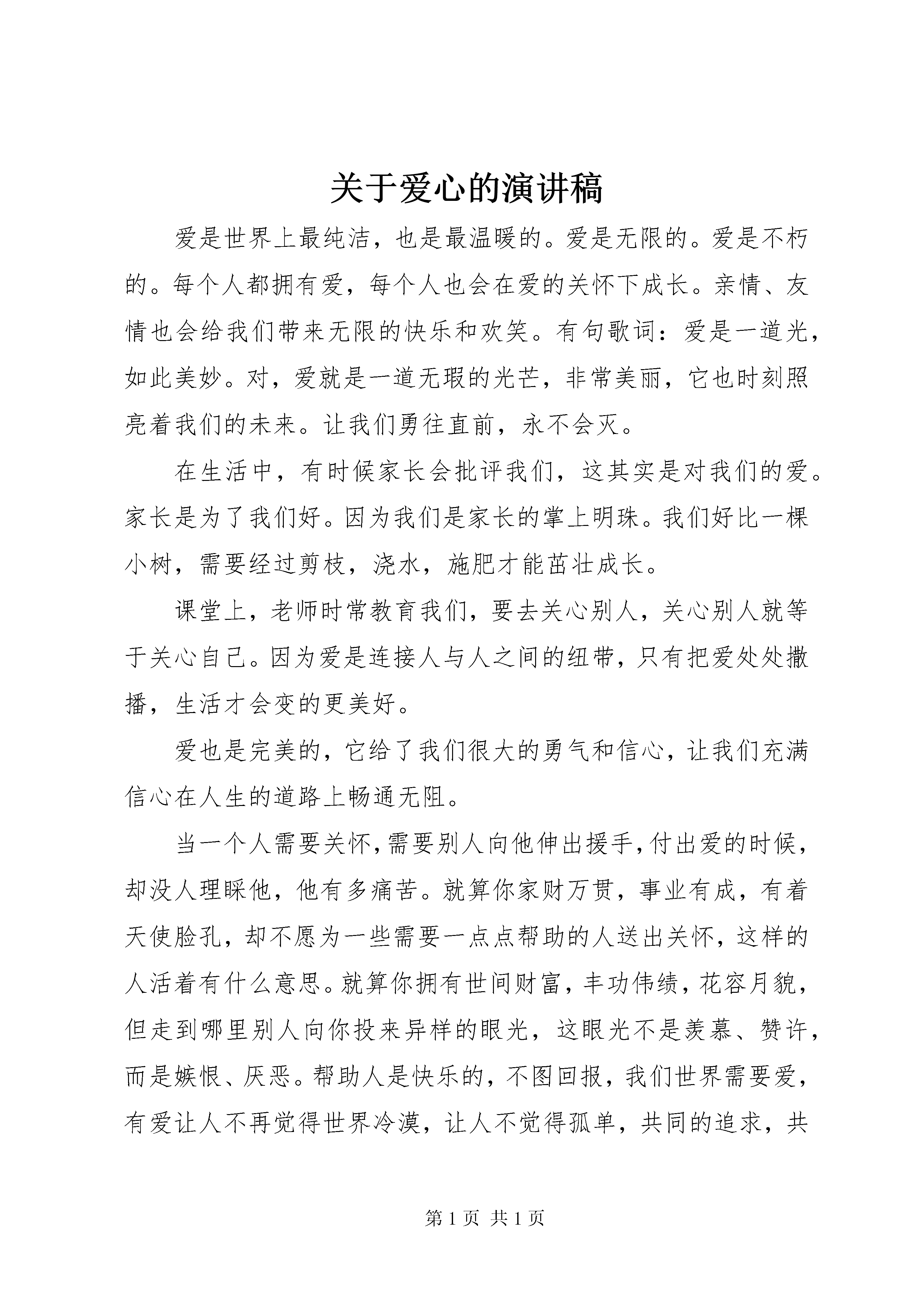 关于爱心的演讲稿爱是世界上最纯洁,也是最温暖的。爱是无限的。爱是不朽的。每个人都拥有爱,每个人也会在爱的关怀下成长。亲情、友情也会给我们带来无限的快乐和欢笑。有句歌词:爱是一道光,如此美妙。对,爱就是一道无瑕的光芒,非常美丽,它也时刻照亮着我们的未来。让我们勇往直前,永不会灭。在生活中,有时候家长会批评我们,这其实是对我们的爱。家长是为了我们好。因为我们是家长的掌上明珠。我们好比一棵小树,需要经过剪枝,浇水,施肥才能茁壮成长。课堂上,老师时常教育我们,要去关心别人,关心别人就等于关心自己。因为爱是连接人与人之间的纽带,只有把爱处处撒播,生活才会变的更美好。爱也是完美的,它给了我们很大的勇气和信心,让我们充满信心在人生的道路上畅通无阻。当一个人需要关怀,需要别人向他伸出援手,付出爱的时候,却没人理睬他,他有多痛苦。就算你家财万贯,事业有成,有着天使脸孔,却不愿为一些需要一点点帮助的人送出关怀,这样的人活着有什么意思。就算你拥有世间财富,丰功伟绩,花容月貌,但走到哪里别人向你投来异样的眼光,这眼光不是羡慕、赞许,而是嫉恨、厌恶。帮助人是快乐的,不图回报,我们世界需要爱,有爱让人不再觉得世界冷漠,让人不觉得孤单,共同的追求,共同的期待,世界充满爱是我们心中的理想世界。爱,藏在世界的每个角落,就看你有没有去发现它,有没有把它找出来给予别人。人人都需要爱,让世界都充满爱吧。世间的爱是永恒的,是不变的,是永存于世的.所有的惊人举动,都有爱的力量,都是爱创造出的,没有爱,就没有一切。一个人心里有别人,总能设身处地地为他人着想,并有爱的奉献,那么得到的将是内心的充实,高尚的人格,爱心的照耀。甘愿给社会付出真情和爱的人,是最幸福的人,因为幸福总是偏爱那些热爱生活而乐于奉献的善良的人。因此,爱,使我们心灵相通;爱,使世界不再孤单。让你我伸出温暖之手,让世界充满爱,让生活中处处开满真、善、美的鲜花。即使你拥有世间财富,丰功伟绩,花容月貌,却不愿为一些需要帮助的人送出关怀,那你还拥有这世上最美好的东西--爱吗。爱,藏在世界的每个角落,人人都需要爱,需要我们来互相给予,让世界都充满爱吧。使我们心灵相通,使世界不再孤单。让你我伸出温暖之手,让世界充满爱,让生活中处处开满真、善、美的鲜花,使即使是冰冷的冬天也充满温暖,处处春花灿烂,宛如天上人间。篇二:扶危济困,奉献爱心尊敬的老师们、亲爱的同学们,我是来自学生会的雷松涛。今天,我站在国旗下讲话的题目是:《扶危济困,奉献爱心》。古人有云,老吾老以及人之老,幼吾幼以及人之幼、博施于民而能济众,中华民族素来有扶危济困,奉献爱心的优良传统。我们都知道,世界没有绝对的公平。所以,我们都曾抱怨过,抱怨饭堂的队伍太长,抱怨宿舍的木床板太硬,抱怨父母给的零花钱太少,但我们是否想过,有的人连饭都吃不上,有的人流落街头,有的人甚至失去了父母。相比起来,我们似乎已经是世界上最幸运的人了。这些,都值得我们去感恩。但在感恩的同时,我们也应该尽所能及,向需要帮助的人伸出援手。在广东北部一些贫困山区里,那里的同龄人是我们无法想象的贫穷,拥有一本字典就是他们的最大的愿望,他们的书包就是一个破烂的塑料袋,他们甚至在苦苦期盼上学的机会。他们,都是和我们生活在同一片蓝天下的同龄人,却受到了不同的待遇。相比起来,我们得到了更多,也有责任付出更多。俗话说。授人玫瑰,手留余香。作为学生,我们无法超越ladygaga成为2011年里捐赠善款最多的一位明星,也无法像李连杰那样成立壹基金公益基金会。但我们只需少喝一瓶饮料,少买一件新文具,将零花钱节省下来,捐助给最需要帮助的同学,就可解他们的燃眉之急,就能让他们正常的学习、生活。即使是1分、1角、1元hellip;hellip;也能聚沙成塔,集腋成裘。你不经意的一份爱心,一份关怀,也许就会改变一个同龄人的人生轨迹。