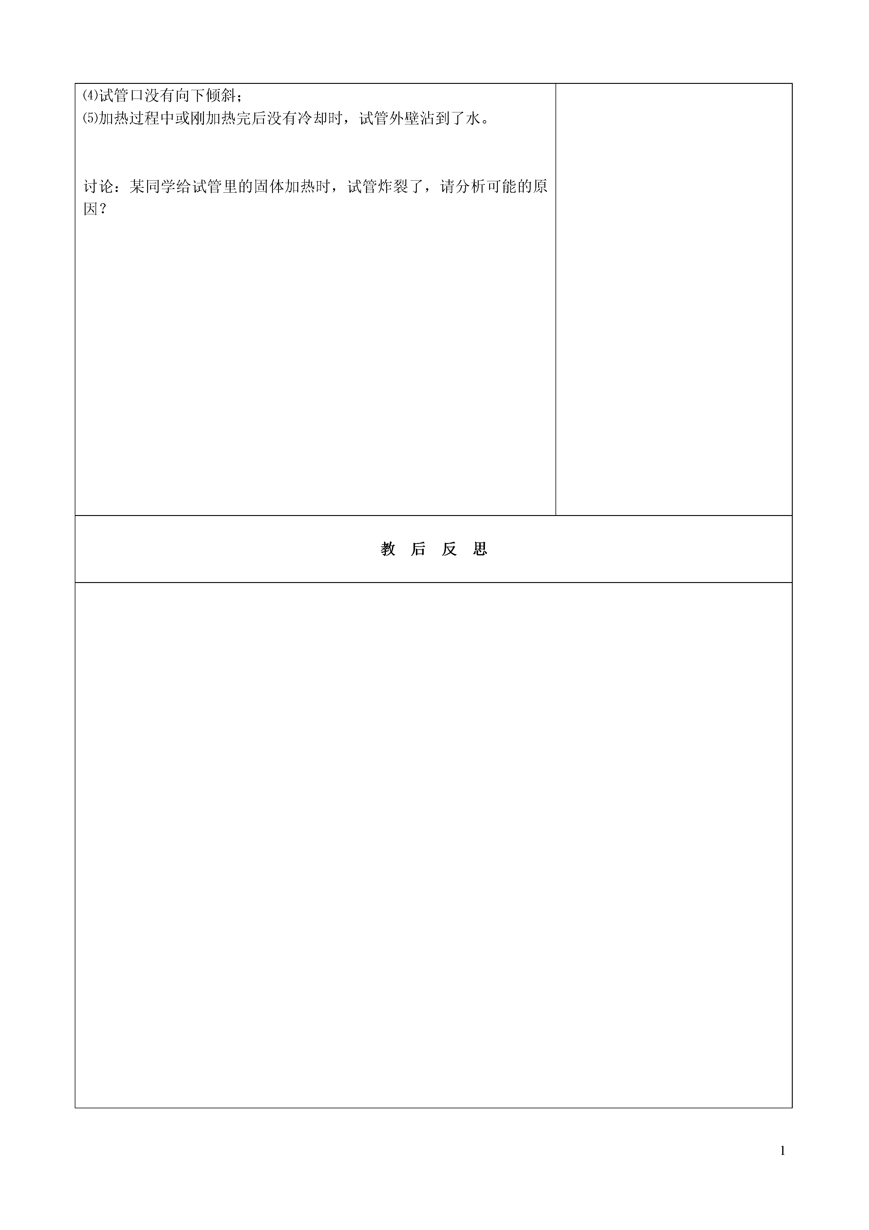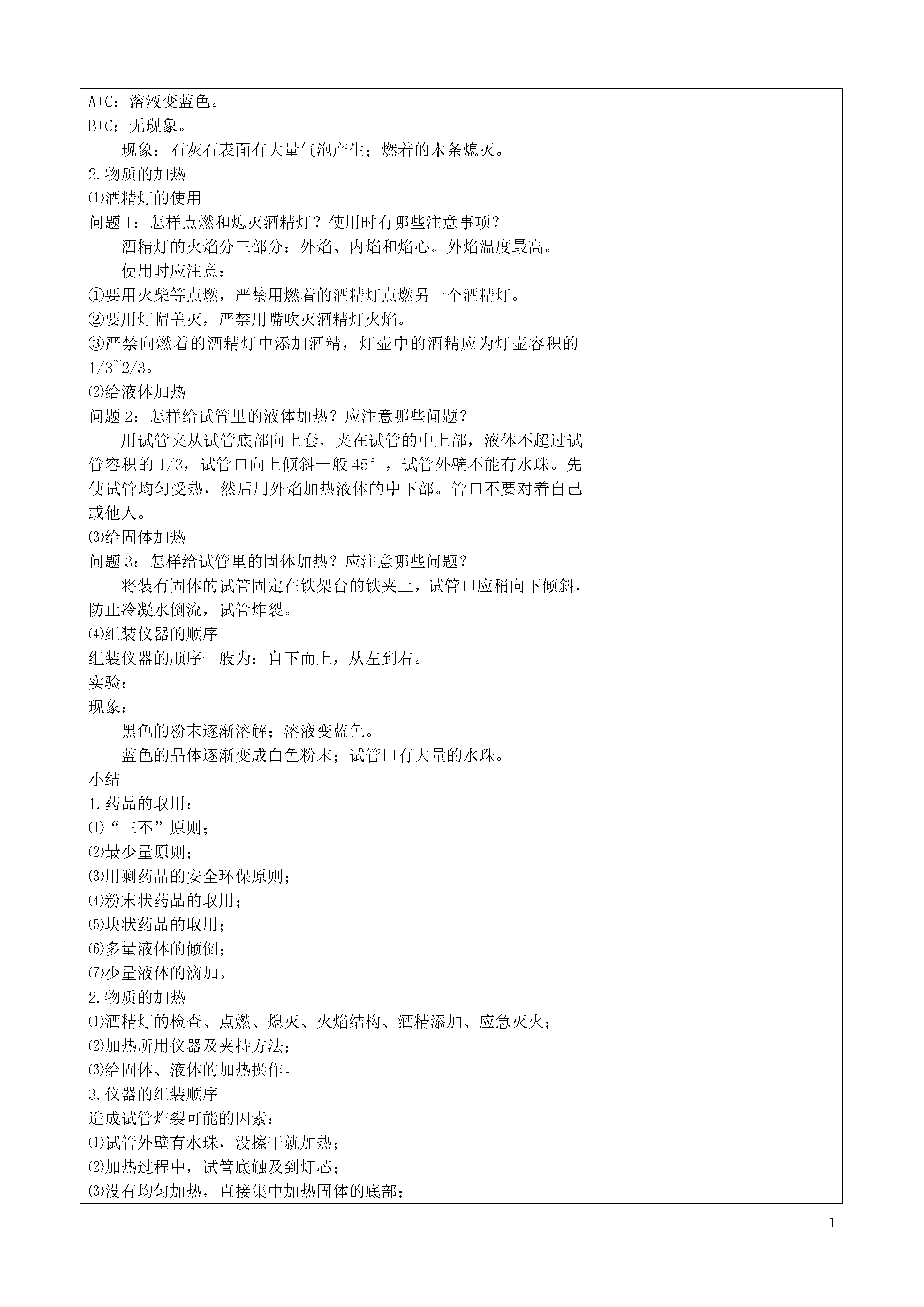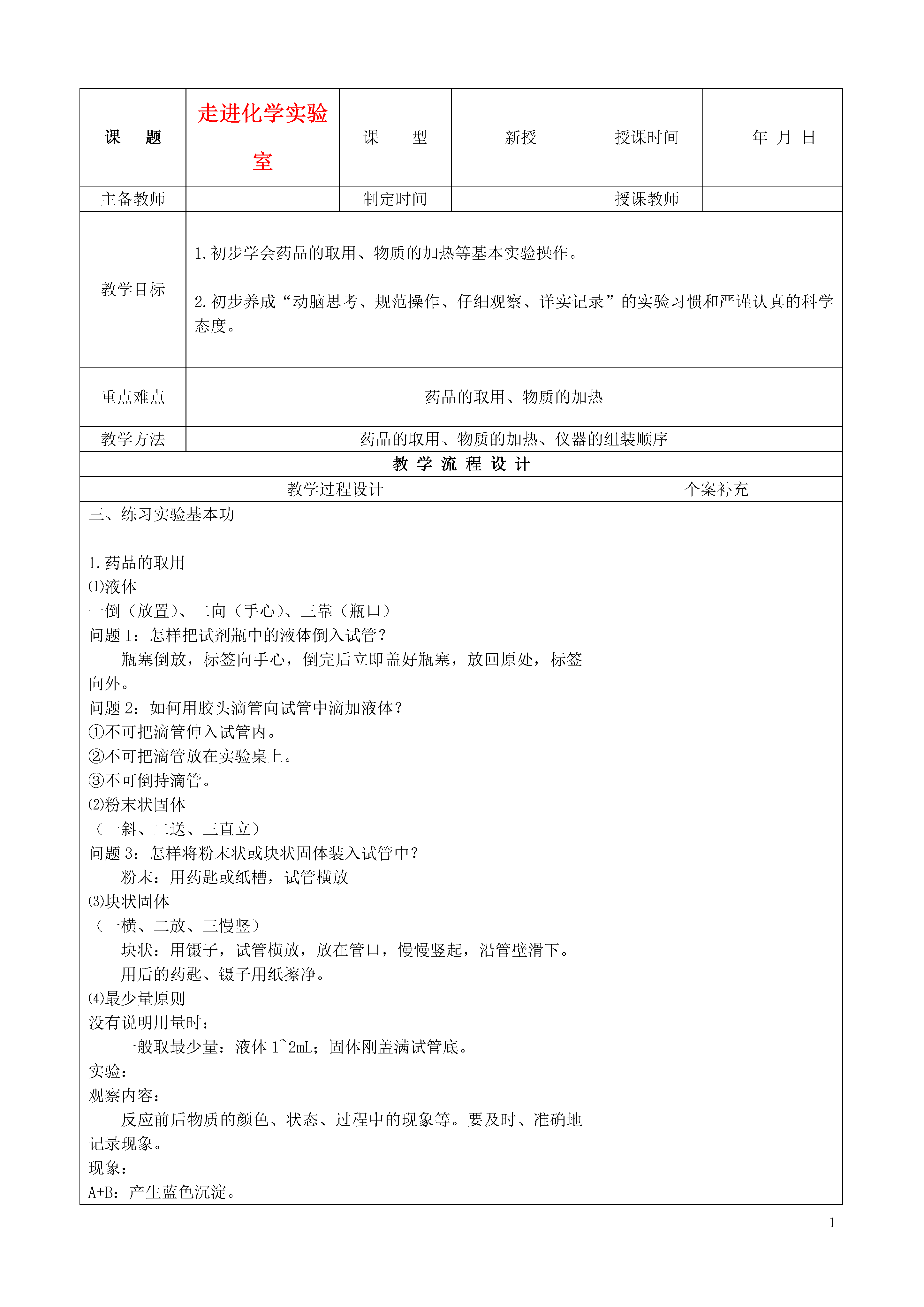 1课题走进化学实验室课型新授授课时间年月日主备教师制定时间授课教师教学目标1.初步学会药品的取用、物质的加热等基本实验操作。2.初步养成“动脑思考、规范操作、仔细观察、详实记录”的实验习惯和严谨认真的科学态度。重点难点药品的取用、物质的加热教学方法药品的取用、物质的加热、仪器的组装顺序教学流程设计教学过程设计个案补充三、练习实验基本功1.药品的取用⑴液体一倒(放置)、二向(手心)、三靠(瓶口)问题1:怎样把试剂瓶中的液体倒入试管?瓶塞倒放,标签向手心,倒完后立即盖好瓶塞,放回原处,标签向外。问题2:如何用胶头滴管向试管中滴加液体?①不可把滴管伸入试管内。②不可把滴管放在实验桌上。③不可倒持滴管。⑵粉末状固体(一斜、二送、三直立)问题3:怎样将粉末状或块状固体装入试管中?粉末:用药匙或纸槽,试管横放⑶块状固体(一横、二放、三慢竖)块状:用镊子,试管横放,放在管口,慢慢竖起,沿管壁滑下。用后的药匙、镊子用纸擦净。⑷最少量原则没有说明用量时:一般取最少量:液体1~2mL;固体刚盖满试管底。实验杨柳雪实验学校电子教案:观察内容:反应前后物质的颜色、状态、过程中的现象等。要及时、准确地记录现象。现象:A+B:产生蓝色沉淀。A+C:溶液变蓝色。B+C:无现象。现象:石灰石表面有大量气泡产生;燃着的木条熄灭。2.物质的加热⑴酒精灯的使用问题1:怎样点燃和熄灭酒精灯?使用时有哪些注意事项?酒精灯的火焰分三部分:外焰、内焰和焰心。外焰温度最高。使用时应注意:①要用火柴等点燃,严禁用燃着的酒精灯点燃另一个酒精灯。②要用灯帽盖灭,严禁用嘴吹灭酒精灯火焰。③严禁向燃着的酒精灯中添加酒精,灯壶中的酒精应为灯壶容积的1/3~2/3。⑵给液体加热问题2:怎样给试管里的液体加热?应注意哪些问题?用试管夹从试管底部向上套,夹在试管的中上部,液体不超过试管容积的1/3,试管口向上倾斜一般45°,试管外壁不能有水珠。先使试管均匀受热,然后用外焰加热液体的中下部。管口不要对着自己或他人。⑶给固体加热问题3:怎样给试管里的固体加热?应注意哪些问题?将装有固体的试管固定在铁架台的铁夹上,试管口应稍向下倾斜,防止冷凝水倒流,试管炸裂。⑷组装仪器的顺序组装仪器的顺序一般为:自下而上,从左到右。实验:现象:黑色的粉末逐渐溶解;溶液变蓝色。蓝色的晶体逐渐变成白色粉末;试管口有大量的水珠。小结1.药品的取用:⑴“三不”原则;⑵最少量原则;⑶用剩药品的安全环保原则;⑷粉末状药品的取用;⑸块状药品的取用;⑹多量液体的倾倒;⑺少量液体的滴加。2.物质的加热⑴酒精灯的检查、点燃、熄灭、火焰结构、酒精添加、应急灭火;⑵加热所用仪器及夹持方法;⑶给固体、液体的加热操作。3.仪器的组装顺序造成试管炸裂可能的因素:⑴试管外壁有水珠,没擦干就加热;⑵加热过程中,试管底触及到灯芯;⑶没有均匀加热,直接集中加热固体的底部;⑷试管口没有向下倾斜;⑸加热过程中或刚加热完后没有冷却时,试管外壁沾到了水。讨论:某同学给试管里的固体加热时,试管炸裂了,请分析可能的原因?教后反思