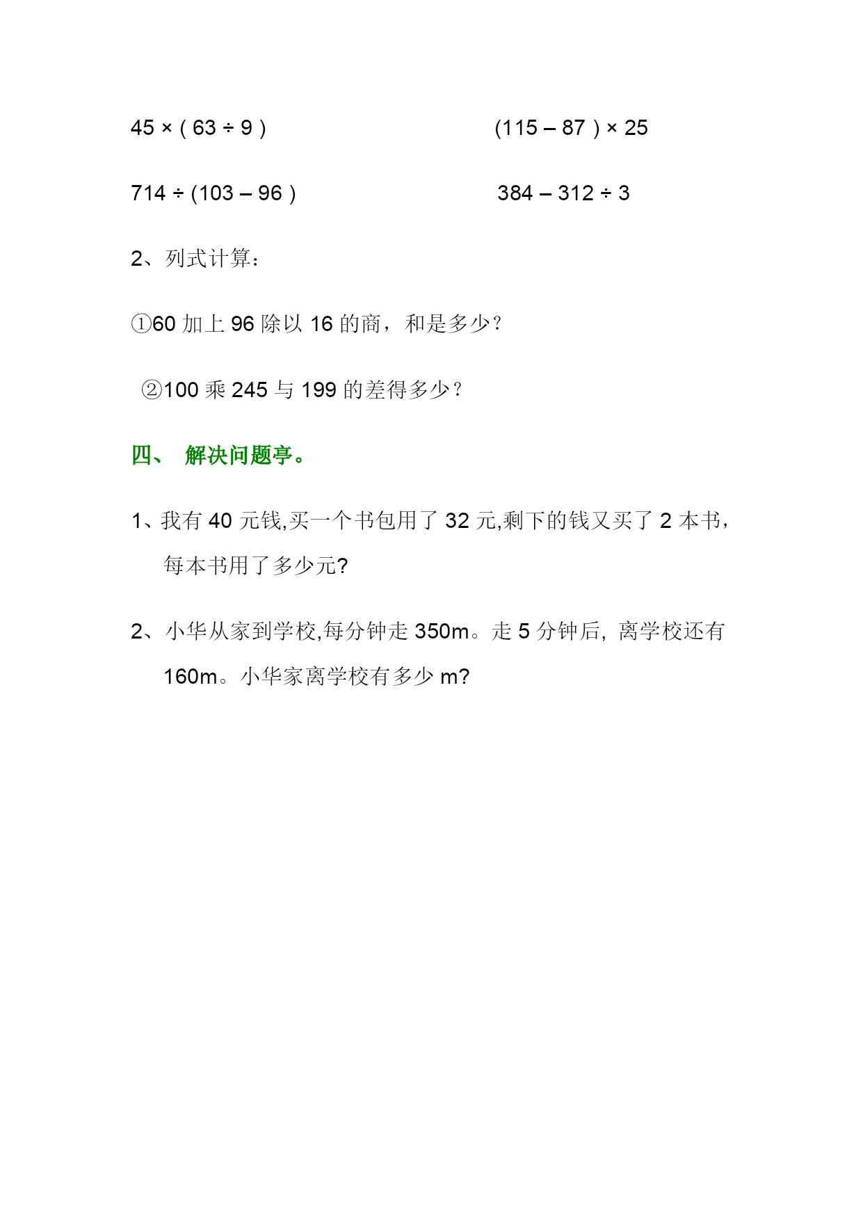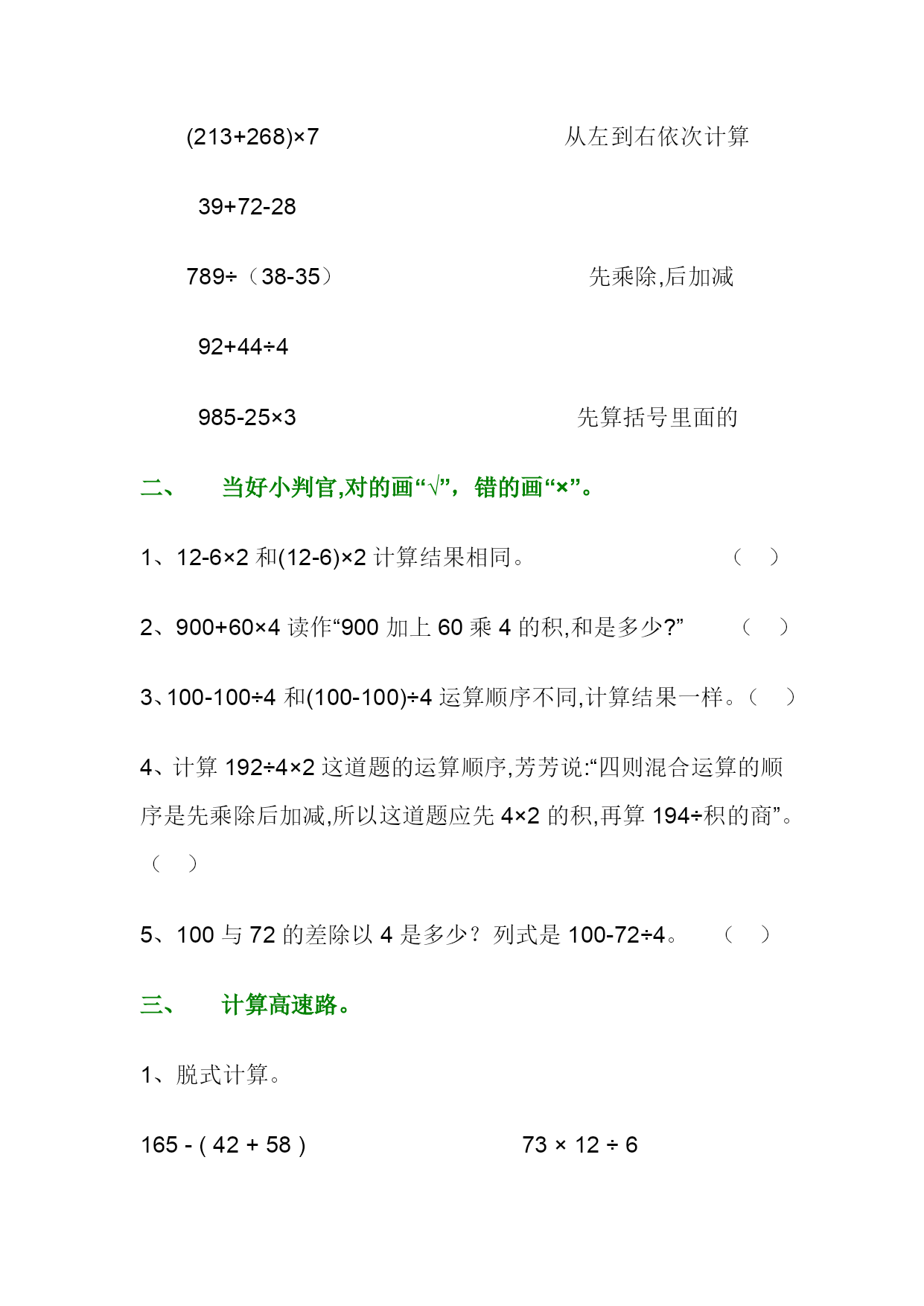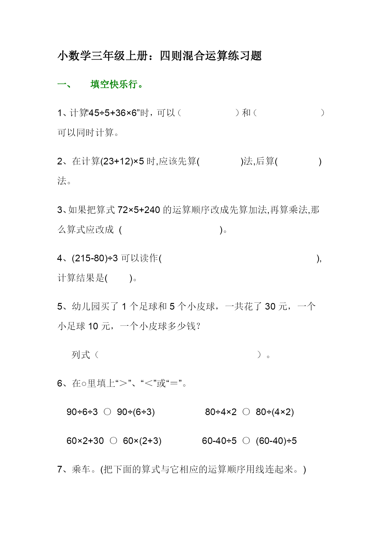 小数学三年级上册:四则混合运算练习题一、填空快乐行。1、计算“45÷5+36×6”时,可以()和()可以同时计算。2、在计算(23+12)×5时,应该先算()法,后算()法。3、如果把算式72×5+240的运算顺序改成先算加法,再算乘法,那么算式应改成()。4、(215-80)÷3可以读作(),计算结果是()。5、幼儿园买了1个足球和5个小皮球,一共花了30元,一个小足球10元,一个小皮球多少钱?列式()。6、在○里填上“>”、“<”或“=”。90÷6÷3○90÷(6÷3)80÷4×2○80÷(4×2)60×2+30○60×(2+3)60-40÷5○(60-40)÷57、乘车。(把下面的算式与它相应的运算顺序用线连起来。)(213+268)×7从左到右依次计算39+72-28789÷(38-35)先乘除,后加减92+44÷4985-25×3先算括号里面的二、当好小判官,对的画“√”,错的画“×”。1、12-6×2和(12-6)×2计算结果相同。()2、900+60×4读作“900加上60乘4的积,和是多少?”()3、100-100÷4和(100-100)÷4运算顺序不同,计算结果一样。()4、计算192÷4×2这道题的运算顺序,芳芳说:“四则混合运算的顺序是先乘除后加减,所以这道题应先4×2的积,再算194÷积的商”。()5、100与72的差除以4是多少?列式是100-72÷4。()三、计算高速路。1、脱式计算。165-(42+58)73×12÷645×(63÷9)(115–87)×25714÷(103–96)384–312÷32、列式计算:①60加上96除以16的商,和是多少?②100乘245与199的差得多少?四、解决问题亭。1、我有40元钱,买一个书包用了32元,剩下的钱又买了2本书,每本书用了多少元?2、小华从家到学校,每分钟走350m。走5分钟后,离学校还有160m。小华家离学校有多少m?
