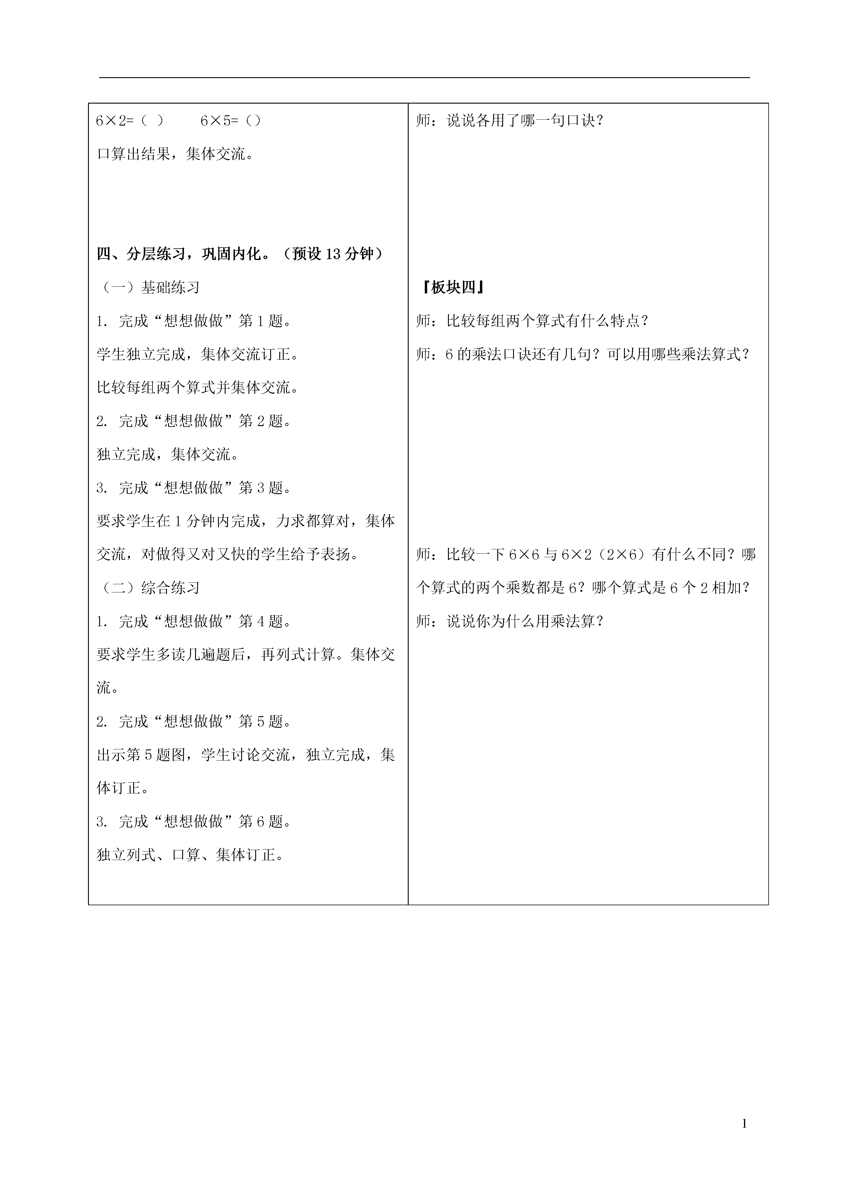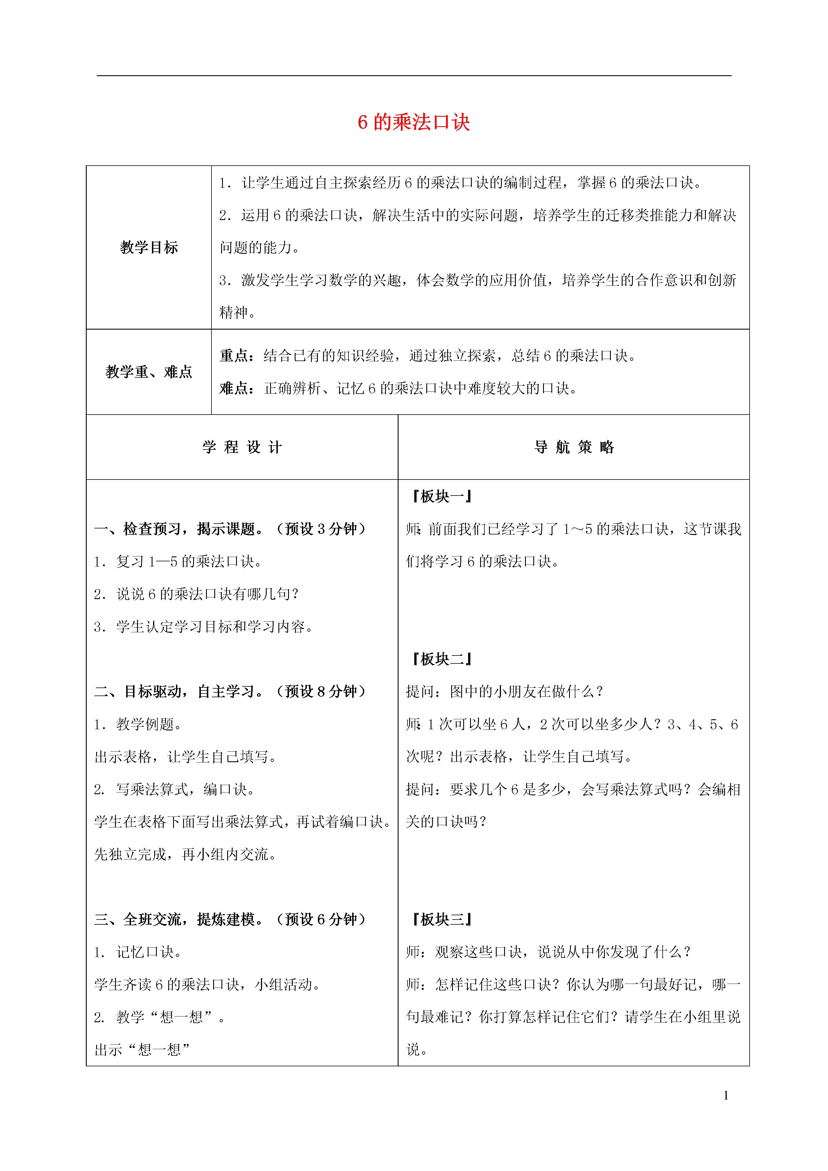 16的乘法口诀教学目标1.让学生通过自主探索经历6的乘法口诀的编制过程,掌握6的乘法口诀。2.运用6的乘法口诀,解决生活中的实际问题,培养学生的迁移类推能力和解决问题的能力。3.激发学生学习数学的兴趣,体会数学的应用价值,培养学生的合作意识和创新精神。教学重、难点重点:结合已有的知识经验,通过独立探索,总结6的乘法口诀。难点:正确辨析、记忆6的乘法口诀中难度较大的口诀。学程设计导航策略一、检查预习,揭示课题。(预设3分钟)1.复习1—5的乘法口诀。2.说说6的乘法口诀有哪几句?3.学生认定学习目标和学习内容。二、目标驱动,自主学习。(预设8分钟)1.教学例题。出示表格,让学生自己填写。2.写乘法算式,编口诀。学生在表格下面写出乘法算式,再试着编口诀。先独立完成,再小组内交流。三、全班交流,提炼建模。(预设6分钟)1.记忆口诀。学生齐读6的乘法口诀,小组活动。2.教学“想一想”。出示“想一想”6×2=()6×5=()口算出结果,集体交流。四、分层练习,巩固内化。(预设13分钟)(一)基础练习1.完成“想想做做”第1题。学生独立完成,集体交流订正。比较每组两个算式并集体交流。2.完成“想想做做”第2题。独立完成,集体交流。3.完成“想想做做”第3题。要求学生在1分钟内完成,力求都算对,集体交流,对做得又对又快的学生给予表扬。(二)综合练习1.完成“想想做做”第4题。要求学生多读几遍题后,再列式计算。集体交流。2.完成“想想做做”第5题。出示第5题图,学生讨论交流,独立完成,集体订正。3.完成“想想做做”第6题。独立列式、口算、集体订正。『板块一』师:前面我们已经学习了1~5的乘法口诀,这节课我们将学习6的乘法口诀。『板块二』提问:图中的小朋友在做什么?师:1次可以坐6人,2次可以坐多少人?3、4、5、6次呢?出示表格,让学生自己填写。提问:要求几个6是多少,会写乘法算式吗?会编相关的口诀吗?『板块三』师:观察这些口诀,说说从中你发现了什么?师:怎样记住这些口诀?你认为哪一句最好记,哪一句最难记?你打算怎样记住它们?请学生在小组里说说。师:说说各用了哪一句口诀?『板块四』师:比较每组两个算式有什么特点?师:6的乘法口诀还有几句?可以用哪些乘法算式?师:比较一下6×6与6×2(2×6)有什么不同?哪个算式的两个乘数都是6?哪个算式是6个2相加?师:说说你为什么用乘法算?