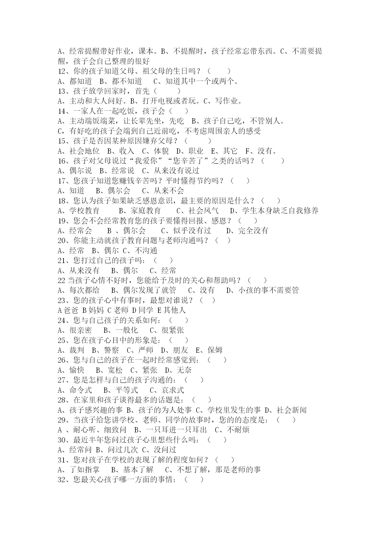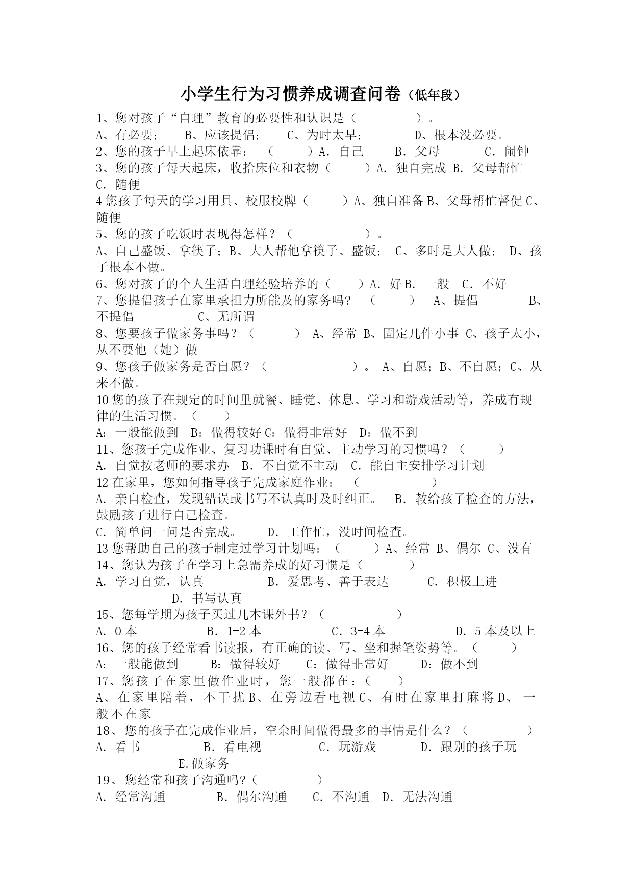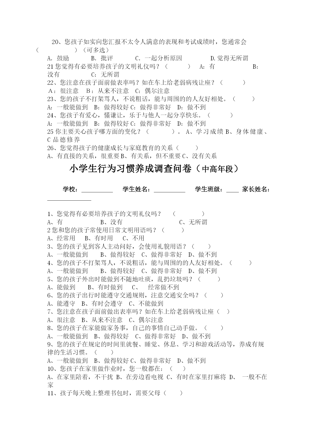 小学生行为习惯养成调查问卷(低年段)1、您对孩子“自理”教育的必要性和认识是()。A、有必要;B、应该提倡;C、为时太早;D、根本没必要。2、您的孩子早上起床依靠:()A.自己B.父母C.闹钟3、您的孩子每天起床,收拾床位和衣物()A.独自完成B.父母帮忙C.随便4您孩子每天的学习用具、校服校牌()A、独自准备B、父母帮忙督促C、随便5、您的孩子吃饭时表现得怎样?()。A、自己盛饭、拿筷子;B、大人帮他拿筷子、盛饭;C、多时是大人做;D、孩子根本不做。6、您对孩子的个人生活自理经验培养的()A.好B.一般C.不好7、您提倡孩子在家里承担力所能及的家务吗?()A、提倡B、不提倡C、无所谓8、您要孩子做家务事吗?()A、经常B、固定几件小事C、孩子太小,从不要他(她)做9、您孩子做家务是否自愿?()。A、自愿;B、不自愿;C、从来不做。10您的孩子在规定的时间里就餐、睡觉、休息、学习和游戏活动等,养成有规律的生活习惯。()A:一般能做到B:做得较好C:做得非常好D:做不到11、您孩子完成作业、复习功课时有自觉、主动学习的习惯吗?()A.自觉按老师的要求办B.不自觉不主动C.能自主安排学习计划12在家里,您如何指导孩子完成家庭作业:()A.亲自检查,发现错误或书写不认真时及时纠正。B.教给孩子检查的方法,鼓励孩子进行自己检查。C.简单问一问是否完成。D.工作忙,没时间检查。13您帮助自己的孩子制定过学习计划吗:()A、经常B、偶尔C、没有14、您认为孩子在学习上急需养成的好习惯是()A.学习自觉,认真B.爱思考、善于表达C.积极上进D.书写认真15、您每学期为孩子买过几本课外书?()A.0本B.1-2本C.3-4本D.5本及以上16、您的孩子经常看书读报,有正确的读、写、坐和握笔姿势等。()A:一般能做到B:做得较好C:做得非常好D:做不到17、您孩子在家里做作业时,您一般都在:()A、在家里陪着,不干扰B、在旁边看电视C、有时在家里打麻将D、一般不在家18、您的孩子在完成作业后,空余时间做得最多的事情是什么?()A.看书B.看电视C.玩游戏D.跟别的孩子玩E.做家务19、您经常和孩子沟通吗?()A.经常沟通B.偶尔沟通C.不沟通D.无法沟通20、您孩子如实向您汇报不太令人满意的表现和考试成绩时,您通常会()(可多选)A.鼓励B.批评C.一起分析原因D.觉得无所谓21您觉得有必要培养孩子的文明礼仪吗?()A:有B:没有C:无所谓22、您注意在孩子面前做表率吗?如在车上给老弱病残让座?()A:很注意B:从来不注意C:偶尔注意23、您的孩子不打架骂人,不说粗话,能与周围的的人友好相处。()A:一般能做到B:做得较好C:做得非常好D:做不到24、您孩子有爱心,懂谦让,乐于与他人一起分享快乐。()A:一般能做到B:做得较好C:做得非常好D:做不到25你主要关心孩子哪方面的变化?()。A、学习成绩B、身体健康、C品德修养26、您觉得孩子的健康成长与家庭教育的关系()A、有直接的关系,很重要B、有关系,但不重要C、没有关系小学生行为习惯养成调查问卷(中高年段)学校:学生姓名:学生班级:家长姓名:1、您觉得有必要培养孩子的文明礼仪吗?()A、有B、没有C、无所谓2您和您的孩子常使用日常文明用语吗?()A、经常用B、有时用C、不用3、您的孩子见到客人主动问好,会使用礼貌用语?()A、一般能做到B、做得较好C、做得非常好D、做不到4、您的孩子不打架骂人,不说粗话,能与周围的的人友好相处。()A、一般能做到B、做得较好C、做得非常好D、做不到5、您的孩子外出时能做到不随地吐痰,乱扔垃圾吗?()A、能做到B、有时做到C、经常做不到6、您的孩子出行时能遵守交通规则,注意交通安全吗?()A、能遵守B、有时会遵守C、不能做到7、您注意在孩子面前做出表率吗?如在车上给老弱病残让座()A、很注意B、从来不注意C、偶尔注意8、您的孩子在家能做家务事,自己的事情自己动手做。()A、一般能做到B、做得较好C、做得非常好D、做不到9、您的孩子在规定的时间里就餐、睡觉、休息、学习和游戏活动等,养成有规律的生活习惯。()A、一般能做到B、做得较好C、做得非常好D、做不到10、您孩子在家里做作业时,您一般都在:()A、在家里陪着,不干扰B、在旁边看电视C、有时在家里打麻将D、一般不在家11、孩子每天晚上整理书包时,需要父母()A、经常提醒带好作业,课本。B、不提醒时,孩子经常忘带东西。C、不需要提醒,孩子会自己整理的很好12、你的孩子知道父母、祖父母的生日吗?()A、都知道B、都不知道C、知道其中一个或两个。13、孩子放学回家时,首先()A、主动和大人问好。B、打开电视或者玩。C、写作业。14、一家人在一起吃饭,孩子会()A、主动端饭端菜,让长辈先坐,先吃B、孩子自己吃,不管别