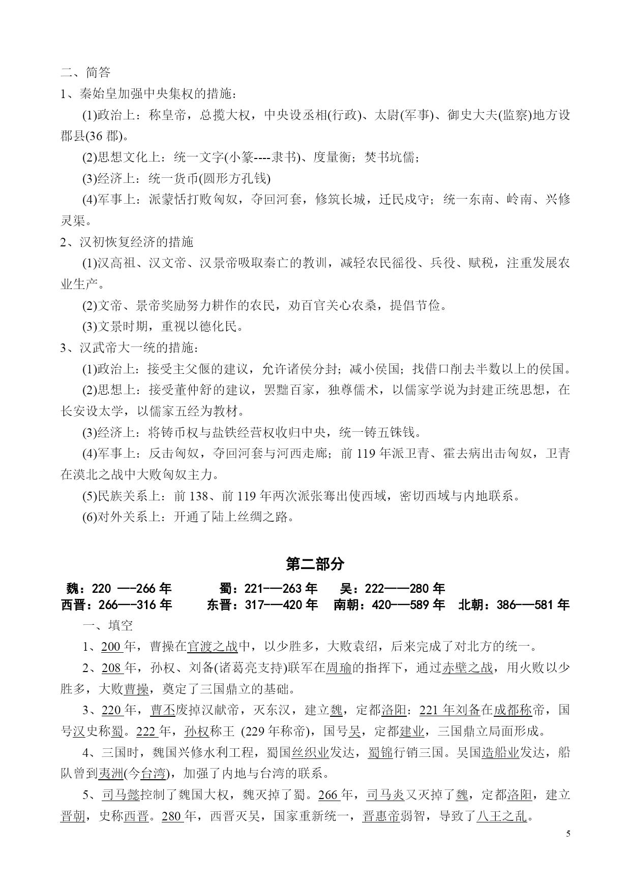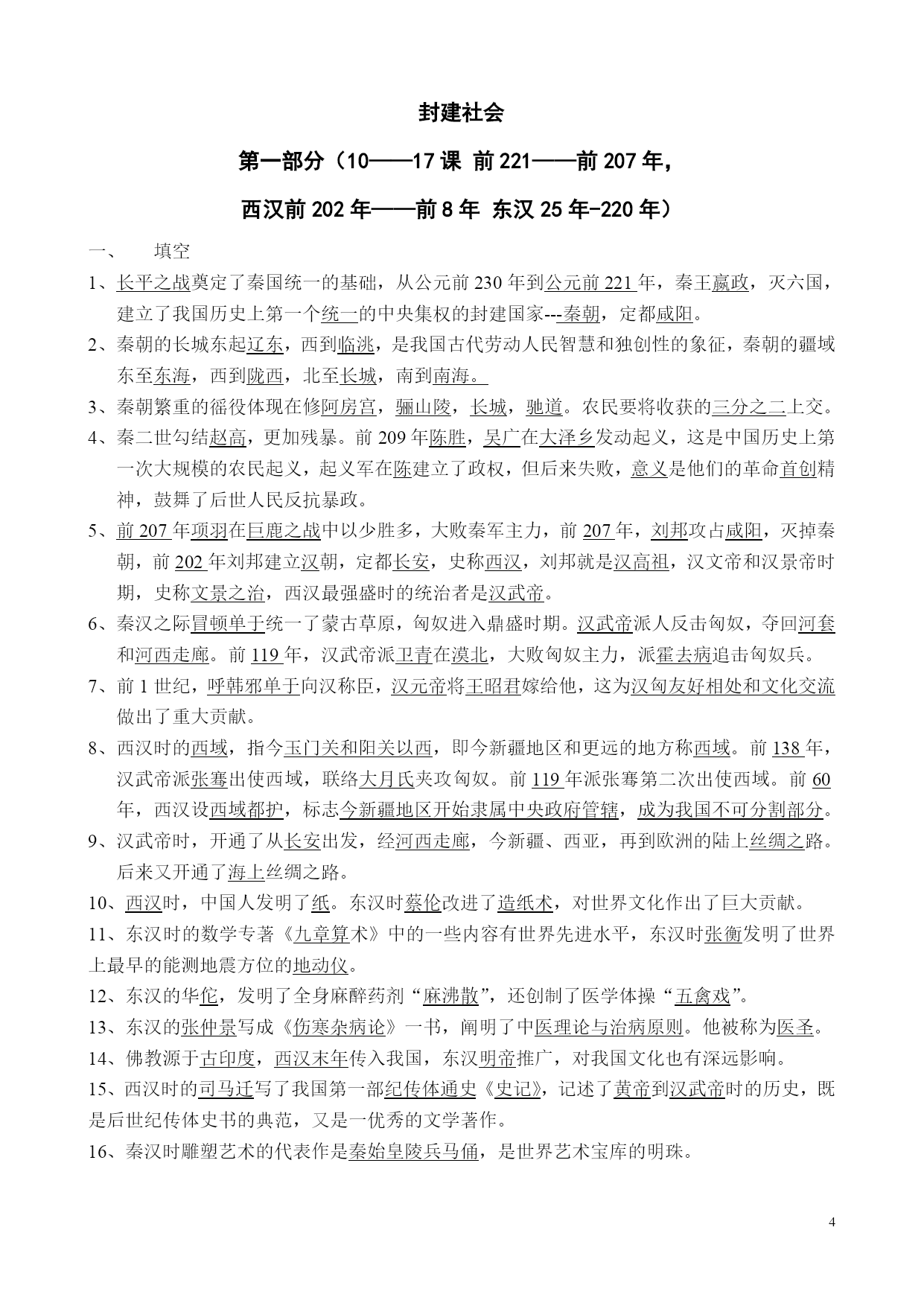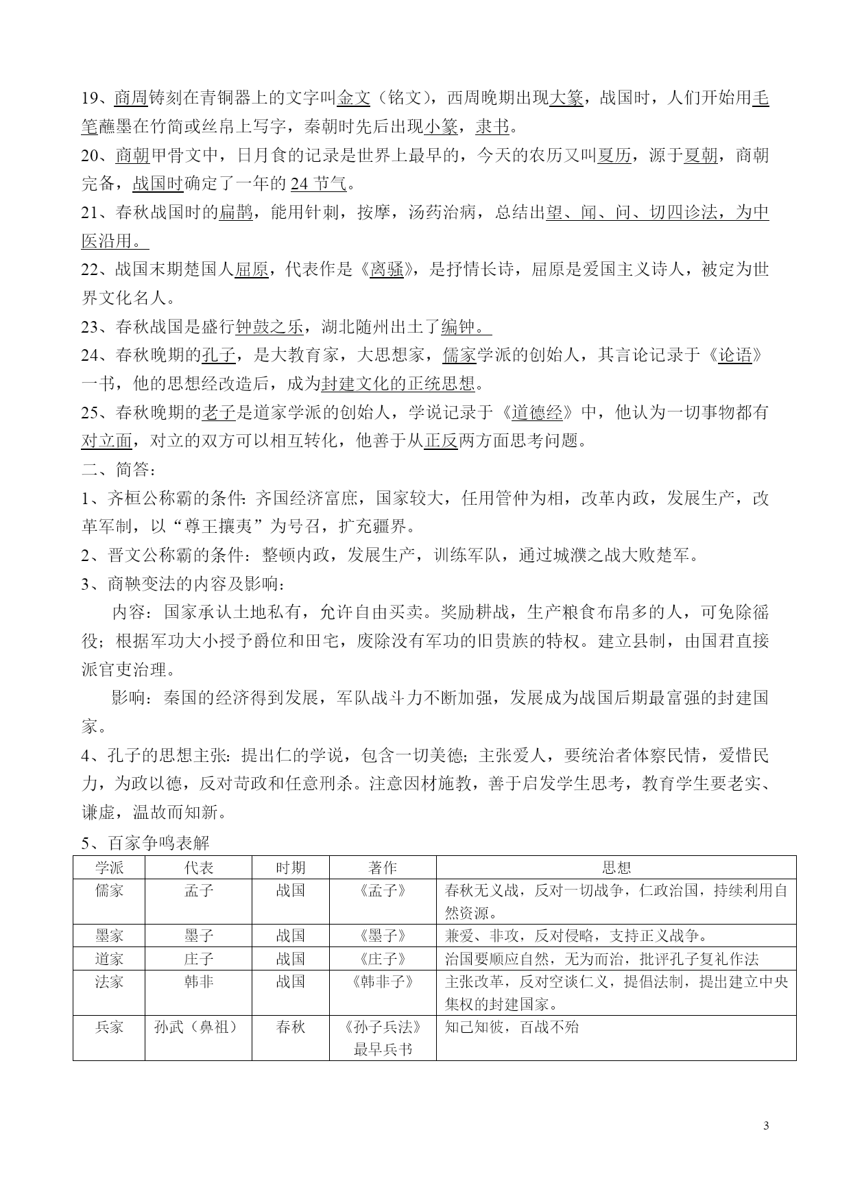 七年级上册历史复习提纲班级:__________姓名:____________原始社会(前170万年——前2070年)填空我国境内已知最早的人类距今170万年的元谋人,发现于今天云南。会制造工具(这是人与动物的根本区别),知道用火。距今70万年至20万年,北京人生活与今北京周口店,他们还保留了猿的某些特性,手脚分工明显,能将石块敲打成粗糙的石器,还使用木棒,会使用天然火,保存火种,过群居生活,火的使用是人类进化过程中的一大进步。距今3万年,山顶洞人生活在北京周口店龙骨山顶部洞穴中,他们使用打制石器,掌握磨光和钻孔技术,会人工取火,靠采集、狩猎、捕鱼为生,会交换生活用品,用骨针缝衣服,死后要埋葬,他们生活在由血缘关系结合的氏族中,人人平等。我国是发现远古人类遗址最多的国家。我国是世界上最早种植水稻和粟的国家。距今七千年的河姆渡人,生活在长江流域,使用磨制石器(耒耜),种水稻,住干栏式的房子,过定居生活,会挖水井,饲养家畜,制造陶器,,简单的玉器和原始的乐器。半坡人生活于距今五六千年的陕西西安半坡村,属黄河流域,使用磨制石器(木制耒耜),种粟,饲养猪狗,用骨制箭头,渔钩,种蔬菜,住半地穴式的房子,烧制彩陶,出现早期文字雏形,会纺线,织布,制衣。距今四五千年,生活在黄河流域的黄帝部落联合炎帝部落,在涿鹿一战中,打败蚩尤,形成以后的华夏族。相传,黄帝发明了建房、挖井、造车船,为后世的衣食住行奠定了基础,被称为人文初祖(华夏族始祖),传说嫘祖发明养蚕缫丝,仓颉发明文字,伶伦编出了乐谱。传说,尧生活简朴,克己爱民,舜宽厚待人,以身作则,禹治水,民主推举部落联盟首领的办法叫禅让。公元前2070年,禹建立夏朝,这是我国第一个王朝,禹是第一个国王,这标志着我国原始社会的结束和奴隶社会的开始,我国早期的国家产生了。奴隶社会(前2070年——前476年夏、商、西周、春秋)填空1、启继承禹的王位,成为夏朝的第二个国王。世袭制代替了禅让制,家天下代替了公天下。2、夏朝的统治中心在河南西部与山西南部,都城在阳城,有军队、刑法、监狱、城墙,宫殿和政府机构,是奴隶主阶级压迫平民和奴隶的工具。3、商的国君汤于公元前1600年打败夏的最后一个国王桀,灭掉了夏,建立商朝。汤任用伊尹,关心百姓,国力发展。4、商王盘庚将都城迁到殷,商朝的最后一个国王是暴君纣,使用炮烙等酷刑镇压人民。5、周文王任用姜尚国力强大,周武王于公元前1046年在牧野大战中打败纣王,纣在鹿台自焚,商亡,武王建立周朝,定都镐(镐京),史称西周。西周实行分封制。6、西周后期,发生了国人暴动。公元前771年,西周灭亡。7、我国的青铜器产生于原始社会末期,繁盛于商朝,代表作品有巨大的司母戊鼎和奇特的四羊方尊。与商朝同期成都平原,盛行三星堆文化,代表青铜器有青铜面具,大型青铜立人像,青铜神树。8、我国是世界上最早发明瓷器的国家,商朝就会烧制原始青瓷9、夏商、西周文明被称为青铜文明,商周时已出现五谷,会选种、施肥、治虫害,出现了青铜农具,今天家禽家畜的主要品种,商朝时都有了。还出现了牲畜圈栏和牧场,但当时奴隶地位低下,没有自由,生活悲惨。10、前770年,周平王迁都洛,史称东周,东周分为春秋,战国两个时期,当时天子势力已经衰落。11、春秋时期著名的霸主有齐桓公、晋文公、楚庄王,晋楚争霸持续了百余年,后来楚打败了晋。12、春秋争霸的影响是给社会带来灾难,但诸侯的数量减少,出现了较大的诸侯国。13、战国七雄是指齐、楚、秦、燕、赵、魏、韩。其中,赵魏韩由晋国分出,齐国国君变成了田氏。14、战国时,齐魏之间爆发了桂陵之战,马陵之战。而前260年,秦国通过长平之战打败了赵国。15、春秋时期,我国出现了铁农具和牛耕,战国时获得推广,牛耕是我国农业发展史上的一次革命。16、战国时,秦国蜀守李冰在岷江中游修筑了都江堰,使成都平原成为了天府之国。17、战国时,新兴的地主阶级为确立封建统治,发展封建经济而进行的变法中,成就最大的是前356年,秦孝公支持的商鞅变法,而地主阶级与农民阶级的矛盾成为社会的主要矛盾,封建社会确立了。18、商朝人刻在龟甲、兽骨上文字叫甲骨文,是比较成熟的文字,我国有文字可考的历史就是从商朝开始的。19、商周铸刻在青铜器上的文字叫金文(铭文),西周晚期出现大篆,战国时,人们开始用毛笔蘸墨在竹简或丝帛上写字,秦朝时先后出现小篆,隶书。20、商朝甲骨文中,日月食的记录是世界上最早的,今天的农历又叫夏历,源于夏朝,商朝完备,战国时确定了一年的24节气。21、春秋战国时的扁鹊,能用针刺,按摩,汤药治病,总结出望、闻、问、切四诊法,为中医沿用。22、战国末期楚国人屈原,代表作是《离骚》,是抒情长诗,屈原是爱国主义诗人,被定为世界文化名人。23、春秋战国是盛行钟鼓之乐,湖北随州出土了编钟