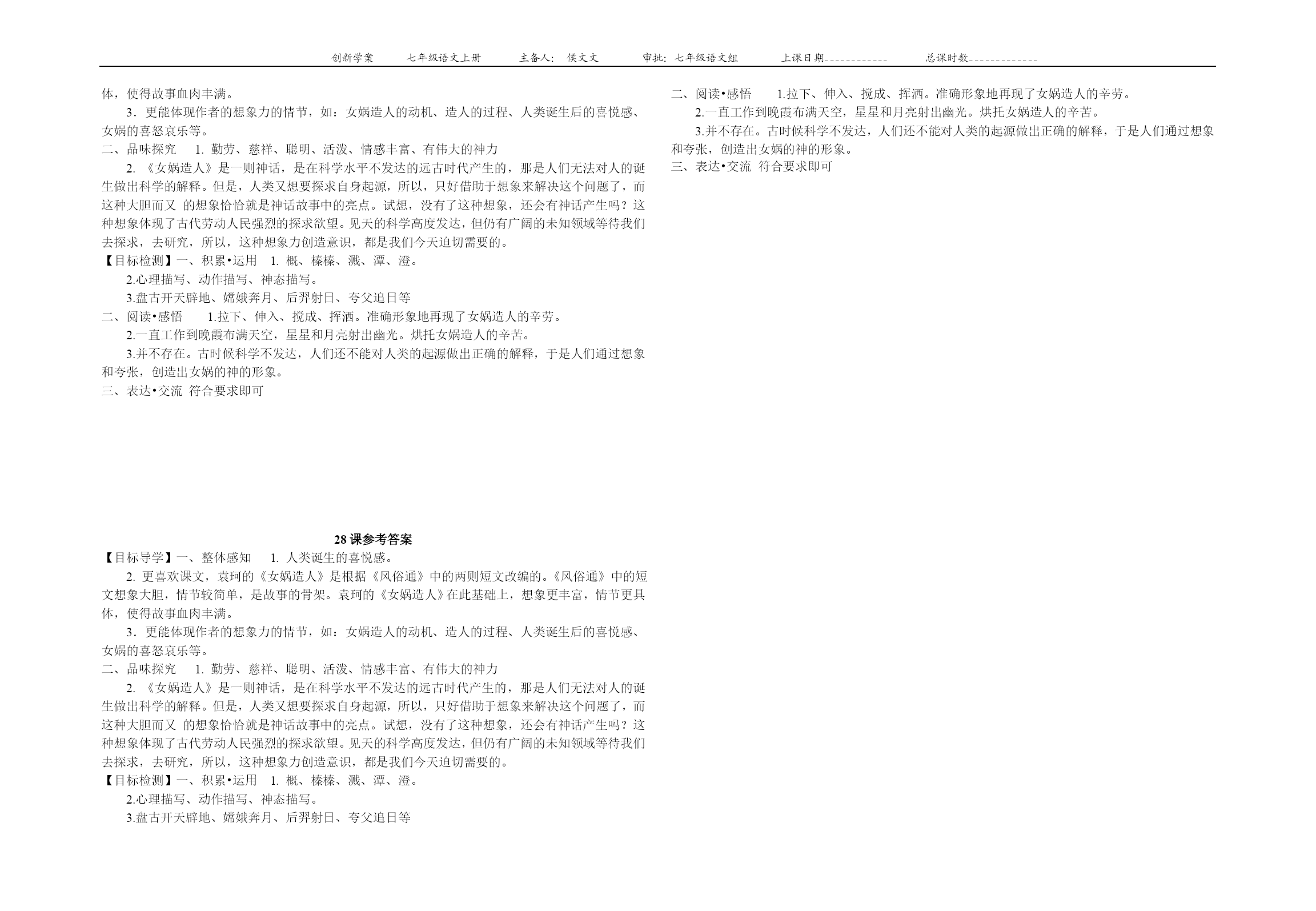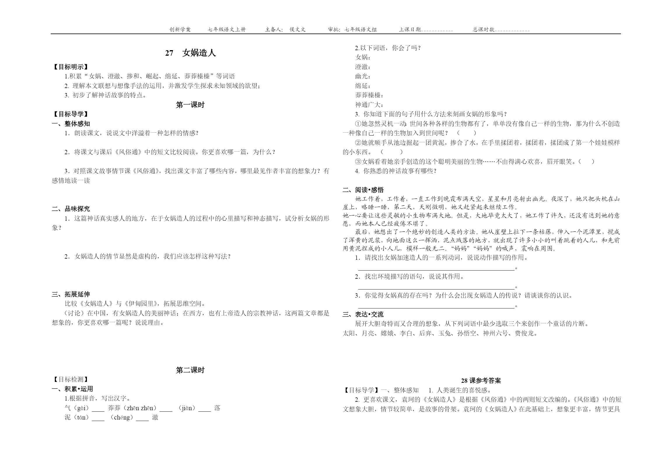 创新学案七年级语文上册主备人:侯文文审批:七年级语文组上课日期____________总课时数_____________27女娲造人【目标明示】1.积累“女娲、澄澈、掺和、崛起、绵延、莽莽榛榛”等词语2.理解本文联想与想像手法的运用,并激发学生探求未知领域的欲望;3.初步了解神话故事的特点。第一课时【目标导学】一、整体感知1.朗读课文,说说文中洋溢着一种怎样的情感?2.将课文与课后《风俗通》中的短文比较阅读。你更喜欢哪一篇,为什么?3.对照课文故事情节课《风俗通》,找出课文丰富了哪些内容,哪里最见作者丰富的想象力?有感情地读一读二、品味探究1.这篇神话真实感人的地方,在于女娲造人的过程中的心里描写和神态描写,试分析女娲的形象?2.女娲造人的情节显然是虚构的,我们应该怎样这种写法?三、拓展延伸比较《女娲造人》与《伊甸园里》,拓展思维空间。(讨论)在中国,有女娲造人的美丽神话;在西方,也有上帝造人的宗教神话,这两篇文章都是想象的,你更喜欢哪一篇呢?说说理由。第二课时【目标检测】一、积累•运用1.根据拼音,写出汉字。气(gài)____莽莽(zhēnzhēn)____(jiàn)____落泥(tán)____(chéng)____澈2.以下词语,你会了吗?女娲:澄澈:幽光:绵延:莽莽榛榛:神通广大:3.你知道下面的句子用什么方法来刻画女娲的形象吗?①她忽然灵机一动:世间各种各样的生物都有了,单单没有像自己一样的生物,那为什么不创造一种像自己一样的生物加入到世间呢?()②她就顺手从池边掘起一团黄泥,掺合了水,在手里揉团着,揉团着,揉团成了第一个娃娃模样的小东西。()③女娲看着她亲手创造的这个聪明美丽的生物……不由得满心欢喜,眉开眼笑。()4.你熟悉的神话故事有哪些?二、阅读•感悟她工作着,工作着,一直工作到晚霞布满天空,星星和月亮射出幽光。夜深了,她只把头枕在山崖上,略睡一睡,第二天,天刚微明,她又赶紧起来继续工作。她一心要让这些灵敏的小生物布满大地。但是,大地毕竟太大了,她工作了许久,还没有达到她的意愿,而她本人已经疲倦不堪了。最后,她想出了一个绝妙的创造人类的方法。她从崖壁上拉下一条枯藤,伸入一个泥潭里,搅成了浑黄的泥浆,向地面这么一挥洒,泥点溅落的地方,就出现了许多小小的叫着跳着的人儿,和先前用黄泥捏成的小人儿,模样一般无二。“妈妈”“妈妈”的喊声,震响在周围。1.请找出女娲加速造人的一系列动词,说说动作描写的作用。_________________________________________________。2.找出环境描写的语句,说说其作用。_________________________________________________。3.你觉得女娲真的存在吗?为什么会出现女娲造人的传说?请谈谈你的认识。_________________________________________________。三、表达•交流展开大胆奇特而又合理的想象,从下列词语中最少选取三个来创作一个童话的片断。太阳、月亮、嫦娥、李白、后弈、玉兔、孙悟空、神州六号、费俊龙。28课参考答案【目标导学】一、整体感知1.人类诞生的喜悦感。2.更喜欢课文,袁珂的《女娲造人》是根据《风俗通》中的两则短文改编的。《风俗通》中的短文想象大胆,情节较简单,是故事的骨架。袁珂的《女娲造人》在此基础上,想象更丰富,情节更具体,使得故事血肉丰满。3.更能体现作者的想象力的情节,如:女娲造人的动机、造人的过程、人类诞生后的喜悦感、女娲的喜怒哀乐等。二、品味探究1.勤劳、慈祥、聪明、活泼、情感丰富、有伟大的神力2.《女娲造人》是一则神话,是在科学水平不发达的远古时代产生的,那是人们无法对人的诞生做出科学的解释。但是,人类又想要探求自身起源,所以,只好借助于想象来解决这个问题了,而这种大胆而又的想象恰恰就是神话故事中的亮点。试想,没有了这种想象,还会有神话产生吗?这种想象体现了古代劳动人民强烈的探求欲望。见天的科学高度发达,但仍有广阔的未知领域等待我们去探求,去研究,所以,这种想象力创造意识,都是我们今天迫切需要的。【目标检测】一、积累•运用1.概、榛榛、溅、潭、澄。2.心理描写、动作描写、神态描写。3.盘古开天辟地、嫦娥奔月、后羿射日、夸父追日等二、阅读•感悟1.拉下、伸入、搅成、挥洒。准确形象地再现了女娲造人的辛劳。2.一直工作到晚霞布满天空,星星和月亮射出幽光。烘托女娲造人的辛苦。3.并不存在。古时候科学不发达,人们还不能对人类的起源做出正确的解释,于是人们通过想象和夸张,创造出女娲的神的形象。三、表达•交流符合要求即可28课参考答案【目标导学】一、整体感知1.人类诞生的喜悦感。2.更喜欢课文,袁珂的《女娲造人》是根据《风俗通》中的两则短文改编的。《风俗通》中的